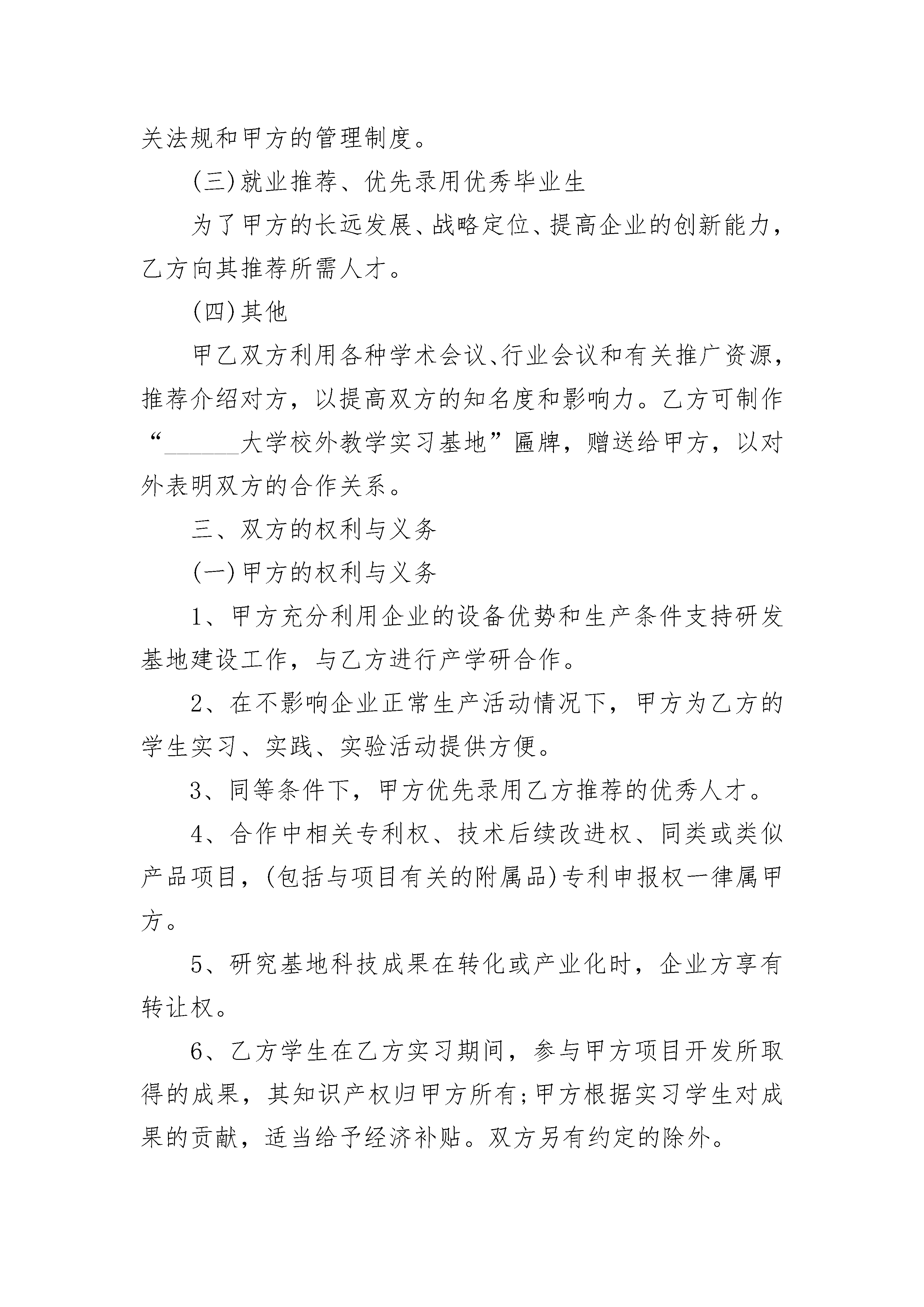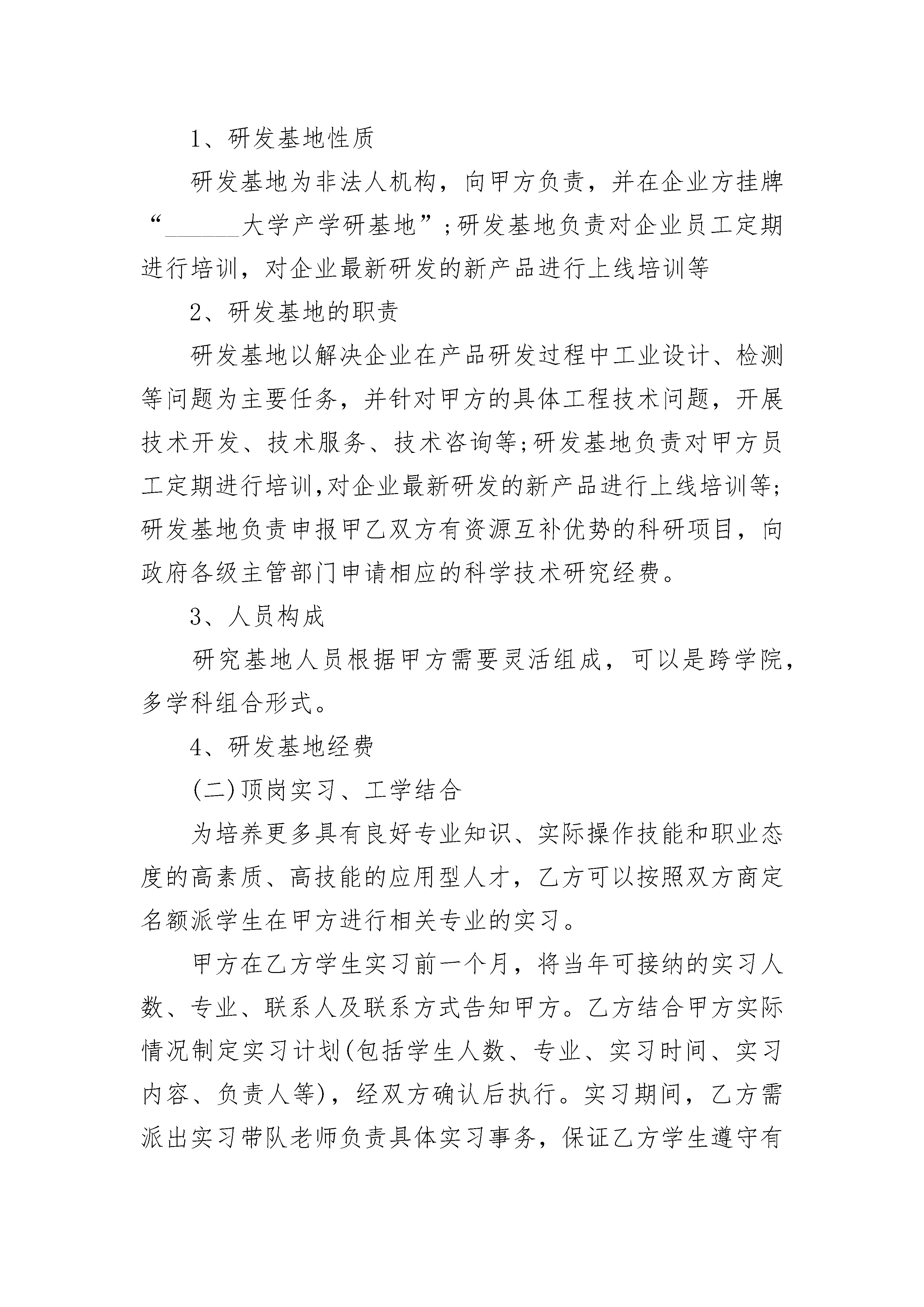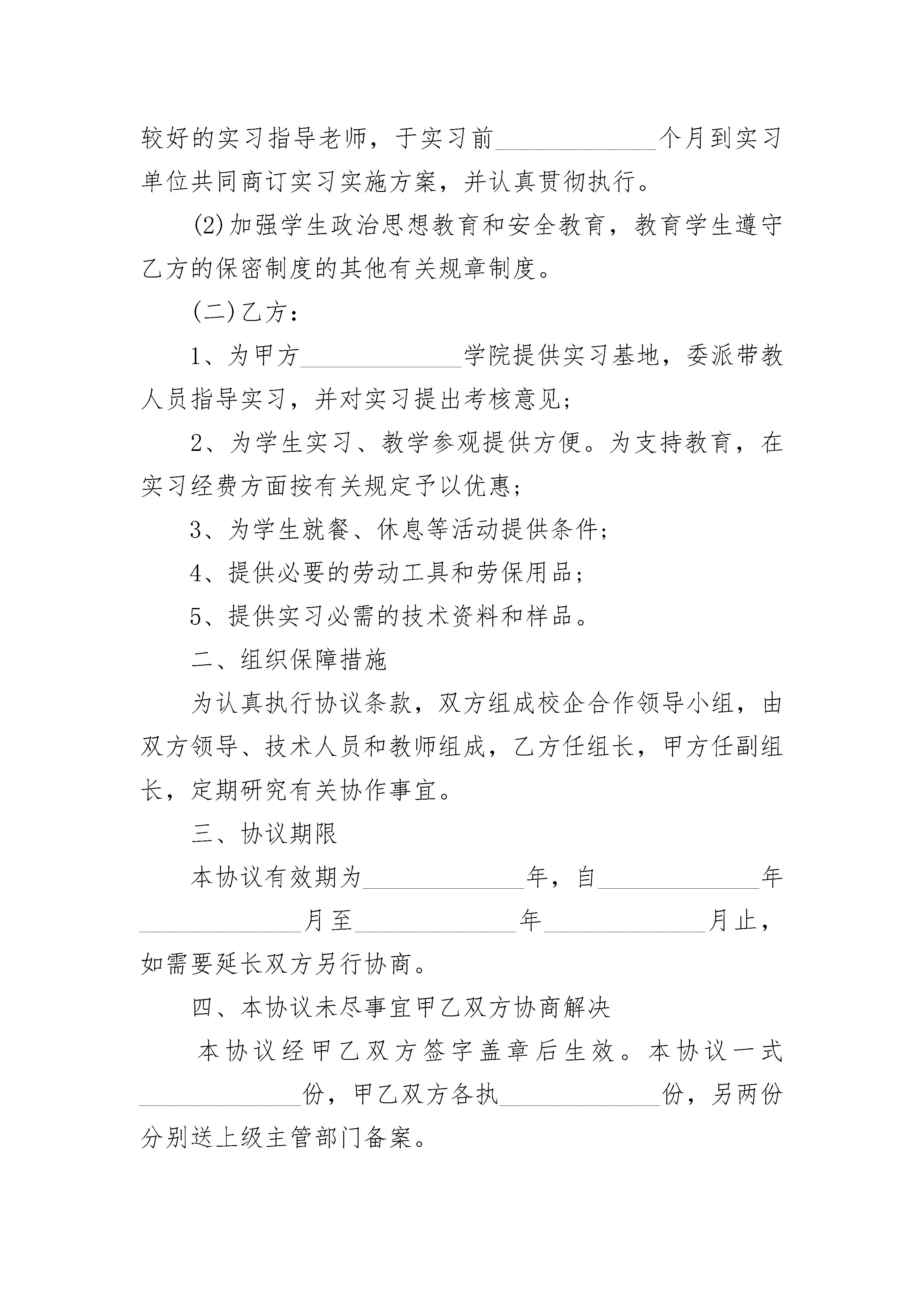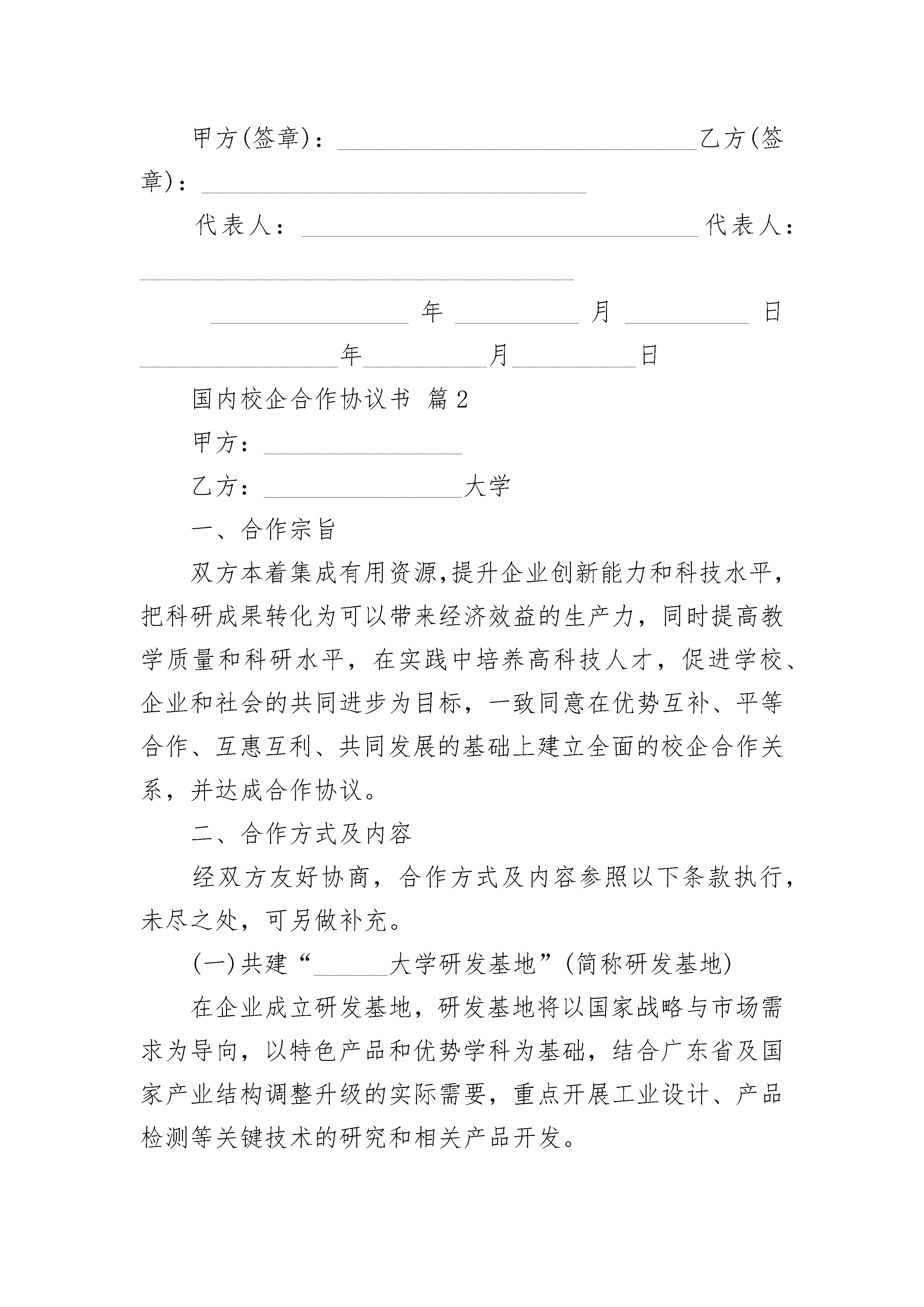 国内校企合作协议书国内校企合作协议书(精选24篇)国内校企合作协议书篇1学校(以下简称甲方):___________________________________公司(以下简称乙方):___________________________________为了推动学生校外实习和社会实践活动的开展,培养具有较高专业实践能力的技术性人才,_________________学院(甲方)与_________________(乙方)本着互相协作,各施所长,互补所需的精神,建立校企合作关系。经双方协商,达成如下协议。一、双方责任(一)甲方:1.优先为乙方提供有关专业的新信息,技术咨询和开展技术协作;2.为乙方培训管理人员、专业技术人员或转岗工人提供服务;3.根据乙方企业的要求,培养我院的优秀学生成为乙方的专业技术人员,或优先、或择优推荐我院的毕业生;4.做好实习基地的建设工作。(1)按照上级有关部门规定,提前_____________个月至_____________年申报实习计划,认真制订实习大纲,指派较好的实习指导老师,于实习前_____________个月到实习单位共同商订实习实施方案,并认真贯彻执行。(2)加强学生政治思想教育和安全教育,教育学生遵守乙方的保密制度的其他有关规章制度。(二)乙方:1、为甲方_____________学院提供实习基地,委派带教人员指导实习,并对实习提出考核意见;2、为学生实习、教学参观提供方便。为支持教育,在实习经费方面按有关规定予以优惠;3、为学生就餐、休息等活动提供条件;4、提供必要的劳动工具和劳保用品;5、提供实习必需的技术资料和样品。二、组织保障措施为认真执行协议条款,双方组成校企合作领导小组,由双方领导、技术人员和教师组成,乙方任组长,甲方任副组长,定期研究有关协作事宜。三、协议期限本协议有效期为_____________年,自_____________年_____________月至_____________年_____________月止,如需要延长双方另行协商。四、本协议未尽事宜甲乙双方协商解决本协议经甲乙双方签字盖章后生效。本协议一式_____________份,甲乙双方各执_____________份,另两份分别送上级主管部门备案。甲方(签章):_____________________________乙方(签章):_______________________________代表人:________________________________代表人:___________________________________________________年__________月__________日________________年__________月__________日国内校企合作协议书篇2甲方:________________乙方:________________大学一、合作宗旨双方本着集成有用资源,提升企业创新能力和科技水平,把科研成果转化为可以带来经济效益的生产力,同时提高教学质量和科研水平,在实践中培养高科技人才,促进学校、企业和社会的共同进步为目标,一致同意在优势互补、平等合作、互惠互利、共同发展的基础上建立全面的校企合作关系,并达成合作协议。二、合作方式及内容经双方友好协商,合作方式及内容参照以下条款执行,未尽之处,可另做补充。(一)共建“______大学研发基地”(简称研发基地)在企业成立研发基地,研发基地将以国家战略与市场需求为导向,以特色产品和优势学科为基础,结合广东省及国家产业结构调整升级的实际需要,重点开展工业设计、产品检测等关键技术的研究和相关产品开发。1、研发基地性质研发基地为非法人机构,向甲方负责,并在企业方挂牌“______大学产学研基地”;研发基地负责对企业员工定期进行培训,对企业最新研发的新产品进行上线培训等2、研发基地的职责研发基地以解决企业在产品研发过程中工业设计、检测等问题为主要任务,并针对甲方的具体工程技术问题,开展技术开发、技术服务、技术咨询等;研发基地负责对甲方员工定期进行培训,对企业最新研发的新产品进行上线培训等;研发基地负责申报甲乙双方有资源互补优势的科研项目,向政府各级主管部门申请相应的科学技术研究经费。3、人员构成研究基地人员根据甲方需要灵活组成,可以是跨学院,多学科组合形式。4、研发基地经费(二)顶岗实习、工学结合为培养更多具有良好专业知识、实际操作技能和职业态度的高素质、高技能的应用型人才,乙方可以按照双方商定名额派学生在甲方进行相关专业的实习。甲方在乙方学生实习前一个月,将当年可接纳的实习人数、专业、联系人及联系方式告知甲方。乙方结合甲方实际情况制定实习计划(包括学生人数、专业、实习时间、实习内容、负责人等),经