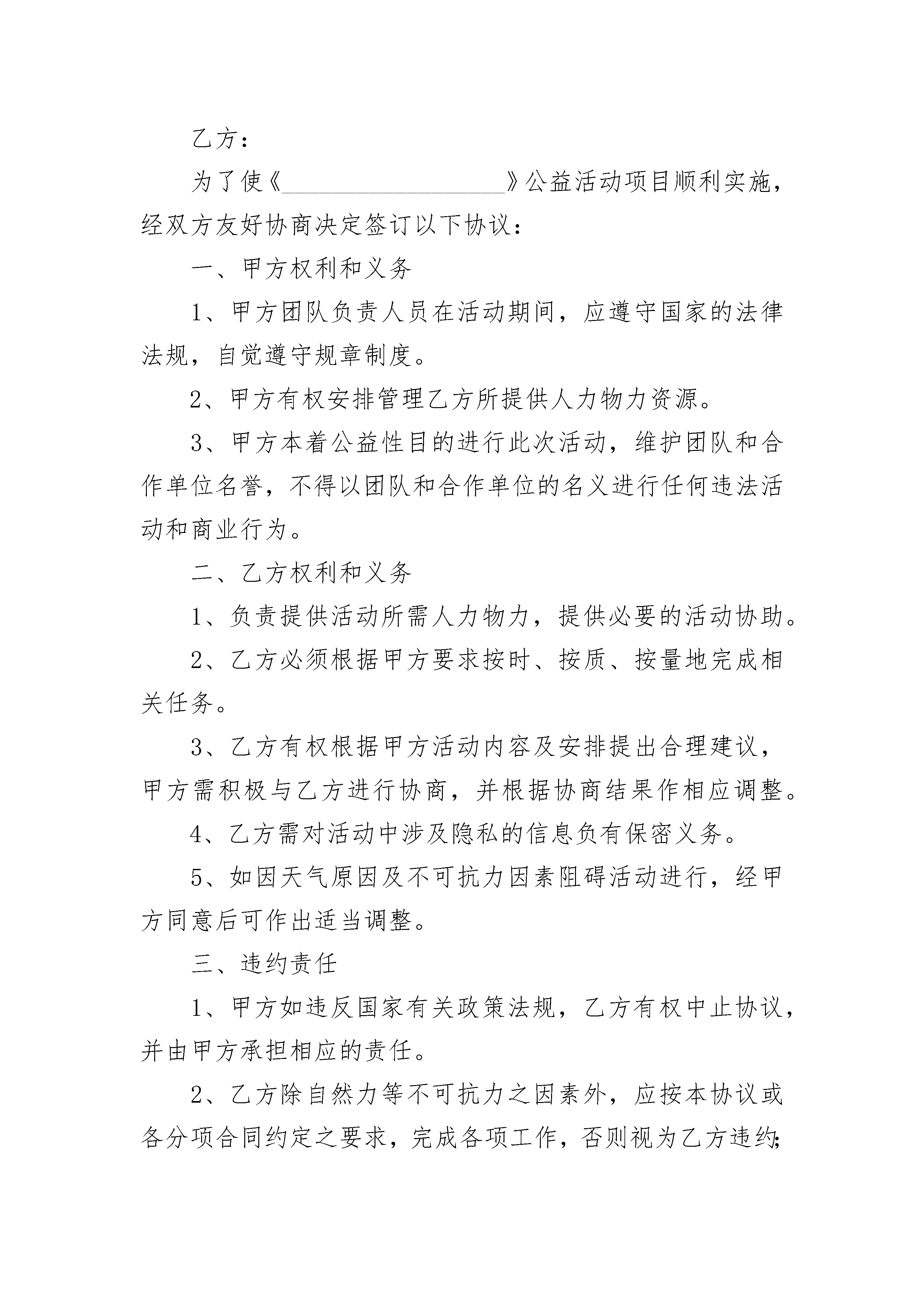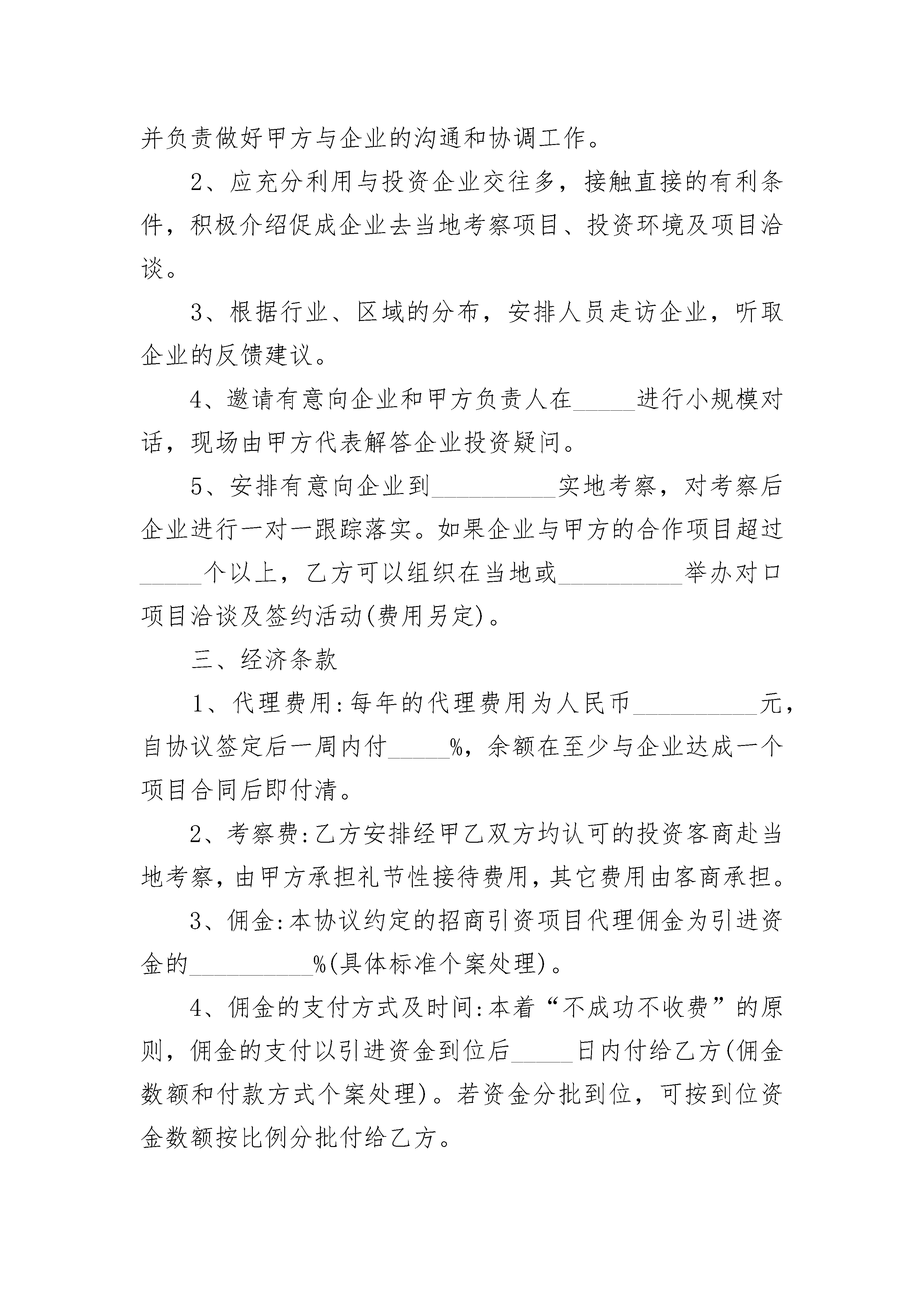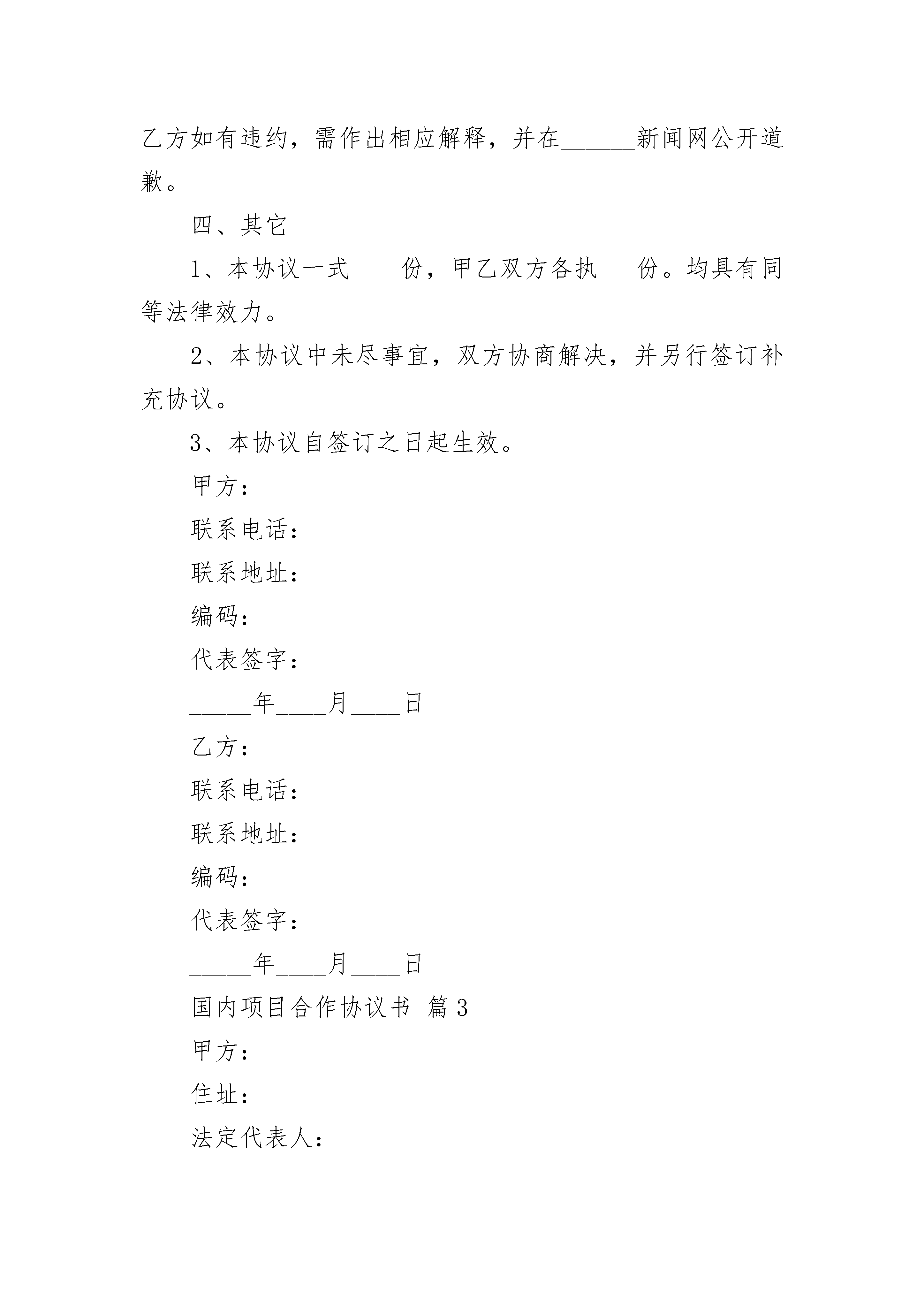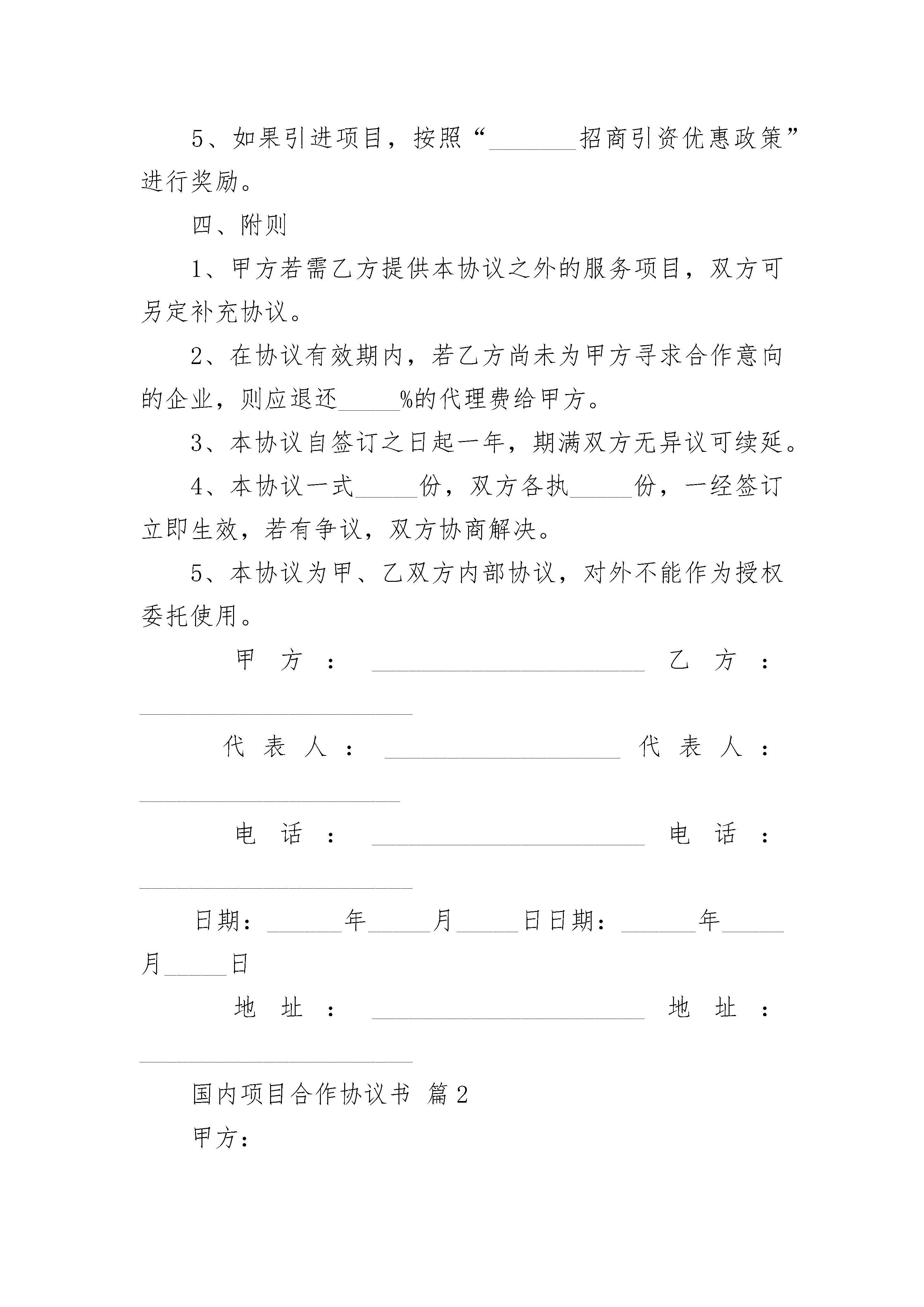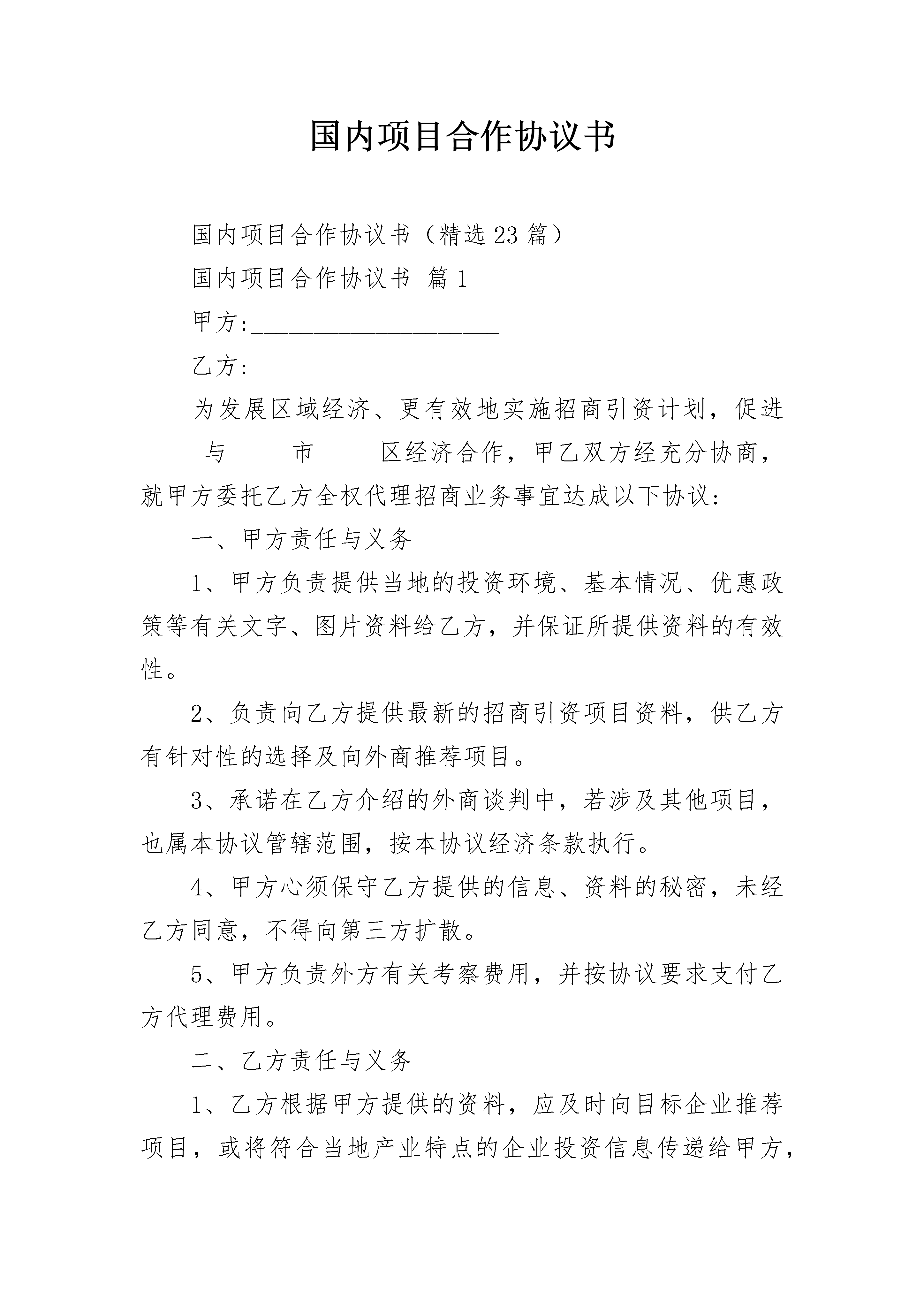 国内项目合作协议书国内项目合作协议书(精选23篇)国内项目合作协议书篇1甲方:____________________乙方:____________________为发展区域经济、更有效地实施招商引资计划,促进_____与_____市_____区经济合作,甲乙双方经充分协商,就甲方委托乙方全权代理招商业务事宜达成以下协议:一、甲方责任与义务1、甲方负责提供当地的投资环境、基本情况、优惠政策等有关文字、图片资料给乙方,并保证所提供资料的有效性。2、负责向乙方提供最新的招商引资项目资料,供乙方有针对性的选择及向外商推荐项目。3、承诺在乙方介绍的外商谈判中,若涉及其他项目,也属本协议管辖范围,按本协议经济条款执行。4、甲方心须保守乙方提供的信息、资料的秘密,未经乙方同意,不得向第三方扩散。5、甲方负责外方有关考察费用,并按协议要求支付乙方代理费用。二、乙方责任与义务1、乙方根据甲方提供的资料,应及时向目标企业推荐项目,或将符合当地产业特点的企业投资信息传递给甲方,并负责做好甲方与企业的沟通和协调工作。2、应充分利用与投资企业交往多,接触直接的有利条件,积极介绍促成企业去当地考察项目、投资环境及项目洽谈。3、根据行业、区域的分布,安排人员走访企业,听取企业的反馈建议。4、邀请有意向企业和甲方负责人在_____进行小规模对话,现场由甲方代表解答企业投资疑问。5、安排有意向企业到__________实地考察,对考察后企业进行一对一跟踪落实。如果企业与甲方的合作项目超过_____个以上,乙方可以组织在当地或__________举办对口项目洽谈及签约活动(费用另定)。三、经济条款1、代理费用:每年的代理费用为人民币__________元,自协议签定后一周内付_____%,余额在至少与企业达成一个项目合同后即付清。2、考察费:乙方安排经甲乙双方圴认可的投资客商赴当地考察,由甲方承担礼节性接待费用,其它费用由客商承担。3、佣金:本协议约定的招商引资项目代理佣金为引进资金的__________%(具体标准个案处理)。4、佣金的支付方式及时间:本着“不成功不收费”的原则,佣金的支付以引进资金到位后_____日内付给乙方(佣金数额和付款方式个案处理)。若资金分批到位,可按到位资金数额按比例分批付给乙方。5、如果引进项目,按照“_______招商引资优惠政策”进行奖励。四、附则1、甲方若需乙方提供本协议之外的服务项目,双方可另定补充协议。2、在协议有效期内,若乙方尚未为甲方寻求合作意向的企业,则应退还_____%的代理费给甲方。3、本协议自签订之日起一年,期满双方无异议可续延。4、本协议一式_____份,双方各执_____份,一经签订立即生效,若有争议,双方协商解决。5、本协议为甲、乙双方内部协议,对外不能作为授权委托使用。甲方:______________________乙方:______________________代表人:___________________代表人:_____________________电话:______________________电话:______________________日期:______年_____月_____日日期:______年_____月_____日地址:______________________地址:______________________国内项目合作协议书篇2甲方:乙方:为了使《__________________》公益活动项目顺利实施,经双方友好协商决定签订以下协议:一、甲方权利和义务1、甲方团队负责人员在活动期间,应遵守国家的法律法规,自觉遵守规章制度。2、甲方有权安排管理乙方所提供人力物力资源。3、甲方本着公益性目的进行此次活动,维护团队和合作单位名誉,不得以团队和合作单位的名义进行任何违法活动和商业行为。二、乙方权利和义务1、负责提供活动所需人力物力,提供必要的活动协助。2、乙方必须根据甲方要求按时、按质、按量地完成相关任务。3、乙方有权根据甲方活动内容及安排提出合理建议,甲方需积极与乙方进行协商,并根据协商结果作相应调整。4、乙方需对活动中涉及隐私的信息负有保密义务。5、如因天气原因及不可抗力因素阻碍活动进行,经甲方同意后可作出适当调整。三、违约责任1、甲方如违反国家有关政策法规,乙方有权中止协议,并由甲方承担相应的责任。2、乙方除自然力等不可抗力之因素外,应按本协议或各分项合同约定之要求,完成各项工作,否则视为乙方违约;乙方如有违约,需作出相应解释,并在______新闻网公开道歉。四、其它1、本协议一式____份,甲乙双方各执___份。均具有同等法律效力。2、本协议中未尽事宜,双方协商解决,并另行签订补充协议。3、本协议自签订之日起生效。甲方:联系电话:联系地址:编码:代表签字
