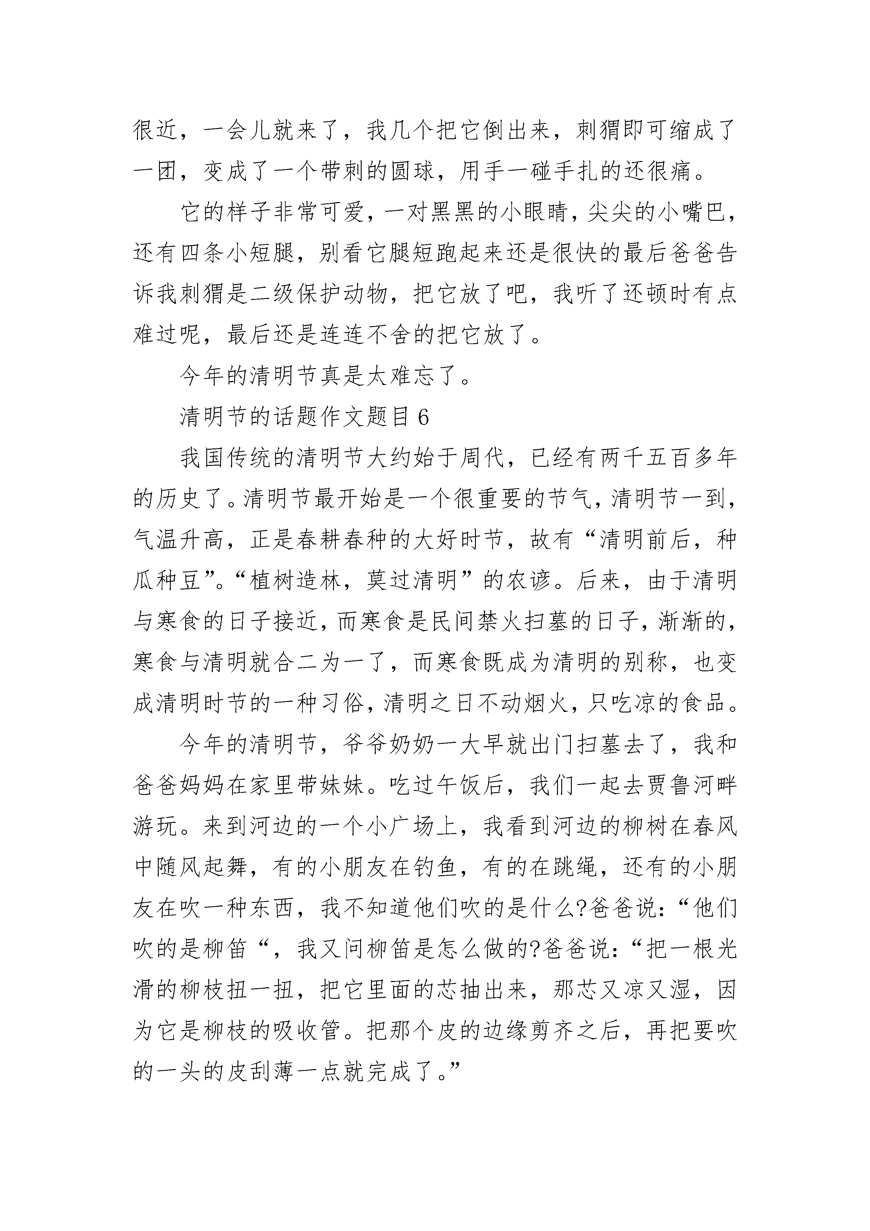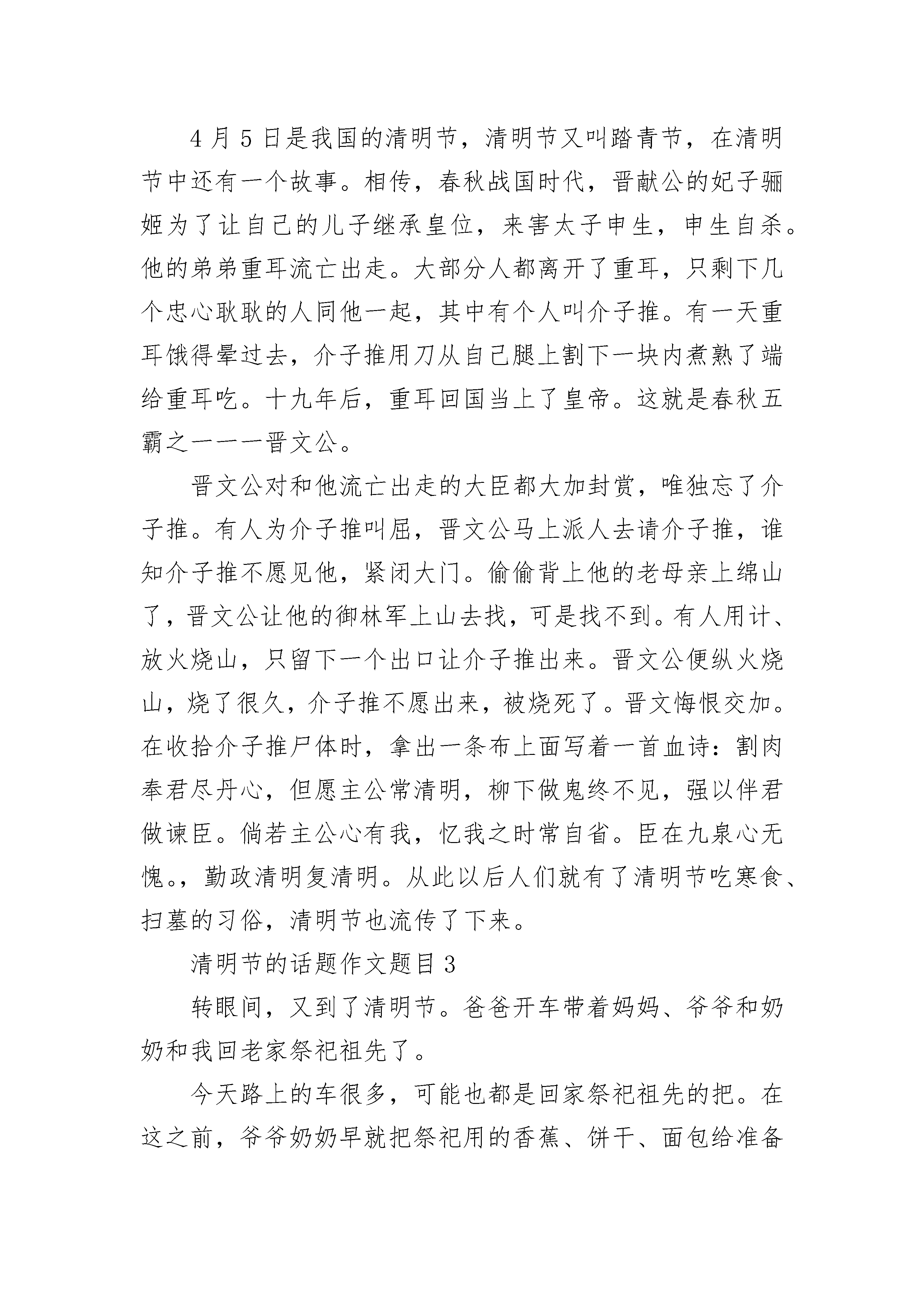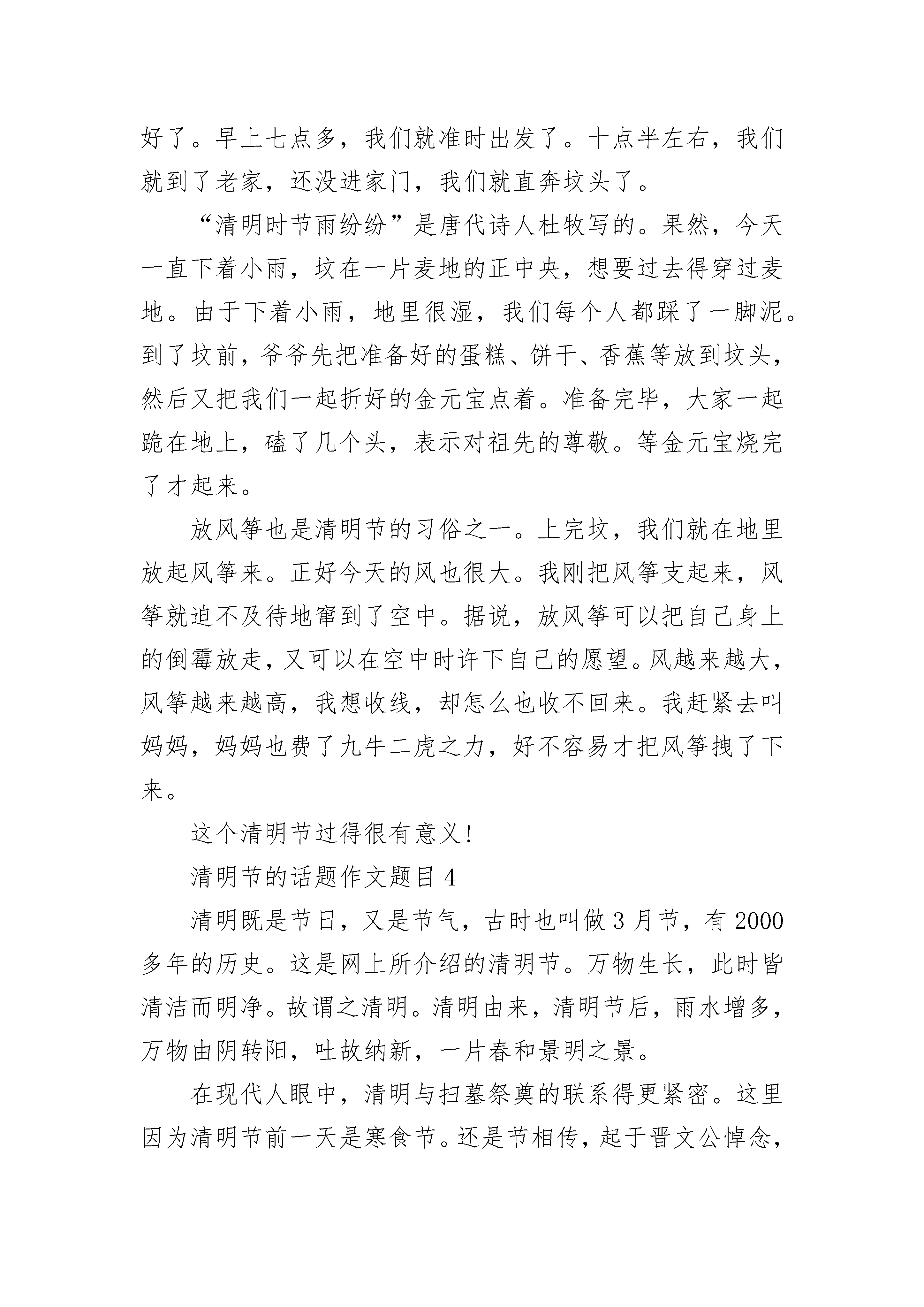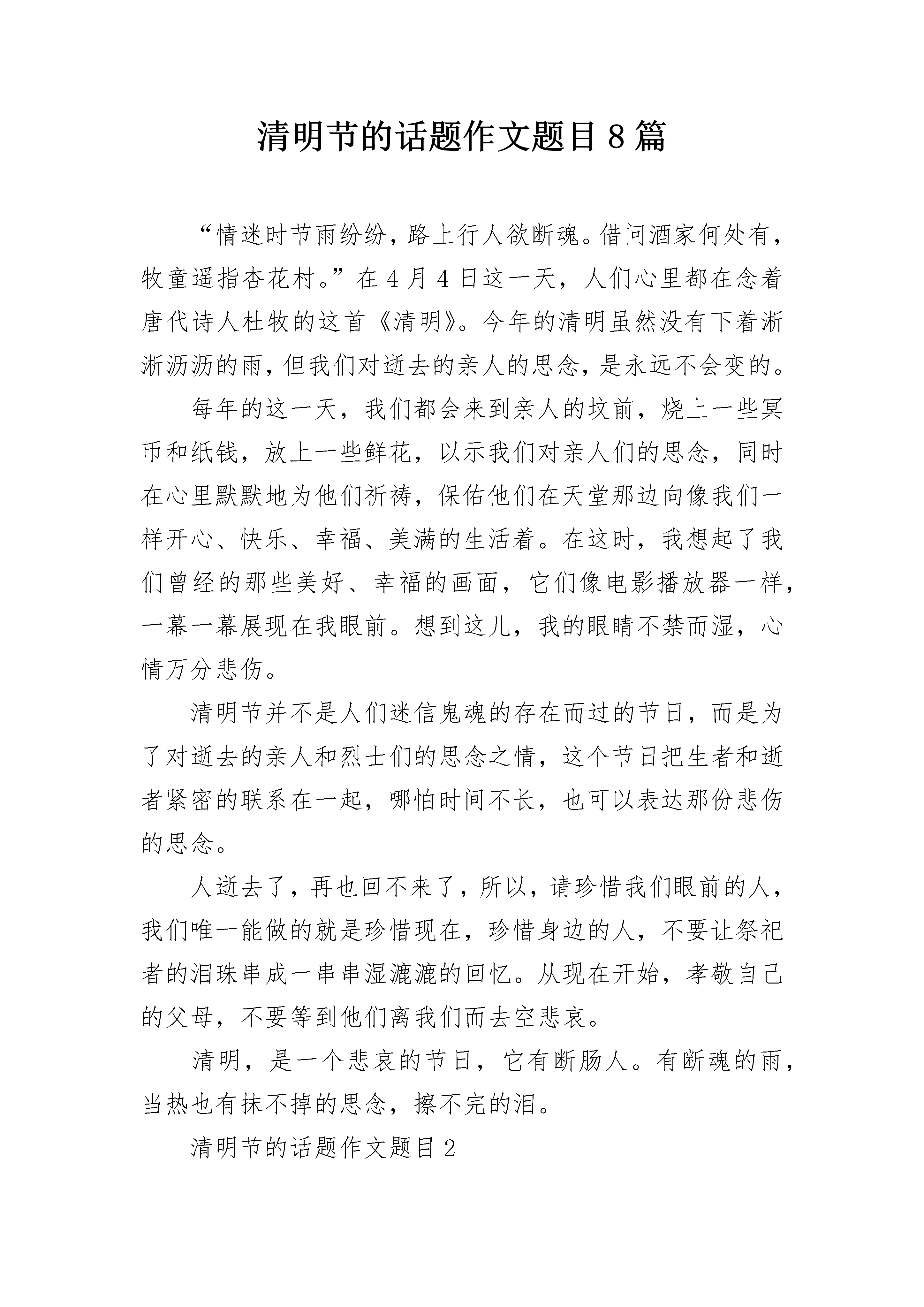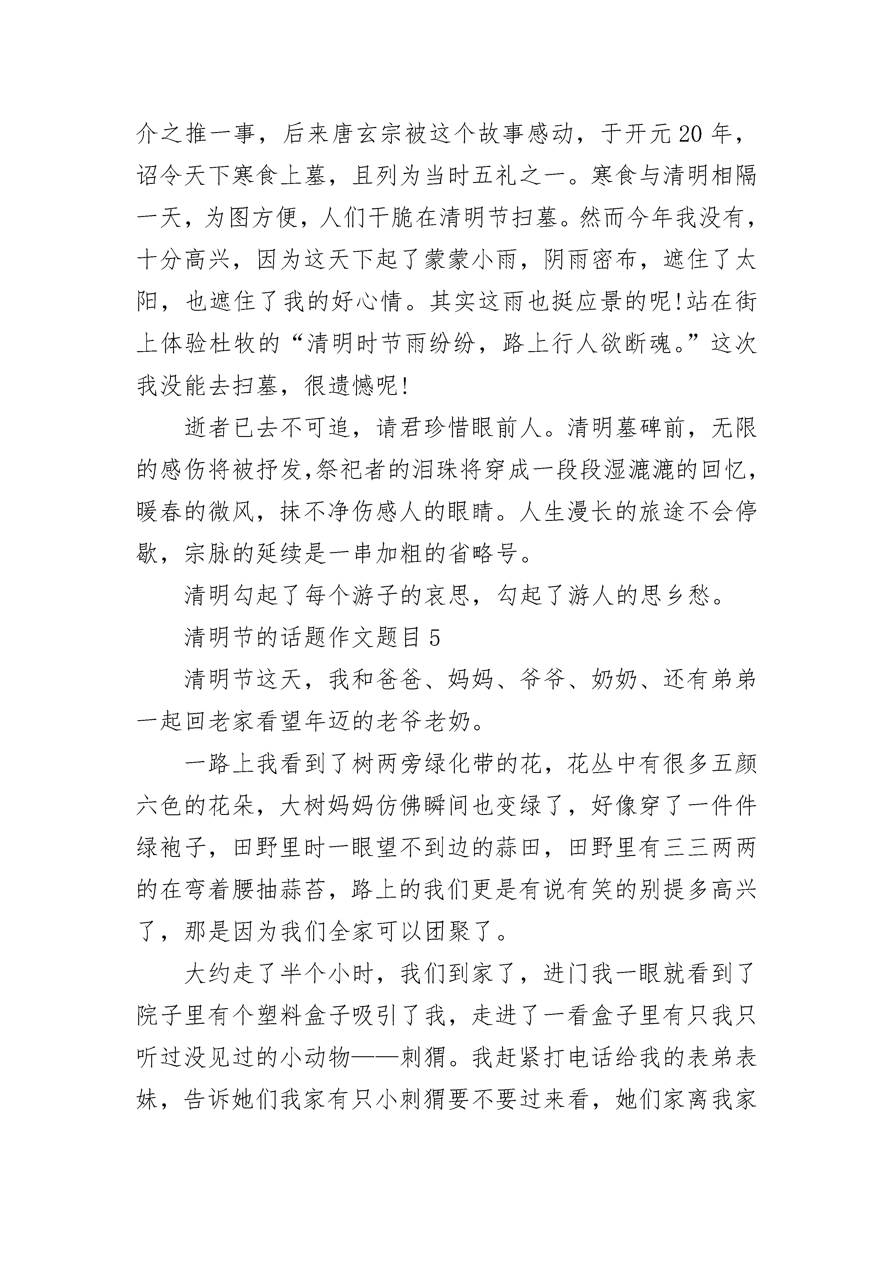 清明节的话题作文题目8篇“情迷时节雨纷纷,路上行人欲断魂。借问酒家何处有,牧童遥指杏花村。”在4月4日这一天,人们心里都在念着唐代诗人杜牧的这首《清明》。今年的清明虽然没有下着淅淅沥沥的雨,但我们对逝去的亲人的思念,是永远不会变的。每年的这一天,我们都会来到亲人的坟前,烧上一些冥币和纸钱,放上一些鲜花,以示我们对亲人们的思念,同时在心里默默地为他们祈祷,保佑他们在天堂那边向像我们一样开心、快乐、幸福、美满的生活着。在这时,我想起了我们曾经的那些美好、幸福的画面,它们像电影播放器一样,一幕一幕展现在我眼前。想到这儿,我的眼睛不禁而湿,心情万分悲伤。清明节并不是人们迷信鬼魂的存在而过的节日,而是为了对逝去的亲人和烈士们的思念之情,这个节日把生者和逝者紧密的联系在一起,哪怕时间不长,也可以表达那份悲伤的思念。人逝去了,再也回不来了,所以,请珍惜我们眼前的人,我们唯一能做的就是珍惜现在,珍惜身边的人,不要让祭祀者的泪珠串成一串串湿漉漉的回忆。从现在开始,孝敬自己的父母,不要等到他们离我们而去空悲哀。清明,是一个悲哀的节日,它有断肠人。有断魂的雨,当热也有抹不掉的思念,擦不完的泪。清明节的话题作文题目24月5日是我国的清明节,清明节又叫踏青节,在清明节中还有一个故事。相传,春秋战国时代,晋献公的妃子骊姬为了让自己的儿子继承皇位,来害太子申生,申生自杀。他的弟弟重耳流亡出走。大部分人都离开了重耳,只剩下几个忠心耿耿的人同他一起,其中有个人叫介子推。有一天重耳饿得晕过去,介子推用刀从自己腿上割下一块内煮熟了端给重耳吃。十九年后,重耳回国当上了皇帝。这就是春秋五霸之一一一晋文公。晋文公对和他流亡出走的大臣都大加封赏,唯独忘了介子推。有人为介子推叫屈,晋文公马上派人去请介子推,谁知介子推不愿见他,紧闭大门。偷偷背上他的老母亲上绵山了,晋文公让他的御林军上山去找,可是找不到。有人用计、放火烧山,只留下一个出口让介子推出来。晋文公便纵火烧山,烧了很久,介子推不愿出来,被烧死了。晋文悔恨交加。在收拾介子推尸体时,拿出一条布上面写着一首血诗:割肉奉君尽丹心,但愿主公常清明,柳下做鬼终不见,强以伴君做谏臣。倘若主公心有我,忆我之时常自省。臣在九泉心无愧。,勤政清明复清明。从此以后人们就有了清明节吃寒食、扫墓的习俗,清明节也流传了下来。清明节的话题作文题目3转眼间,又到了清明节。爸爸开车带着妈妈、爷爷和奶奶和我回老家祭祀祖先了。今天路上的车很多,可能也都是回家祭祀祖先的把。在这之前,爷爷奶奶早就把祭祀用的香蕉、饼干、面包给准备好了。早上七点多,我们就准时出发了。十点半左右,我们就到了老家,还没进家门,我们就直奔坟头了。“清明时节雨纷纷”是唐代诗人杜牧写的。果然,今天一直下着小雨,坟在一片麦地的正中央,想要过去得穿过麦地。由于下着小雨,地里很湿,我们每个人都踩了一脚泥。到了坟前,爷爷先把准备好的蛋糕、饼干、香蕉等放到坟头,然后又把我们一起折好的金元宝点着。准备完毕,大家一起跪在地上,磕了几个头,表示对祖先的尊敬。等金元宝烧完了才起来。放风筝也是清明节的习俗之一。上完坟,我们就在地里放起风筝来。正好今天的风也很大。我刚把风筝支起来,风筝就迫不及待地窜到了空中。据说,放风筝可以把自己身上的倒霉放走,又可以在空中时许下自己的愿望。风越来越大,风筝越来越高,我想收线,却怎么也收不回来。我赶紧去叫妈妈,妈妈也费了九牛二虎之力,好不容易才把风筝拽了下来。这个清明节过得很有意义!清明节的话题作文题目4清明既是节日,又是节气,古时也叫做3月节,有2000多年的历史。这是网上所介绍的清明节。万物生长,此时皆清洁而明净。故谓之清明。清明由来,清明节后,雨水增多,万物由阴转阳,吐故纳新,一片春和景明之景。在现代人眼中,清明与扫墓祭奠的联系得更紧密。这里因为清明节前一天是寒食节。还是节相传,起于晋文公悼念,介之推一事,后来唐玄宗被这个故事感动,于开元20年,诏令天下寒食上墓,且列为当时五礼之一。寒食与清明相隔一天,为图方便,人们干脆在清明节扫墓。然而今年我没有,十分高兴,因为这天下起了蒙蒙小雨,阴雨密布,遮住了太阳,也遮住了我的好心情。其实这雨也挺应景的呢!站在街上体验杜牧的“清明时节雨纷纷,路上行人欲断魂。”这次我没能去扫墓,很遗憾呢!逝者已去不可追,请君珍惜眼前人。清明墓碑前,无限的感伤将被抒发,祭祀者的泪珠将穿成一段段湿漉漉的回忆,暖春的微风,抹不净伤感人的眼睛。人生漫长的旅途不会停歇,宗脉的延续是一串加粗的省略号。清明勾起了每个游子的哀思,勾起了游人的思乡愁。清明节的话题作文题目5清明节这天,我和爸爸、妈妈、爷爷、奶奶、还有弟弟一起回老家看望年迈的老爷老奶。一路上我看到了树两旁绿化带的花,花丛中有很多五颜六色的花朵,大树妈妈仿佛瞬间也变绿了,好像穿了一件件绿袍子,田野里