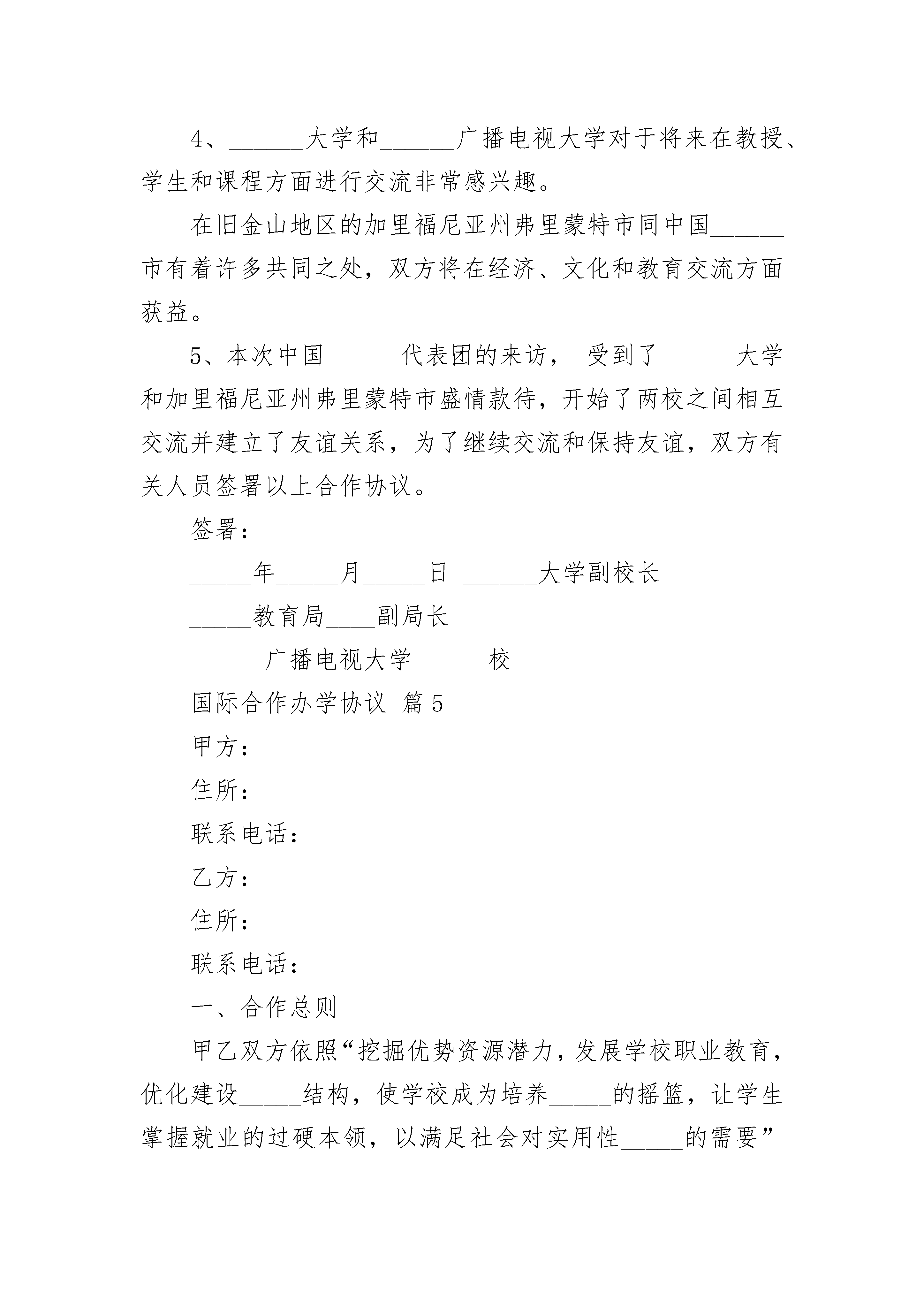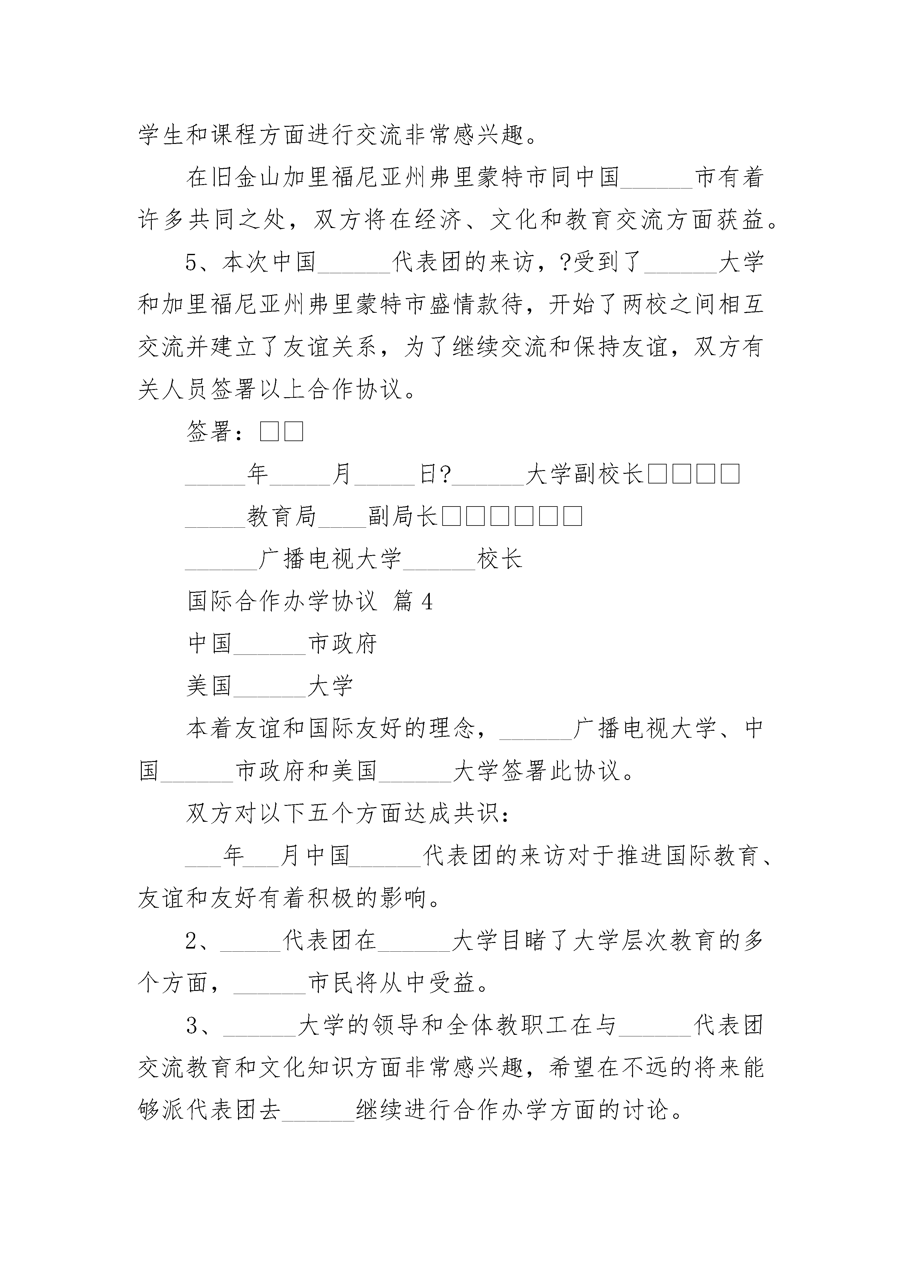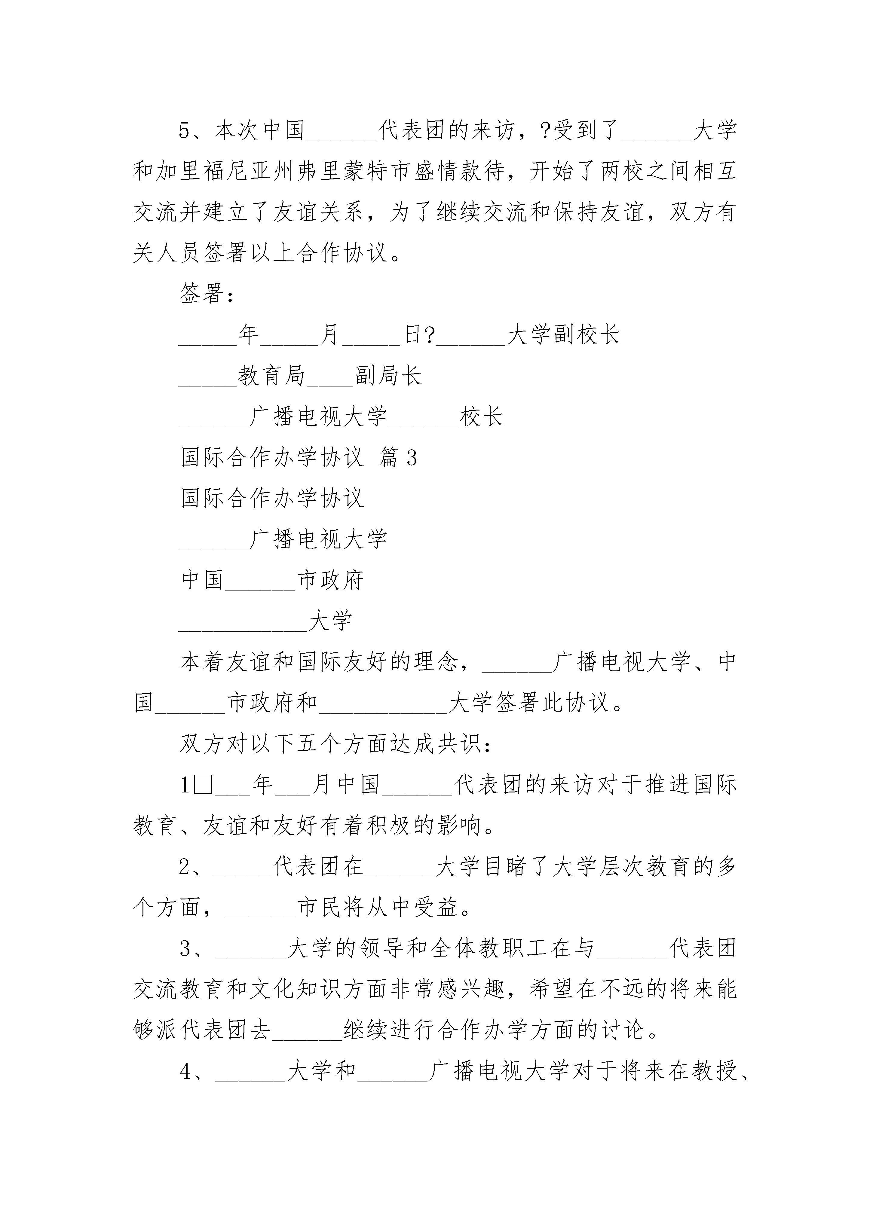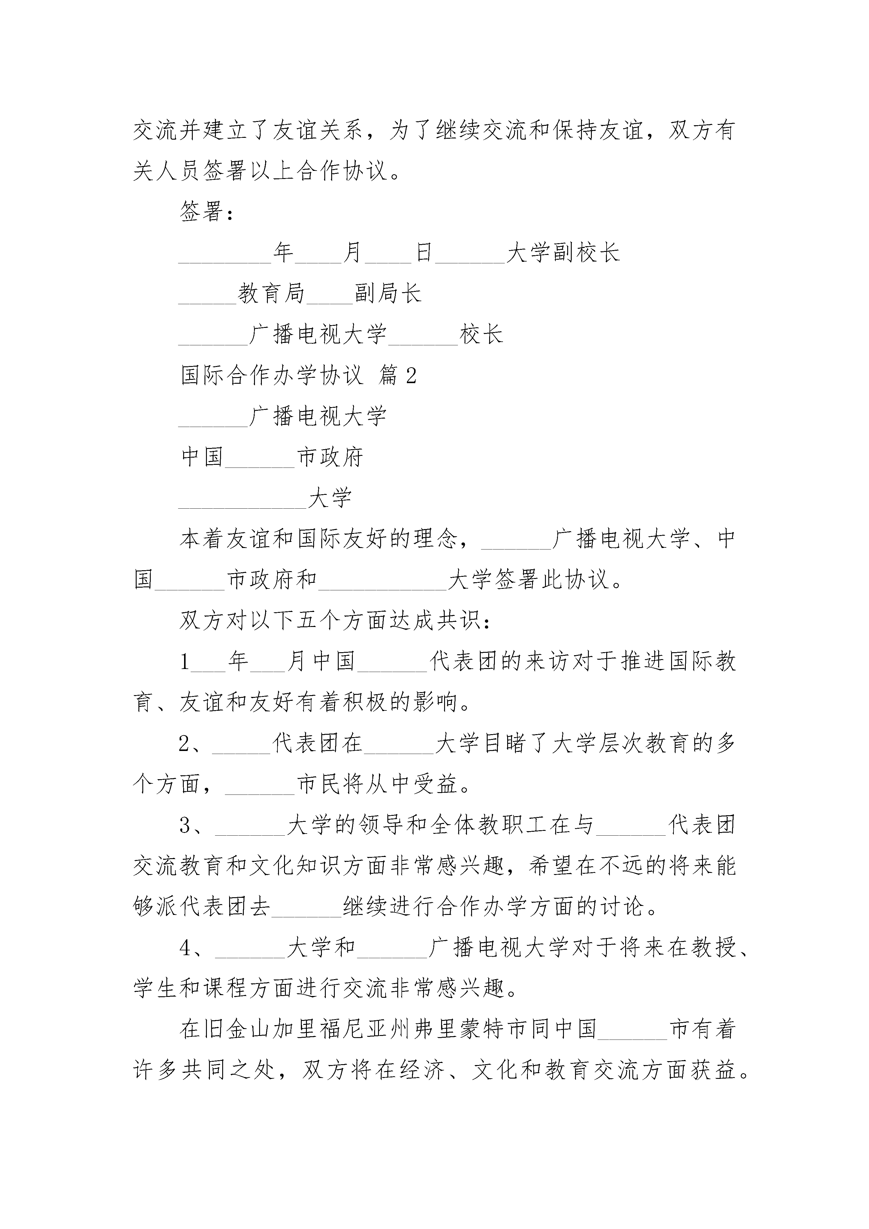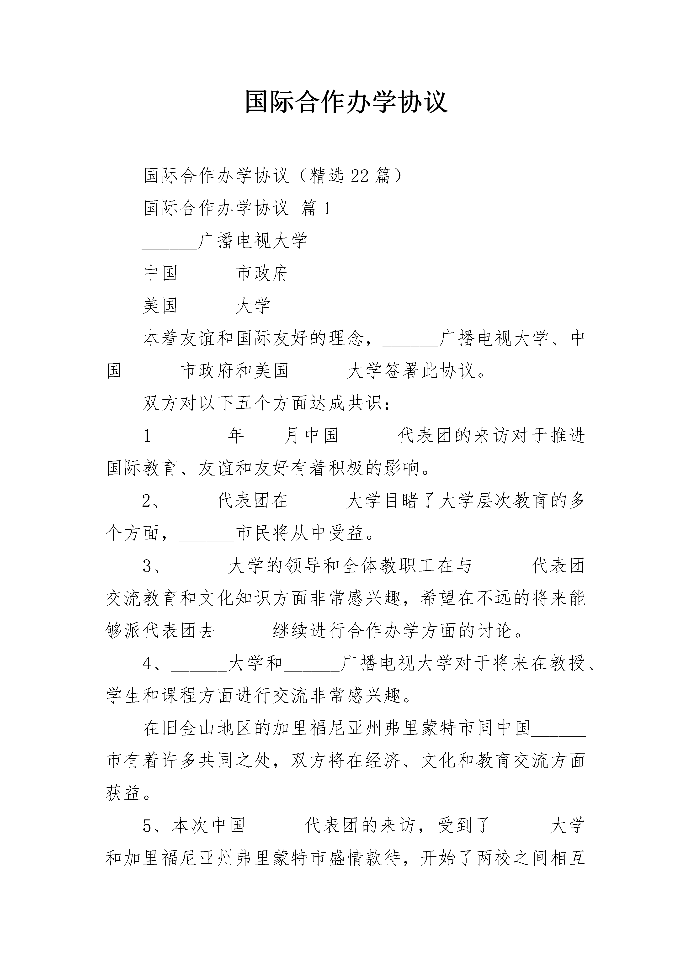 国际合作办学协议国际合作办学协议(精选22篇)国际合作办学协议篇1______广播电视大学中国______市政府美国______大学本着友谊和国际友好的理念,______广播电视大学、中国______市政府和美国______大学签署此协议。双方对以下五个方面达成共识:1________年____月中国______代表团的来访对于推进国际教育、友谊和友好有着积极的影响。2、_____代表团在______大学目睹了大学层次教育的多个方面,______市民将从中受益。3、______大学的领导和全体教职工在与______代表团交流教育和文化知识方面非常感兴趣,希望在不远的将来能够派代表团去______继续进行合作办学方面的讨论。4、______大学和______广播电视大学对于将来在教授、学生和课程方面进行交流非常感兴趣。在旧金山地区的加里福尼亚州弗里蒙特市同中国______市有着许多共同之处,双方将在经济、文化和教育交流方面获益。5、本次中国______代表团的来访,受到了______大学和加里福尼亚州弗里蒙特市盛情款待,开始了两校之间相互交流并建立了友谊关系,为了继续交流和保持友谊,双方有关人员签署以上合作协议。签署:________年____月____日______大学副校长_____教育局____副局长______广播电视大学______校长国际合作办学协议篇2______广播电视大学中国______市政府___________大学本着友谊和国际友好的理念,______广播电视大学、中国______市政府和___________大学签署此协议。双方对以下五个方面达成共识:1___年___月中国______代表团的来访对于推进国际教育、友谊和友好有着积极的影响。2、_____代表团在______大学目睹了大学层次教育的多个方面,______市民将从中受益。3、______大学的领导和全体教职工在与______代表团交流教育和文化知识方面非常感兴趣,希望在不远的将来能够派代表团去______继续进行合作办学方面的讨论。4、______大学和______广播电视大学对于将来在教授、学生和课程方面进行交流非常感兴趣。在旧金山加里福尼亚州弗里蒙特市同中国______市有着许多共同之处,双方将在经济、文化和教育交流方面获益。5、本次中国______代表团的来访,?受到了______大学和加里福尼亚州弗里蒙特市盛情款待,开始了两校之间相互交流并建立了友谊关系,为了继续交流和保持友谊,双方有关人员签署以上合作协议。签署:_____年_____月_____日?______大学副校长_____教育局____副局长______广播电视大学______校长国际合作办学协议篇3国际合作办学协议______广播电视大学中国______市政府___________大学本着友谊和国际友好的理念,______广播电视大学、中国______市政府和___________大学签署此协议。双方对以下五个方面达成共识:1___年___月中国______代表团的来访对于推进国际教育、友谊和友好有着积极的影响。2、_____代表团在______大学目睹了大学层次教育的多个方面,______市民将从中受益。3、______大学的领导和全体教职工在与______代表团交流教育和文化知识方面非常感兴趣,希望在不远的将来能够派代表团去______继续进行合作办学方面的讨论。4、______大学和______广播电视大学对于将来在教授、学生和课程方面进行交流非常感兴趣。在旧金山加里福尼亚州弗里蒙特市同中国______市有着许多共同之处,双方将在经济、文化和教育交流方面获益。5、本次中国______代表团的来访,?受到了______大学和加里福尼亚州弗里蒙特市盛情款待,开始了两校之间相互交流并建立了友谊关系,为了继续交流和保持友谊,双方有关人员签署以上合作协议。签署:_____年_____月_____日?______大学副校长_____教育局____副局长______广播电视大学______校长国际合作办学协议篇4中国______市政府美国______大学本着友谊和国际友好的理念,______广播电视大学、中国______市政府和美国______大学签署此协议。双方对以下五个方面达成共识:___年___月中国______代表团的来访对于推进国际教育、友谊和友好有着积极的影响。2、_____代表团在______大学目睹了大学层次教育的多个方面,______市民将从中受益。3、______大学的领导和全体教职工在与______代表团交流教育和文化知识方面非常感兴趣,希望在不远的将来能够派代表团去______继续进行合作办学方面的讨论。4、______大学和