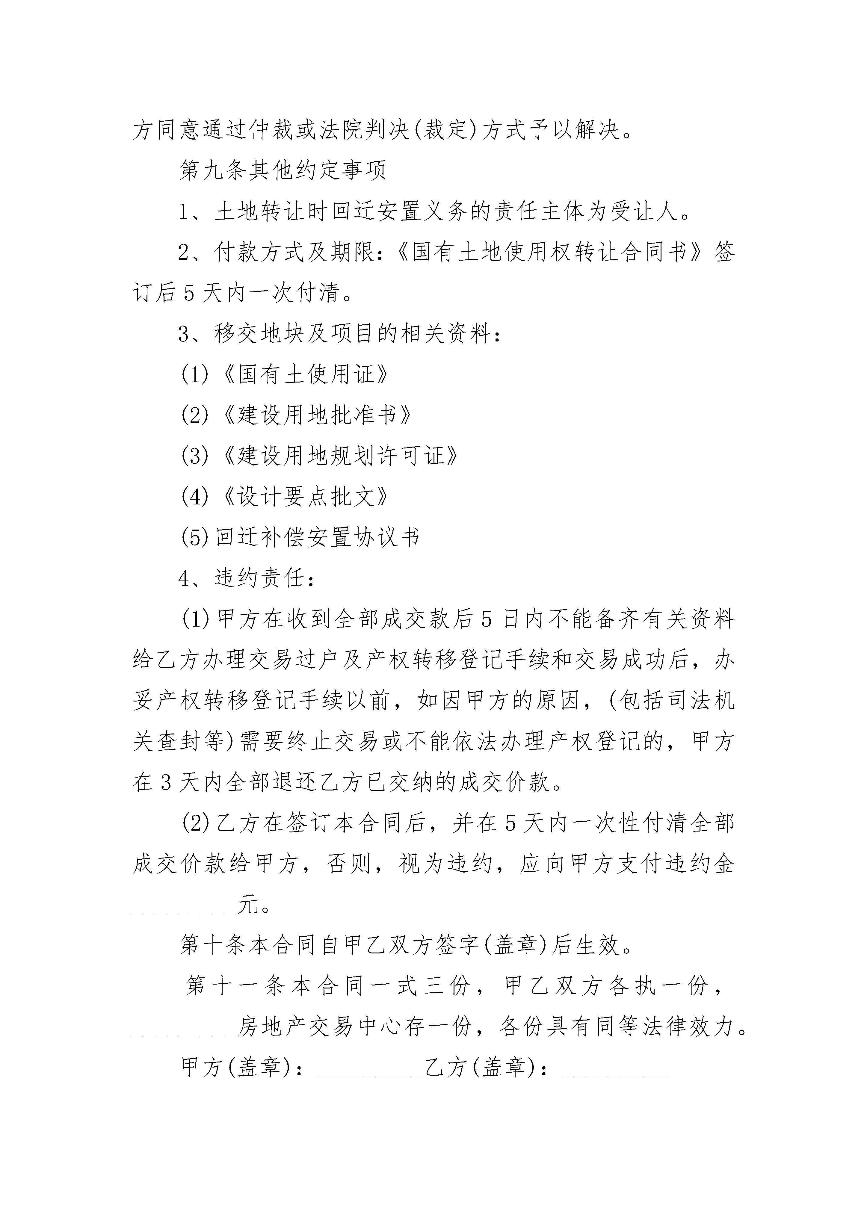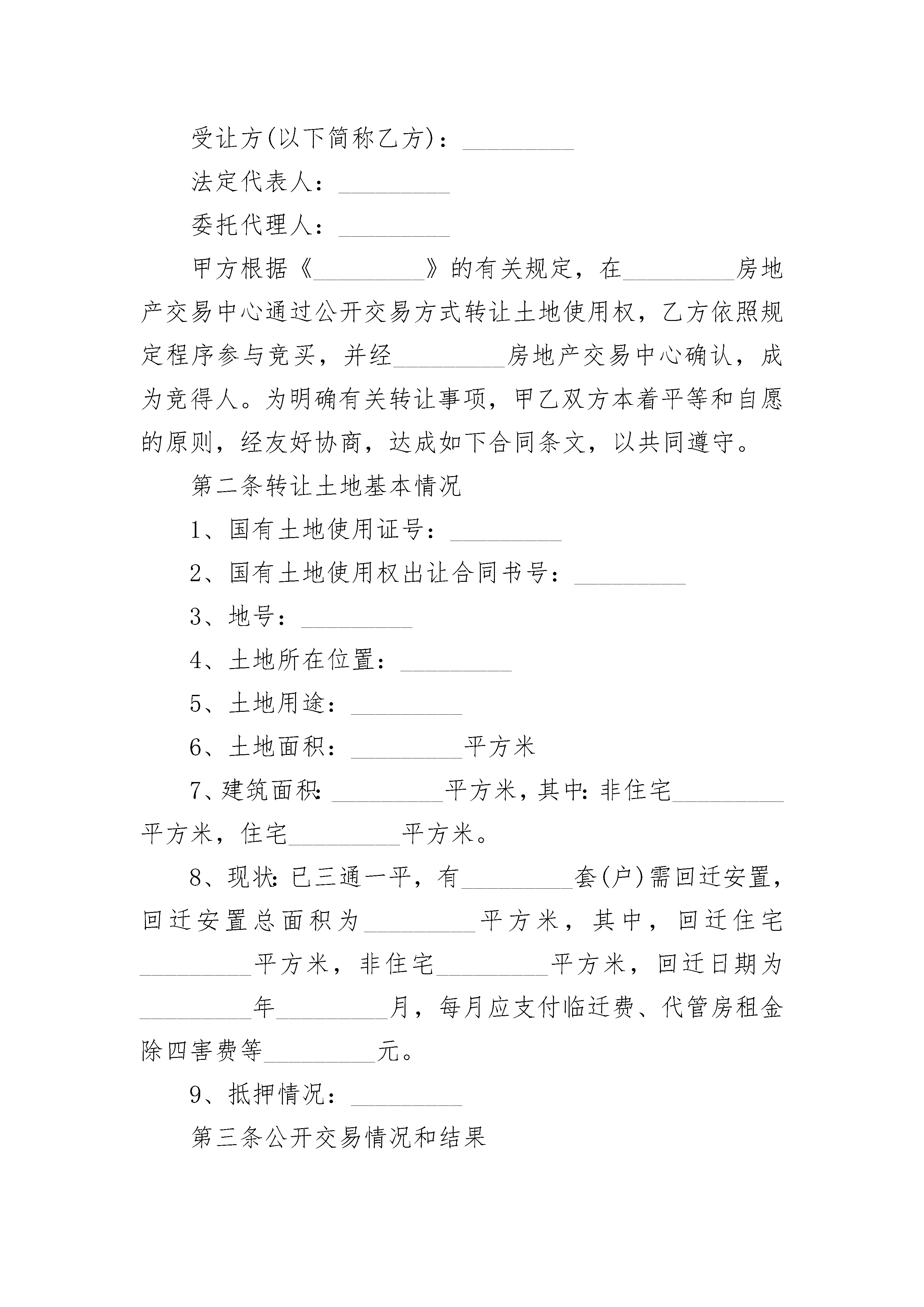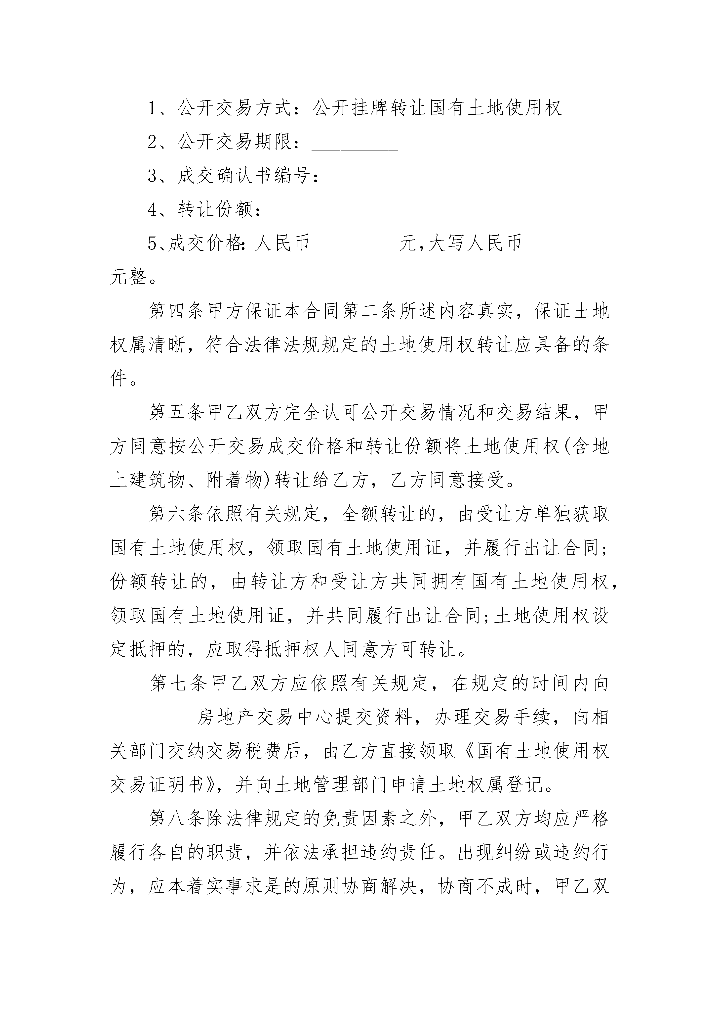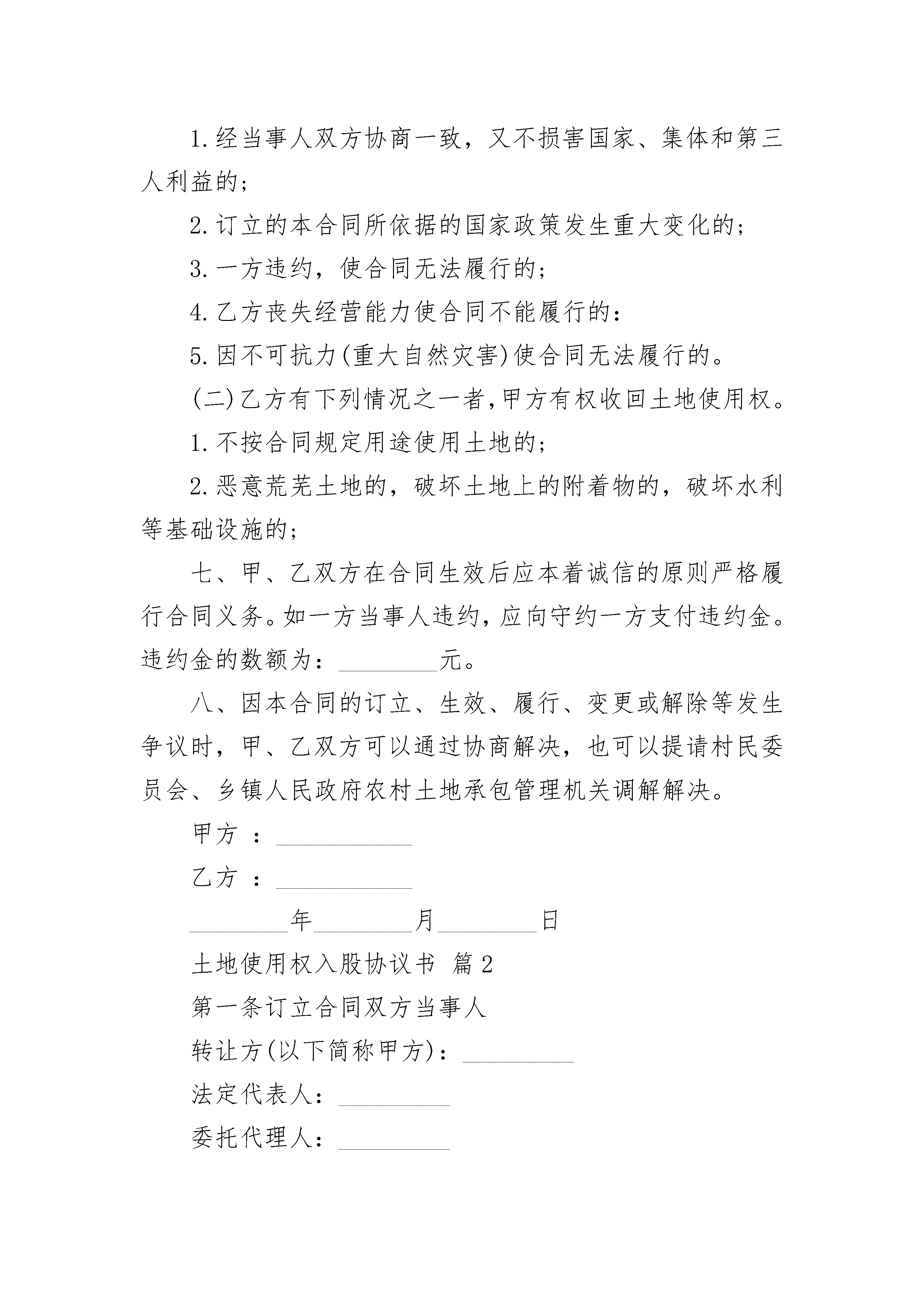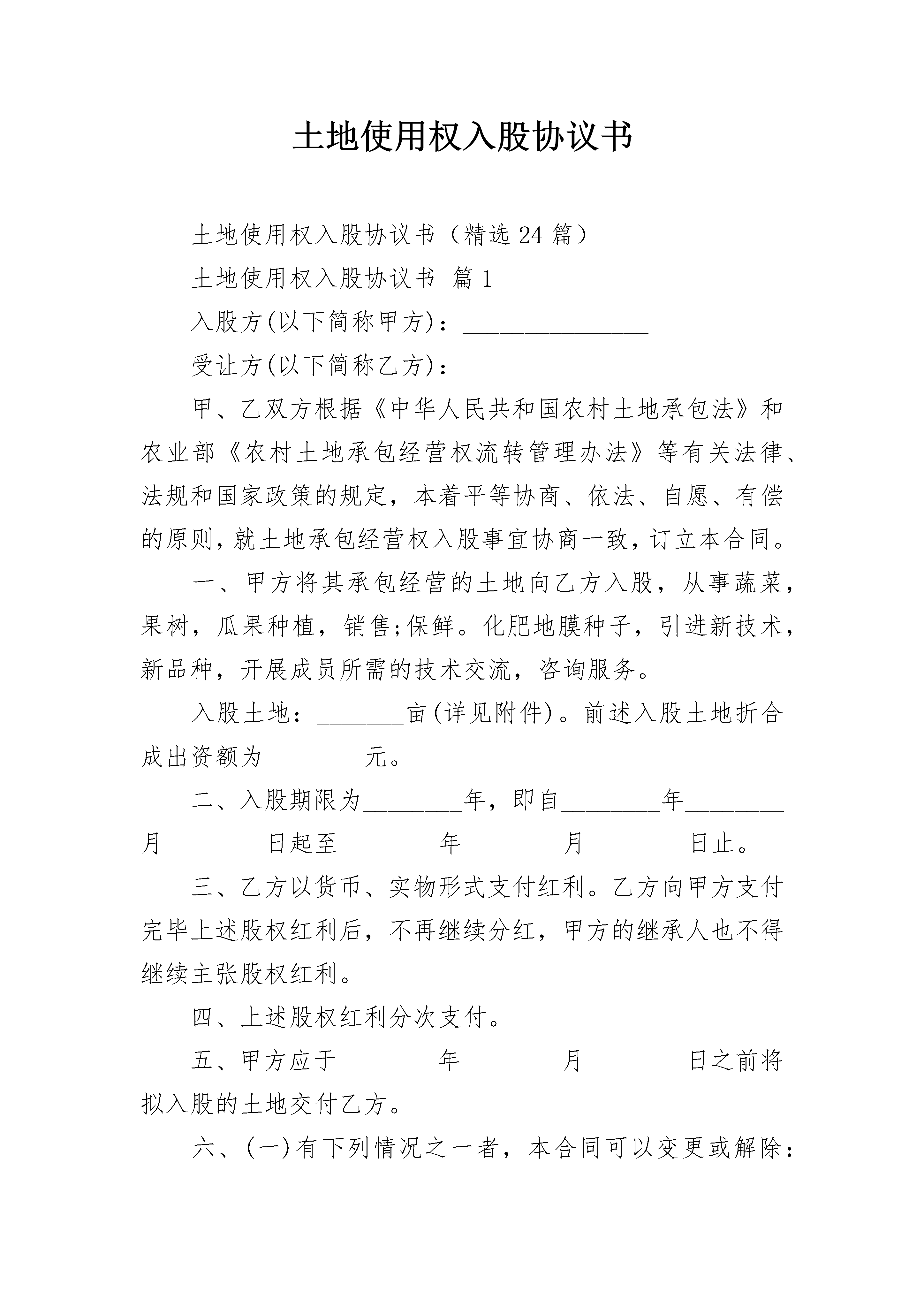 土地使用权入股协议书土地使用权入股协议书(精选24篇)土地使用权入股协议书篇1入股方(以下简称甲方):_______________受让方(以下简称乙方):_______________甲、乙双方根据《中华人民共和国农村土地承包法》和农业部《农村土地承包经营权流转管理办法》等有关法律、法规和国家政策的规定,本着平等协商、依法、自愿、有偿的原则,就土地承包经营权入股事宜协商一致,订立本合同。一、甲方将其承包经营的土地向乙方入股,从事蔬菜,果树,瓜果种植,销售;保鲜。化肥地膜种子,引进新技术,新品种,开展成员所需的技术交流,咨询服务。入股土地:_______亩(详见附件)。前述入股土地折合成出资额为________元。二、入股期限为________年,即自________年________月________日起至________年________月________日止。三、乙方以货币、实物形式支付红利。乙方向甲方支付完毕上述股权红利后,不再继续分红,甲方的继承人也不得继续主张股权红利。四、上述股权红利分次支付。五、甲方应于________年________月________日之前将拟入股的土地交付乙方。六、(一)有下列情况之一者,本合同可以变更或解除:1.经当事人双方协商一致,又不损害国家、集体和第三人利益的;2.订立的本合同所依据的国家政策发生重大变化的;3.一方违约,使合同无法履行的;4.乙方丧失经营能力使合同不能履行的:5.因不可抗力(重大自然灾害)使合同无法履行的。(二)乙方有下列情况之一者,甲方有权收回土地使用权。1.不按合同规定用途使用土地的;2.恶意荒芜土地的,破坏土地上的附着物的,破坏水利等基础设施的;七、甲、乙双方在合同生效后应本着诚信的原则严格履行合同义务。如一方当事人违约,应向守约一方支付违约金。违约金的数额为:________元。八、因本合同的订立、生效、履行、变更或解除等发生争议时,甲、乙双方可以通过协商解决,也可以提请村民委员会、乡镇人民政府农村土地承包管理机关调解解决。甲方:___________乙方:___________________年________月________日土地使用权入股协议书篇2第一条订立合同双方当事人转让方(以下简称甲方):_________法定代表人:_________委托代理人:_________受让方(以下简称乙方):_________法定代表人:_________委托代理人:_________甲方根据《_________》的有关规定,在_________房地产交易中心通过公开交易方式转让土地使用权,乙方依照规定程序参与竞买,并经_________房地产交易中心确认,成为竞得人。为明确有关转让事项,甲乙双方本着平等和自愿的原则,经友好协商,达成如下合同条文,以共同遵守。第二条转让土地基本情况1、国有土地使用证号:_________2、国有土地使用权出让合同书号:_________3、地号:_________4、土地所在位置:_________5、土地用途:_________6、土地面积:_________平方米7、建筑面积:_________平方米,其中:非住宅_________平方米,住宅_________平方米。8、现状:已三通一平,有_________套(户)需回迁安置,回迁安置总面积为_________平方米,其中,回迁住宅_________平方米,非住宅_________平方米,回迁日期为_________年_________月,每月应支付临迁费、代管房租金除四害费等_________元。9、抵押情况:_________第三条公开交易情况和结果1、公开交易方式:公开挂牌转让国有土地使用权2、公开交易期限:_________3、成交确认书编号:_________4、转让份额:_________5、成交价格:人民币_________元,大写人民币_________元整。第四条甲方保证本合同第二条所述内容真实,保证土地权属清晰,符合法律法规规定的土地使用权转让应具备的条件。第五条甲乙双方完全认可公开交易情况和交易结果,甲方同意按公开交易成交价格和转让份额将土地使用权(含地上建筑物、附着物)转让给乙方,乙方同意接受。第六条依照有关规定,全额转让的,由受让方单独获取国有土地使用权,领取国有土地使用证,并履行出让合同;份额转让的,由转让方和受让方共同拥有国有土地使用权,领取国有土地使用证,并共同履行出让合同;土地使用权设定抵押的,应取得抵押权人同意方可转让。第七条甲乙双方应依照有关规定,在规定的时间内向_________房地产交易中心提交资料,办理交易手续,向相关部门交纳交易税费后,由乙方直接领取《国有土地使用权交易证明书》,并向土地管理部门申请土地权属登记。第八条除法
