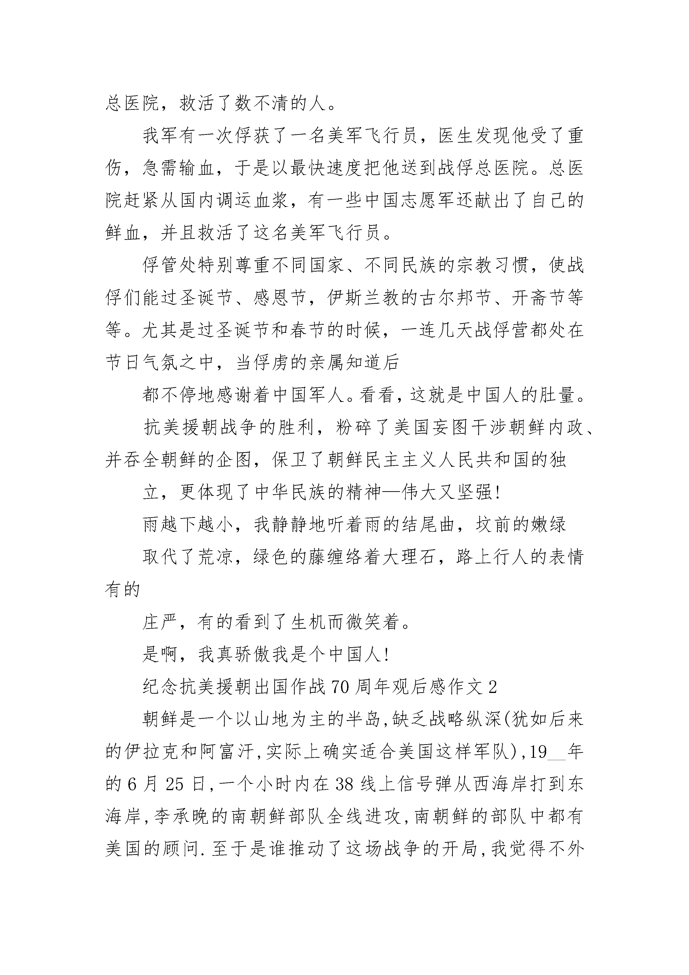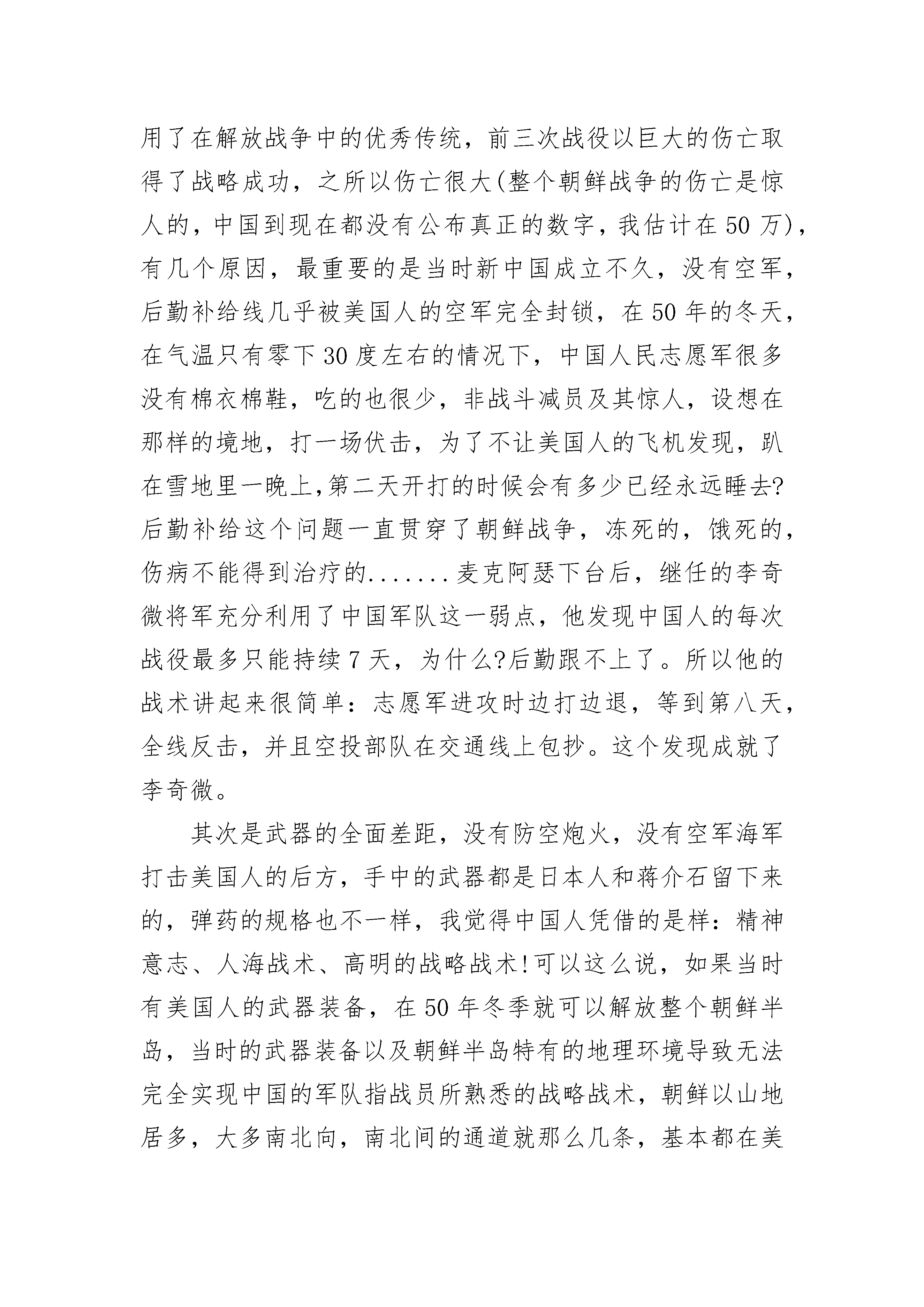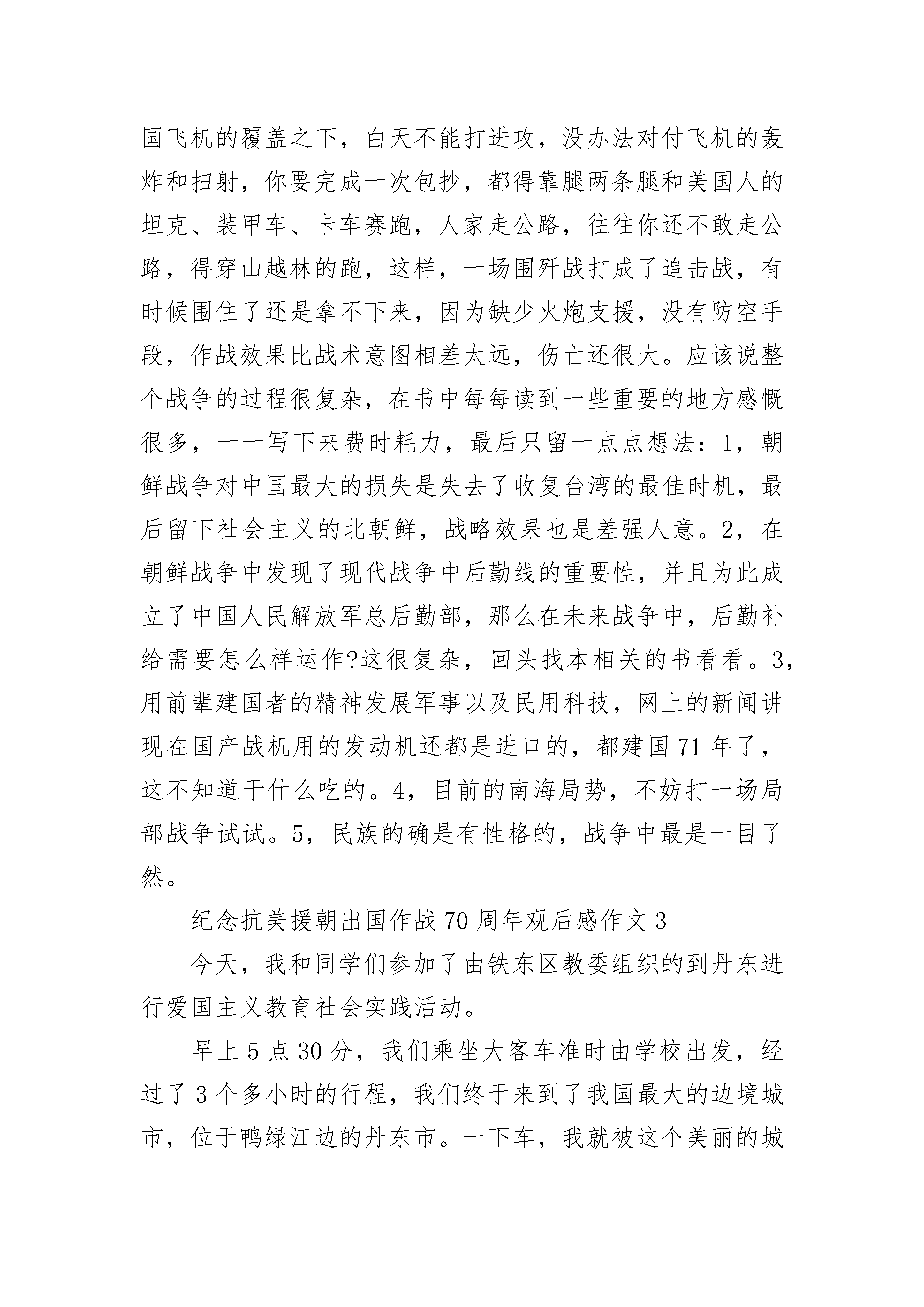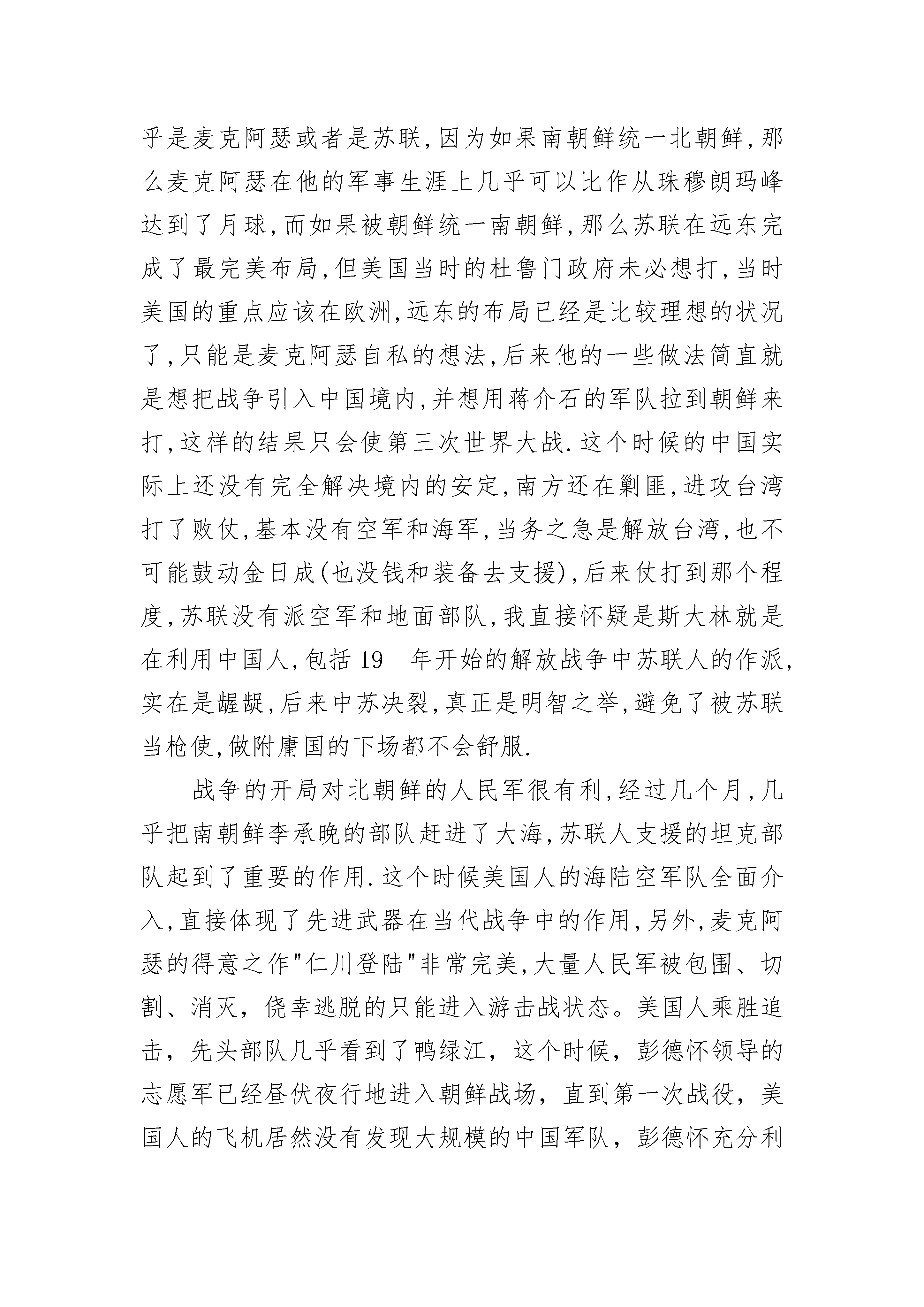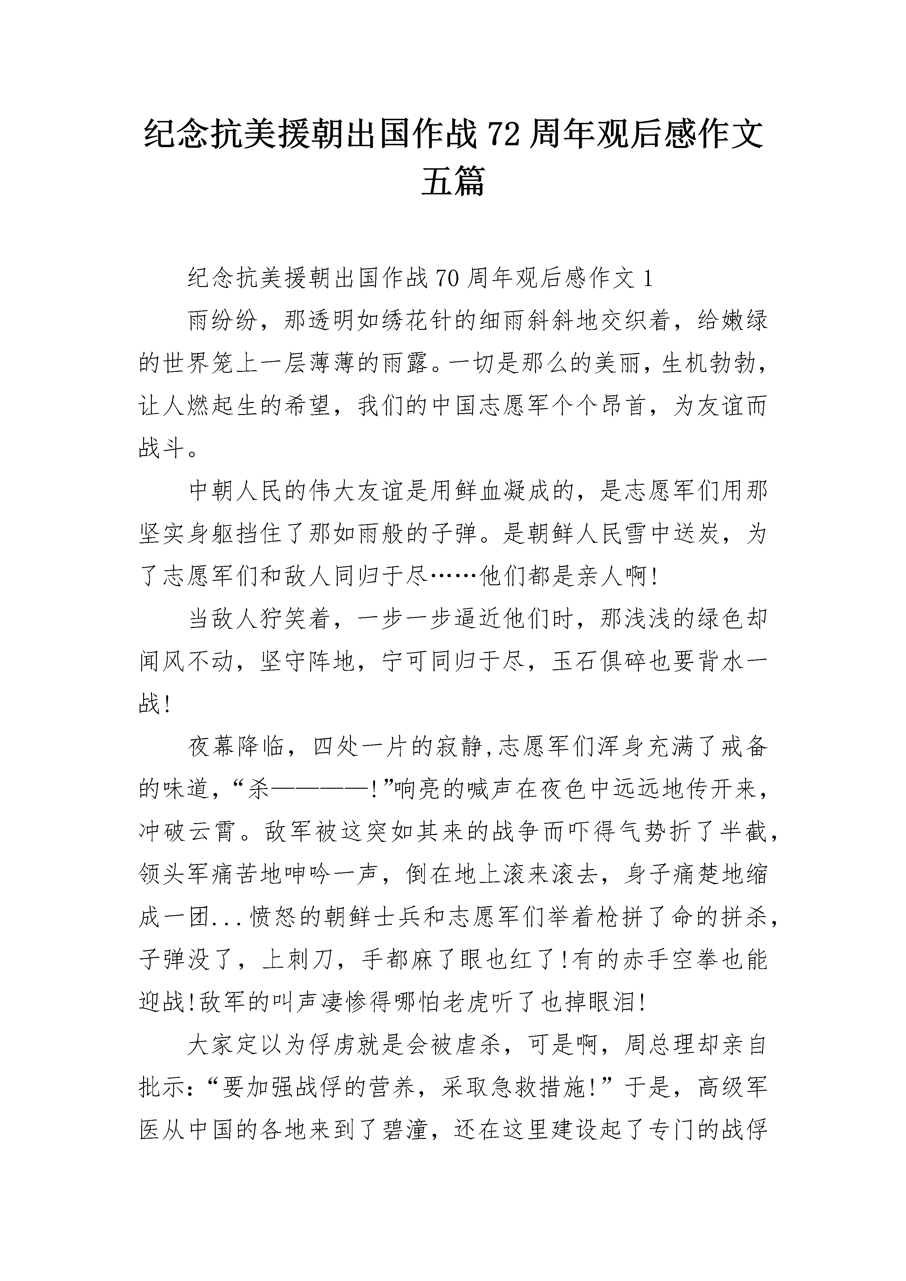 纪念抗美援朝出国作战72周年观后感作文五篇纪念抗美援朝出国作战70周年观后感作文1雨纷纷,那透明如绣花针的细雨斜斜地交织着,给嫩绿的世界笼上一层薄薄的雨露。一切是那么的美丽,生机勃勃,让人燃起生的希望,我们的中国志愿军个个昂首,为友谊而战斗。中朝人民的伟大友谊是用鲜血凝成的,是志愿军们用那坚实身躯挡住了那如雨般的子弹。是朝鲜人民雪中送炭,为了志愿军们和敌人同归于尽……他们都是亲人啊!当敌人狞笑着,一步一步逼近他们时,那浅浅的绿色却闻风不动,坚守阵地,宁可同归于尽,玉石俱碎也要背水一战!夜幕降临,四处一片的寂静,志愿军们浑身充满了戒备的味道,“杀————!”响亮的喊声在夜色中远远地传开来,冲破云霄。敌军被这突如其来的战争而吓得气势折了半截,领头军痛苦地呻吟一声,倒在地上滚来滚去,身子痛楚地缩成一团...愤怒的朝鲜士兵和志愿军们举着枪拼了命的拼杀,子弹没了,上刺刀,手都麻了眼也红了!有的赤手空拳也能迎战!敌军的叫声凄惨得哪怕老虎听了也掉眼泪!大家定以为俘虏就是会被虐杀,可是啊,周总理却亲自批示:“要加强战俘的营养,采取急救措施!”于是,高级军医从中国的各地来到了碧潼,还在这里建设起了专门的战俘总医院,救活了数不清的人。我军有一次俘获了一名美军飞行员,医生发现他受了重伤,急需输血,于是以最快速度把他送到战俘总医院。总医院赶紧从国内调运血浆,有一些中国志愿军还献出了自己的鲜血,并且救活了这名美军飞行员。俘管处特别尊重不同国家、不同民族的宗教习惯,使战俘们能过圣诞节、感恩节,伊斯兰教的古尔邦节、开斋节等等。尤其是过圣诞节和春节的时候,一连几天战俘营都处在节日气氛之中,当俘虏的亲属知道后都不停地感谢着中国军人。看看,这就是中国人的肚量。抗美援朝战争的胜利,粉碎了美国妄图干涉朝鲜内政、并吞全朝鲜的企图,保卫了朝鲜民主主义人民共和国的独立,更体现了中华民族的精神—伟大又坚强!雨越下越小,我静静地听着雨的结尾曲,坟前的嫩绿取代了荒凉,绿色的藤缠络着大理石,路上行人的表情有的庄严,有的看到了生机而微笑着。是啊,我真骄傲我是个中国人!纪念抗美援朝出国作战70周年观后感作文2朝鲜是一个以山地为主的半岛,缺乏战略纵深(犹如后来的伊拉克和阿富汗,实际上确实适合美国这样军队),19__年的6月25日,一个小时内在38线上信号弹从西海岸打到东海岸,李承晚的南朝鲜部队全线进攻,南朝鲜的部队中都有美国的顾问.至于是谁推动了这场战争的开局,我觉得不外乎是麦克阿瑟或者是苏联,因为如果南朝鲜统一北朝鲜,那么麦克阿瑟在他的军事生涯上几乎可以比作从珠穆朗玛峰达到了月球,而如果被朝鲜统一南朝鲜,那么苏联在远东完成了最完美布局,但美国当时的杜鲁门政府未必想打,当时美国的重点应该在欧洲,远东的布局已经是比较理想的状况了,只能是麦克阿瑟自私的想法,后来他的一些做法简直就是想把战争引入中国境内,并想用蒋介石的军队拉到朝鲜来打,这样的结果只会使第三次世界大战.这个时候的中国实际上还没有完全解决境内的安定,南方还在剿匪,进攻台湾打了败仗,基本没有空军和海军,当务之急是解放台湾,也不可能鼓动金日成(也没钱和装备去支援),后来仗打到那个程度,苏联没有派空军和地面部队,我直接怀疑是斯大林就是在利用中国人,包括19__年开始的解放战争中苏联人的作派,实在是龌龊,后来中苏决裂,真正是明智之举,避免了被苏联当枪使,做附庸国的下场都不会舒服.战争的开局对北朝鲜的人民军很有利,经过几个月,几乎把南朝鲜李承晚的部队赶进了大海,苏联人支援的坦克部队起到了重要的作用.这个时候美国人的海陆空军队全面介入,直接体现了先进武器在当代战争中的作用,另外,麦克阿瑟的得意之作"仁川登陆"非常完美,大量人民军被包围、切割、消灭,侥幸逃脱的只能进入游击战状态。美国人乘胜追击,先头部队几乎看到了鸭绿江,这个时候,彭德怀领导的志愿军已经昼伏夜行地进入朝鲜战场,直到第一次战役,美国人的飞机居然没有发现大规模的中国军队,彭德怀充分利用了在解放战争中的优秀传统,前三次战役以巨大的伤亡取得了战略成功,之所以伤亡很大(整个朝鲜战争的伤亡是惊人的,中国到现在都没有公布真正的数字,我估计在50万),有几个原因,最重要的是当时新中国成立不久,没有空军,后勤补给线几乎被美国人的空军完全封锁,在50年的冬天,在气温只有零下30度左右的情况下,中国人民志愿军很多没有棉衣棉鞋,吃的也很少,非战斗减员及其惊人,设想在那样的境地,打一场伏击,为了不让美国人的飞机发现,趴在雪地里一晚上,第二天开打的时候会有多少已经永远睡去?后勤补给这个问题一直贯穿了朝鲜战争,冻死的,饿死的,伤病不能得到治疗的.......麦克阿瑟下台后,继任的李奇微将军充分利用了中国军队这一弱点,他发现中国人的每次战役最多只能持续7天,为什么?后勤跟不上了。所以他的战术讲起来很简单: