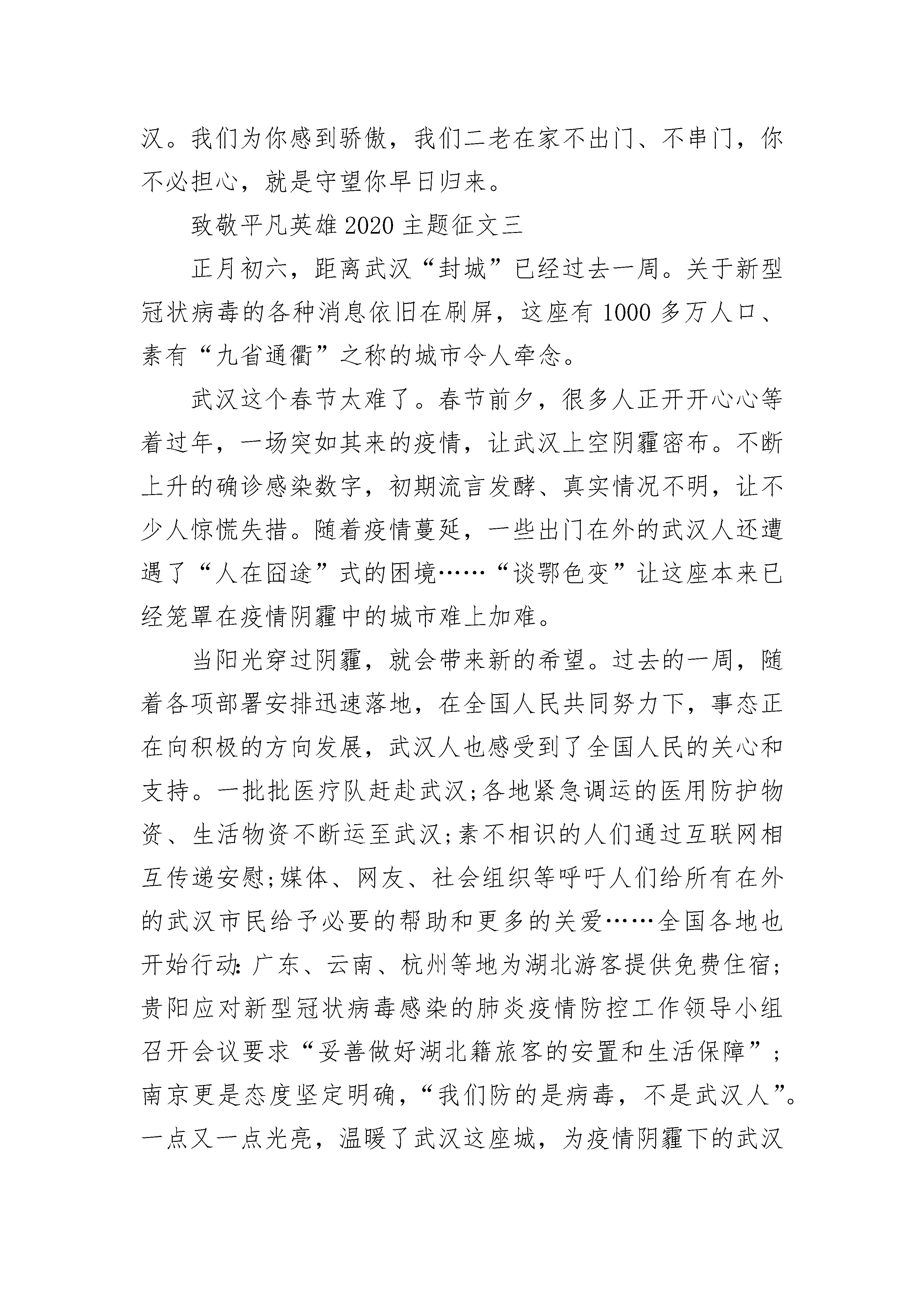 致敬平凡英雄2023主题征文范文五篇致敬平凡英雄2020主题征文一“国家之使命,不容辜负,我等你回来!”1月27日,正月初三,妻子白钰的这条微信朋友圈,让刚到武汉的邢正涛格外暖心。“定不负使命不负卿。”邢正涛说,“在这一刻,大家与小家,紧紧连在了一起。”同为首都医科大学宣武医院急诊科护士,1988年出生的邢正涛与1992年出生的白钰,因医结缘,因疫暂别。“正月初二得知要组建医疗队支援武汉,大家都报了名,穿上这身白衣,就意味着使命与担当。”邢正涛说,“我爱人也报了名,但最后不在名单上,她为此还闹了脾气。”在第一批支援武汉的北京医疗队136名队员中,男性护士只有16人,邢正涛正是其中之一。武汉协和医院西院区,是邢正涛新的战斗岗位。“医疗队分成11个组,每4小时一班。”邢正涛说,“大家都会提前半个小时到,穿好防护服,整理需要带进隔离病房的各种必需品。”“正常的治疗和生活护理要胆大,敢于向前;病人的情绪变化和心理情况要心细,随时掌握。”邢正涛说,住进隔离病房的患者,经常会产生焦虑情绪,进行心理治疗同样非常重要,“比如通过聊天,给他们加油鼓劲,或者给他们比划加油手势,但都要因人而异,注意时机、方式,尽量不刻意。”“一定要做好防护,千万别大意。”每天,身在北京的白钰都会叮嘱丈夫,“他刚到武汉的时候,我担心得很,整夜睡不着,后来看到各种防护措施都做到了位,便放心多了。”“战胜疫情,挽救生命”,这是夫妻二人共同的心愿,也是所有医务工作者的职责与使命。邢正涛出征武汉后,白钰轮岗到医院急诊大厅分诊台工作。测体温、量血压、了解病情、辅助分诊……丈夫邢正涛也是千叮万嘱,“急诊病人接触的第一位医护人员就是你,一定要做好防护。”互相打气,共同抗疫。第一次进隔离病房前,邢正涛特意请同事将妻子与他的名字并排写在了防护服上,同时写上了大大的“我爱你”三个字。“这是我们最浪漫的战地情书。”邢正涛说,夫妻俩虽身处两地,但一直并肩战斗。每当坐上班车,不论前往隔离病房,还是返回驻地,短短10分钟的车程,第一次来武汉的邢正涛,总是对着窗外看个不停。“我觉得武汉真的很美。”他说,“等胜利了,我一定带着白钰来看樱花,吃热干面。”虽然因疫暂别,但白钰与丈夫心意相通,“等疫情散去,我们一起去武汉。”致敬平凡英雄2020主题征文二目前,新冠肺炎重症人数占确诊人数的比例不断下降,治愈率也显著提高。今天(3月14日),我们就来认识一位重症医学专家。17年前他曾参与抗击非典,17年后他再次站到抗疫一线。他说,我是一名老兵,一定会圆满完成任务。作为中央指导组专家组成员,童朝晖每天要巡诊两到三家医院的重症病房,除了武汉,还要奔赴孝感、黄冈、黄石、鄂州等地指导重症患者救治。每到一个床位,他都会向主管医生和护士提出一连串的问题,督促医护人员专注于每一个诊疗细节。17年前,童朝晖在北京临危受命,担任SARS病房主任,收治近百例非典患者,无一病亡。17年后的今天,他再次请缨来到疫情一线。刚到武汉时,童朝晖用了两天时间,把当时定点收治新冠肺炎患者的三家医院的收治情况摸查了一遍,并做了详细的查房笔记,总结新冠肺炎的发病特征,为后续来到湖北的重症医务人员提供了宝贵的经验。目前,湖北已汇集了1.9万多名重症专业医务人员。每天在不同医院的重症病房之间奔走,分析病例、参与救治,忙碌之余,童朝晖还会及时整理发现和思考,写下诊疗日记。关口前移,就是他和专家们经过临床观察和研讨之后,提出的重要诊疗建议,已经纳入新冠肺炎诊疗方案。经过他们的努力,很多重症患者都在逐步恢复中。白天忙完病房巡诊,晚上回到驻地,童朝晖还会和国内外的同行们交流会诊心得,探讨和分享治疗新冠肺炎的经验。童朝晖是湖北黄冈人,父母就住在离武汉两个小时路程的黄冈蕲春县,而来武汉的这50多天,童朝晖却没进过一次家门。母亲发来微信说:你听从党的召唤,从北京来到武汉。我们为你感到骄傲,我们二老在家不出门、不串门,你不必担心,就是守望你早日归来。致敬平凡英雄2020主题征文三正月初六,距离武汉“封城”已经过去一周。关于新型冠状病毒的各种消息依旧在刷屏,这座有1000多万人口、素有“九省通衢”之称的城市令人牵念。武汉这个春节太难了。春节前夕,很多人正开开心心等着过年,一场突如其来的疫情,让武汉上空阴霾密布。不断上升的确诊感染数字,初期流言发酵、真实情况不明,让不少人惊慌失措。随着疫情蔓延,一些出门在外的武汉人还遭遇了“人在囧途”式的困境……“谈鄂色变”让这座本来已经笼罩在疫情阴霾中的城市难上加难。当阳光穿过阴霾,就会带来新的希望。过去的一周,随着各项部署安排迅速落地,在全国人民共同努力下,事态正在向积极的方向发展,武汉人也感受到了全国人民的关心和支持。一批批医疗队赶赴武汉;各地紧急调运的医用防护物资、生活物资不断运至武汉;素不相识的人们通过互联网相互传递安慰