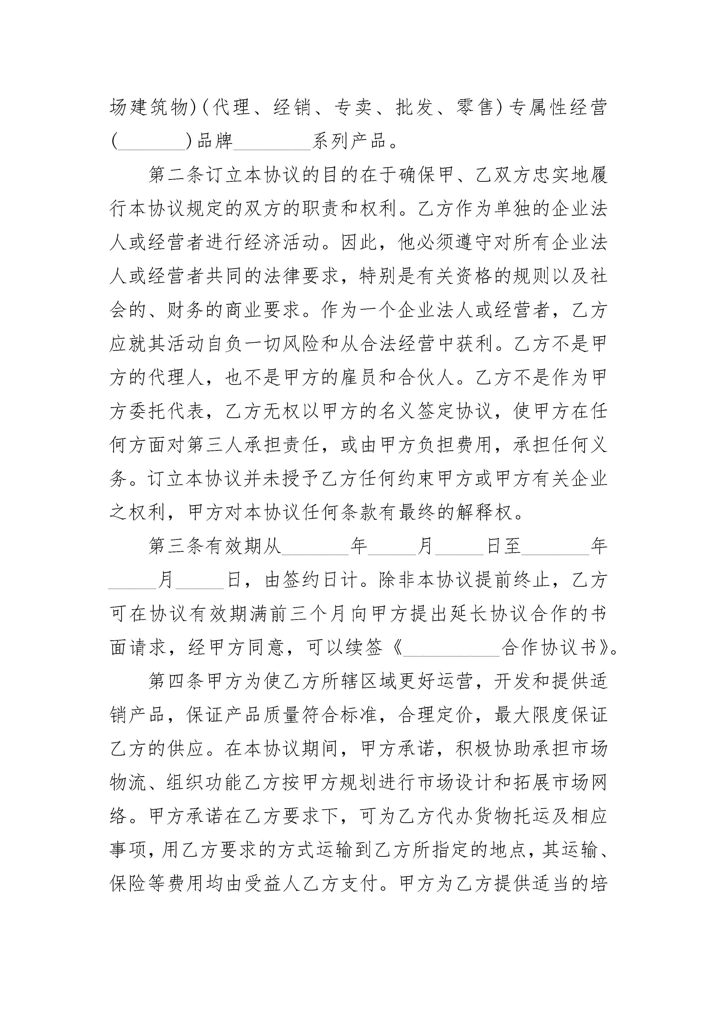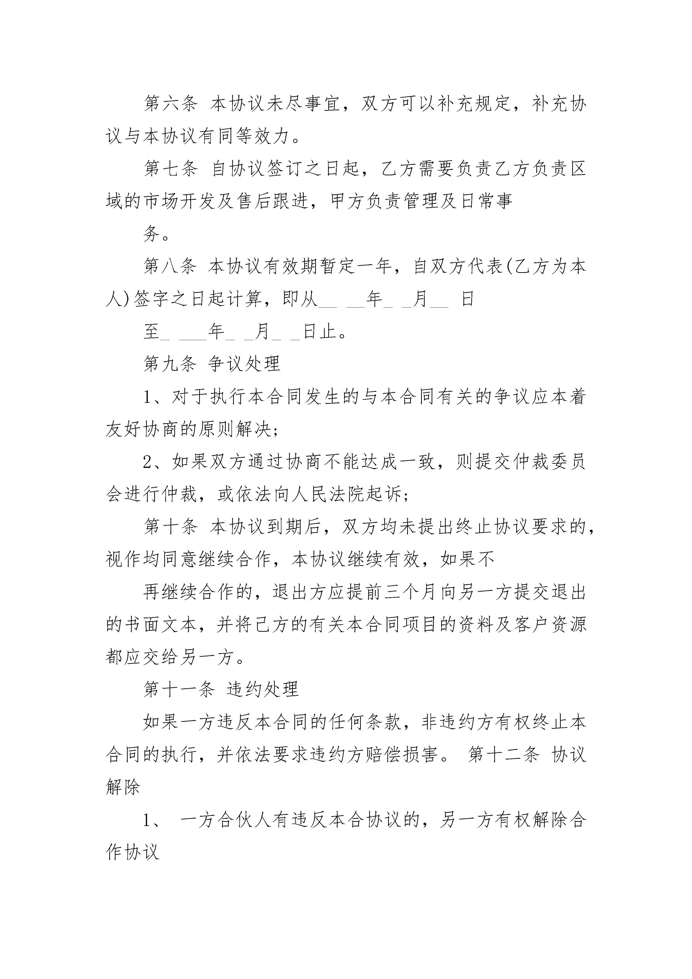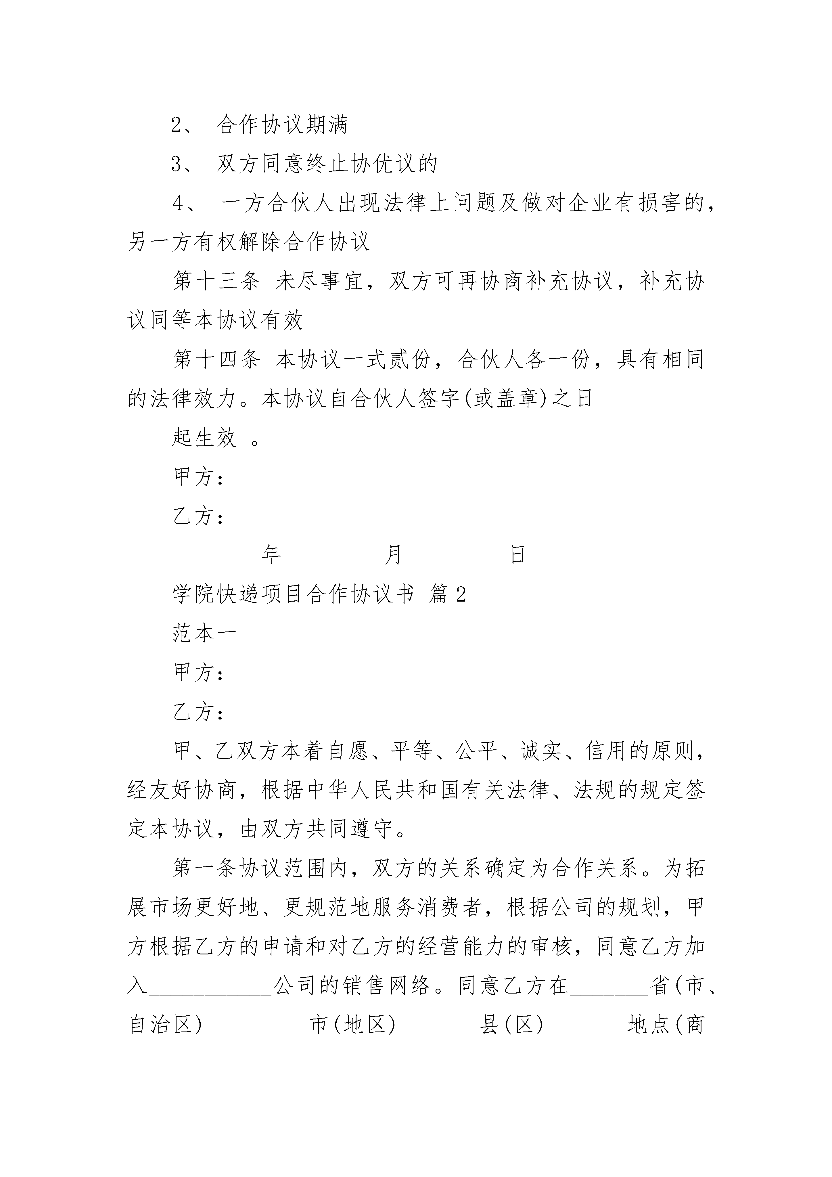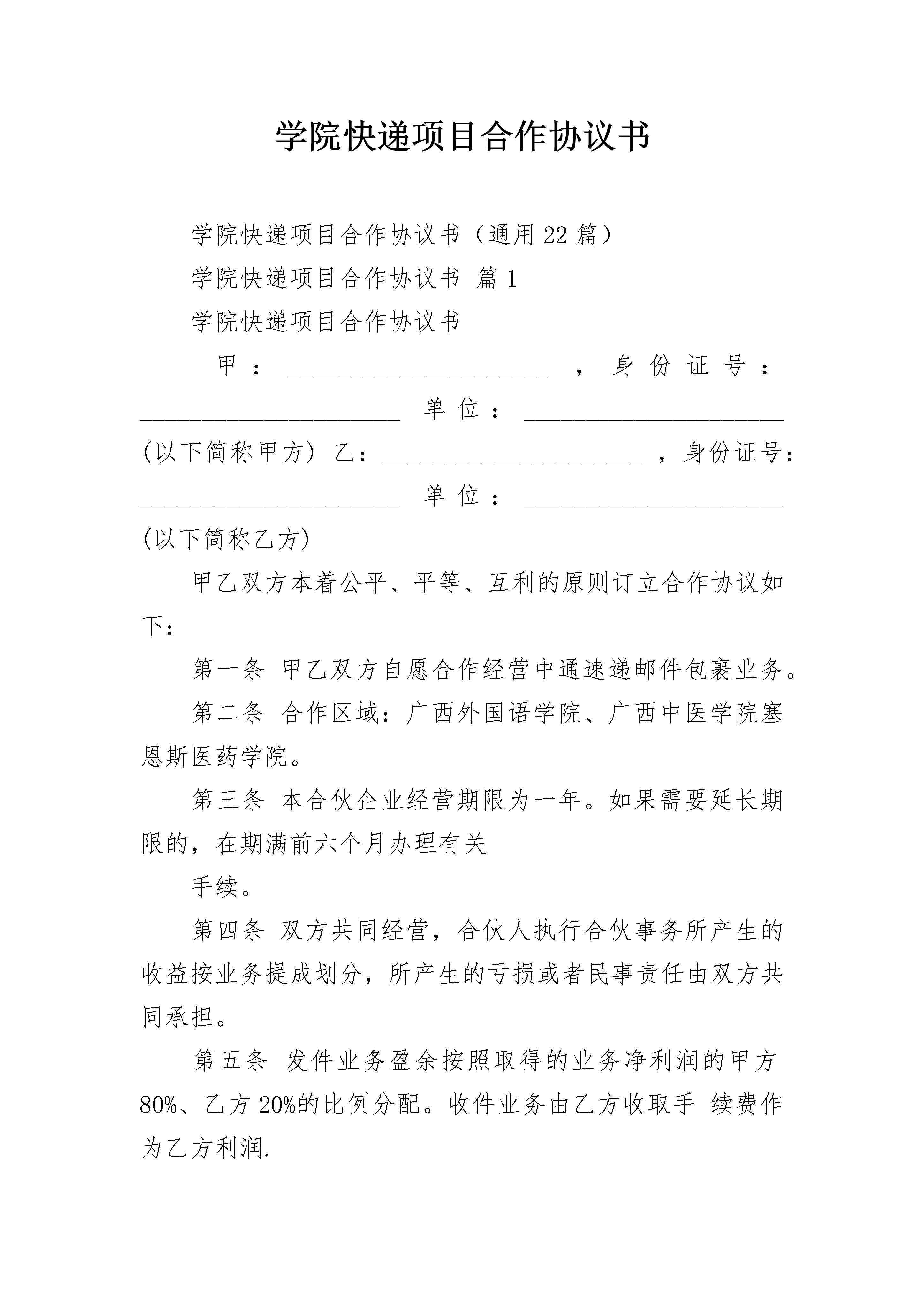 学院快递项目合作协议书学院快递项目合作协议书(通用22篇)学院快递项目合作协议书篇1学院快递项目合作协议书甲:_____________________,身份证号:_____________________单位:_____________________(以下简称甲方)乙:_____________________,身份证号:_____________________单位:_____________________(以下简称乙方)甲乙双方本着公平、平等、互利的原则订立合作协议如下:第一条甲乙双方自愿合作经营中通速递邮件包裹业务。第二条合作区域:广西外国语学院、广西中医学院塞恩斯医药学院。第三条本合伙企业经营期限为一年。如果需要延长期限的,在期满前六个月办理有关手续。第四条双方共同经营,合伙人执行合伙事务所产生的收益按业务提成划分,所产生的亏损或者民事责任由双方共同承担。第五条发件业务盈余按照取得的业务净利润的甲方80%、乙方20%的比例分配。收件业务由乙方收取手续费作为乙方利润.第六条本协议未尽事宜,双方可以补充规定,补充协议与本协议有同等效力。第七条自协议签订之日起,乙方需要负责乙方负责区域的市场开发及售后跟进,甲方负责管理及日常事务。第八条本协议有效期暂定一年,自双方代表(乙方为本人)签字之日起计算,即从____年__月__日至____年__月__日止。第九条争议处理1、对于执行本合同发生的与本合同有关的争议应本着友好协商的原则解决;2、如果双方通过协商不能达成一致,则提交仲裁委员会进行仲裁,或依法向人民法院起诉;第十条本协议到期后,双方均未提出终止协议要求的,视作均同意继续合作,本协议继续有效,如果不再继续合作的,退出方应提前三个月向另一方提交退出的书面文本,并将己方的有关本合同项目的资料及客户资源都应交给另一方。第十一条违约处理如果一方违反本合同的任何条款,非违约方有权终止本合同的执行,并依法要求违约方赔偿损害。第十二条协议解除1、一方合伙人有违反本合协议的,另一方有权解除合作协议2、合作协议期满3、双方同意终止协优议的4、一方合伙人出现法律上问题及做对企业有损害的,另一方有权解除合作协议第十三条未尽事宜,双方可再协商补充协议,补充协议同等本协议有效第十四条本协议一式贰份,合伙人各一份,具有相同的法律效力。本协议自合伙人签字(或盖章)之日起生效。甲方:___________乙方:_______________年_____月_____日学院快递项目合作协议书篇2范本一甲方:_____________乙方:_____________甲、乙双方本着自愿、平等、公平、诚实、信用的原则,经友好协商,根据中华人民共和国有关法律、法规的规定签定本协议,由双方共同遵守。第一条协议范围内,双方的关系确定为合作关系。为拓展市场更好地、更规范地服务消费者,根据公司的规划,甲方根据乙方的申请和对乙方的经营能力的审核,同意乙方加入___________公司的销售网络。同意乙方在_______省(市、自治区)_________市(地区)_______县(区)_______地点(商场建筑物)(代理、经销、专卖、批发、零售)专属性经营(_______)品牌________系列产品。第二条订立本协议的目的在于确保甲、乙双方忠实地履行本协议规定的双方的职责和权利。乙方作为单独的企业法人或经营者进行经济活动。因此,他必须遵守对所有企业法人或经营者共同的法律要求,特别是有关资格的规则以及社会的、财务的商业要求。作为一个企业法人或经营者,乙方应就其活动自负一切风险和从合法经营中获利。乙方不是甲方的代理人,也不是甲方的雇员和合伙人。乙方不是作为甲方委托代表,乙方无权以甲方的名义签定协议,使甲方在任何方面对第三人承担责任,或由甲方负担费用,承担任何义务。订立本协议并未授予乙方任何约束甲方或甲方有关企业之权利,甲方对本协议任何条款有最终的解释权。第三条有效期从_______年_____月_____日至_______年_____月_____日,由签约日计。除非本协议提前终止,乙方可在协议有效期满前三个月向甲方提出延长协议合作的书面请求,经甲方同意,可以续签《__________合作协议书》。第四条甲方为使乙方所辖区域更好运营,开发和提供适销产品,保证产品质量符合标准,合理定价,最大限度保证乙方的供应。在本协议期间,甲方承诺,积极协助承担市场物流、组织功能乙方按甲方规划进行市场设计和拓展市场网络。甲方承诺在乙方要求下,可为乙方代办货物托运及相应事项,用乙方要求的方式运输到乙方所指定的地点,其运输、保险等费用均由受益人乙方支付。甲方为乙方提供适当的培训和辅导。作为市场开发和业务拓展必备条件,以保证整个系统持续统一。甲方负责组织品牌宣传,并协同承担市场物