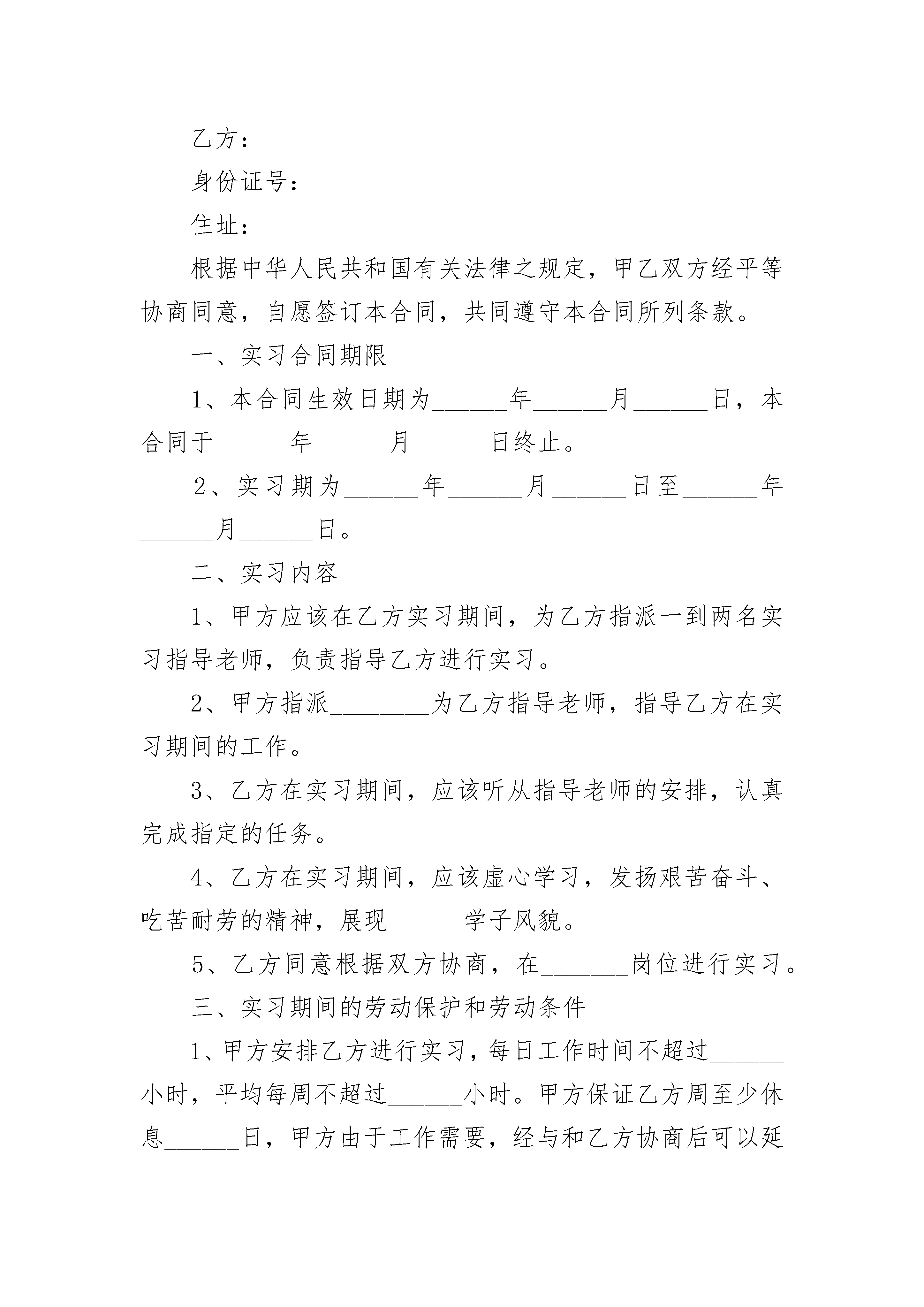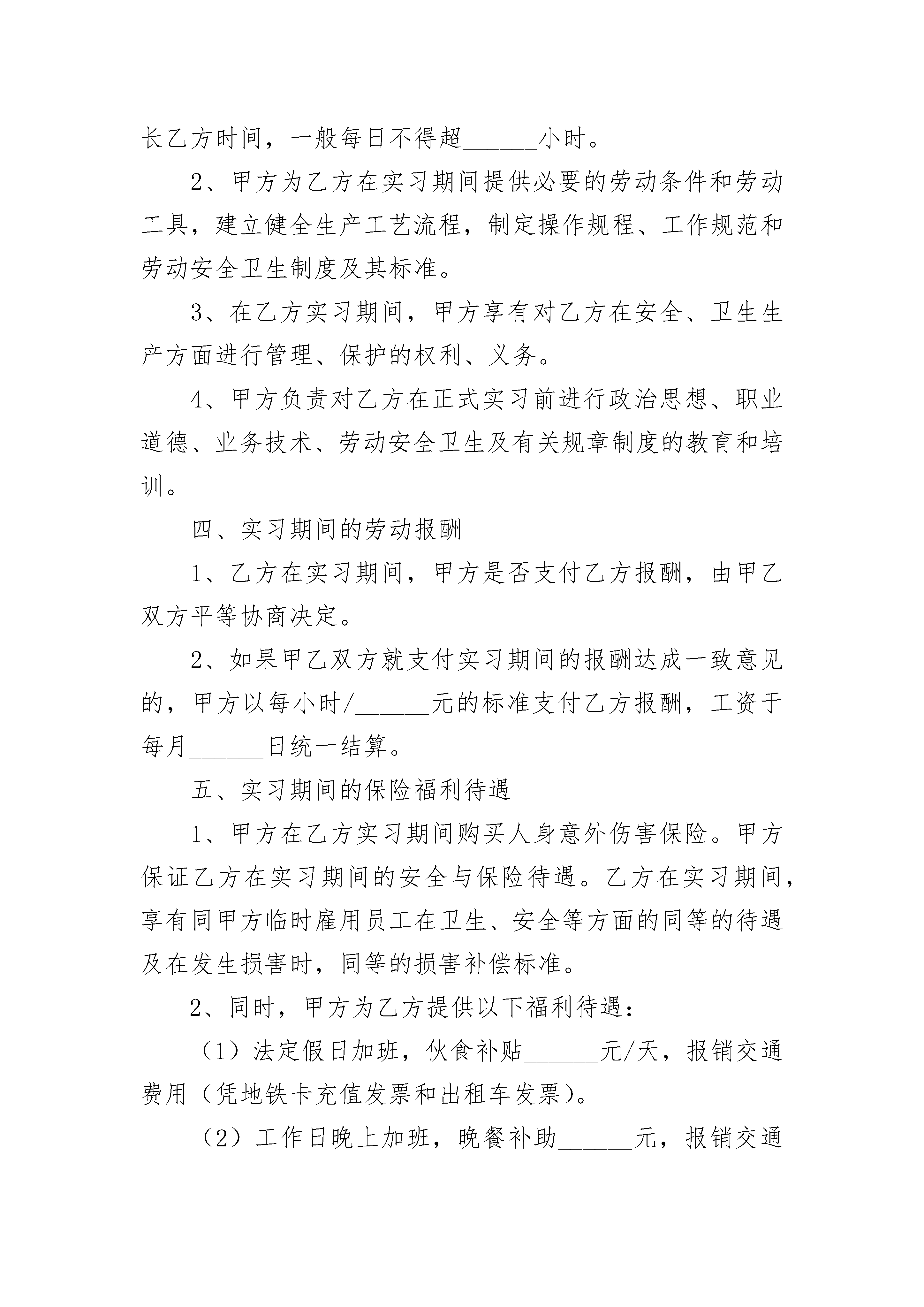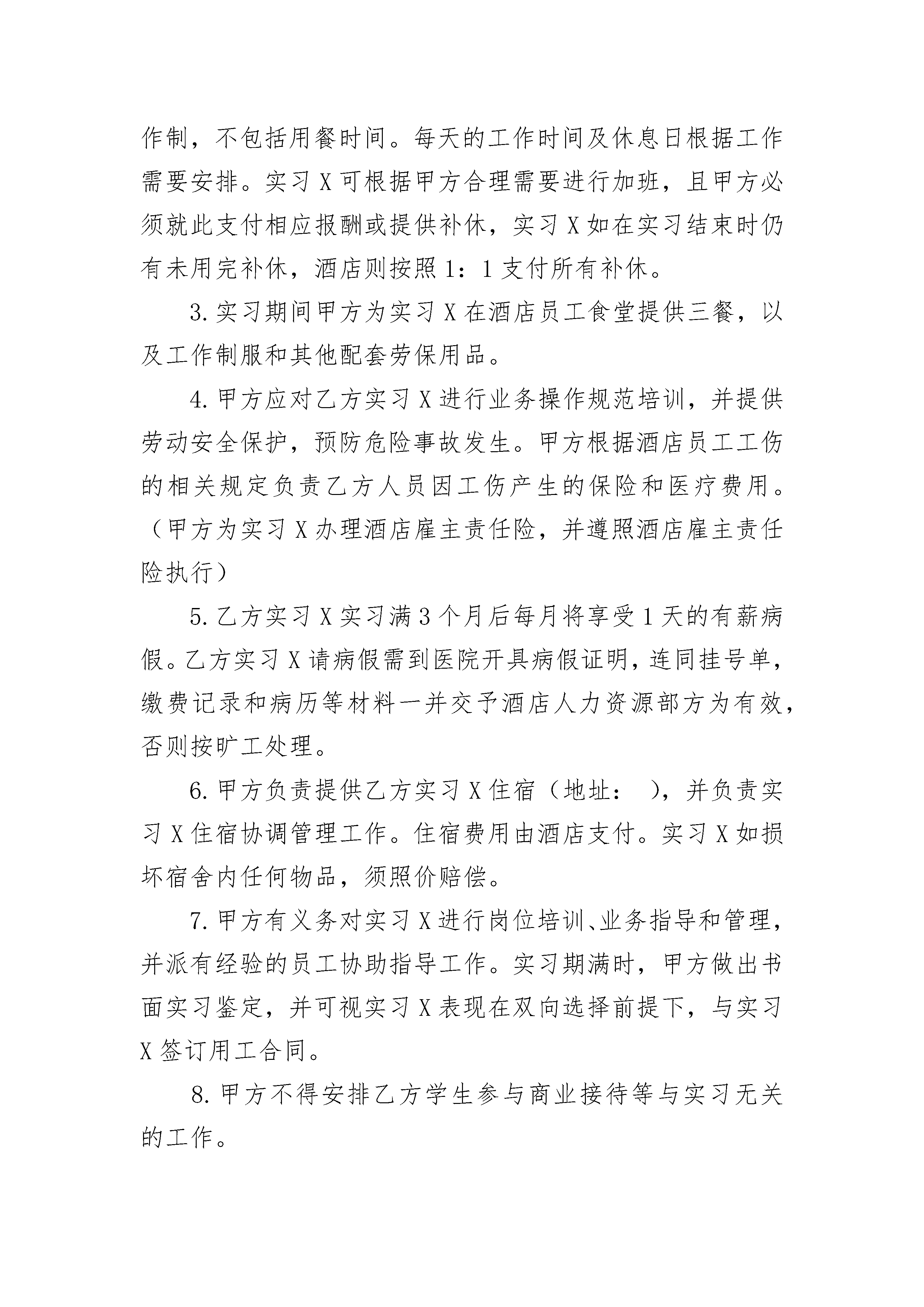 实习合作协议实习合作协议(精选9篇)实习合作协议篇1实习合作协议书甲方:乙方:学院管理工程系为了积极探索校企联合培养创新型人才的模式,使学生熟练掌握饭店基本业务和了解企业经营管理模式,培养学生的业务技能和专业素养,甲、乙双方经友好协商,本着平等自愿的原则,就乙方学生在甲方实习事宜达成本协议,共同遵守。一、本协议期限为6个月,自________年_3____月_5____日至________年_8____月____日,实习结束之后需返校完成学业。二、甲方接收乙方实习X共22名(具体名单附后)。三、乙方实习X实习期间的待遇如下:实习津贴每月_950元。由甲方在每月____日以银行转帐方式支付。四、双方责任:(一)甲方1.乙方学生需到酒店指定机构进行体检(办理健康证),体检费用由学生先行支付,在实习期满后一并由甲方全额报销。体检不合格者不予录用。2.甲方按照《劳动法》规定实习X每周实行40小时工作制,不包括用餐时间。每天的工作时间及休息日根据工作需要安排。实习X可根据甲方合理需要进行加班,且甲方必须就此支付相应报酬或提供补休,实习X如在实习结束时仍有未用完补休,酒店则按照1:1支付所有补休。3.实习期间甲方为实习X在酒店员工食堂提供三餐,以及工作制服和其他配套劳保用品。4.甲方应对乙方实习X进行业务操作规范培训,并提供劳动安全保护,预防危险事故发生。甲方根据酒店员工工伤的相关规定负责乙方人员因工伤产生的保险和医疗费用。(甲方为实习X办理酒店雇主责任险,并遵照酒店雇主责任险执行)5.乙方实习X实习满3个月后每月将享受1天的有薪病假。乙方实习X请病假需到医院开具病假证明,连同挂号单,缴费记录和病历等材料一并交予酒店人力资源部方为有效,否则按旷工处理。6.甲方负责提供乙方实习X住宿(地址:),并负责实习X住宿协调管理工作。住宿费用由酒店支付。实习X如损坏宿舍内任何物品,须照价赔偿。7.甲方有义务对实习X进行岗位培训、业务指导和管理,并派有经验的员工协助指导工作。实习期满时,甲方做出书面实习鉴定,并可视实习X表现在双向选择前提下,与实习X签订用工合同。8.甲方不得安排乙方学生参与商业接待等与实习无关的工作。(二)乙方1.乙方对实习X做好教育和协助管理工作,并选派两名指导教师全程跟踪。负责实习X思想教育、督促其遵守实习制度、服从岗位分配,以顺利完成实习任务。2.乙方配合甲方教育实习从酒店的管理,严格遵守酒店各项规章制度,协调处理好突发事件。3.乙方实习X必须服从甲方的管理,认真执行甲方规章制度。由于其过失或故意所为而给甲方造成损失的,应承担相应责任。4.乙方实习X必须服从甲方的岗位分配,学生在实习期内不得自行更换部门。本协议一式两份,甲乙双方各执一份。自双方签字盖章后正式生效。如有不尽之处,双方应本着友好协商的原则解决。甲方联系人:联系电话:乙方联系人:联系电话:甲方(盖章):乙方(盖章):代表签字:代表签字:签约时间:________年____月____日签约时间:________年____月____日实习合作协议篇2甲方:身份证号:住址:乙方:身份证号:住址:根据中华人民共和国有关法律之规定,甲乙双方经平等协商同意,自愿签订本合同,共同遵守本合同所列条款。一、实习合同期限1、本合同生效日期为______年______月______日,本合同于______年______月______日终止。2、实习期为______年______月______日至______年______月______日。二、实习内容1、甲方应该在乙方实习期间,为乙方指派一到两名实习指导老师,负责指导乙方进行实习。2、甲方指派________为乙方指导老师,指导乙方在实习期间的工作。3、乙方在实习期间,应该听从指导老师的安排,认真完成指定的任务。4、乙方在实习期间,应该虚心学习,发扬艰苦奋斗、吃苦耐劳的精神,展现______学子风貌。5、乙方同意根据双方协商,在_______岗位进行实习。三、实习期间的劳动保护和劳动条件1、甲方安排乙方进行实习,每日工作时间不超过______小时,平均每周不超过______小时。甲方保证乙方周至少休息______日,甲方由于工作需要,经与和乙方协商后可以延长乙方时间,一般每日不得超______小时。2、甲方为乙方在实习期间提供必要的劳动条件和劳动工具,建立健全生产工艺流程,制定操作规程、工作规范和劳动安全卫生制度及其标准。3、在乙方实习期间,甲方享有对乙方在安全、卫生生产方面进行管理、保护的权利、义务。4、甲方负责对乙方在正式实习前进行政治思想、职业道德、业务技术、劳动安全卫生及有关规章制度的教育和培训。四、实习期间的劳动报酬1、乙方在实习期间,甲方是否支付乙方报酬,由甲乙双方平等协商决定。2、如果甲乙双方就支付实习期间的报酬达成一致意