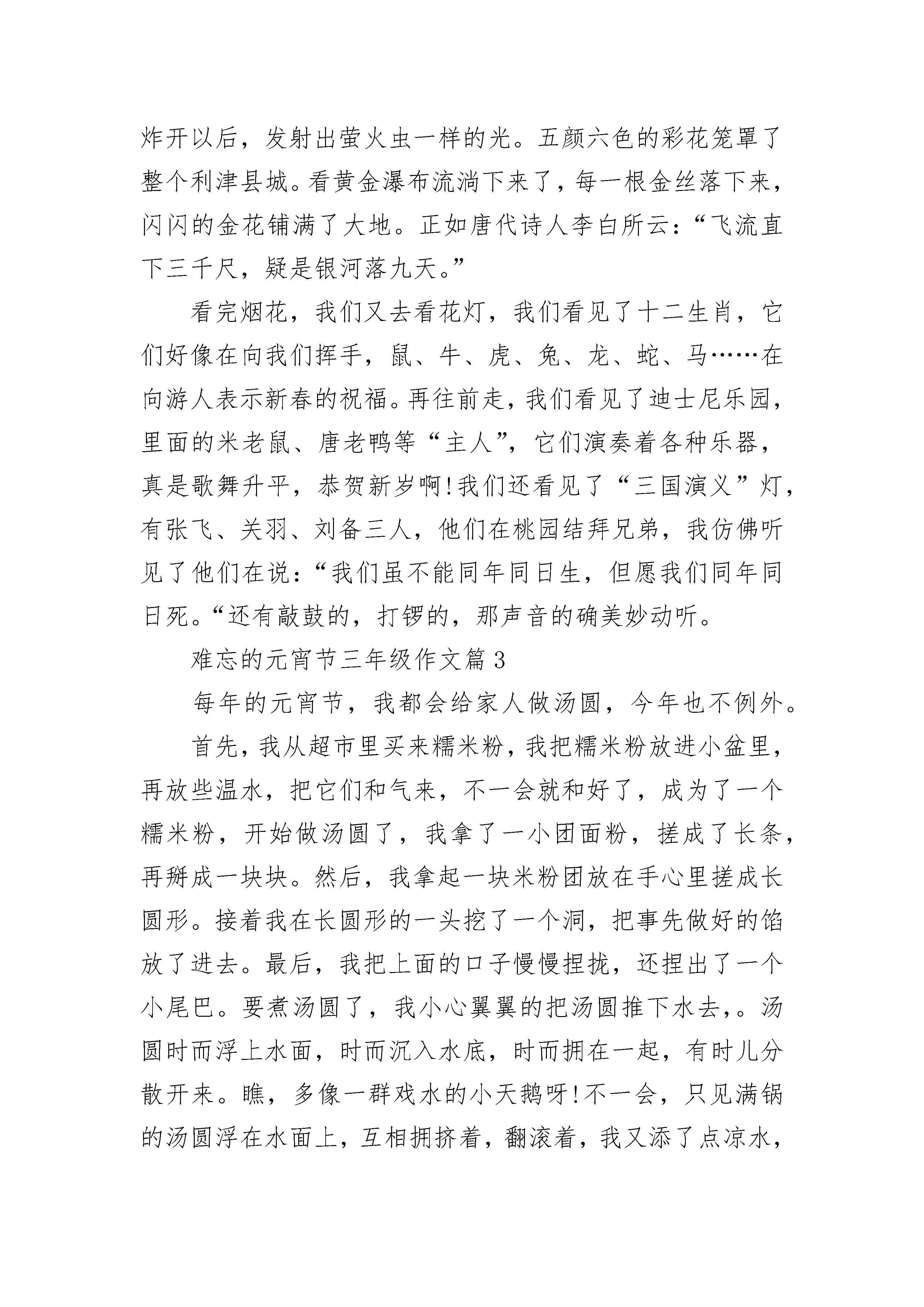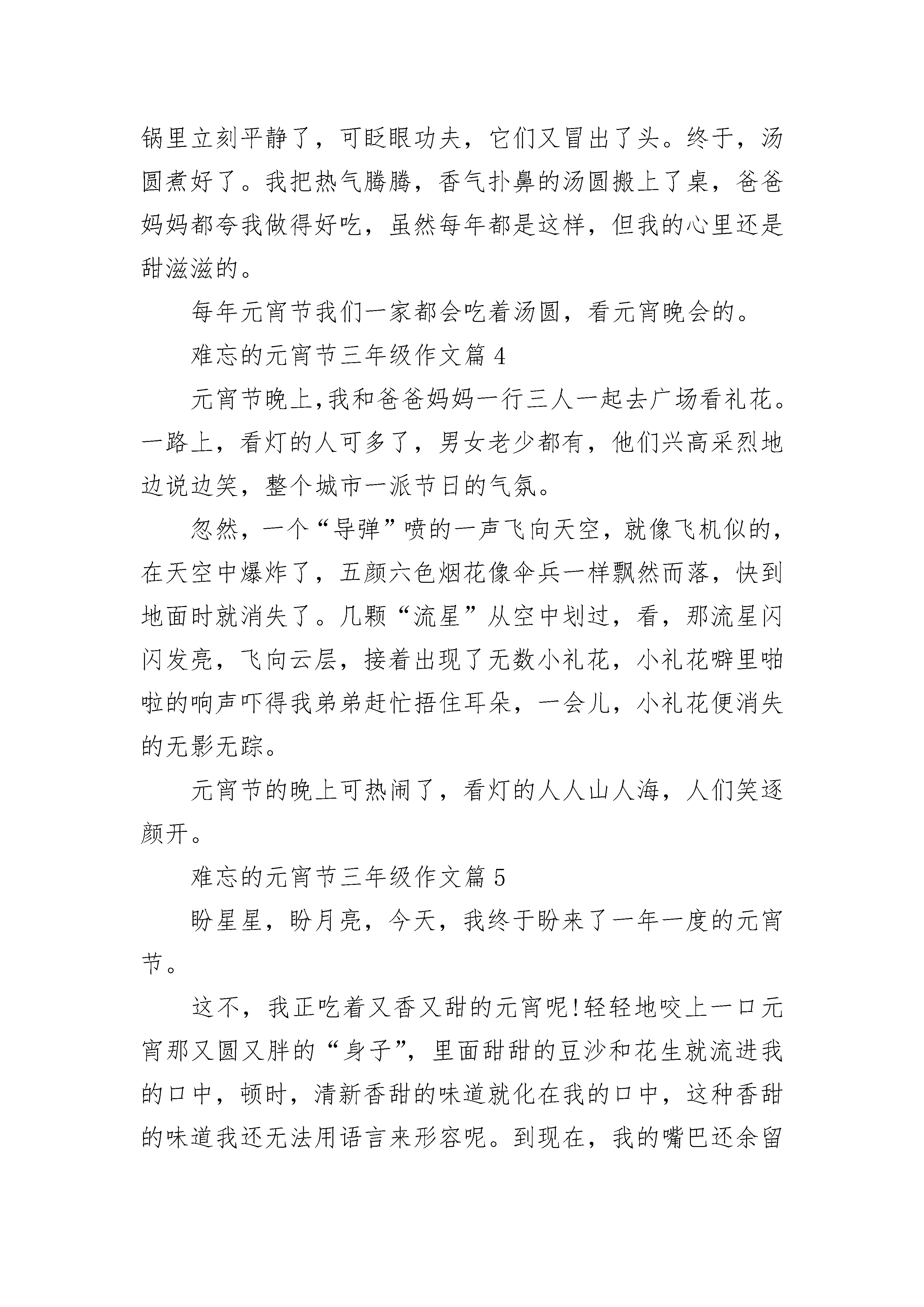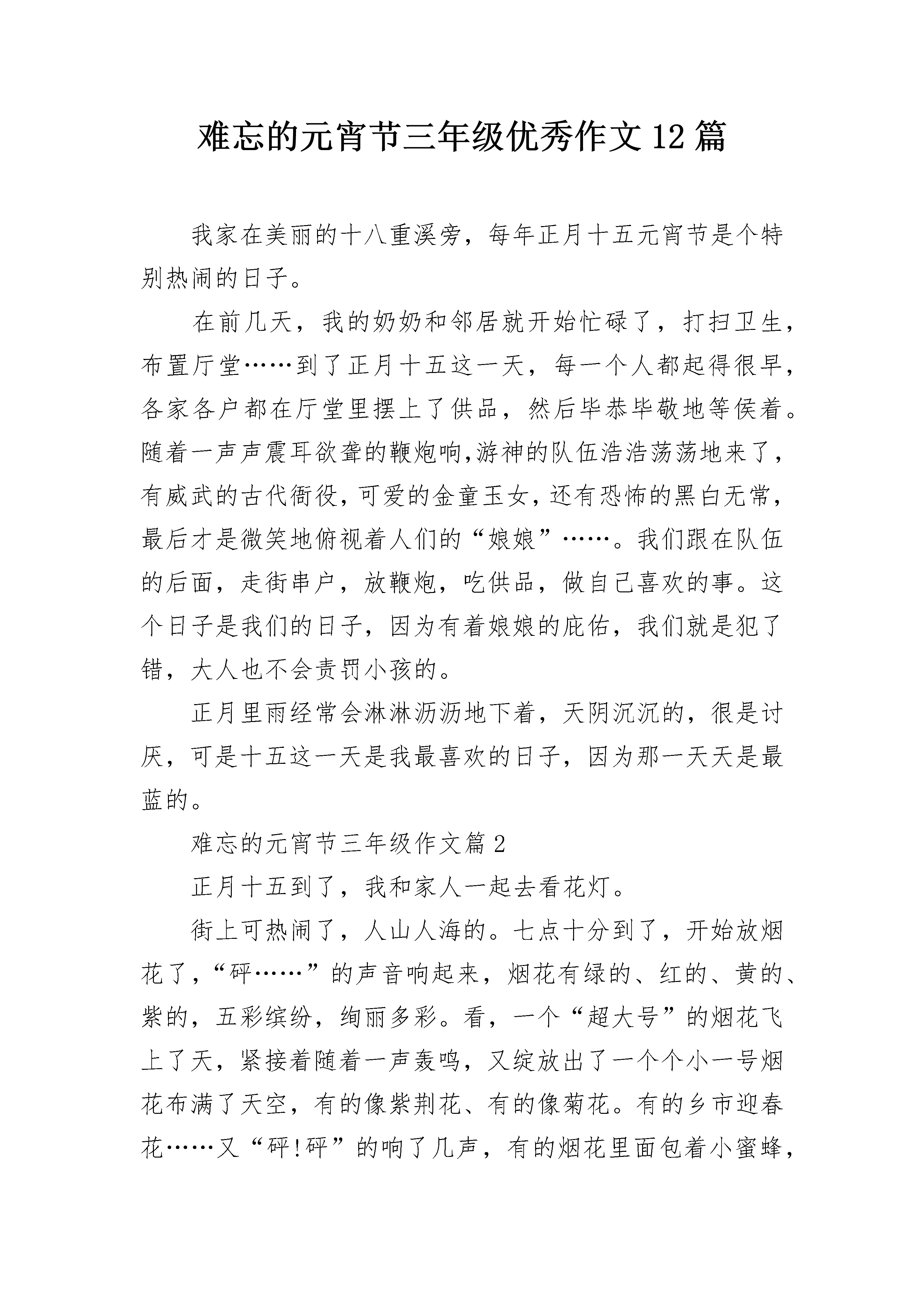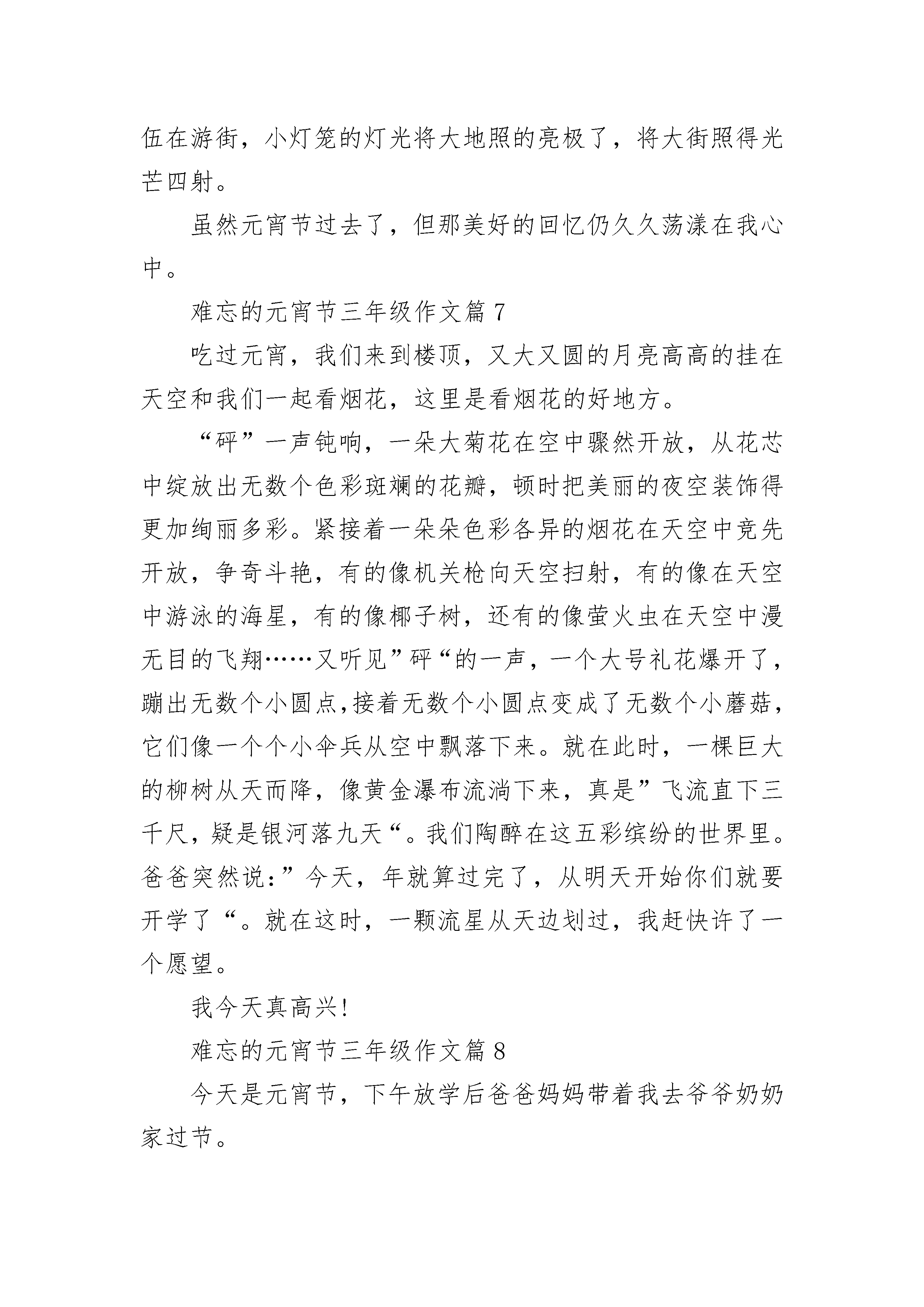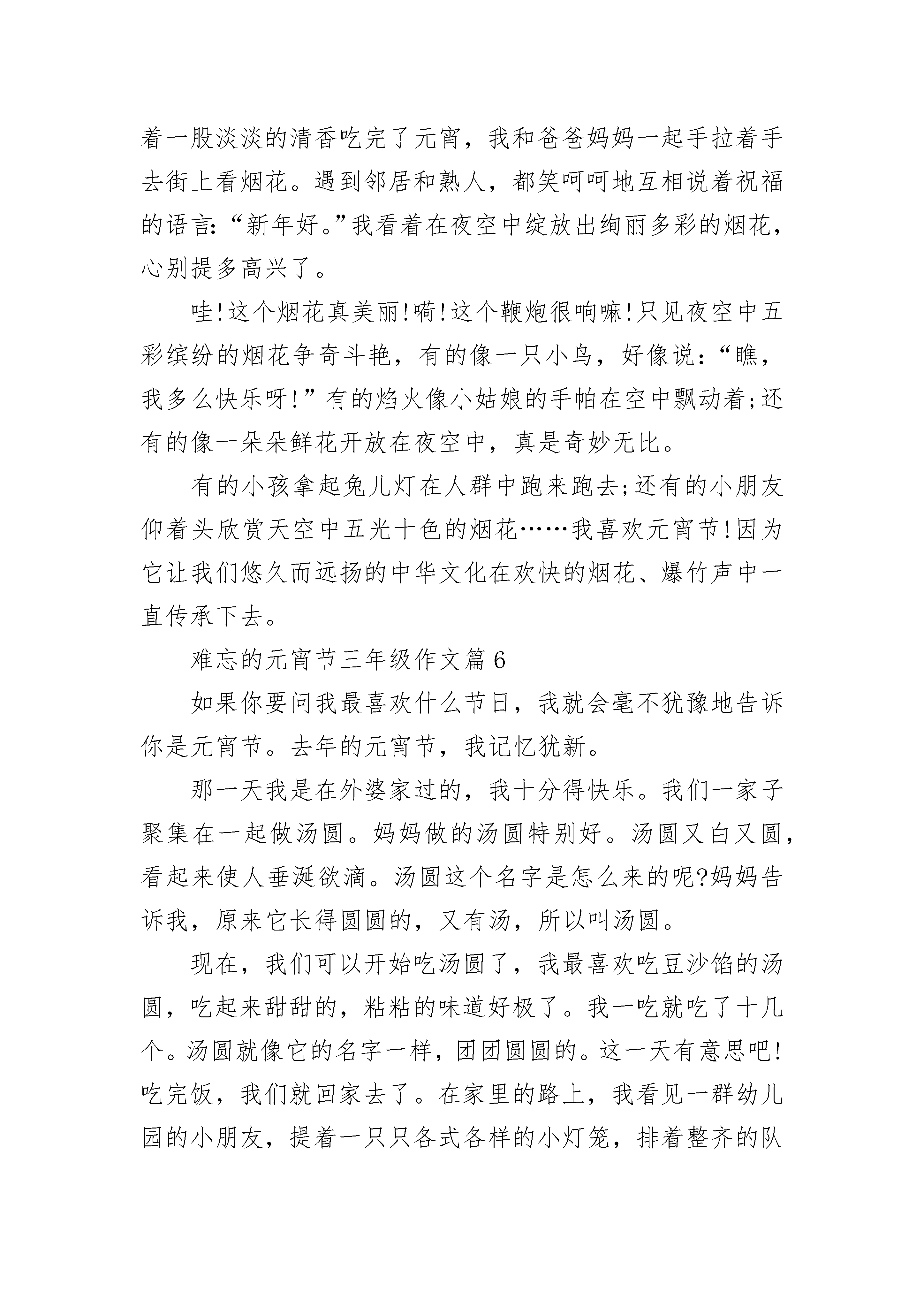 难忘的元宵节三年级优秀作文12篇我家在美丽的十八重溪旁,每年正月十五元宵节是个特别热闹的日子。在前几天,我的奶奶和邻居就开始忙碌了,打扫卫生,布置厅堂……到了正月十五这一天,每一个人都起得很早,各家各户都在厅堂里摆上了供品,然后毕恭毕敬地等侯着。随着一声声震耳欲聋的鞭炮响,游神的队伍浩浩荡荡地来了,有威武的古代衙役,可爱的金童玉女,还有恐怖的黑白无常,最后才是微笑地俯视着人们的“娘娘”……。我们跟在队伍的后面,走街串户,放鞭炮,吃供品,做自己喜欢的事。这个日子是我们的日子,因为有着娘娘的庇佑,我们就是犯了错,大人也不会责罚小孩的。正月里雨经常会淋淋沥沥地下着,天阴沉沉的,很是讨厌,可是十五这一天是我最喜欢的日子,因为那一天天是最蓝的。难忘的元宵节三年级作文篇2正月十五到了,我和家人一起去看花灯。街上可热闹了,人山人海的。七点十分到了,开始放烟花了,“砰……”的声音响起来,烟花有绿的、红的、黄的、紫的,五彩缤纷,绚丽多彩。看,一个“超大号”的烟花飞上了天,紧接着随着一声轰鸣,又绽放出了一个个小一号烟花布满了天空,有的像紫荆花、有的像菊花。有的乡市迎春花……又“砰!砰”的响了几声,有的烟花里面包着小蜜蜂,炸开以后,发射出萤火虫一样的光。五颜六色的彩花笼罩了整个利津县城。看黄金瀑布流淌下来了,每一根金丝落下来,闪闪的金花铺满了大地。正如唐代诗人李白所云:“飞流直下三千尺,疑是银河落九天。”看完烟花,我们又去看花灯,我们看见了十二生肖,它们好像在向我们挥手,鼠、牛、虎、兔、龙、蛇、马……在向游人表示新春的祝福。再往前走,我们看见了迪士尼乐园,里面的米老鼠、唐老鸭等“主人”,它们演奏着各种乐器,真是歌舞升平,恭贺新岁啊!我们还看见了“三国演义”灯,有张飞、关羽、刘备三人,他们在桃园结拜兄弟,我仿佛听见了他们在说:“我们虽不能同年同日生,但愿我们同年同日死。“还有敲鼓的,打锣的,那声音的确美妙动听。难忘的元宵节三年级作文篇3每年的元宵节,我都会给家人做汤圆,今年也不例外。首先,我从超市里买来糯米粉,我把糯米粉放进小盆里,再放些温水,把它们和气来,不一会就和好了,成为了一个糯米粉,开始做汤圆了,我拿了一小团面粉,搓成了长条,再掰成一块块。然后,我拿起一块米粉团放在手心里搓成长圆形。接着我在长圆形的一头挖了一个洞,把事先做好的馅放了进去。最后,我把上面的口子慢慢捏拢,还捏出了一个小尾巴。要煮汤圆了,我小心翼翼的把汤圆推下水去,。汤圆时而浮上水面,时而沉入水底,时而拥在一起,有时儿分散开来。瞧,多像一群戏水的小天鹅呀!不一会,只见满锅的汤圆浮在水面上,互相拥挤着,翻滚着,我又添了点凉水,锅里立刻平静了,可眨眼功夫,它们又冒出了头。终于,汤圆煮好了。我把热气腾腾,香气扑鼻的汤圆搬上了桌,爸爸妈妈都夸我做得好吃,虽然每年都是这样,但我的心里还是甜滋滋的。每年元宵节我们一家都会吃着汤圆,看元宵晚会的。难忘的元宵节三年级作文篇4元宵节晚上,我和爸爸妈妈一行三人一起去广场看礼花。一路上,看灯的人可多了,男女老少都有,他们兴高采烈地边说边笑,整个城市一派节日的气氛。忽然,一个“导弹”喷的一声飞向天空,就像飞机似的,在天空中爆炸了,五颜六色烟花像伞兵一样飘然而落,快到地面时就消失了。几颗“流星”从空中划过,看,那流星闪闪发亮,飞向云层,接着出现了无数小礼花,小礼花噼里啪啦的响声吓得我弟弟赶忙捂住耳朵,一会儿,小礼花便消失的无影无踪。元宵节的晚上可热闹了,看灯的人人山人海,人们笑逐颜开。难忘的元宵节三年级作文篇5盼星星,盼月亮,今天,我终于盼来了一年一度的元宵节。这不,我正吃着又香又甜的元宵呢!轻轻地咬上一口元宵那又圆又胖的“身子”,里面甜甜的豆沙和花生就流进我的口中,顿时,清新香甜的味道就化在我的口中,这种香甜的味道我还无法用语言来形容呢。到现在,我的嘴巴还余留着一股淡淡的清香吃完了元宵,我和爸爸妈妈一起手拉着手去街上看烟花。遇到邻居和熟人,都笑呵呵地互相说着祝福的语言:“新年好。”我看着在夜空中绽放出绚丽多彩的烟花,心别提多高兴了。哇!这个烟花真美丽!嗬!这个鞭炮很响嘛!只见夜空中五彩缤纷的烟花争奇斗艳,有的像一只小鸟,好像说:“瞧,我多么快乐呀!”有的焰火像小姑娘的手帕在空中飘动着;还有的像一朵朵鲜花开放在夜空中,真是奇妙无比。有的小孩拿起兔儿灯在人群中跑来跑去;还有的小朋友仰着头欣赏天空中五光十色的烟花……我喜欢元宵节!因为它让我们悠久而远扬的中华文化在欢快的烟花、爆竹声中一直传承下去。难忘的元宵节三年级作文篇6如果你要问我最喜欢什么节日,我就会毫不犹豫地告诉你是元宵节。去年的元宵节,我记忆犹新。那一天我是在外婆家过的,我十分得快乐。我们一家子聚集在一起做汤圆。妈妈做的汤圆特别好。汤圆又白又圆,看起来使人垂涎欲滴。汤圆这个名字是怎么来的呢?妈妈告诉