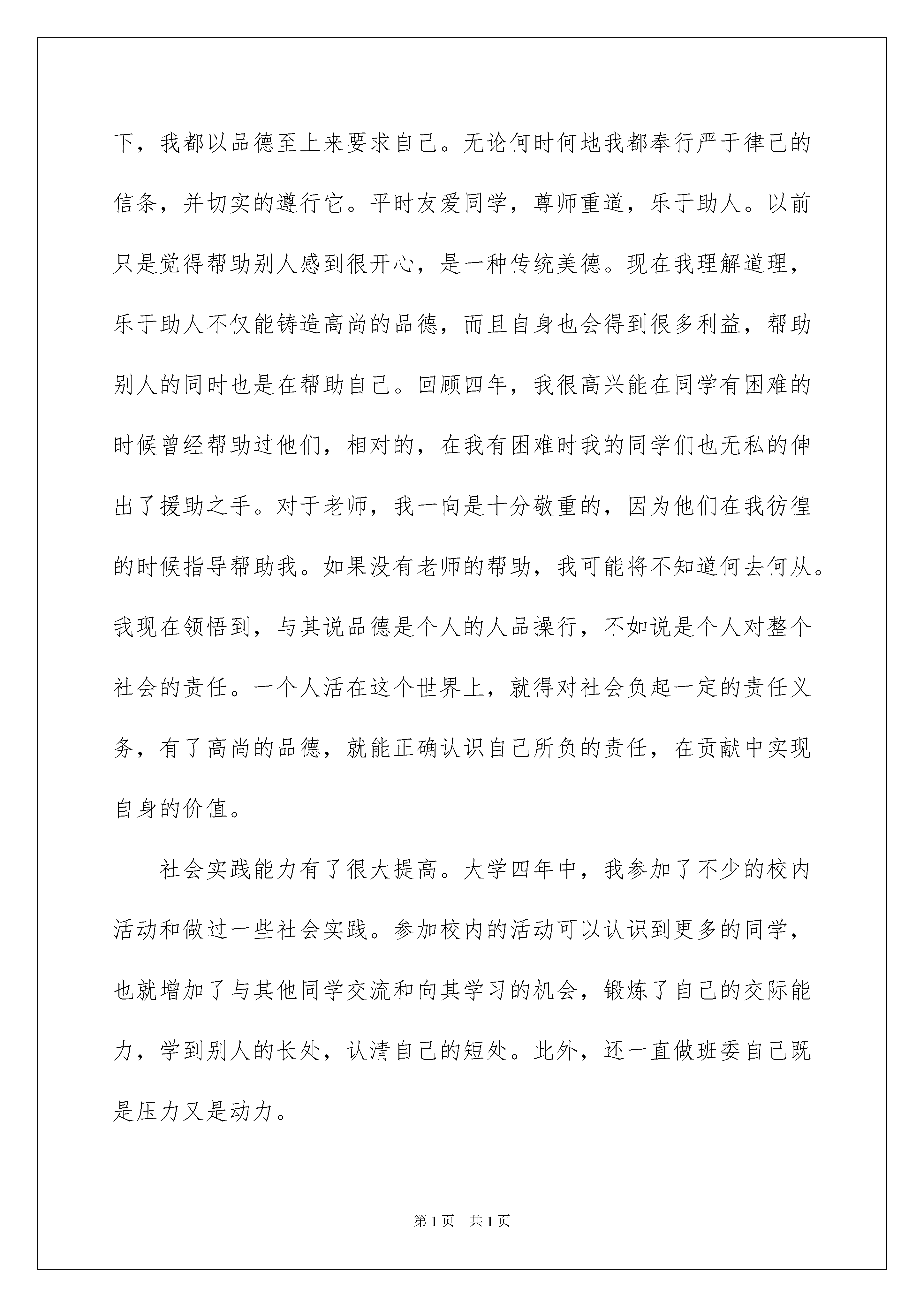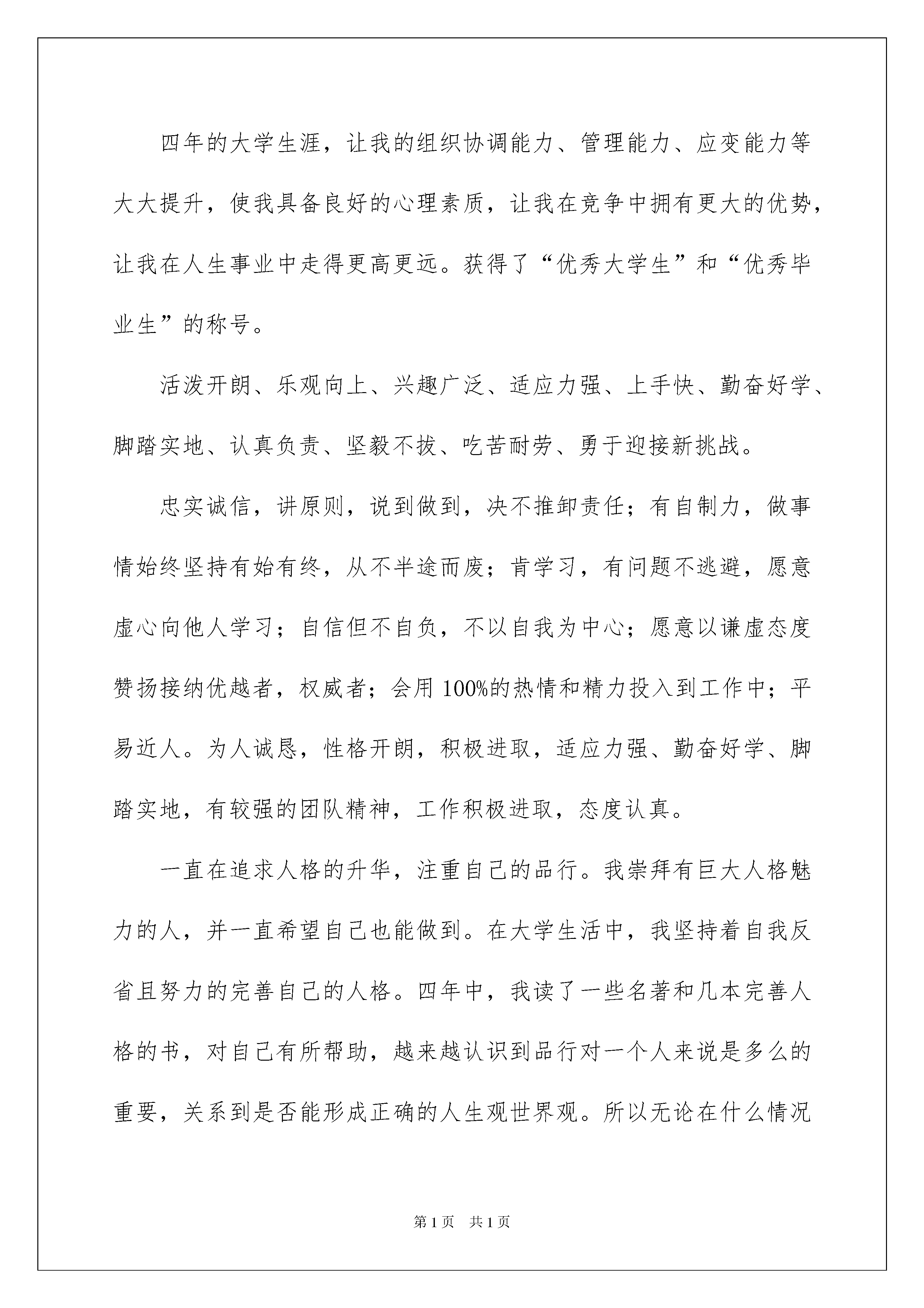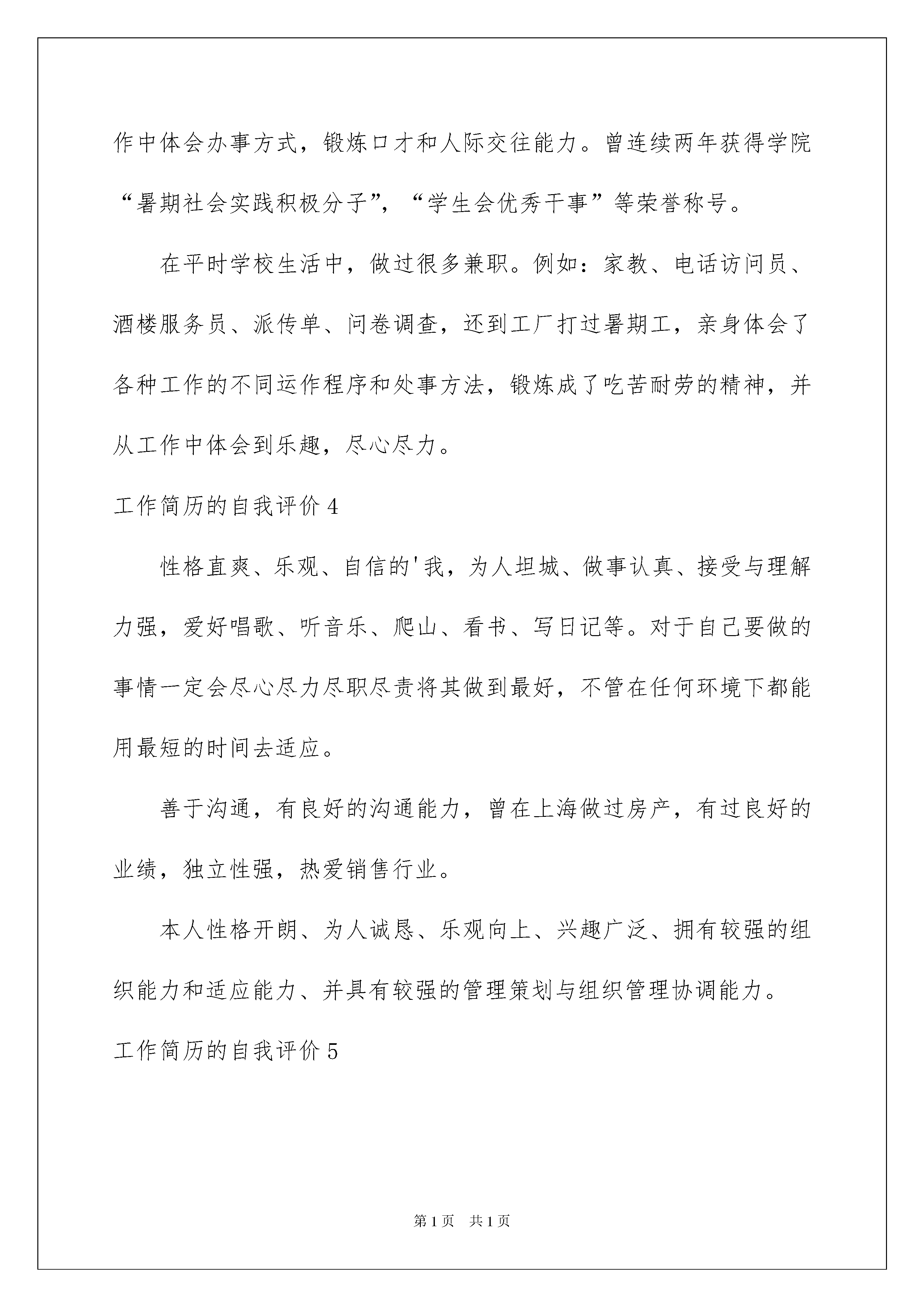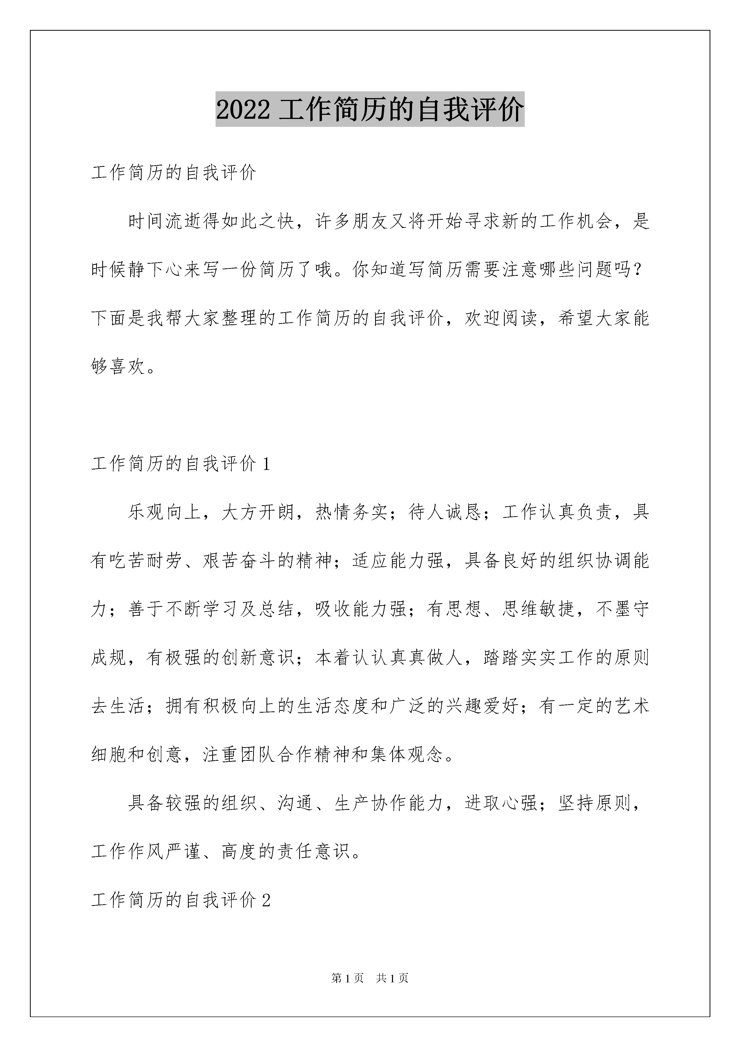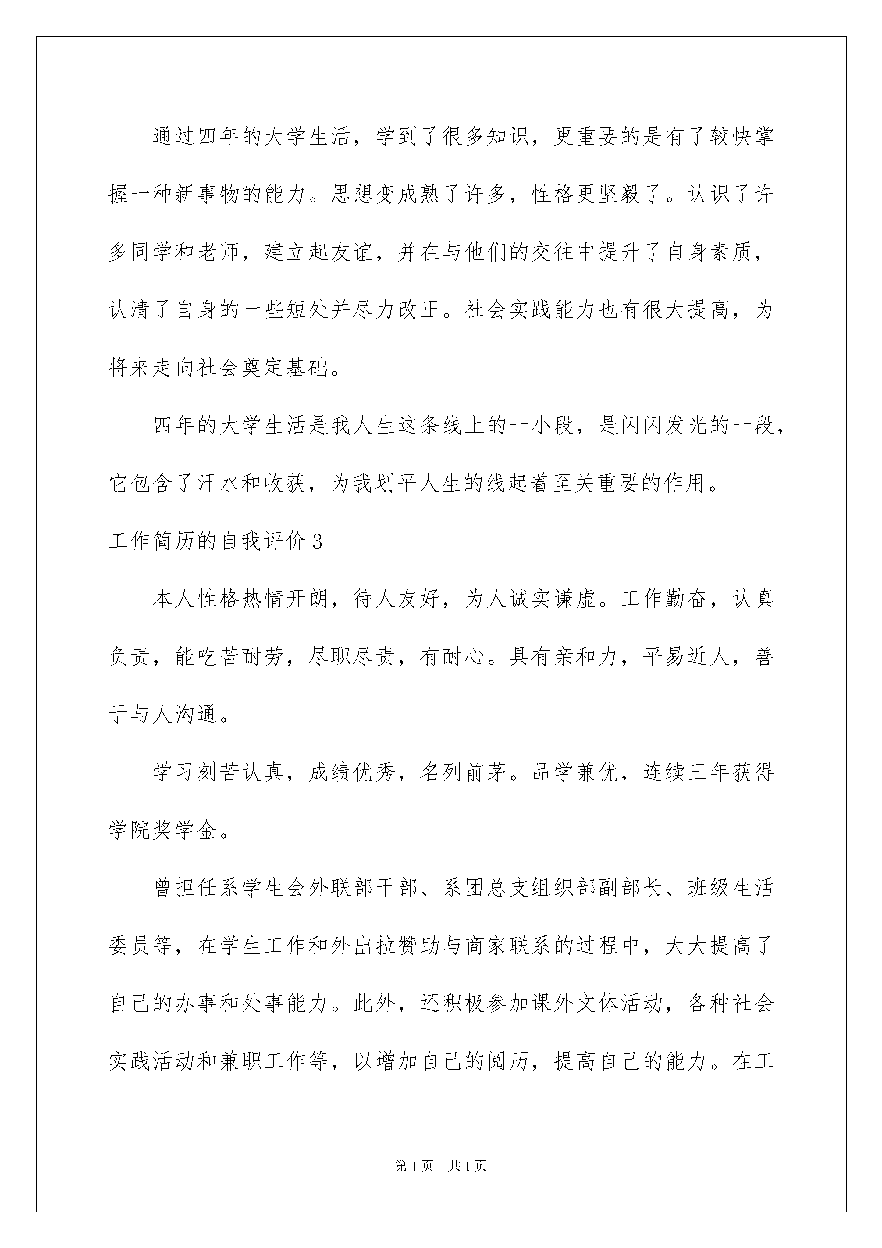 2022工作简历的自我评价工作简历的自我评价时间流逝得如此之快,许多朋友又将开始寻求新的工作机会,是时候静下心来写一份简历了哦。你知道写简历需要注意哪些问题吗?下面是我帮大家整理的工作简历的自我评价,欢迎阅读,希望大家能够喜欢。工作简历的自我评价1乐观向上,大方开朗,热情务实;待人诚恳;工作认真负责,具有吃苦耐劳、艰苦奋斗的精神;适应能力强,具备良好的组织协调能力;善于不断学习及总结,吸收能力强;有思想、思维敏捷,不墨守成规,有极强的创新意识;本着认认真真做人,踏踏实实工作的原则去生活;拥有积极向上的生活态度和广泛的兴趣爱好;有一定的艺术细胞和创意,注重团队合作精神和集体观念。具备较强的组织、沟通、生产协作能力,进取心强;坚持原则,工作作风严谨、高度的责任意识。工作简历的自我评价2四年的大学生涯,让我的组织协调能力、管理能力、应变能力等大大提升,使我具备良好的心理素质,让我在竞争中拥有更大的优势,让我在人生事业中走得更高更远。获得了“优秀大学生”和“优秀毕业生”的称号。活泼开朗、乐观向上、兴趣广泛、适应力强、上手快、勤奋好学、脚踏实地、认真负责、坚毅不拔、吃苦耐劳、勇于迎接新挑战。忠实诚信,讲原则,说到做到,决不推卸责任;有自制力,做事情始终坚持有始有终,从不半途而废;肯学习,有问题不逃避,愿意虚心向他人学习;自信但不自负,不以自我为中心;愿意以谦虚态度赞扬接纳优越者,权威者;会用100%的热情和精力投入到工作中;平易近人。为人诚恳,性格开朗,积极进取,适应力强、勤奋好学、脚踏实地,有较强的团队精神,工作积极进取,态度认真。一直在追求人格的升华,注重自己的品行。我崇拜有巨大人格魅力的人,并一直希望自己也能做到。在大学生活中,我坚持着自我反省且努力的完善自己的人格。四年中,我读了一些名著和几本完善人格的书,对自己有所帮助,越来越认识到品行对一个人来说是多么的重要,关系到是否能形成正确的人生观世界观。所以无论在什么情况下,我都以品德至上来要求自己。无论何时何地我都奉行严于律己的信条,并切实的遵行它。平时友爱同学,尊师重道,乐于助人。以前只是觉得帮助别人感到很开心,是一种传统美德。现在我理解道理,乐于助人不仅能铸造高尚的品德,而且自身也会得到很多利益,帮助别人的同时也是在帮助自己。回顾四年,我很高兴能在同学有困难的时候曾经帮助过他们,相对的,在我有困难时我的同学们也无私的伸出了援助之手。对于老师,我一向是十分敬重的,因为他们在我彷徨的时候指导帮助我。如果没有老师的帮助,我可能将不知道何去何从。我现在领悟到,与其说品德是个人的人品操行,不如说是个人对整个社会的责任。一个人活在这个世界上,就得对社会负起一定的责任义务,有了高尚的品德,就能正确认识自己所负的责任,在贡献中实现自身的价值。社会实践能力有了很大提高。大学四年中,我参加了不少的校内活动和做过一些社会实践。参加校内的活动可以认识到更多的同学,也就增加了与其他同学交流和向其学习的机会,锻炼了自己的交际能力,学到别人的长处,认清自己的短处。此外,还一直做班委自己既是压力又是动力。通过四年的大学生活,学到了很多知识,更重要的是有了较快掌握一种新事物的能力。思想变成熟了许多,性格更坚毅了。认识了许多同学和老师,建立起友谊,并在与他们的交往中提升了自身素质,认清了自身的一些短处并尽力改正。社会实践能力也有很大提高,为将来走向社会奠定基础。四年的大学生活是我人生这条线上的一小段,是闪闪发光的一段,它包含了汗水和收获,为我划平人生的线起着至关重要的作用。工作简历的自我评价3本人性格热情开朗,待人友好,为人诚实谦虚。工作勤奋,认真负责,能吃苦耐劳,尽职尽责,有耐心。具有亲和力,平易近人,善于与人沟通。学习刻苦认真,成绩优秀,名列前茅。品学兼优,连续三年获得学院奖学金。曾担任系学生会外联部干部、系团总支组织部副部长、班级生活委员等,在学生工作和外出拉赞助与商家联系的过程中,大大提高了自己的办事和处事能力。此外,还积极参加课外文体活动,各种社会实践活动和兼职工作等,以增加自己的阅历,提高自己的能力。在工作中体会办事方式,锻炼口才和人际交往能力。曾连续两年获得学院“暑期社会实践积极分子”,“学生会优秀干事”等荣誉称号。在平时学校生活中,做过很多兼职。例如:家教、电话访问员、酒楼服务员、派传单、问卷调查,还到工厂打过暑期工,亲身体会了各种工作的不同运作程序和处事方法,锻炼成了吃苦耐劳的精神,并从工作中体会到乐趣,尽心尽力。工作简历的自我评价4性格直爽、乐观、自信的'我,为人坦城、做事认真、接受与理解力强,爱好唱歌、听音乐、爬山、看书、写日记等。对于