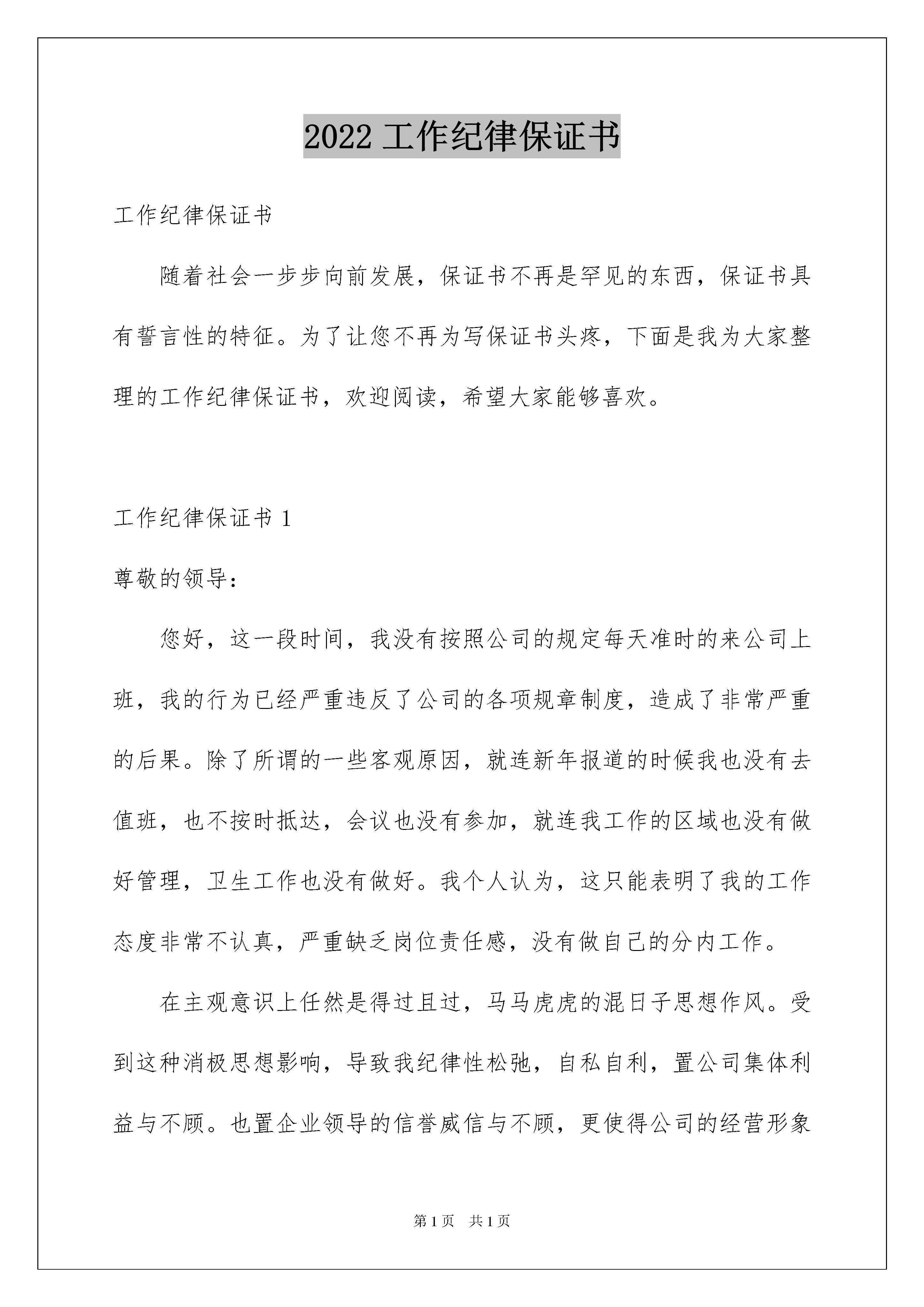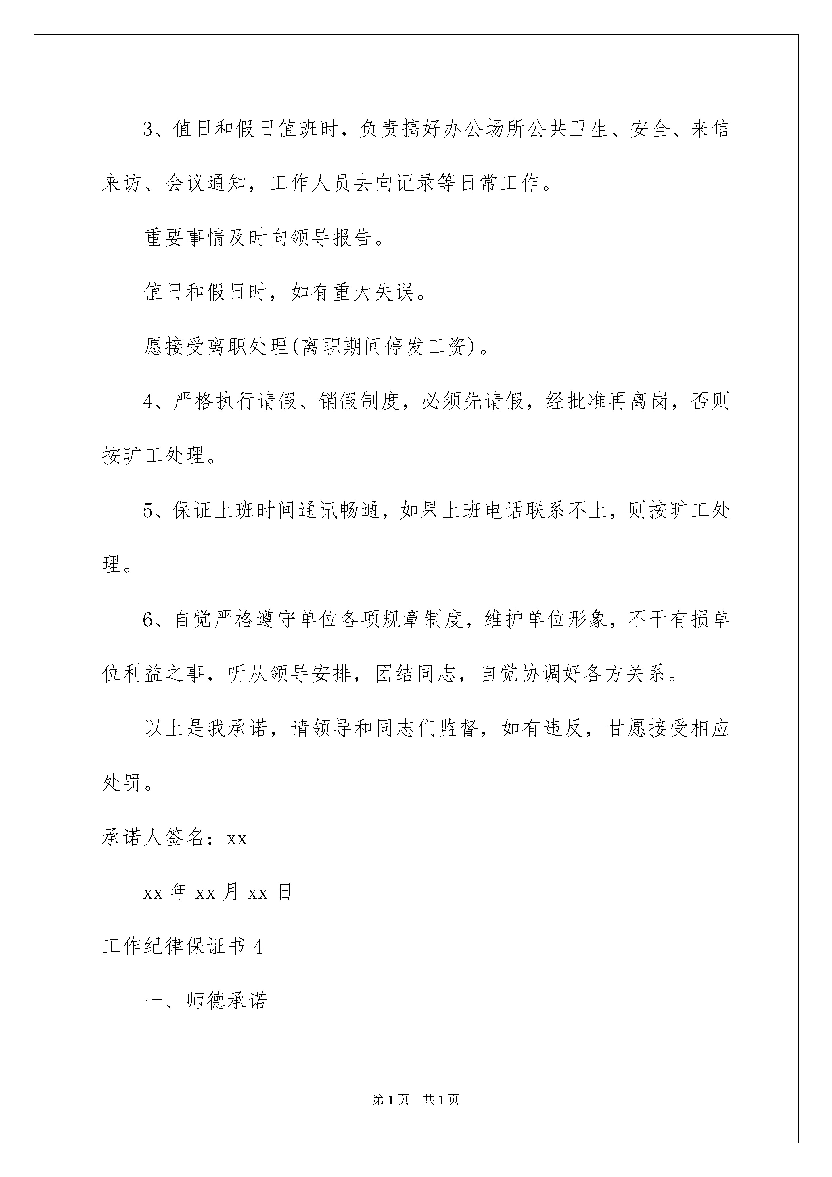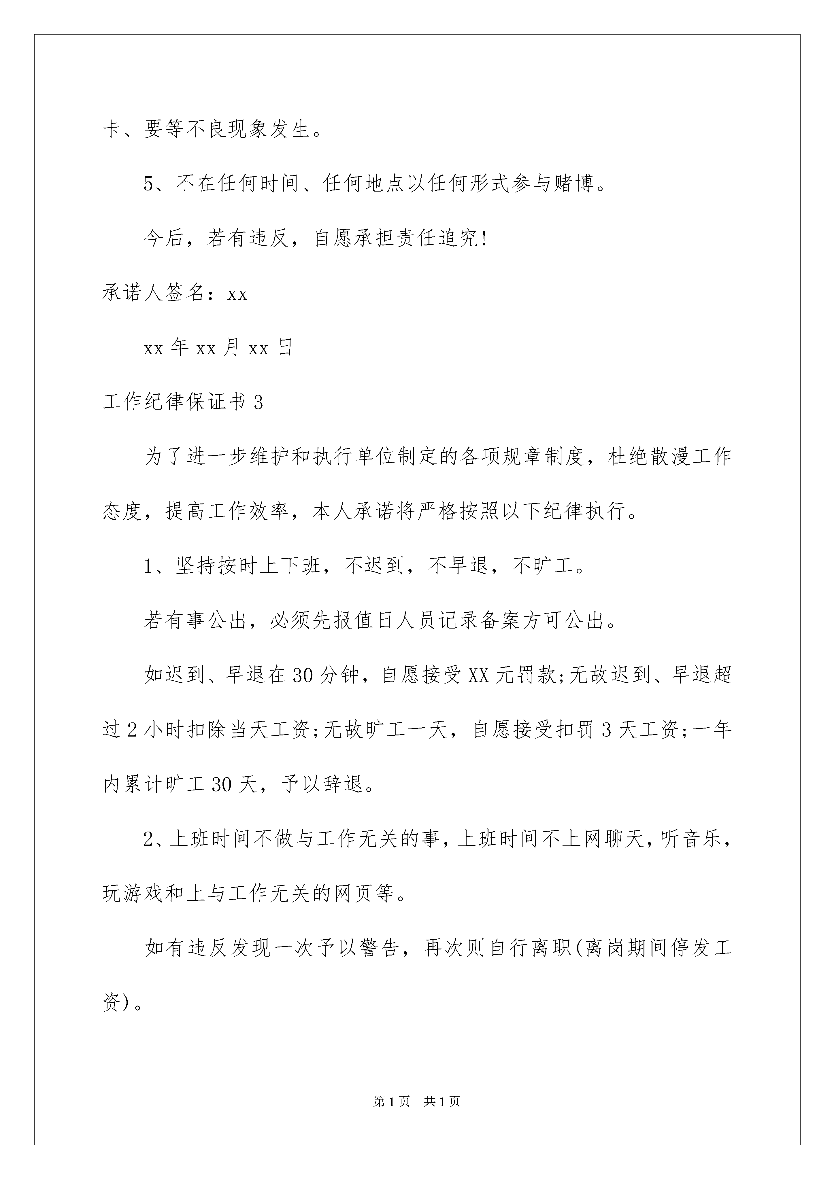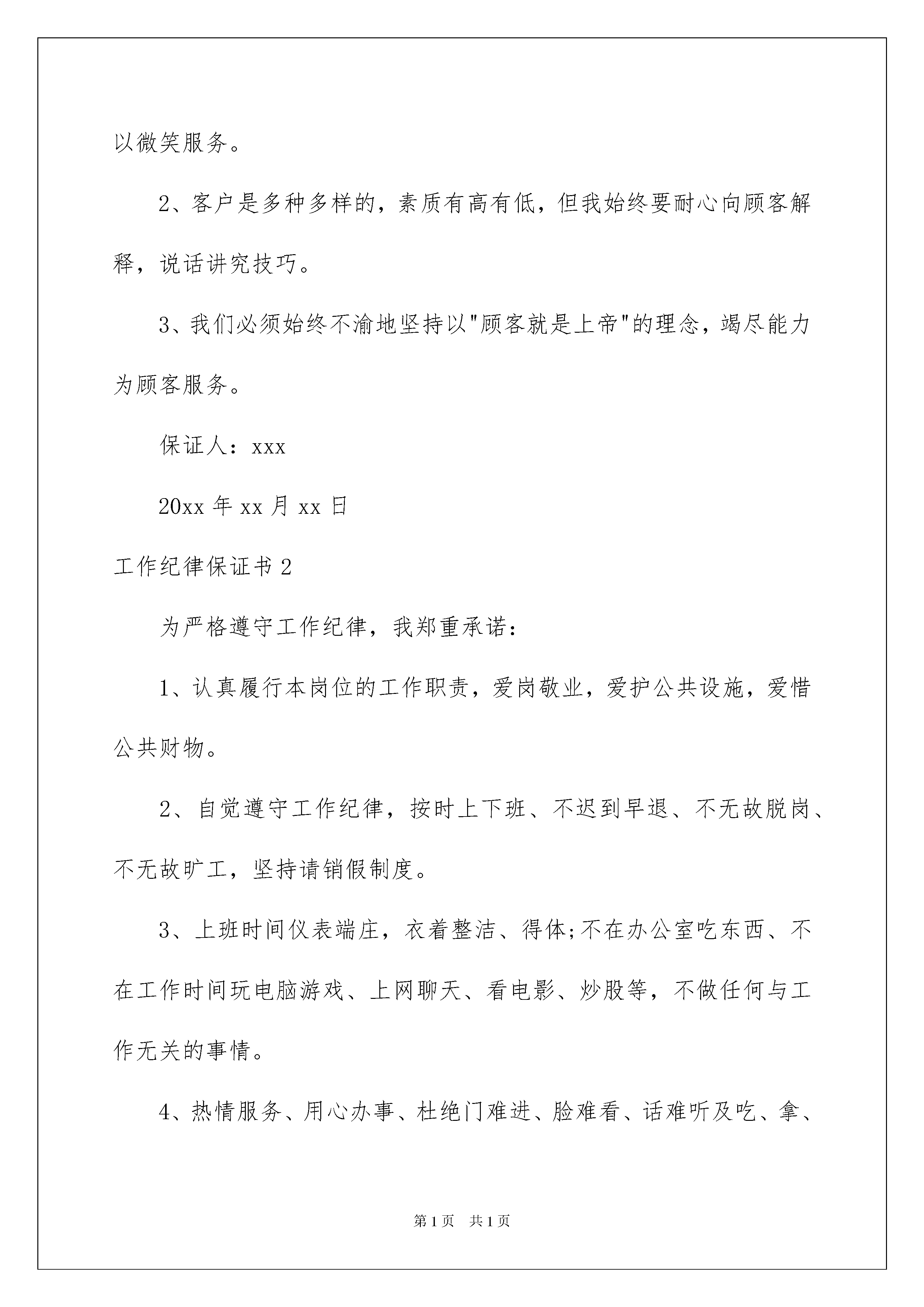 2022工作纪律保证书工作纪律保证书随着社会一步步向前发展,保证书不再是罕见的东西,保证书具有誓言性的特征。为了让您不再为写保证书头疼,下面是我为大家整理的工作纪律保证书,欢迎阅读,希望大家能够喜欢。工作纪律保证书1尊敬的领导:您好,这一段时间,我没有按照公司的规定每天准时的来公司上班,我的行为已经严重违反了公司的各项规章制度,造成了非常严重的后果。除了所谓的一些客观原因,就连新年报道的时候我也没有去值班,也不按时抵达,会议也没有参加,就连我工作的区域也没有做好管理,卫生工作也没有做好。我个人认为,这只能表明了我的工作态度非常不认真,严重缺乏岗位责任感,没有做自己的分内工作。在主观意识上任然是得过且过,马马虎虎的混日子思想作风。受到这种消极思想影响,导致我纪律性松弛,自私自利,置公司集体利益与不顾。也置企业领导的信誉威信与不顾,更使得公司的经营形象大受影响。我对自己犯下的严重错误感动极其痛苦,我自己陷入了深深的后悔和遗憾之中。在这个时刻,我心情无比悔恨,感到无比遗憾。由于我个人的原因,大大影响了公司的经营形象。我深知这件事情的严重性,我在此时此刻也意识到了我这样一项服务性行业对于客户的态度是何等的重要。但我觉得此次顾客投诉,领导将我的错误及时指出,并严厉批评我。从某种层面上讲,我也是幸运的。因为这次保证将我潜在的错误给爆发出来了,是在激励我改正错误,为以后更好的工作而努力。这对于我未来的人生工作道路,无疑是一个关键的转折点。所以,我要深深的保证,并由衷地对于领导的关心表示诚挚感谢。亲爱的领导者,下一阶段,我会牢记这次的教训。我要从内心深处认识到这样一个巨大的错误,其后果是无法想象的。我对顾客的怠慢,失礼和漫不经心,给公司造成了不良影响,让公司蒙受损失。再次我希望领导能够接受我诚挚的歉意,并在以后监督我,纠正我的错误。我知道,我无论如何努力都不足以弥补我的过错。特向领导保证如下:1、无论多么繁忙的业务,无论手头工作多么重要,我们必须坚持以微笑服务。2、客户是多种多样的,素质有高有低,但我始终要耐心向顾客解释,说话讲究技巧。3、我们必须始终不渝地坚持以"顾客就是上帝"的理念,竭尽能力为顾客服务。保证人:xxx20xx年xx月xx日工作纪律保证书2为严格遵守工作纪律,我郑重承诺:1、认真履行本岗位的工作职责,爱岗敬业,爱护公共设施,爱惜公共财物。2、自觉遵守工作纪律,按时上下班、不迟到早退、不无故脱岗、不无故旷工,坚持请销假制度。3、上班时间仪表端庄,衣着整洁、得体;不在办公室吃东西、不在工作时间玩电脑游戏、上网聊天、看电影、炒股等,不做任何与工作无关的事情。4、热情服务、用心办事、杜绝门难进、脸难看、话难听及吃、拿、卡、要等不良现象发生。5、不在任何时间、任何地点以任何形式参与赌博。今后,若有违反,自愿承担责任追究!承诺人签名:xxxx年xx月xx日工作纪律保证书3为了进一步维护和执行单位制定的各项规章制度,杜绝散漫工作态度,提高工作效率,本人承诺将严格按照以下纪律执行。1、坚持按时上下班,不迟到,不早退,不旷工。若有事公出,必须先报值日人员记录备案方可公出。如迟到、早退在30分钟,自愿接受XX元罚款;无故迟到、早退超过2小时扣除当天工资;无故旷工一天,自愿接受扣罚3天工资;一年内累计旷工30天,予以辞退。2、上班时间不做与工作无关的事,上班时间不上网聊天,听音乐,玩游戏和上与工作无关的网页等。如有违反发现一次予以警告,再次则自行离职(离岗期间停发工资)。3、值日和假日值班时,负责搞好办公场所公共卫生、安全、来信来访、会议通知,工作人员去向记录等日常工作。重要事情及时向领导报告。值日和假日时,如有重大失误。愿接受离职处理(离职期间停发工资)。4、严格执行请假、销假制度,必须先请假,经批准再离岗,否则按旷工处理。5、保证上班时间通讯畅通,如果上班电话联系不上,则按旷工处理。6、自觉严格遵守单位各项规章制度,维护单位形象,不干有损单位利益之事,听从领导安排,团结同志,自觉协调好各方关系。以上是我承诺,请领导和同志们监督,如有违反,甘愿接受相应处罚。承诺人签名:xxxx年xx月xx日工作纪律保证书4一、师德承诺1、时刻注意自己的仪表举止和言谈,讲文明,讲礼貌,在学生面前保持朴素、整洁、端庄、高雅的形象和气质,谨记为人师表。2、以大局为重,服从组织纪律,与同事和睦相处,精诚合作。3、在教学工作中使用规范的职业用语,不体罚和变相体罚学生,随时随地对学生保持满腔热忱,信任、宽容、理解、善待每一个学生。4、在家校联系工作中,不把自己应承担的教育责任推卸给家长,不埋怨家长,不接受学生或家长礼