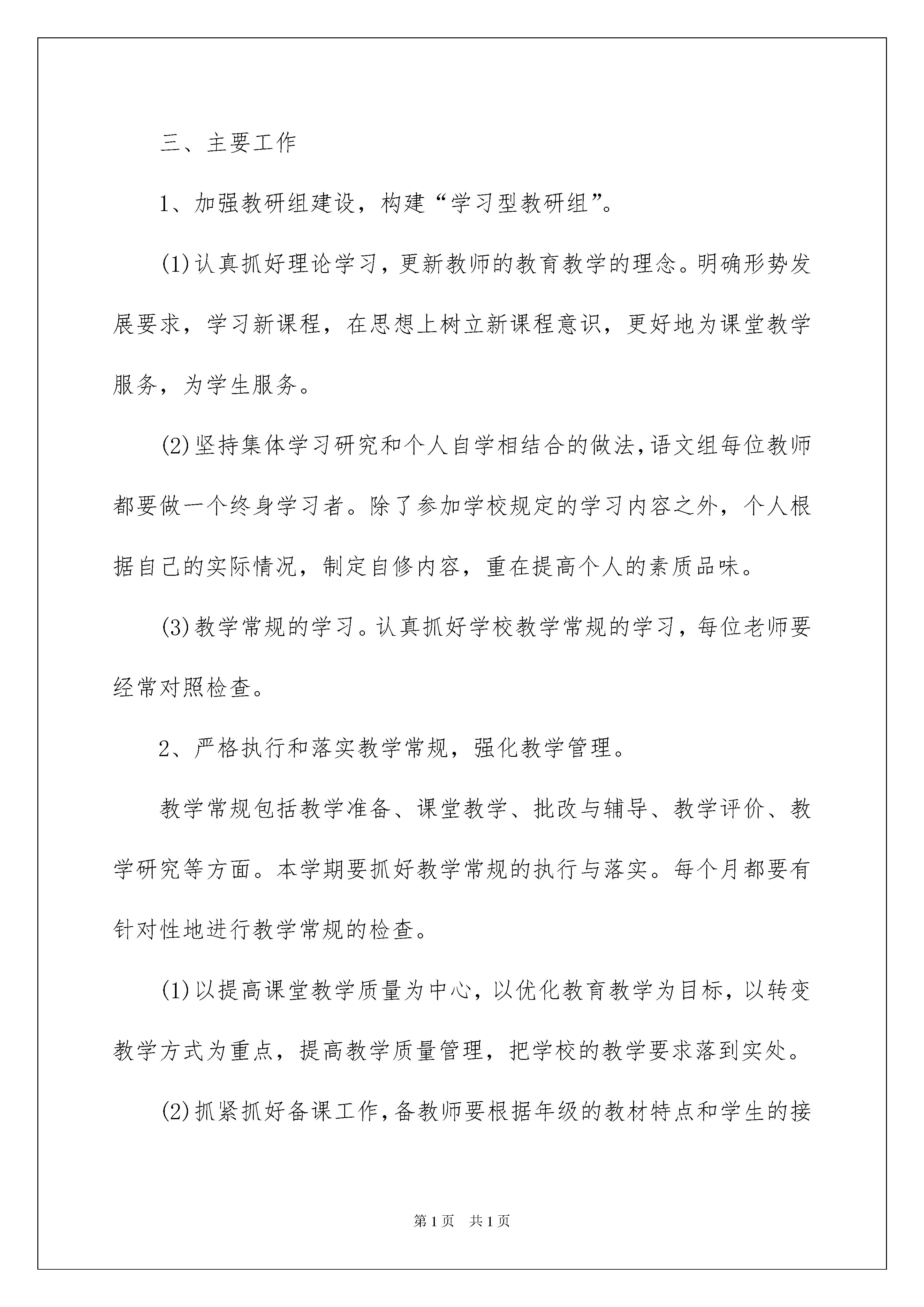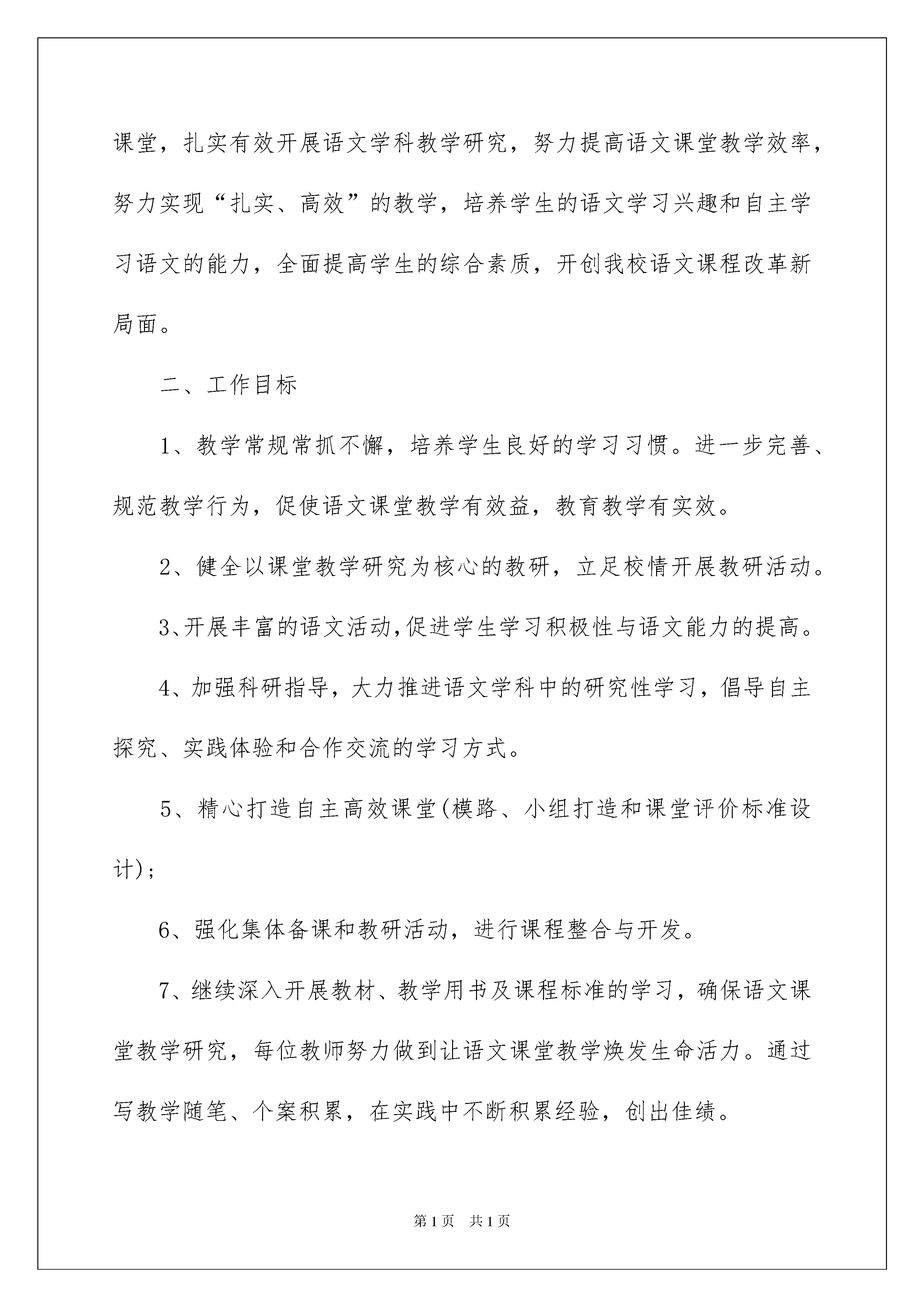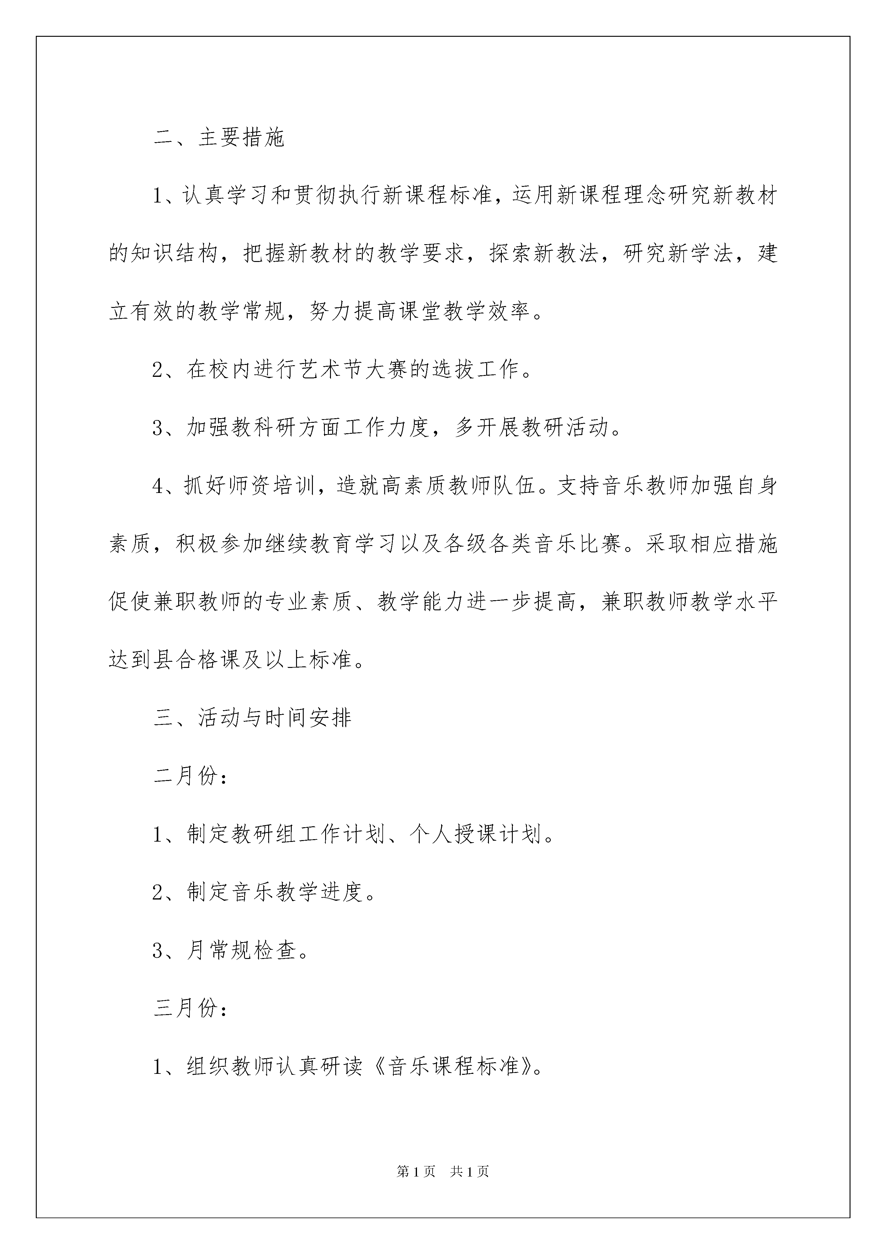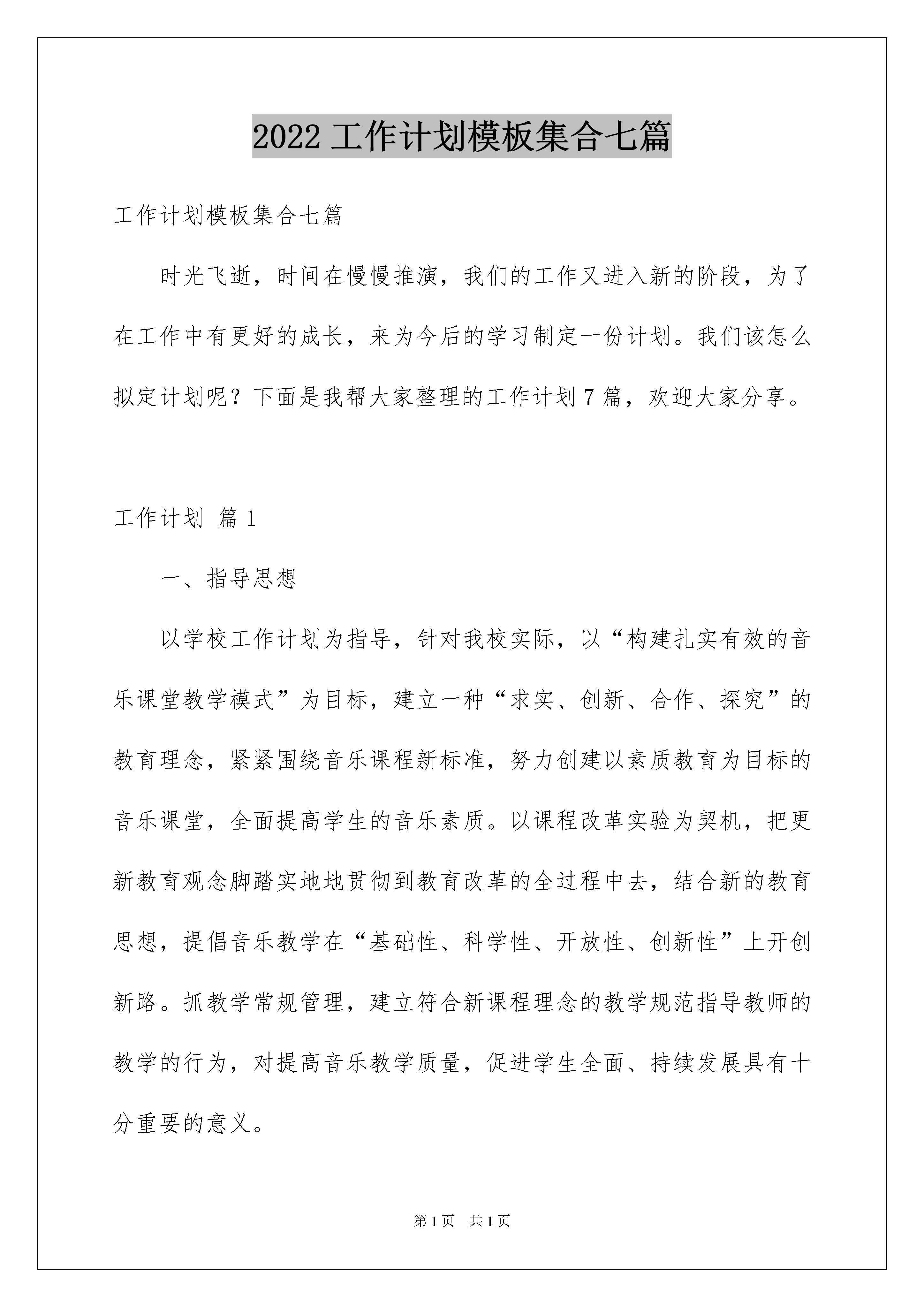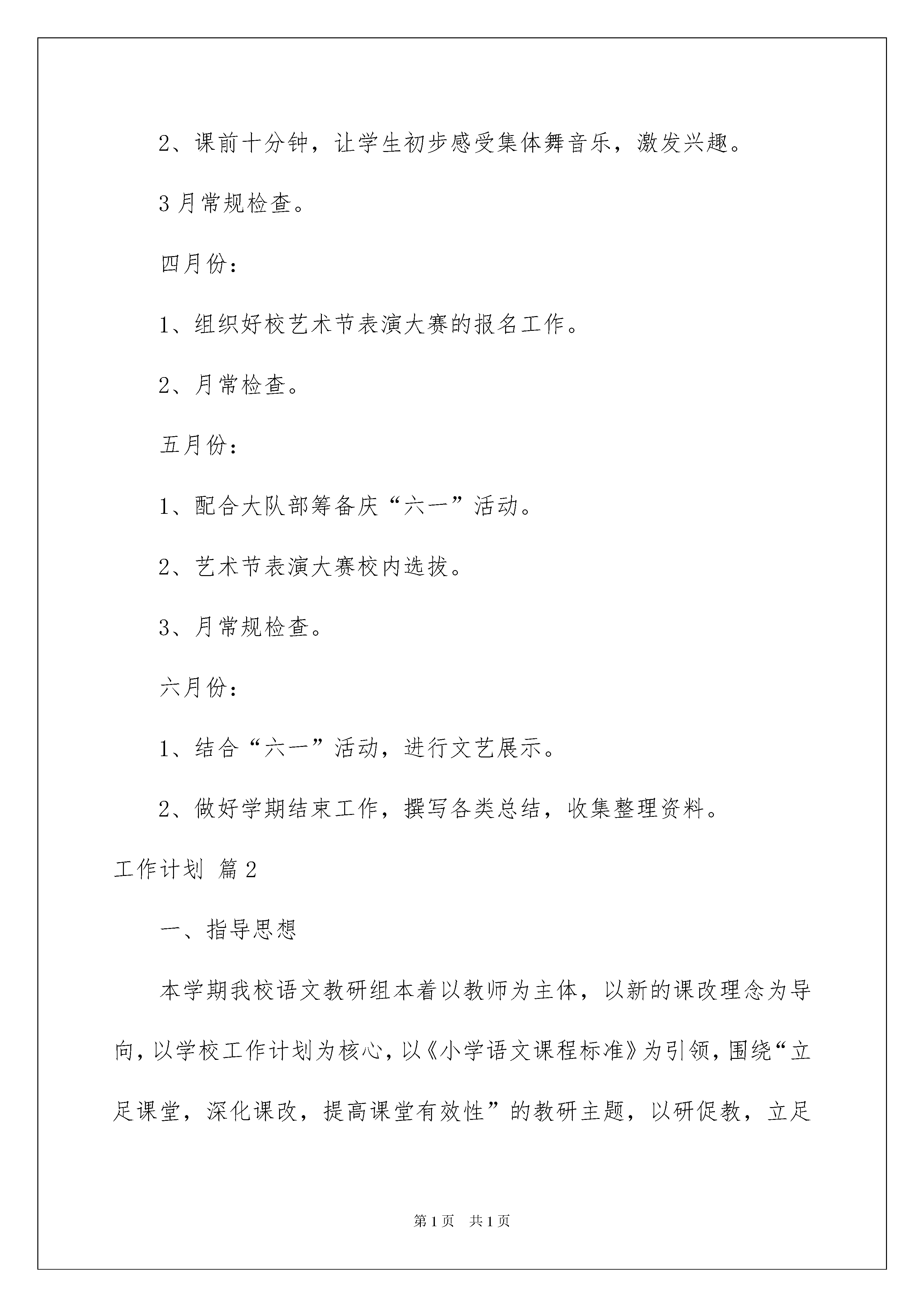2022工作计划模板集合七篇工作计划模板集合七篇时光飞逝,时间在慢慢推演,我们的工作又进入新的阶段,为了在工作中有更好的成长,来为今后的学习制定一份计划。我们该怎么拟定计划呢?下面是我帮大家整理的工作计划7篇,欢迎大家分享。工作计划篇1一、指导思想以学校工作计划为指导,针对我校实际,以“构建扎实有效的音乐课堂教学模式”为目标,建立一种“求实、创新、合作、探究”的教育理念,紧紧围绕音乐课程新标准,努力创建以素质教育为目标的音乐课堂,全面提高学生的音乐素质。以课程改革实验为契机,把更新教育观念脚踏实地地贯彻到教育改革的全过程中去,结合新的教育思想,提倡音乐教学在“基础性、科学性、开放性、创新性”上开创新路。抓教学常规管理,建立符合新课程理念的教学规范指导教师的教学的行为,对提高音乐教学质量,促进学生全面、持续发展具有十分重要的意义。二、主要措施1、认真学习和贯彻执行新课程标准,运用新课程理念研究新教材的知识结构,把握新教材的教学要求,探索新教法,研究新学法,建立有效的教学常规,努力提高课堂教学效率。2、在校内进行艺术节大赛的选拔工作。3、加强教科研方面工作力度,多开展教研活动。4、抓好师资培训,造就高素质教师队伍。支持音乐教师加强自身素质,积极参加继续教育学习以及各级各类音乐比赛。采取相应措施促使兼职教师的专业素质、教学能力进一步提高,兼职教师教学水平达到县合格课及以上标准。三、活动与时间安排二月份:1、制定教研组工作计划、个人授课计划。2、制定音乐教学进度。3、月常规检查。三月份:1、组织教师认真研读《音乐课程标准》。2、课前十分钟,让学生初步感受集体舞音乐,激发兴趣。3月常规检查。四月份:1、组织好校艺术节表演大赛的报名工作。2、月常检查。五月份:1、配合大队部筹备庆“六一”活动。2、艺术节表演大赛校内选拔。3、月常规检查。六月份:1、结合“六一”活动,进行文艺展示。2、做好学期结束工作,撰写各类总结,收集整理资料。工作计划篇2一、指导思想本学期我校语文教研组本着以教师为主体,以新的课改理念为导向,以学校工作计划为核心,以《小学语文课程标准》为引领,围绕“立足课堂,深化课改,提高课堂有效性”的教研主题,以研促教,立足课堂,扎实有效开展语文学科教学研究,努力提高语文课堂教学效率,努力实现“扎实、高效”的教学,培养学生的语文学习兴趣和自主学习语文的能力,全面提高学生的综合素质,开创我校语文课程改革新局面。二、工作目标1、教学常规常抓不懈,培养学生良好的学习习惯。进一步完善、规范教学行为,促使语文课堂教学有效益,教育教学有实效。2、健全以课堂教学研究为核心的教研,立足校情开展教研活动。3、开展丰富的语文活动,促进学生学习积极性与语文能力的提高。4、加强科研指导,大力推进语文学科中的研究性学习,倡导自主探究、实践体验和合作交流的学习方式。5、精心打造自主高效课堂(模路、小组打造和课堂评价标准设计);6、强化集体备课和教研活动,进行课程整合与开发。7、继续深入开展教材、教学用书及课程标准的学习,确保语文课堂教学研究,每位教师努力做到让语文课堂教学焕发生命活力。通过写教学随笔、个案积累,在实践中不断积累经验,创出佳绩。三、主要工作1、加强教研组建设,构建“学习型教研组”。(1)认真抓好理论学习,更新教师的教育教学的理念。明确形势发展要求,学习新课程,在思想上树立新课程意识,更好地为课堂教学服务,为学生服务。(2)坚持集体学习研究和个人自学相结合的做法,语文组每位教师都要做一个终身学习者。除了参加学校规定的学习内容之外,个人根据自己的实际情况,制定自修内容,重在提高个人的素质品味。(3)教学常规的学习。认真抓好学校教学常规的学习,每位老师要经常对照检查。2、严格执行和落实教学常规,强化教学管理。教学常规包括教学准备、课堂教学、批改与辅导、教学评价、教学研究等方面。本学期要抓好教学常规的执行与落实。每个月都要有针对性地进行教学常规的检查。(1)以提高课堂教学质量为中心,以优化教育教学为目标,以转变教学方式为重点,提高教学质量管理,把学校的教学要求落到实处。(2)抓紧抓好备课工作,备教师要根据年级的教材特点和学生的接受能力,安排好教学计划,落实提高教学质量的措施,把培养学生的学习能力放在首位。(3)积极开展集体备课活动。要力求改变照抄照搬教案,与上课相脱节的现象。备课时,应注意及时吸收新的教学信息,优化教学过程,完善自己的备课思路,要注意学习与借鉴,但切忌照搬照抄。尝试大单元教学,备课时,要在深入分析每个单元(或每个系列)教材的基础上。(4)加强组内听课评课活动。要认真填写听课记录,不能弄