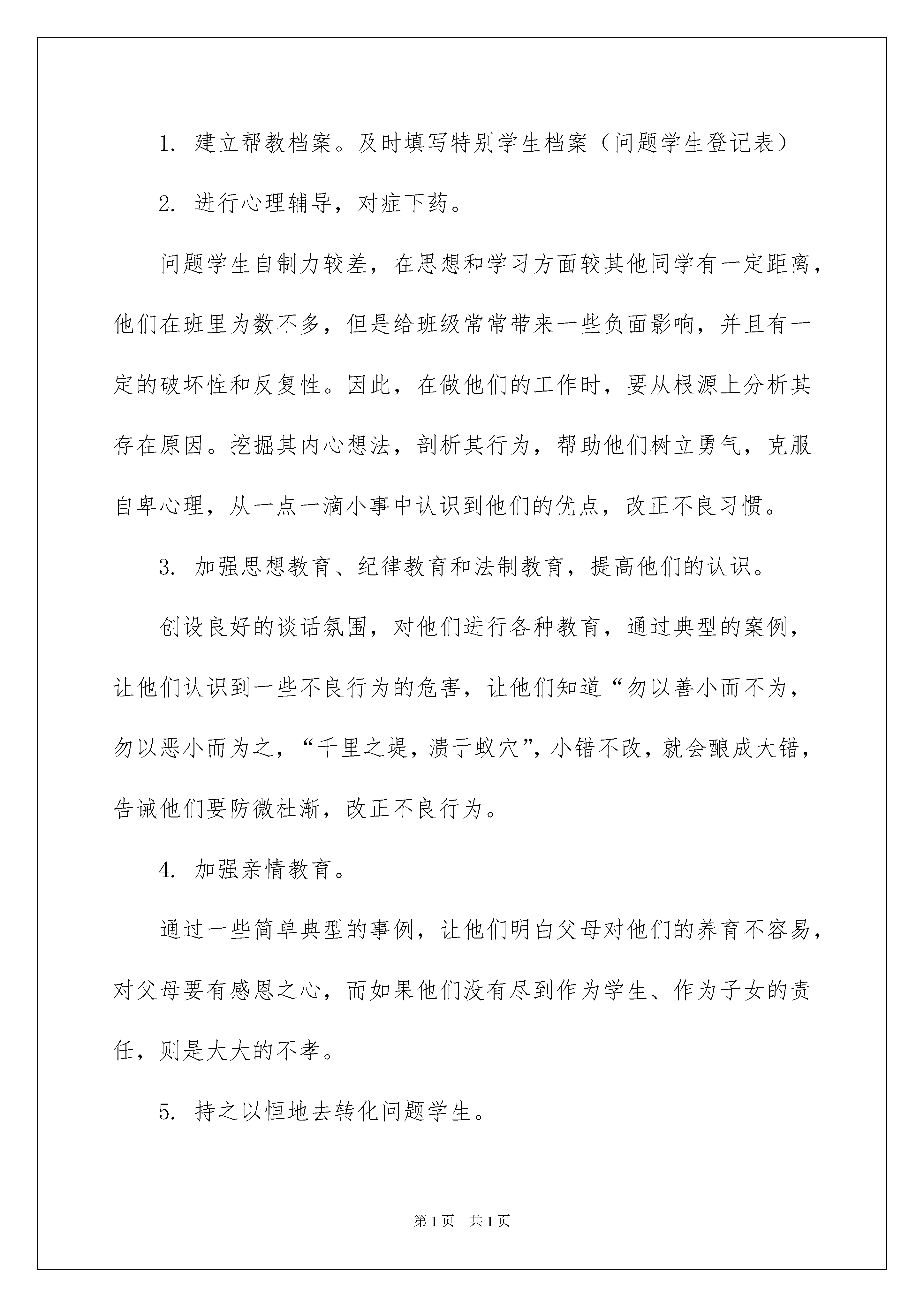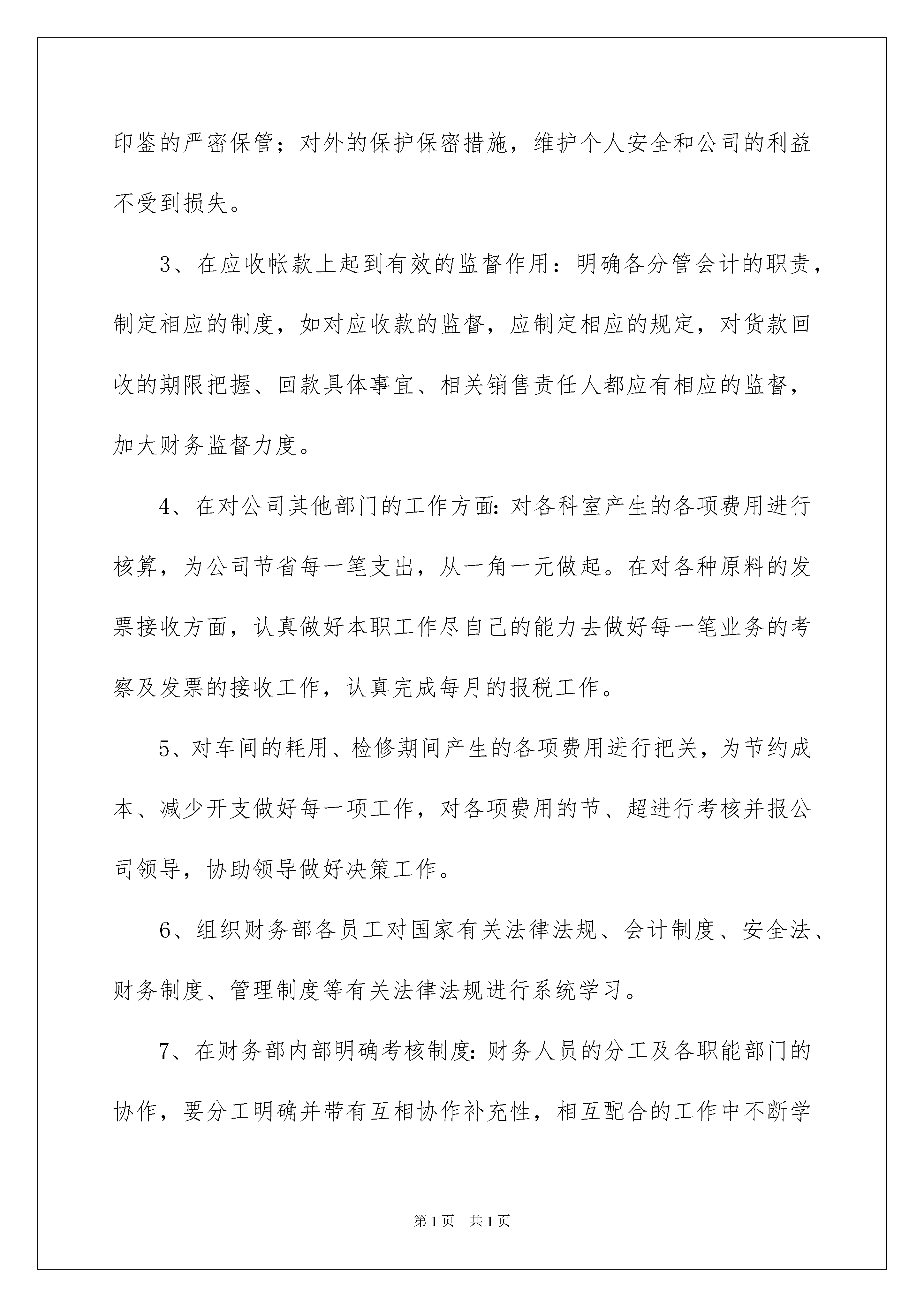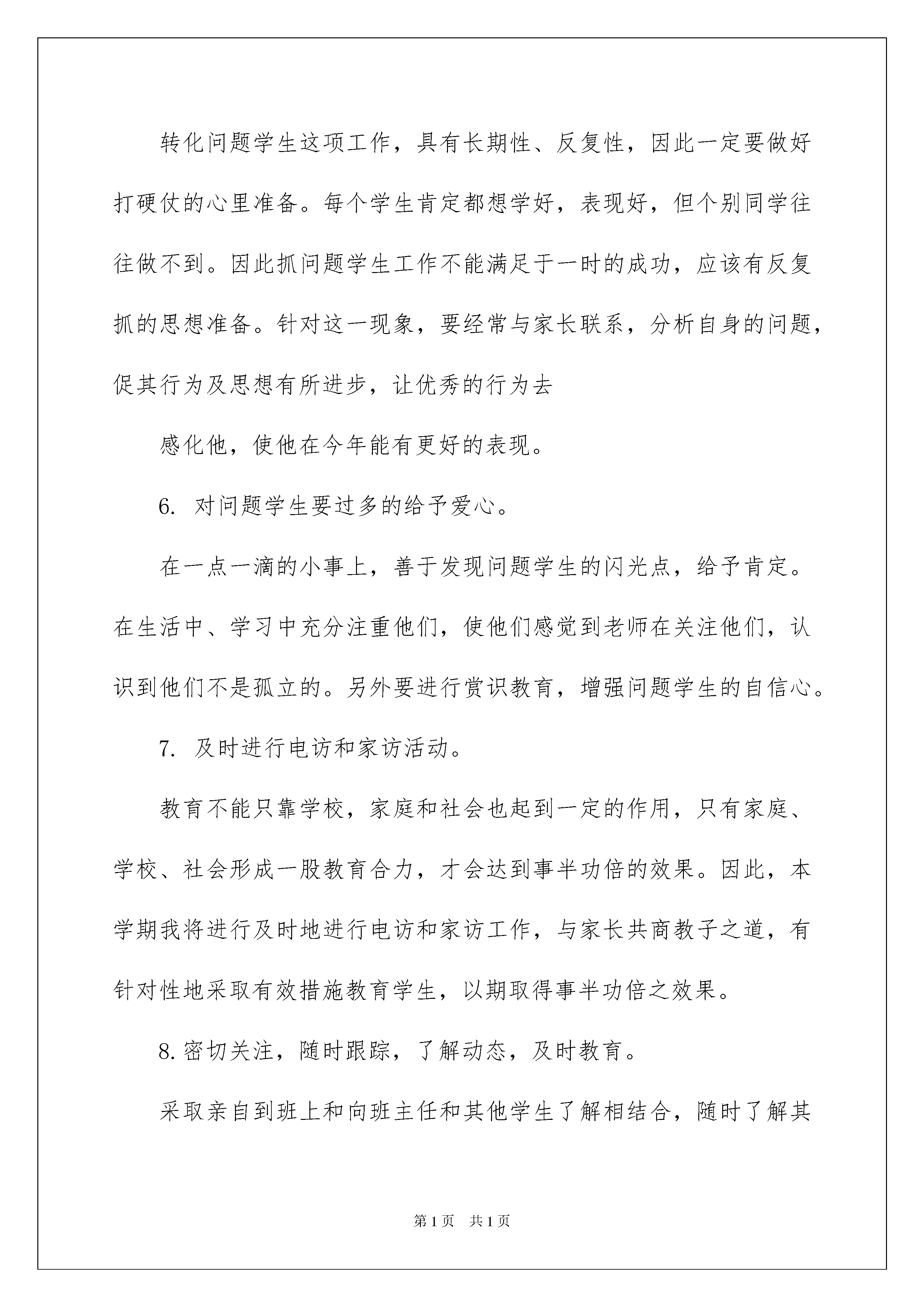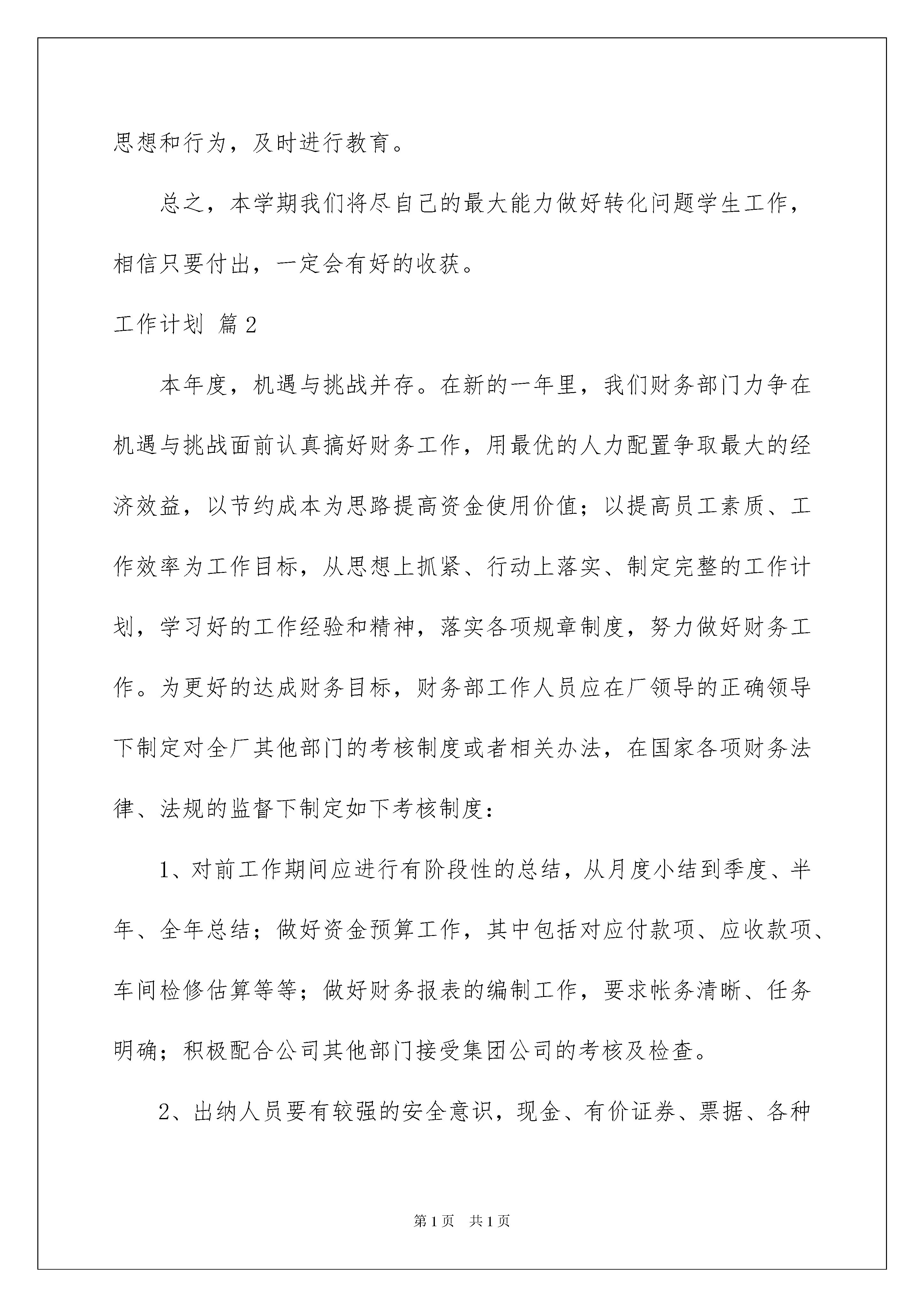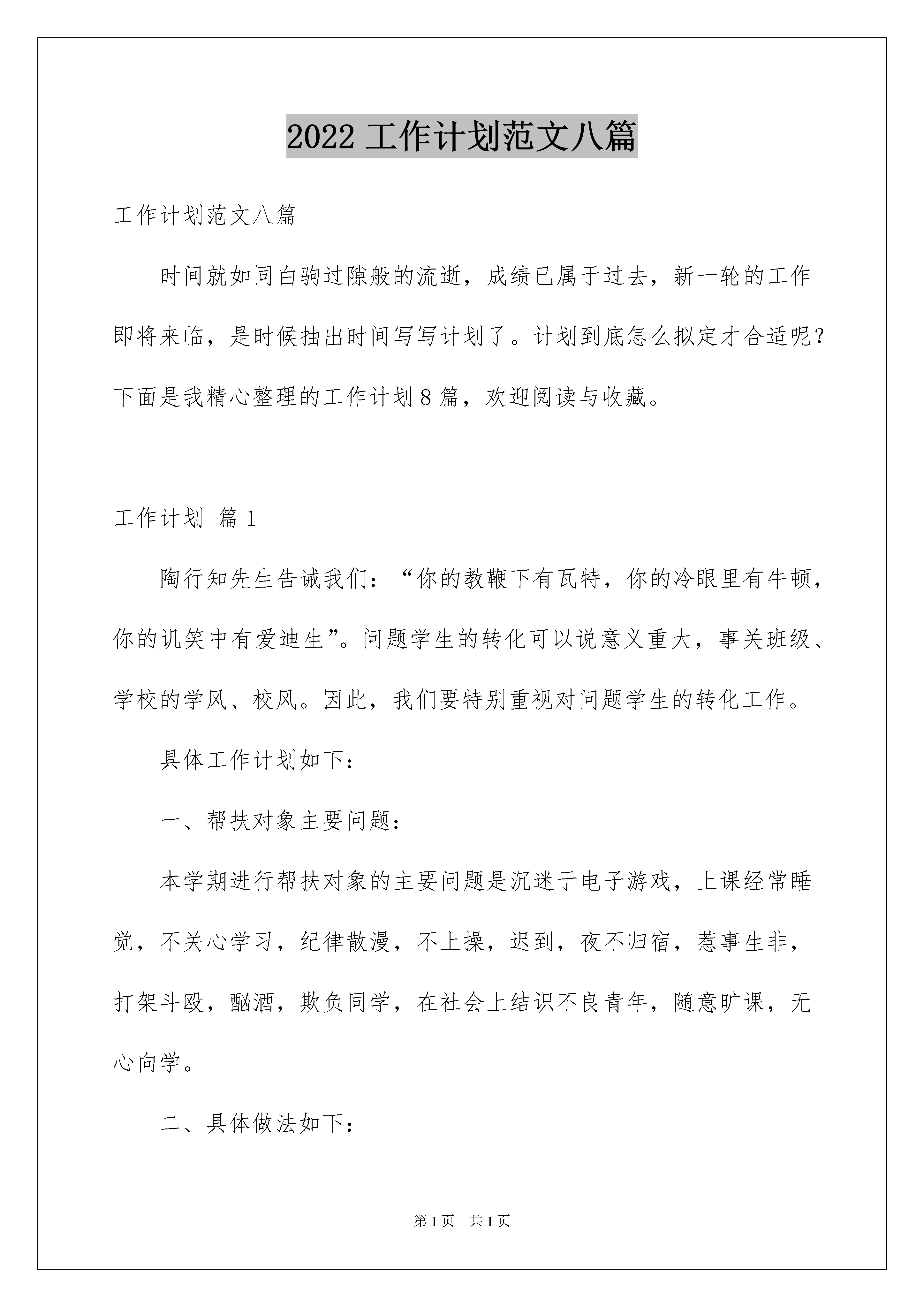 2022工作计划范文八篇工作计划范文八篇时间就如同白驹过隙般的流逝,成绩已属于过去,新一轮的工作即将来临,是时候抽出时间写写计划了。计划到底怎么拟定才合适呢?下面是我精心整理的工作计划8篇,欢迎阅读与收藏。工作计划篇1陶行知先生告诫我们:“你的教鞭下有瓦特,你的冷眼里有牛顿,你的讥笑中有爱迪生”。问题学生的转化可以说意义重大,事关班级、学校的学风、校风。因此,我们要特别重视对问题学生的转化工作。具体工作计划如下:一、帮扶对象主要问题:本学期进行帮扶对象的主要问题是沉迷于电子游戏,上课经常睡觉,不关心学习,纪律散漫,不上操,迟到,夜不归宿,惹事生非,打架斗殴,酗酒,欺负同学,在社会上结识不良青年,随意旷课,无心向学。二、具体做法如下:1.建立帮教档案。及时填写特别学生档案(问题学生登记表)2.进行心理辅导,对症下药。问题学生自制力较差,在思想和学习方面较其他同学有一定距离,他们在班里为数不多,但是给班级常常带来一些负面影响,并且有一定的破坏性和反复性。因此,在做他们的工作时,要从根源上分析其存在原因。挖掘其内心想法,剖析其行为,帮助他们树立勇气,克服自卑心理,从一点一滴小事中认识到他们的优点,改正不良习惯。3.加强思想教育、纪律教育和法制教育,提高他们的认识。创设良好的谈话氛围,对他们进行各种教育,通过典型的案例,让他们认识到一些不良行为的危害,让他们知道“勿以善小而不为,勿以恶小而为之,“千里之堤,溃于蚁穴”,小错不改,就会酿成大错,告诫他们要防微杜渐,改正不良行为。4.加强亲情教育。通过一些简单典型的事例,让他们明白父母对他们的养育不容易,对父母要有感恩之心,而如果他们没有尽到作为学生、作为子女的责任,则是大大的不孝。5.持之以恒地去转化问题学生。转化问题学生这项工作,具有长期性、反复性,因此一定要做好打硬仗的心里准备。每个学生肯定都想学好,表现好,但个别同学往往做不到。因此抓问题学生工作不能满足于一时的成功,应该有反复抓的思想准备。针对这一现象,要经常与家长联系,分析自身的问题,促其行为及思想有所进步,让优秀的行为去感化他,使他在今年能有更好的表现。6.对问题学生要过多的给予爱心。在一点一滴的小事上,善于发现问题学生的闪光点,给予肯定。在生活中、学习中充分注重他们,使他们感觉到老师在关注他们,认识到他们不是孤立的。另外要进行赏识教育,增强问题学生的自信心。7.及时进行电访和家访活动。教育不能只靠学校,家庭和社会也起到一定的作用,只有家庭、学校、社会形成一股教育合力,才会达到事半功倍的效果。因此,本学期我将进行及时地进行电访和家访工作,与家长共商教子之道,有针对性地采取有效措施教育学生,以期取得事半功倍之效果。8.密切关注,随时跟踪,了解动态,及时教育。采取亲自到班上和向班主任和其他学生了解相结合,随时了解其思想和行为,及时进行教育。总之,本学期我们将尽自己的最大能力做好转化问题学生工作,相信只要付出,一定会有好的收获。工作计划篇2本年度,机遇与挑战并存。在新的一年里,我们财务部门力争在机遇与挑战面前认真搞好财务工作,用最优的人力配置争取最大的经济效益,以节约成本为思路提高资金使用价值;以提高员工素质、工作效率为工作目标,从思想上抓紧、行动上落实、制定完整的工作计划,学习好的工作经验和精神,落实各项规章制度,努力做好财务工作。为更好的达成财务目标,财务部工作人员应在厂领导的正确领导下制定对全厂其他部门的考核制度或者相关办法,在国家各项财务法律、法规的监督下制定如下考核制度:1、对前工作期间应进行有阶段性的总结,从月度小结到季度、半年、全年总结;做好资金预算工作,其中包括对应付款项、应收款项、车间检修估算等等;做好财务报表的编制工作,要求帐务清晰、任务明确;积极配合公司其他部门接受集团公司的考核及检查。2、出纳人员要有较强的安全意识,现金、有价证券、票据、各种印鉴的严密保管;对外的保护保密措施,维护个人安全和公司的利益不受到损失。3、在应收帐款上起到有效的监督作用:明确各分管会计的职责,制定相应的制度,如对应收款的监督,应制定相应的规定,对货款回收的期限把握、回款具体事宜、相关销售责任人都应有相应的监督,加大财务监督力度。4、在对公司其他部门的工作方面:对各科室产生的各项费用进行核算,为公司节省每一笔支出,从一角一元做起。在对各种原料的发票接收方面,认真做好本职工作尽自己的能力去做好每一笔业务的考察及发票的接收工作,认真完成每月的报税工作。5、对车间的耗用、检修期间产生的各项费用进行把关,为节约成本、减少开支做好每一项工作,对各项费用的节、超进行考核并报公司领导,协助领导