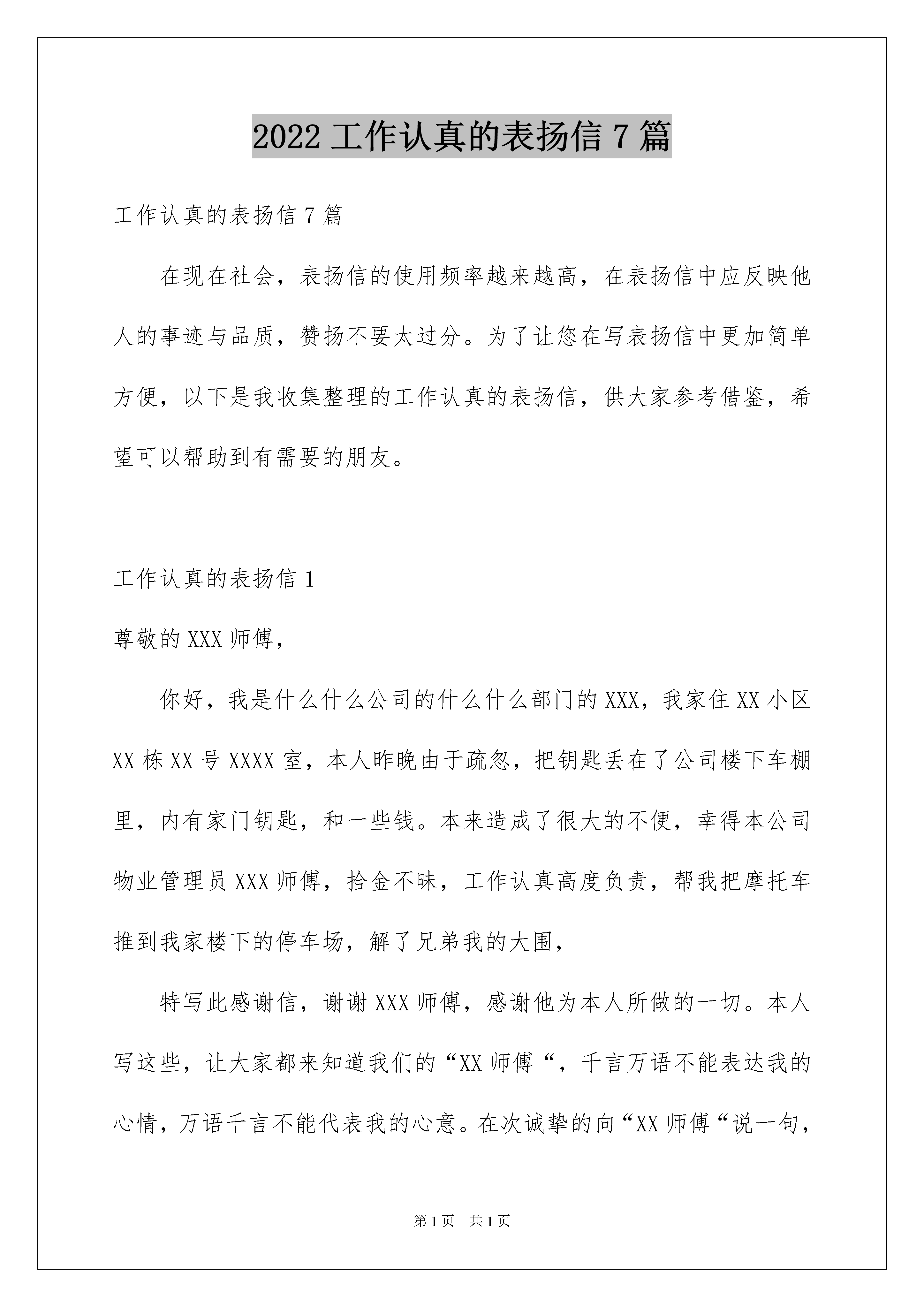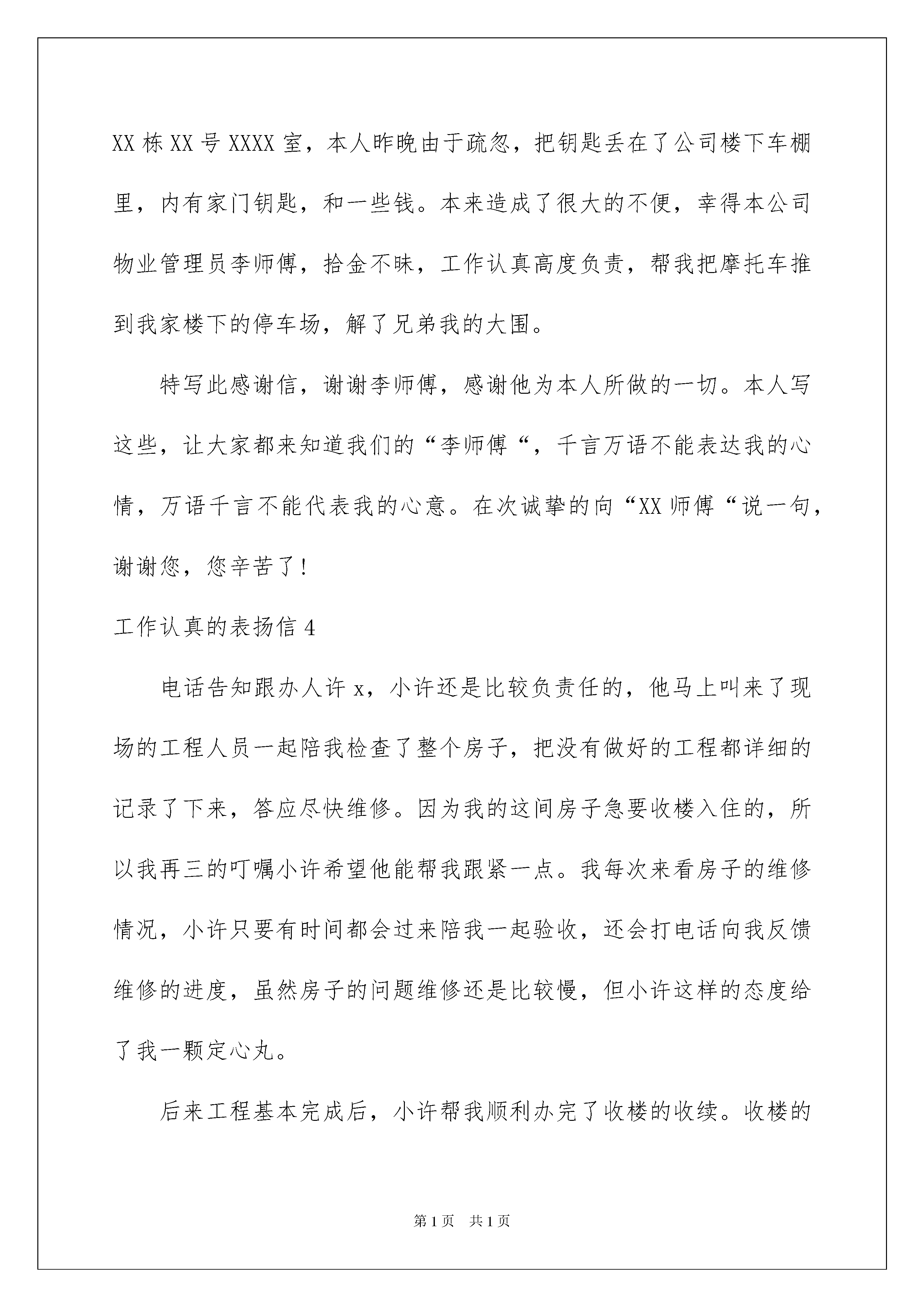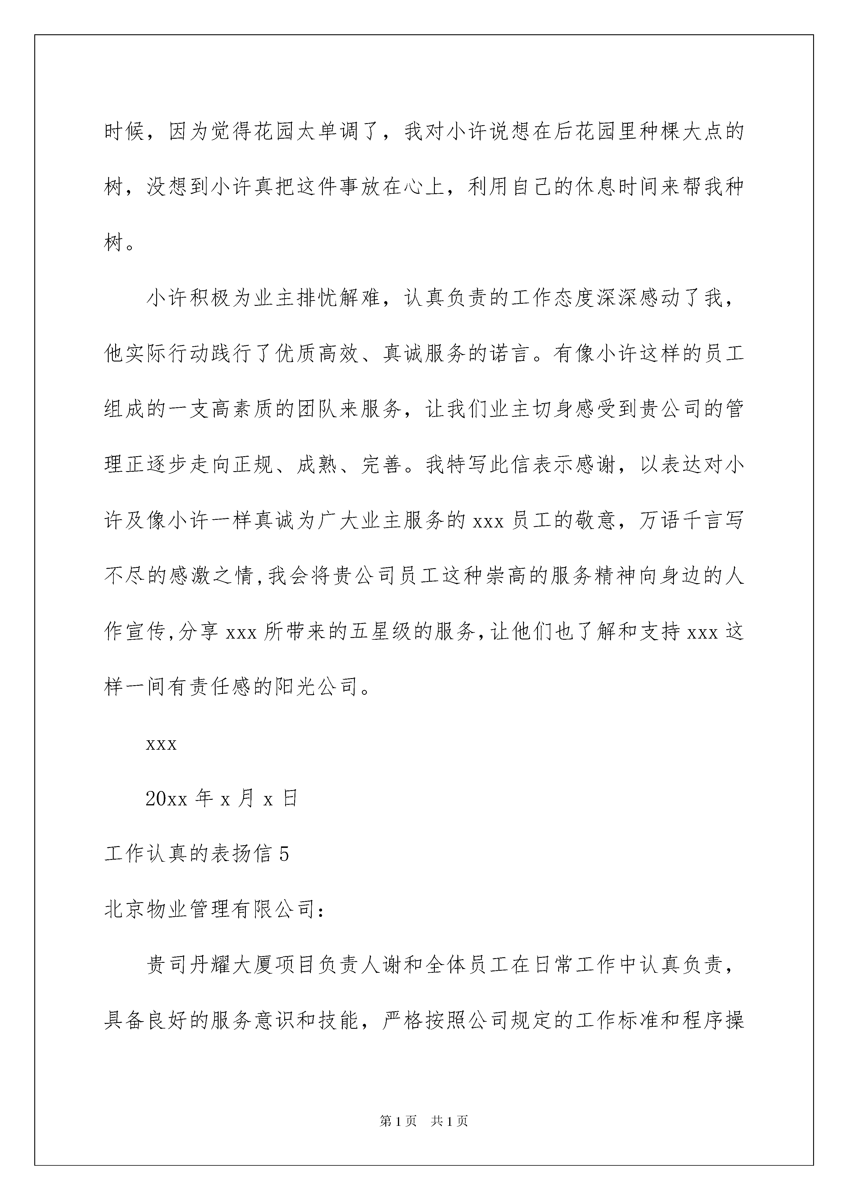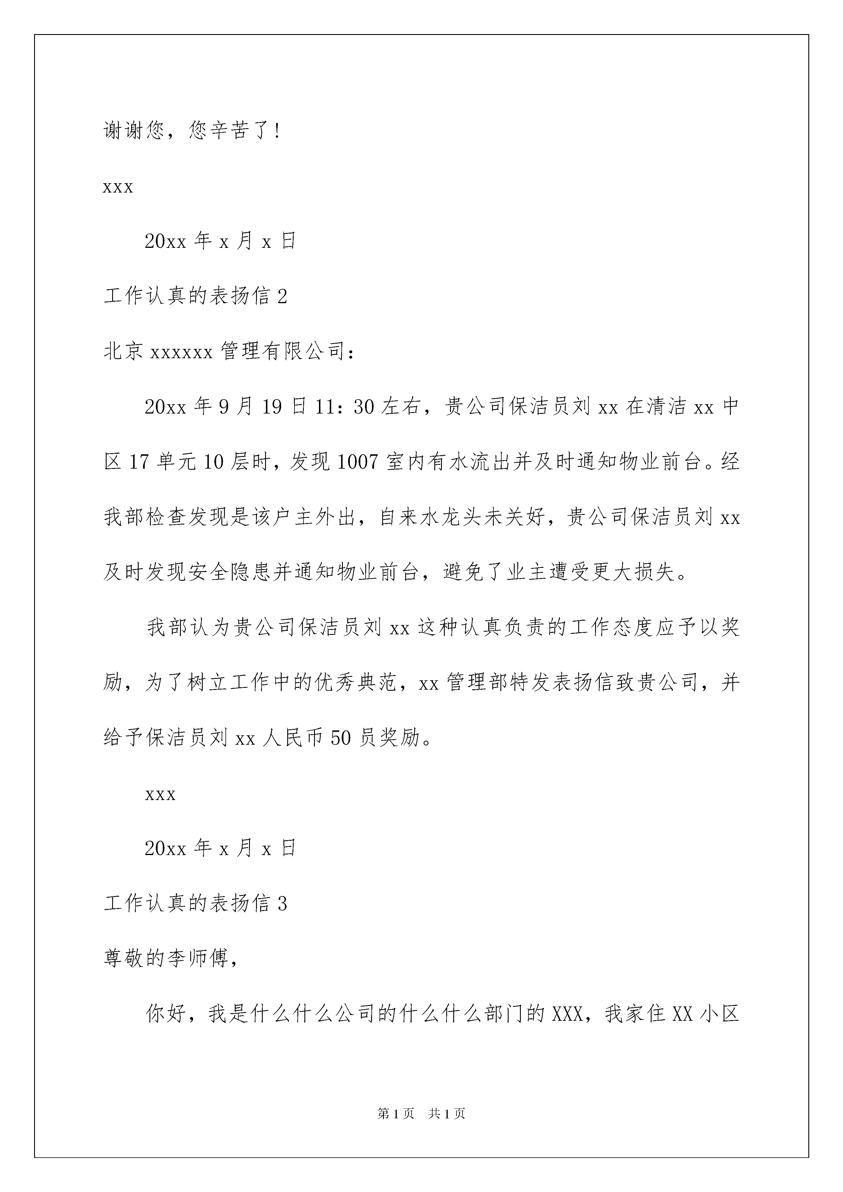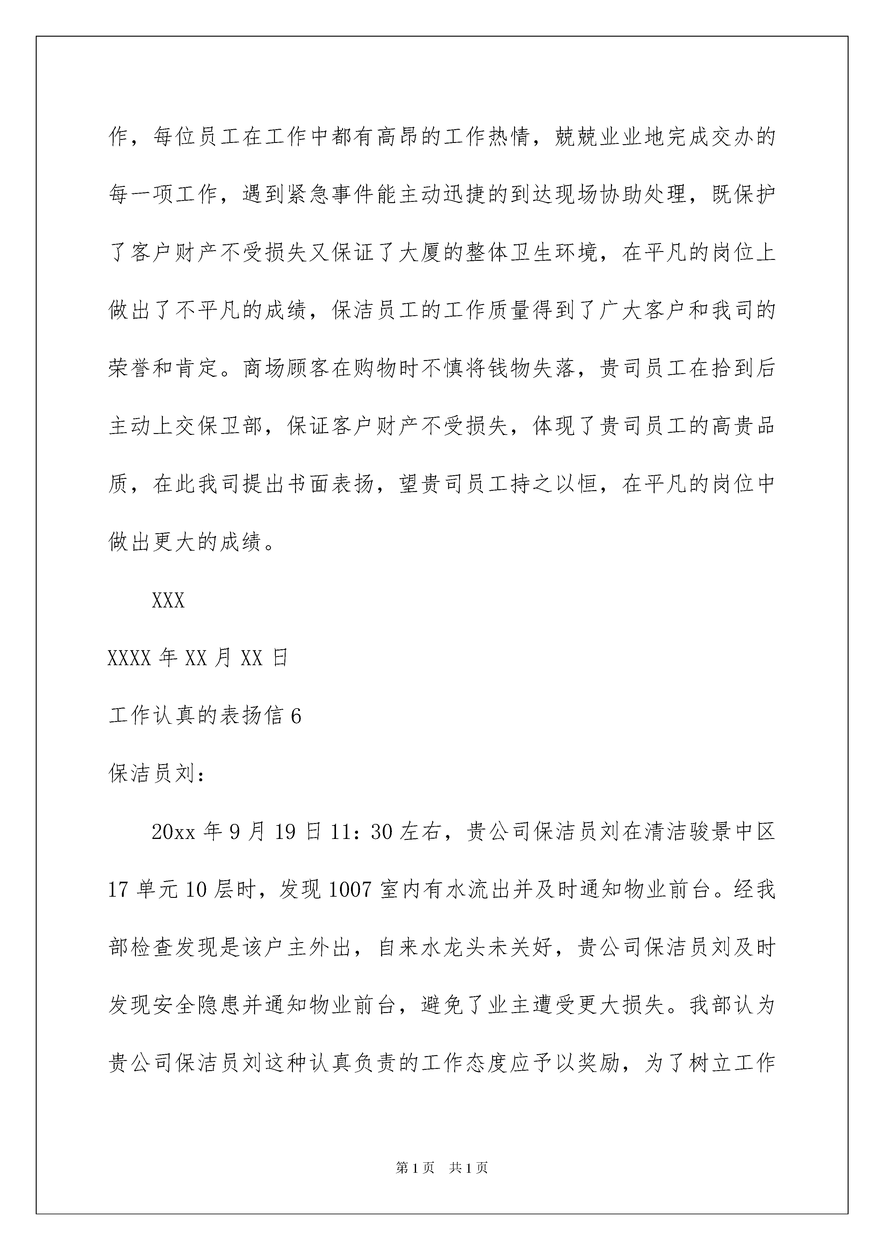 2022工作认真的表扬信7篇工作认真的表扬信7篇在现在社会,表扬信的使用频率越来越高,在表扬信中应反映他人的事迹与品质,赞扬不要太过分。为了让您在写表扬信中更加简单方便,以下是我收集整理的工作认真的表扬信,供大家参考借鉴,希望可以帮助到有需要的朋友。工作认真的表扬信1尊敬的XXX师傅,你好,我是什么什么公司的什么什么部门的XXX,我家住XX小区XX栋XX号XXXX室,本人昨晚由于疏忽,把钥匙丢在了公司楼下车棚里,内有家门钥匙,和一些钱。本来造成了很大的不便,幸得本公司物业管理员XXX师傅,拾金不昧,工作认真高度负责,帮我把摩托车推到我家楼下的停车场,解了兄弟我的大围,特写此感谢信,谢谢XXX师傅,感谢他为本人所做的一切。本人写这些,让大家都来知道我们的“XX师傅“,千言万语不能表达我的心情,万语千言不能代表我的心意。在次诚挚的向“XX师傅“说一句,谢谢您,您辛苦了!xxx20xx年x月x日工作认真的表扬信2北京xxxxxx管理有限公司:20xx年9月19日11:30左右,贵公司保洁员刘xx在清洁xx中区17单元10层时,发现1007室内有水流出并及时通知物业前台。经我部检查发现是该户主外出,自来水龙头未关好,贵公司保洁员刘xx及时发现安全隐患并通知物业前台,避免了业主遭受更大损失。我部认为贵公司保洁员刘xx这种认真负责的工作态度应予以奖励,为了树立工作中的优秀典范,xx管理部特发表扬信致贵公司,并给予保洁员刘xx人民币50员奖励。xxx20xx年x月x日工作认真的表扬信3尊敬的李师傅,你好,我是什么什么公司的什么什么部门的XXX,我家住XX小区XX栋XX号XXXX室,本人昨晚由于疏忽,把钥匙丢在了公司楼下车棚里,内有家门钥匙,和一些钱。本来造成了很大的不便,幸得本公司物业管理员李师傅,拾金不昧,工作认真高度负责,帮我把摩托车推到我家楼下的停车场,解了兄弟我的大围。特写此感谢信,谢谢李师傅,感谢他为本人所做的一切。本人写这些,让大家都来知道我们的“李师傅“,千言万语不能表达我的心情,万语千言不能代表我的心意。在次诚挚的向“XX师傅“说一句,谢谢您,您辛苦了!工作认真的表扬信4电话告知跟办人许x,小许还是比较负责任的,他马上叫来了现场的工程人员一起陪我检查了整个房子,把没有做好的工程都详细的记录了下来,答应尽快维修。因为我的这间房子急要收楼入住的,所以我再三的叮嘱小许希望他能帮我跟紧一点。我每次来看房子的维修情况,小许只要有时间都会过来陪我一起验收,还会打电话向我反馈维修的进度,虽然房子的问题维修还是比较慢,但小许这样的态度给了我一颗定心丸。后来工程基本完成后,小许帮我顺利办完了收楼的收续。收楼的时候,因为觉得花园太单调了,我对小许说想在后花园里种棵大点的树,没想到小许真把这件事放在心上,利用自己的休息时间来帮我种树。小许积极为业主排忧解难,认真负责的工作态度深深感动了我,他实际行动践行了优质高效、真诚服务的诺言。有像小许这样的员工组成的一支高素质的团队来服务,让我们业主切身感受到贵公司的管理正逐步走向正规、成熟、完善。我特写此信表示感谢,以表达对小许及像小许一样真诚为广大业主服务的xxx员工的敬意,万语千言写不尽的感激之情,我会将贵公司员工这种崇高的服务精神向身边的人作宣传,分享xxx所带来的五星级的服务,让他们也了解和支持xxx这样一间有责任感的阳光公司。xxx20xx年x月x日工作认真的表扬信5北京物业管理有限公司:贵司丹耀大厦项目负责人谢和全体员工在日常工作中认真负责,具备良好的服务意识和技能,严格按照公司规定的工作标准和程序操作,每位员工在工作中都有高昂的工作热情,兢兢业业地完成交办的每一项工作,遇到紧急事件能主动迅捷的到达现场协助处理,既保护了客户财产不受损失又保证了大厦的整体卫生环境,在平凡的岗位上做出了不平凡的成绩,保洁员工的工作质量得到了广大客户和我司的荣誉和肯定。商场顾客在购物时不慎将钱物失落,贵司员工在拾到后主动上交保卫部,保证客户财产不受损失,体现了贵司员工的高贵品质,在此我司提出书面表扬,望贵司员工持之以恒,在平凡的岗位中做出更大的成绩。XXXXXXX年XX月XX日工作认真的表扬信6保洁员刘:20xx年9月19日11:30左右,贵公司保洁员刘在清洁骏景中区17单元10层时,发现1007室内有水流出并及时通知物业前台。经我部检查发现是该户主外出,自来水龙头未关好,贵公司保洁员刘及时发现安全隐患并通知物业前台,避免了业主遭受更大损失。我部认为贵公司保洁员刘这种认真负责的工作态度应予以奖励,为了树立工作中的优秀典范,骏景管理部特发表扬信致贵公司,并给予保洁