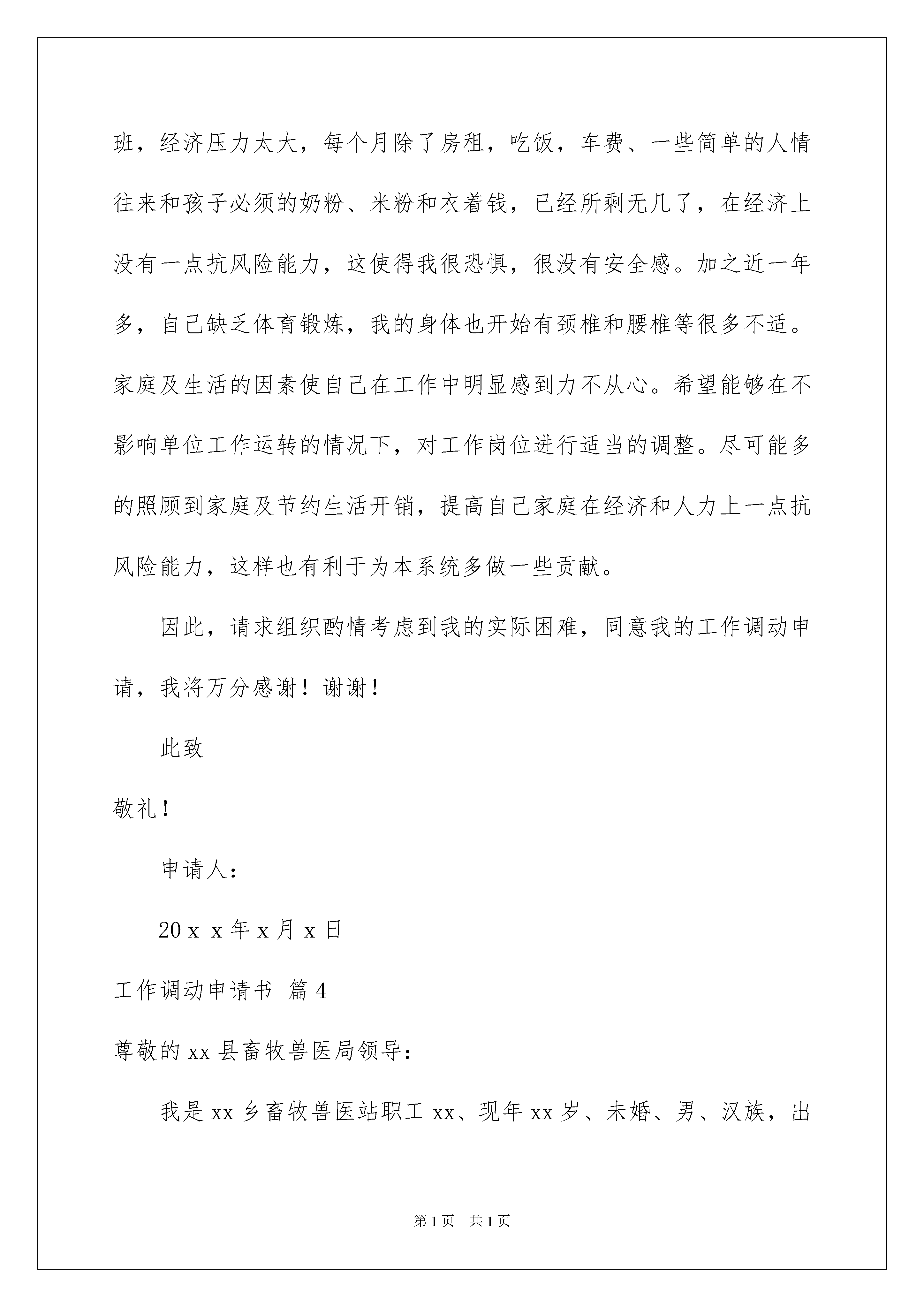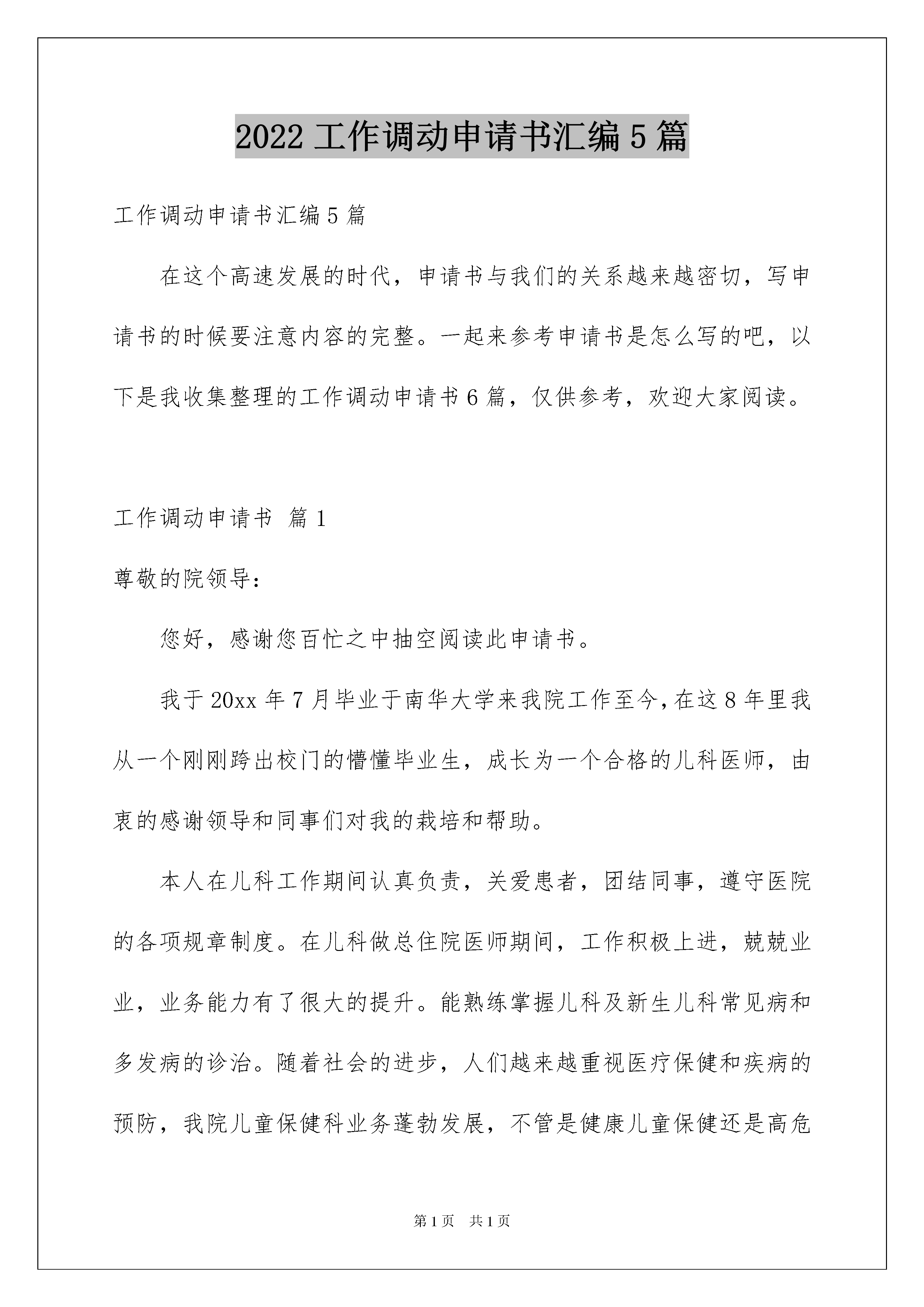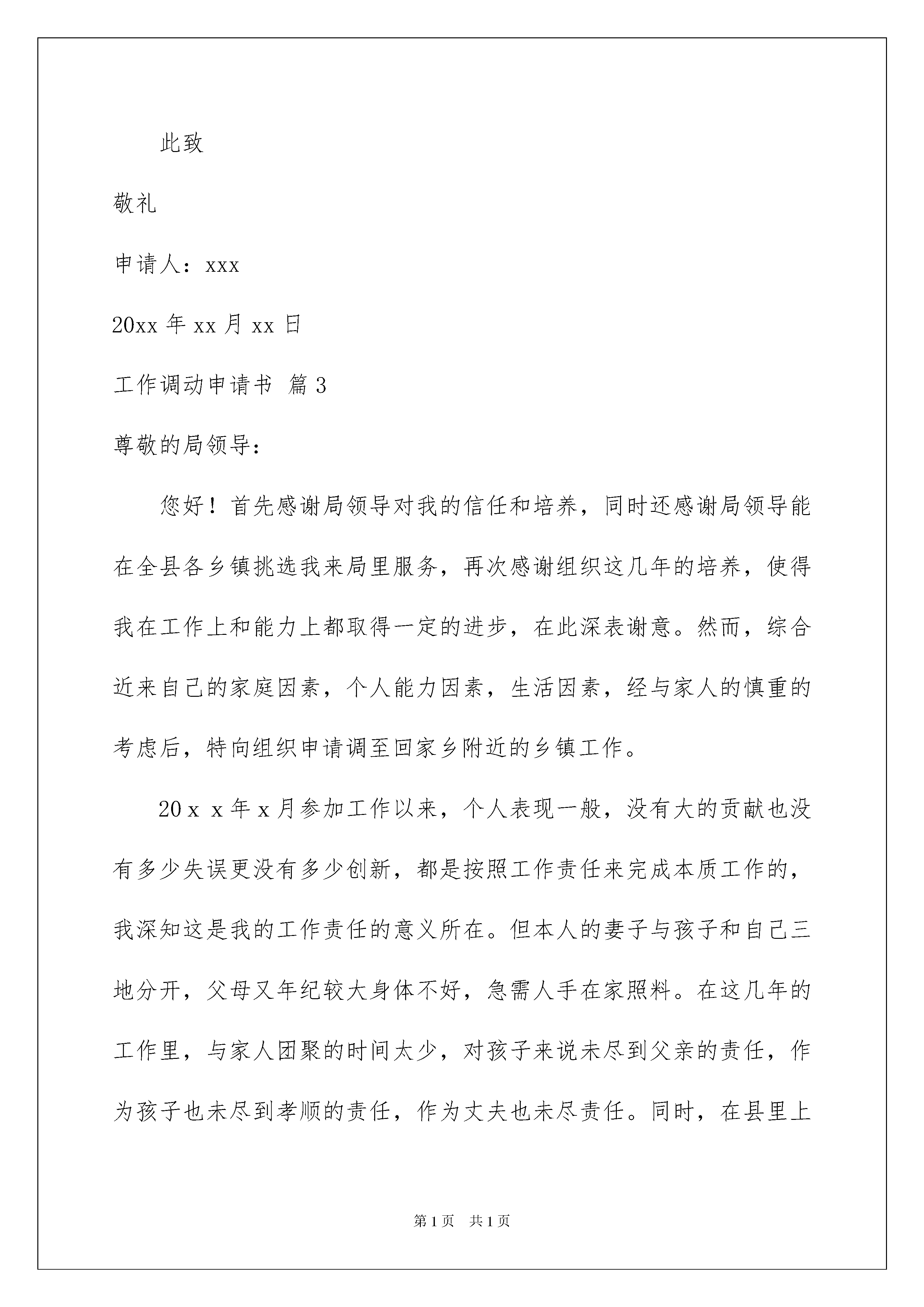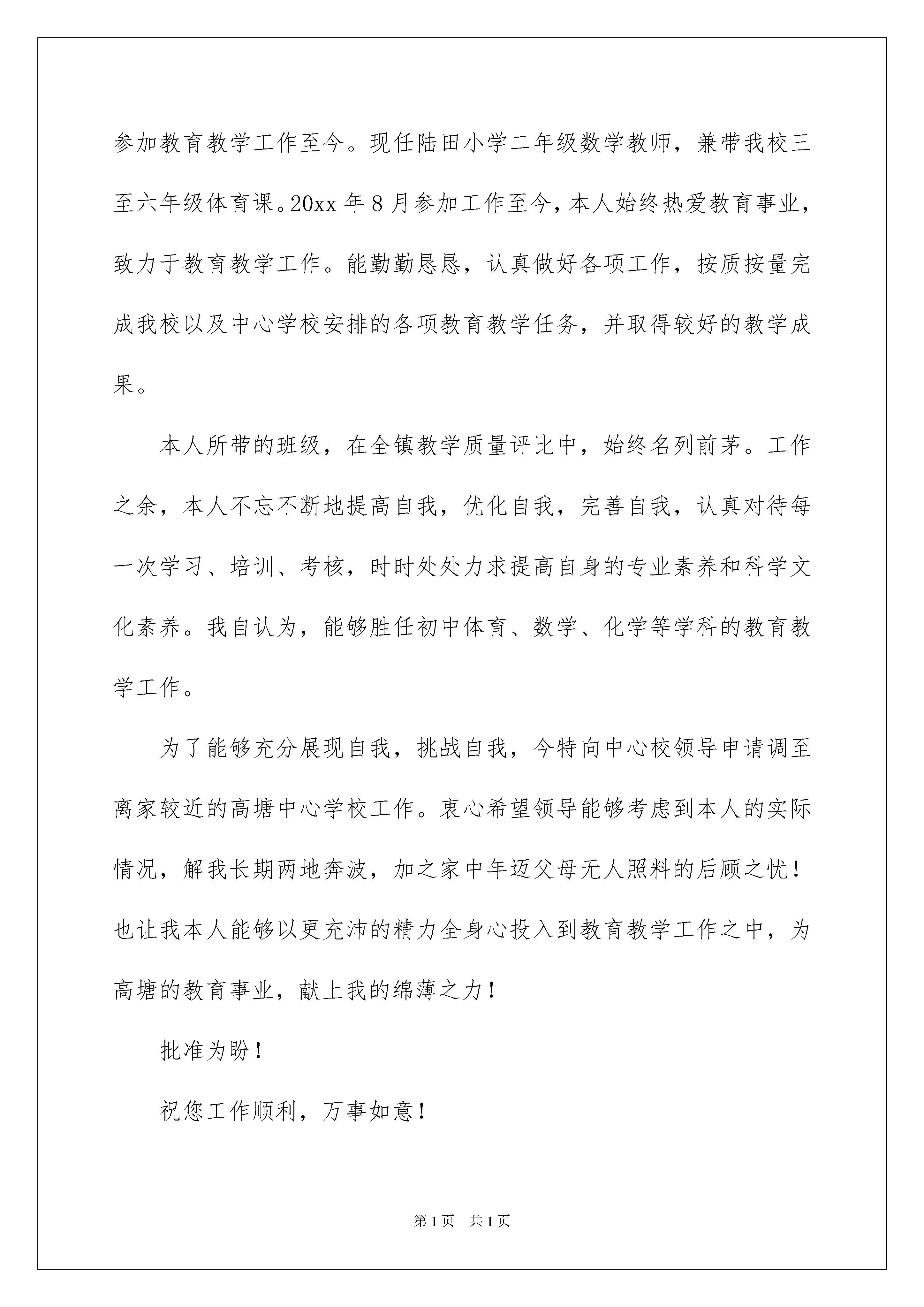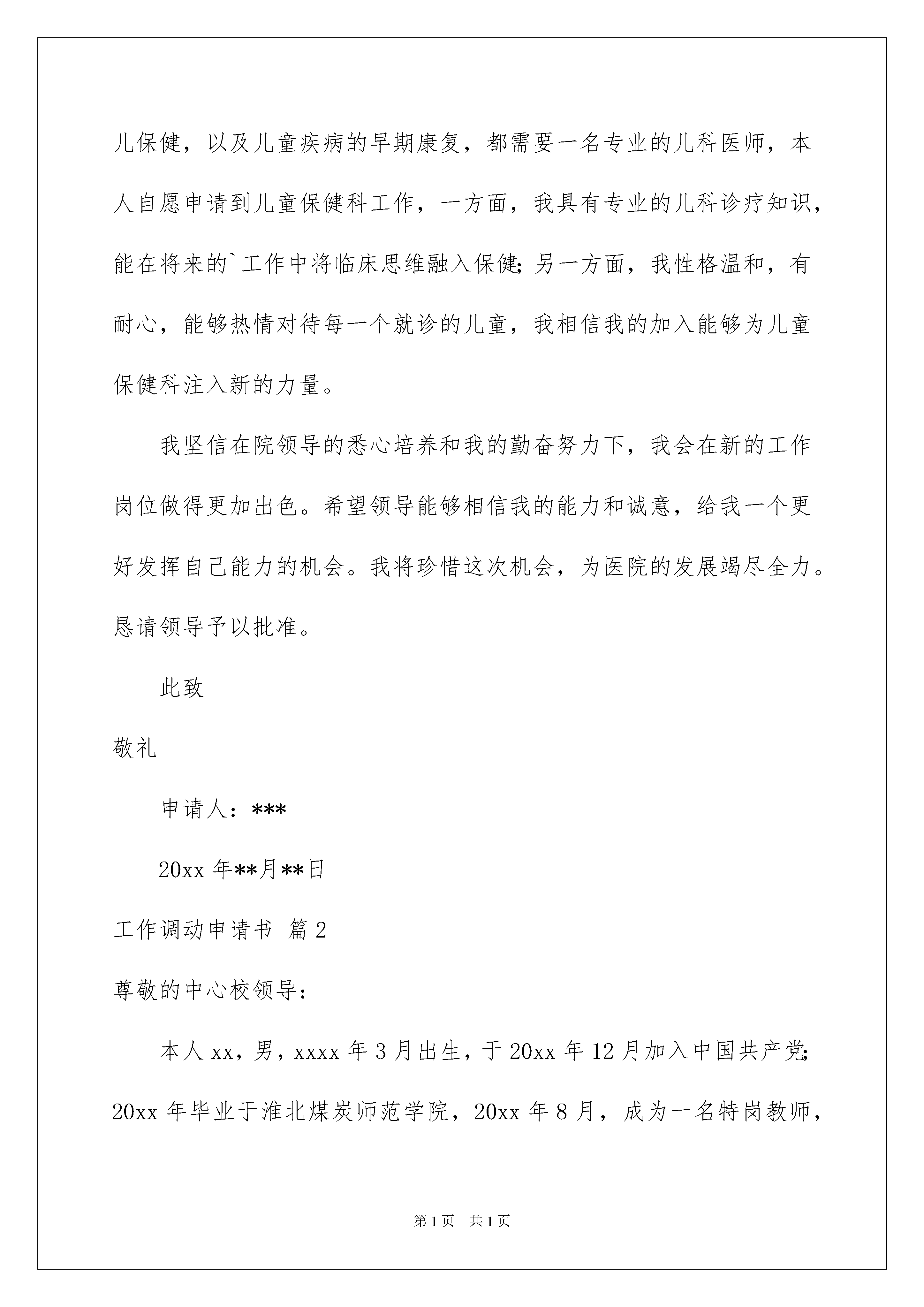 2022工作调动申请书汇编5篇工作调动申请书汇编5篇在这个高速发展的时代,申请书与我们的关系越来越密切,写申请书的时候要注意内容的完整。一起来参考申请书是怎么写的吧,以下是我收集整理的工作调动申请书6篇,仅供参考,欢迎大家阅读。工作调动申请书篇1尊敬的院领导:您好,感谢您百忙之中抽空阅读此申请书。我于20xx年7月毕业于南华大学来我院工作至今,在这8年里我从一个刚刚跨出校门的懵懂毕业生,成长为一个合格的儿科医师,由衷的感谢领导和同事们对我的栽培和帮助。本人在儿科工作期间认真负责,关爱患者,团结同事,遵守医院的各项规章制度。在儿科做总住院医师期间,工作积极上进,兢兢业业,业务能力有了很大的提升。能熟练掌握儿科及新生儿科常见病和多发病的诊治。随着社会的进步,人们越来越重视医疗保健和疾病的预防,我院儿童保健科业务蓬勃发展,不管是健康儿童保健还是高危儿保健,以及儿童疾病的早期康复,都需要一名专业的儿科医师,本人自愿申请到儿童保健科工作,一方面,我具有专业的儿科诊疗知识,能在将来的`工作中将临床思维融入保健;另一方面,我性格温和,有耐心,能够热情对待每一个就诊的儿童,我相信我的加入能够为儿童保健科注入新的力量。我坚信在院领导的悉心培养和我的勤奋努力下,我会在新的工作岗位做得更加出色。希望领导能够相信我的能力和诚意,给我一个更好发挥自己能力的机会。我将珍惜这次机会,为医院的发展竭尽全力。恳请领导予以批准。此致敬礼申请人:***20xx年**月**日工作调动申请书篇2尊敬的中心校领导:本人xx,男,xxxx年3月出生,于20xx年12月加入中国共产党;20xx年毕业于淮北煤炭师范学院,20xx年8月,成为一名特岗教师,参加教育教学工作至今。现任陆田小学二年级数学教师,兼带我校三至六年级体育课。20xx年8月参加工作至今,本人始终热爱教育事业,致力于教育教学工作。能勤勤恳恳,认真做好各项工作,按质按量完成我校以及中心学校安排的各项教育教学任务,并取得较好的教学成果。本人所带的班级,在全镇教学质量评比中,始终名列前茅。工作之余,本人不忘不断地提高自我,优化自我,完善自我,认真对待每一次学习、培训、考核,时时处处力求提高自身的专业素养和科学文化素养。我自认为,能够胜任初中体育、数学、化学等学科的教育教学工作。为了能够充分展现自我,挑战自我,今特向中心校领导申请调至离家较近的高塘中心学校工作。衷心希望领导能够考虑到本人的实际情况,解我长期两地奔波,加之家中年迈父母无人照料的后顾之忧!也让我本人能够以更充沛的精力全身心投入到教育教学工作之中,为高塘的教育事业,献上我的绵薄之力!批准为盼!祝您工作顺利,万事如意!此致敬礼申请人:xxx20xx年xx月xx日工作调动申请书篇3尊敬的局领导:您好!首先感谢局领导对我的信任和培养,同时还感谢局领导能在全县各乡镇挑选我来局里服务,再次感谢组织这几年的培养,使得我在工作上和能力上都取得一定的进步,在此深表谢意。然而,综合近来自己的家庭因素,个人能力因素,生活因素,经与家人的慎重的考虑后,特向组织申请调至回家乡附近的乡镇工作。20xx年x月参加工作以来,个人表现一般,没有大的贡献也没有多少失误更没有多少创新,都是按照工作责任来完成本质工作的,我深知这是我的工作责任的意义所在。但本人的妻子与孩子和自己三地分开,父母又年纪较大身体不好,急需人手在家照料。在这几年的工作里,与家人团聚的时间太少,对孩子来说未尽到父亲的责任,作为孩子也未尽到孝顺的责任,作为丈夫也未尽责任。同时,在县里上班,经济压力太大,每个月除了房租,吃饭,车费、一些简单的人情往来和孩子必须的奶粉、米粉和衣着钱,已经所剩无几了,在经济上没有一点抗风险能力,这使得我很恐惧,很没有安全感。加之近一年多,自己缺乏体育锻炼,我的身体也开始有颈椎和腰椎等很多不适。家庭及生活的因素使自己在工作中明显感到力不从心。希望能够在不影响单位工作运转的情况下,对工作岗位进行适当的调整。尽可能多的照顾到家庭及节约生活开销,提高自己家庭在经济和人力上一点抗风险能力,这样也有利于为本系统多做一些贡献。因此,请求组织酌情考虑到我的实际困难,同意我的工作调动申请,我将万分感谢!谢谢!此致敬礼!申请人:20xx年x月x日工作调动申请书篇4尊敬的xx县畜牧兽医局领导:我是xx乡畜牧兽医站职工xx、现年xx岁、未婚、男、汉族,出生于xxx,XX年7月毕业于云南省xx学校畜牧兽医专业,XX年12月参加工作,大专文凭,畜牧兽医助师,XX年12月至20xx年4月在xx乡畜牧兽医站工作,20xx年5月被调到xx乡畜牧兽医站工作至今。在此艰苦地区工