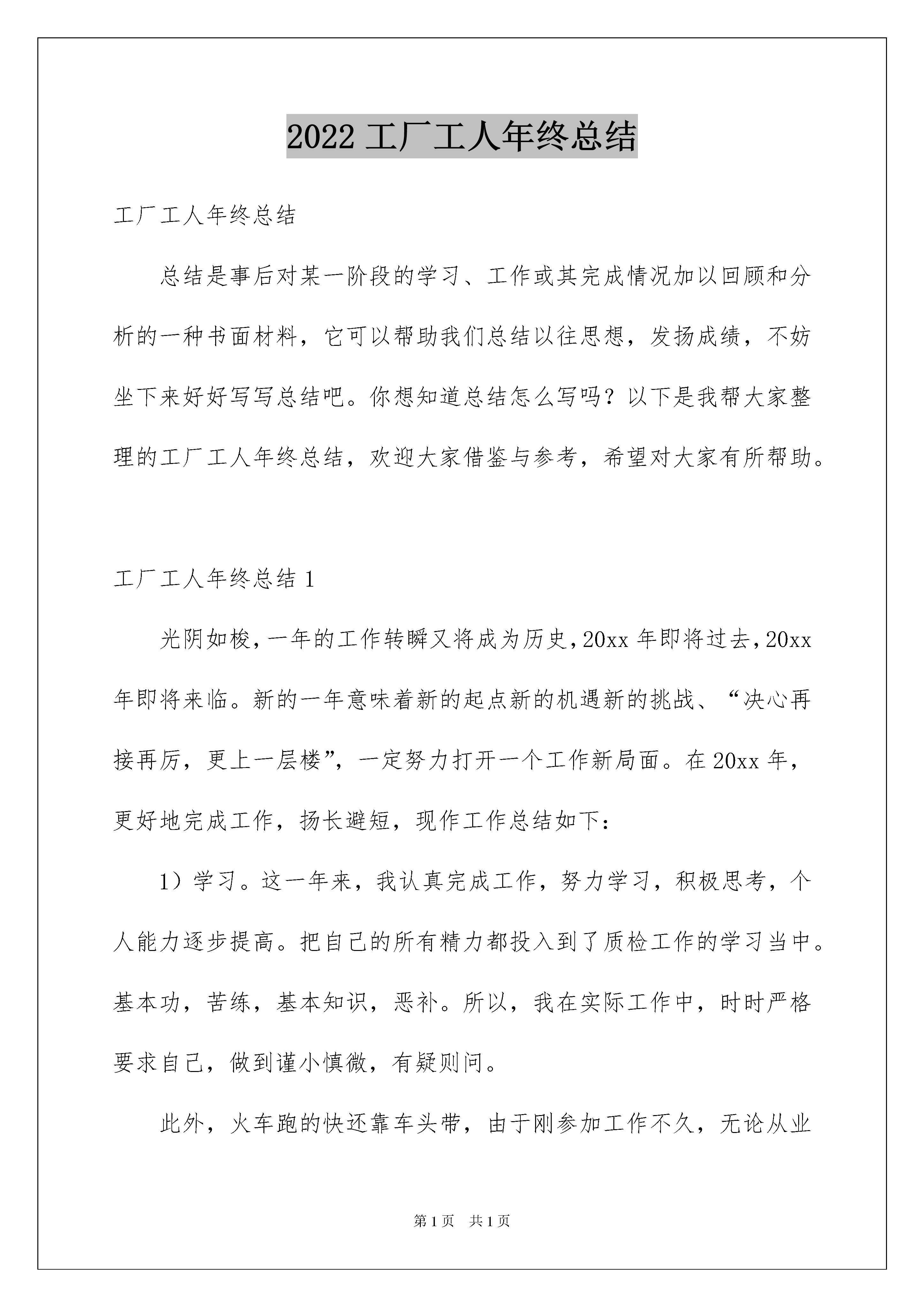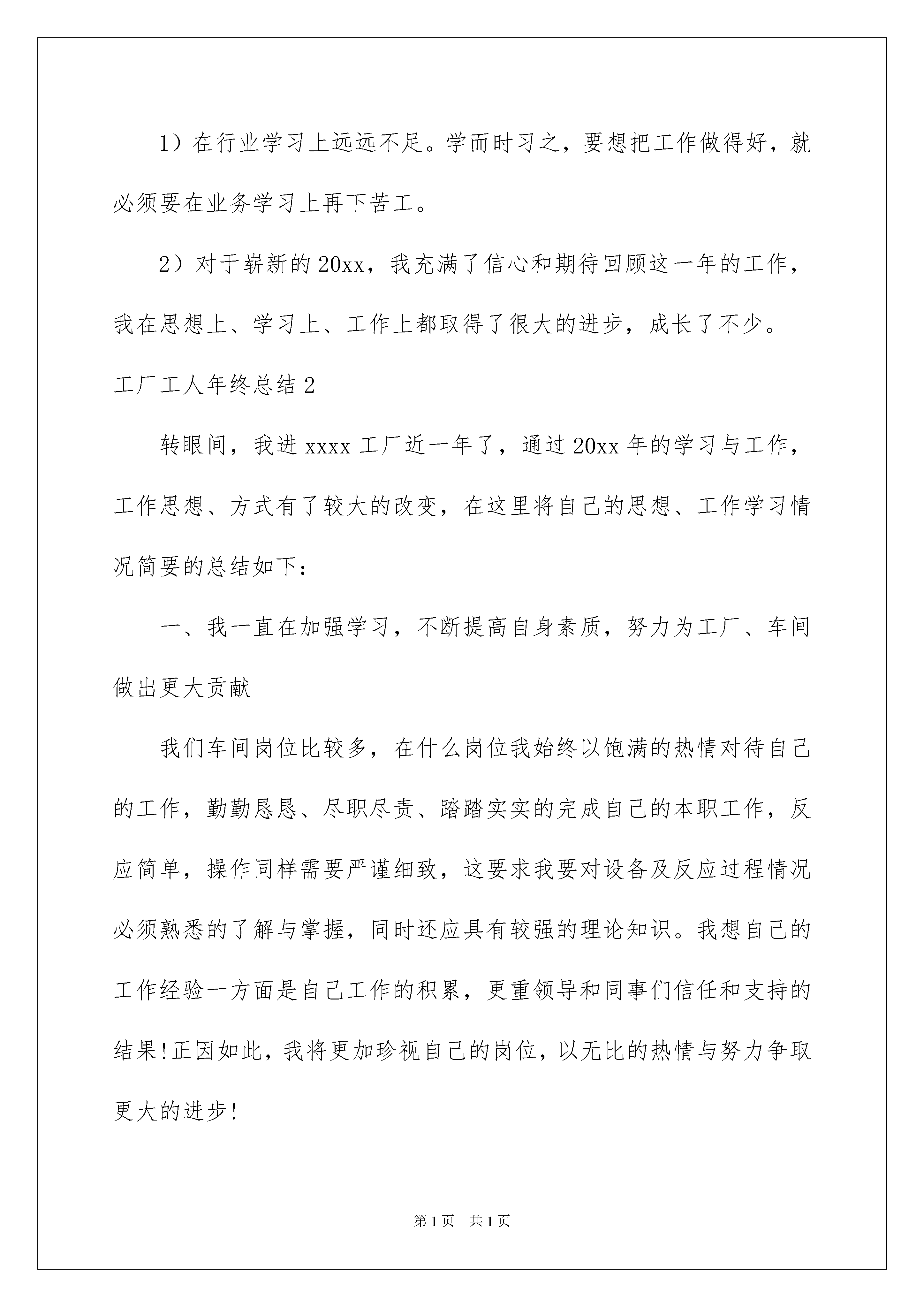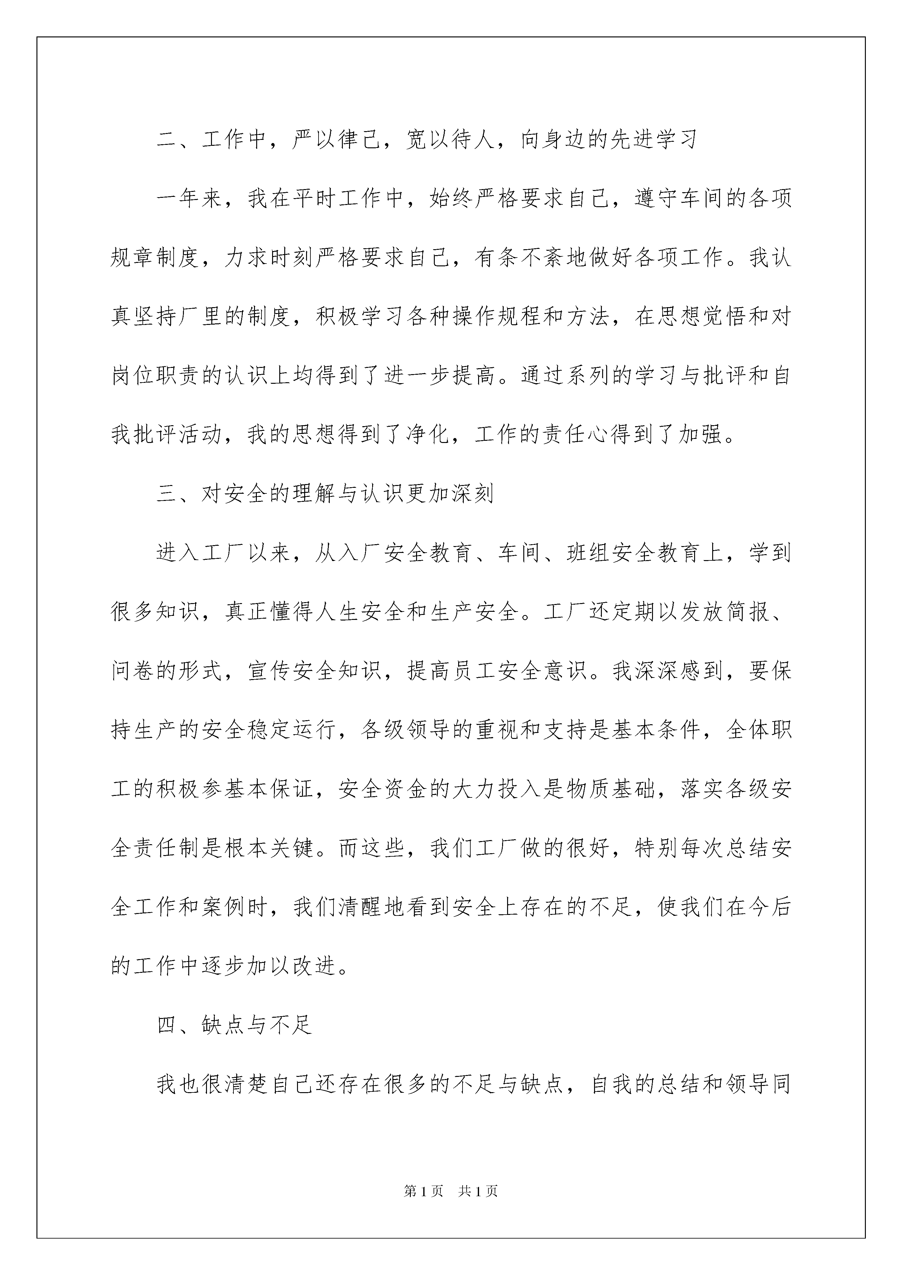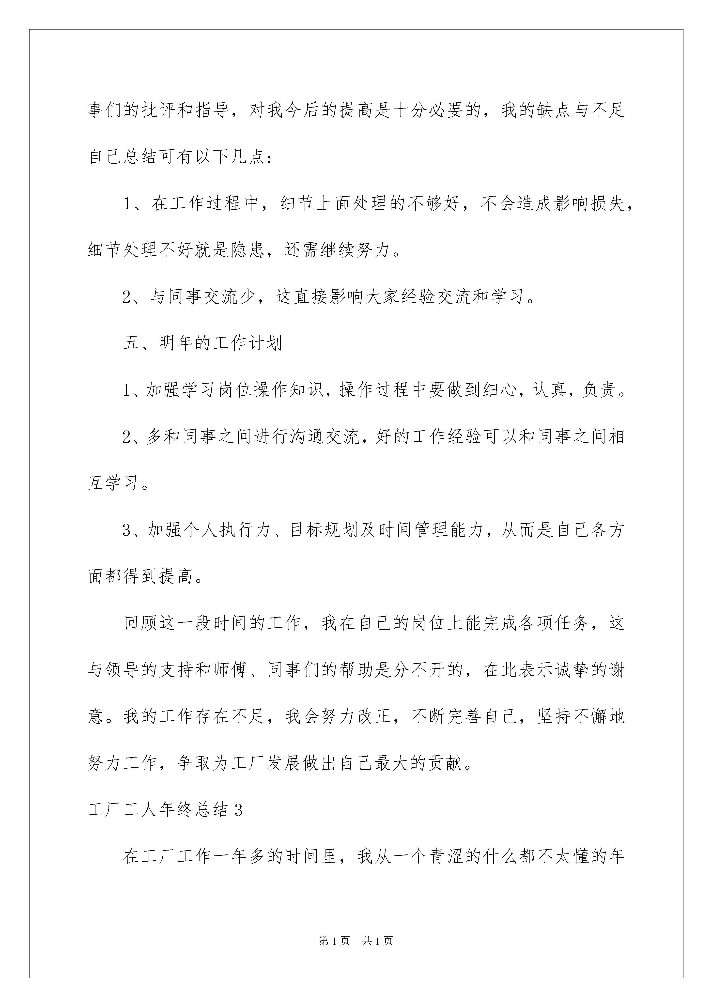 2022工厂工人年终总结工厂工人年终总结总结是事后对某一阶段的学习、工作或其完成情况加以回顾和分析的一种书面材料,它可以帮助我们总结以往思想,发扬成绩,不妨坐下来好好写写总结吧。你想知道总结怎么写吗?以下是我帮大家整理的工厂工人年终总结,欢迎大家借鉴与参考,希望对大家有所帮助。工厂工人年终总结1光阴如梭,一年的工作转瞬又将成为历史,20xx年即将过去,20xx年即将来临。新的一年意味着新的起点新的机遇新的挑战、“决心再接再厉,更上一层楼”,一定努力打开一个工作新局面。在20xx年,更好地完成工作,扬长避短,现作工作总结如下:1)学习。这一年来,我认真完成工作,努力学习,积极思考,个人能力逐步提高。把自己的所有精力都投入到了质检工作的学习当中。基本功,苦练,基本知识,恶补。所以,我在实际工作中,时时严格要求自己,做到谨小慎微,有疑则问。此外,火车跑的快还靠车头带,由于刚参加工作不久,无论从业务能力,还是从思想上都存在许多的不足。在这些方面我都得到了部门领导和当班班长的正确引导。2)工作。今年我先后在油田公司、分公司的安全文化推进会、安全交流会上担任解说工作;参加了部门的安全定级工作;为部门的目视化工作献计献策,积累了很多宝贵的经验。作为质检部的一名新员工,可以担任部门解说这一重要的工作,无疑是对我能力的一种肯定和提高。在这次工作当中,我不光是收获了一份参与感和自我实现感,更重要的是在过程中学习到了所有书本上没有的知识。提高了与人交往的能力,强化了我在工作当中的安全意识。安全定级工作,从筹备到迎审,我都参与其中。准备期间需要记忆的知识无形当中又成了一次充电的好机会,我就想吸水的海绵一样,吸收着知识的养分。日子在弹指一挥间就毫无声息的流逝,就在此时需要回头总结之际才猛然间意识到日子的匆匆。今年13月,我来到质检部工作已经两年,在领导及同事们的支持和帮助下成熟了很多,退去了些许焦躁和青涩,但也清醒地认识到自己的不足之处:1)在行业学习上远远不足。学而时习之,要想把工作做得好,就必须要在业务学习上再下苦工。2)对于崭新的20xx,我充满了信心和期待回顾这一年的工作,我在思想上、学习上、工作上都取得了很大的进步,成长了不少。工厂工人年终总结2转眼间,我进xxxx工厂近一年了,通过20xx年的学习与工作,工作思想、方式有了较大的改变,在这里将自己的思想、工作学习情况简要的总结如下:一、我一直在加强学习,不断提高自身素质,努力为工厂、车间做出更大贡献我们车间岗位比较多,在什么岗位我始终以饱满的热情对待自己的工作,勤勤恳恳、尽职尽责、踏踏实实的完成自己的本职工作,反应简单,操作同样需要严谨细致,这要求我要对设备及反应过程情况必须熟悉的了解与掌握,同时还应具有较强的理论知识。我想自己的工作经验一方面是自己工作的积累,更重领导和同事们信任和支持的结果!正因如此,我将更加珍视自己的岗位,以无比的热情与努力争取更大的进步!二、工作中,严以律己,宽以待人,向身边的先进学习一年来,我在平时工作中,始终严格要求自己,遵守车间的各项规章制度,力求时刻严格要求自己,有条不紊地做好各项工作。我认真坚持厂里的制度,积极学习各种操作规程和方法,在思想觉悟和对岗位职责的认识上均得到了进一步提高。通过系列的学习与批评和自我批评活动,我的思想得到了净化,工作的责任心得到了加强。三、对安全的理解与认识更加深刻进入工厂以来,从入厂安全教育、车间、班组安全教育上,学到很多知识,真正懂得人生安全和生产安全。工厂还定期以发放简报、问卷的形式,宣传安全知识,提高员工安全意识。我深深感到,要保持生产的安全稳定运行,各级领导的重视和支持是基本条件,全体职工的积极参基本保证,安全资金的大力投入是物质基础,落实各级安全责任制是根本关键。而这些,我们工厂做的很好,特别每次总结安全工作和案例时,我们清醒地看到安全上存在的不足,使我们在今后的工作中逐步加以改进。四、缺点与不足我也很清楚自己还存在很多的不足与缺点,自我的总结和领导同事们的批评和指导,对我今后的提高是十分必要的,我的缺点与不足自己总结可有以下几点:1、在工作过程中,细节上面处理的不够好,不会造成影响损失,细节处理不好就是隐患,还需继续努力。2、与同事交流少,这直接影响大家经验交流和学习。五、明年的工作计划1、加强学习岗位操作知识,操作过程中要做到细心,认真,负责。2、多和同事之间进行沟通交流,好的工作经验可以和同事之间相互学习。3、加强个人执行力、目标规划及时间管理能力,从而是自己各方面都得到提高。回顾这一段时间的工作,我在自己的岗位上能完成各项任务,这与领导的支持和师傅、同事们的