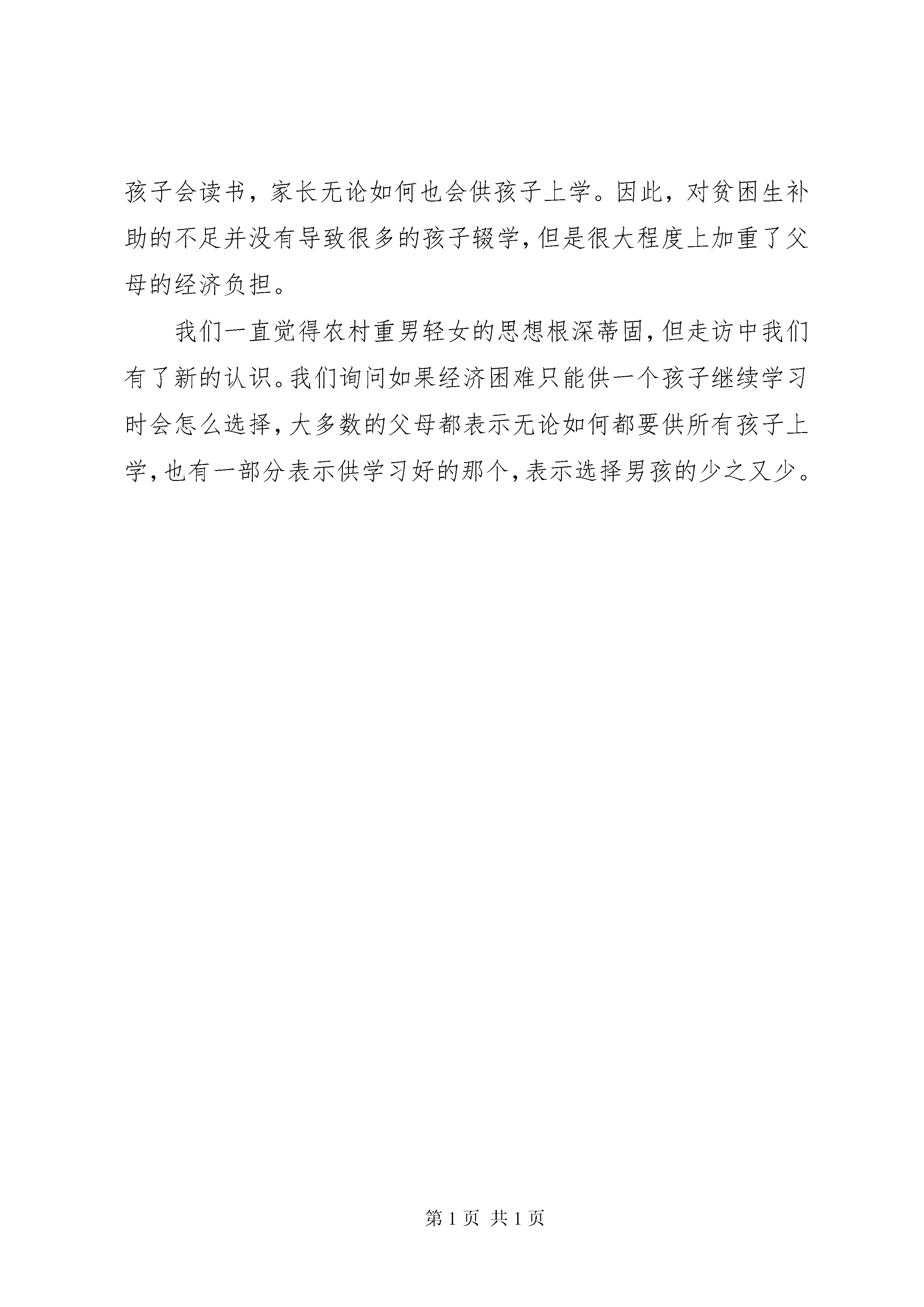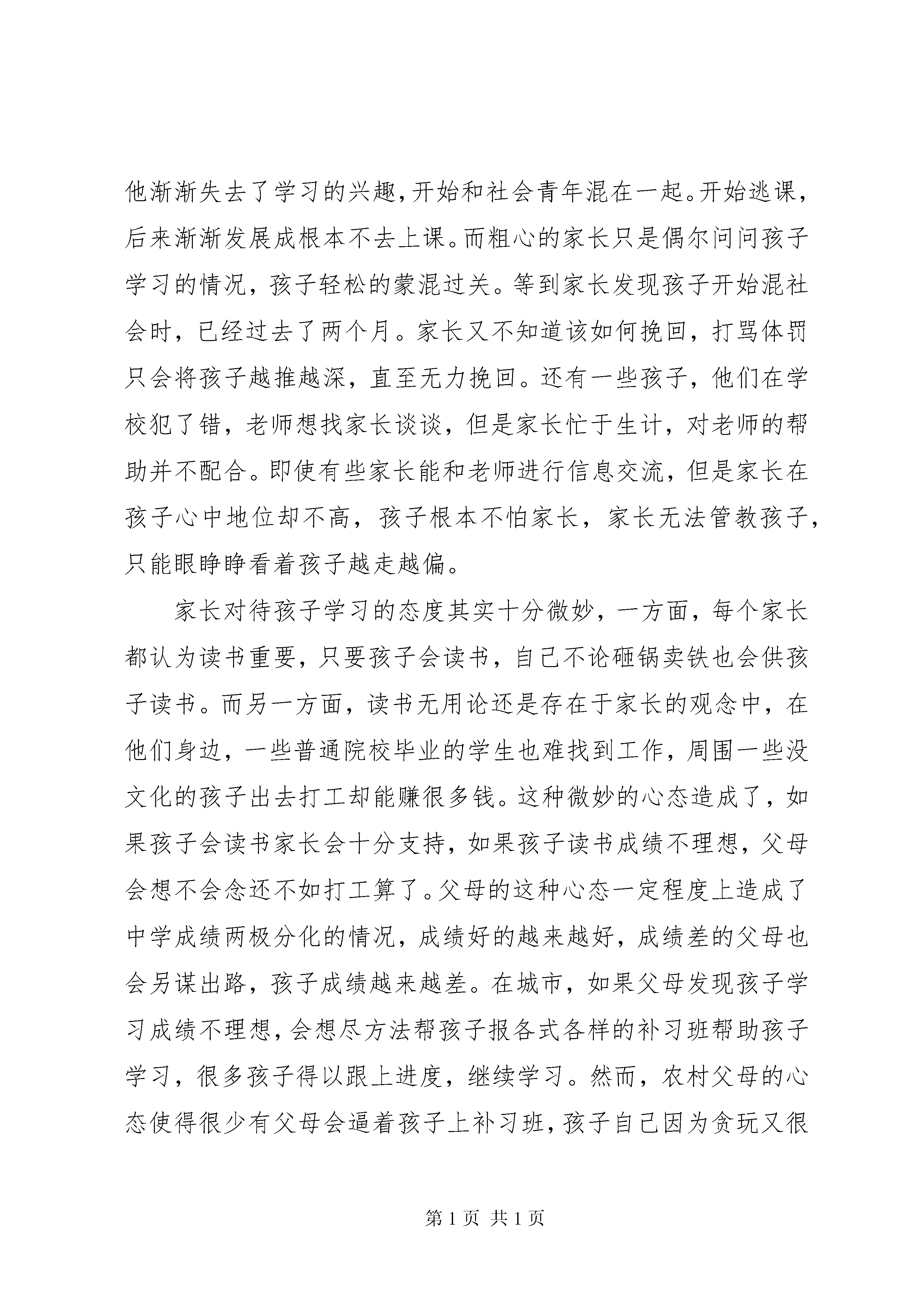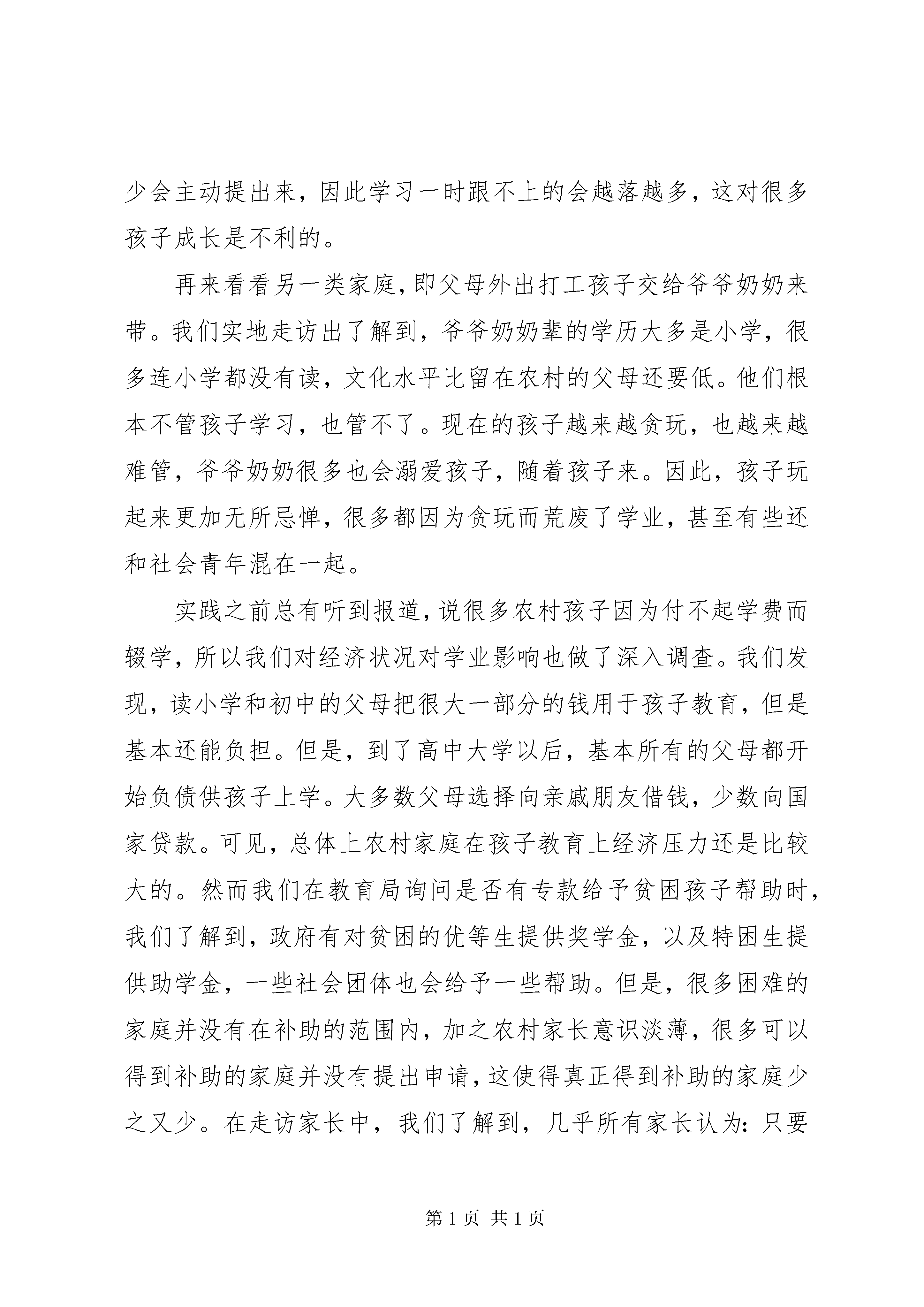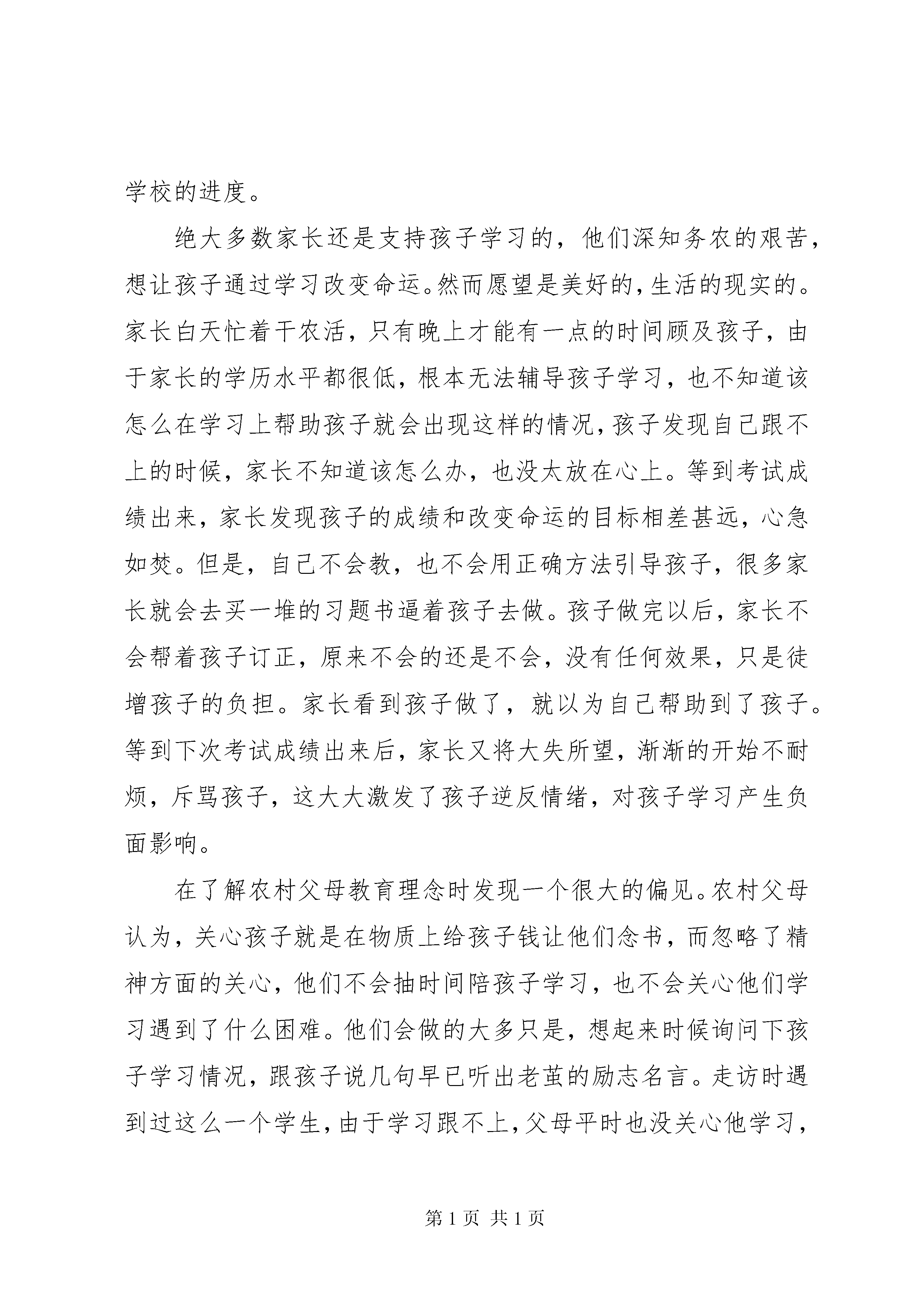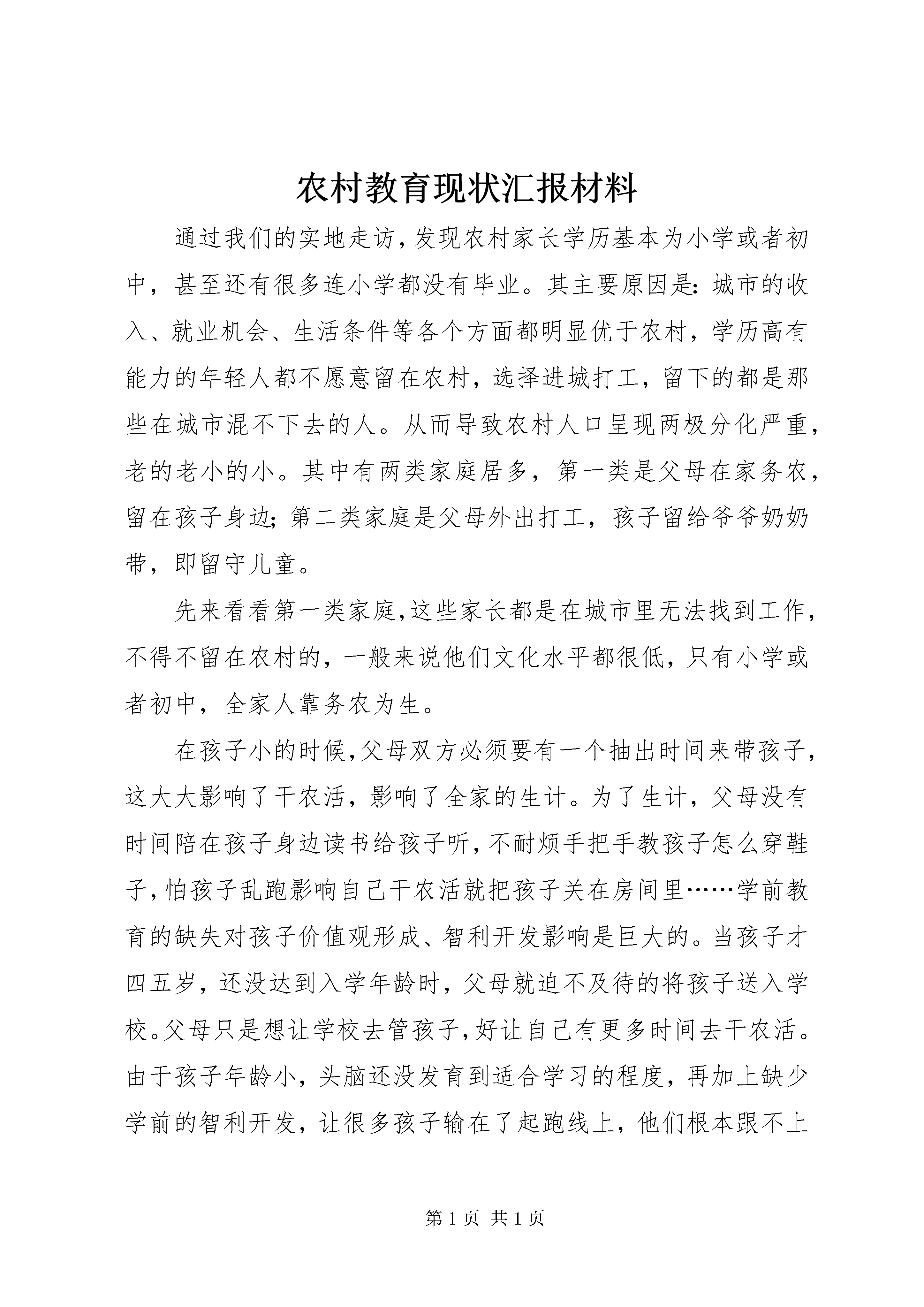 农村教育现状汇报材料通过我们的实地走访,发现农村家长学历基本为小学或者初中,甚至还有很多连小学都没有毕业。其主要原因是:城市的收入、就业机会、生活条件等各个方面都明显优于农村,学历高有能力的年轻人都不愿意留在农村,选择进城打工,留下的都是那些在城市混不下去的人。从而导致农村人口呈现两极分化严重,老的老小的小。其中有两类家庭居多,第一类是父母在家务农,留在孩子身边;第二类家庭是父母外出打工,孩子留给爷爷奶奶带,即留守儿童。先来看看第一类家庭,这些家长都是在城市里无法找到工作,不得不留在农村的,一般来说他们文化水平都很低,只有小学或者初中,全家人靠务农为生。在孩子小的时候,父母双方必须要有一个抽出时间来带孩子,这大大影响了干农活,影响了全家的生计。为了生计,父母没有时间陪在孩子身边读书给孩子听,不耐烦手把手教孩子怎么穿鞋子,怕孩子乱跑影响自己干农活就把孩子关在房间里……学前教育的缺失对孩子价值观形成、智利开发影响是巨大的。当孩子才四五岁,还没达到入学年龄时,父母就迫不及待的将孩子送入学校。父母只是想让学校去管孩子,好让自己有更多时间去干农活。由于孩子年龄小,头脑还没发育到适合学习的程度,再加上缺少学前的智利开发,让很多孩子输在了起跑线上,他们根本跟不上学校的进度。绝大多数家长还是支持孩子学习的,他们深知务农的艰苦,想让孩子通过学习改变命运。然而愿望是美好的,生活的现实的。家长白天忙着干农活,只有晚上才能有一点的时间顾及孩子,由于家长的学历水平都很低,根本无法辅导孩子学习,也不知道该怎么在学习上帮助孩子就会出现这样的情况,孩子发现自己跟不上的时候,家长不知道该怎么办,也没太放在心上。等到考试成绩出来,家长发现孩子的成绩和改变命运的目标相差甚远,心急如焚。但是,自己不会教,也不会用正确方法引导孩子,很多家长就会去买一堆的习题书逼着孩子去做。孩子做完以后,家长不会帮着孩子订正,原来不会的还是不会,没有任何效果,只是徒增孩子的负担。家长看到孩子做了,就以为自己帮助到了孩子。等到下次考试成绩出来后,家长又将大失所望,渐渐的开始不耐烦,斥骂孩子,这大大激发了孩子逆反情绪,对孩子学习产生负面影响。在了解农村父母教育理念时发现一个很大的偏见。农村父母认为,关心孩子就是在物质上给孩子钱让他们念书,而忽略了精神方面的关心,他们不会抽时间陪孩子学习,也不会关心他们学习遇到了什么困难。他们会做的大多只是,想起来时候询问下孩子学习情况,跟孩子说几句早已听出老茧的励志名言。走访时遇到过这么一个学生,由于学习跟不上,父母平时也没关心他学习,他渐渐失去了学习的兴趣,开始和社会青年混在一起。开始逃课,后来渐渐发展成根本不去上课。而粗心的家长只是偶尔问问孩子学习的情况,孩子轻松的蒙混过关。等到家长发现孩子开始混社会时,已经过去了两个月。家长又不知道该如何挽回,打骂体罚只会将孩子越推越深,直至无力挽回。还有一些孩子,他们在学校犯了错,老师想找家长谈谈,但是家长忙于生计,对老师的帮助并不配合。即使有些家长能和老师进行信息交流,但是家长在孩子心中地位却不高,孩子根本不怕家长,家长无法管教孩子,只能眼睁睁看着孩子越走越偏。家长对待孩子学习的态度其实十分微妙,一方面,每个家长都认为读书重要,只要孩子会读书,自己不论砸锅卖铁也会供孩子读书。而另一方面,读书无用论还是存在于家长的观念中,在他们身边,一些普通院校毕业的学生也难找到工作,周围一些没文化的孩子出去打工却能赚很多钱。这种微妙的心态造成了,如果孩子会读书家长会十分支持,如果孩子读书成绩不理想,父母会想不会念还不如打工算了。父母的这种心态一定程度上造成了中学成绩两极分化的情况,成绩好的越来越好,成绩差的父母也会另谋出路,孩子成绩越来越差。在城市,如果父母发现孩子学习成绩不理想,会想尽方法帮孩子报各式各样的补习班帮助孩子学习,很多孩子得以跟上进度,继续学习。然而,农村父母的心态使得很少有父母会逼着孩子上补习班,孩子自己因为贪玩又很少会主动提出来,因此学习一时跟不上的会越落越多,这对很多孩子成长是不利的。再来看看另一类家庭,即父母外出打工孩子交给爷爷奶奶来带。我们实地走访出了解到,爷爷奶奶辈的学历大多是小学,很多连小学都没有读,文化水平比留在农村的父母还要低。他们根本不管孩子学习,也管不了。现在的孩子越来越贪玩,也越来越难管,爷爷奶奶很多也会溺爱孩子,随着孩子来。因此,孩子玩起来更加无所忌惮,很多都因为贪玩而荒废了学业,甚至有些还和社会青年混在一起。实践之前总有听到报道,说很多农村孩子因为付不起学费而辍学,所以我们对经济状况对学业影响也做了深入调查。我们发现,读小学和初中的父母把很大一部分的钱用于孩子教育,但是基本还能负担。但是,到了高中大学以后,基本所有的父母都开始负债供孩子上学。大多数父母选择向亲戚