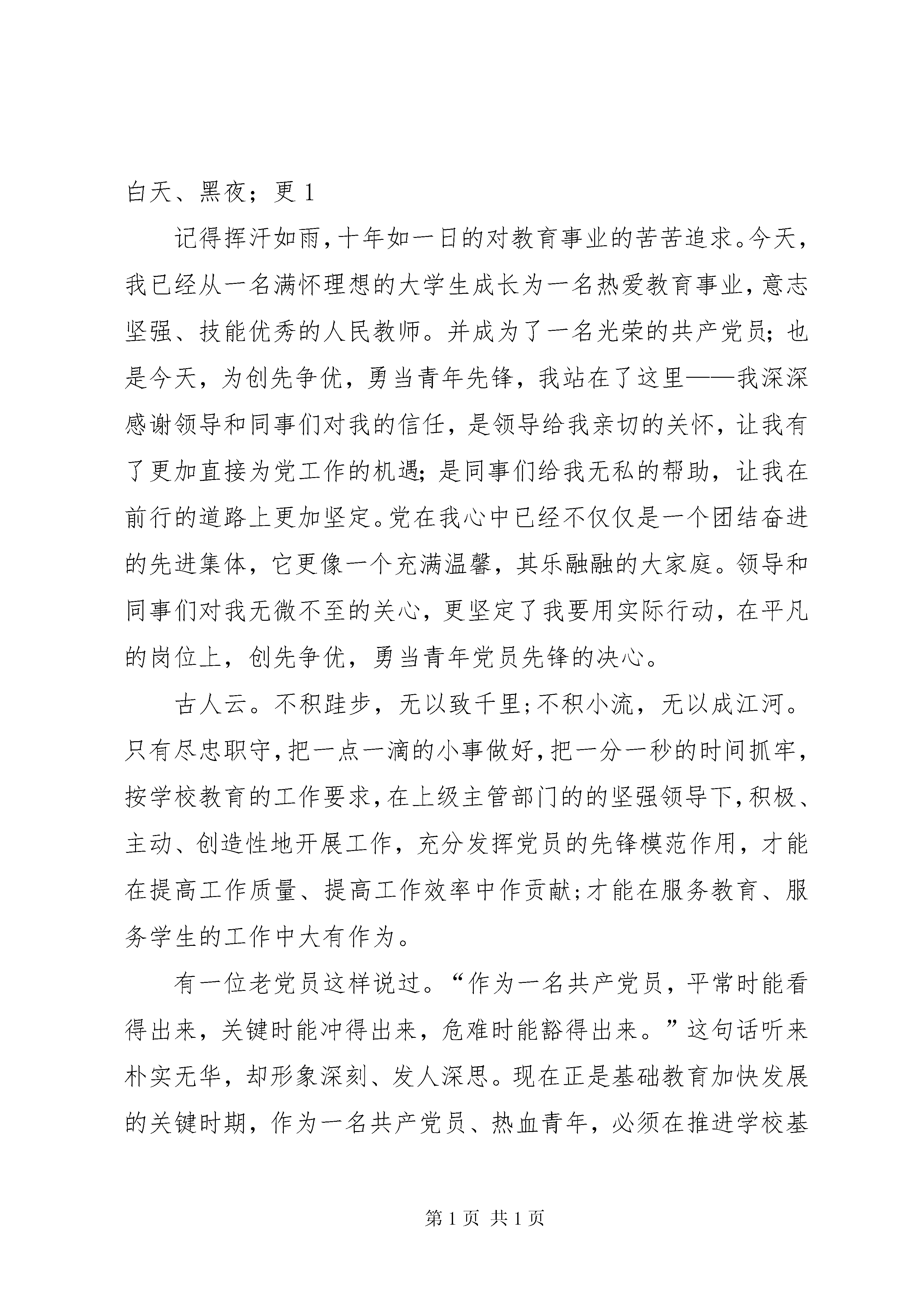 创先争优青年先锋演讲稿XX市埇桥区“创先争优在行动”演讲比赛演讲稿奋力创先争优勇当青年先锋XX县区中学苗训红尊敬的各位领导,各位评委:大家好。今天,我演讲的题目是。奋力创先争优,勇当青年先锋。作为一名普通的党员,我有幸受同志们的推荐参加这次演讲,感到无上光荣。站在这神圣的讲台上,我的心中有一种难以抑制的激动和兴奋,好像突然回到了激情飞扬的大学时代,回到了那个充满憧憬和多梦的人生季节:杨柳岸边,我曾刻苦求知;图书馆里,我曾挑灯夜读,青春的梦想,让我学会拼搏、学会奋斗、学会创造。参加工作后,在领导和同事们的关心、帮助下,我在教育工作中摸爬滚打,在教学工作中努力奋斗;从课前备课,到课堂教学;从以校为家,到与学生朝夕相处。我忘不了大雪纷飞的寒冬腊月在宿舍与住校的孩子们的其乐融融,也还记得烈日暴雨下走访各学生家长的倍感欣慰;我忘不了刚上班时,老教师对我的敦敦告诫,也还记得初上讲台时的惴惴不安;我忘不了埋头苦干的白天、黑夜;更1记得挥汗如雨,十年如一日的对教育事业的苦苦追求。今天,我已经从一名满怀理想的大学生成长为一名热爱教育事业,意志坚强、技能优秀的人民教师。并成为了一名光荣的共产党员;也是今天,为创先争优,勇当青年先锋,我站在了这里——我深深感谢领导和同事们对我的信任,是领导给我亲切的关怀,让我有了更加直接为党工作的机遇;是同事们给我无私的帮助,让我在前行的道路上更加坚定。党在我心中已经不仅仅是一个团结奋进的先进集体,它更像一个充满温馨,其乐融融的大家庭。领导和同事们对我无微不至的关心,更坚定了我要用实际行动,在平凡的岗位上,创先争优,勇当青年党员先锋的决心。古人云。不积跬步,无以致千里;不积小流,无以成江河。只有尽忠职守,把一点一滴的小事做好,把一分一秒的时间抓牢,按学校教育的工作要求,在上级主管部门的的坚强领导下,积极、主动、创造性地开展工作,充分发挥党员的先锋模范作用,才能在提高工作质量、提高工作效率中作贡献;才能在服务教育、服务学生的工作中大有作为。有一位老党员这样说过。“作为一名共产党员,平常时能看得出来,关键时能冲得出来,危难时能豁得出来。”这句话听来朴实无华,却形象深刻、发人深思。现在正是基础教育加快发展的关键时期,作为一名共产党员、热血青年,必须在推进学校基础教育发展中冲得出来,豁得出去,为国家教育教学事业奋力拼2搏,在创先争优中勇当先锋,充分发挥自己的激情与才能。按照党中央的要求,勤奋工作,把每一件事情、每一项任务落实好、完成好,立足本职,服务教育。只要我们每个青年党员都能在自己的岗位上忠于职守,那么无数次平凡将凝成伟大,无数个普通将造就非凡。各位领导,各位评委,牢记宗旨,我们创先争优;服务发展,我们勇当先锋,让我们携手共进吧。时代的发展,需要共产党员勇往直前,教育的发展,需要我们担当重任,让我们在宽广的教育事业的舞台上尽情挥洒自己的青春和热血,为太阳底下最光辉的事业做出积极的更大的贡献。我的演讲完毕,谢谢大家。
