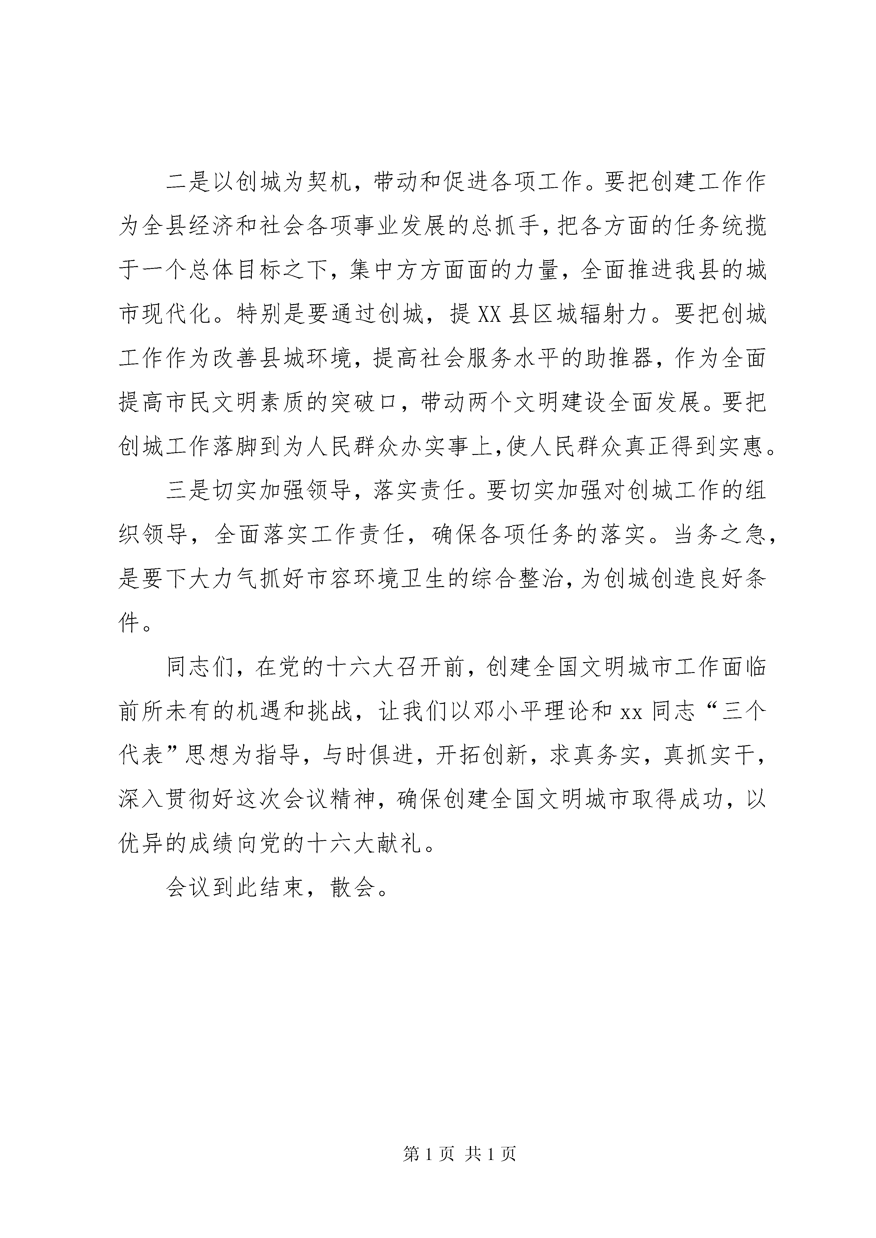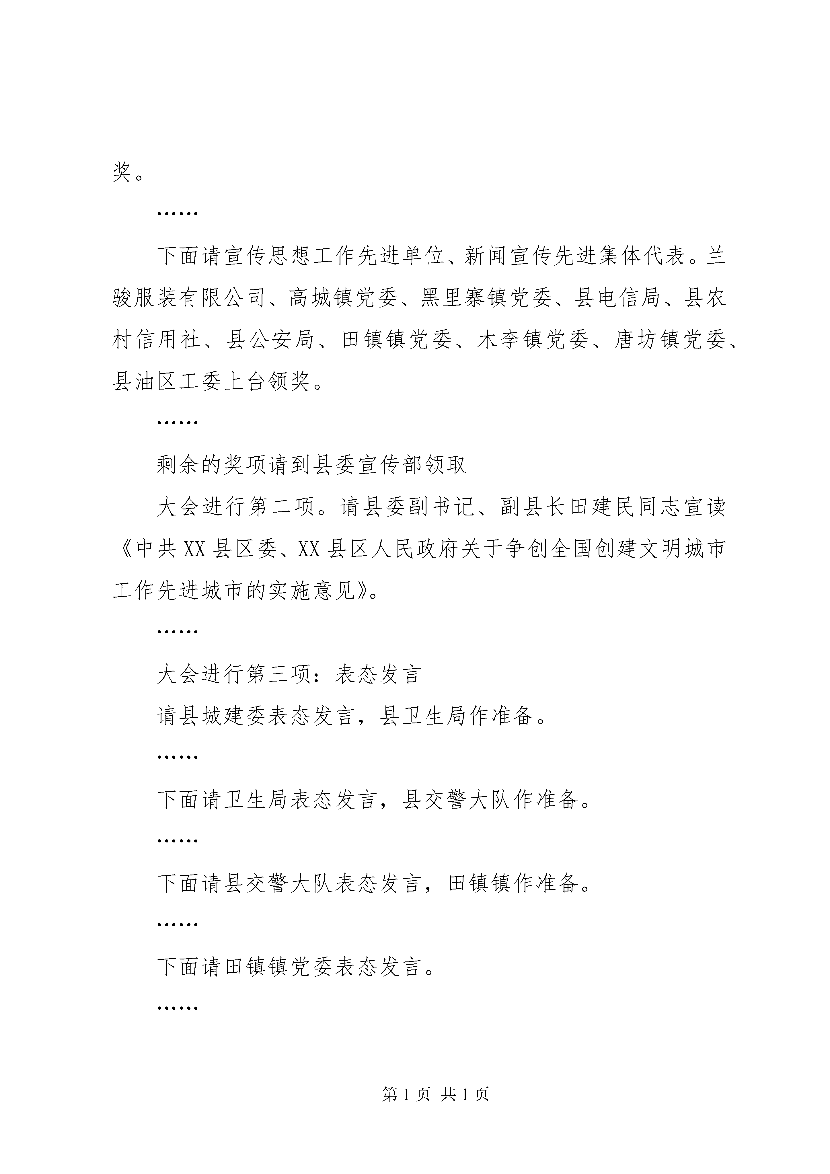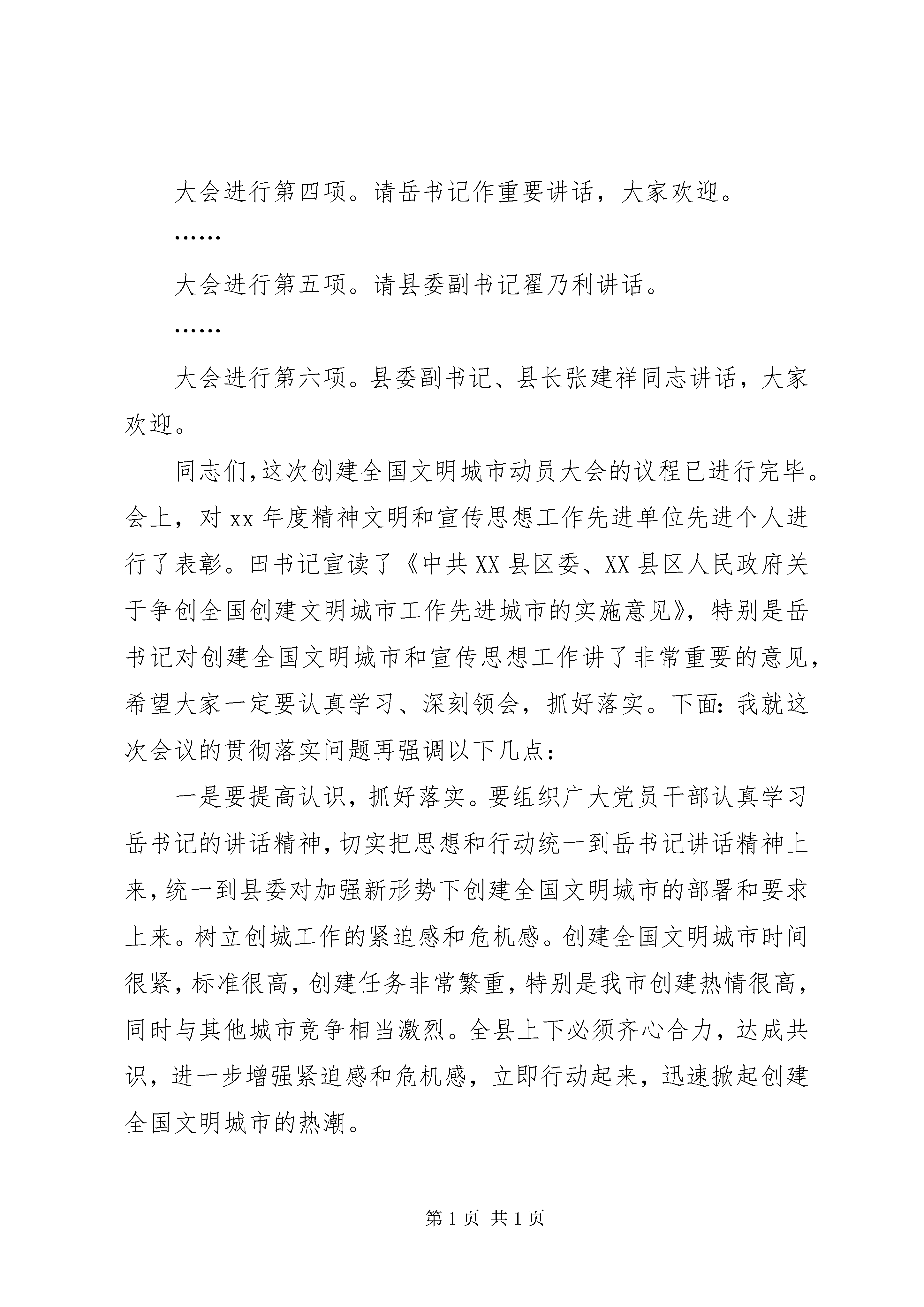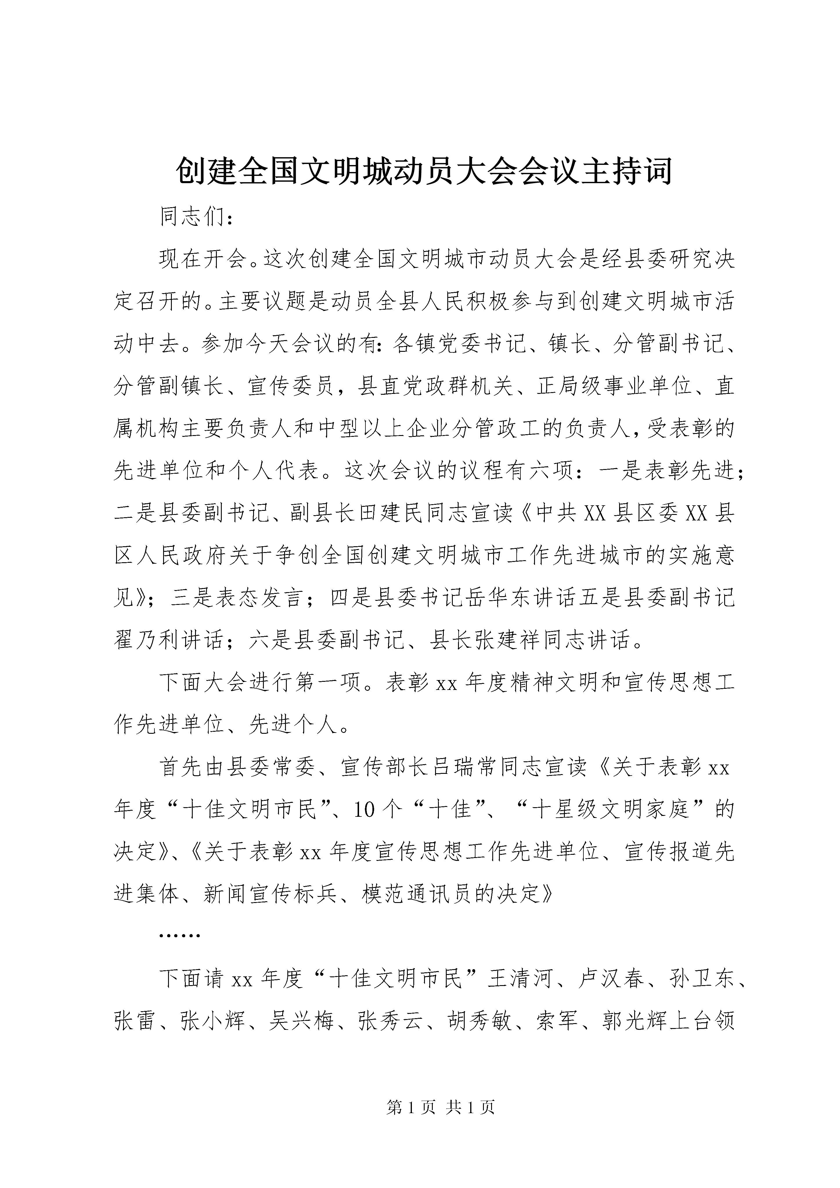 创建全国文明城动员大会会议主持词同志们:现在开会。这次创建全国文明城市动员大会是经县委研究决定召开的。主要议题是动员全县人民积极参与到创建文明城市活动中去。参加今天会议的有:各镇党委书记、镇长、分管副书记、分管副镇长、宣传委员,县直党政群机关、正局级事业单位、直属机构主要负责人和中型以上企业分管政工的负责人,受表彰的先进单位和个人代表。这次会议的议程有六项:一是表彰先进;二是县委副书记、副县长田建民同志宣读《中共XX县区委XX县区人民政府关于争创全国创建文明城市工作先进城市的实施意见》;三是表态发言;四是县委书记岳华东讲话五是县委副书记翟乃利讲话;六是县委副书记、县长张建祥同志讲话。下面大会进行第一项。表彰xx年度精神文明和宣传思想工作先进单位、先进个人。首先由县委常委、宣传部长吕瑞常同志宣读《关于表彰xx年度“十佳文明市民”、10个“十佳”、“十星级文明家庭”的决定》、《关于表彰xx年度宣传思想工作先进单位、宣传报道先进集体、新闻宣传标兵、模范通讯员的决定》……下面请xx年度“十佳文明市民”王清河、卢汉春、孙卫东、张雷、张小辉、吴兴梅、张秀云、胡秀敏、索军、郭光辉上台领奖。……下面请宣传思想工作先进单位、新闻宣传先进集体代表。兰骏服装有限公司、高城镇党委、黑里寨镇党委、县电信局、县农村信用社、县公安局、田镇镇党委、木李镇党委、唐坊镇党委、县油区工委上台领奖。……剩余的奖项请到县委宣传部领取大会进行第二项。请县委副书记、副县长田建民同志宣读《中共XX县区委、XX县区人民政府关于争创全国创建文明城市工作先进城市的实施意见》。……大会进行第三项:表态发言请县城建委表态发言,县卫生局作准备。……下面请卫生局表态发言,县交警大队作准备。……下面请县交警大队表态发言,田镇镇作准备。……下面请田镇镇党委表态发言。……大会进行第四项。请岳书记作重要讲话,大家欢迎。……大会进行第五项。请县委副书记翟乃利讲话。……大会进行第六项。县委副书记、县长张建祥同志讲话,大家欢迎。同志们,这次创建全国文明城市动员大会的议程已进行完毕。会上,对xx年度精神文明和宣传思想工作先进单位先进个人进行了表彰。田书记宣读了《中共XX县区委、XX县区人民政府关于争创全国创建文明城市工作先进城市的实施意见》,特别是岳书记对创建全国文明城市和宣传思想工作讲了非常重要的意见,希望大家一定要认真学习、深刻领会,抓好落实。下面:我就这次会议的贯彻落实问题再强调以下几点:一是要提高认识,抓好落实。要组织广大党员干部认真学习岳书记的讲话精神,切实把思想和行动统一到岳书记讲话精神上来,统一到县委对加强新形势下创建全国文明城市的部署和要求上来。树立创城工作的紧迫感和危机感。创建全国文明城市时间很紧,标准很高,创建任务非常繁重,特别是我市创建热情很高,同时与其他城市竞争相当激烈。全县上下必须齐心合力,达成共识,进一步增强紧迫感和危机感,立即行动起来,迅速掀起创建全国文明城市的热潮。二是以创城为契机,带动和促进各项工作。要把创建工作作为全县经济和社会各项事业发展的总抓手,把各方面的任务统揽于一个总体目标之下,集中方方面面的力量,全面推进我县的城市现代化。特别是要通过创城,提XX县区城辐射力。要把创城工作作为改善县城环境,提高社会服务水平的助推器,作为全面提高市民文明素质的突破口,带动两个文明建设全面发展。要把创城工作落脚到为人民群众办实事上,使人民群众真正得到实惠。三是切实加强领导,落实责任。要切实加强对创城工作的组织领导,全面落实工作责任,确保各项任务的落实。当务之急,是要下大力气抓好市容环境卫生的综合整治,为创城创造良好条件。同志们,在党的十六大召开前,创建全国文明城市工作面临前所未有的机遇和挑战,让我们以邓小平理论和xx同志“三个代表”思想为指导,与时俱进,开拓创新,求真务实,真抓实干,深入贯彻好这次会议精神,确保创建全国文明城市取得成功,以优异的成绩向党的十六大献礼。会议到此结束,散会。