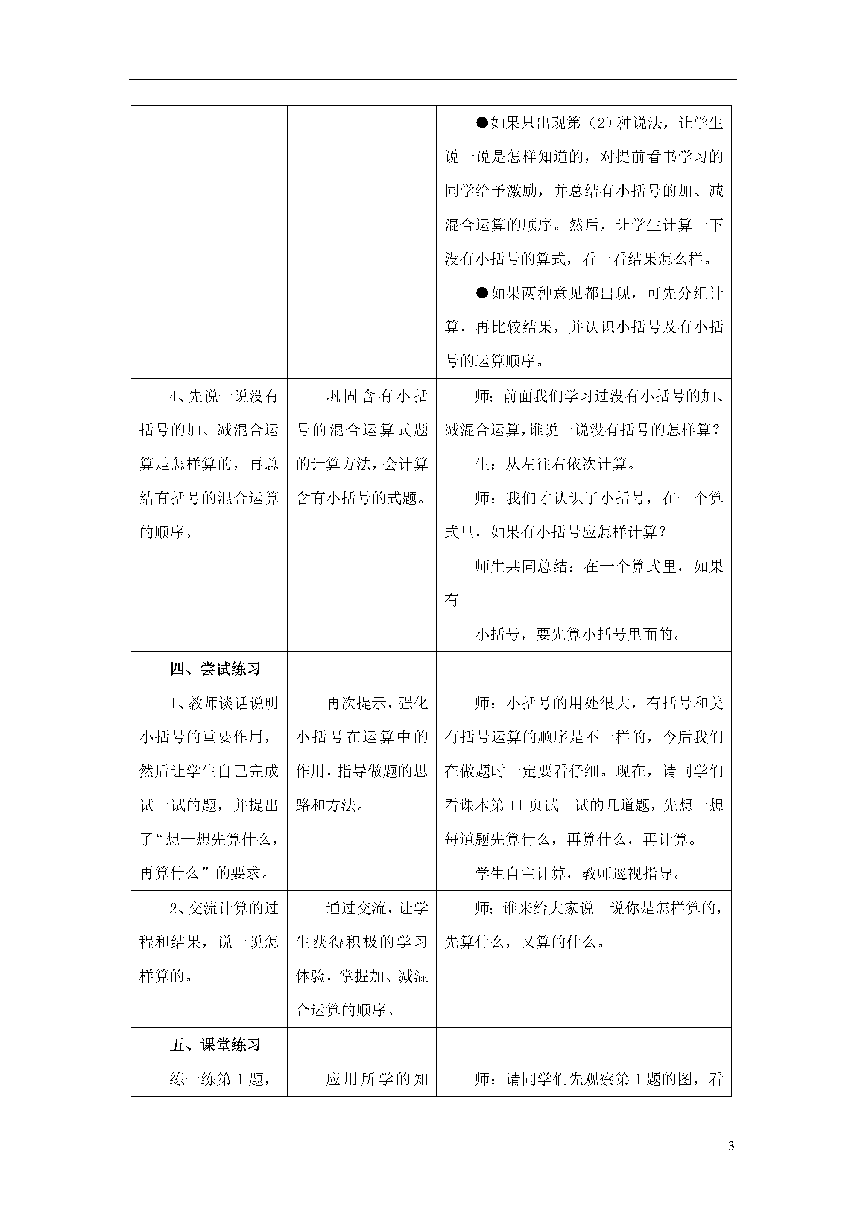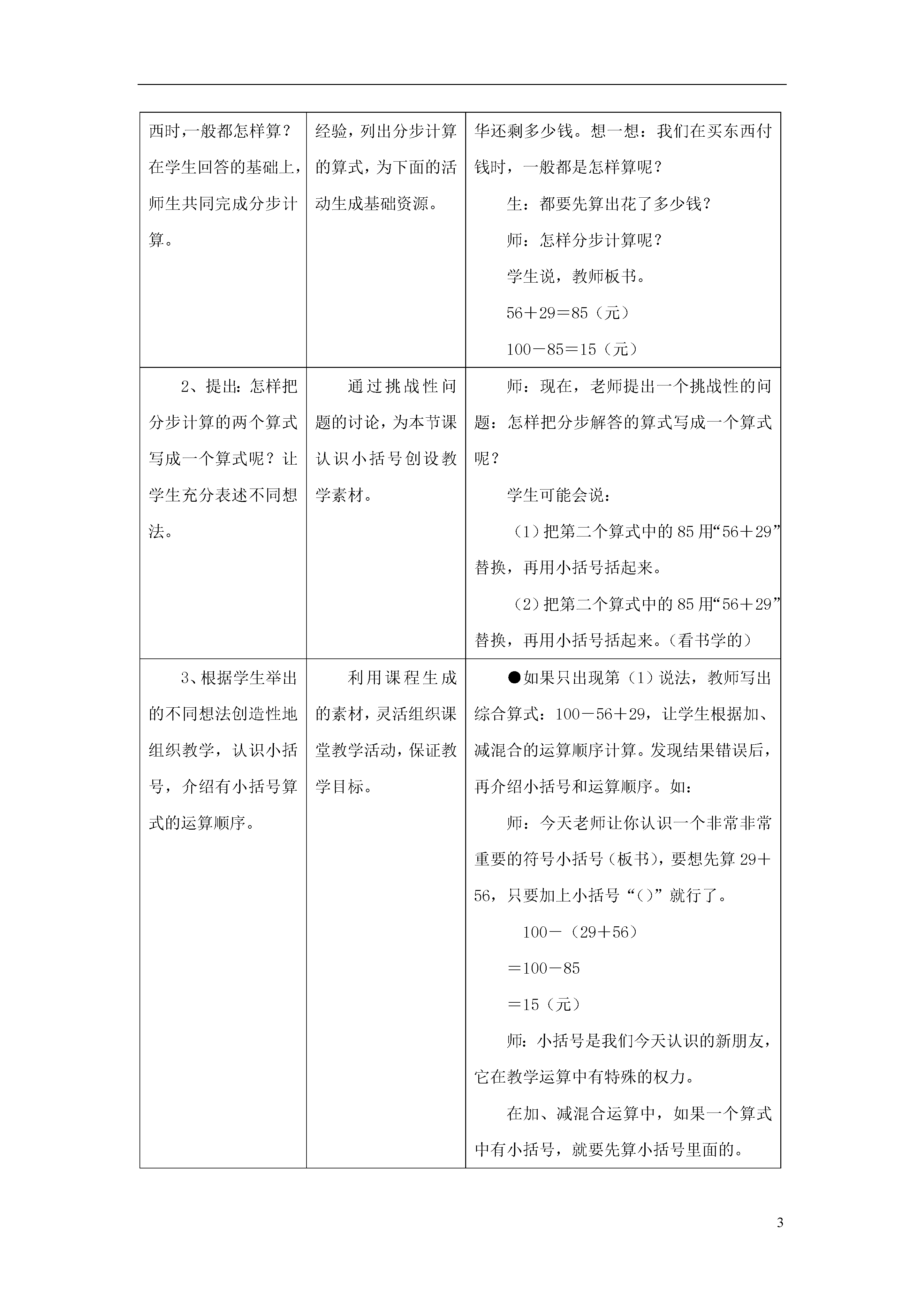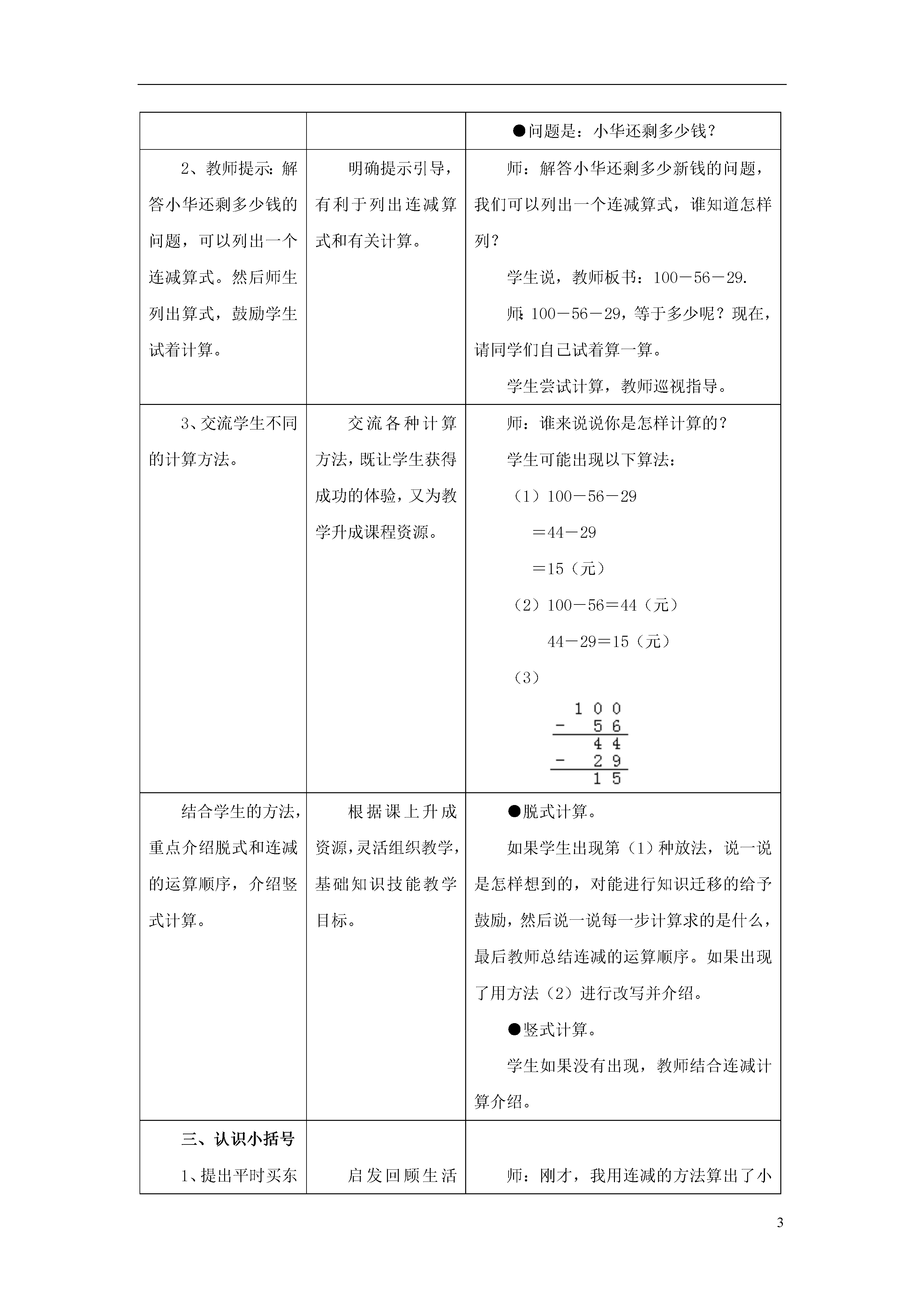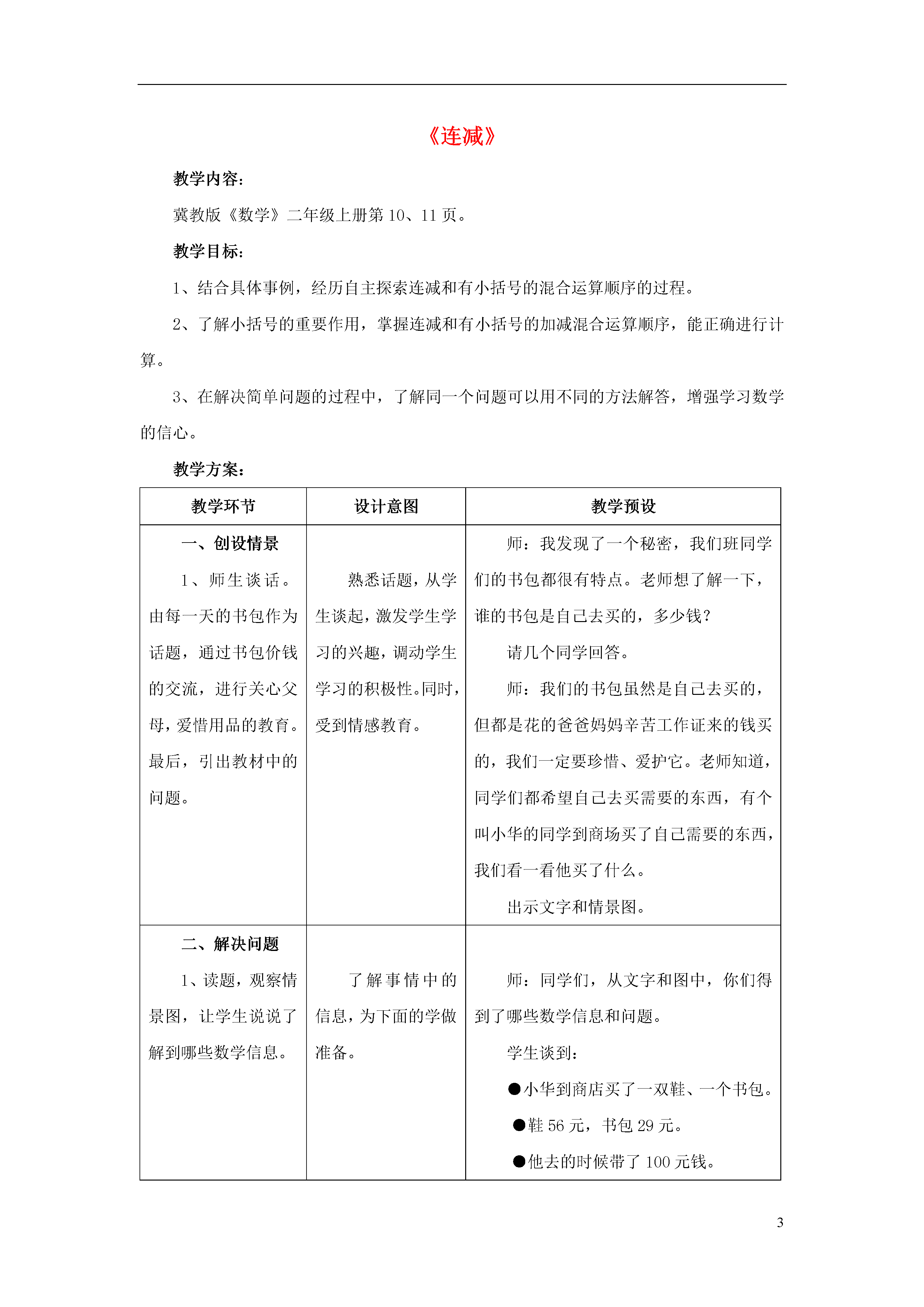 3《连减》教学内容:冀教版《数学》二年级上册第10、11页。教学目标:1、结合具体事例,经历自主探索连减和有小括号的混合运算顺序的过程。2、了解小括号的重要作用,掌握连减和有小括号的加减混合运算顺序,能正确进行计算。3、在解决简单问题的过程中,了解同一个问题可以用不同的方法解答,增强学习数学的信心。教学方案:教学环节设计意图教学预设一、创设情景1、师生谈话。由每一天的书包作为话题,通过书包价钱的交流,进行关心父母,爱惜用品的教育。最后,引出教材中的问题。熟悉话题,从学生谈起,激发学生学习的兴趣,调动学生学习的积极性。同时,受到情感教育。师:我发现了一个秘密,我们班同学们的书包都很有特点。老师想了解一下,谁的书包是自己去买的,多少钱?请几个同学回答。师:我们的书包虽然是自己去买的,但都是花的爸爸妈妈辛苦工作证来的钱买的,我们一定要珍惜、爱护它。老师知道,同学们都希望自己去买需要的东西,有个叫小华的同学到商场买了自己需要的东西,我们看一看他买了什么。出示文字和情景图。二、解决问题1、读题,观察情景图,让学生说说了解到哪些数学信息。了解事情中的信息,为下面的学做准备。师:同学们,从文字和图中,你们得到了哪些数学信息和问题。学生谈到:●小华到商店买了一双鞋、一个书包。●鞋56元,书包29元。●他去的时候带了100元钱。●问题是:小华还剩多少钱?2、教师提示:解答小华还剩多少钱的问题,可以列出一个连减算式。然后师生列出算式,鼓励学生试着计算。明确提示引导,有利于列出连减算式和有关计算。师:解答小华还剩多少新钱的问题,我们可以列出一个连减算式,谁知道怎样列?学生说,教师板书:100-56-29.师:100-56-29,等于多少呢?现在,请同学们自己试着算一算。学生尝试计算,教师巡视指导。3、交流学生不同的计算方法。交流各种计算方法,既让学生获得成功的体验,又为教学升成课程资源。师:谁来说说你是怎样计算的?学生可能出现以下算法:(1)100-56-29=44-29=15(元)(2)100-56=44(元)44-29=15(元)(3)结合学生的方法,重点介绍脱式和连减的运算顺序,介绍竖式计算。根据课上升成资源,灵活组织教学,基础知识技能教学目标。●脱式计算。如果学生出现第(1)种放法,说一说是怎样想到的,对能进行知识迁移的给予鼓励,然后说一说每一步计算求的是什么,最后教师总结连减的运算顺序。如果出现了用方法(2)进行改写并介绍。●竖式计算。学生如果没有出现,教师结合连减计算介绍。三、认识小括号1、提出平时买东西时,一般都怎样算?在学生回答的基础上,师生共同完成分步计算。启发回顾生活经验,列出分步计算的算式,为下面的活动生成基础资源。师:刚才,我用连减的方法算出了小华还剩多少钱。想一想:我们在买东西付钱时,一般都是怎样算呢?生:都要先算出花了多少钱?师:怎样分步计算呢?学生说,教师板书。56+29=85(元)100-85=15(元)2、提出:怎样把分步计算的两个算式写成一个算式呢?让学生充分表述不同想法。通过挑战性问题的讨论,为本节课认识小括号创设教学素材。师:现在,老师提出一个挑战性的问题:怎样把分步解答的算式写成一个算式呢?学生可能会说:(1)把第二个算式中的85用“56+29”替换,再用小括号括起来。(2)把第二个算式中的85用“56+29”替换,再用小括号括起来。(看书学的)3、根据学生举出的不同想法创造性地组织教学,认识小括号,介绍有小括号算式的运算顺序。利用课程生成的素材,灵活组织课堂教学活动,保证教学目标。●如果只出现第(1)说法,教师写出综合算式:100-56+29,让学生根据加、减混合的运算顺序计算。发现结果错误后,再介绍小括号和运算顺序。如:师:今天老师让你认识一个非常非常重要的符号小括号(板书),要想先算29+56,只要加上小括号“()”就行了。100-(29+56)=100-85=15(元)师:小括号是我们今天认识的新朋友,它在教学运算中有特殊的权力。在加、减混合运算中,如果一个算式中有小括号,就要先算小括号里面的。●如果只出现第(2)种说法,让学生说一说是怎样知道的,对提前看书学习的同学给予激励,并总结有小括号的加、减混合运算的顺序。然后,让学生计算一下没有小括号的算式,看一看结果怎么样。●如果两种意见都出现,可先分组计算,再比较结果,并认识小括号及有小括号的运算顺序。4、先说一说没有括号的加、减混合运算是怎样算的,再总结有括号的混合运算的顺序。巩固含有小括号的混合运算式题的计算方法,会计算含有小括号的式题。师:前面我们学习过没有小括号的加、减混合运算,谁说一说没有括号的怎样算?生:从左往右
