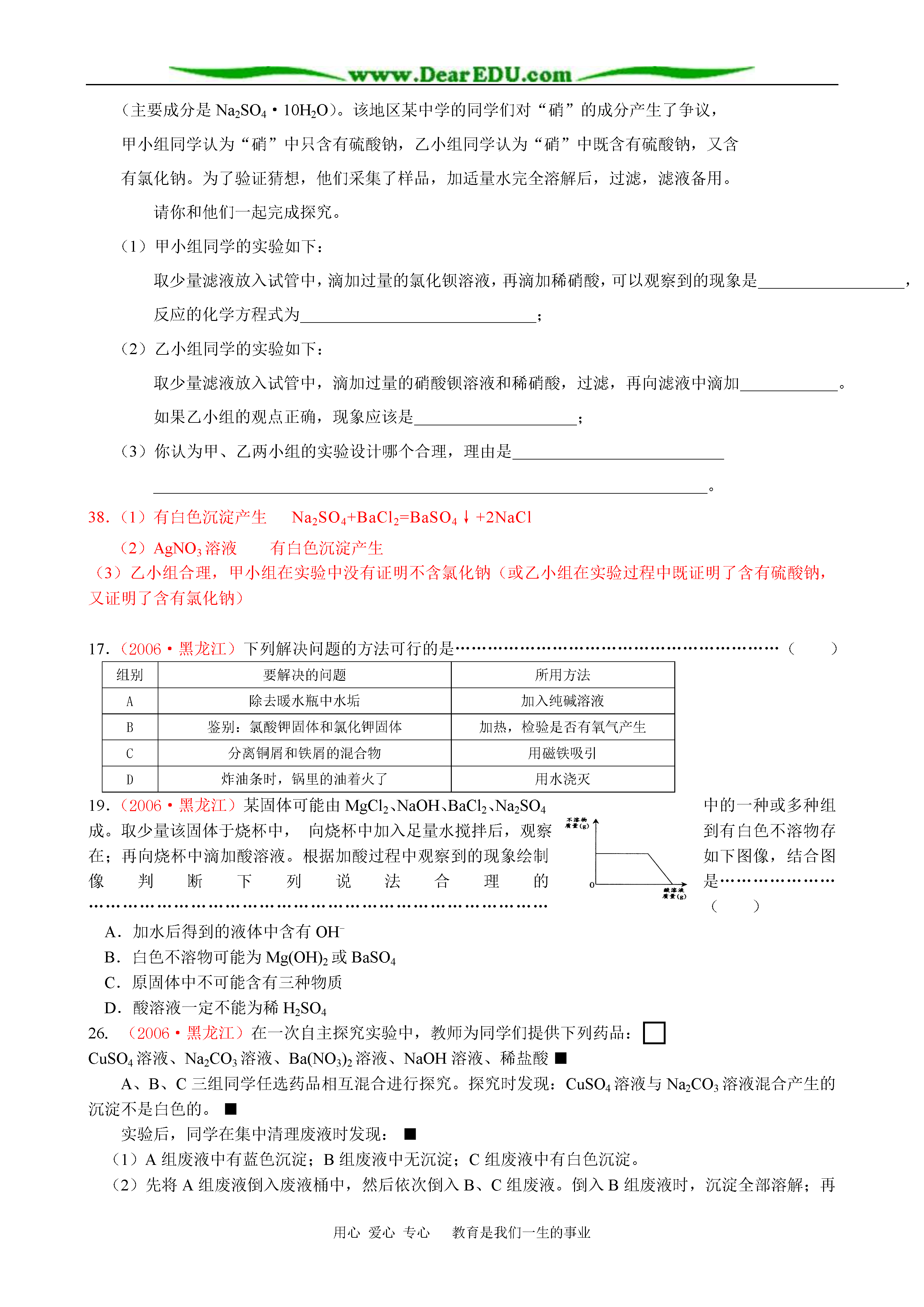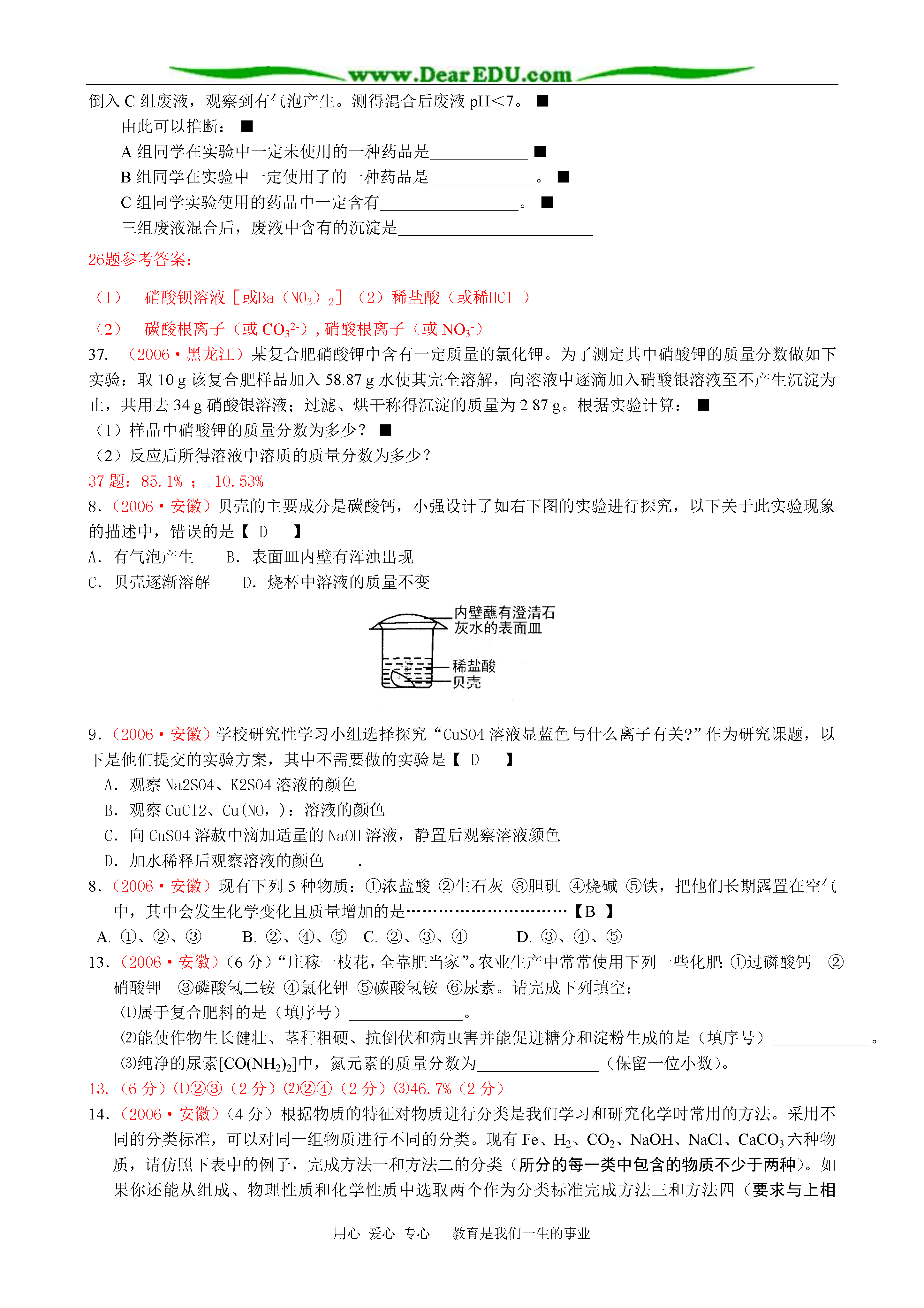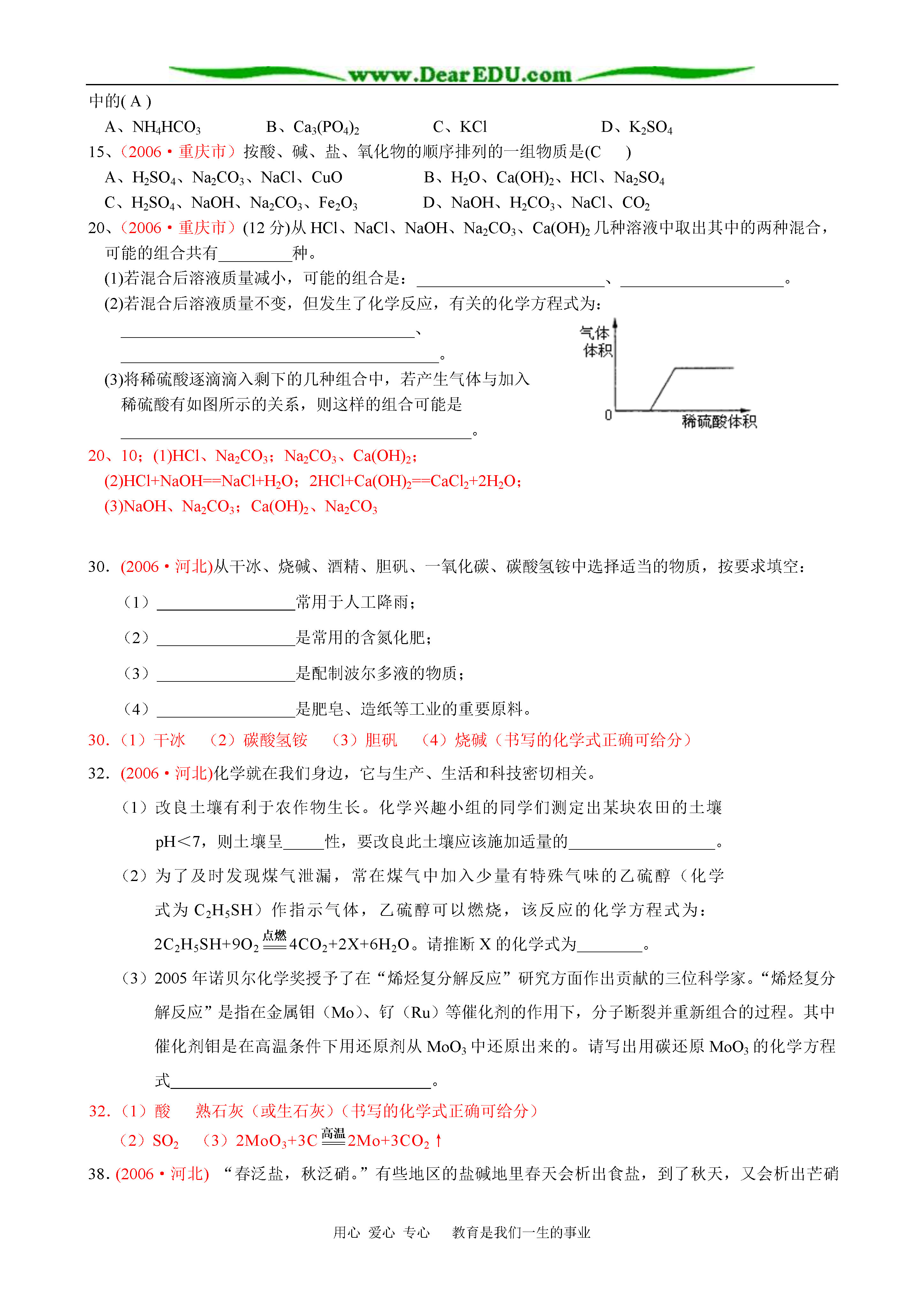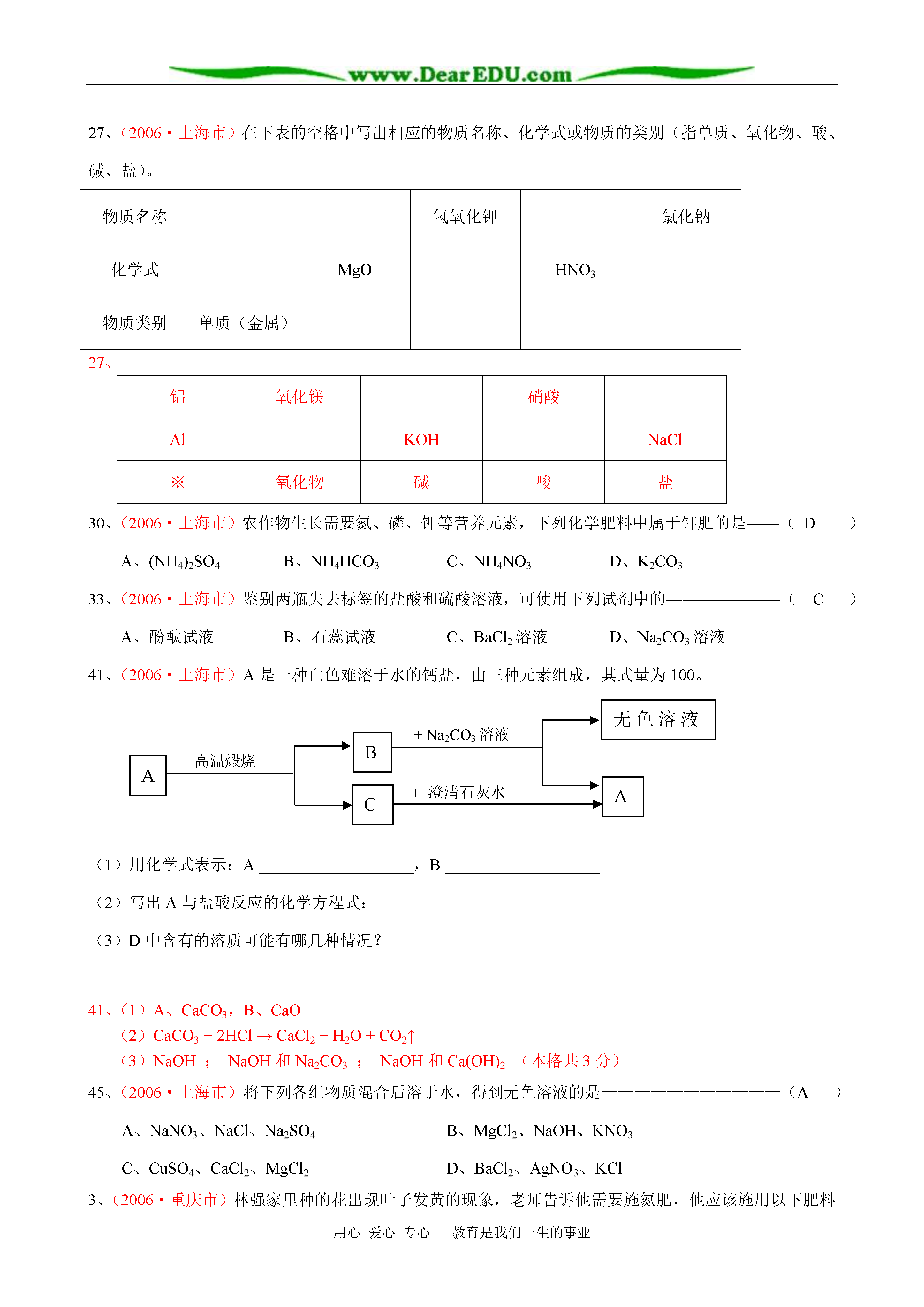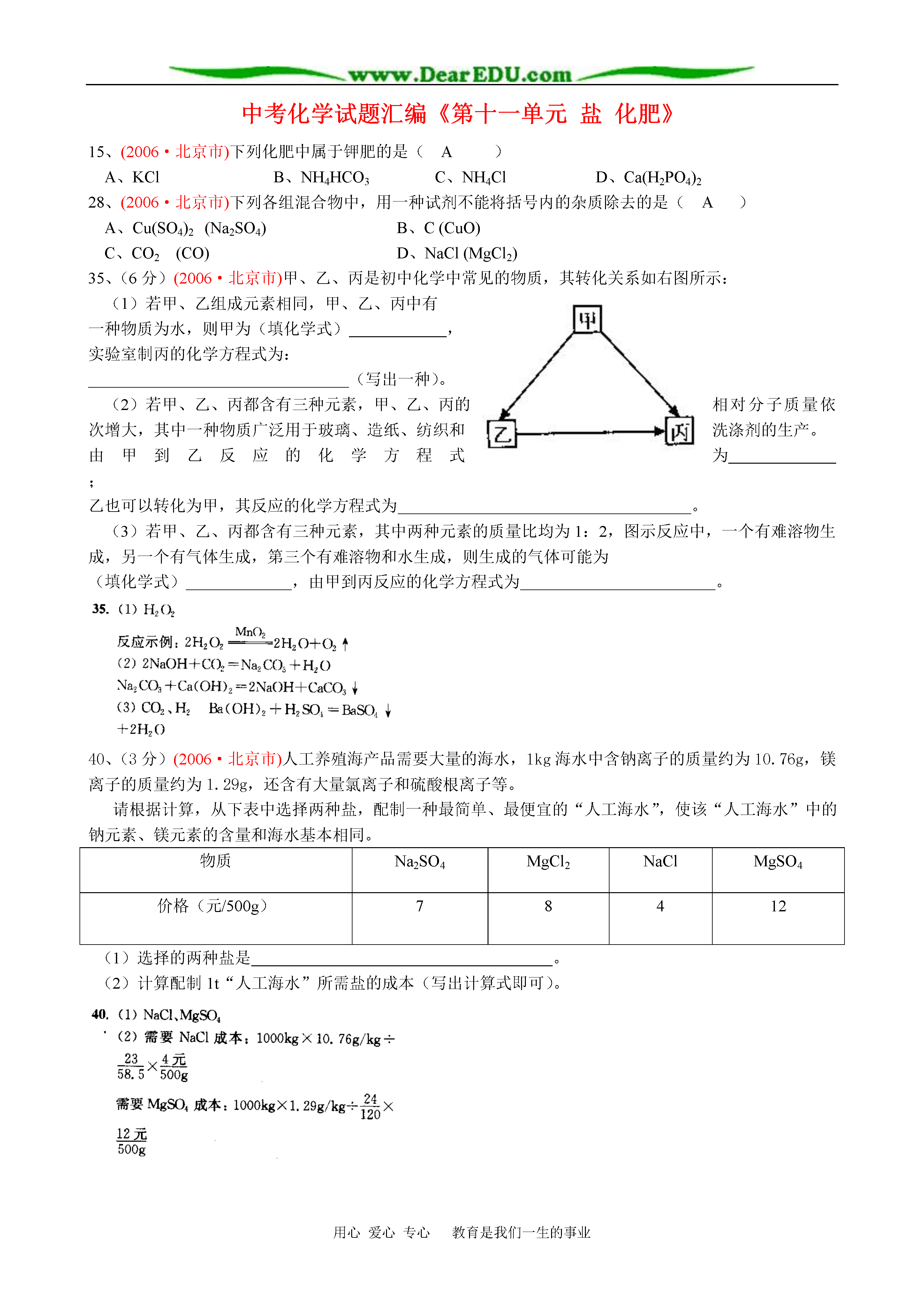 用心爱心专心教育是我们一生的事业中考化学试题汇编《第十一单元盐化肥》15、(2006·北京市)下列化肥中属于钾肥的是(A)A、KClB、NH4HCO3C、NH4ClD、Ca(H2PO4)228、(2006·北京市)下列各组混合物中,用一种试剂不能将括号内的杂质除去的是(A)A、Cu(SO4)2(Na2SO4)B、C(CuO)C、CO2(CO)D、NaCl(MgCl2)35、(6分)(2006·北京市)甲、乙、丙是初中化学中常见的物质,其转化关系如右图所示:(1)若甲、乙组成元素相同,甲、乙、丙中有一种物质为水,则甲为(填化学式),实验室制丙的化学方程式为:(写出一种)。(2)若甲、乙、丙都含有三种元素,甲、乙、丙的相对分子质量依次增大,其中一种物质广泛用于玻璃、造纸、纺织和洗涤剂的生产。由甲到乙反应的化学方程式为;乙也可以转化为甲,其反应的化学方程式为。(3)若甲、乙、丙都含有三种元素,其中两种元素的质量比均为1:2,图示反应中,一个有难溶物生成,另一个有气体生成,第三个有难溶物和水生成,则生成的气体可能为(填化学式),由甲到丙反应的化学方程式为。40、(3分)(2006·北京市)人工养殖海产品需要大量的海水,1kg海水中含钠离子的质量约为10.76g,镁离子的质量约为1.29g,还含有大量氯离子和硫酸根离子等。请根据计算,从下表中选择两种盐,配制一种最简单、最便宜的“人工海水”,使该“人工海水”中的钠元素、镁元素的含量和海水基本相同。物质Na2SO4MgCl2NaClMgSO4价格(元/500g)78412(1)选择的两种盐是。(2)计算配制1t“人工海水”所需盐的成本(写出计算式即可)。27、(2006·上海市)在下表的空格中写出相应的物质名称、化学式或物质的类别(指单质、氧化物、酸、碱、盐)。物质名称氢氧化钾氯化钠化学式MgOHNO3物质类别单质(金属)27、铝氧化镁硝酸AlKOHNaCl※氧化物碱酸盐30、(2006·上海市)农作物生长需要氮、磷、钾等营养元素,下列化学肥料中属于钾肥的是——(D)A、(NH4)2SO4B、NH4HCO3C、NH4NO3D、K2CO333、(2006·上海市)鉴别两瓶失去标签的盐酸和硫酸溶液,可使用下列试剂中的———————(C)A、酚酞试液B、石蕊试液C、BaCl2溶液D、Na2CO3溶液41、(2006·上海市)A是一种白色难溶于水的钙盐,由三种元素组成,其式量为100。高温煅烧+澄清石灰水+Na2CO3溶液AABC无色溶液D(1)用化学式表示:A___________________,B___________________(2)写出A与盐酸反应的化学方程式:______________________________________(3)D中含有的溶质可能有哪几种情况?____________________________________________________________________41、(1)A、CaCO3,B、CaO(2)CaCO3+2HCl→CaCl2+H2O+CO2↑(3)NaOH;NaOH和Na2CO3;NaOH和Ca(OH)2(本格共3分)45、(2006·上海市)将下列各组物质混合后溶于水,得到无色溶液的是———————————(A)A、NaNO3、NaCl、Na2SO4B、MgCl2、NaOH、KNO3C、CuSO4、CaCl2、MgCl2D、BaCl2、AgNO3、KCl3、(2006·重庆市)林强家里种的花出现叶子发黄的现象,老师告诉他需要施氮肥,他应该施用以下肥料中的(A)A、NH4HCO3B、Ca3(PO4)2C、KClD、K2SO415、(2006·重庆市)按酸、碱、盐、氧化物的顺序排列的一组物质是(C)A、H2SO4、Na2CO3、NaCl、CuOB、H2O、Ca(OH)2、HCl、Na2SO4C、H2SO4、NaOH、Na2CO3、Fe2O3D、NaOH、H2CO3、NaCl、CO220、(2006·重庆市)(12分)从HCl、NaCl、NaOH、Na2CO3、Ca(OH)2几种溶液中取出其中的两种混合,可能的组合共有_________种。(1)若混合后溶液质量减小,可能的组合是:_______________________、____________________。(2)若混合后溶液质量不变,但发生了化学反应,有关的化学方程式为:____________________________________、_______________________________________。(3)将稀