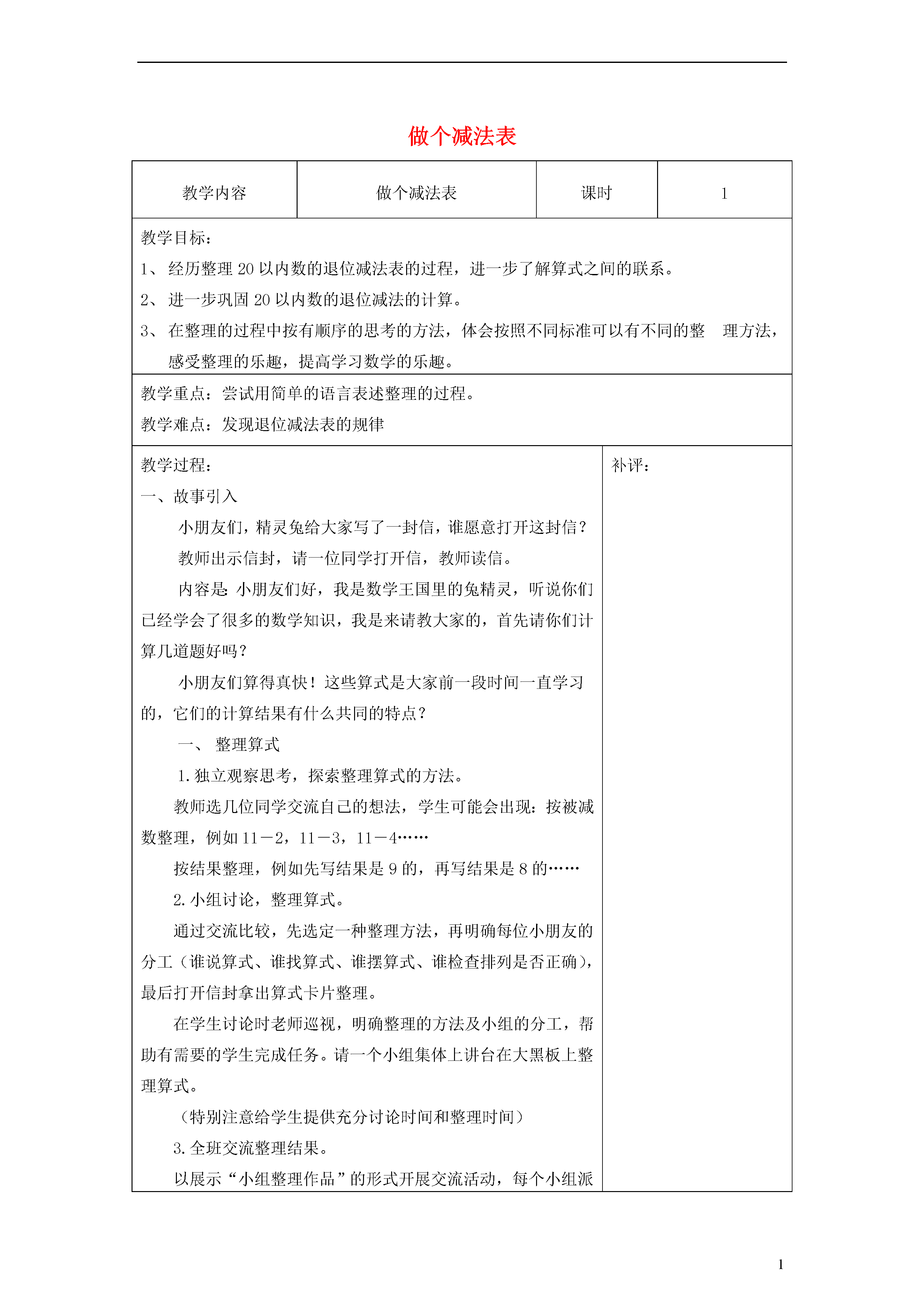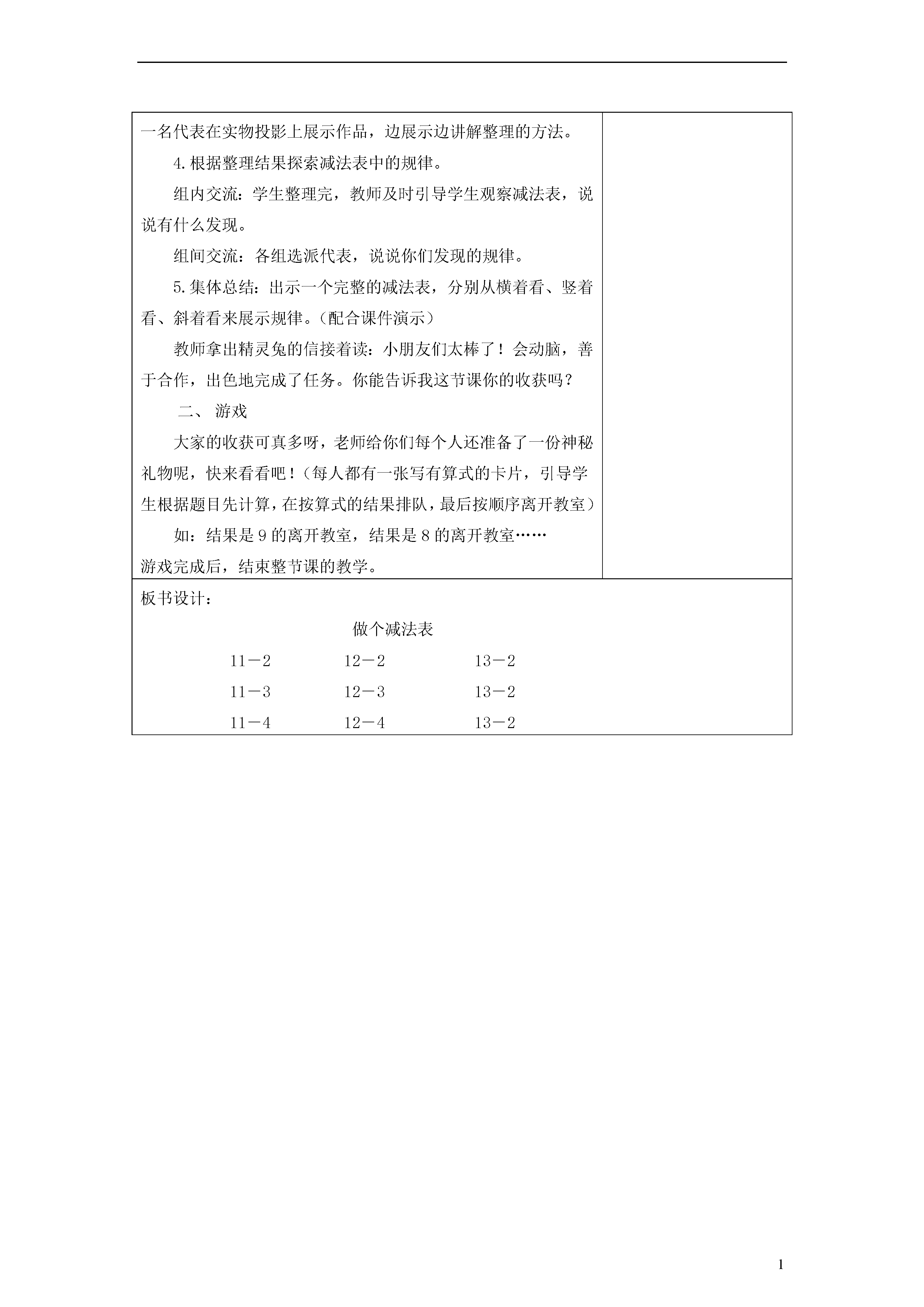 1做个减法表教学内容做个减法表课时1教学目标:经历整理20以内数的退位减法表的过程,进一步了解算式之间的联系。进一步巩固20以内数的退位减法的计算。在整理的过程中按有顺序的思考的方法,体会按照不同标准可以有不同的整理方法,感受整理的乐趣,提高学习数学的乐趣。教学重点:尝试用简单的语言表述整理的过程。教学难点:发现退位减法表的规律教学过程:一、故事引入小朋友们,精灵兔给大家写了一封信,谁愿意打开这封信?教师出示信封,请一位同学打开信,教师读信。内容是:小朋友们好,我是数学王国里的兔精灵,听说你们已经学会了很多的数学知识,我是来请教大家的,首先请你们计算几道题好吗?小朋友们算得真快!这些算式是大家前一段时间一直学习的,它们的计算结果有什么共同的特点?整理算式1.独立观察思考,探索整理算式的方法。教师选几位同学交流自己的想法,学生可能会出现:按被减数整理,例如11-2,11-3,11-4……按结果整理,例如先写结果是9的,再写结果是8的……2.小组讨论,整理算式。通过交流比较,先选定一种整理方法,再明确每位小朋友的分工(谁说算式、谁找算式、谁摆算式、谁检查排列是否正确),最后打开信封拿出算式卡片整理。在学生讨论时老师巡视,明确整理的方法及小组的分工,帮助有需要的学生完成任务。请一个小组集体上讲台在大黑板上整理算式。(特别注意给学生提供充分讨论时间和整理时间)3.全班交流整理结果。以展示“小组整理作品”的形式开展交流活动,每个小组派一名代表在实物投影上展示作品,边展示边讲解整理的方法。4.根据整理结果探索减法表中的规律。组内交流:学生整理完,教师及时引导学生观察减法表,说说有什么发现。组间交流:各组选派代表,说说你们发现的规律。5.集体总结:出示一个完整的减法表,分别从横着看、竖着看、斜着看来展示规律。(配合课件演示)教师拿出精灵兔的信接着读:小朋友们太棒了!会动脑,善于合作,出色地完成了任务。你能告诉我这节课你的收获吗?游戏大家的收获可真多呀,老师给你们每个人还准备了一份神秘礼物呢,快来看看吧!(每人都有一张写有算式的卡片,引导学生根据题目先计算,在按算式的结果排队,最后按顺序离开教室)如:结果是9的离开教室,结果是8的离开教室……游戏完成后,结束整节课的教学。补评:板书设计:做个减法表11-212-213-211-312-313-211-412-413-2