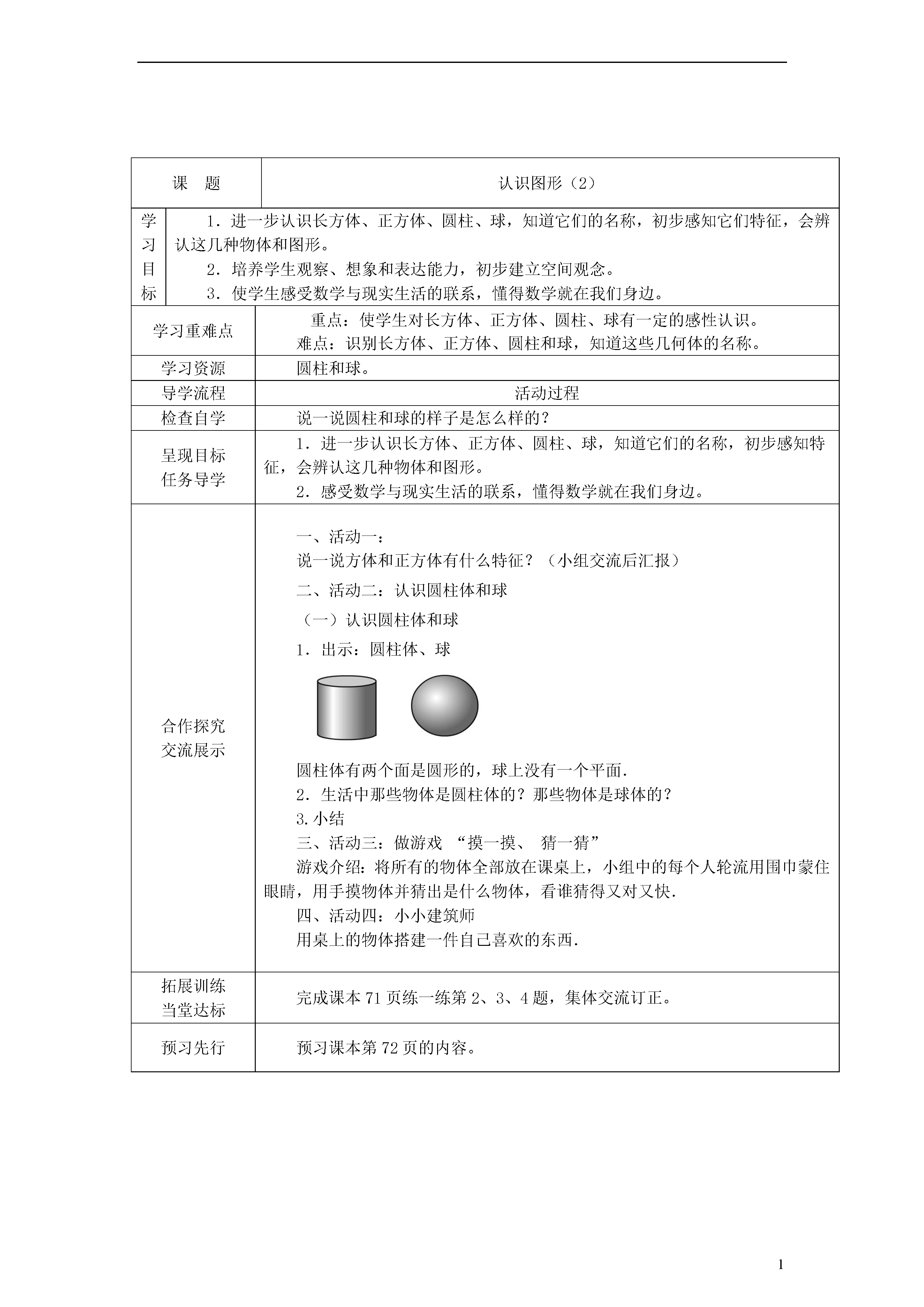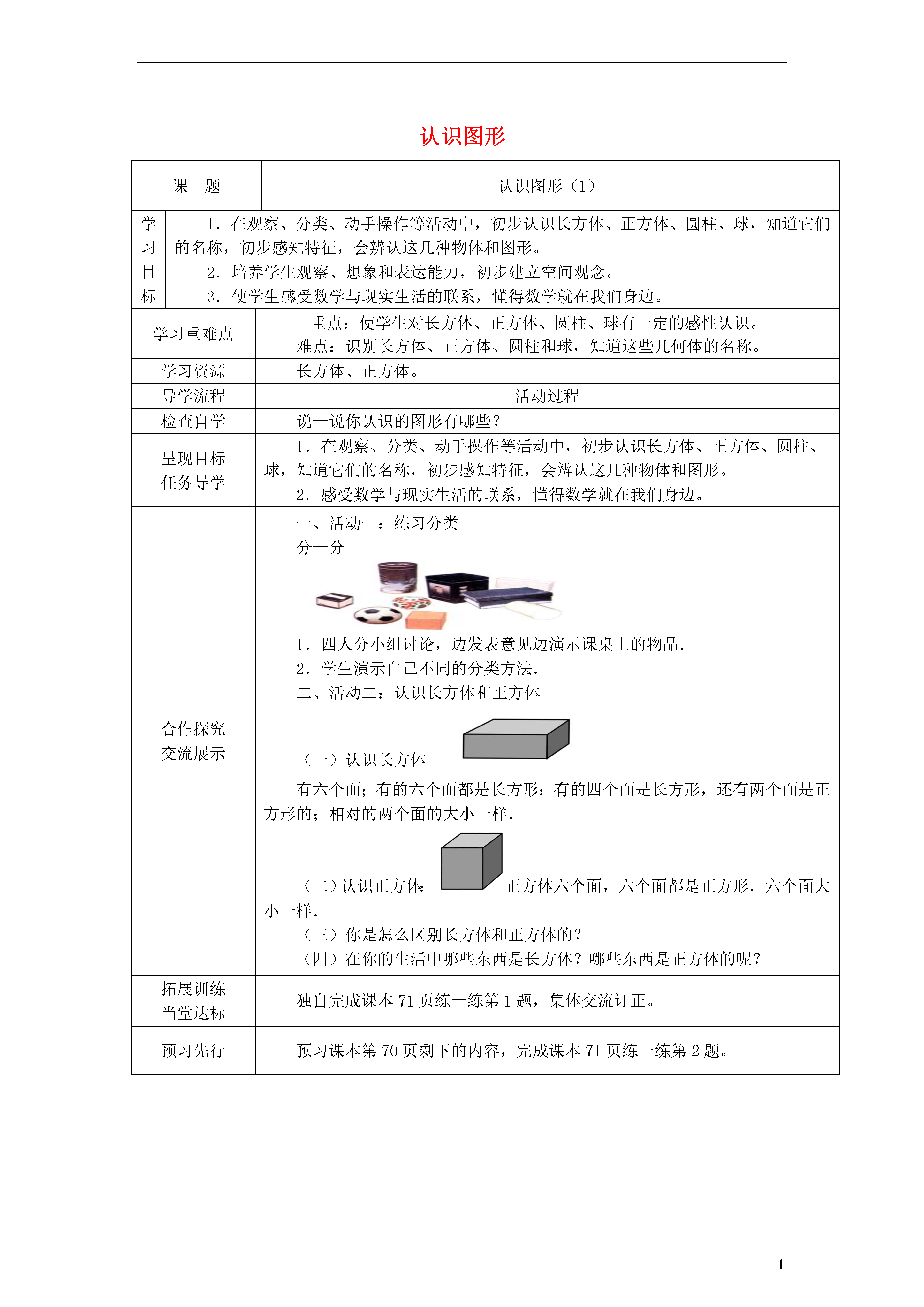 1认识图形课题认识图形(1)学习目标1.在观察、分类、动手操作等活动中,初步认识长方体、正方体、圆柱、球,知道它们的名称,初步感知特征,会辨认这几种物体和图形。2.培养学生观察、想象和表达能力,初步建立空间观念。3.使学生感受数学与现实生活的联系,懂得数学就在我们身边。学习重难点重点:使学生对长方体、正方体、圆柱、球有一定的感性认识。难点:识别长方体、正方体、圆柱和球,知道这些几何体的名称。学习资源长方体、正方体。导学流程活动过程检查自学说一说你认识的图形有哪些?呈现目标任务导学1.在观察、分类、动手操作等活动中,初步认识长方体、正方体、圆柱、球,知道它们的名称,初步感知特征,会辨认这几种物体和图形。2.感受数学与现实生活的联系,懂得数学就在我们身边。合作探究交流展示一、活动一:练习分类分一分1.四人分小组讨论,边发表意见边演示课桌上的物品.2.学生演示自己不同的分类方法.二、活动二:认识长方体和正方体(一)认识长方体有六个面;有的六个面都是长方形;有的四个面是长方形,还有两个面是正方形的;相对的两个面的大小一样.(二)认识正方体:正方体六个面,六个面都是正方形.六个面大小一样.(三)你是怎么区别长方体和正方体的?(四)在你的生活中哪些东西是长方体?哪些东西是正方体的呢?拓展训练当堂达标独自完成课本71页练一练第1题,集体交流订正。预习先行预习课本剩下的内容,完成课本71页练一练第2题。课题认识图形(2)学习目标1.进一步认识长方体、正方体、圆柱、球,知道它们的名称,初步感知它们特征,会辨认这几种物体和图形。2.培养学生观察、想象和表达能力,初步建立空间观念。3.使学生感受数学与现实生活的联系,懂得数学就在我们身边。学习重难点重点:使学生对长方体、正方体、圆柱、球有一定的感性认识。难点:识别长方体、正方体、圆柱和球,知道这些几何体的名称。学习资源圆柱和球。导学流程活动过程检查自学说一说圆柱和球的样子是怎么样的?呈现目标任务导学1.进一步认识长方体、正方体、圆柱、球,知道它们的名称,初步感知特征,会辨认这几种物体和图形。2.感受数学与现实生活的联系,懂得数学就在我们身边。合作探究交流展示一、活动一:说一说方体和正方体有什么特征?(小组交流后汇报)二、活动二:认识圆柱体和球(一)认识圆柱体和球1.出示:圆柱体、球圆柱体有两个面是圆形的,球上没有一个平面.2.生活中那些物体是圆柱体的?那些物体是球体的?3.小结三、活动三:做游戏“摸一摸、猜一猜”游戏介绍:将所有的物体全部放在课桌上,小组中的每个人轮流用围巾蒙住眼睛,用手摸物体并猜出是什么物体,看谁猜得又对又快.四、活动四:小小建筑师用桌上的物体搭建一件自己喜欢的东西.拓展训练当堂达标完成课本71页练一练第2、3、4题,集体交流订正。预习先行预习课本的内容。