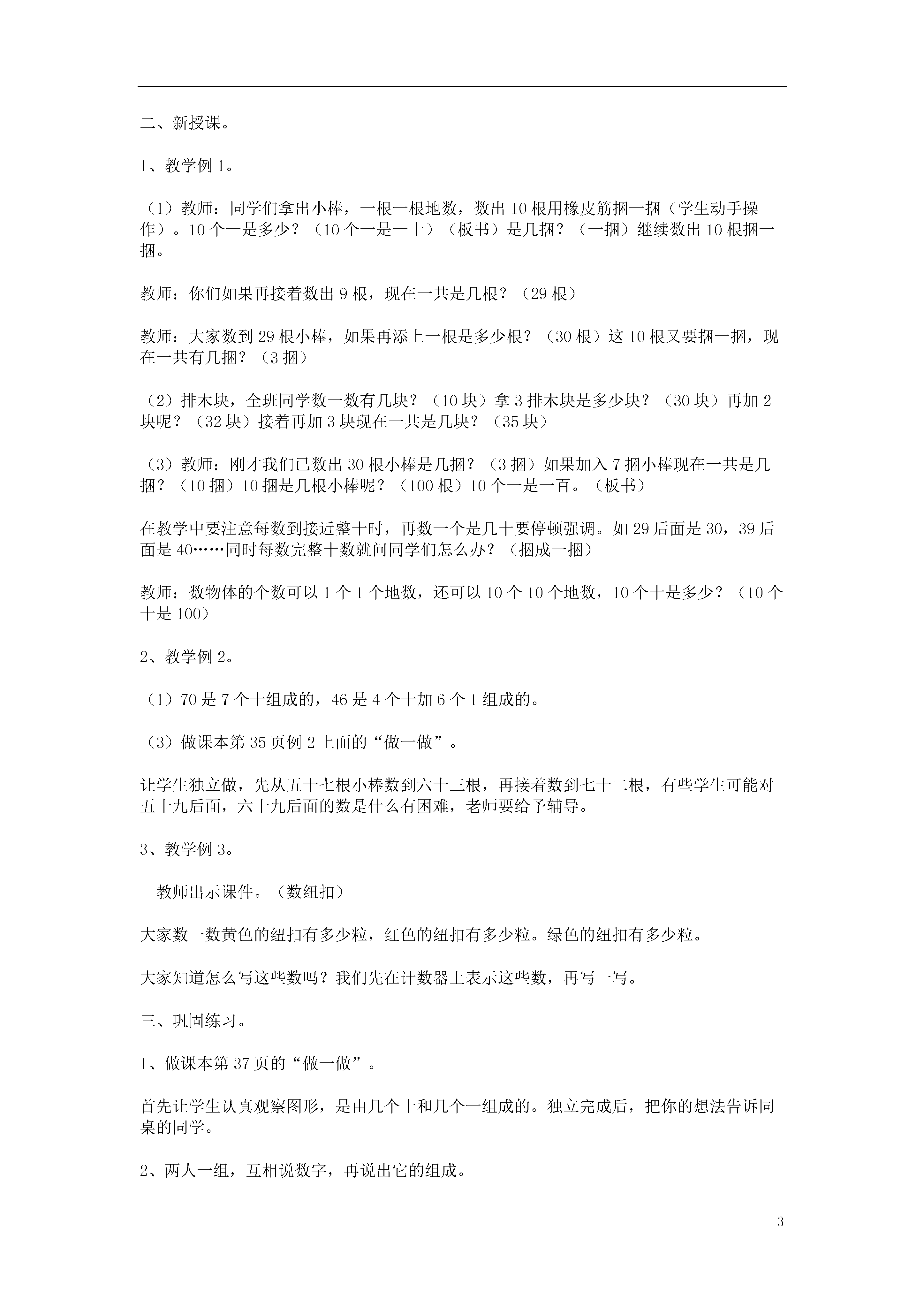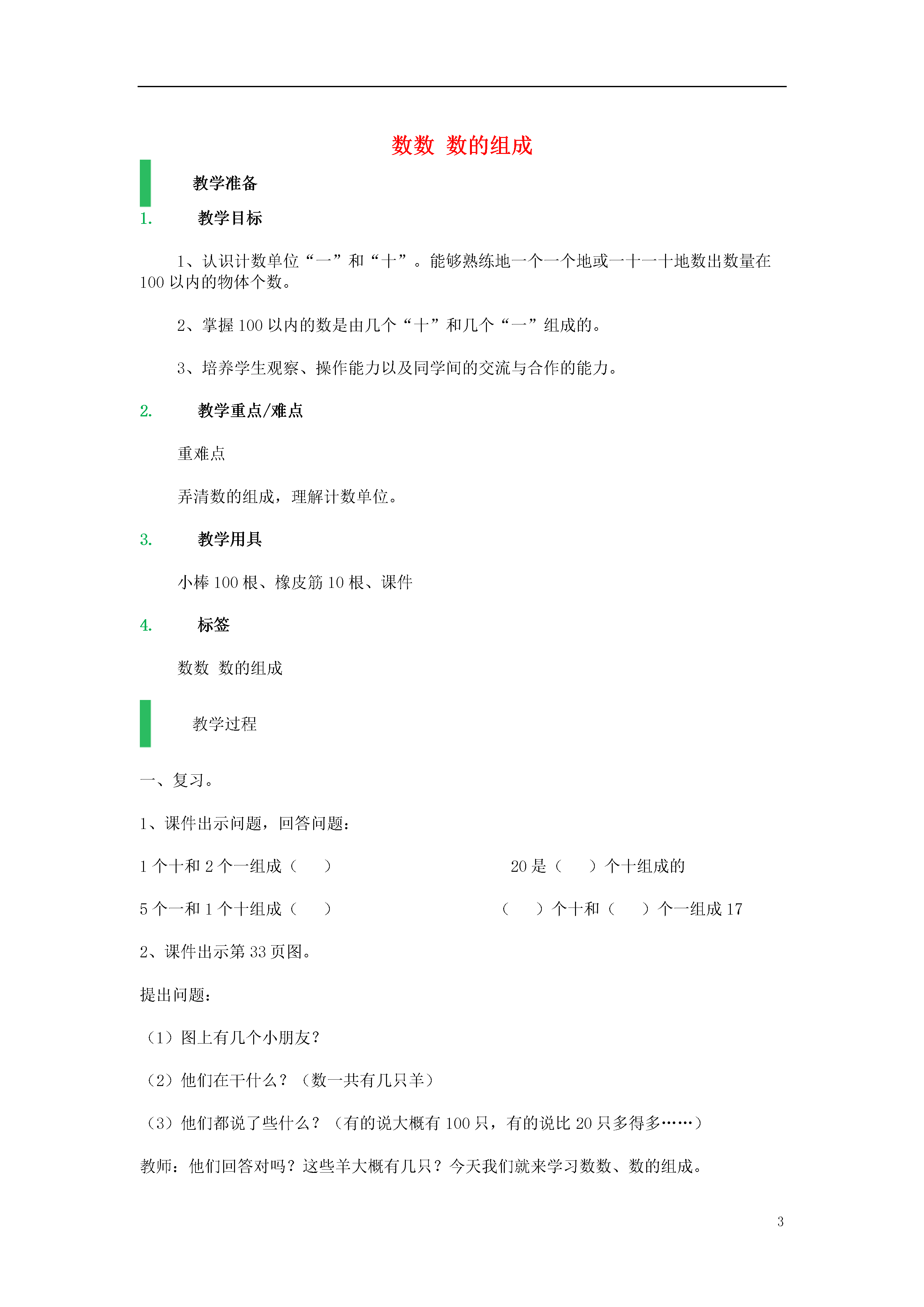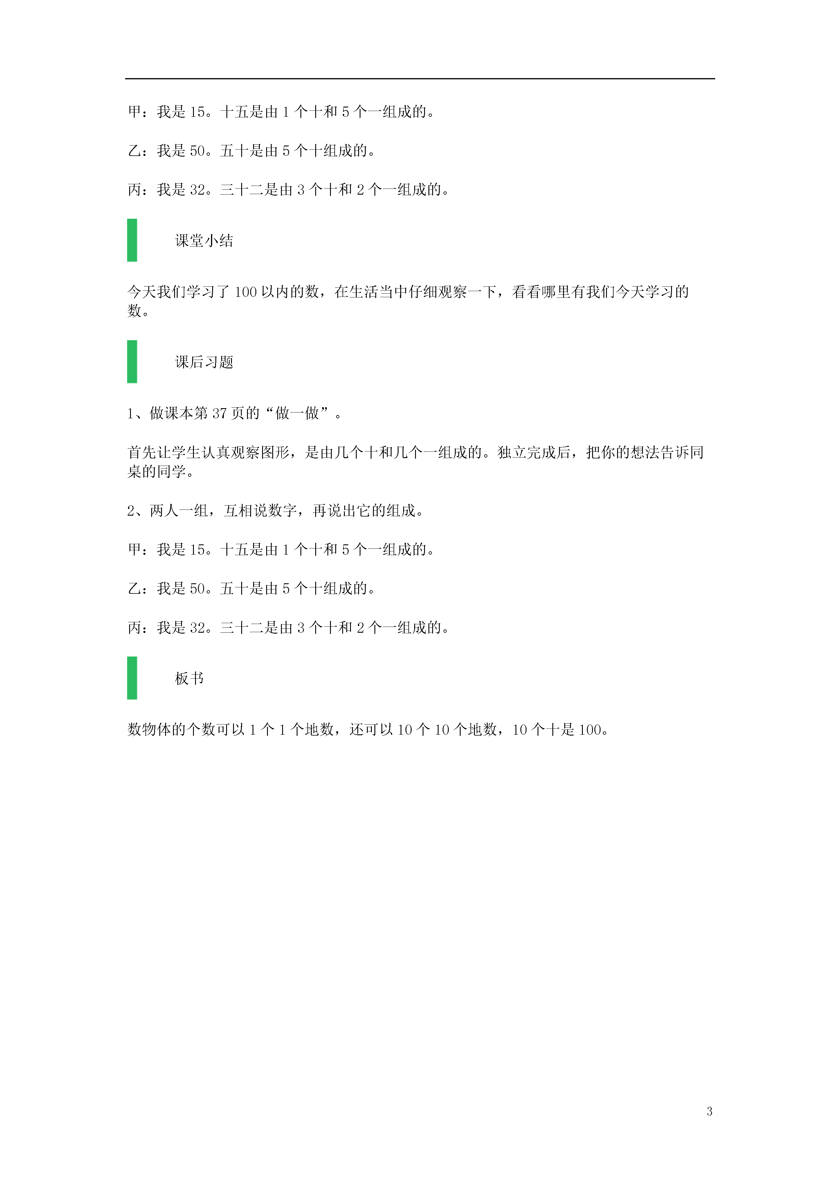 3数数数的组成教学准备1.教学目标1、认识计数单位“一”和“十”。能够熟练地一个一个地或一十一十地数出数量在100以内的物体个数。2、掌握100以内的数是由几个“十”和几个“一”组成的。3、培养学生观察、操作能力以及同学间的交流与合作的能力。2.教学重点/难点重难点弄清数的组成,理解计数单位。3.教学用具小棒100根、橡皮筋10根、课件4.标签数数数的组成教学过程一、复习。1、课件出示问题,回答问题:1个十和2个一组成()20是()个十组成的5个一和1个十组成()()个十和()个一组成172、课件出示图。提出问题:(1)图上有几个小朋友?(2)他们在干什么?(数一共有几只羊)(3)他们都说了些什么?(有的说大概有100只,有的说比20只多得多……)教师:他们回答对吗?这些羊大概有几只?今天我们就来学习数数、数的组成。二、新授课。1、教学例1。(1)教师:同学们拿出小棒,一根一根地数,数出10根用橡皮筋捆一捆(学生动手操作)。10个一是多少?(10个一是一十)(板书)是几捆?(一捆)继续数出10根捆一捆。教师:你们如果再接着数出9根,现在一共是几根?(29根)教师:大家数到29根小棒,如果再添上一根是多少根?(30根)这10根又要捆一捆,现在一共有几捆?(3捆)(2)排木块,全班同学数一数有几块?(10块)拿3排木块是多少块?(30块)再加2块呢?(32块)接着再加3块现在一共是几块?(35块)(3)教师:刚才我们已数出30根小棒是几捆?(3捆)如果加入7捆小棒现在一共是几捆?(10捆)10捆是几根小棒呢?(100根)10个一是一百。(板书)在教学中要注意每数到接近整十时,再数一个是几十要停顿强调。如29后面是30,39后面是40……同时每数完整十数就问同学们怎么办?(捆成一捆)教师:数物体的个数可以1个1个地数,还可以10个10个地数,10个十是多少?(10个十是100)2、教学例2。(1)70是7个十组成的,46是4个十加6个1组成的。(3)做课本例2上面的“做一做”。让学生独立做,先从五十七根小棒数到六十三根,再接着数到七十二根,有些学生可能对五十九后面,六十九后面的数是什么有困难,老师要给予辅导。3、教学例3。教师出示课件。(数纽扣)大家数一数黄色的纽扣有多少粒,红色的纽扣有多少粒。绿色的纽扣有多少粒。大家知道怎么写这些数吗?我们先在计数器上表示这些数,再写一写。三、巩固练习。1、做课本的“做一做”。首先让学生认真观察图形,是由几个十和几个一组成的。独立完成后,把你的想法告诉同桌的同学。2、两人一组,互相说数字,再说出它的组成。甲:我是15。十五是由1个十和5个一组成的。乙:我是50。五十是由5个十组成的。丙:我是32。三十二是由3个十和2个一组成的。课堂小结今天我们学习了100以内的数,在生活当中仔细观察一下,看看哪里有我们今天学习的数。课后习题1、做课本的“做一做”。首先让学生认真观察图形,是由几个十和几个一组成的。独立完成后,把你的想法告诉同桌的同学。2、两人一组,互相说数字,再说出它的组成。甲:我是15。十五是由1个十和5个一组成的。乙:我是50。五十是由5个十组成的。丙:我是32。三十二是由3个十和2个一组成的。板书数物体的个数可以1个1个地数,还可以10个10个地数,10个十是100。