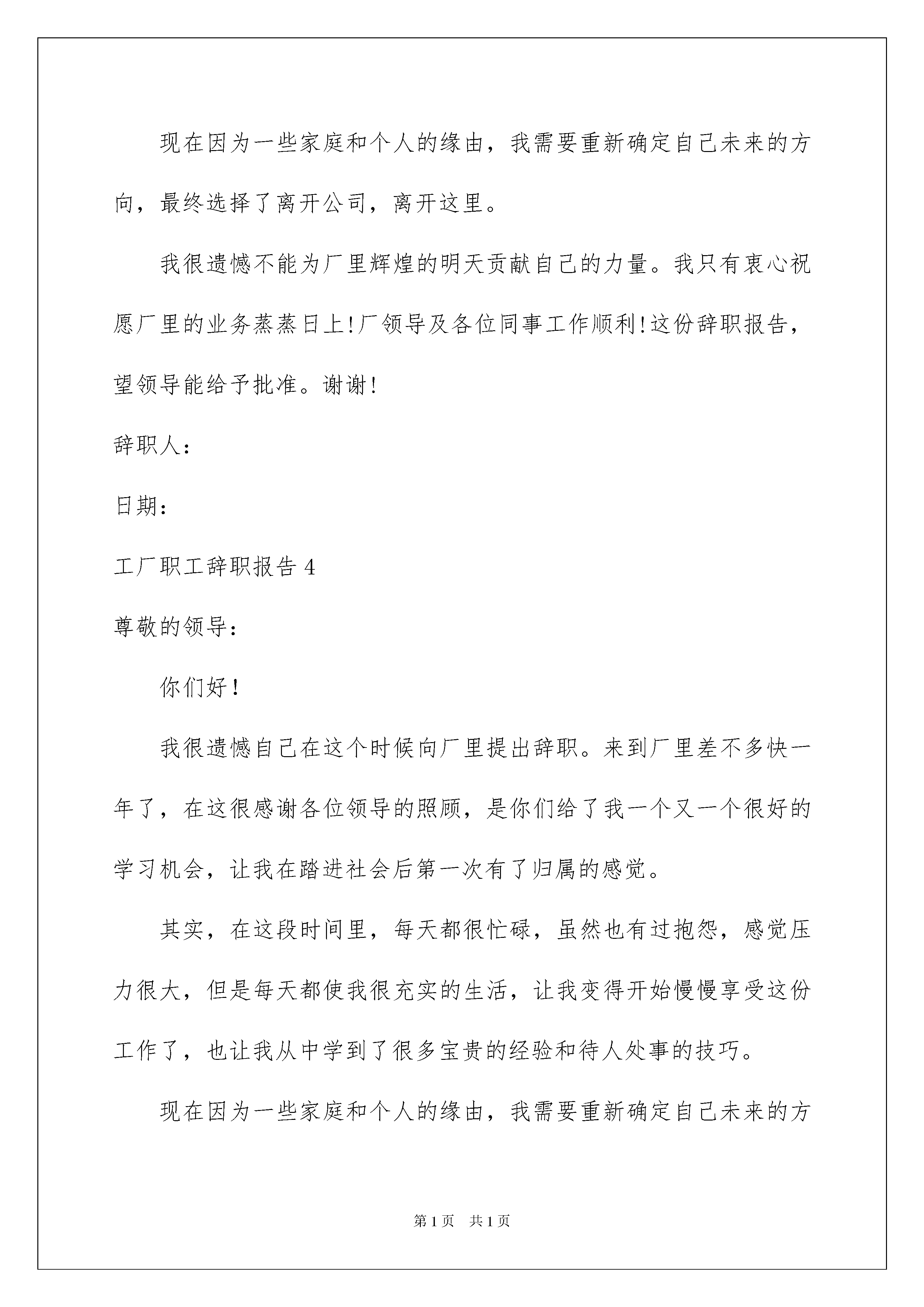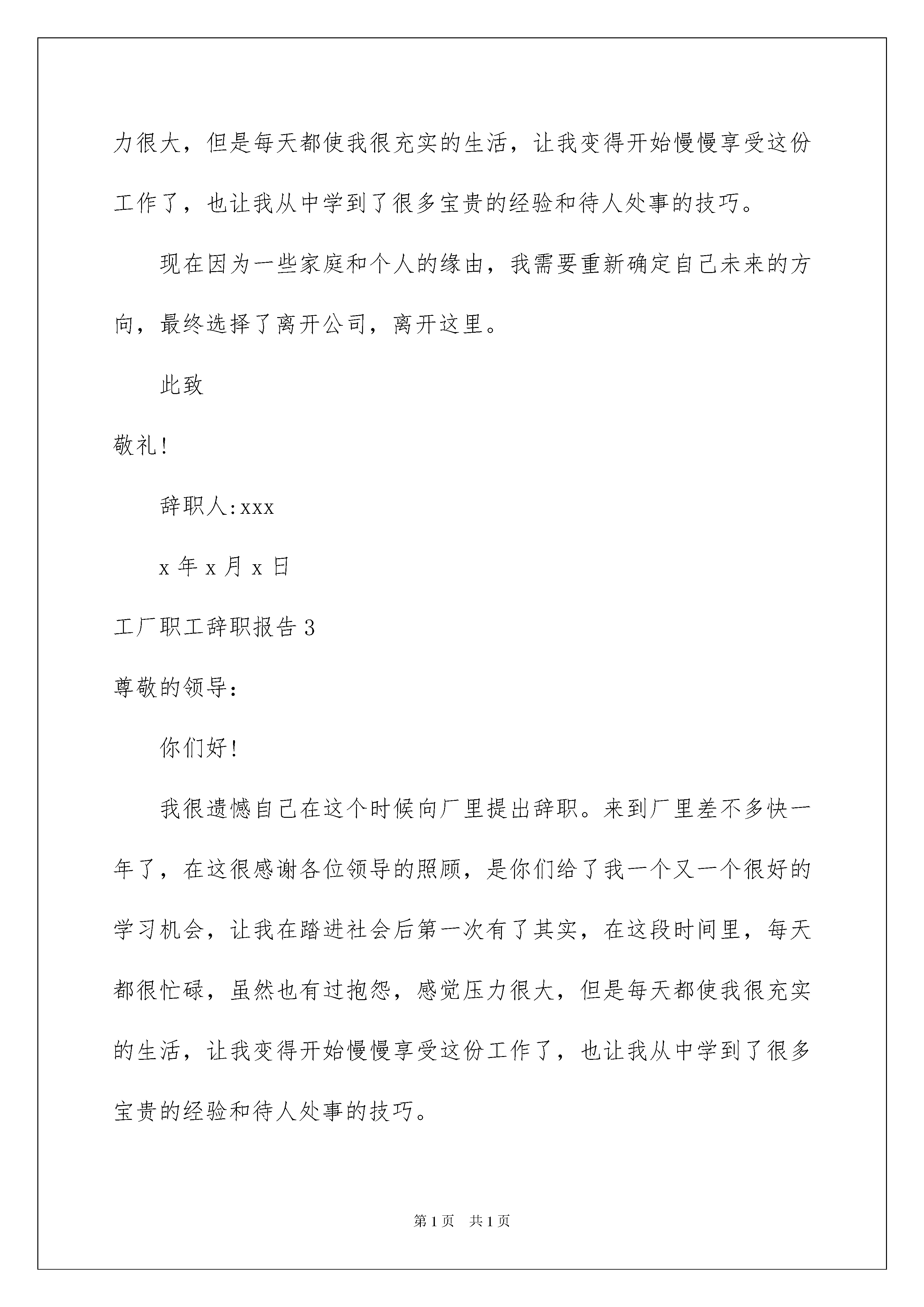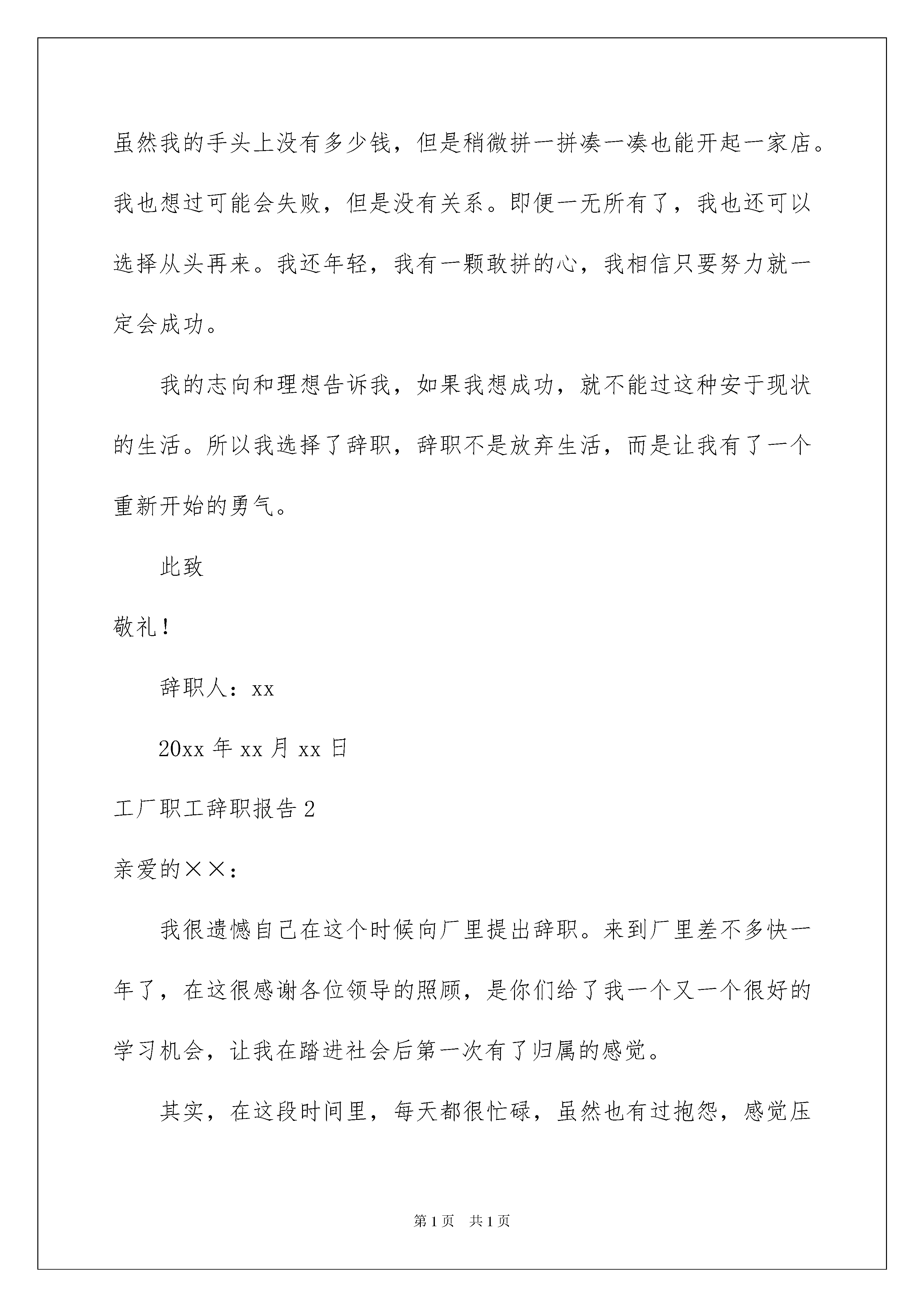 2022工厂职工辞职报告工厂职工辞职报告在岗位上呆了一段时间后,我们可能会面临新的选择,最终与公司告别,这时就要思考一下写辞职报告的事情了。你想知道辞职报告怎么写吗?下面是我整理的工厂职工辞职报告,仅供参考,大家一起来看看吧。工厂职工辞职报告1尊敬的领导您好!我是xx工厂里的一名职工人员,我现在在生产车间工作。我才来到工厂一个月的时间,我就已经忍受不了这里面的工作环境和工作内容了。通过这一个月的工作,让我觉得我的志向不在这里,我的梦想也不在这里。所以在慎重思考之后,我向领导呈上了我的这份辞职报告。希望领导能够仔细阅读,理解我的苦衷和处境。虽然我知道,我出身不好,学历又很低。既没有什么工作经验,也没有什么其他的才能。但是我总觉得自己的生活不应该是这样子的。我从小的生活就过得特别苦,我妈妈因为患上了环境的疾病,所以常年躺在家里面,不能够出去干活。而且昂贵的医药费已经花费了我们家大部分的经济资源。所以从小到大,我们村里边的人都很看不起我们。我也发誓,一定要让我们家人过上人上人的生活。所以,为了减轻家里面的负担,我连大学都没有上完,就出来工作了。在出来工作之后,因为我年龄太小,又没有什么学历,所以只能够选择做一些苦力工作。我在工地里搬过水泥,扛过材料包。我记得那个时候正是大夏天,我的衣服已经被汗浸湿的,能够滴出水来。但是为了能够多挣点钱,我从早上扛到晚上,都不敢停下来休息一会儿。要远比在现在工厂里工作辛苦好几倍。但是后来工地里不要人了,所以我就来到了我们工厂。我不是怕辛苦,我只是怕没有前途和发展前景。而且在工厂工作,从早到晚,就是坐在那里重复着几个琐碎的动作和操作,让我觉得格外的烦闷和无味。工厂压抑的工作氛围,也让我开始对我的人生有了重新的思考和规划。假如我继续留在工厂里工作,那我每个月的工资还是会一成不变,挣得也很少。而我所期盼的人上人的生活也开始变得遥遥无期。所以我不能够这样下去。我打算在我辞职以后就去创业,虽然我的手头上没有多少钱,但是稍微拼一拼凑一凑也能开起一家店。我也想过可能会失败,但是没有关系。即便一无所有了,我也还可以选择从头再来。我还年轻,我有一颗敢拼的心,我相信只要努力就一定会成功。我的志向和理想告诉我,如果我想成功,就不能过这种安于现状的生活。所以我选择了辞职,辞职不是放弃生活,而是让我有了一个重新开始的勇气。此致敬礼!辞职人:xx20xx年xx月xx日工厂职工辞职报告2亲爱的××:我很遗憾自己在这个时候向厂里提出辞职。来到厂里差不多快一年了,在这很感谢各位领导的照顾,是你们给了我一个又一个很好的学习机会,让我在踏进社会后第一次有了归属的感觉。其实,在这段时间里,每天都很忙碌,虽然也有过抱怨,感觉压力很大,但是每天都使我很充实的生活,让我变得开始慢慢享受这份工作了,也让我从中学到了很多宝贵的经验和待人处事的技巧。现在因为一些家庭和个人的缘由,我需要重新确定自己未来的方向,最终选择了离开公司,离开这里。此致敬礼!辞职人:xxxx年x月x日工厂职工辞职报告3尊敬的领导:你们好!我很遗憾自己在这个时候向厂里提出辞职。来到厂里差不多快一年了,在这很感谢各位领导的照顾,是你们给了我一个又一个很好的学习机会,让我在踏进社会后第一次有了其实,在这段时间里,每天都很忙碌,虽然也有过抱怨,感觉压力很大,但是每天都使我很充实的生活,让我变得开始慢慢享受这份工作了,也让我从中学到了很多宝贵的经验和待人处事的技巧。现在因为一些家庭和个人的缘由,我需要重新确定自己未来的方向,最终选择了离开公司,离开这里。我很遗憾不能为厂里辉煌的明天贡献自己的力量。我只有衷心祝愿厂里的业务蒸蒸日上!厂领导及各位同事工作顺利!这份辞职报告,望领导能给予批准。谢谢!辞职人:日期:工厂职工辞职报告4尊敬的领导:你们好!我很遗憾自己在这个时候向厂里提出辞职。来到厂里差不多快一年了,在这很感谢各位领导的照顾,是你们给了我一个又一个很好的学习机会,让我在踏进社会后第一次有了归属的感觉。其实,在这段时间里,每天都很忙碌,虽然也有过抱怨,感觉压力很大,但是每天都使我很充实的生活,让我变得开始慢慢享受这份工作了,也让我从中学到了很多宝贵的经验和待人处事的技巧。现在因为一些家庭和个人的缘由,我需要重新确定自己未来的方向,最终选择了离开公司,离开这里。我很遗憾不能为厂里辉煌的明天贡献自己的力量。我只有衷心祝愿厂里的业务蒸蒸日上!厂领导及各位同事工作顺利!这份辞职报告,望领导能给予批准。谢谢!我很赞同刘经理所说的适应不了工作就自己走人的说法,我适应不了这样的传统管理模式,反过来说,强制性的管理手段并不能给我提供一个自由成长的环