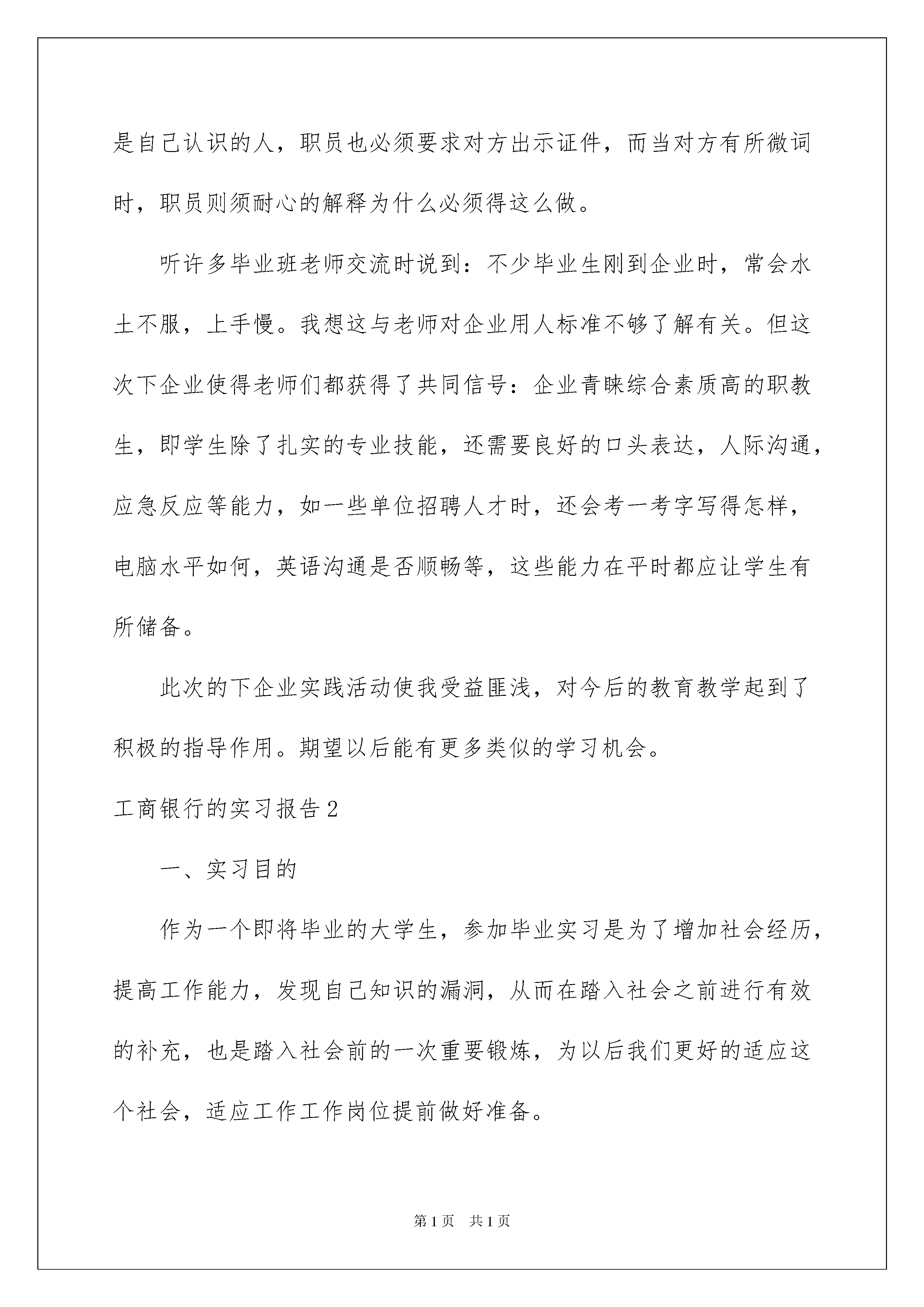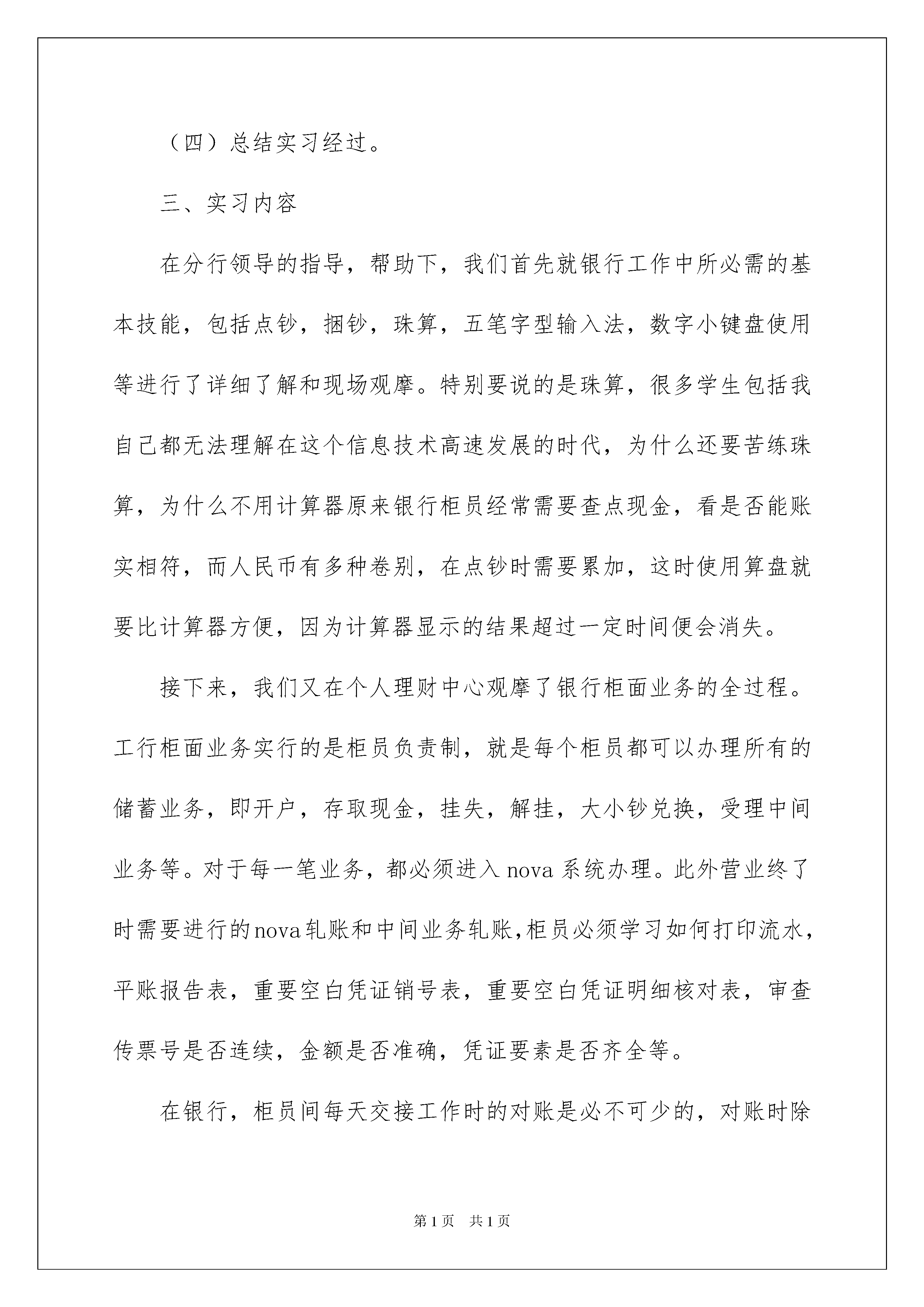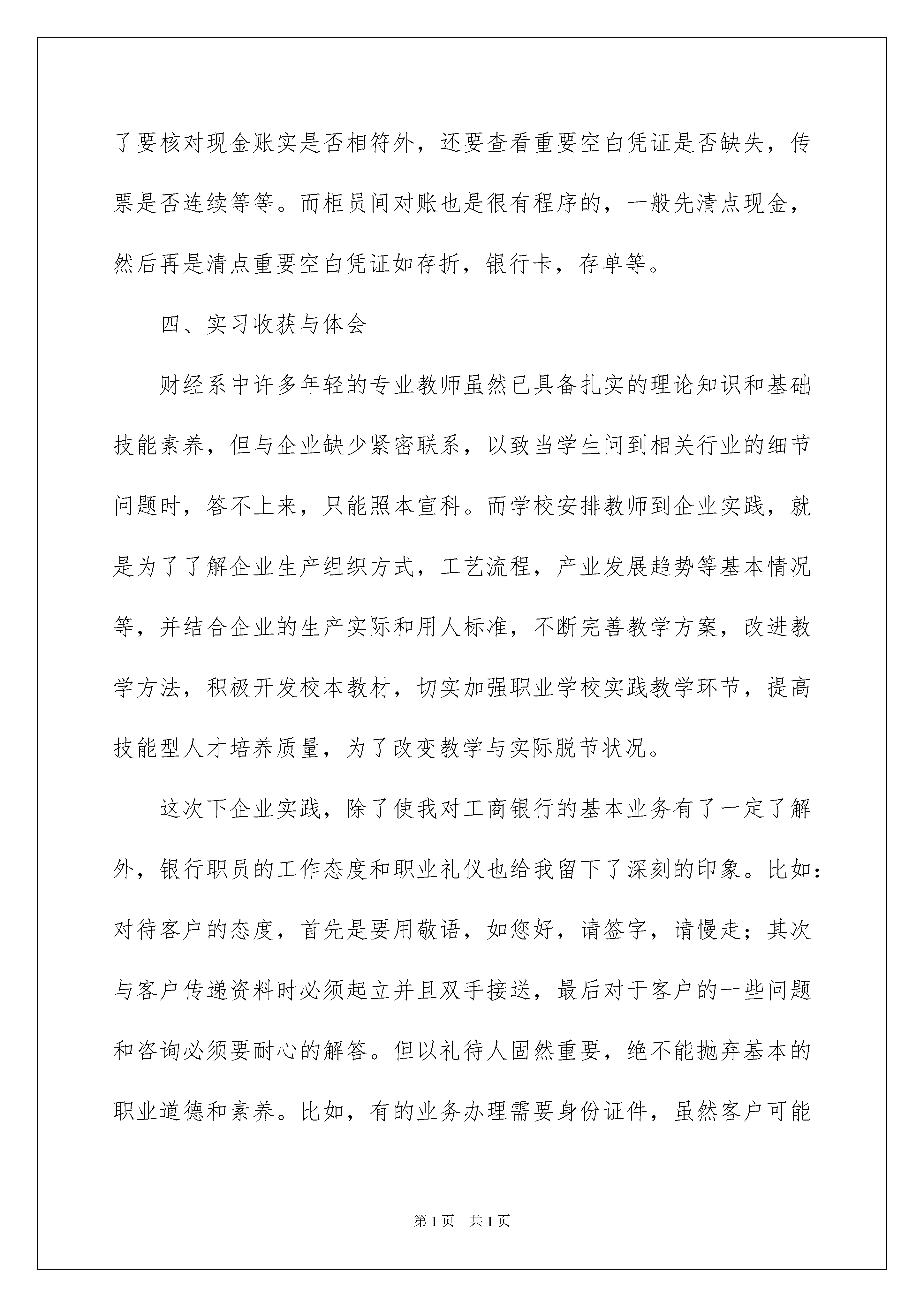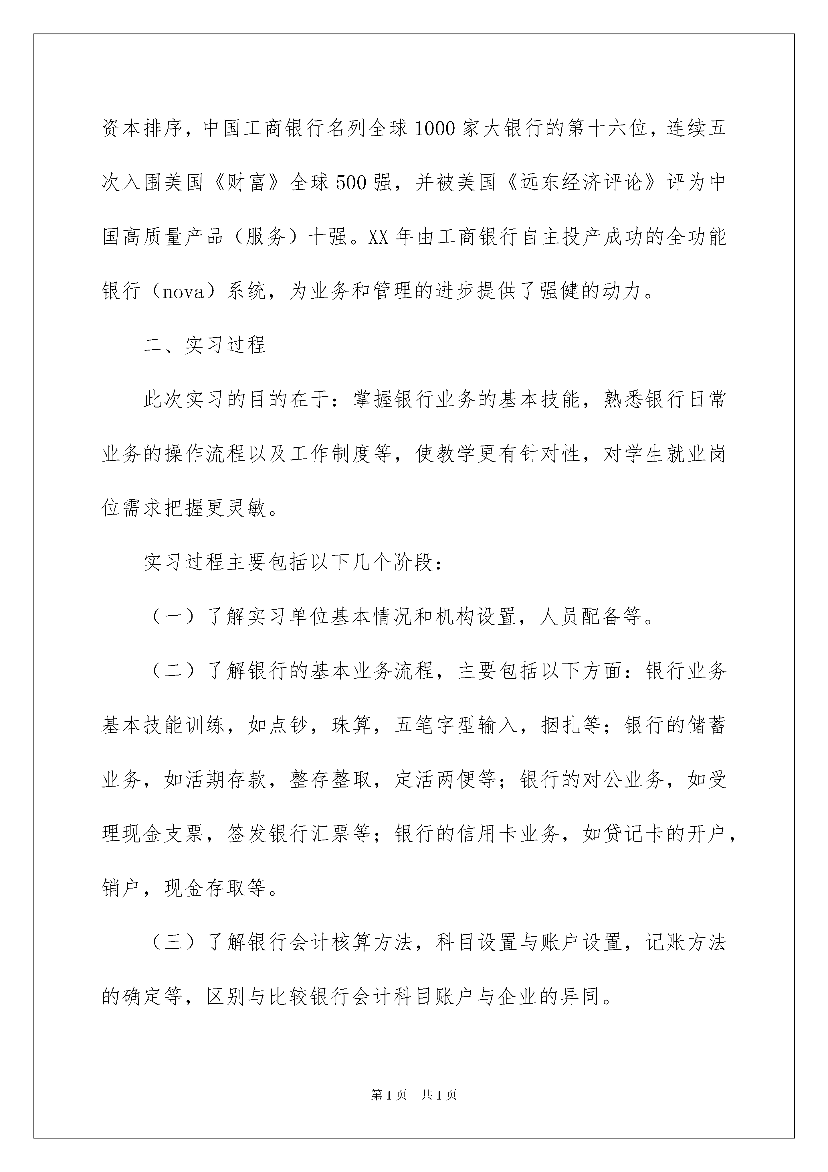 2022工商银行的实习报告工商银行的实习报告在不断进步的时代,报告的适用范围越来越广泛,我们在写报告的时候要避免篇幅过长。那么你真正懂得怎么写好报告吗?下面是我帮大家整理的工商银行的实习报告,欢迎阅读与收藏。工商银行的实习报告1为提高教师专业技能水平和实践教学能力,建设出高水平的双师型教师队伍,学校积极响应教育部号召,于20xx年暑期再次安排各系专业教师下企业实践。本人作为财经系的专业教师之一,也被分派到了校企合作单位——中国工商银行苏州分行进行了为期一个月的锻炼学习。下面我将实习的情况及体会作简单总结:一、实习单位简介中国工商银行成立于1984年。作为中国资产规模最大的商业银行,经过20几年的改革发展,中国工商银行已经步入质量效益和规模协调发展的轨道。XX年末资产总额近53000亿元人民币,占中国境内银行业金融机构资产总和的近五分之一。XX年英国《银行家》杂志按一级资本排序,中国工商银行名列全球1000家大银行的第十六位,连续五次入围美国《财富》全球500强,并被美国《远东经济评论》评为中国高质量产品(服务)十强。XX年由工商银行自主投产成功的全功能银行(nova)系统,为业务和管理的进步提供了强健的动力。二、实习过程此次实习的目的在于:掌握银行业务的基本技能,熟悉银行日常业务的操作流程以及工作制度等,使教学更有针对性,对学生就业岗位需求把握更灵敏。实习过程主要包括以下几个阶段:(一)了解实习单位基本情况和机构设置,人员配备等。(二)了解银行的基本业务流程,主要包括以下方面:银行业务基本技能训练,如点钞,珠算,五笔字型输入,捆扎等;银行的储蓄业务,如活期存款,整存整取,定活两便等;银行的对公业务,如受理现金支票,签发银行汇票等;银行的信用卡业务,如贷记卡的开户,销户,现金存取等。(三)了解银行会计核算方法,科目设置与账户设置,记账方法的确定等,区别与比较银行会计科目账户与企业的异同。(四)总结实习经过。三、实习内容在分行领导的指导,帮助下,我们首先就银行工作中所必需的基本技能,包括点钞,捆钞,珠算,五笔字型输入法,数字小键盘使用等进行了详细了解和现场观摩。特别要说的是珠算,很多学生包括我自己都无法理解在这个信息技术高速发展的时代,为什么还要苦练珠算,为什么不用计算器原来银行柜员经常需要查点现金,看是否能账实相符,而人民币有多种卷别,在点钞时需要累加,这时使用算盘就要比计算器方便,因为计算器显示的结果超过一定时间便会消失。接下来,我们又在个人理财中心观摩了银行柜面业务的全过程。工行柜面业务实行的是柜员负责制,就是每个柜员都可以办理所有的储蓄业务,即开户,存取现金,挂失,解挂,大小钞兑换,受理中间业务等。对于每一笔业务,都必须进入nova系统办理。此外营业终了时需要进行的nova轧账和中间业务轧账,柜员必须学习如何打印流水,平账报告表,重要空白凭证销号表,重要空白凭证明细核对表,审查传票号是否连续,金额是否准确,凭证要素是否齐全等。在银行,柜员间每天交接工作时的对账是必不可少的,对账时除了要核对现金账实是否相符外,还要查看重要空白凭证是否缺失,传票是否连续等等。而柜员间对账也是很有程序的,一般先清点现金,然后再是清点重要空白凭证如存折,银行卡,存单等。四、实习收获与体会财经系中许多年轻的专业教师虽然已具备扎实的理论知识和基础技能素养,但与企业缺少紧密联系,以致当学生问到相关行业的细节问题时,答不上来,只能照本宣科。而学校安排教师到企业实践,就是为了了解企业生产组织方式,工艺流程,产业发展趋势等基本情况等,并结合企业的生产实际和用人标准,不断完善教学方案,改进教学方法,积极开发校本教材,切实加强职业学校实践教学环节,提高技能型人才培养质量,为了改变教学与实际脱节状况。这次下企业实践,除了使我对工商银行的基本业务有了一定了解外,银行职员的工作态度和职业礼仪也给我留下了深刻的印象。比如:对待客户的态度,首先是要用敬语,如您好,请签字,请慢走;其次与客户传递资料时必须起立并且双手接送,最后对于客户的一些问题和咨询必须要耐心的解答。但以礼待人固然重要,绝不能抛弃基本的职业道德和素养。比如,有的业务办理需要身份证件,虽然客户可能是自己认识的人,职员也必须要求对方出示证件,而当对方有所微词时,职员则须耐心的解释为什么必须得这么做。听许多毕业班老师交流时说到:不少毕业生刚到企业时,常会水土不服,上手慢。我想这与老师对企业用人标准不够了解有关。但这次下企业使得老师们都获得了共同信号:企业青睐综合素质高的职教生,即学生除了扎实的专业技能,还需要良好的口头表达,人际沟通,应急反应等能力,如一些单