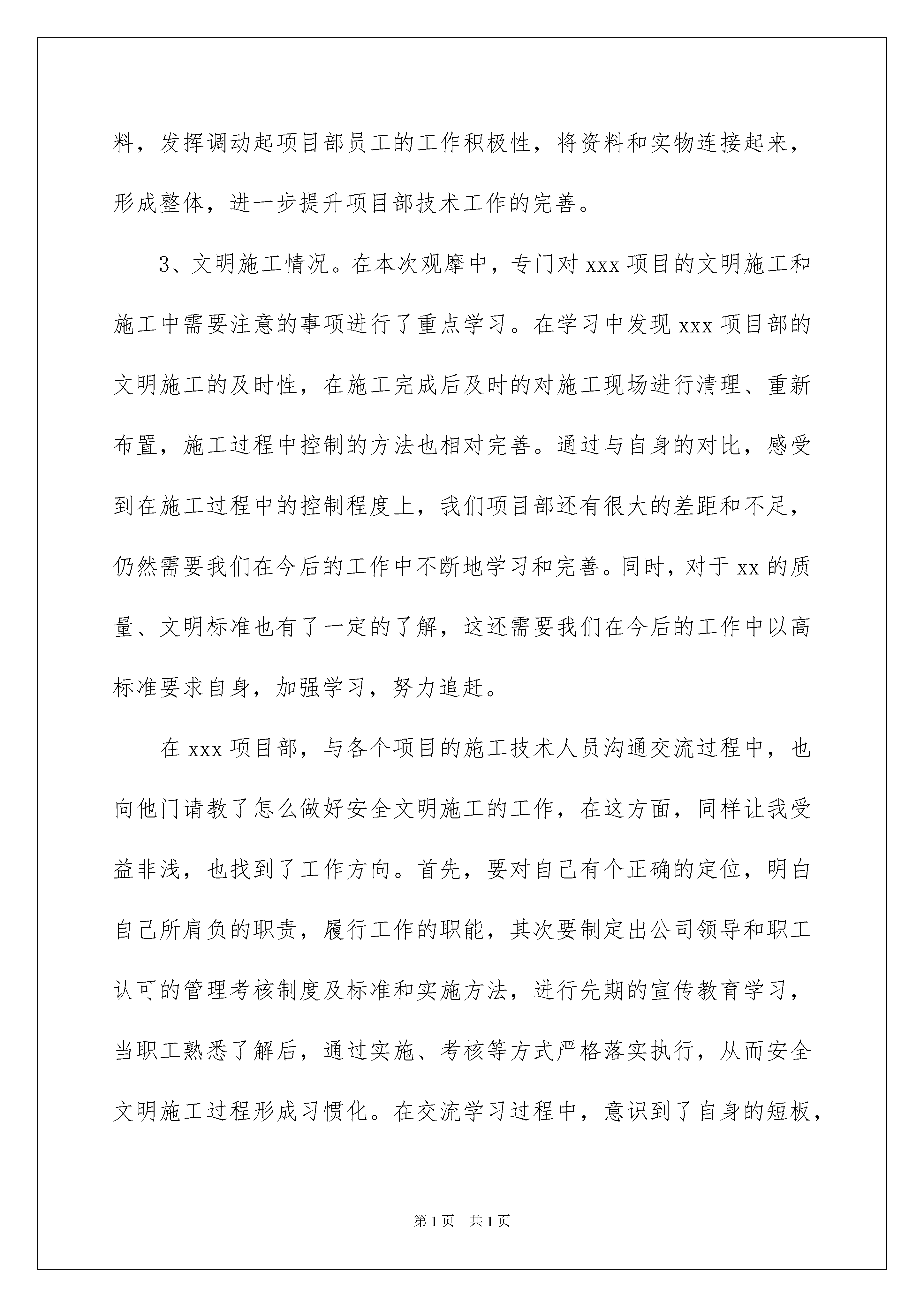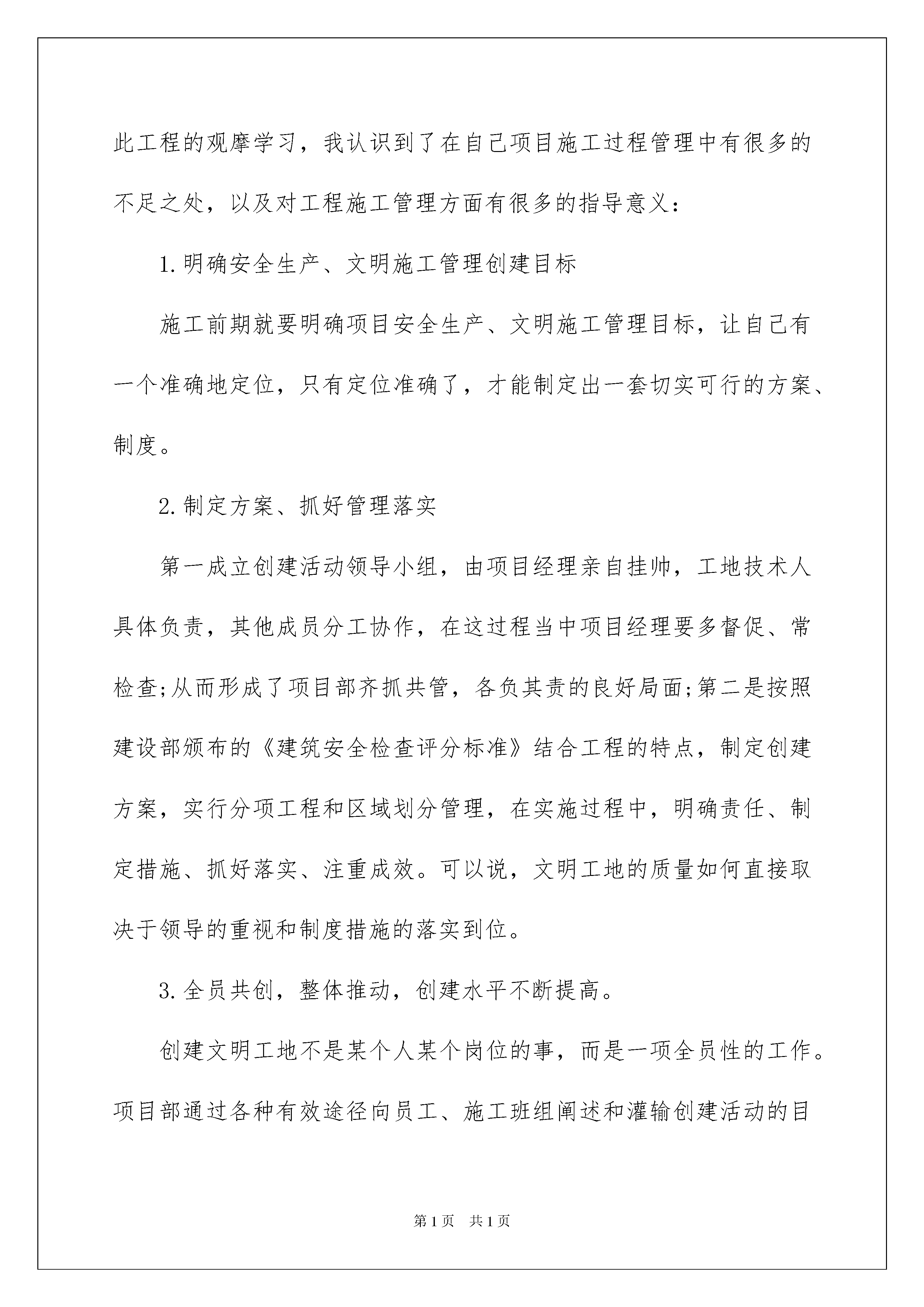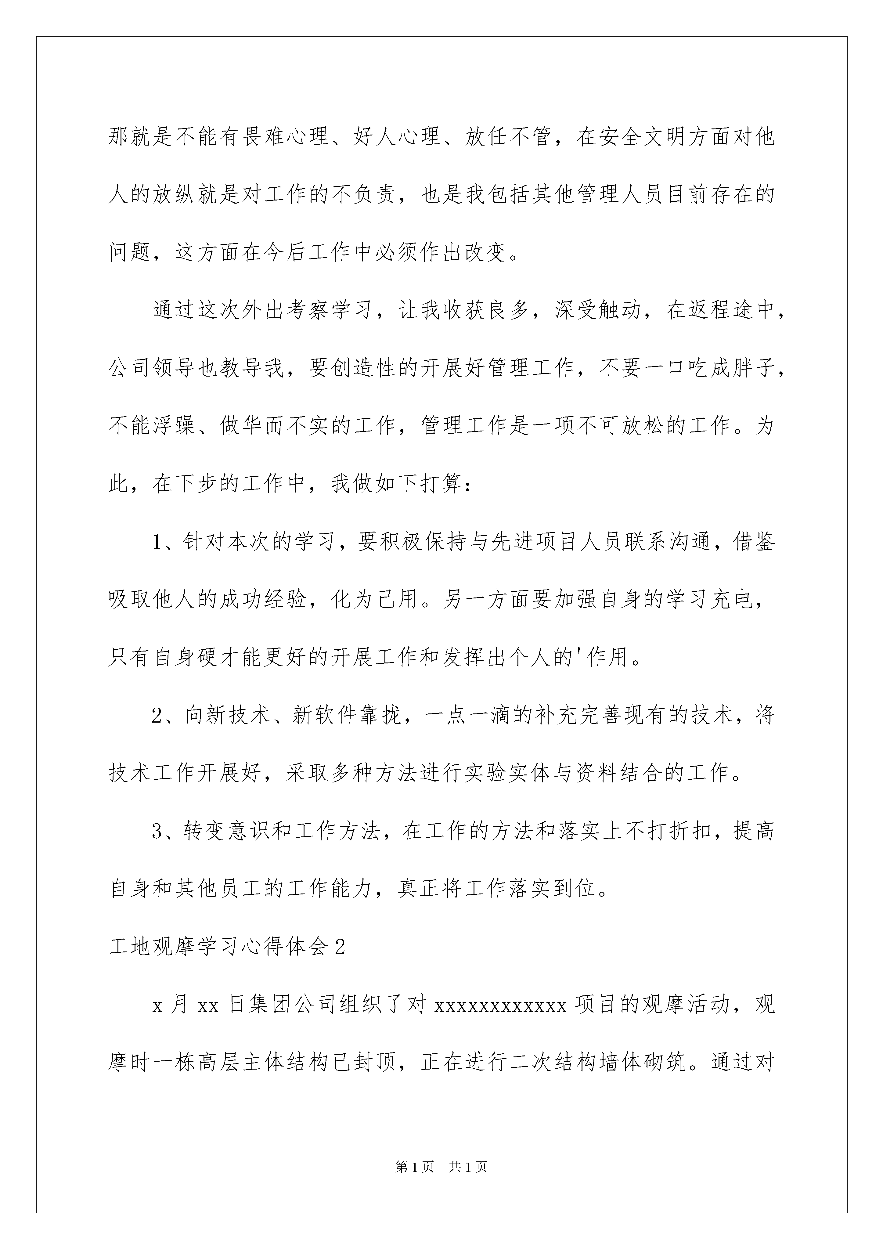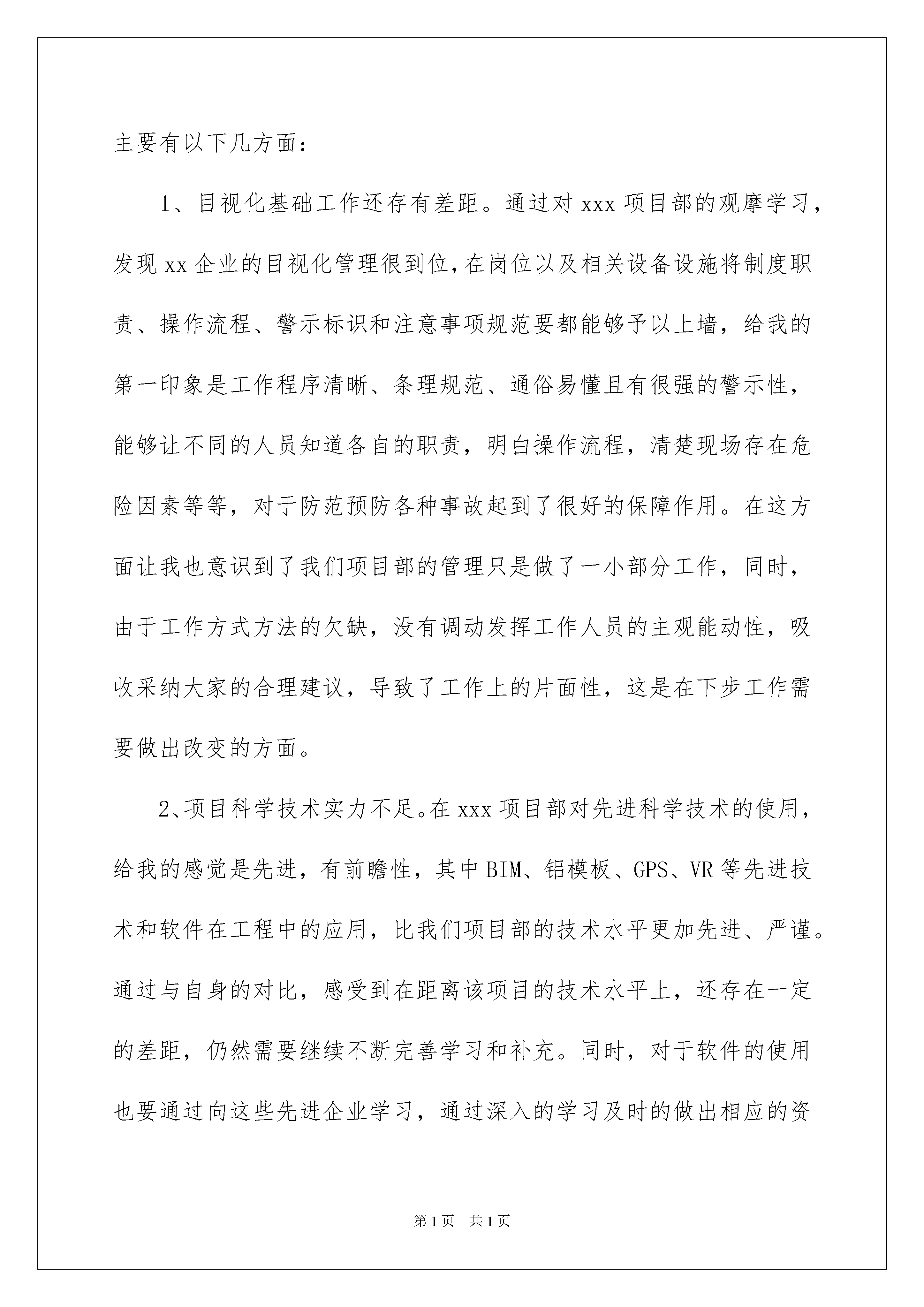 2022工地观摩学习心得体会工地观摩学习心得体会我们在一些事情上受到启发后,心得体会是很好的记录方式,通过写心得体会,可使我们今后少走弯路。那么要如何写呢?下面是我为大家整理的工地观摩学习心得体会,欢迎阅读与收藏。工地观摩学习心得体会1为进一步提高我公司项目部整体管理水平,20xx年x月xx日,由集团公司安全部带队到中国xx第x工程局有限公司承建的xxxxxxxxxxxxxx项目部进行实地观摩和交流学习。经过短暂而又充实的观摩学习,我的感受颇多,认为此次观摩学习目的在于观摩先进、寻找差距、弥补不足、夯实基础、突破自己。在观摩学习过程中,通过听取介绍、现场参观等形式,让我在身心和视野上都受到了新的洗礼,使我在观摩学习中进一步认识自己,认识自己与别人的差距,更认识了项目管理的重要性和必要性,同进也感受到了更大的压力和使命。在这次考察学习中,通过与xxx项目的管理人员沟通以及实地的现场查看,结合自身日常工作开展的情况,自身感受到的差距和心得主要有以下几方面:1、目视化基础工作还存有差距。通过对xxx项目部的观摩学习,发现xx企业的目视化管理很到位,在岗位以及相关设备设施将制度职责、操作流程、警示标识和注意事项规范要都能够予以上墙,给我的第一印象是工作程序清晰、条理规范、通俗易懂且有很强的警示性,能够让不同的人员知道各自的职责,明白操作流程,清楚现场存在危险因素等等,对于防范预防各种事故起到了很好的保障作用。在这方面让我也意识到了我们项目部的管理只是做了一小部分工作,同时,由于工作方式方法的欠缺,没有调动发挥工作人员的主观能动性,吸收采纳大家的合理建议,导致了工作上的片面性,这是在下步工作需要做出改变的方面。2、项目科学技术实力不足。在xxx项目部对先进科学技术的使用,给我的感觉是先进,有前瞻性,其中BIM、铝模板、GPS、VR等先进技术和软件在工程中的应用,比我们项目部的技术水平更加先进、严谨。通过与自身的对比,感受到在距离该项目的技术水平上,还存在一定的差距,仍然需要继续不断完善学习和补充。同时,对于软件的使用也要通过向这些先进企业学习,通过深入的学习及时的做出相应的资料,发挥调动起项目部员工的工作积极性,将资料和实物连接起来,形成整体,进一步提升项目部技术工作的完善。3、文明施工情况。在本次观摩中,专门对xxx项目的文明施工和施工中需要注意的事项进行了重点学习。在学习中发现xxx项目部的文明施工的及时性,在施工完成后及时的对施工现场进行清理、重新布置,施工过程中控制的方法也相对完善。通过与自身的对比,感受到在施工过程中的控制程度上,我们项目部还有很大的差距和不足,仍然需要我们在今后的工作中不断地学习和完善。同时,对于xx的质量、文明标准也有了一定的了解,这还需要我们在今后的工作中以高标准要求自身,加强学习,努力追赶。在xxx项目部,与各个项目的施工技术人员沟通交流过程中,也向他门请教了怎么做好安全文明施工的工作,在这方面,同样让我受益非浅,也找到了工作方向。首先,要对自己有个正确的定位,明白自己所肩负的职责,履行工作的职能,其次要制定出公司领导和职工认可的管理考核制度及标准和实施方法,进行先期的宣传教育学习,当职工熟悉了解后,通过实施、考核等方式严格落实执行,从而安全文明施工过程形成习惯化。在交流学习过程中,意识到了自身的短板,那就是不能有畏难心理、好人心理、放任不管,在安全文明方面对他人的放纵就是对工作的不负责,也是我包括其他管理人员目前存在的问题,这方面在今后工作中必须作出改变。通过这次外出考察学习,让我收获良多,深受触动,在返程途中,公司领导也教导我,要创造性的开展好管理工作,不要一口吃成胖子,不能浮躁、做华而不实的工作,管理工作是一项不可放松的工作。为此,在下步的工作中,我做如下打算:1、针对本次的学习,要积极保持与先进项目人员联系沟通,借鉴吸取他人的成功经验,化为己用。另一方面要加强自身的学习充电,只有自身硬才能更好的开展工作和发挥出个人的'作用。2、向新技术、新软件靠拢,一点一滴的补充完善现有的技术,将技术工作开展好,采取多种方法进行实验实体与资料结合的工作。3、转变意识和工作方法,在工作的方法和落实上不打折扣,提高自身和其他员工的工作能力,真正将工作落实到位。工地观摩学习心得体会2x月xx日集团公司组织了对xxxxxxxxxxxx项目的观摩活动,观摩时一栋高层主体结构已封顶,正在进行二次结构墙体砌筑。通过对此工程的观摩学习,我认识到了在自己项目施工过程管理中有很多的不足之处,以及对工程施工管理方面有很多的指导意义:1.明确安全生产、文明施工管理创建目标施工前期