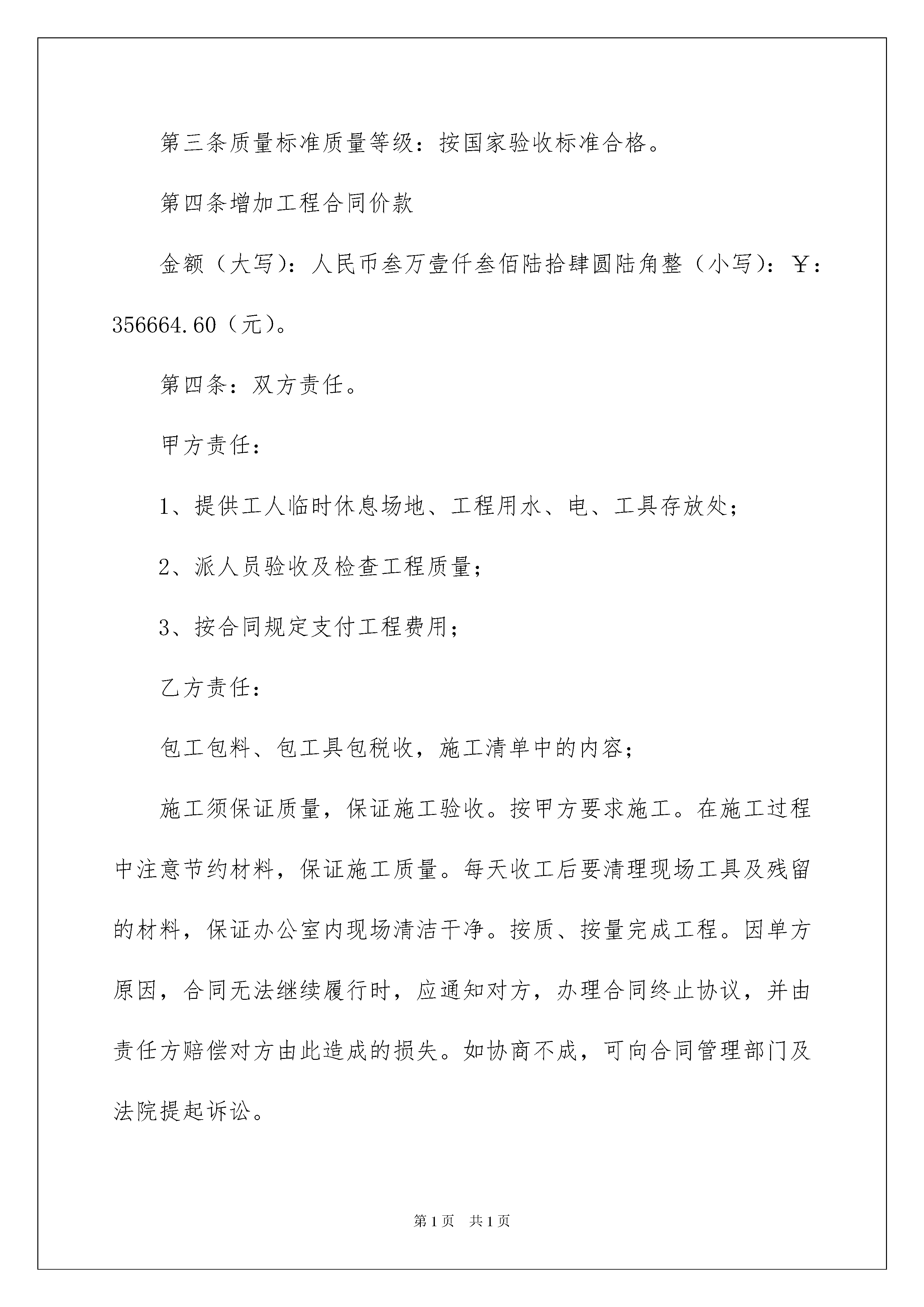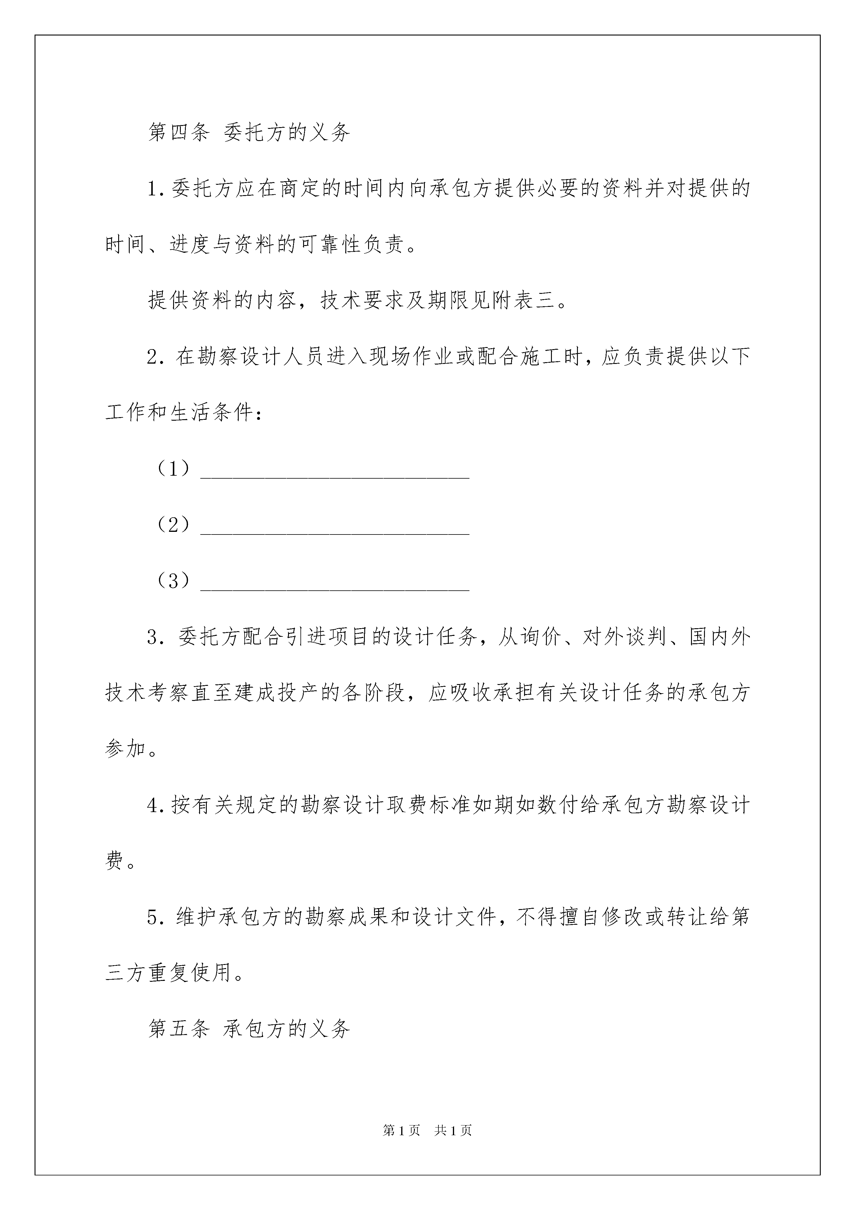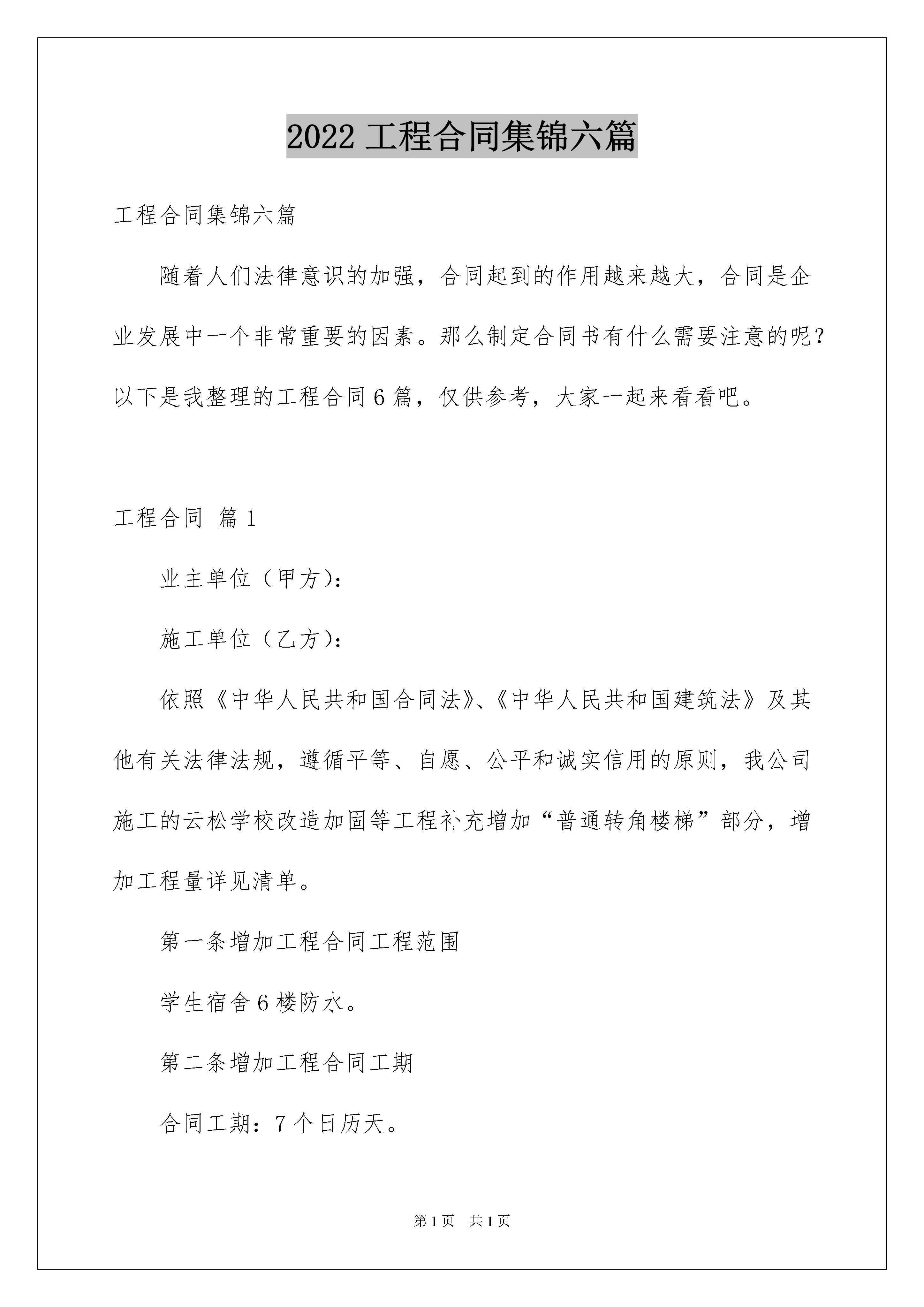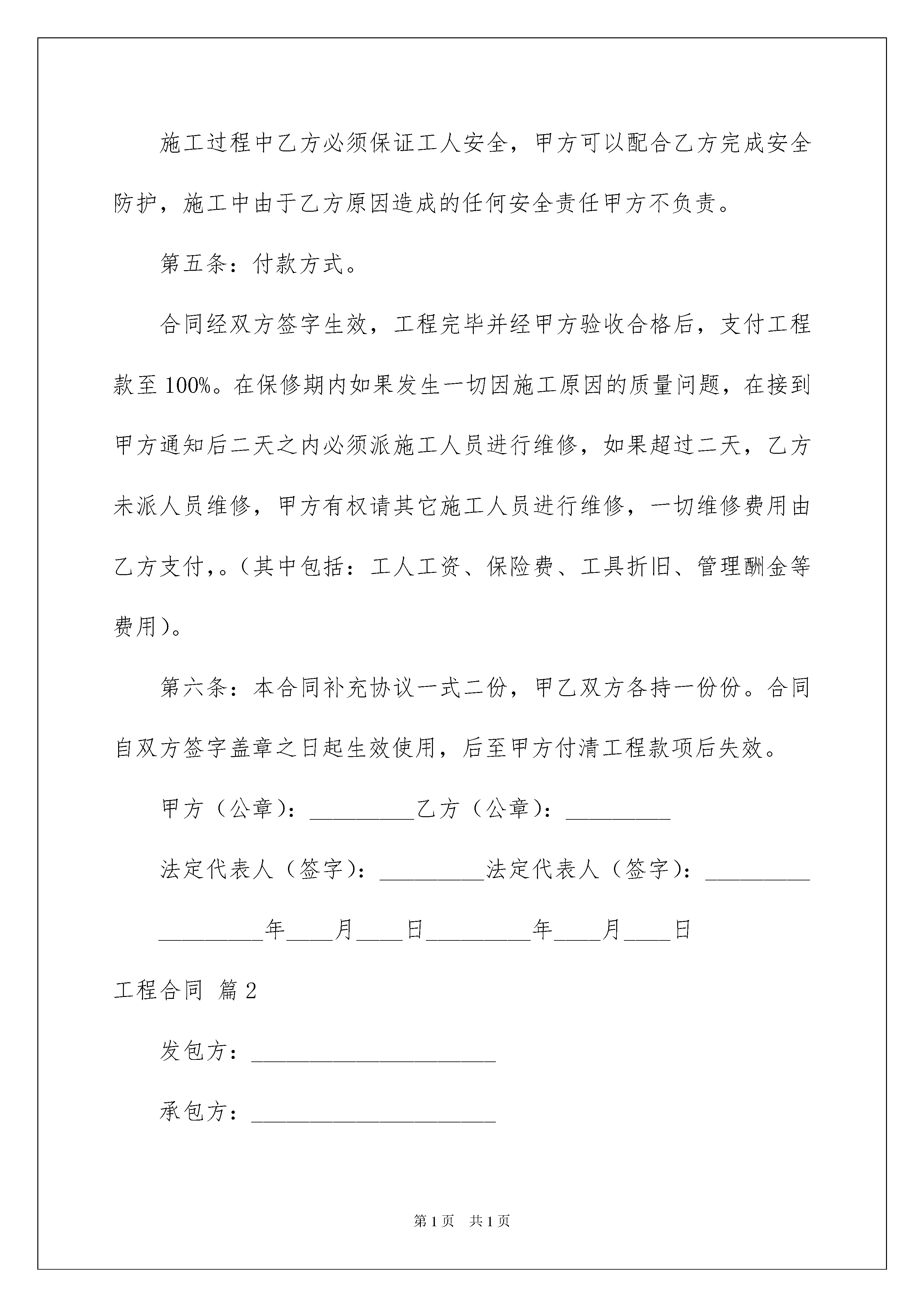 2022工程合同集锦六篇工程合同集锦六篇随着人们法律意识的加强,合同起到的作用越来越大,合同是企业发展中一个非常重要的因素。那么制定合同书有什么需要注意的呢?以下是我整理的工程合同6篇,仅供参考,大家一起来看看吧。工程合同篇1业主单位(甲方):施工单位(乙方):依照《中华人民共和国合同法》、《中华人民共和国建筑法》及其他有关法律法规,遵循平等、自愿、公平和诚实信用的原则,我公司施工的云松学校改造加固等工程补充增加“普通转角楼梯”部分,增加工程量详见清单。第一条增加工程合同工程范围学生宿舍6楼防水。第二条增加工程合同工期合同工期:7个日历天。第三条质量标准质量等级:按国家验收标准合格。第四条增加工程合同价款金额(大写):人民币叁万壹仟叁佰陆拾肆圆陆角整(小写):¥:356664.60(元)。第四条:双方责任。甲方责任:1、提供工人临时休息场地、工程用水、电、工具存放处;2、派人员验收及检查工程质量;3、按合同规定支付工程费用;乙方责任:包工包料、包工具包税收,施工清单中的内容;施工须保证质量,保证施工验收。按甲方要求施工。在施工过程中注意节约材料,保证施工质量。每天收工后要清理现场工具及残留的材料,保证办公室内现场清洁干净。按质、按量完成工程。因单方原因,合同无法继续履行时,应通知对方,办理合同终止协议,并由责任方赔偿对方由此造成的损失。如协商不成,可向合同管理部门及法院提起诉讼。施工过程中乙方必须保证工人安全,甲方可以配合乙方完成安全防护,施工中由于乙方原因造成的任何安全责任甲方不负责。第五条:付款方式。合同经双方签字生效,工程完毕并经甲方验收合格后,支付工程款至100%。在保修期内如果发生一切因施工原因的质量问题,在接到甲方通知后二天之内必须派施工人员进行维修,如果超过二天,乙方未派人员维修,甲方有权请其它施工人员进行维修,一切维修费用由乙方支付,。(其中包括:工人工资、保险费、工具折旧、管理酬金等费用)。第六条:本合同补充协议一式二份,甲乙双方各持一份份。合同自双方签字盖章之日起生效使用,后至甲方付清工程款项后失效。甲方(公章):_________乙方(公章):_________法定代表人(签字):_________法定代表人(签字):__________________年____月____日_________年____月____日工程合同篇2发包方:_____________________承包方:_____________________根据《中华人民共和国经济合同法》和《建设工程勘察设计合同条例》的有关规定,经双方协商一致,签订本合同,以资共同遵守第一条工程名称____________________________________;工程地点____________________________________;工程规模____________________________________;工程投资____________________________________。第二条委托方根据本合规定填写建设工程勘察设计委托书(见附表一、二)第三条勘察设计费取费的依据和取费标准,按国家规定执行。勘察设计费的拨付办法,自合同生效后______天内,委托方应向承包方给付定金。合同履行后,定金抵作勘察设计费,不足部分委托方应在______天内一次结清(或订为分若干次结清)。勘察任务的定金为勘察费的30%,设计任务的定金为估算设计费的20%。本工程的勘察费为______元估算设计费为______元。委托方不履行合同的,无权要求返还定金;承包方不履行合同的,应双倍返还定金。第四条委托方的义务1.委托方应在商定的时间内向承包方提供必要的资料并对提供的时间、进度与资料的可靠性负责。提供资料的内容,技术要求及期限见附表三。2.在勘察设计人员进入现场作业或配合施工时,应负责提供以下工作和生活条件:(1)_________________________(2)_________________________(3)_________________________3.委托方配合引进项目的设计任务,从询价、对外谈判、国内外技术考察直至建成投产的各阶段,应吸收承担有关设计任务的承包方参加。4.按有关规定的勘察设计取费标准如期如数付给承包方勘察设计费。5.维护承包方的勘察成果和设计文件,不得擅自修改或转让给第三方重复使用。第五条承包方的义务1.承包方应在______年______月______日前提交有关勘察成果和设计文件,并承担责任。提交勘察成果的范围、进度和质量,以及设计的阶段、进度、