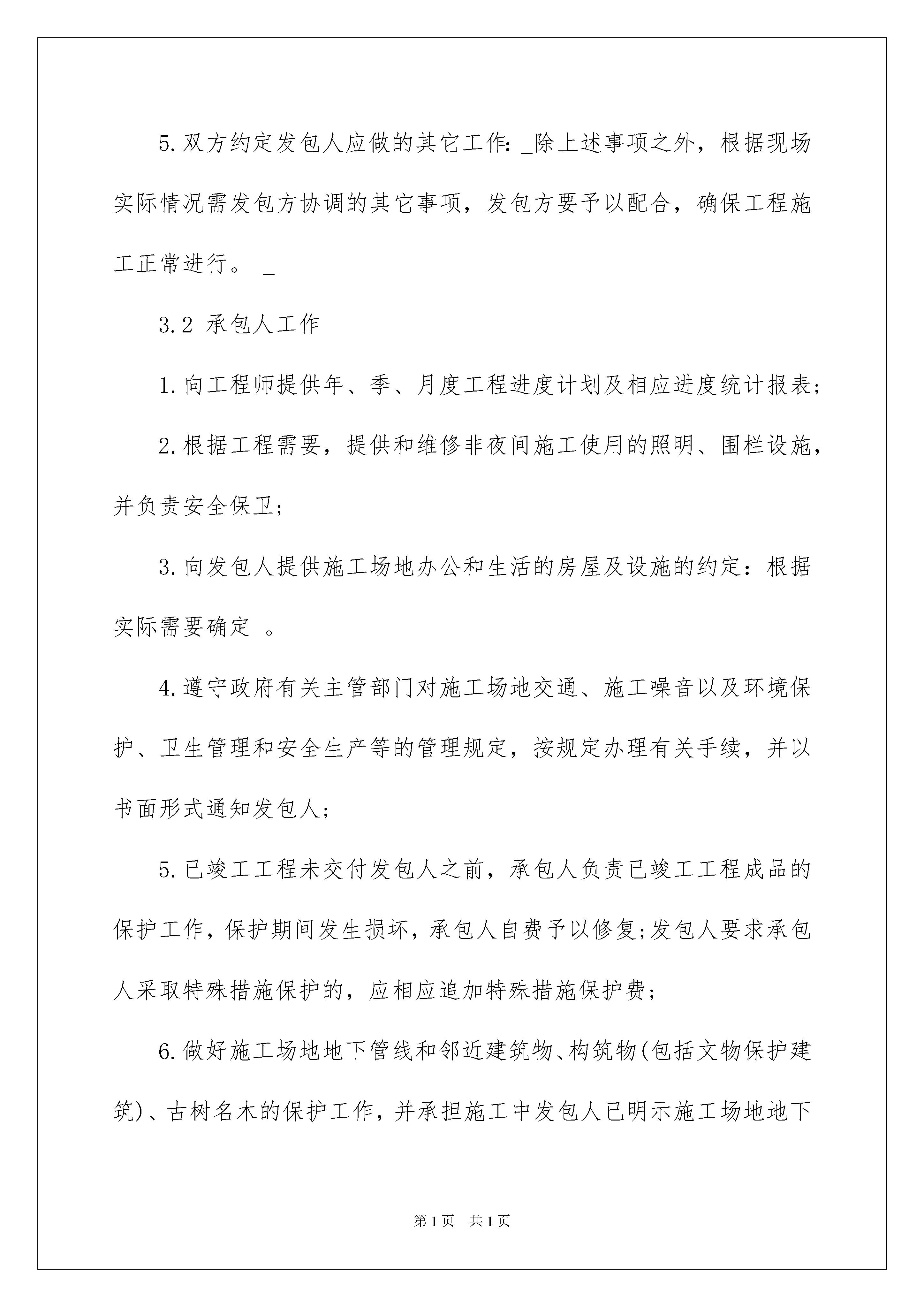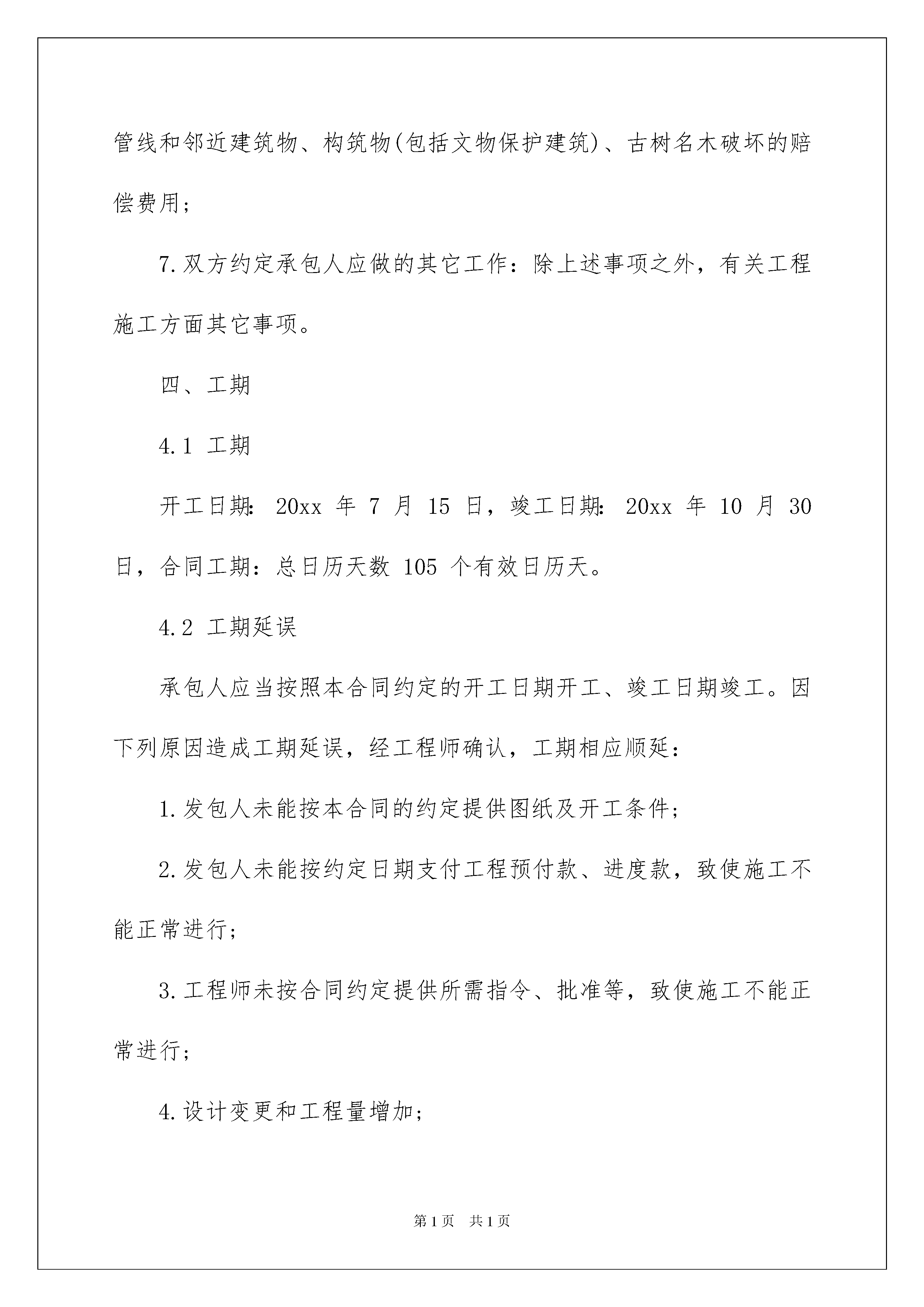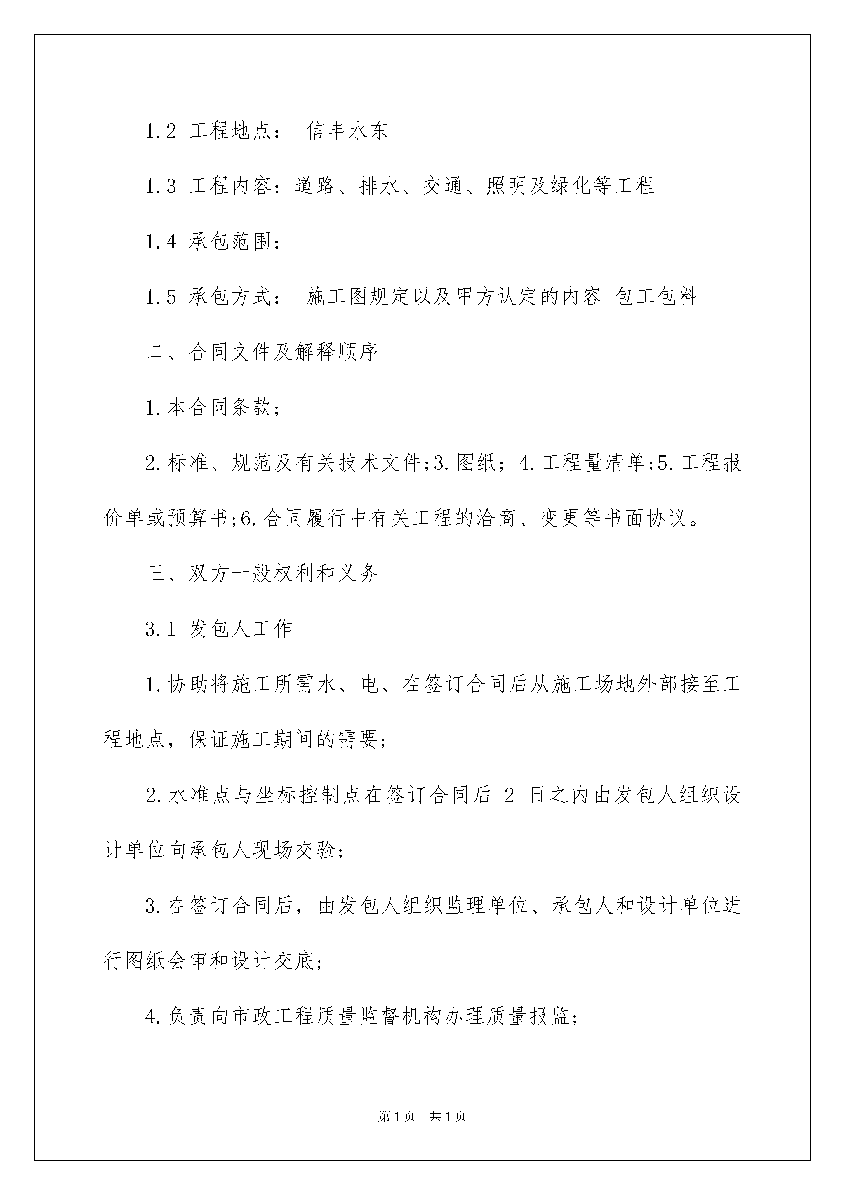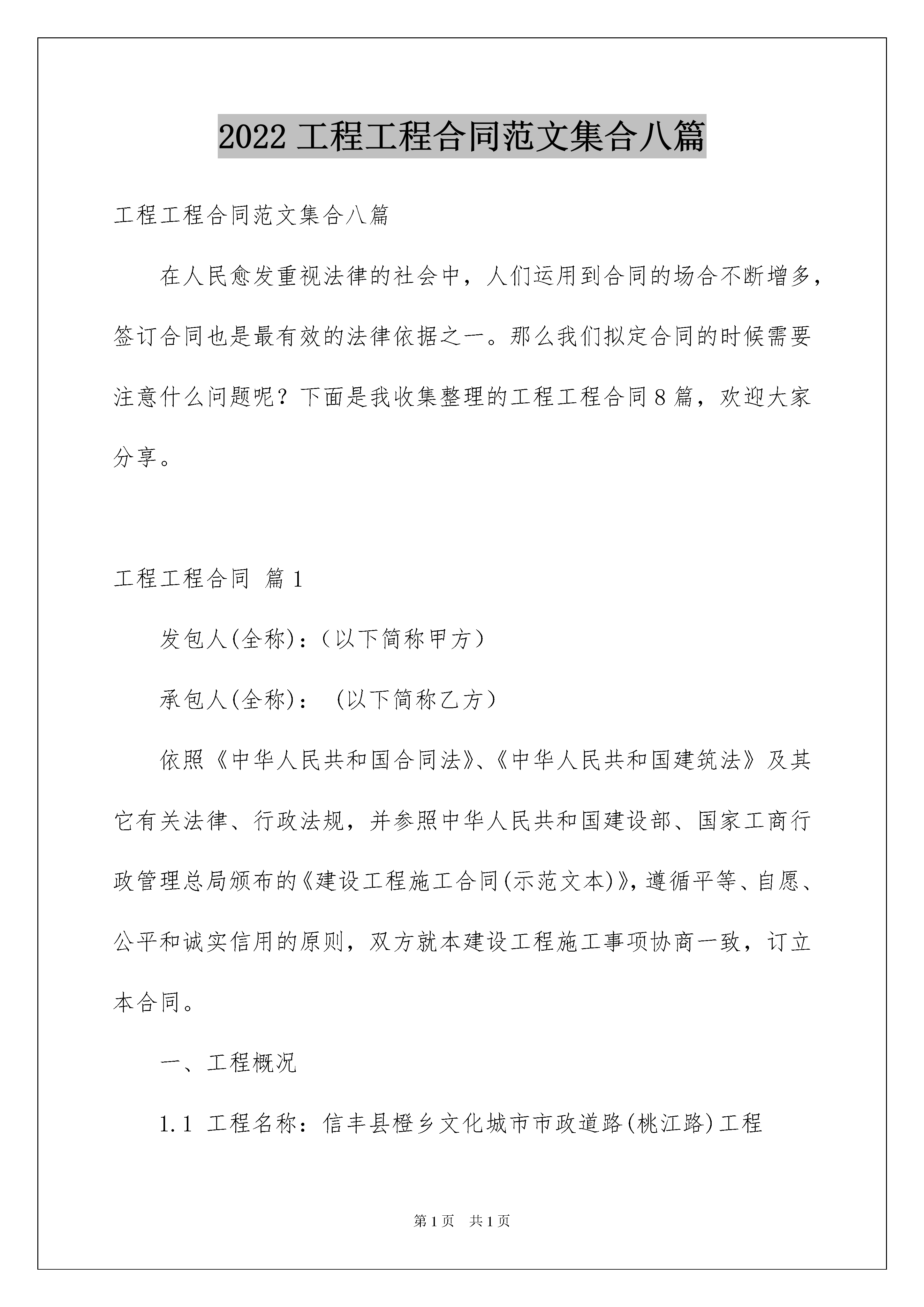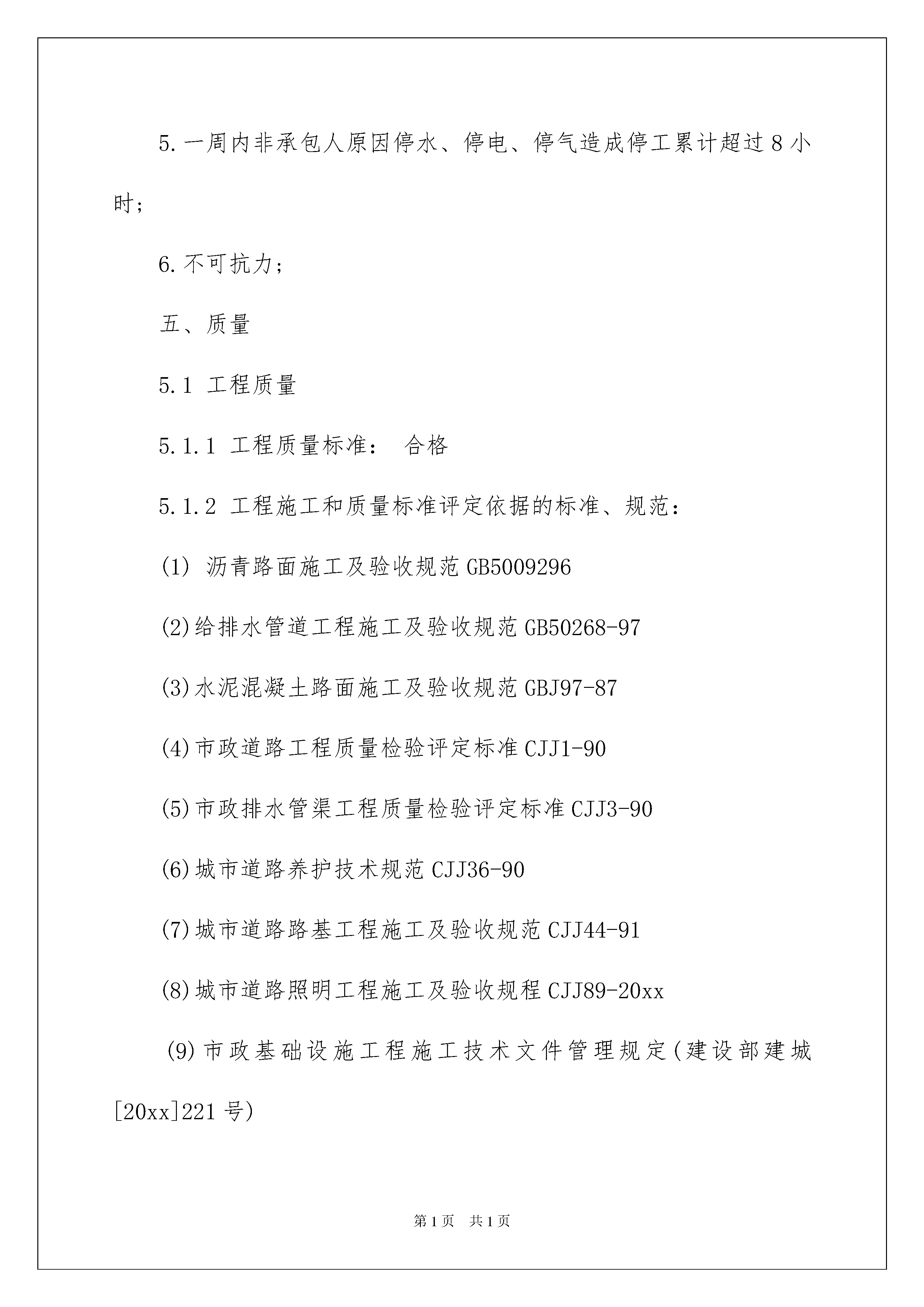 2022工程工程合同范文集合八篇工程工程合同范文集合八篇在人民愈发重视法律的社会中,人们运用到合同的场合不断增多,签订合同也是最有效的法律依据之一。那么我们拟定合同的时候需要注意什么问题呢?下面是我收集整理的工程工程合同8篇,欢迎大家分享。工程工程合同篇1发包人(全称):(以下简称甲方)承包人(全称):(以下简称乙方)依照《中华人民共和国合同法》、《中华人民共和国建筑法》及其它有关法律、行政法规,并参照中华人民共和国建设部、国家工商行政管理总局颁布的《建设工程施工合同(示范文本)》,遵循平等、自愿、公平和诚实信用的原则,双方就本建设工程施工事项协商一致,订立本合同。一、工程概况1.1工程名称:信丰县橙乡文化城市市政道路(桃江路)工程1.2工程地点:信丰水东1.3工程内容:道路、排水、交通、照明及绿化等工程1.4承包范围:1.5承包方式:施工图规定以及甲方认定的内容包工包料二、合同文件及解释顺序1.本合同条款;2.标准、规范及有关技术文件;3.图纸;4.工程量清单;5.工程报价单或预算书;6.合同履行中有关工程的洽商、变更等书面协议。三、双方一般权利和义务3.1发包人工作1.协助将施工所需水、电、在签订合同后从施工场地外部接至工程地点,保证施工期间的需要;2.水准点与坐标控制点在签订合同后2日之内由发包人组织设计单位向承包人现场交验;3.在签订合同后,由发包人组织监理单位、承包人和设计单位进行图纸会审和设计交底;4.负责向市政工程质量监督机构办理质量报监;5.双方约定发包人应做的其它工作:_除上述事项之外,根据现场实际情况需发包方协调的其它事项,发包方要予以配合,确保工程施工正常进行。_3.2承包人工作1.向工程师提供年、季、月度工程进度计划及相应进度统计报表;2.根据工程需要,提供和维修非夜间施工使用的照明、围栏设施,并负责安全保卫;3.向发包人提供施工场地办公和生活的房屋及设施的约定:根据实际需要确定。4.遵守政府有关主管部门对施工场地交通、施工噪音以及环境保护、卫生管理和安全生产等的管理规定,按规定办理有关手续,并以书面形式通知发包人;5.已竣工工程未交付发包人之前,承包人负责已竣工工程成品的保护工作,保护期间发生损坏,承包人自费予以修复;发包人要求承包人采取特殊措施保护的,应相应追加特殊措施保护费;6.做好施工场地地下管线和邻近建筑物、构筑物(包括文物保护建筑)、古树名木的保护工作,并承担施工中发包人已明示施工场地地下管线和邻近建筑物、构筑物(包括文物保护建筑)、古树名木破坏的赔偿费用;7.双方约定承包人应做的其它工作:除上述事项之外,有关工程施工方面其它事项。四、工期4.1工期开工日期:20xx年7月15日,竣工日期:20xx年10月30日,合同工期:总日历天数105个有效日历天。4.2工期延误承包人应当按照本合同约定的开工日期开工、竣工日期竣工。因下列原因造成工期延误,经工程师确认,工期相应顺延:1.发包人未能按本合同的约定提供图纸及开工条件;2.发包人未能按约定日期支付工程预付款、进度款,致使施工不能正常进行;3.工程师未按合同约定提供所需指令、批准等,致使施工不能正常进行;4.设计变更和工程量增加;5.一周内非承包人原因停水、停电、停气造成停工累计超过8小时;6.不可抗力;五、质量5.1工程质量5.1.1工程质量标准:合格5.1.2工程施工和质量标准评定依据的标准、规范:(1)沥青路面施工及验收规范GB5009296(2)给排水管道工程施工及验收规范GB50268-97(3)水泥混凝土路面施工及验收规范GBJ97-87(4)市政道路工程质量检验评定标准CJJ1-90(5)市政排水管渠工程质量检验评定标准CJJ3-90(6)城市道路养护技术规范CJJ36-90(7)城市道路路基工程施工及验收规范CJJ44-91(8)城市道路照明工程施工及验收规程CJJ89-20xx(9)市政基础设施工程施工技术文件管理规定(建设部建城[20xx]221号)5.2隐蔽工程和中间验收工程每一道工序在承包人自检的基础上,需经工程师验收合格方可进行下一道工序。5.3工程试车工程试车要求及费用的承担:___________承包方5.4竣工验收工程具备竣工验收条件,承包人按国家工程竣工验收有关规定,7天内向发包人提供一套完整竣工资料及竣工验收报告、一套竣工图。5.5质量保修具体保修项目内容、范围、保修期、保修责任、质量保修金的支付在附件《工程质量保修书》中约定,质量保修书作为本合同的附件。六、合同价款确定与支付6.1合同价款及调整6.1.1本工程合同价款:暂定壹仟贰佰万元(小写:1200