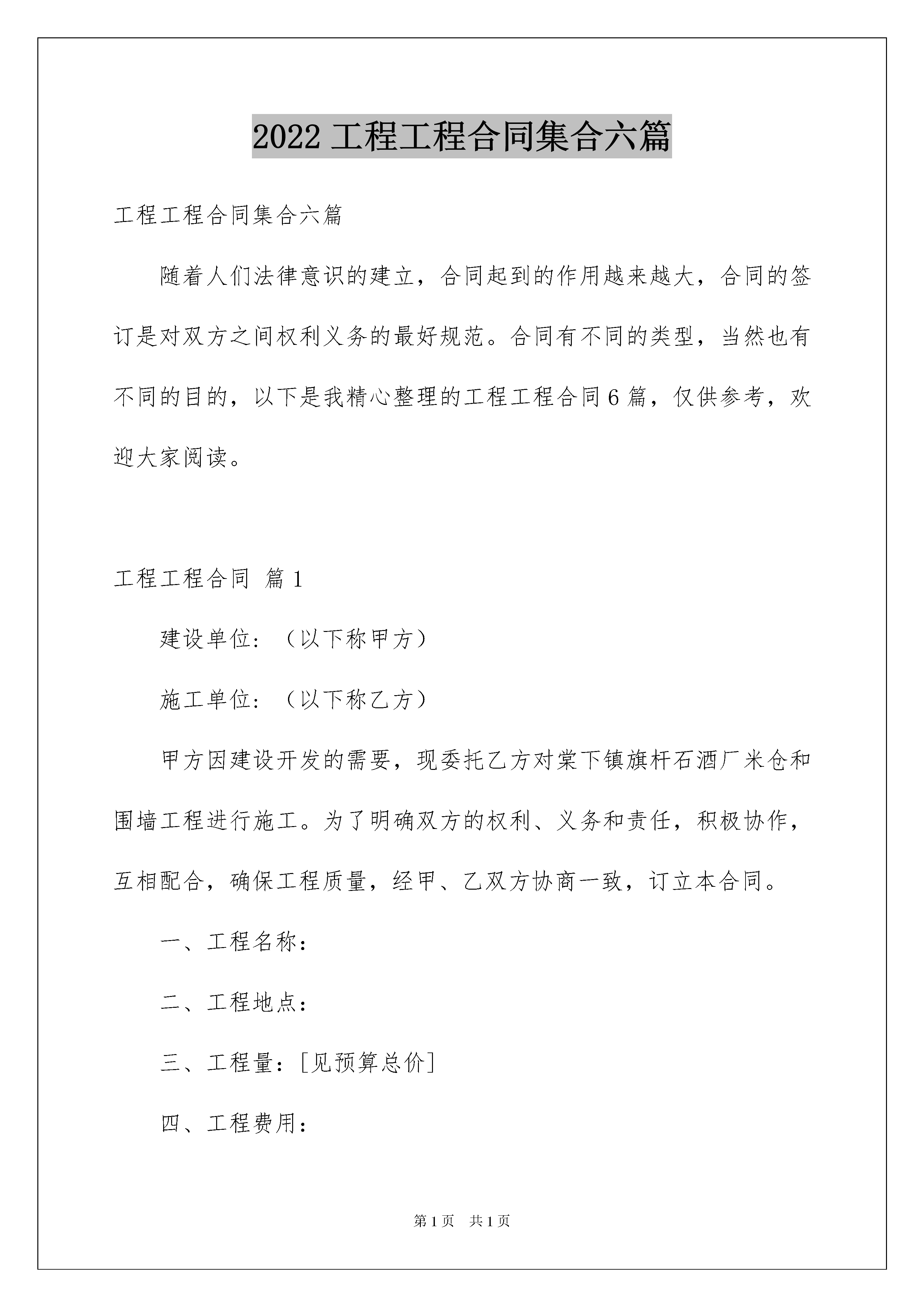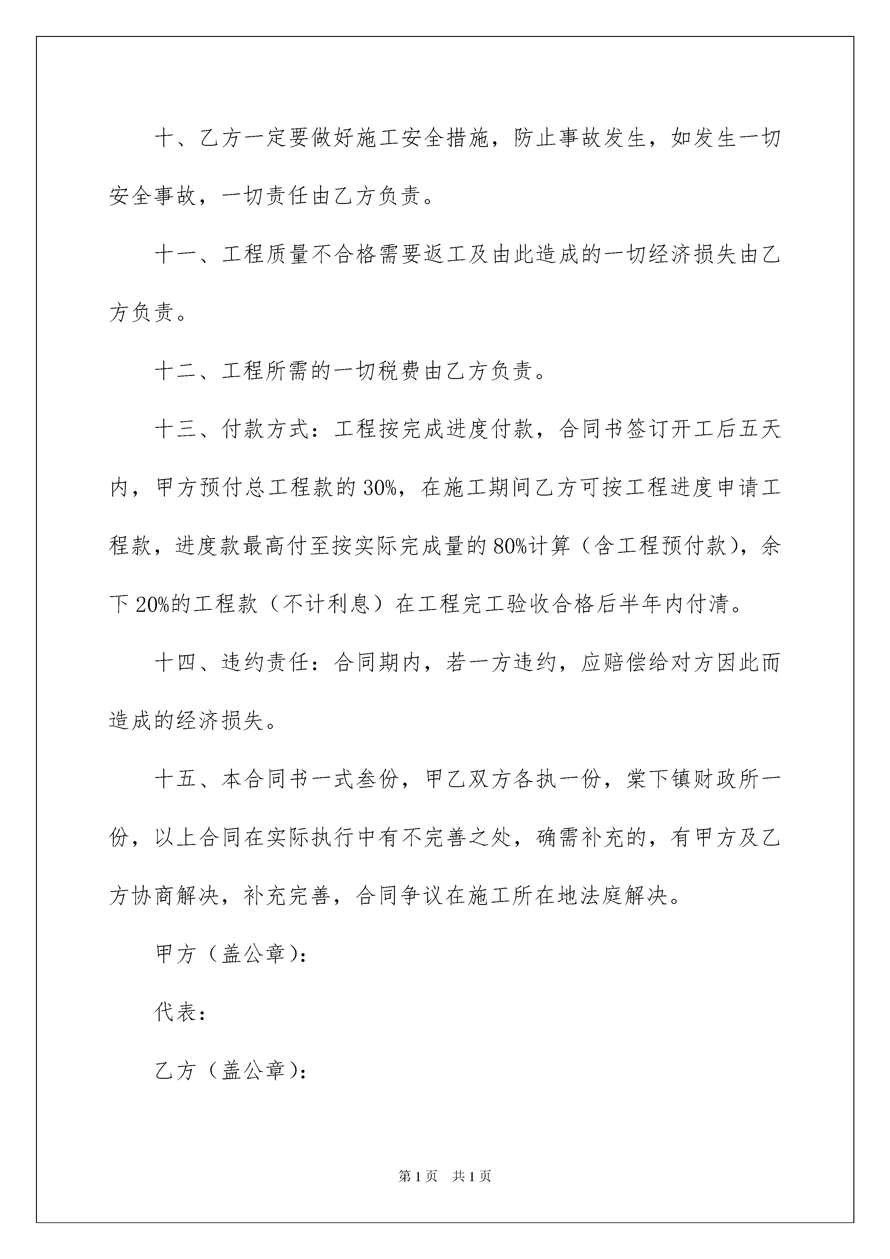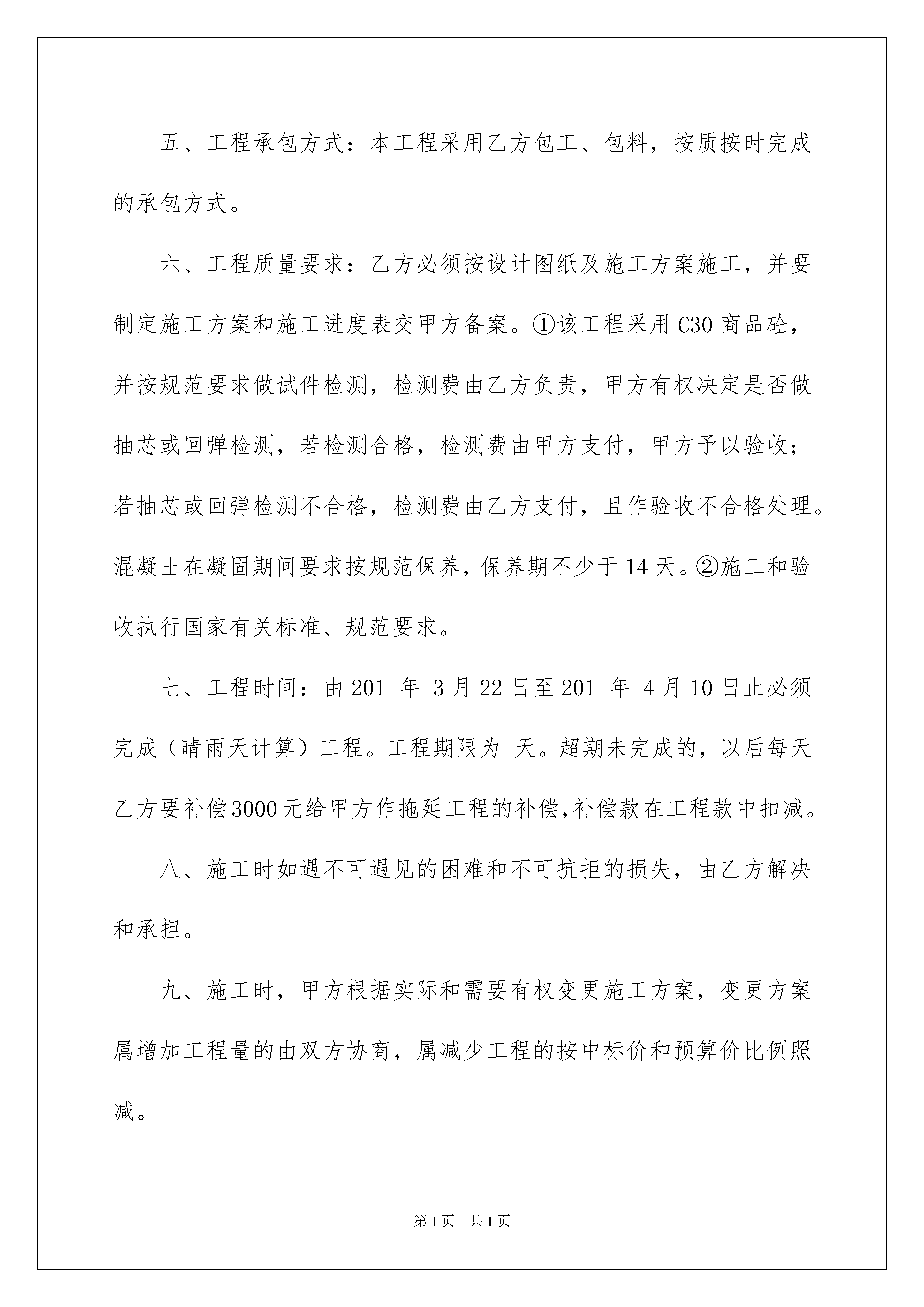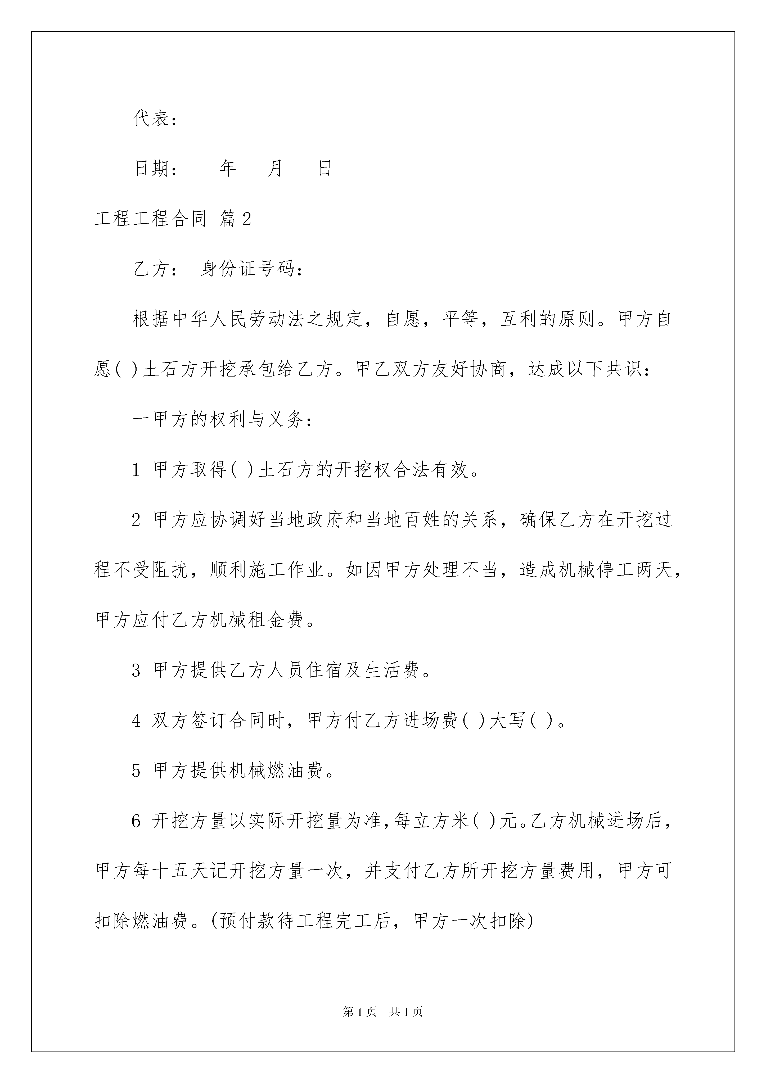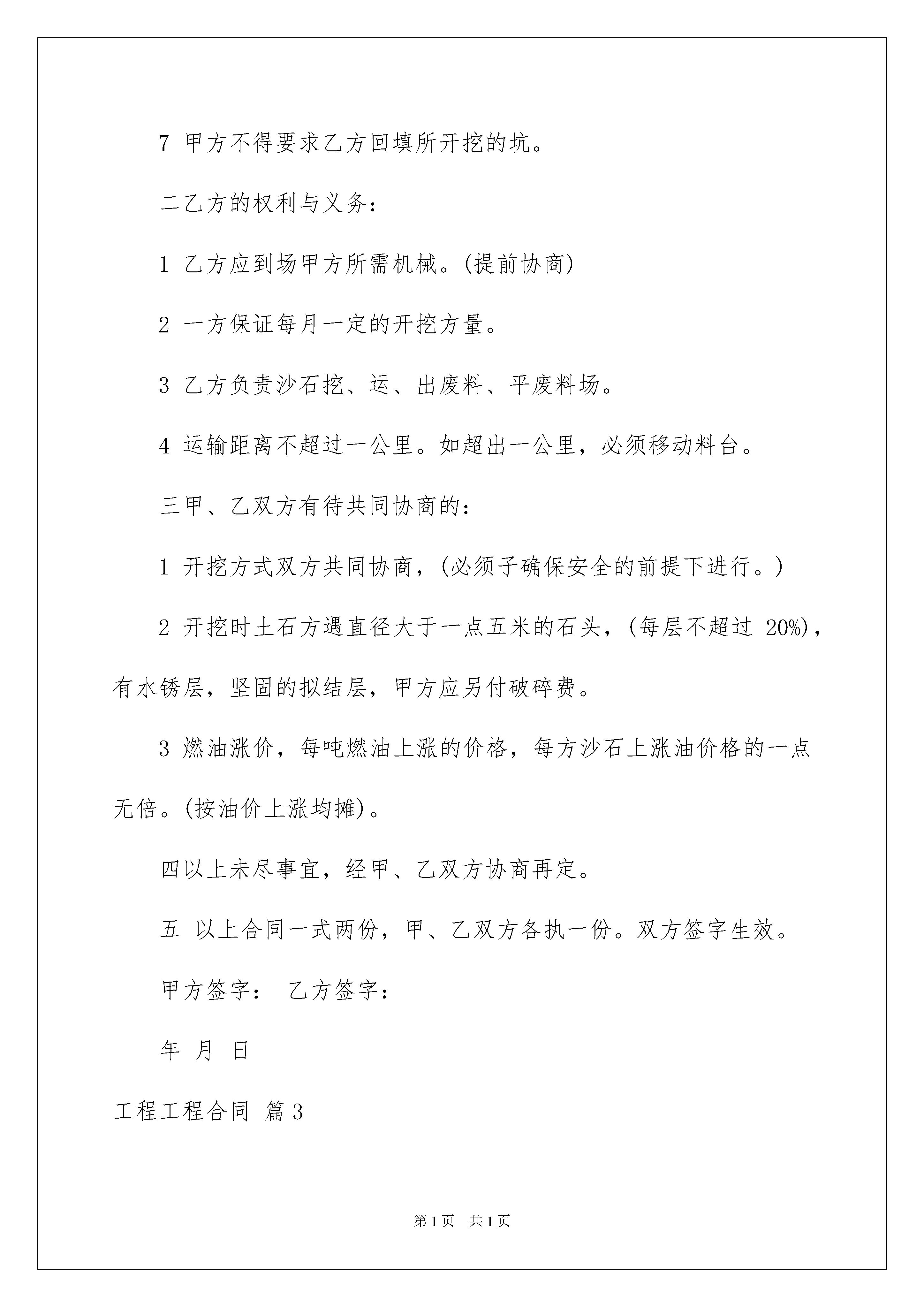 2022工程工程合同集合六篇工程工程合同集合六篇随着人们法律意识的建立,合同起到的作用越来越大,合同的签订是对双方之间权利义务的最好规范。合同有不同的类型,当然也有不同的目的,以下是我精心整理的工程工程合同6篇,仅供参考,欢迎大家阅读。工程工程合同篇1建设单位:(以下称甲方)施工单位:(以下称乙方)甲方因建设开发的需要,现委托乙方对棠下镇旗杆石酒厂米仓和围墙工程进行施工。为了明确双方的权利、义务和责任,积极协作,互相配合,确保工程质量,经甲、乙双方协商一致,订立本合同。一、工程名称:二、工程地点:三、工程量:[见预算总价]四、工程费用:五、工程承包方式:本工程采用乙方包工、包料,按质按时完成的承包方式。六、工程质量要求:乙方必须按设计图纸及施工方案施工,并要制定施工方案和施工进度表交甲方备案。①该工程采用C30商品砼,并按规范要求做试件检测,检测费由乙方负责,甲方有权决定是否做抽芯或回弹检测,若检测合格,检测费由甲方支付,甲方予以验收;若抽芯或回弹检测不合格,检测费由乙方支付,且作验收不合格处理。混凝土在凝固期间要求按规范保养,保养期不少于14天。②施工和验收执行国家有关标准、规范要求。七、工程时间:由201年3月22日至201年4月10日止必须完成(晴雨天计算)工程。工程期限为天。超期未完成的,以后每天乙方要补偿3000元给甲方作拖延工程的补偿,补偿款在工程款中扣减。八、施工时如遇不可遇见的困难和不可抗拒的损失,由乙方解决和承担。九、施工时,甲方根据实际和需要有权变更施工方案,变更方案属增加工程量的由双方协商,属减少工程的按中标价和预算价比例照减。十、乙方一定要做好施工安全措施,防止事故发生,如发生一切安全事故,一切责任由乙方负责。十一、工程质量不合格需要返工及由此造成的一切经济损失由乙方负责。十二、工程所需的一切税费由乙方负责。十三、付款方式:工程按完成进度付款,合同书签订开工后五天内,甲方预付总工程款的30%,在施工期间乙方可按工程进度申请工程款,进度款最高付至按实际完成量的80%计算(含工程预付款),余下20%的工程款(不计利息)在工程完工验收合格后半年内付清。十四、违约责任:合同期内,若一方违约,应赔偿给对方因此而造成的经济损失。十五、本合同书一式叁份,甲乙双方各执一份,棠下镇财政所一份,以上合同在实际执行中有不完善之处,确需补充的,有甲方及乙方协商解决,补充完善,合同争议在施工所在地法庭解决。甲方(盖公章):代表:乙方(盖公章):代表:日期:年月日工程工程合同篇2乙方:身份证号码:根据中华人民劳动法之规定,自愿,平等,互利的原则。甲方自愿()土石方开挖承包给乙方。甲乙双方友好协商,达成以下共识:一甲方的权利与义务:1甲方取得()土石方的开挖权合法有效。2甲方应协调好当地政府和当地百姓的关系,确保乙方在开挖过程不受阻扰,顺利施工作业。如因甲方处理不当,造成机械停工两天,甲方应付乙方机械租金费。3甲方提供乙方人员住宿及生活费。4双方签订合同时,甲方付乙方进场费()大写()。5甲方提供机械燃油费。6开挖方量以实际开挖量为准,每立方米()元。乙方机械进场后,甲方每十五天记开挖方量一次,并支付乙方所开挖方量费用,甲方可扣除燃油费。(预付款待工程完工后,甲方一次扣除)7甲方不得要求乙方回填所开挖的坑。二乙方的权利与义务:1乙方应到场甲方所需机械。(提前协商)2一方保证每月一定的开挖方量。3乙方负责沙石挖、运、出废料、平废料场。4运输距离不超过一公里。如超出一公里,必须移动料台。三甲、乙双方有待共同协商的:1开挖方式双方共同协商,(必须子确保安全的前提下进行。)2开挖时土石方遇直径大于一点五米的石头,(每层不超过20%),有水锈层,坚固的拟结层,甲方应另付破碎费。3燃油涨价,每吨燃油上涨的价格,每方沙石上涨油价格的一点无倍。(按油价上涨均摊)。四以上未尽事宜,经甲、乙双方协商再定。五以上合同一式两份,甲、乙双方各执一份。双方签字生效。甲方签字:乙方签字:年月日工程工程合同篇3甲方(发包人):乙方(承包人):XX公司依据《中华人民共和国合同法》、《中华人民共和国建筑法》及其他有关法律、行政法规,遵循平等、自愿、公平和诚实信用的原则,甲、乙双方就工程施工有关事项达成一致意见,同意订立本合同。第一条工程概况一、工程名称:(以下称本工程)二、工程地点:XX市三、承包范围:乙方按施工图纸及合同的要求,完成工程施工,具体施工四、承包方式:包工包料。第二条合同价款及结算价款:一、按本工程的承包范围和承包方式,本工程合同价款为人民币(小写):¥8000000。00元;(大写):元整。合同价