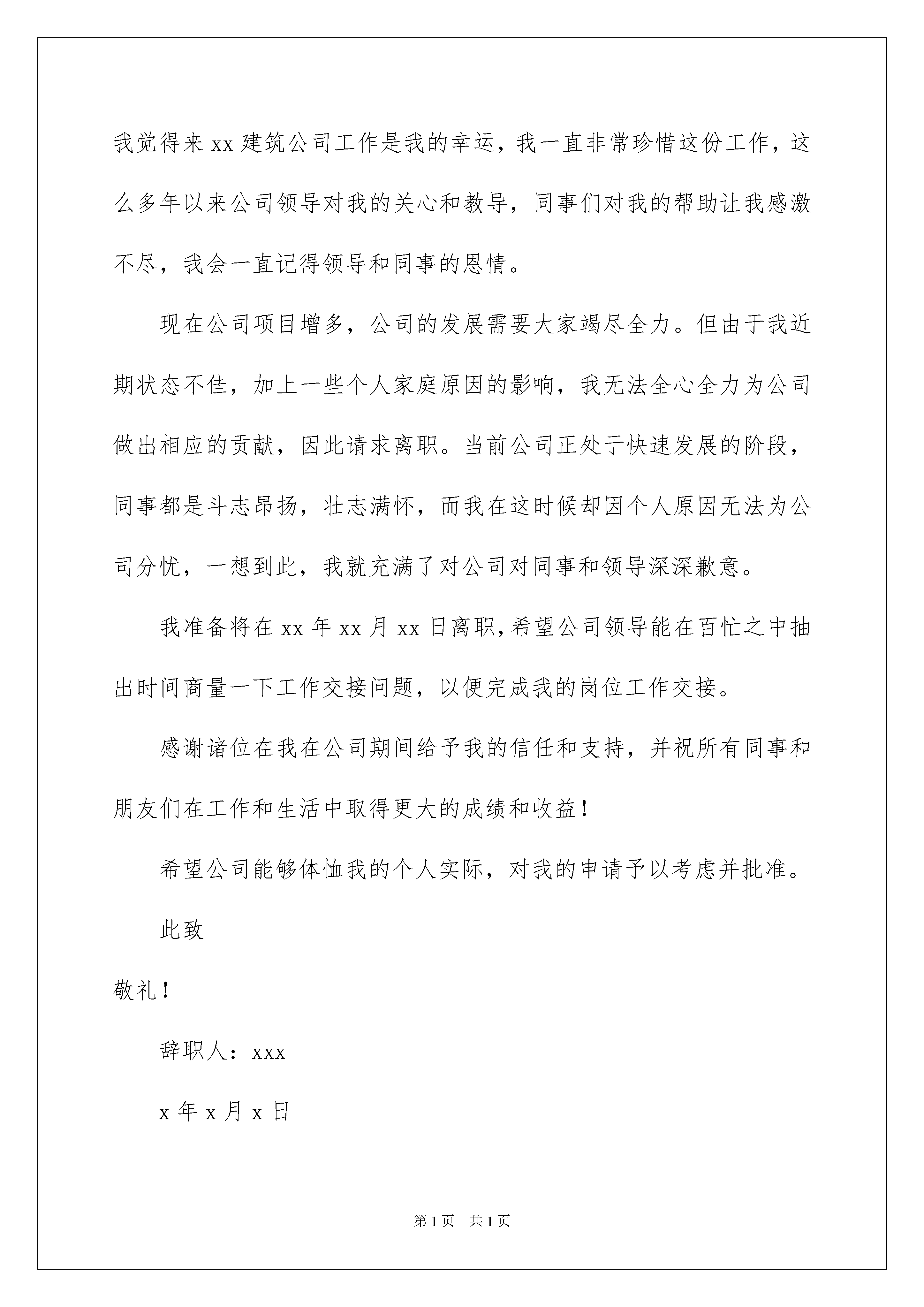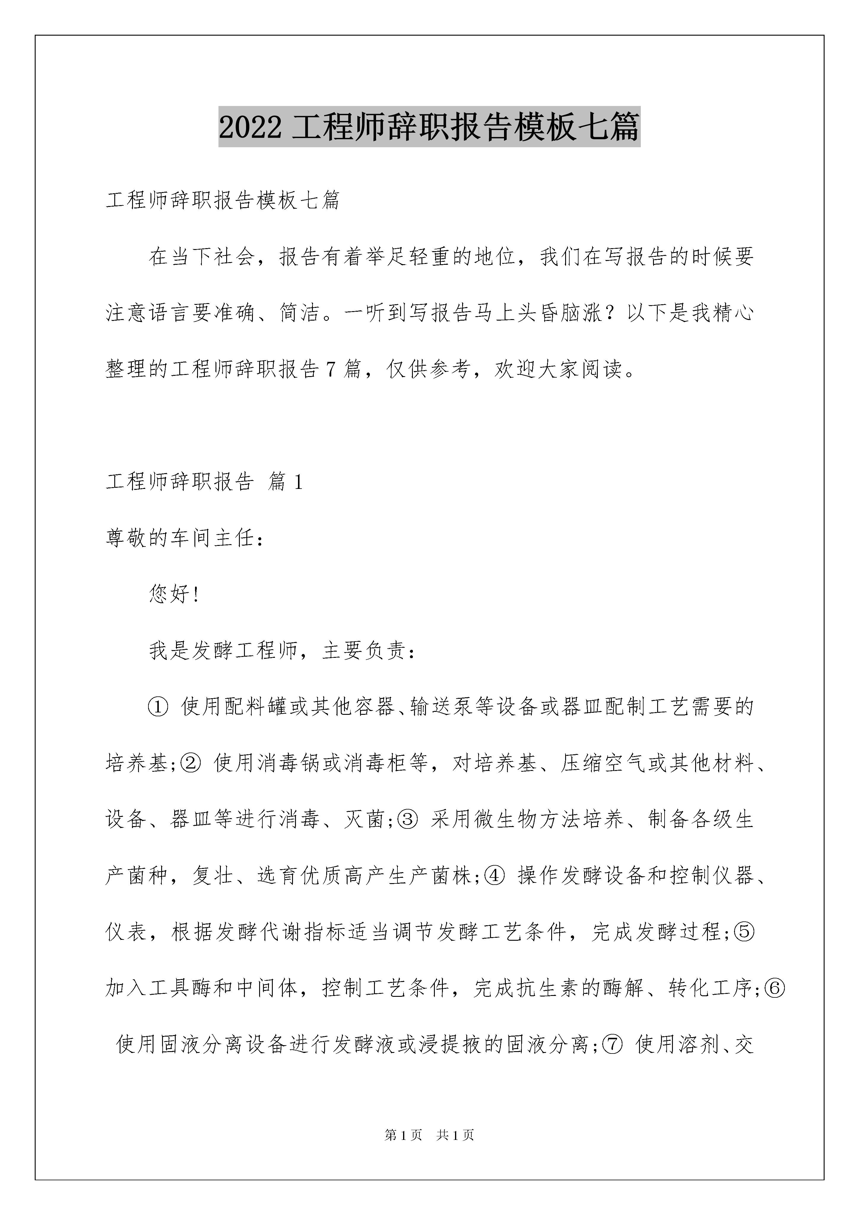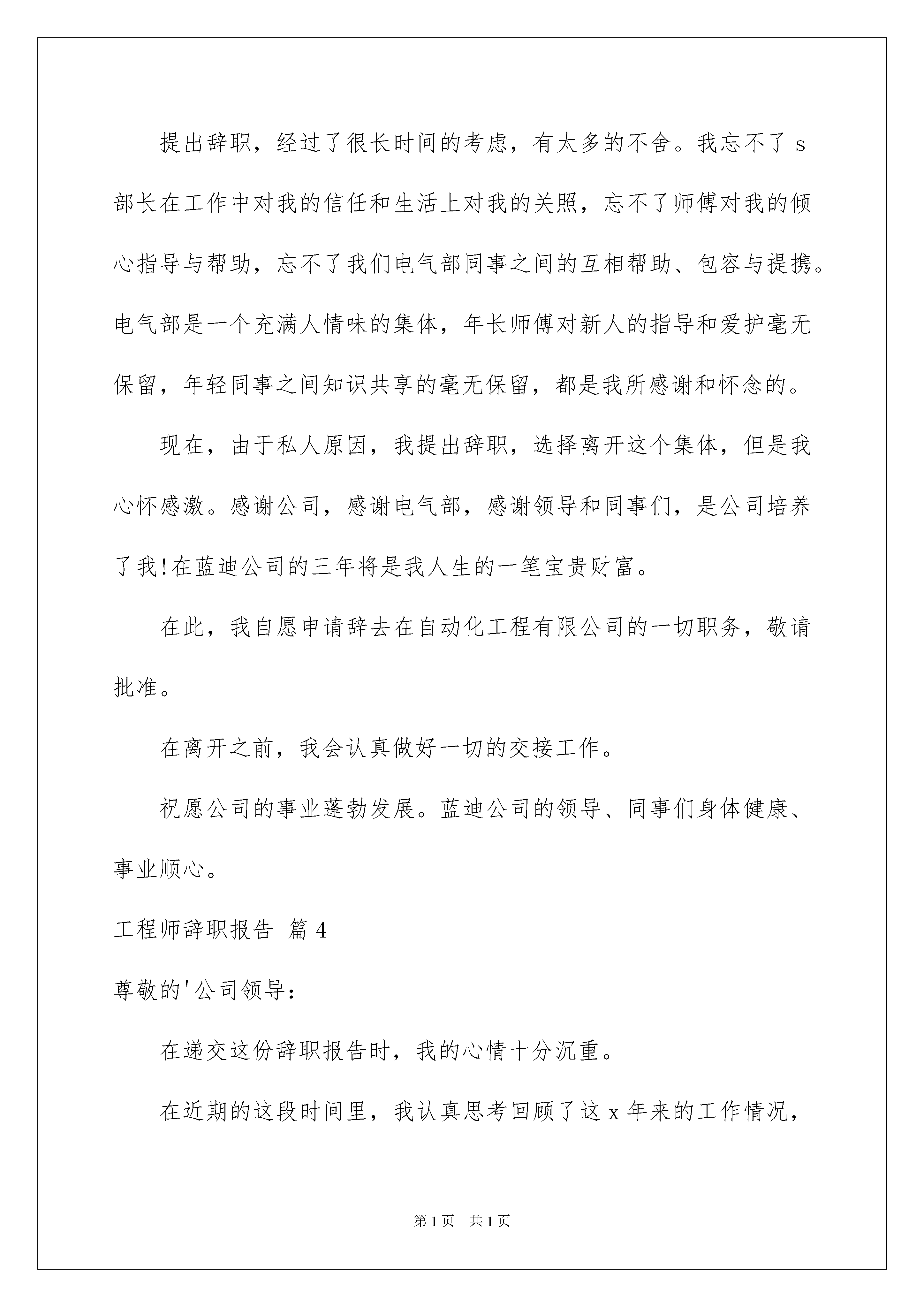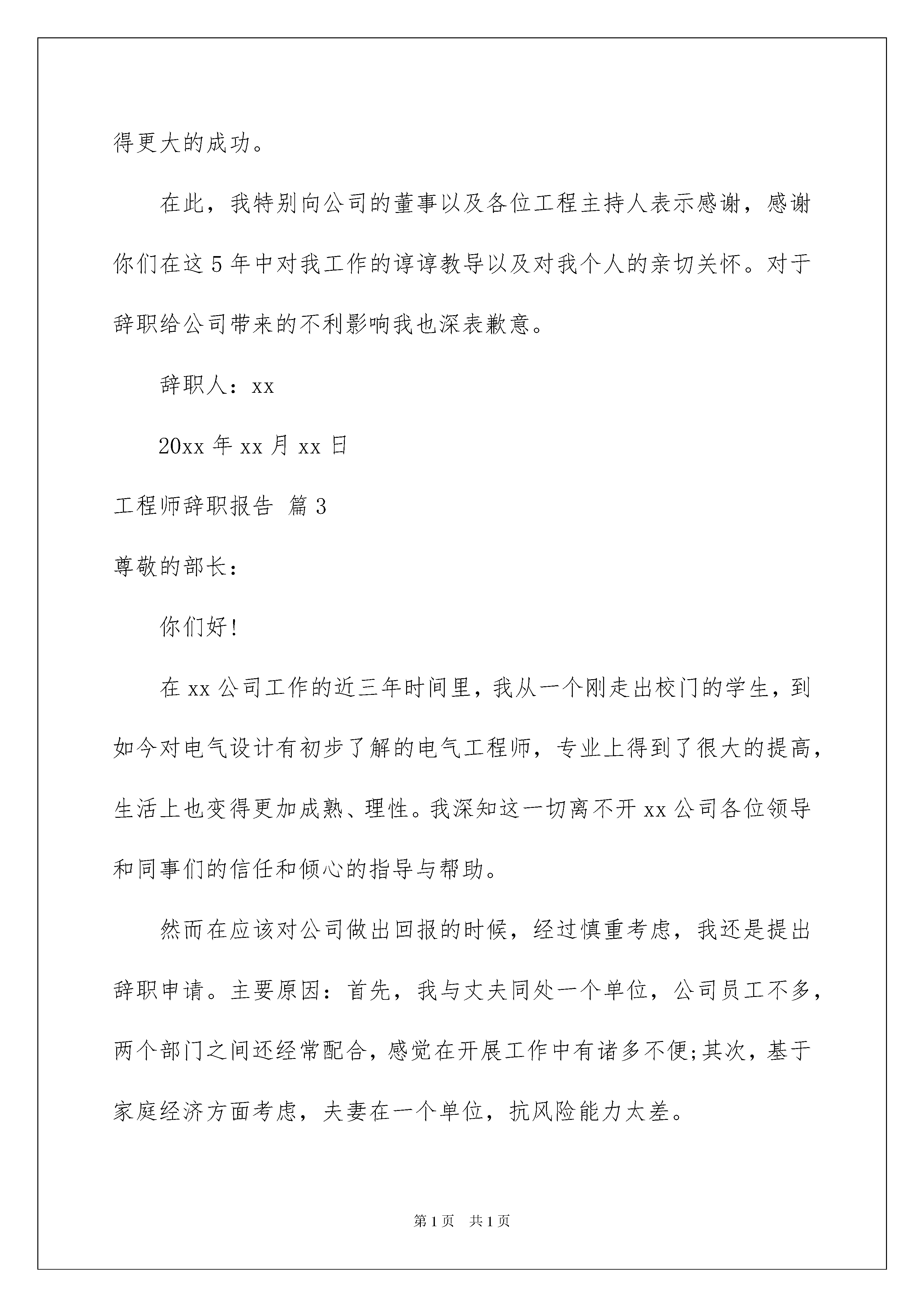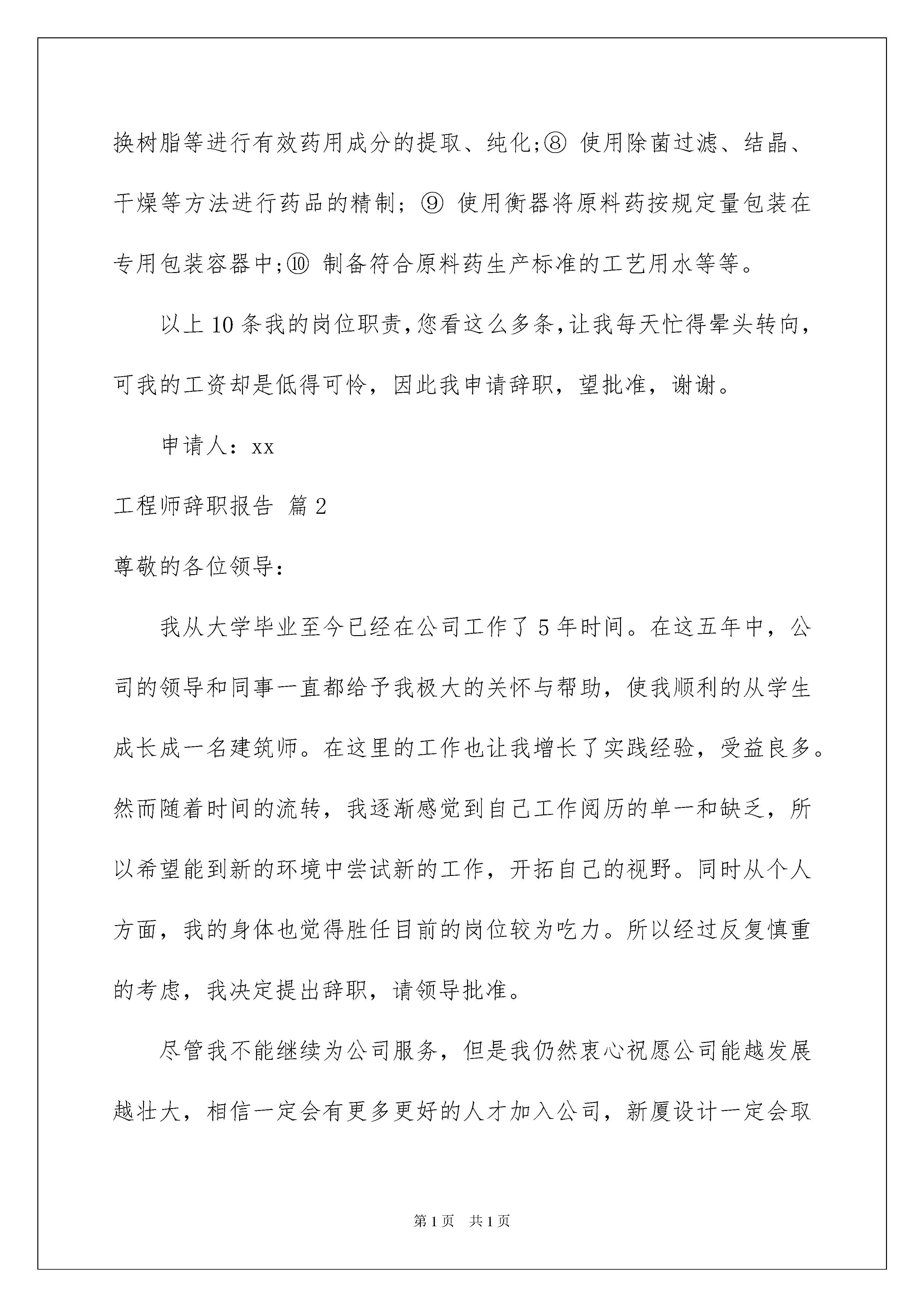 2022工程师辞职报告模板七篇工程师辞职报告模板七篇在当下社会,报告有着举足轻重的地位,我们在写报告的时候要注意语言要准确、简洁。一听到写报告马上头昏脑涨?以下是我精心整理的工程师辞职报告7篇,仅供参考,欢迎大家阅读。工程师辞职报告篇1尊敬的车间主任:您好!我是发酵工程师,主要负责:①使用配料罐或其他容器、输送泵等设备或器皿配制工艺需要的培养基;②使用消毒锅或消毒柜等,对培养基、压缩空气或其他材料、设备、器皿等进行消毒、灭菌;③采用微生物方法培养、制备各级生产菌种,复壮、选育优质高产生产菌株;④操作发酵设备和控制仪器、仪表,根据发酵代谢指标适当调节发酵工艺条件,完成发酵过程;⑤加入工具酶和中间体,控制工艺条件,完成抗生素的酶解、转化工序;⑥使用固液分离设备进行发酵液或浸提掖的固液分离;⑦使用溶剂、交换树脂等进行有效药用成分的提取、纯化;⑧使用除菌过滤、结晶、干燥等方法进行药品的精制;⑨使用衡器将原料药按规定量包装在专用包装容器中;⑩制备符合原料药生产标准的工艺用水等等。以上10条我的岗位职责,您看这么多条,让我每天忙得晕头转向,可我的工资却是低得可怜,因此我申请辞职,望批准,谢谢。申请人:xx工程师辞职报告篇2尊敬的各位领导:我从大学毕业至今已经在公司工作了5年时间。在这五年中,公司的领导和同事一直都给予我极大的关怀与帮助,使我顺利的从学生成长成一名建筑师。在这里的工作也让我增长了实践经验,受益良多。然而随着时间的流转,我逐渐感觉到自己工作阅历的单一和缺乏,所以希望能到新的环境中尝试新的工作,开拓自己的视野。同时从个人方面,我的身体也觉得胜任目前的岗位较为吃力。所以经过反复慎重的考虑,我决定提出辞职,请领导批准。尽管我不能继续为公司服务,但是我仍然衷心祝愿公司能越发展越壮大,相信一定会有更多更好的人才加入公司,新厦设计一定会取得更大的成功。在此,我特别向公司的董事以及各位工程主持人表示感谢,感谢你们在这5年中对我工作的谆谆教导以及对我个人的亲切关怀。对于辞职给公司带来的不利影响我也深表歉意。辞职人:xx20xx年xx月xx日工程师辞职报告篇3尊敬的部长:你们好!在xx公司工作的近三年时间里,我从一个刚走出校门的学生,到如今对电气设计有初步了解的电气工程师,专业上得到了很大的提高,生活上也变得更加成熟、理性。我深知这一切离不开xx公司各位领导和同事们的信任和倾心的指导与帮助。然而在应该对公司做出回报的时候,经过慎重考虑,我还是提出辞职申请。主要原因:首先,我与丈夫同处一个单位,公司员工不多,两个部门之间还经常配合,感觉在开展工作中有诸多不便;其次,基于家庭经济方面考虑,夫妻在一个单位,抗风险能力太差。提出辞职,经过了很长时间的考虑,有太多的不舍。我忘不了s部长在工作中对我的信任和生活上对我的关照,忘不了师傅对我的倾心指导与帮助,忘不了我们电气部同事之间的互相帮助、包容与提携。电气部是一个充满人情味的集体,年长师傅对新人的指导和爱护毫无保留,年轻同事之间知识共享的毫无保留,都是我所感谢和怀念的。现在,由于私人原因,我提出辞职,选择离开这个集体,但是我心怀感激。感谢公司,感谢电气部,感谢领导和同事们,是公司培养了我!在蓝迪公司的三年将是我人生的一笔宝贵财富。在此,我自愿申请辞去在自动化工程有限公司的一切职务,敬请批准。在离开之前,我会认真做好一切的交接工作。祝愿公司的事业蓬勃发展。蓝迪公司的领导、同事们身体健康、事业顺心。工程师辞职报告篇4尊敬的'公司领导:在递交这份辞职报告时,我的心情十分沉重。在近期的这段时间里,我认真思考回顾了这x年来的工作情况,我觉得来xx建筑公司工作是我的幸运,我一直非常珍惜这份工作,这么多年以来公司领导对我的关心和教导,同事们对我的帮助让我感激不尽,我会一直记得领导和同事的恩情。现在公司项目增多,公司的发展需要大家竭尽全力。但由于我近期状态不佳,加上一些个人家庭原因的影响,我无法全心全力为公司做出相应的贡献,因此请求离职。当前公司正处于快速发展的阶段,同事都是斗志昂扬,壮志满怀,而我在这时候却因个人原因无法为公司分忧,一想到此,我就充满了对公司对同事和领导深深歉意。我准备将在xx年xx月xx日离职,希望公司领导能在百忙之中抽出时间商量一下工作交接问题,以便完成我的岗位工作交接。感谢诸位在我在公司期间给予我的信任和支持,并祝所有同事和朋友们在工作和生活中取得更大的成绩和收益!希望公司能够体恤我的个人实际,对我的申请予以考虑并批准。此致敬礼!辞职人:xxxx年x月x日工程师辞职报告篇5尊敬的领导:您好!首先,感谢您在百忙之中抽出时间阅读我的辞职信。俗话说