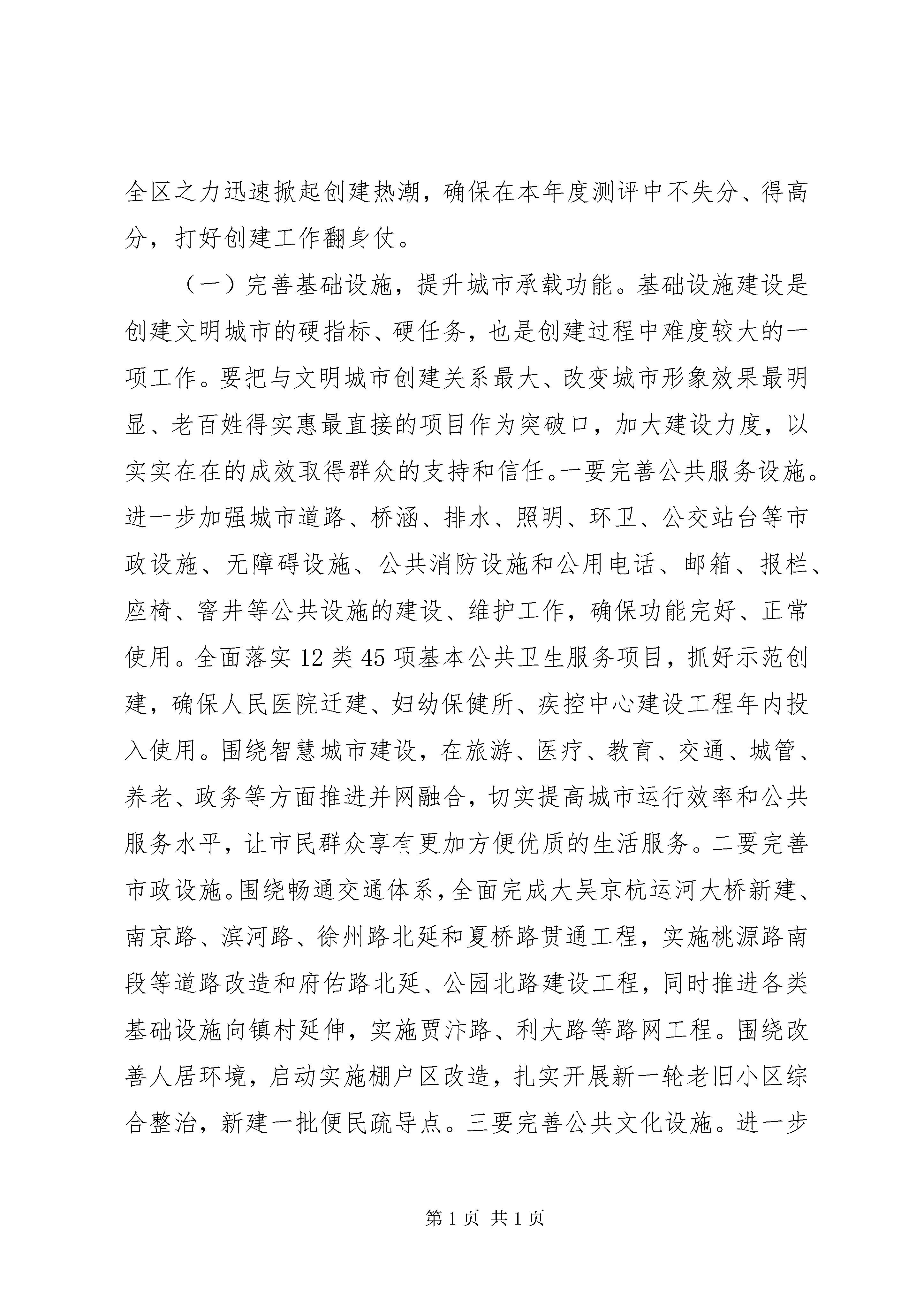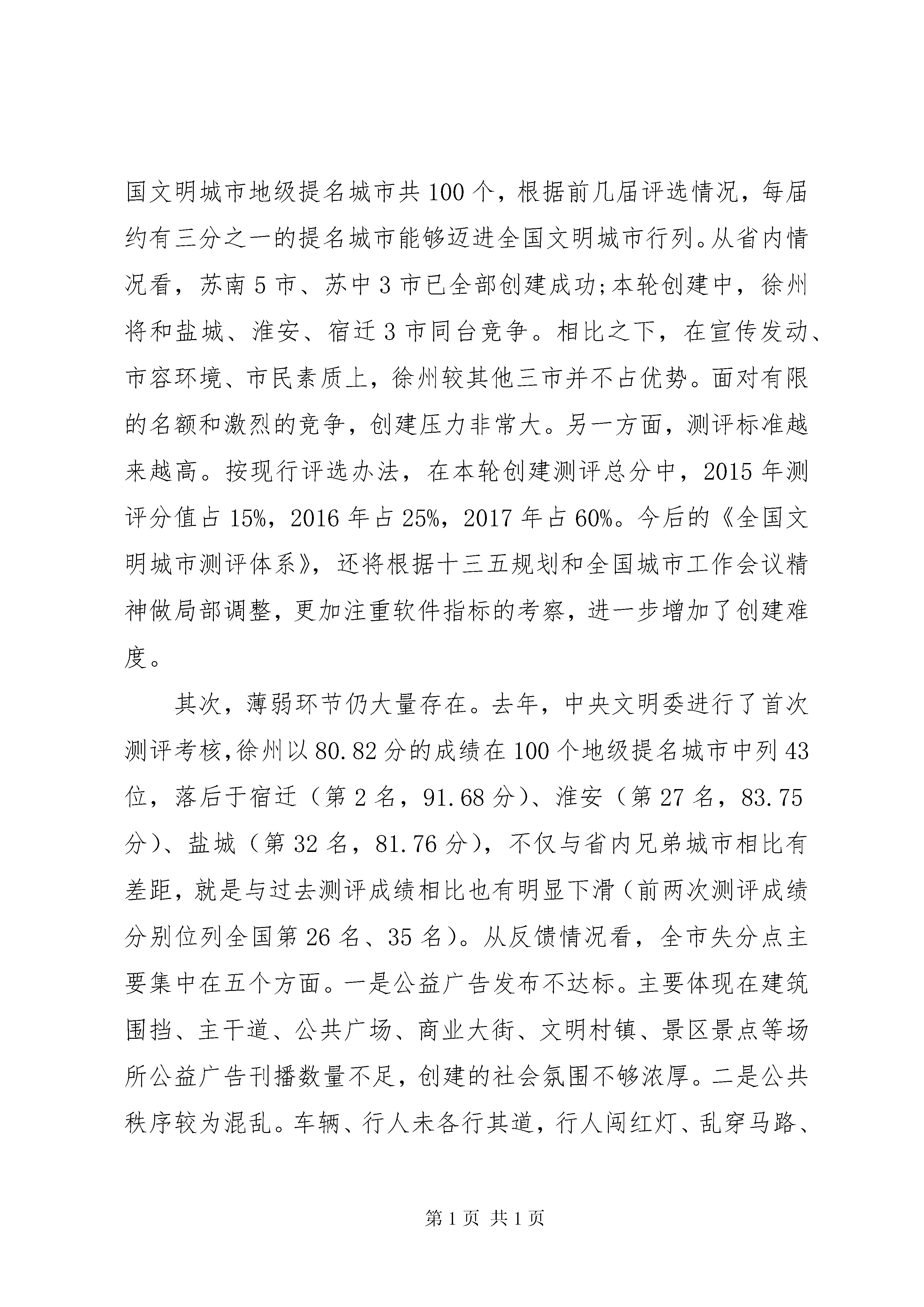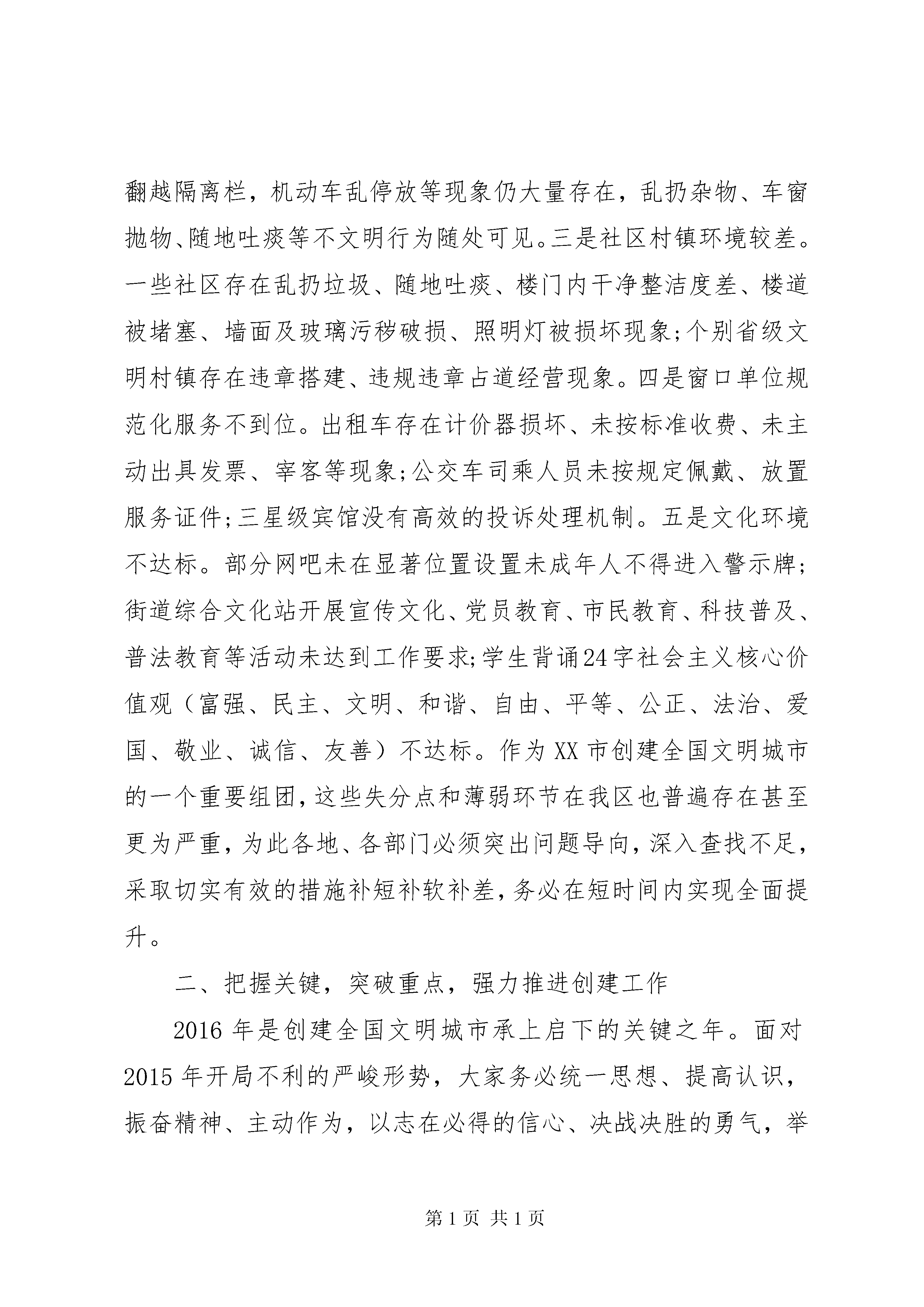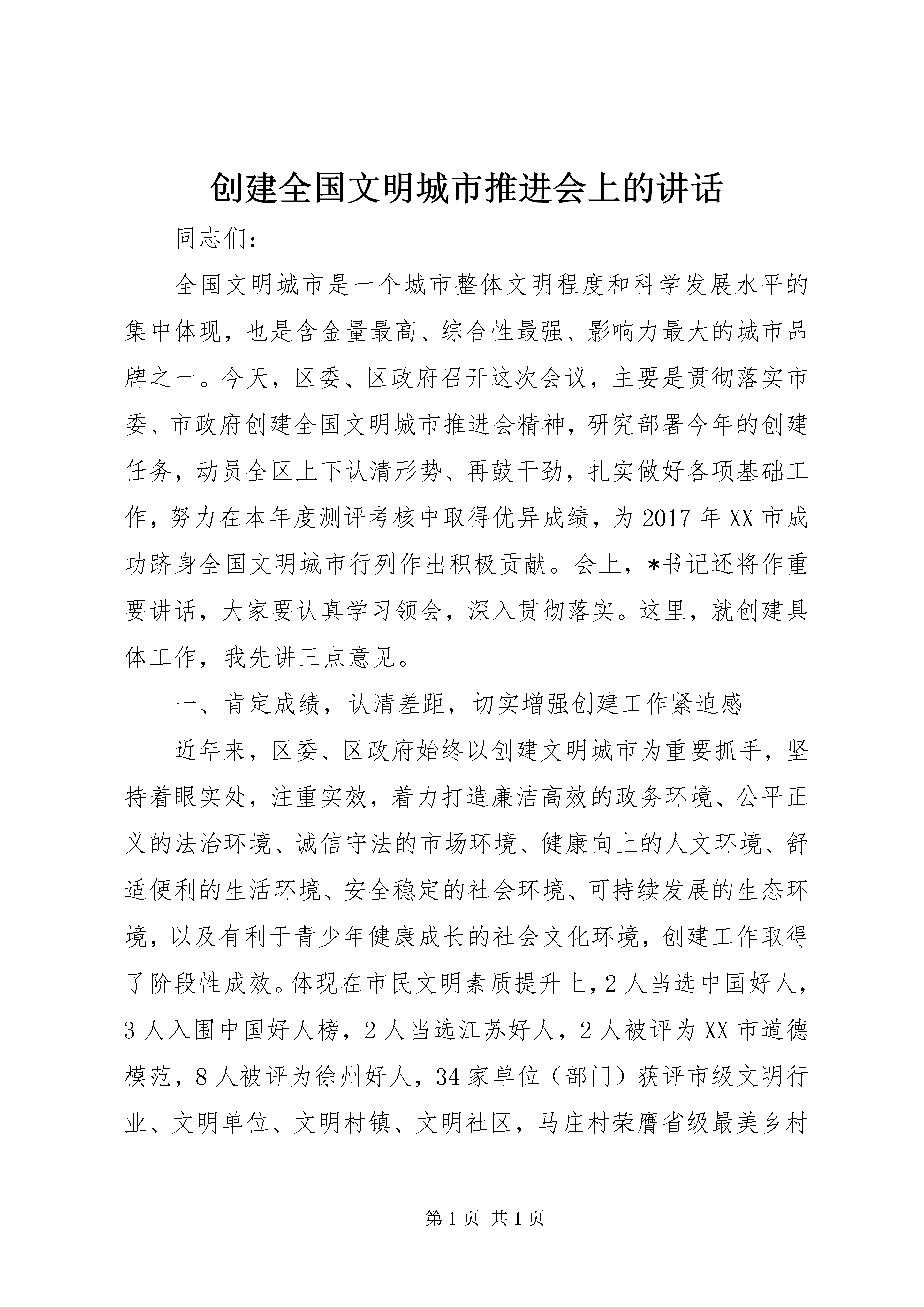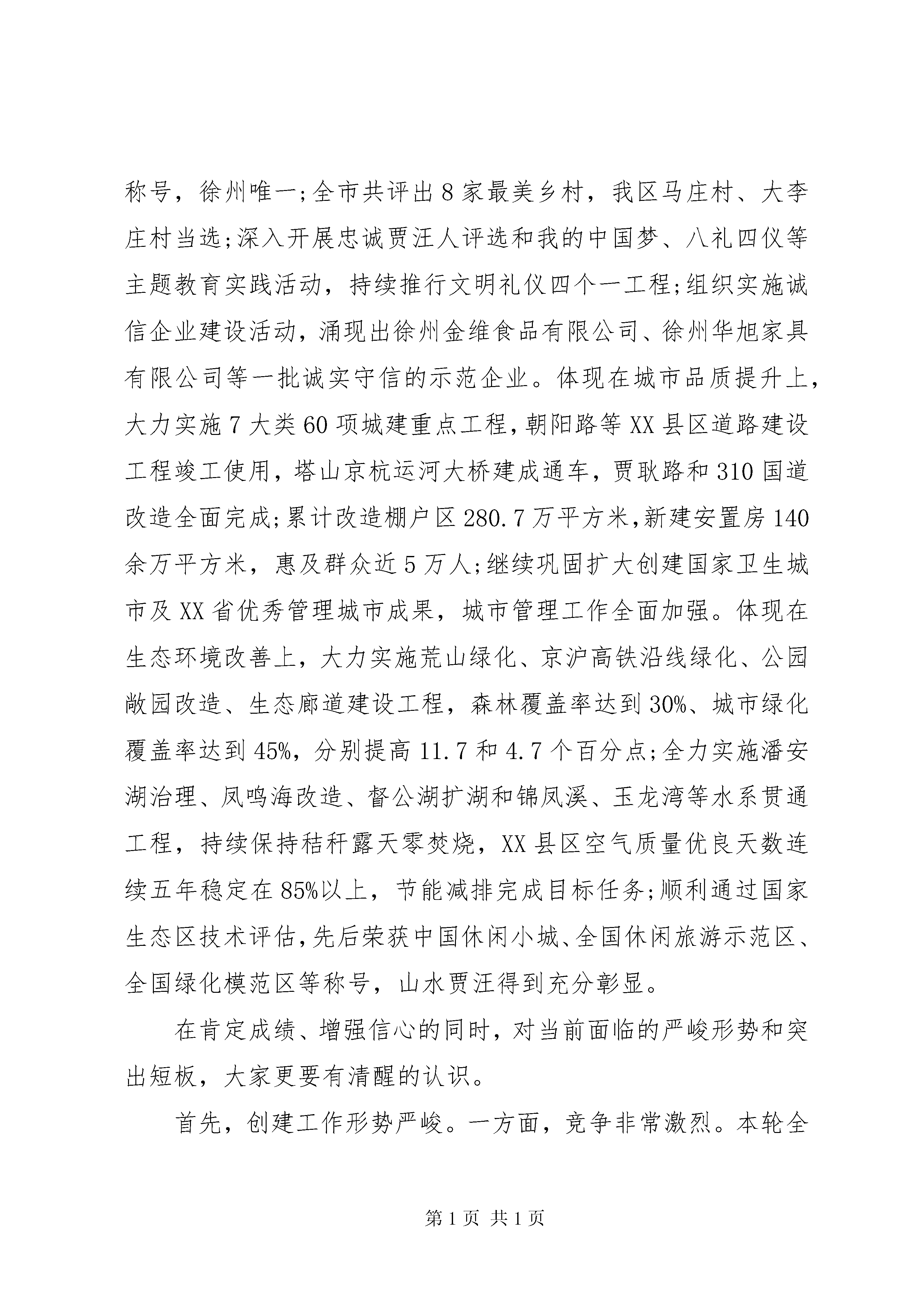创建全国文明城市推进会上的讲话同志们:全国文明城市是一个城市整体文明程度和科学发展水平的集中体现,也是含金量最高、综合性最强、影响力最大的城市品牌之一。今天,区委、区政府召开这次会议,主要是贯彻落实市委、市政府创建全国文明城市推进会精神,研究部署今年的创建任务,动员全区上下认清形势、再鼓干劲,扎实做好各项基础工作,努力在本年度测评考核中取得优异成绩,为2017年XX市成功跻身全国文明城市行列作出积极贡献。会上,*书记还将作重要讲话,大家要认真学习领会,深入贯彻落实。这里,就创建具体工作,我先讲三点意见。一、肯定成绩,认清差距,切实增强创建工作紧迫感近年来,区委、区政府始终以创建文明城市为重要抓手,坚持着眼实处,注重实效,着力打造廉洁高效的政务环境、公平正义的法治环境、诚信守法的市场环境、健康向上的人文环境、舒适便利的生活环境、安全稳定的社会环境、可持续发展的生态环境,以及有利于青少年健康成长的社会文化环境,创建工作取得了阶段性成效。体现在市民文明素质提升上,2人当选中国好人,3人入围中国好人榜,2人当选江苏好人,2人被评为XX市道德模范,8人被评为徐州好人,34家单位(部门)获评市级文明行业、文明单位、文明村镇、文明社区,马庄村荣膺省级最美乡村称号,徐州唯一;全市共评出8家最美乡村,我区马庄村、大李庄村当选;深入开展忠诚贾汪人评选和我的中国梦、八礼四仪等主题教育实践活动,持续推行文明礼仪四个一工程;组织实施诚信企业建设活动,涌现出徐州金维食品有限公司、徐州华旭家具有限公司等一批诚实守信的示范企业。体现在城市品质提升上,大力实施7大类60项城建重点工程,朝阳路等XX县区道路建设工程竣工使用,塔山京杭运河大桥建成通车,贾耿路和310国道改造全面完成;累计改造棚户区280.7万平方米,新建安置房140余万平方米,惠及群众近5万人;继续巩固扩大创建国家卫生城市及XX省优秀管理城市成果,城市管理工作全面加强。体现在生态环境改善上,大力实施荒山绿化、京沪高铁沿线绿化、公园敞园改造、生态廊道建设工程,森林覆盖率达到30%、城市绿化覆盖率达到45%,分别提高11.7和4.7个百分点;全力实施潘安湖治理、凤鸣海改造、督公湖扩湖和锦凤溪、玉龙湾等水系贯通工程,持续保持秸秆露天零焚烧,XX县区空气质量优良天数连续五年稳定在85%以上,节能减排完成目标任务;顺利通过国家生态区技术评估,先后荣获中国休闲小城、全国休闲旅游示范区、全国绿化模范区等称号,山水贾汪得到充分彰显。在肯定成绩、增强信心的同时,对当前面临的严峻形势和突出短板,大家更要有清醒的认识。首先,创建工作形势严峻。一方面,竞争非常激烈。本轮全国文明城市地级提名城市共100个,根据前几届评选情况,每届约有三分之一的提名城市能够迈进全国文明城市行列。从省内情况看,苏南5市、苏中3市已全部创建成功;本轮创建中,徐州将和盐城、淮安、宿迁3市同台竞争。相比之下,在宣传发动、市容环境、市民素质上,徐州较其他三市并不占优势。面对有限的名额和激烈的竞争,创建压力非常大。另一方面,测评标准越来越高。按现行评选办法,在本轮创建测评总分中,2015年测评分值占15%,2016年占25%,2017年占60%。今后的《全国文明城市测评体系》,还将根据十三五规划和全国城市工作会议精神做局部调整,更加注重软件指标的考察,进一步增加了创建难度。其次,薄弱环节仍大量存在。去年,中央文明委进行了首次测评考核,徐州以80.82分的成绩在100个地级提名城市中列43位,落后于宿迁(第2名,91.68分)、淮安(第27名,83.75分)、盐城(第32名,81.76分),不仅与省内兄弟城市相比有差距,就是与过去测评成绩相比也有明显下滑(前两次测评成绩分别位列全国第26名、35名)。从反馈情况看,全市失分点主要集中在五个方面。一是公益广告发布不达标。主要体现在建筑围挡、主干道、公共广场、商业大街、文明村镇、景区景点等场所公益广告刊播数量不足,创建的社会氛围不够浓厚。二是公共秩序较为混乱。车辆、行人未各行其道,行人闯红灯、乱穿马路、翻越隔离栏,机动车乱停放等现象仍大量存在,乱扔杂物、车窗抛物、随地吐痰等不文明行为随处可见。三是社区村镇环境较差。一些社区存在乱扔垃圾、随地吐痰、楼门内干净整洁度差、楼道被堵塞、墙面及玻璃污秽破损、照明灯被损坏现象;个别省级文明村镇存在违章搭建、违规违章占道经营现象。四是窗口单位规范化服务不到位。出租车存在计价器损坏、未按标准收费、未主动出具发票、宰客等现象;公交车司乘人员未按规定佩戴、放置服务证件;三星级宾馆没有高效的投诉处理机制。五是文化环境不达标。部分网吧未在显著位置设置未成年人不得进入警示牌;街道综合文化站开展宣传文化、党员教育、市民教育、科技普及、普法教育等活动未达到工作要求