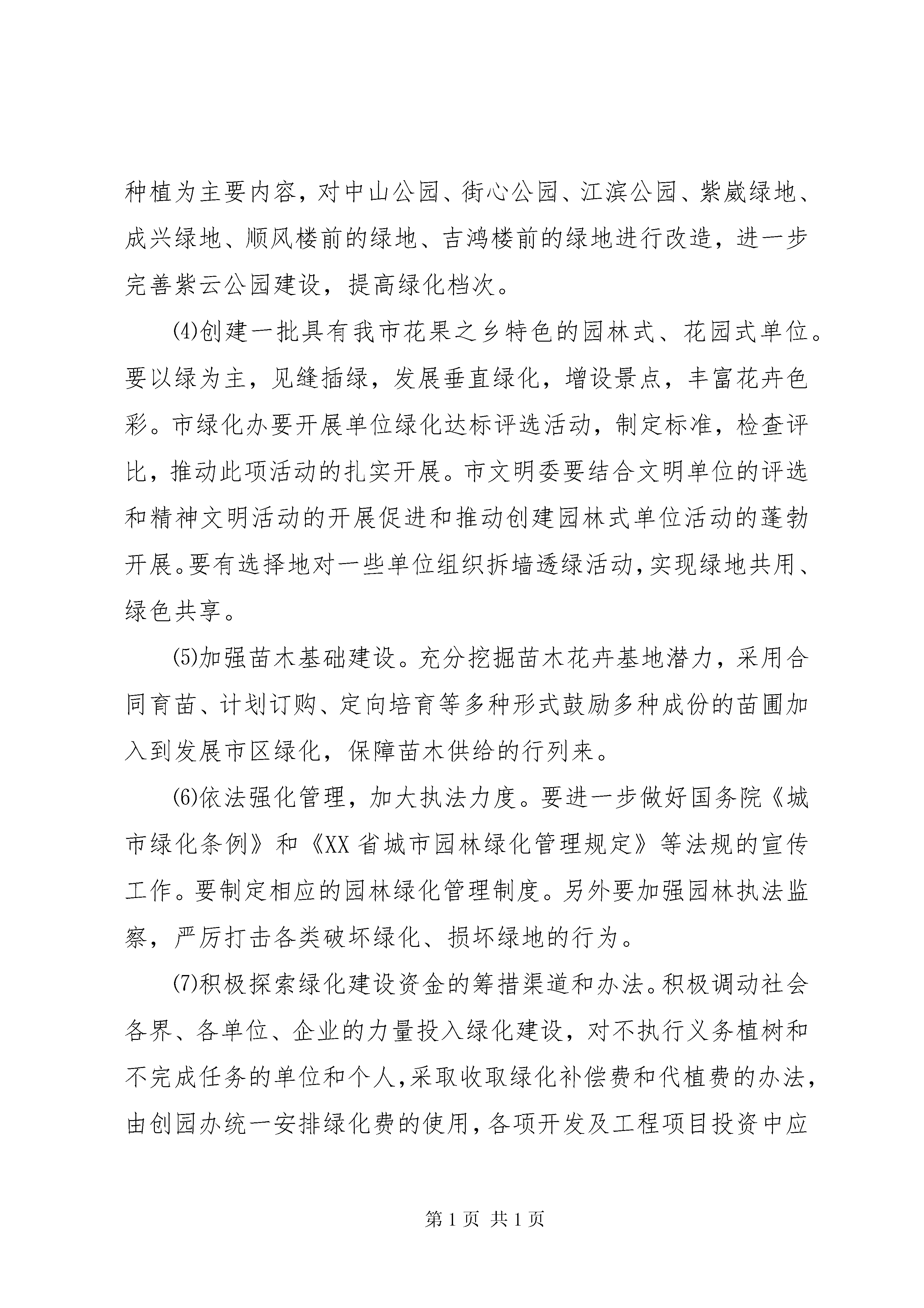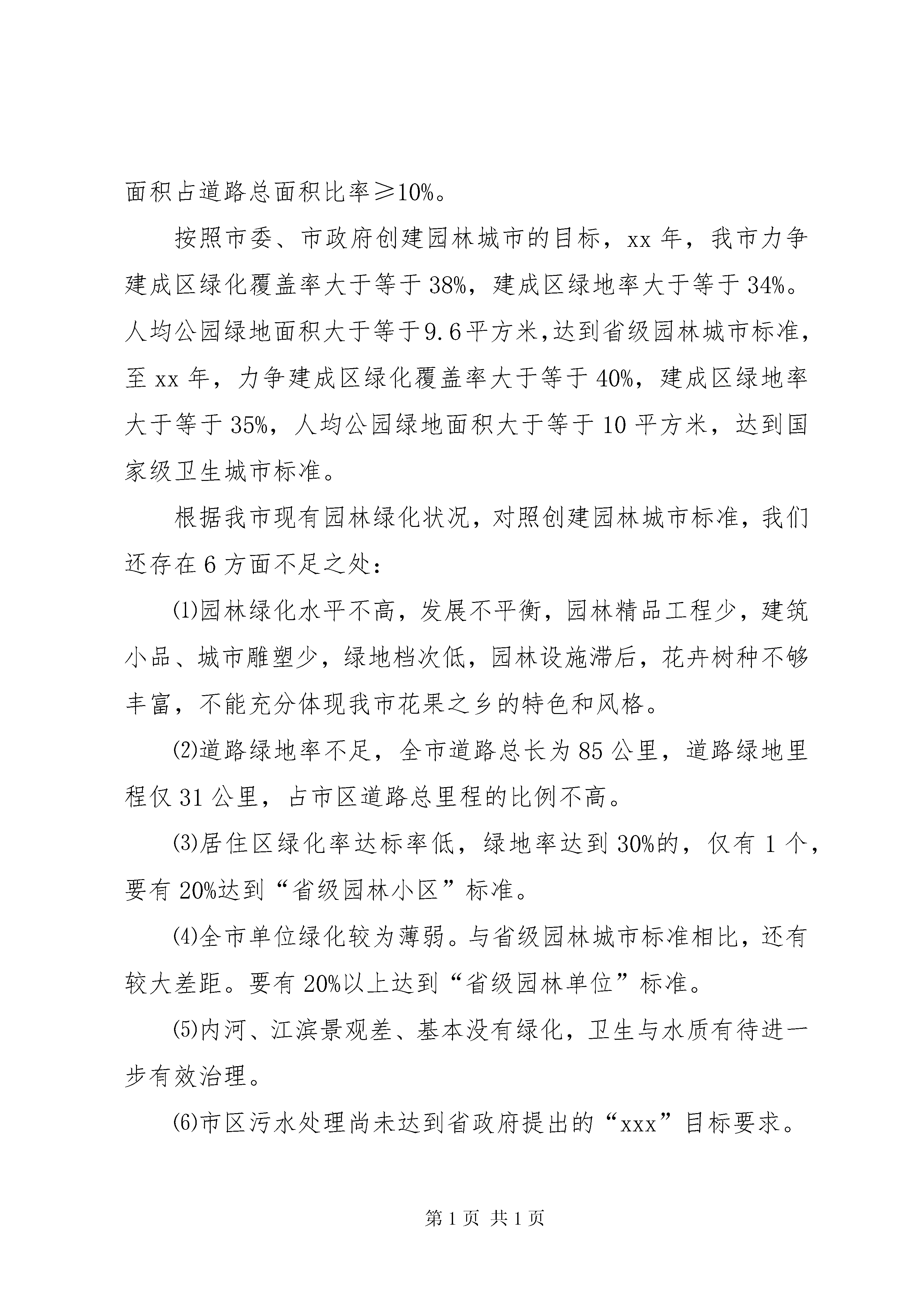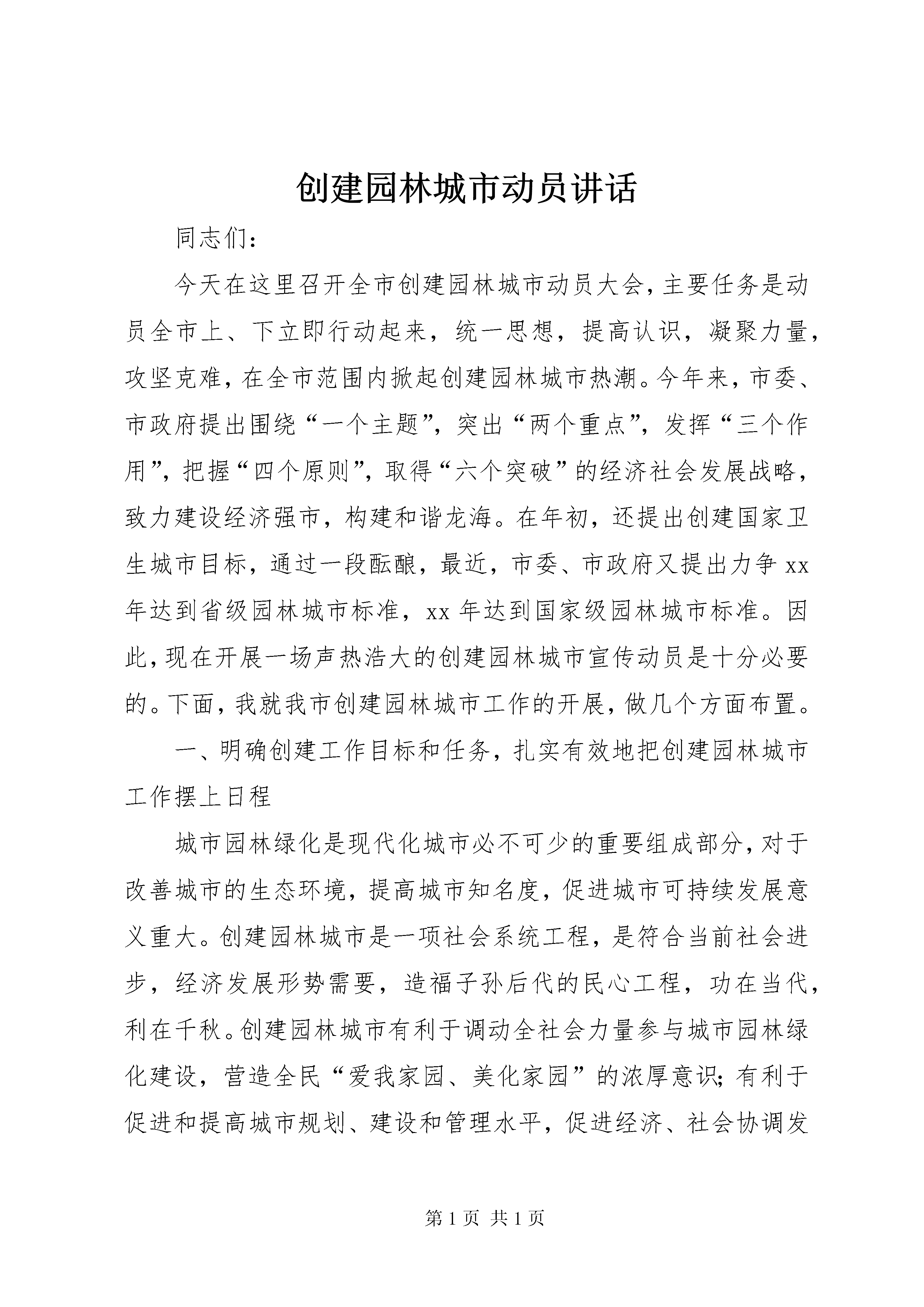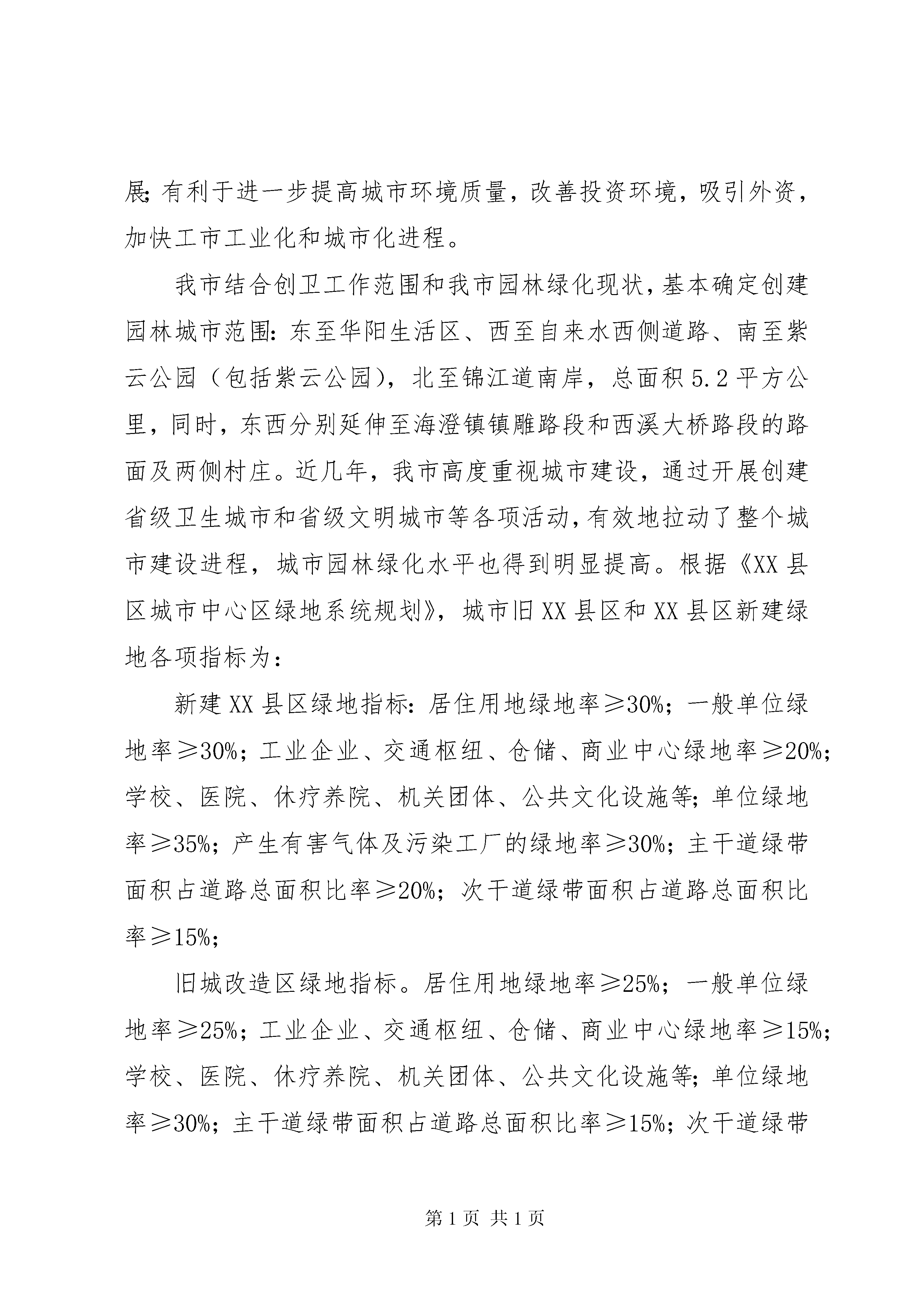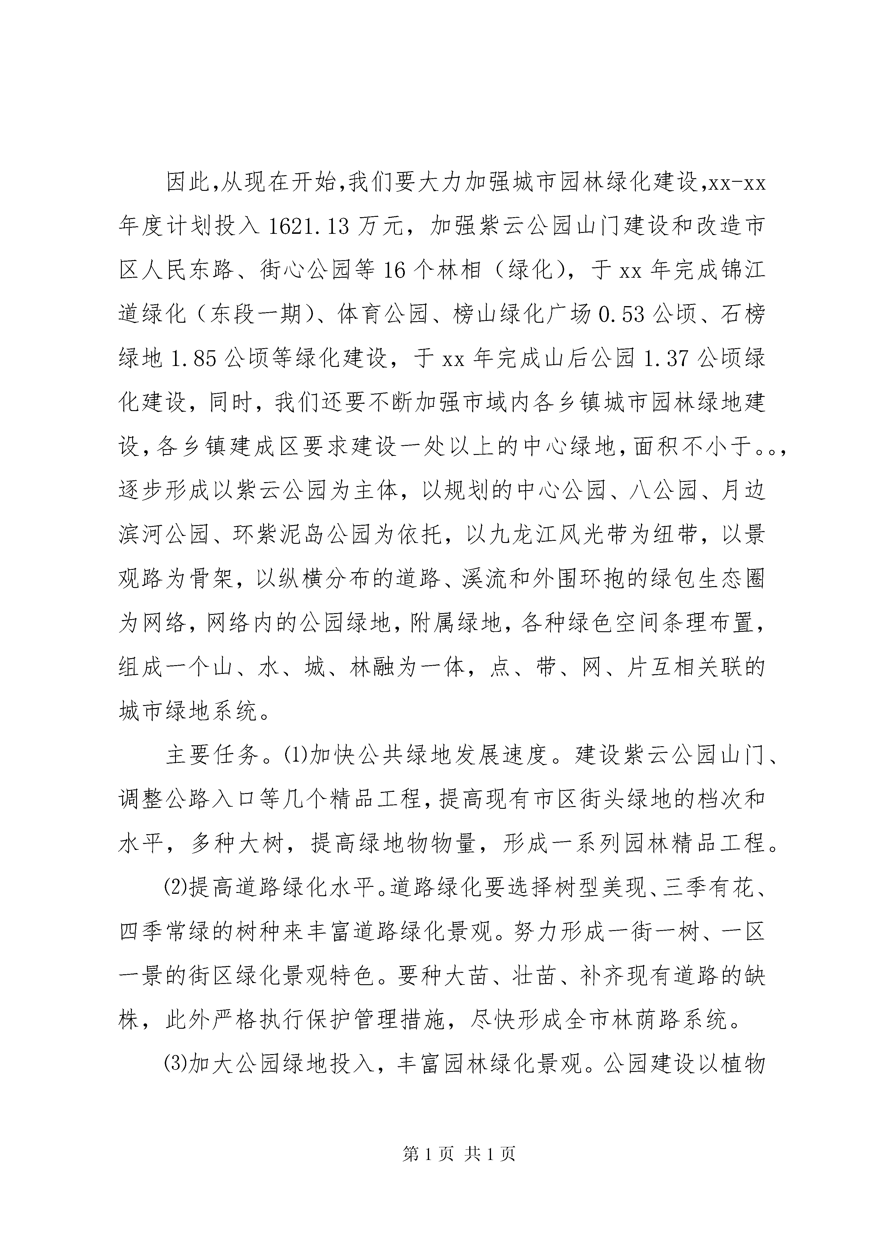 创建园林城市动员讲话同志们:今天在这里召开全市创建园林城市动员大会,主要任务是动员全市上、下立即行动起来,统一思想,提高认识,凝聚力量,攻坚克难,在全市范围内掀起创建园林城市热潮。今年来,市委、市政府提出围绕“一个主题”,突出“两个重点”,发挥“三个作用”,把握“四个原则”,取得“六个突破”的经济社会发展战略,致力建设经济强市,构建和谐龙海。在年初,还提出创建国家卫生城市目标,通过一段酝酿,最近,市委、市政府又提出力争xx年达到省级园林城市标准,xx年达到国家级园林城市标准。因此,现在开展一场声热浩大的创建园林城市宣传动员是十分必要的。下面,我就我市创建园林城市工作的开展,做几个方面布置。一、明确创建工作目标和任务,扎实有效地把创建园林城市工作摆上日程城市园林绿化是现代化城市必不可少的重要组成部分,对于改善城市的生态环境,提高城市知名度,促进城市可持续发展意义重大。创建园林城市是一项社会系统工程,是符合当前社会进步,经济发展形势需要,造福子孙后代的民心工程,功在当代,利在千秋。创建园林城市有利于调动全社会力量参与城市园林绿化建设,营造全民“爱我家园、美化家园”的浓厚意识;有利于促进和提高城市规划、建设和管理水平,促进经济、社会协调发展;有利于进一步提高城市环境质量,改善投资环境,吸引外资,加快工市工业化和城市化进程。我市结合创卫工作范围和我市园林绿化现状,基本确定创建园林城市范围:东至华阳生活区、西至自来水西侧道路、南至紫云公园(包括紫云公园),北至锦江道南岸,总面积5.2平方公里,同时,东西分别延伸至海澄镇镇雕路段和西溪大桥路段的路面及两侧村庄。近几年,我市高度重视城市建设,通过开展创建省级卫生城市和省级文明城市等各项活动,有效地拉动了整个城市建设进程,城市园林绿化水平也得到明显提高。根据《XX县区城市中心区绿地系统规划》,城市旧XX县区和XX县区新建绿地各项指标为:新建XX县区绿地指标:居住用地绿地率≥30%;一般单位绿地率≥30%;工业企业、交通枢纽、仓储、商业中心绿地率≥20%;学校、医院、休疗养院、机关团体、公共文化设施等;单位绿地率≥35%;产生有害气体及污染工厂的绿地率≥30%;主干道绿带面积占道路总面积比率≥20%;次干道绿带面积占道路总面积比率≥15%;旧城改造区绿地指标。居住用地绿地率≥25%;一般单位绿地率≥25%;工业企业、交通枢纽、仓储、商业中心绿地率≥15%;学校、医院、休疗养院、机关团体、公共文化设施等;单位绿地率≥30%;主干道绿带面积占道路总面积比率≥15%;次干道绿带面积占道路总面积比率≥10%。按照市委、市政府创建园林城市的目标,xx年,我市力争建成区绿化覆盖率大于等于38%,建成区绿地率大于等于34%。人均公园绿地面积大于等于9.6平方米,达到省级园林城市标准,至xx年,力争建成区绿化覆盖率大于等于40%,建成区绿地率大于等于35%,人均公园绿地面积大于等于10平方米,达到国家级卫生城市标准。根据我市现有园林绿化状况,对照创建园林城市标准,我们还存在6方面不足之处:⑴园林绿化水平不高,发展不平衡,园林精品工程少,建筑小品、城市雕塑少,绿地档次低,园林设施滞后,花卉树种不够丰富,不能充分体现我市花果之乡的特色和风格。⑵道路绿地率不足,全市道路总长为85公里,道路绿地里程仅31公里,占市区道路总里程的比例不高。⑶居住区绿化率达标率低,绿地率达到30%的,仅有1个,要有20%达到“省级园林小区”标准。⑷全市单位绿化较为薄弱。与省级园林城市标准相比,还有较大差距。要有20%以上达到“省级园林单位”标准。⑸内河、江滨景观差、基本没有绿化,卫生与水质有待进一步有效治理。⑹市区污水处理尚未达到省政府提出的“xxx”目标要求。因此,从现在开始,我们要大力加强城市园林绿化建设,xx-xx年度计划投入1621.13万元,加强紫云公园山门建设和改造市区人民东路、街心公园等16个林相(绿化),于xx年完成锦江道绿化(东段一期)、体育公园、榜山绿化广场0.53公顷、石榜绿地1.85公顷等绿化建设,于xx年完成山后公园1.37公顷绿化建设,同时,我们还要不断加强市域内各乡镇城市园林绿地建设,各乡镇建成区要求建设一处以上的中心绿地,面积不小于。。,逐步形成以紫云公园为主体,以规划的中心公园、八公园、月边滨河公园、环紫泥岛公园为依托,以九龙江风光带为纽带,以景观路为骨架,以纵横分布的道路、溪流和外围环抱的绿包生态圈为网络,网络内的公园绿地,附属绿地,各种绿色空间条理布置,组成一个山、水、城、林融为一体,点、带、网、片互相关联的城市绿地系统。主要任务。⑴加快公共绿地发展速度。建设紫云公园山门、调整公路入口等几个精品工程,提高现有市区街头绿地的档次和水平,多种大树,提高绿地物物量,形成一系列园林精