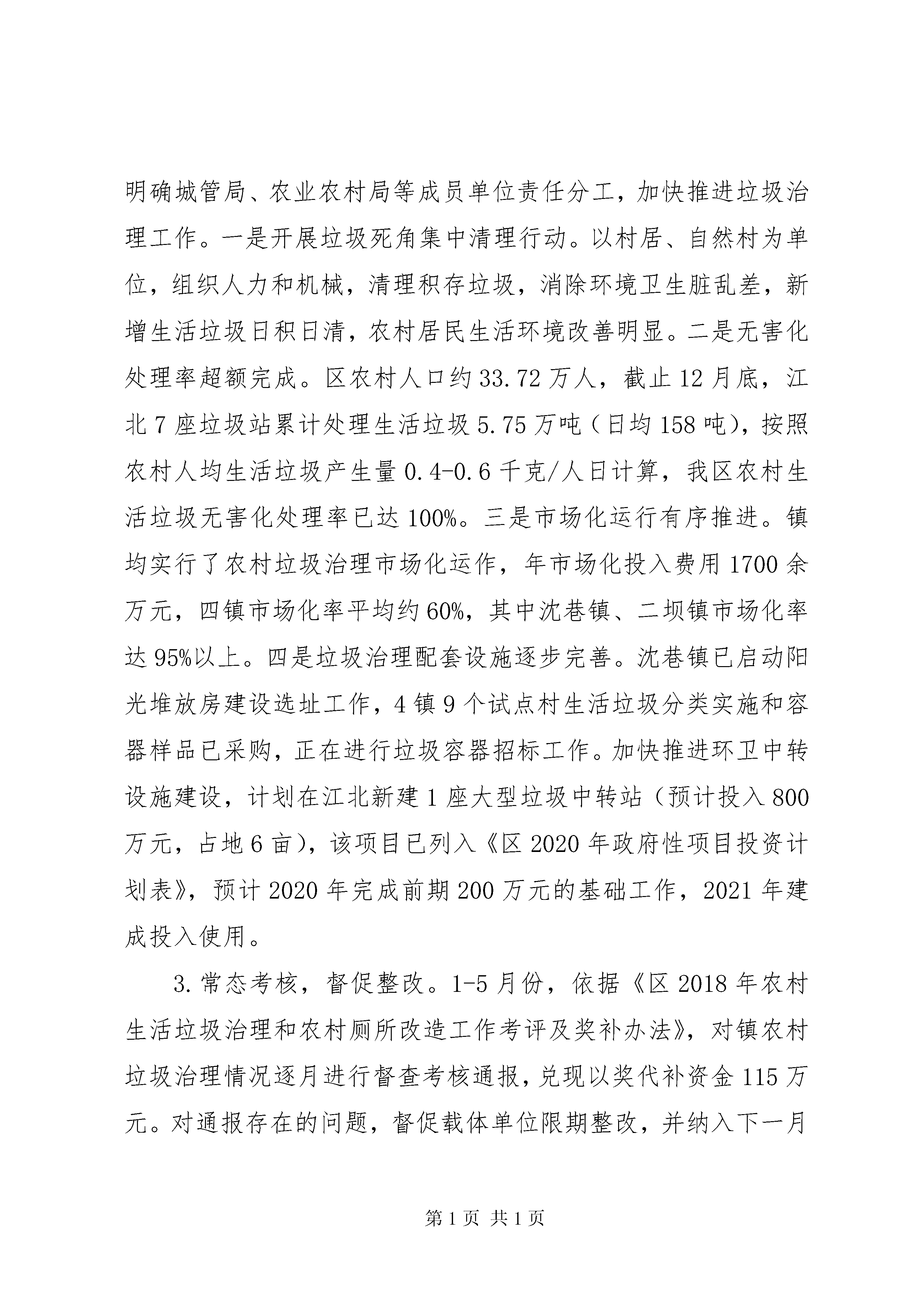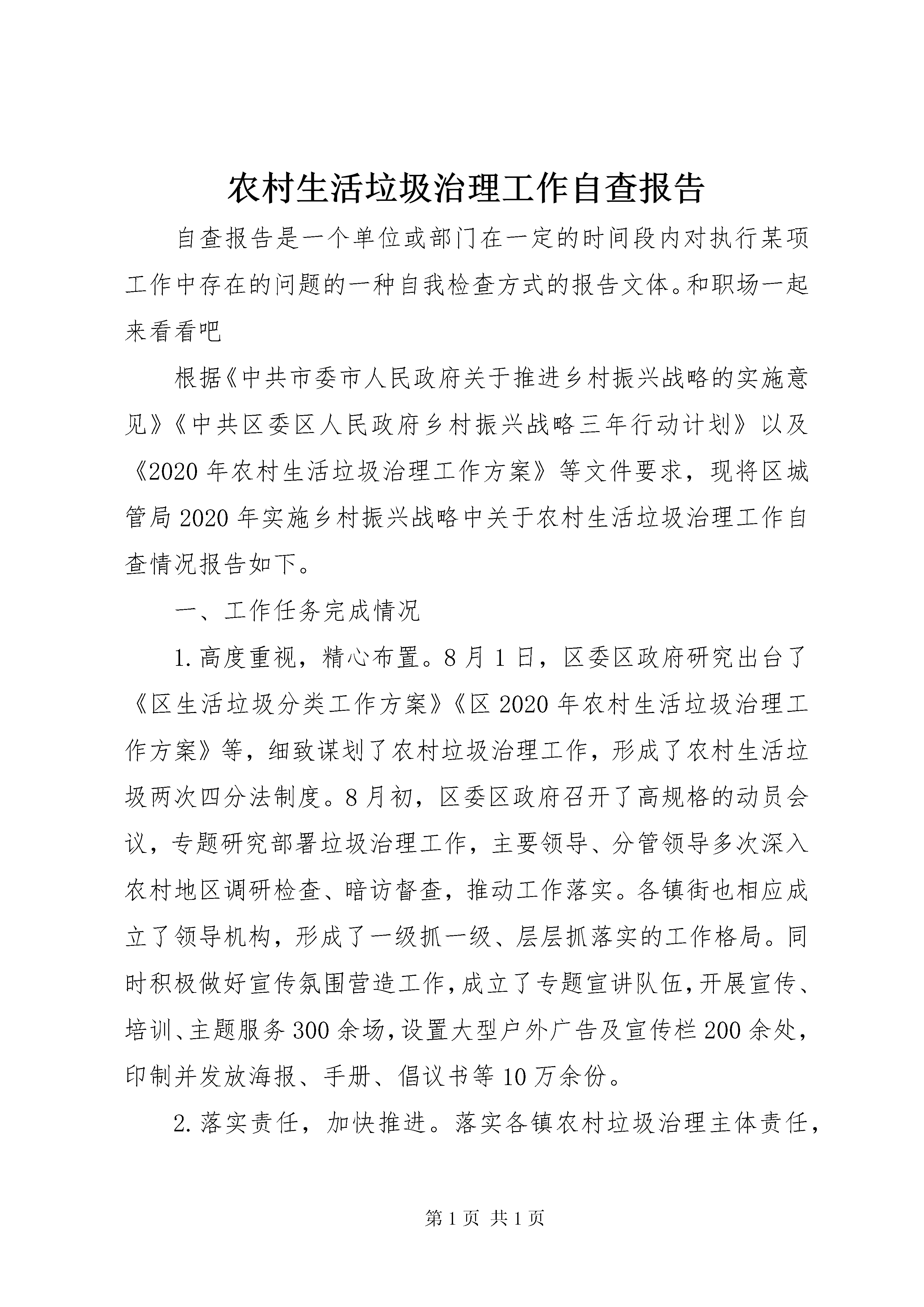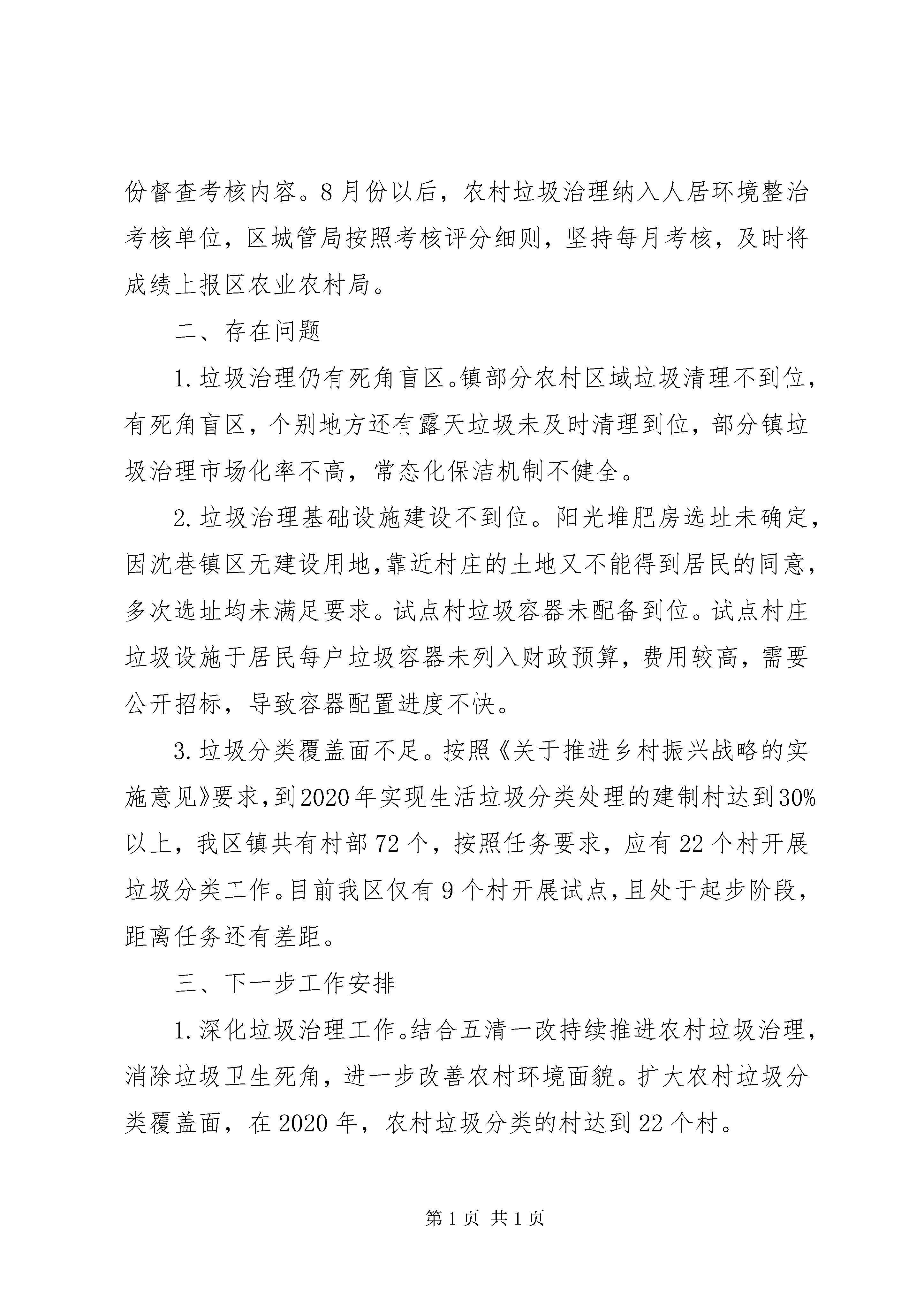 农村生活垃圾治理工作自查报告自查报告是一个单位或部门在一定的时间段内对执行某项工作中存在的问题的一种自我检查方式的报告文体。和职场一起来看看吧根据《中共市委市人民政府关于推进乡村振兴战略的实施意见》《中共区委区人民政府乡村振兴战略三年行动计划》以及《2020年农村生活垃圾治理工作方案》等文件要求,现将区城管局2020年实施乡村振兴战略中关于农村生活垃圾治理工作自查情况报告如下。一、工作任务完成情况1.高度重视,精心布置。8月1日,区委区政府研究出台了《区生活垃圾分类工作方案》《区2020年农村生活垃圾治理工作方案》等,细致谋划了农村垃圾治理工作,形成了农村生活垃圾两次四分法制度。8月初,区委区政府召开了高规格的动员会议,专题研究部署垃圾治理工作,主要领导、分管领导多次深入农村地区调研检查、暗访督查,推动工作落实。各镇街也相应成立了领导机构,形成了一级抓一级、层层抓落实的工作格局。同时积极做好宣传氛围营造工作,成立了专题宣讲队伍,开展宣传、培训、主题服务300余场,设置大型户外广告及宣传栏200余处,印制并发放海报、手册、倡议书等10万余份。2.落实责任,加快推进。落实各镇农村垃圾治理主体责任,明确城管局、农业农村局等成员单位责任分工,加快推进垃圾治理工作。一是开展垃圾死角集中清理行动。以村居、自然村为单位,组织人力和机械,清理积存垃圾,消除环境卫生脏乱差,新增生活垃圾日积日清,农村居民生活环境改善明显。二是无害化处理率超额完成。区农村人口约33.72万人,截止12月底,江北7座垃圾站累计处理生活垃圾5.75万吨(日均158吨),按照农村人均生活垃圾产生量0.4-0.6千克/人日计算,我区农村生活垃圾无害化处理率已达100%。三是市场化运行有序推进。镇均实行了农村垃圾治理市场化运作,年市场化投入费用1700余万元,四镇市场化率平均约60%,其中沈巷镇、二坝镇市场化率达95%以上。四是垃圾治理配套设施逐步完善。沈巷镇已启动阳光堆放房建设选址工作,4镇9个试点村生活垃圾分类实施和容器样品已采购,正在进行垃圾容器招标工作。加快推进环卫中转设施建设,计划在江北新建1座大型垃圾中转站(预计投入800万元,占地6亩),该项目已列入《区2020年政府性项目投资计划表》,预计2020年完成前期200万元的基础工作,2021年建成投入使用。3.常态考核,督促整改。1-5月份,依据《区2018年农村生活垃圾治理和农村厕所改造工作考评及奖补办法》,对镇农村垃圾治理情况逐月进行督查考核通报,兑现以奖代补资金115万元。对通报存在的问题,督促载体单位限期整改,并纳入下一月份督查考核内容。8月份以后,农村垃圾治理纳入人居环境整治考核单位,区城管局按照考核评分细则,坚持每月考核,及时将成绩上报区农业农村局。二、存在问题1.垃圾治理仍有死角盲区。镇部分农村区域垃圾清理不到位,有死角盲区,个别地方还有露天垃圾未及时清理到位,部分镇垃圾治理市场化率不高,常态化保洁机制不健全。2.垃圾治理基础设施建设不到位。阳光堆肥房选址未确定,因沈巷镇区无建设用地,靠近村庄的土地又不能得到居民的同意,多次选址均未满足要求。试点村垃圾容器未配备到位。试点村庄垃圾设施于居民每户垃圾容器未列入财政预算,费用较高,需要公开招标,导致容器配置进度不快。3.垃圾分类覆盖面不足。按照《关于推进乡村振兴战略的实施意见》要求,到2020年实现生活垃圾分类处理的建制村达到30%以上,我区镇共有村部72个,按照任务要求,应有22个村开展垃圾分类工作。目前我区仅有9个村开展试点,且处于起步阶段,距离任务还有差距。三、下一步工作安排1.深化垃圾治理工作。结合五清一改持续推进农村垃圾治理,消除垃圾卫生死角,进一步改善农村环境面貌。扩大农村垃圾分类覆盖面,在2020年,农村垃圾分类的村达到22个村。2.落实农村阳光堆肥房建设。试点村居至少建设一座阳光堆肥房,其他村居采取联建方式建设。3.足额配备垃圾容器。抓紧启动垃圾容器公开招标前期工作,确保2020年5月前,试点村垃圾容器配备到位。4.完善农村垃圾治理长效机制。运用市场化手段,提升农村地区农村垃圾治理市场化覆盖率,提升垃圾治理常态化工作水平,加快推进农村垃圾分类工作。