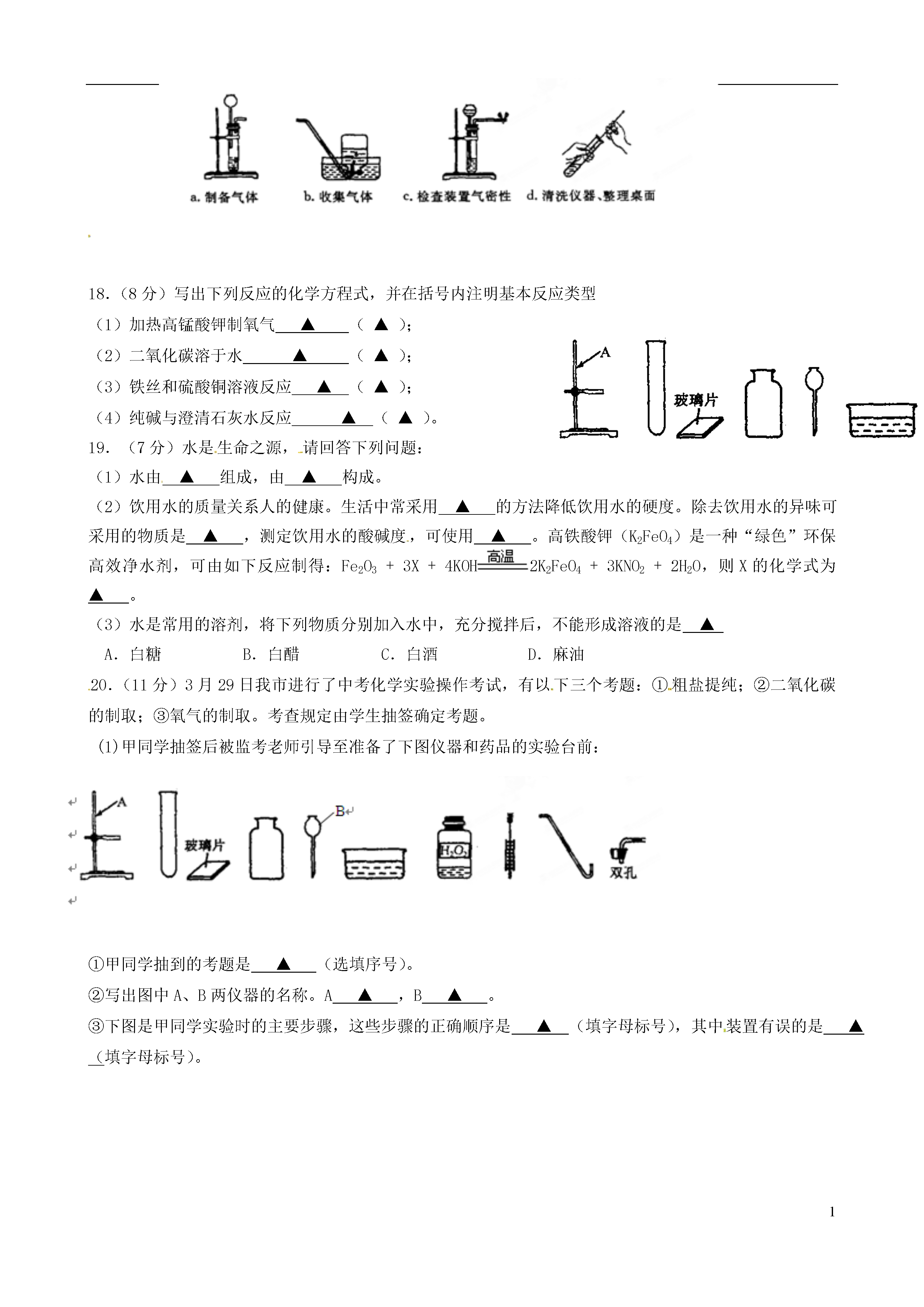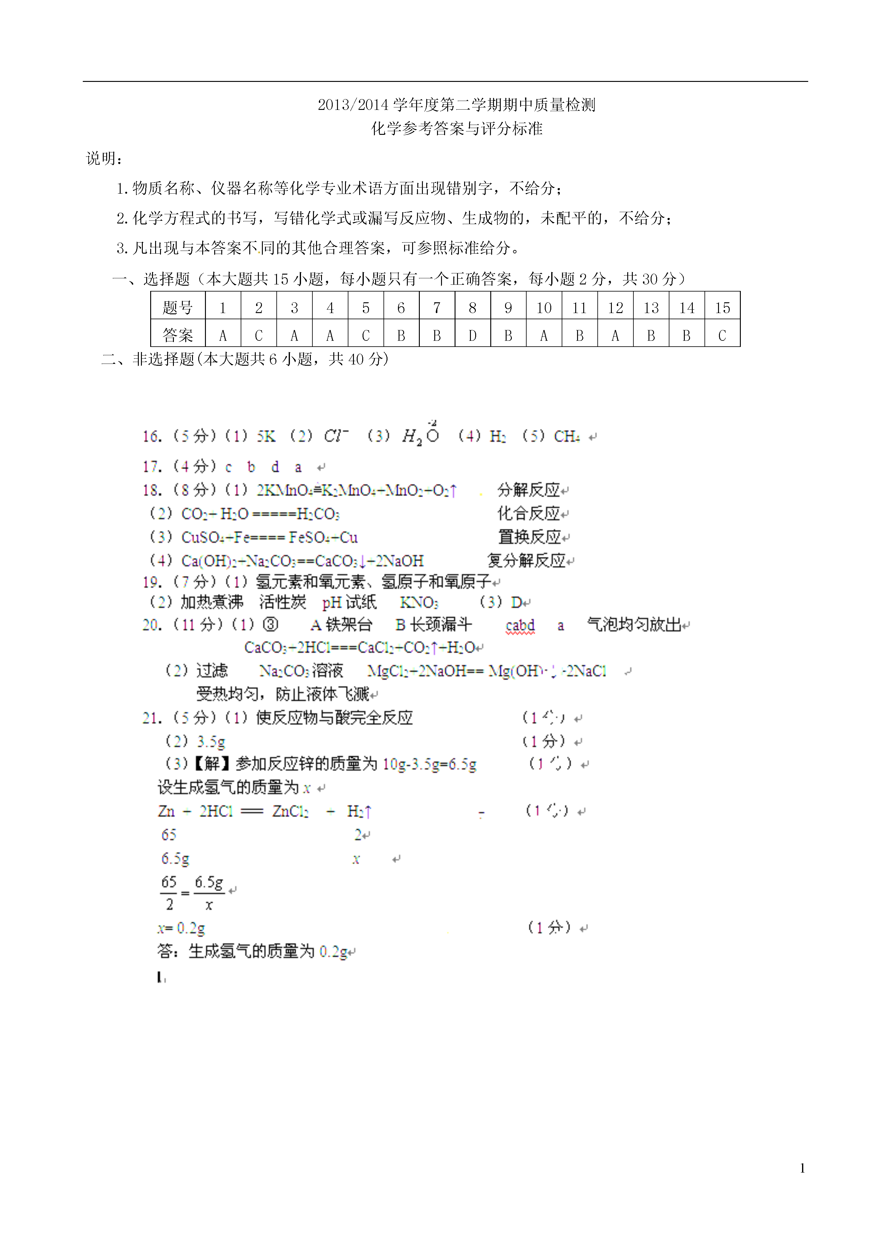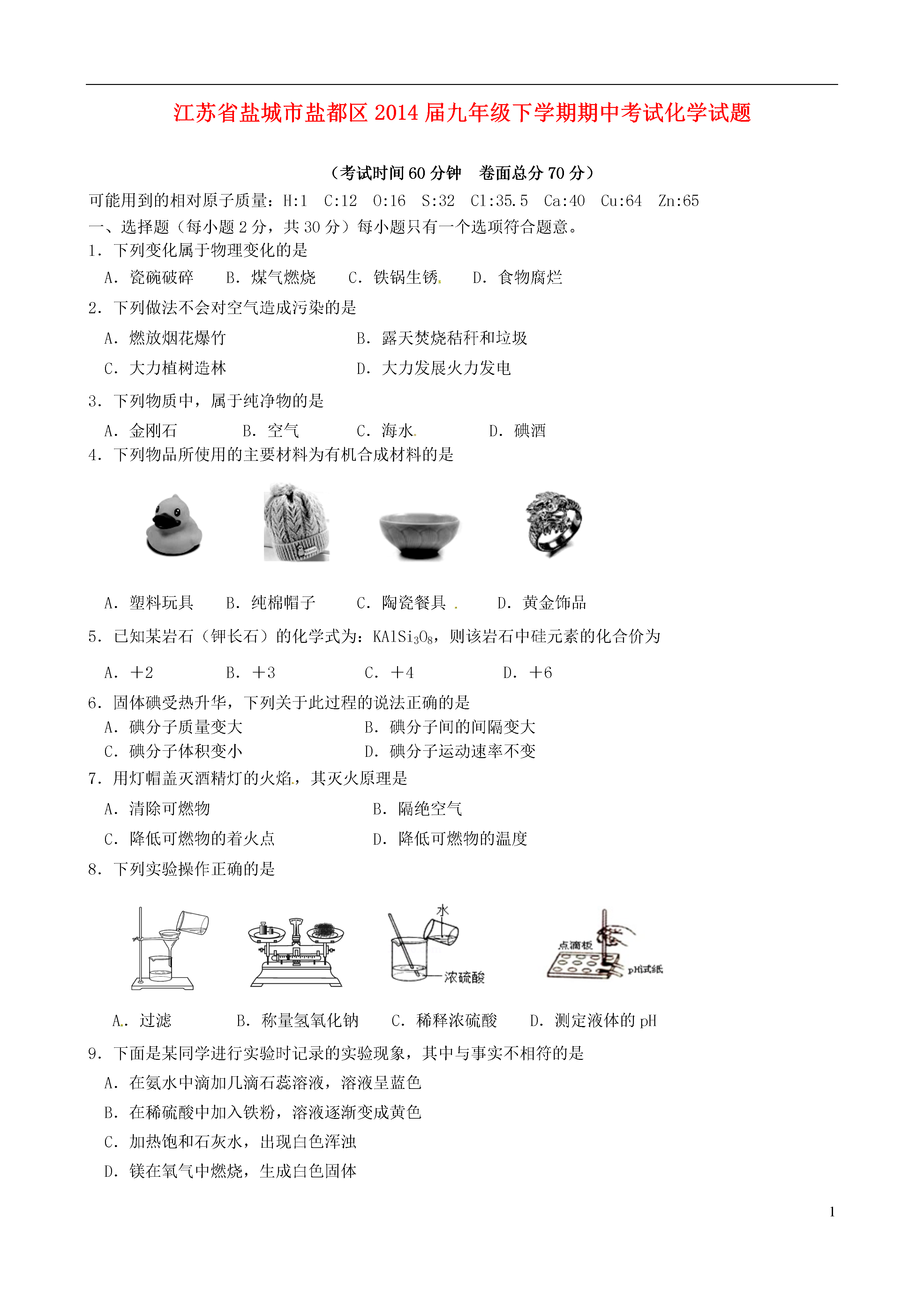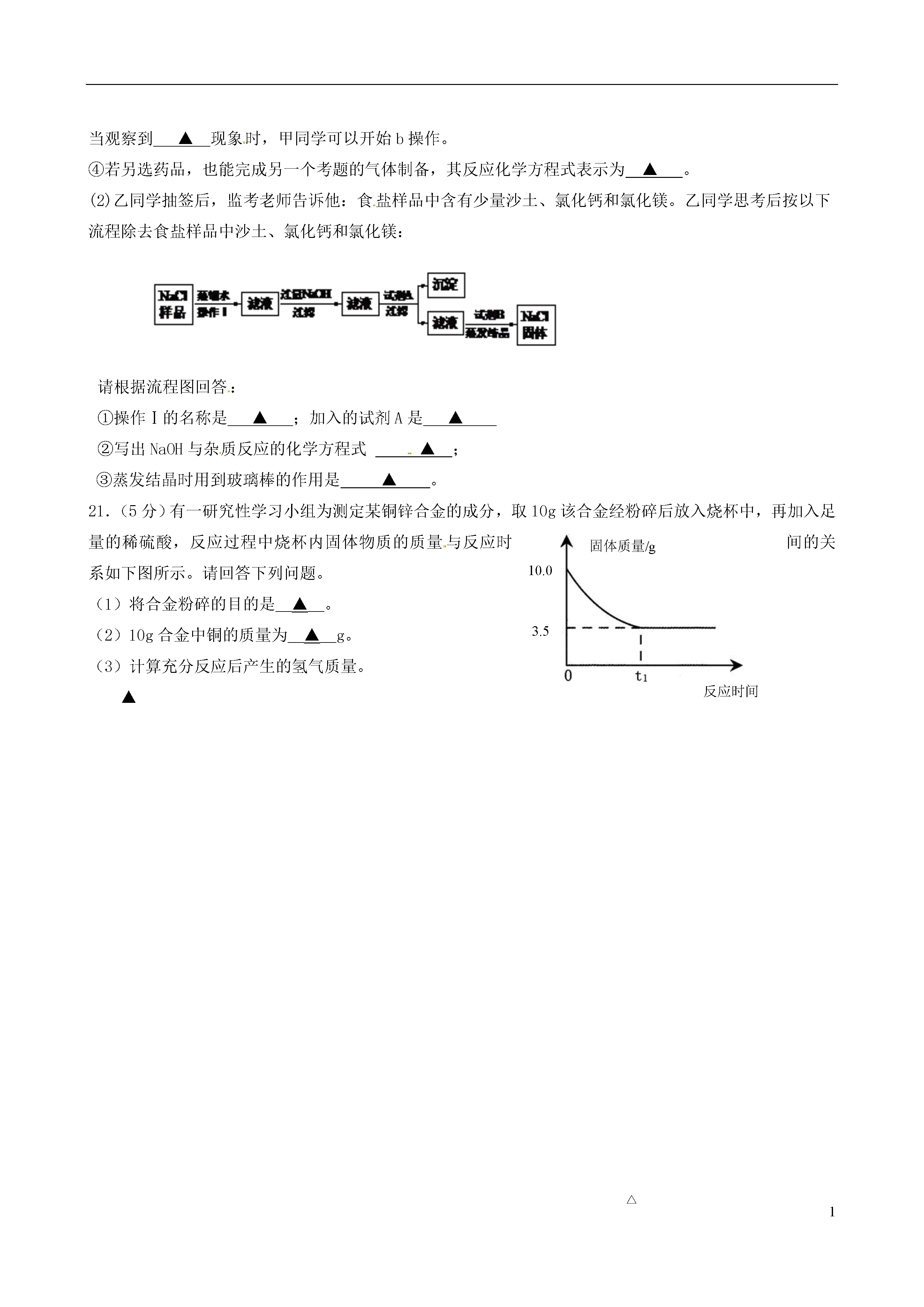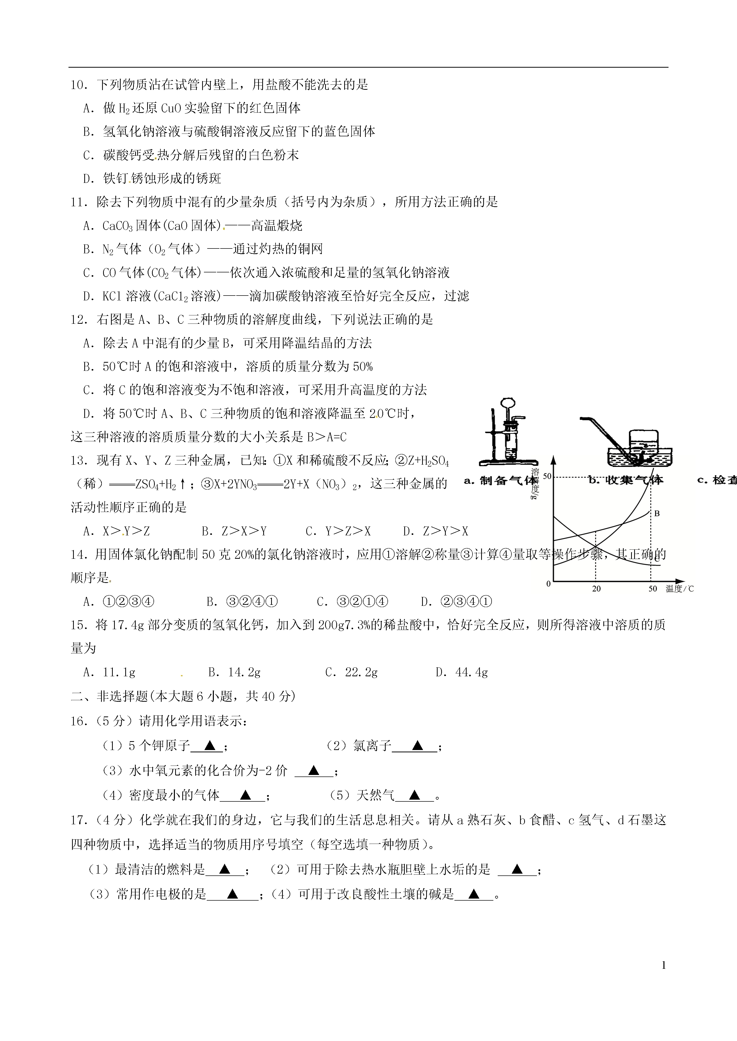 1江苏省盐城市盐都区2014届九年级下学期期中考试化学试题(考试时间60分钟卷面总分70分)可能用到的相对原子质量:H:1C:12O:16S:32Cl:35.5Ca:40Cu:64Zn:65一、选择题(每小题2分,共30分)每小题只有一个选项符合题意。1.下列变化属于物理变化的是A.瓷碗破碎B.煤气燃烧C.铁锅生锈D.食物腐烂2.下列做法不会对空气造成污染的是A.燃放烟花爆竹B.露天焚烧秸秆和垃圾C.大力植树造林D.大力发展火力发电3.下列物质中,属于纯净物的是A.金刚石B.空气C.海水D.碘酒4.下列物品所使用的主要材料为有机合成材料的是A.塑料玩具B.纯棉帽子C.陶瓷餐具D.黄金饰品5.已知某岩石(钾长石)的化学式为:KAlSi3O8,则该岩石中硅元素的化合价为A.+2B.+3C.+4D.+66.固体碘受热升华,下列关于此过程的说法正确的是A.碘分子质量变大B.碘分子间的间隔变大C.碘分子体积变小D.碘分子运动速率不变7.用灯帽盖灭酒精灯的火焰,其灭火原理是A.清除可燃物B.隔绝空气C.降低可燃物的着火点D.降低可燃物的温度8.下列实验操作正确的是A.过滤B.称量氢氧化钠C.稀释浓硫酸D.测定液体的pH9.下面是某同学进行实验时记录的实验现象,其中与事实不相符的是A.在氨水中滴加几滴石蕊溶液,溶液呈蓝色B.在稀硫酸中加入铁粉,溶液逐渐变成黄色C.加热饱和石灰水,出现白色浑浊D.镁在氧气中燃烧,生成白色固体10.下列物质沾在试管内壁上,用盐酸不能洗去的是A.做H2还原CuO实验留下的红色固体B.氢氧化钠溶液与硫酸铜溶液反应留下的蓝色固体C.碳酸钙受热分解后残留的白色粉末D.铁钉锈蚀形成的锈斑11.除去下列物质中混有的少量杂质(括号内为杂质),所用方法正确的是A.CaCO3固体(CaO固体)——高温煅烧B.N2气体(O2气体)——通过灼热的铜网C.CO气体(CO2气体)——依次通入浓硫酸和足量的氢氧化钠溶液D.KCl溶液(CaC12溶液)——滴加碳酸钠溶液至恰好完全反应,过滤12.右图是A、B、C三种物质的溶解度曲线,下列说法正确的是A.除去A中混有的少量B,可采用降温结晶的方法B.50℃时A的饱和溶液中,溶质的质量分数为50%C.将C的饱和溶液变为不饱和溶液,可采用升高温度的方法D.将50℃时A、B、C三种物质的饱和溶液降温至20℃时,这三种溶液的溶质质量分数的大小关系是B>A=C13.现有X、Y、Z三种金属,已知:①X和稀硫酸不反应;②Z+H2SO4(稀)ZSO4+H2↑;③X+2YNO32Y+X(NO3)2,这三种金属的活动性顺序正确的是A.X>Y>ZB.Z>X>YC.Y>Z>XD.Z>Y>X14.用固体氯化钠配制50克20%的氯化钠溶液时,应用①溶解②称量③计算④量取等操作步骤,其正确的顺序是A.①②③④B.③②④①C.③②①④D.②③④①15.将17.4g部分变质的氢氧化钙,加入到200g7.3%的稀盐酸中,恰好完全反应,则所得溶液中溶质的质量为A.11.1gB.14.2gC.22.2gD.44.4g二、非选择题(本大题6小题,共40分)16.(5分)请用化学用语表示:(1)5个钾原子▲;(2)氯离子▲;(3)水中氧元素的化合价为-2价▲;(4)密度最小的气体▲;(5)天然气▲。17.(4分)化学就在我们的身边,它与我们的生活息息相关。请从a熟石灰、b食醋、c氢气、d石墨这四种物质中,选择适当的物质用序号填空(每空选填一种物质)。(1)最清洁的燃料是▲;(2)可用于除去热水瓶胆壁上水垢的是▲;(3)常用作电极的是▲;(4)可用于改良酸性土壤的碱是▲。18.(8分)写出下列反应的化学方程式,并在括号内注明基本反应类型(1)加热高锰酸钾制氧气▲(▲);(2)二氧化碳溶于水▲(▲);(3)铁丝和硫酸铜溶液反应▲(▲);(4)纯碱与澄清石灰水反应▲(▲)。19.(7分)水是生命之源,请回答下列问题:(1)水由▲组成,由▲构成。(2)饮用水的质量关系人的健康。生活中常采用▲的方法降低饮用水的硬度。除去饮用水的异味可采用的物质是▲,测定饮用水的酸碱度,可使用▲。高铁酸钾(K2FeO4)是一种“绿色”环保高效净水剂,可由如下反应制得:Fe2O3+3X+4KOH2K2FeO4+3KNO2+2H2O,则X的化学式为▲。(3)水是常用的溶剂,将下列物质分别加入水中,充分搅拌后,不能形成溶液的是▲A.白糖B.白醋C.白酒D.麻油20.(11分)3月29日我市进行了中考化学实验操作考试,有以下三个考题:①粗盐提纯;②二氧化碳的制取;③氧气的制取。考查规定由学