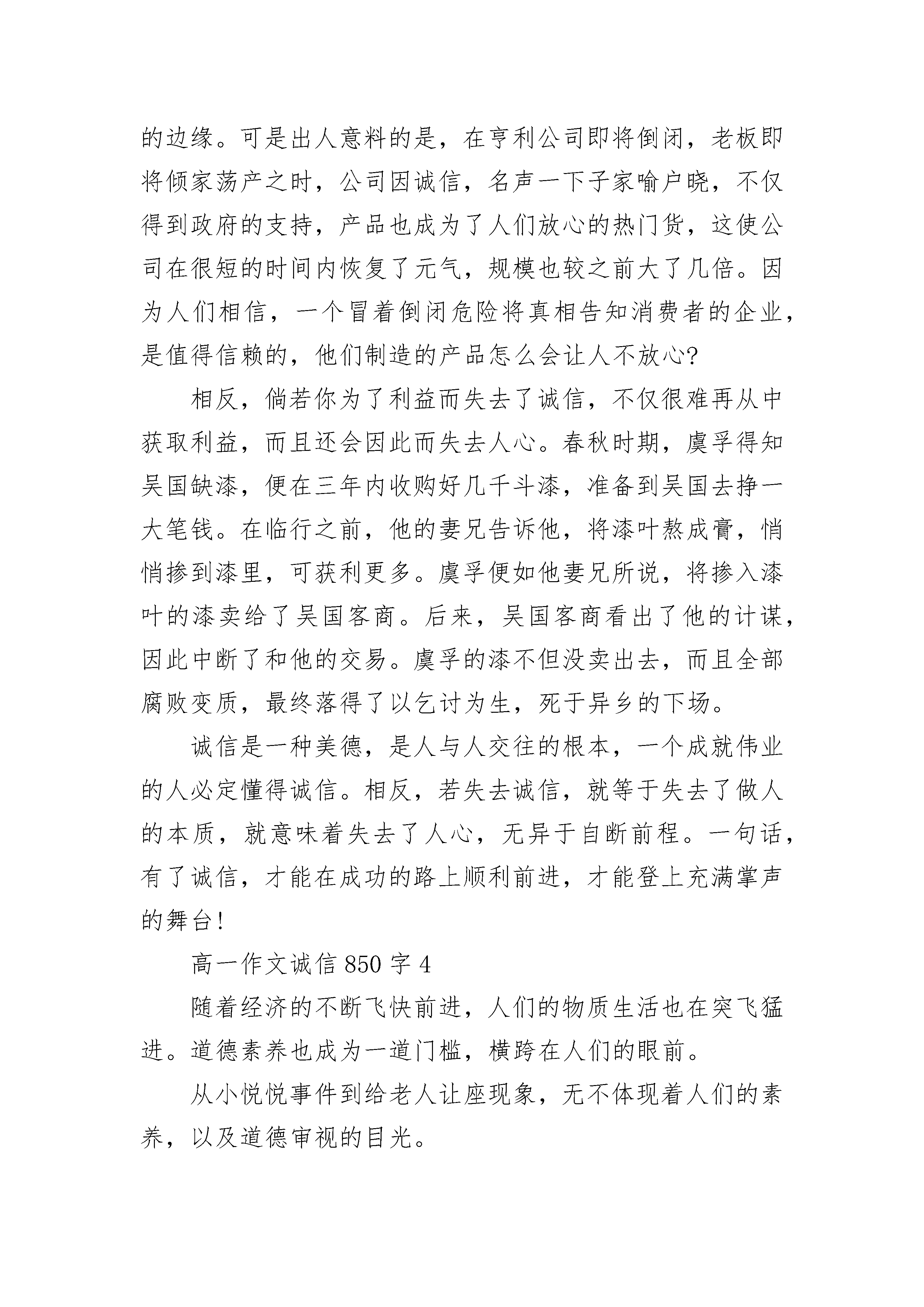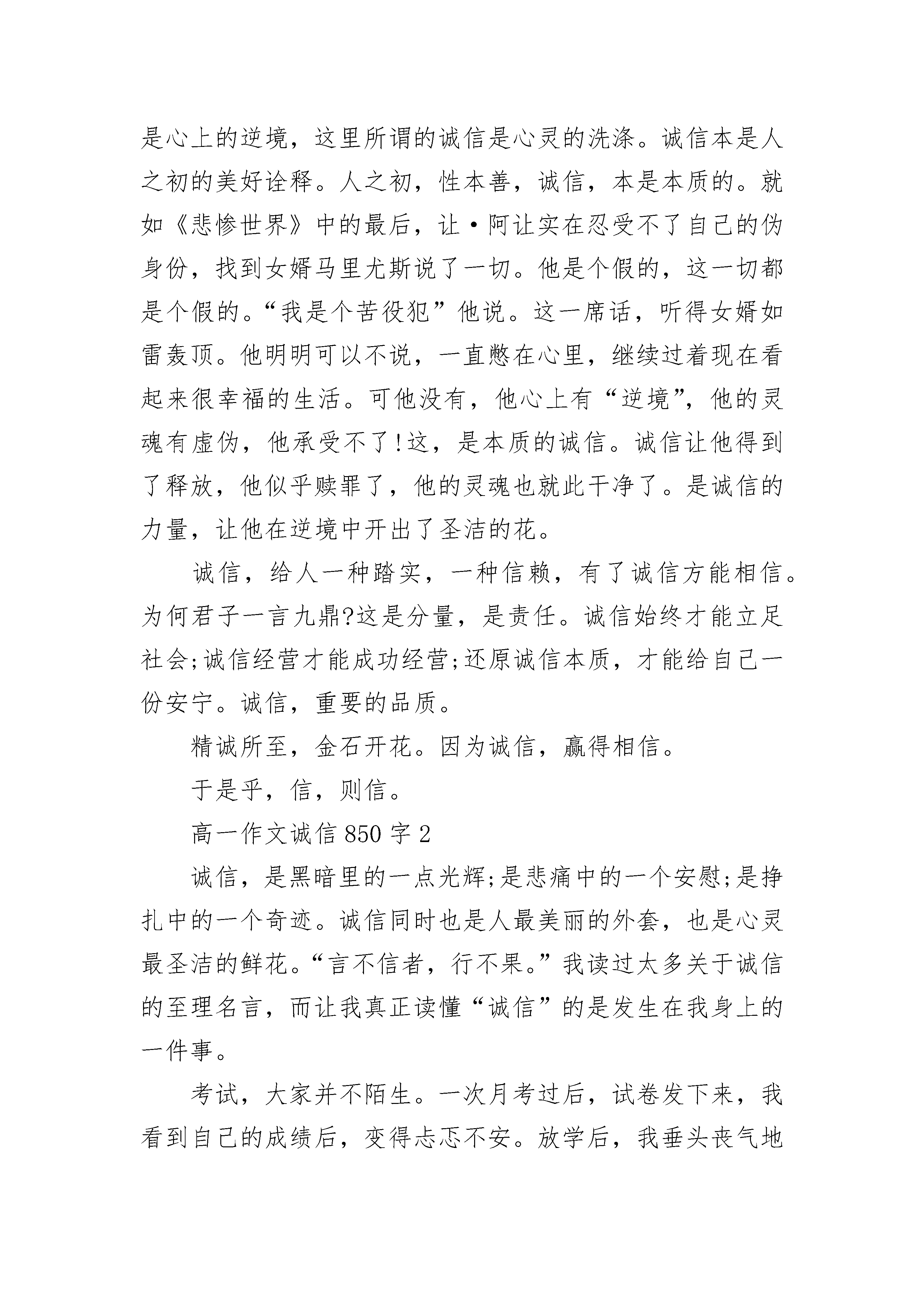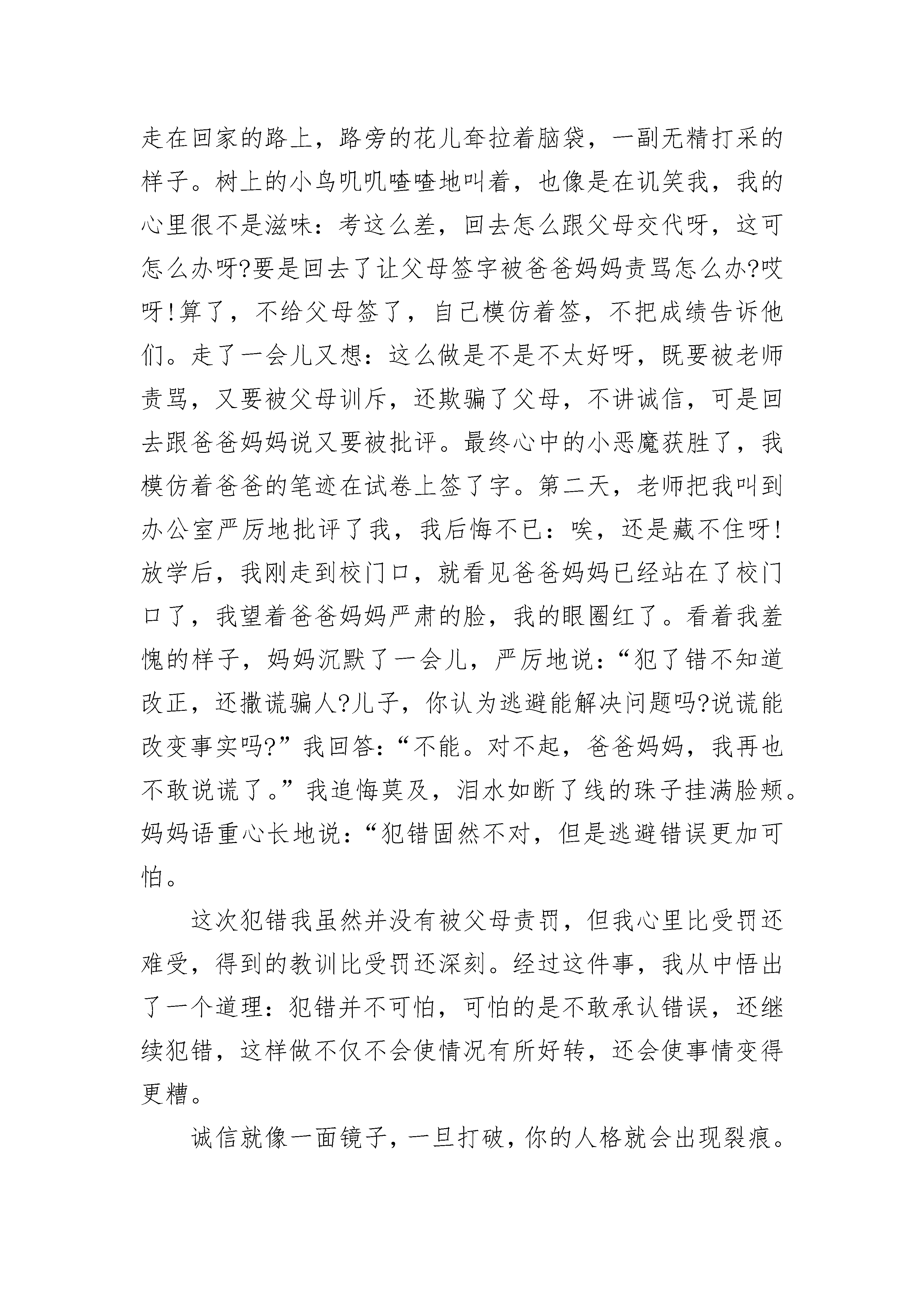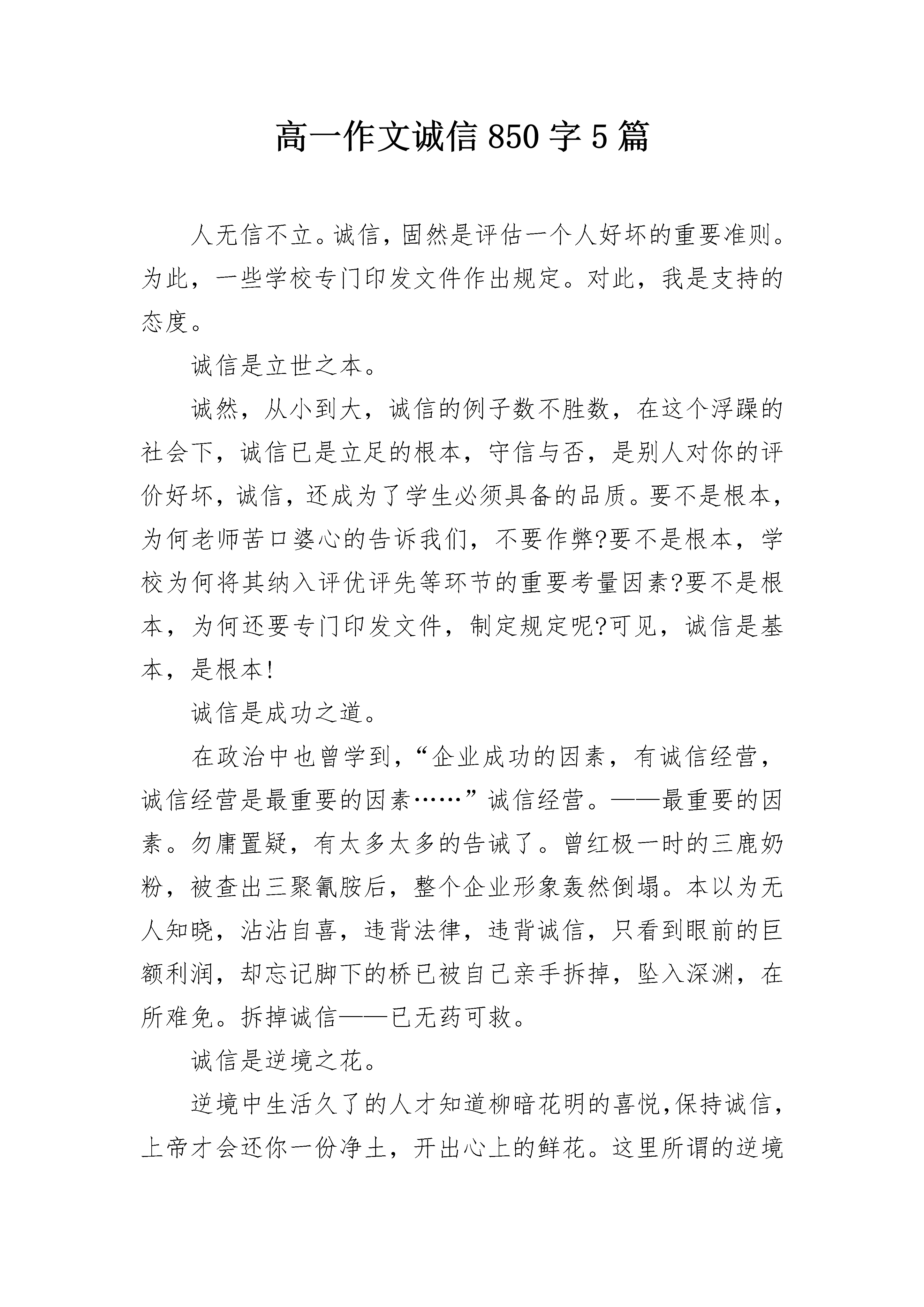 高一作文诚信850字5篇人无信不立。诚信,固然是评估一个人好坏的重要准则。为此,一些学校专门印发文件作出规定。对此,我是支持的态度。诚信是立世之本。诚然,从小到大,诚信的例子数不胜数,在这个浮躁的社会下,诚信已是立足的根本,守信与否,是别人对你的评价好坏,诚信,还成为了学生必须具备的品质。要不是根本,为何老师苦口婆心的告诉我们,不要作弊?要不是根本,学校为何将其纳入评优评先等环节的重要考量因素?要不是根本,为何还要专门印发文件,制定规定呢?可见,诚信是基本,是根本!诚信是成功之道。在政治中也曾学到,“企业成功的因素,有诚信经营,诚信经营是最重要的因素……”诚信经营。——最重要的因素。勿庸置疑,有太多太多的告诫了。曾红极一时的三鹿奶粉,被查出三聚氰胺后,整个企业形象轰然倒塌。本以为无人知晓,沾沾自喜,违背法律,违背诚信,只看到眼前的巨额利润,却忘记脚下的桥已被自己亲手拆掉,坠入深渊,在所难免。拆掉诚信——已无药可救。诚信是逆境之花。逆境中生活久了的人才知道柳暗花明的喜悦,保持诚信,上帝才会还你一份净土,开出心上的鲜花。这里所谓的逆境是心上的逆境,这里所谓的诚信是心灵的洗涤。诚信本是人之初的美好诠释。人之初,性本善,诚信,本是本质的。就如《悲惨世界》中的最后,让·阿让实在忍受不了自己的伪身份,找到女婿马里尤斯说了一切。他是个假的,这一切都是个假的。“我是个苦役犯”他说。这一席话,听得女婿如雷轰顶。他明明可以不说,一直憋在心里,继续过着现在看起来很幸福的生活。可他没有,他心上有“逆境”,他的灵魂有虚伪,他承受不了!这,是本质的诚信。诚信让他得到了释放,他似乎赎罪了,他的灵魂也就此干净了。是诚信的力量,让他在逆境中开出了圣洁的花。诚信,给人一种踏实,一种信赖,有了诚信方能相信。为何君子一言九鼎?这是分量,是责任。诚信始终才能立足社会;诚信经营才能成功经营;还原诚信本质,才能给自己一份安宁。诚信,重要的品质。精诚所至,金石开花。因为诚信,赢得相信。于是乎,信,则信。高一作文诚信850字2诚信,是黑暗里的一点光辉;是悲痛中的一个安慰;是挣扎中的一个奇迹。诚信同时也是人最美丽的外套,也是心灵最圣洁的鲜花。“言不信者,行不果。”我读过太多关于诚信的至理名言,而让我真正读懂“诚信”的是发生在我身上的一件事。考试,大家并不陌生。一次月考过后,试卷发下来,我看到自己的成绩后,变得忐忑不安。放学后,我垂头丧气地走在回家的路上,路旁的花儿耷拉着脑袋,一副无精打采的样子。树上的小鸟叽叽喳喳地叫着,也像是在讥笑我,我的心里很不是滋味:考这么差,回去怎么跟父母交代呀,这可怎么办呀?要是回去了让父母签字被爸爸妈妈责骂怎么办?哎呀!算了,不给父母签了,自己模仿着签,不把成绩告诉他们。走了一会儿又想:这么做是不是不太好呀,既要被老师责骂,又要被父母训斥,还欺骗了父母,不讲诚信,可是回去跟爸爸妈妈说又要被批评。最终心中的小恶魔获胜了,我模仿着爸爸的笔迹在试卷上签了字。第二天,老师把我叫到办公室严厉地批评了我,我后悔不已:唉,还是藏不住呀!放学后,我刚走到校门口,就看见爸爸妈妈已经站在了校门口了,我望着爸爸妈妈严肃的脸,我的眼圈红了。看着我羞愧的样子,妈妈沉默了一会儿,严厉地说:“犯了错不知道改正,还撒谎骗人?儿子,你认为逃避能解决问题吗?说谎能改变事实吗?”我回答:“不能。对不起,爸爸妈妈,我再也不敢说谎了。”我追悔莫及,泪水如断了线的珠子挂满脸颊。妈妈语重心长地说:“犯错固然不对,但是逃避错误更加可怕。这次犯错我虽然并没有被父母责罚,但我心里比受罚还难受,得到的教训比受罚还深刻。经过这件事,我从中悟出了一个道理:犯错并不可怕,可怕的是不敢承认错误,还继续犯错,这样做不仅不会使情况有所好转,还会使事情变得更糟。诚信就像一面镜子,一旦打破,你的人格就会出现裂痕。对于诚信的人,最高奖赏是公众的赞美,最大的收获是心灵的踏实宁静。诚信是个人成功的基石,更是我们生生不息的民族之魂!我们应该让诚信的接力棒代代相传!高一作文诚信850字3古语有云:“不精不诚,不能动人”,也就是我们俗话所说的“精诚所至,金石为开”,这说明诚信对于人与人之间的交往是起到很大的作用的。因此,我认为,诚信是人生不可或缺的一门必修课。纵观古今中外,大凡取得过重大成就的人,往往都是懂得诚信的重要性的人。倘若你遇到了困难,只要你有诚信,你的朋友们都会想尽一切办法来帮助你。曾经有一个小男孩儿在街上卖火柴,一位绅士买完后发现没有零钱,小男孩儿便主动去给绅士换零钱,但是在回来的路上,被马车撞成重伤。当绅士来探望他时,小男孩儿哭着对绅士说:“对不起,我没能及时将零钱给您送回去,我失信了。”绅士被他的诚信所感动,当了解到他的父母双亡生活困顿时,毅然决定把他生活所需的一切费用都承担起来。即便你走在人生的下坡路,只要你