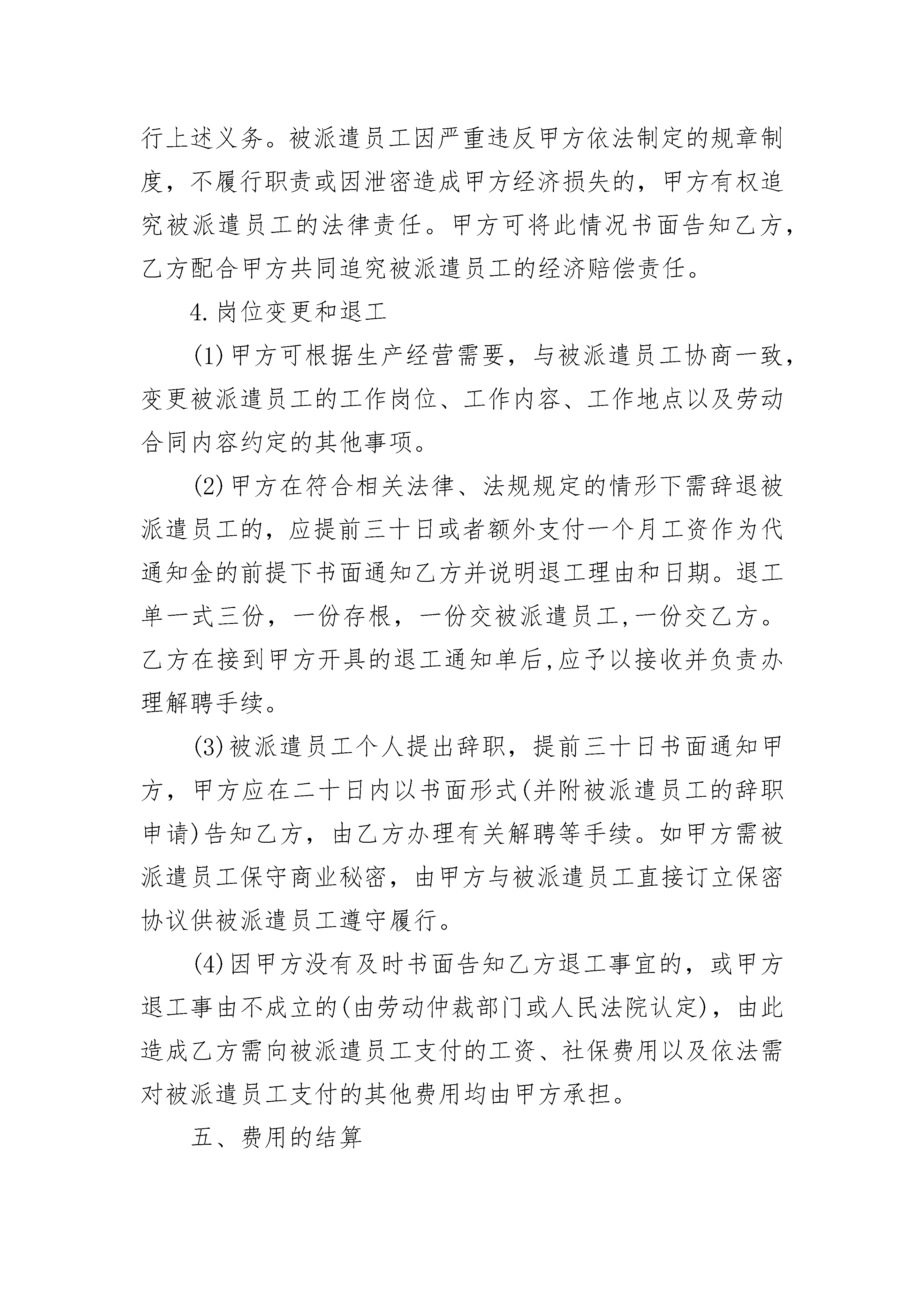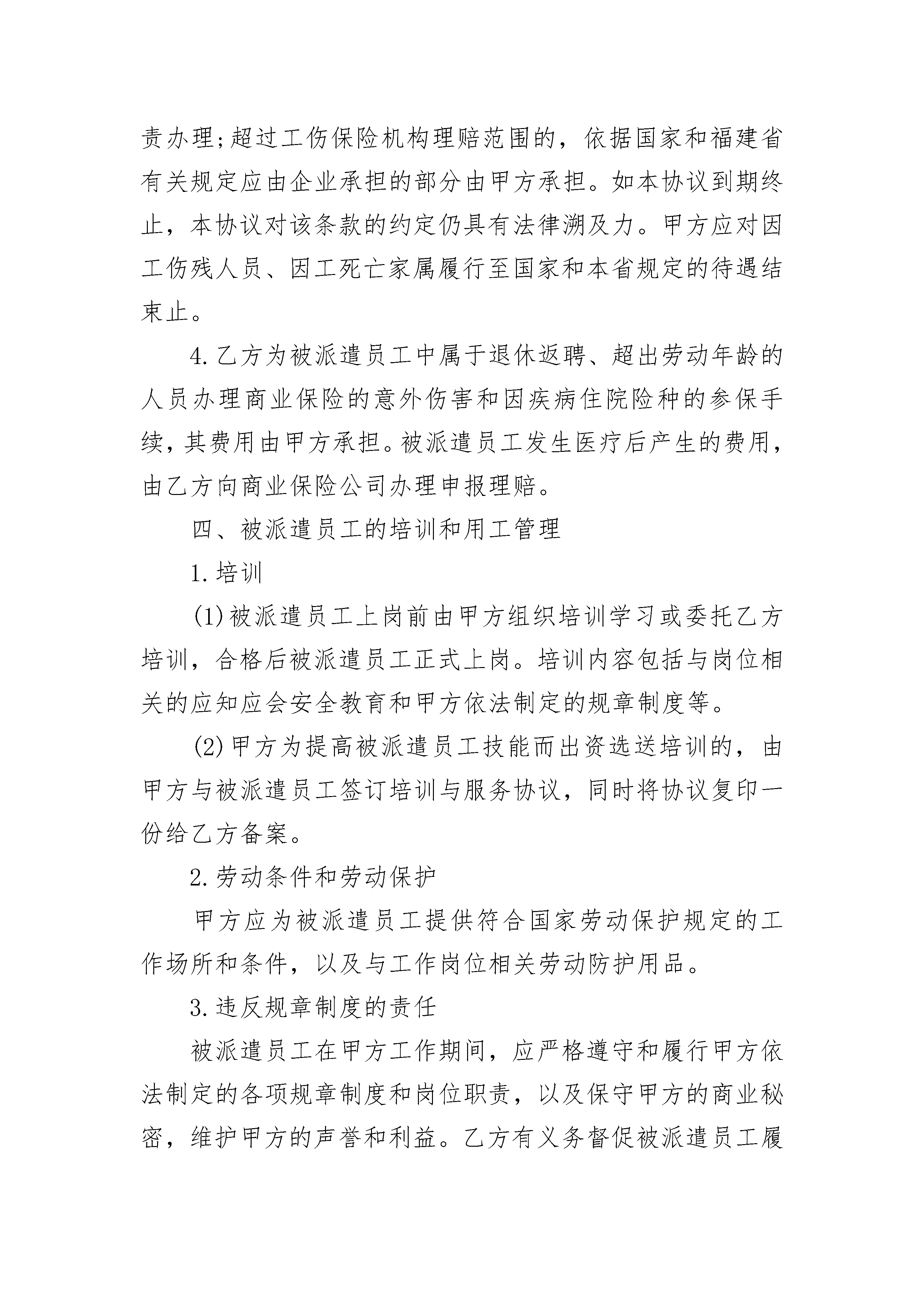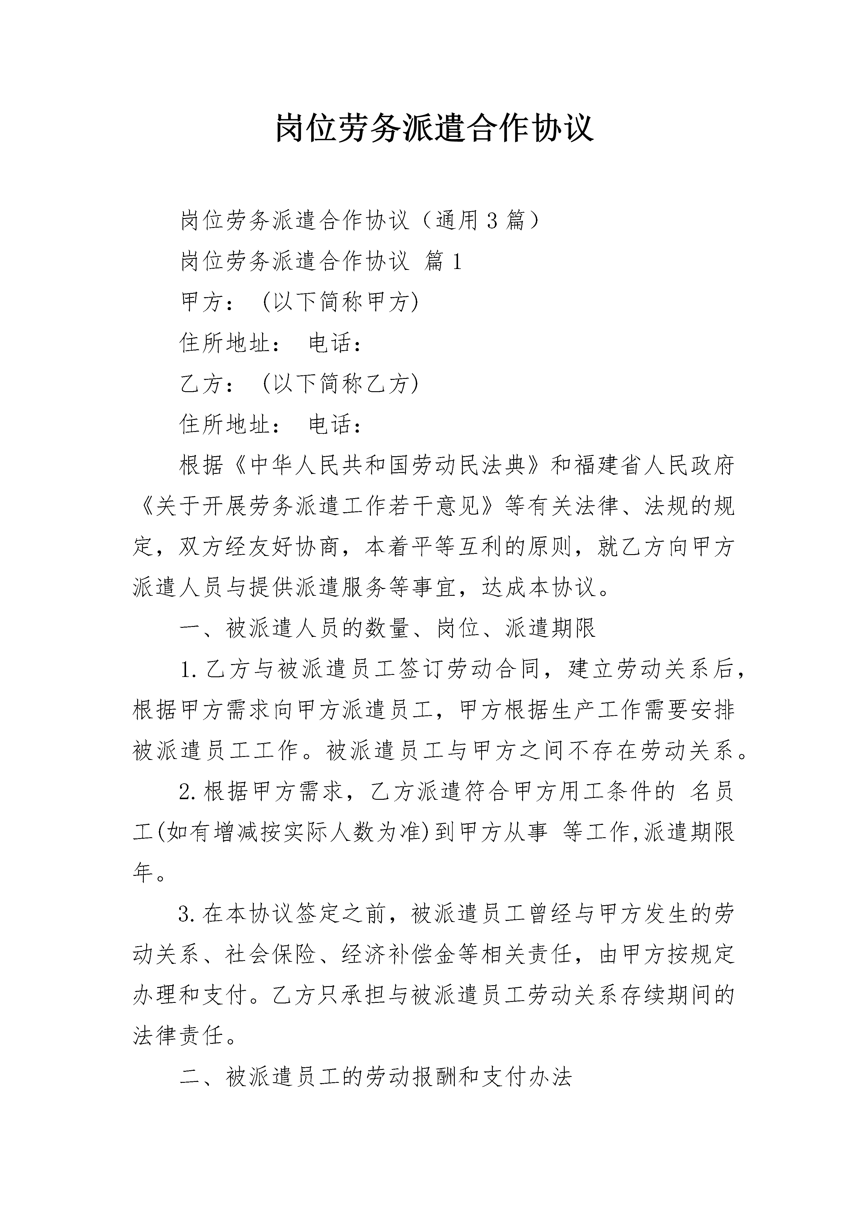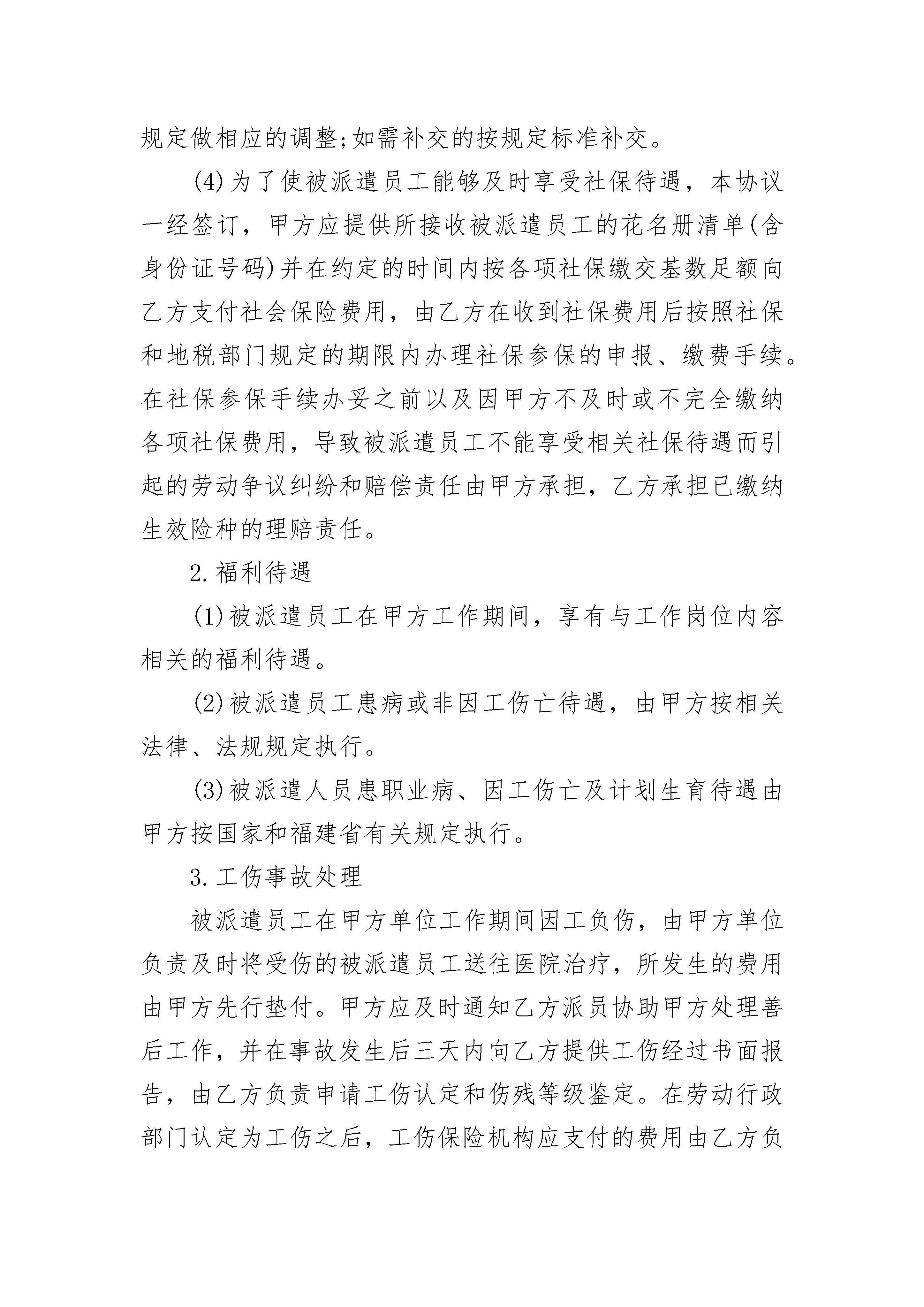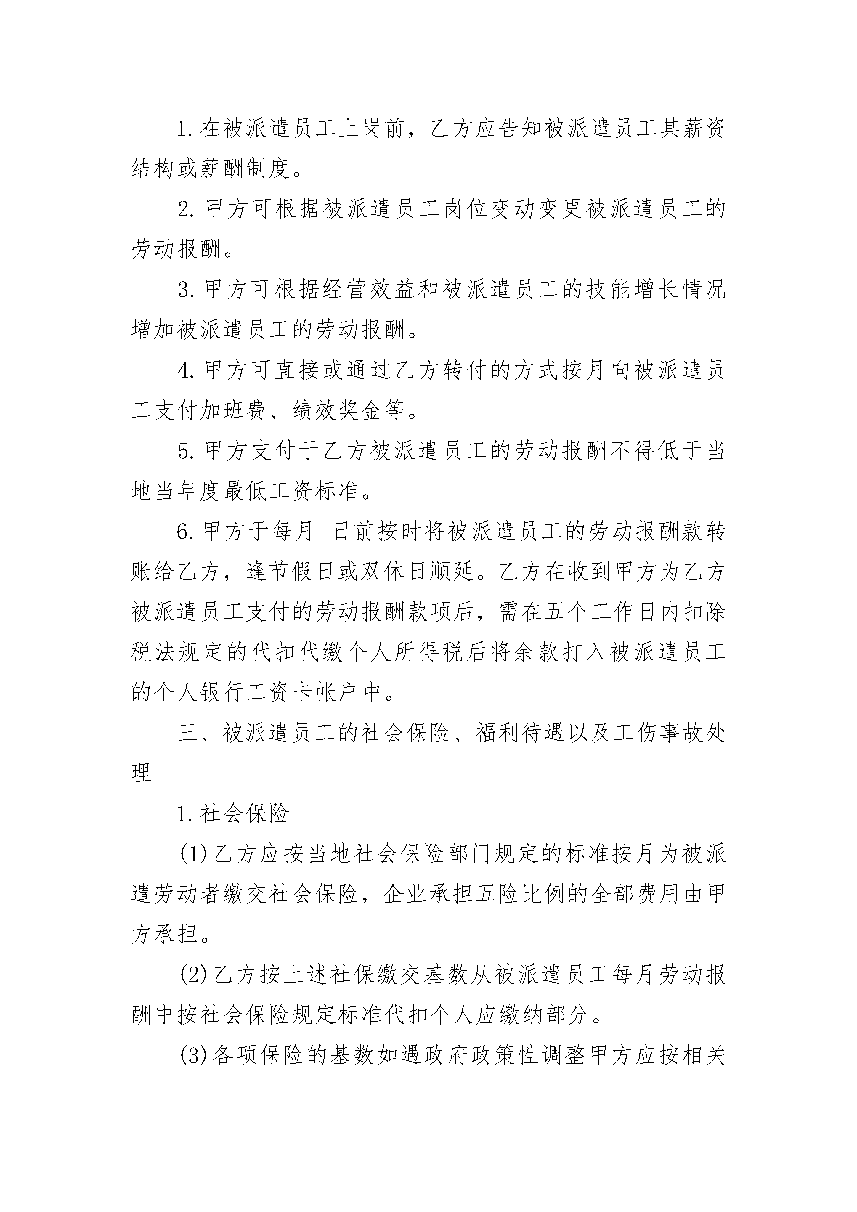 岗位劳务派遣合作协议岗位劳务派遣合作协议(通用3篇)岗位劳务派遣合作协议篇1甲方:(以下简称甲方)住所地址:电话:乙方:(以下简称乙方)住所地址:电话:根据《中华人民共和国劳动民法典》和福建省人民政府《关于开展劳务派遣工作若干意见》等有关法律、法规的规定,双方经友好协商,本着平等互利的原则,就乙方向甲方派遣人员与提供派遣服务等事宜,达成本协议。一、被派遣人员的数量、岗位、派遣期限1.乙方与被派遣员工签订劳动合同,建立劳动关系后,根据甲方需求向甲方派遣员工,甲方根据生产工作需要安排被派遣员工工作。被派遣员工与甲方之间不存在劳动关系。2.根据甲方需求,乙方派遣符合甲方用工条件的名员工(如有增减按实际人数为准)到甲方从事等工作,派遣期限年。3.在本协议签定之前,被派遣员工曾经与甲方发生的劳动关系、社会保险、经济补偿金等相关责任,由甲方按规定办理和支付。乙方只承担与被派遣员工劳动关系存续期间的法律责任。二、被派遣员工的劳动报酬和支付办法1.在被派遣员工上岗前,乙方应告知被派遣员工其薪资结构或薪酬制度。2.甲方可根据被派遣员工岗位变动变更被派遣员工的劳动报酬。3.甲方可根据经营效益和被派遣员工的技能增长情况增加被派遣员工的劳动报酬。4.甲方可直接或通过乙方转付的方式按月向被派遣员工支付加班费、绩效奖金等。5.甲方支付于乙方被派遣员工的劳动报酬不得低于当地当年度最低工资标准。6.甲方于每月日前按时将被派遣员工的劳动报酬款转账给乙方,逢节假日或双休日顺延。乙方在收到甲方为乙方被派遣员工支付的劳动报酬款项后,需在五个工作日内扣除税法规定的代扣代缴个人所得税后将余款打入被派遣员工的个人银行工资卡帐户中。三、被派遣员工的社会保险、福利待遇以及工伤事故处理1.社会保险(1)乙方应按当地社会保险部门规定的标准按月为被派遣劳动者缴交社会保险,企业承担五险比例的全部费用由甲方承担。(2)乙方按上述社保缴交基数从被派遣员工每月劳动报酬中按社会保险规定标准代扣个人应缴纳部分。(3)各项保险的基数如遇政府政策性调整甲方应按相关规定做相应的调整;如需补交的按规定标准补交。(4)为了使被派遣员工能够及时享受社保待遇,本协议一经签订,甲方应提供所接收被派遣员工的花名册清单(含身份证号码)并在约定的时间内按各项社保缴交基数足额向乙方支付社会保险费用,由乙方在收到社保费用后按照社保和地税部门规定的期限内办理社保参保的申报、缴费手续。在社保参保手续办妥之前以及因甲方不及时或不完全缴纳各项社保费用,导致被派遣员工不能享受相关社保待遇而引起的劳动争议纠纷和赔偿责任由甲方承担,乙方承担已缴纳生效险种的理赔责任。2.福利待遇(1)被派遣员工在甲方工作期间,享有与工作岗位内容相关的福利待遇。(2)被派遣员工患病或非因工伤亡待遇,由甲方按相关法律、法规规定执行。(3)被派遣人员患职业病、因工伤亡及计划生育待遇由甲方按国家和福建省有关规定执行。3.工伤事故处理被派遣员工在甲方单位工作期间因工负伤,由甲方单位负责及时将受伤的被派遣员工送往医院治疗,所发生的费用由甲方先行垫付。甲方应及时通知乙方派员协助甲方处理善后工作,并在事故发生后三天内向乙方提供工伤经过书面报告,由乙方负责申请工伤认定和伤残等级鉴定。在劳动行政部门认定为工伤之后,工伤保险机构应支付的费用由乙方负责办理;超过工伤保险机构理赔范围的,依据国家和福建省有关规定应由企业承担的部分由甲方承担。如本协议到期终止,本协议对该条款的约定仍具有法律溯及力。甲方应对因工伤残人员、因工死亡家属履行至国家和本省规定的待遇结束止。4.乙方为被派遣员工中属于退休返聘、超出劳动年龄的人员办理商业保险的意外伤害和因疾病住院险种的参保手续,其费用由甲方承担。被派遣员工发生医疗后产生的费用,由乙方向商业保险公司办理申报理赔。四、被派遣员工的培训和用工管理1.培训(1)被派遣员工上岗前由甲方组织培训学习或委托乙方培训,合格后被派遣员工正式上岗。培训内容包括与岗位相关的应知应会安全教育和甲方依法制定的规章制度等。(2)甲方为提高被派遣员工技能而出资选送培训的,由甲方与被派遣员工签订培训与服务协议,同时将协议复印一份给乙方备案。2.劳动条件和劳动保护甲方应为被派遣员工提供符合国家劳动保护规定的工作场所和条件,以及与工作岗位相关劳动防护用品。3.违反规章制度的责任被派遣员工在甲方工作期间,应严格遵守和履行甲方依法制定的各项规章制度和岗位职责,以及保守甲方的商业秘密,维护甲方的声誉和利益。乙方有义务督促被派遣员工履行上述义务。被派遣员工因严重违反甲方依法制定的规章制度,不履行职责或因泄密造成甲方经济损失的,甲方有权追究被派遣员工的法律责任。甲方可将此情况书面告知乙方,乙方配合甲方共同追究被派遣员工的经济赔偿责任。4.岗位变更和退工(1)甲方可根据生产经营需要,