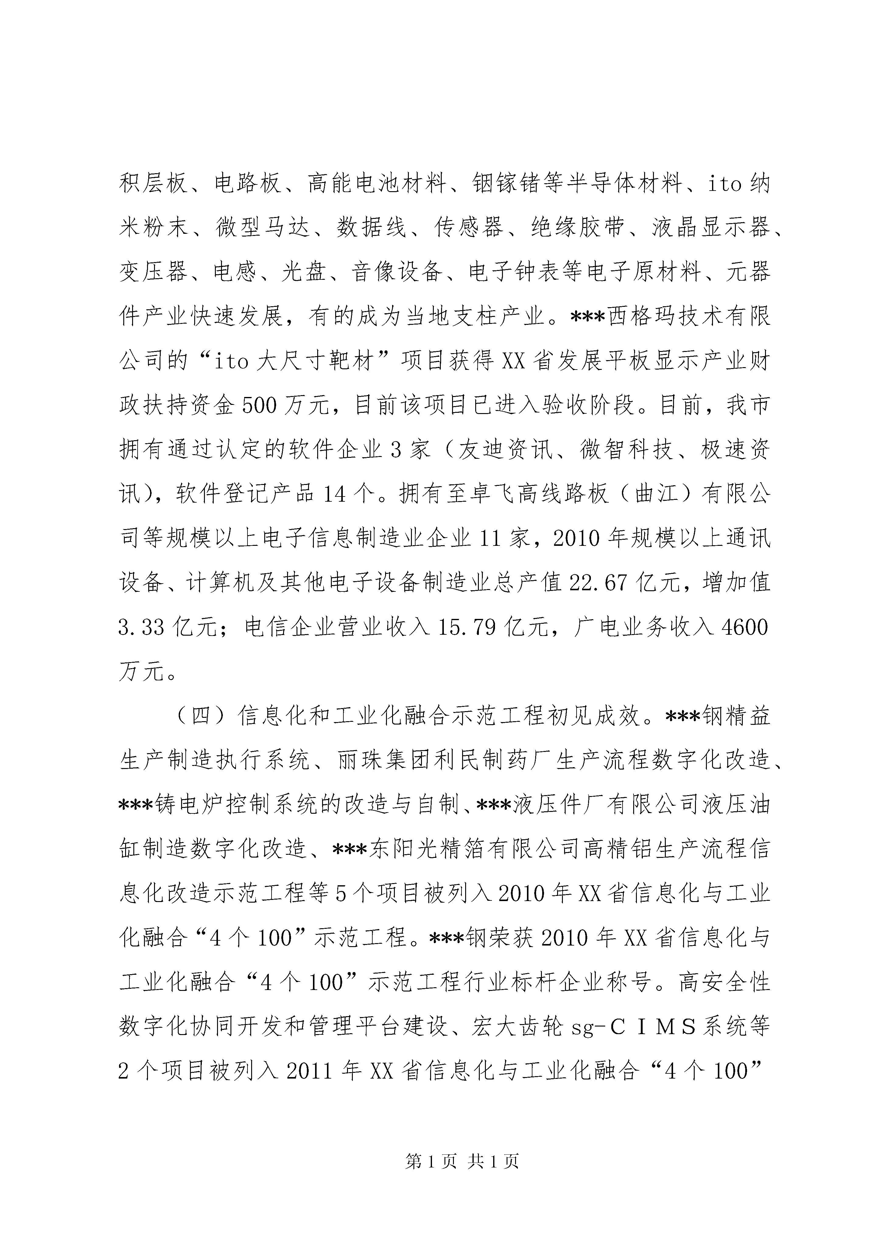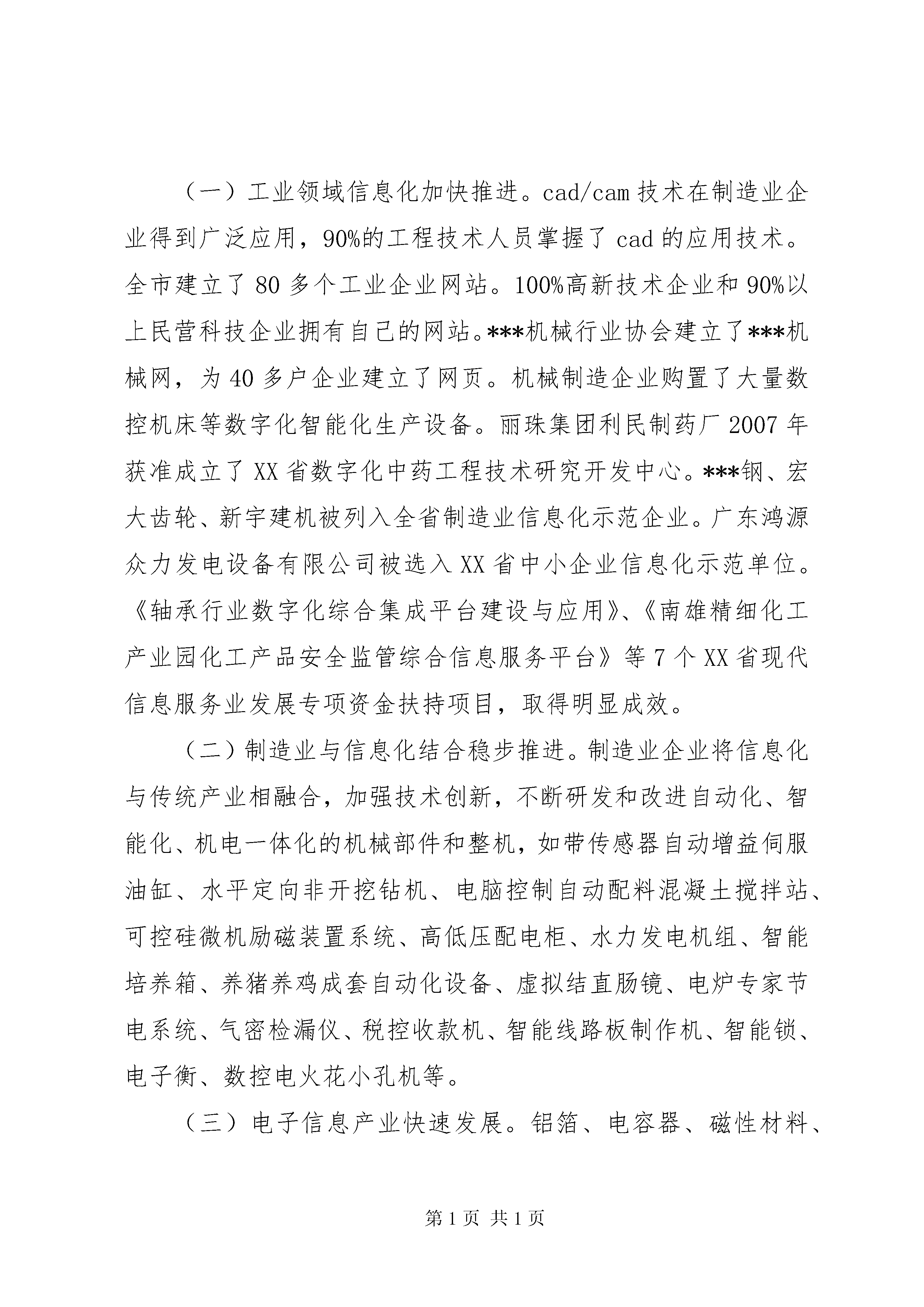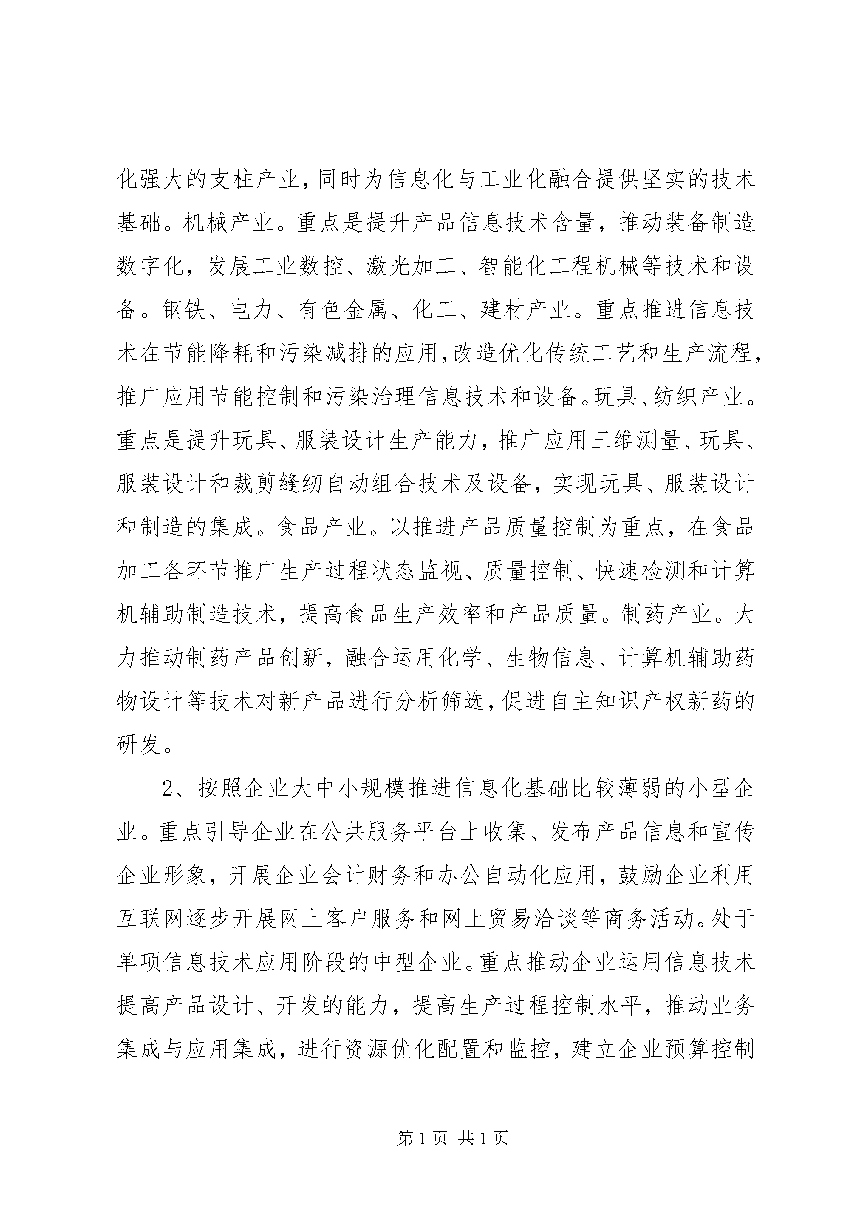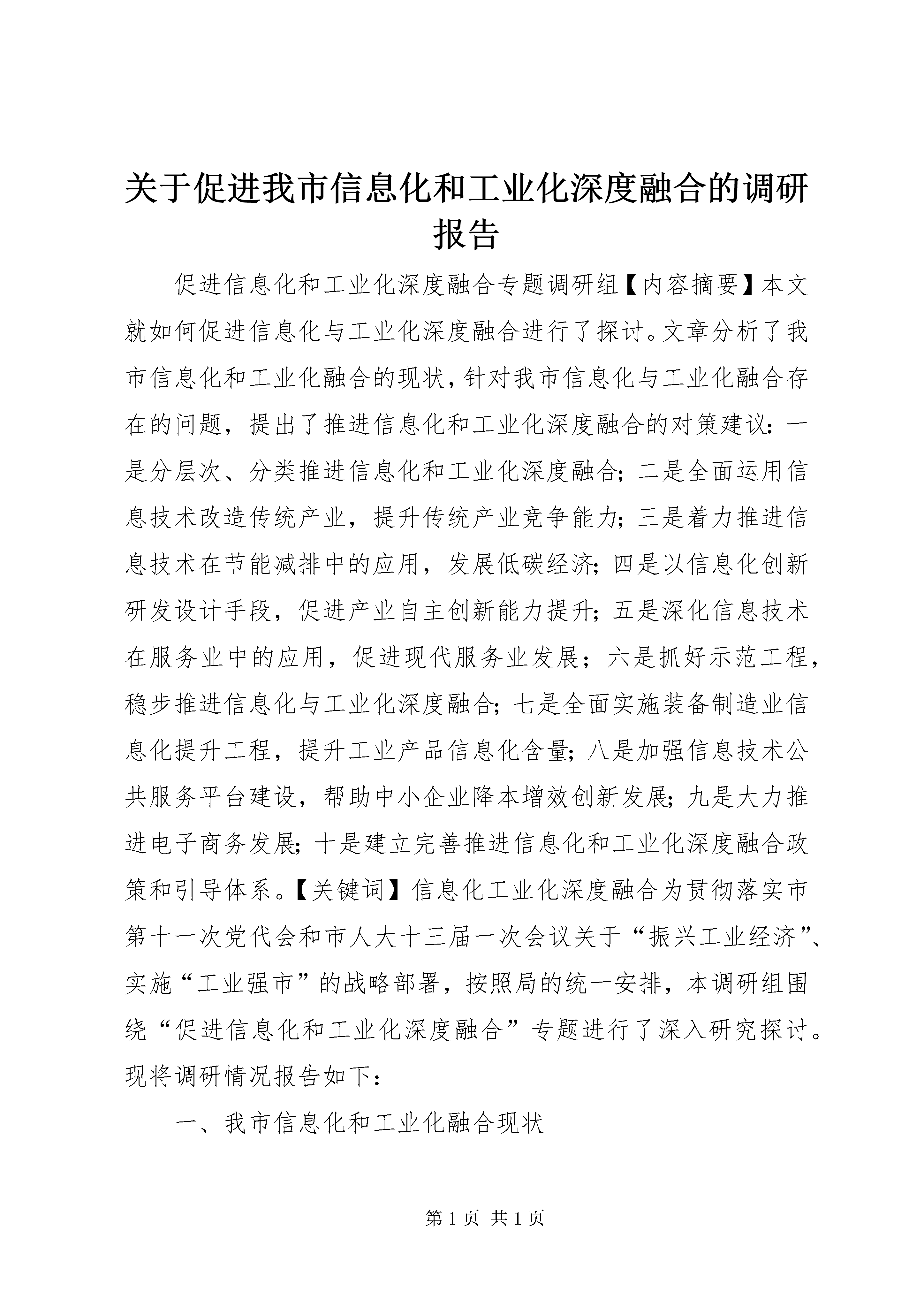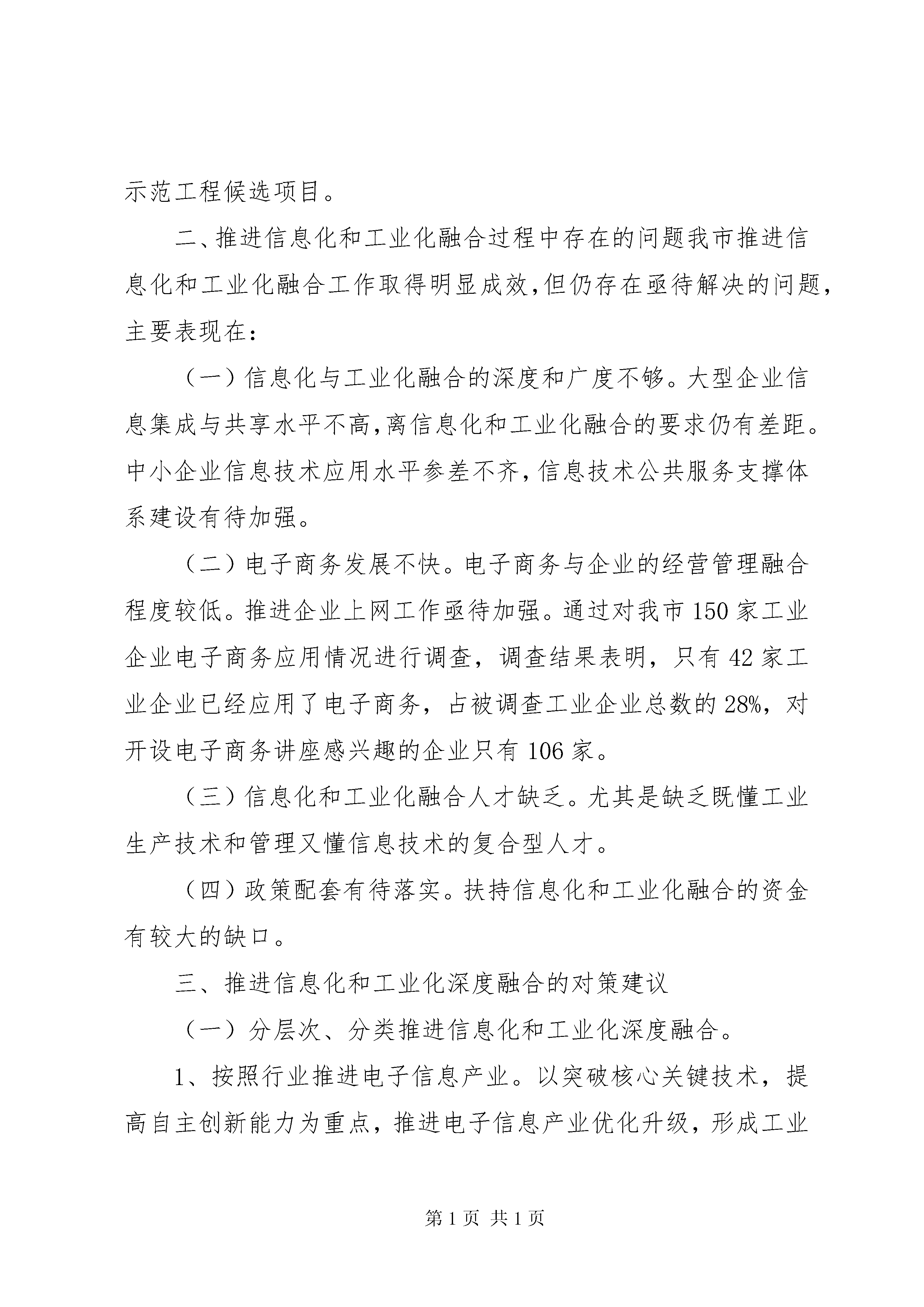 关于促进我市信息化和工业化深度融合的调研报告促进信息化和工业化深度融合专题调研组【内容摘要】本文就如何促进信息化与工业化深度融合进行了探讨。文章分析了我市信息化和工业化融合的现状,针对我市信息化与工业化融合存在的问题,提出了推进信息化和工业化深度融合的对策建议:一是分层次、分类推进信息化和工业化深度融合;二是全面运用信息技术改造传统产业,提升传统产业竞争能力;三是着力推进信息技术在节能减排中的应用,发展低碳经济;四是以信息化创新研发设计手段,促进产业自主创新能力提升;五是深化信息技术在服务业中的应用,促进现代服务业发展;六是抓好示范工程,稳步推进信息化与工业化深度融合;七是全面实施装备制造业信息化提升工程,提升工业产品信息化含量;八是加强信息技术公共服务平台建设,帮助中小企业降本增效创新发展;九是大力推进电子商务发展;十是建立完善推进信息化和工业化深度融合政策和引导体系。【关键词】信息化工业化深度融合为贯彻落实市第十一次党代会和市人大十三届一次会议关于“振兴工业经济”、实施“工业强市”的战略部署,按照局的统一安排,本调研组围绕“促进信息化和工业化深度融合”专题进行了深入研究探讨。现将调研情况报告如下:一、我市信息化和工业化融合现状(一)工业领域信息化加快推进。cad/cam技术在制造业企业得到广泛应用,90%的工程技术人员掌握了cad的应用技术。全市建立了80多个工业企业网站。100%高新技术企业和90%以上民营科技企业拥有自己的网站。***机械行业协会建立了***机械网,为40多户企业建立了网页。机械制造企业购置了大量数控机床等数字化智能化生产设备。丽珠集团利民制药厂2007年获准成立了XX省数字化中药工程技术研究开发中心。***钢、宏大齿轮、新宇建机被列入全省制造业信息化示范企业。广东鸿源众力发电设备有限公司被选入XX省中小企业信息化示范单位。《轴承行业数字化综合集成平台建设与应用》、《南雄精细化工产业园化工产品安全监管综合信息服务平台》等7个XX省现代信息服务业发展专项资金扶持项目,取得明显成效。(二)制造业与信息化结合稳步推进。制造业企业将信息化与传统产业相融合,加强技术创新,不断研发和改进自动化、智能化、机电一体化的机械部件和整机,如带传感器自动增益伺服油缸、水平定向非开挖钻机、电脑控制自动配料混凝土搅拌站、可控硅微机励磁装置系统、高低压配电柜、水力发电机组、智能培养箱、养猪养鸡成套自动化设备、虚拟结直肠镜、电炉专家节电系统、气密检漏仪、税控收款机、智能线路板制作机、智能锁、电子衡、数控电火花小孔机等。(三)电子信息产业快速发展。铝箔、电容器、磁性材料、积层板、电路板、高能电池材料、铟镓锗等半导体材料、ito纳米粉末、微型马达、数据线、传感器、绝缘胶带、液晶显示器、变压器、电感、光盘、音像设备、电子钟表等电子原材料、元器件产业快速发展,有的成为当地支柱产业。***西格玛技术有限公司的“ito大尺寸靶材”项目获得XX省发展平板显示产业财政扶持资金500万元,目前该项目已进入验收阶段。目前,我市拥有通过认定的软件企业3家(友迪资讯、微智科技、极速资讯),软件登记产品14个。拥有至卓飞高线路板(曲江)有限公司等规模以上电子信息制造业企业11家,2010年规模以上通讯设备、计算机及其他电子设备制造业总产值22.67亿元,增加值3.33亿元;电信企业营业收入15.79亿元,广电业务收入4600万元。(四)信息化和工业化融合示范工程初见成效。***钢精益生产制造执行系统、丽珠集团利民制药厂生产流程数字化改造、***铸电炉控制系统的改造与自制、***液压件厂有限公司液压油缸制造数字化改造、***东阳光精箔有限公司高精铝生产流程信息化改造示范工程等5个项目被列入2010年XX省信息化与工业化融合“4个100”示范工程。***钢荣获2010年XX省信息化与工业化融合“4个100”示范工程行业标杆企业称号。高安全性数字化协同开发和管理平台建设、宏大齿轮sg-CIMS系统等2个项目被列入2011年XX省信息化与工业化融合“4个100”示范工程候选项目。二、推进信息化和工业化融合过程中存在的问题我市推进信息化和工业化融合工作取得明显成效,但仍存在亟待解决的问题,主要表现在:(一)信息化与工业化融合的深度和广度不够。大型企业信息集成与共享水平不高,离信息化和工业化融合的要求仍有差距。中小企业信息技术应用水平参差不齐,信息技术公共服务支撑体系建设有待加强。(二)电子商务发展不快。电子商务与企业的经营管理融合程度较低。推进企业上网工作亟待加强。通过对我市150家工业企业电子商务应用情况进行调查,调查结果表明,只有42家工业企业已经应用了电子商务,占被调查工业企业总数的28%,对开设电子商务讲座感兴趣的企业只有106家。(