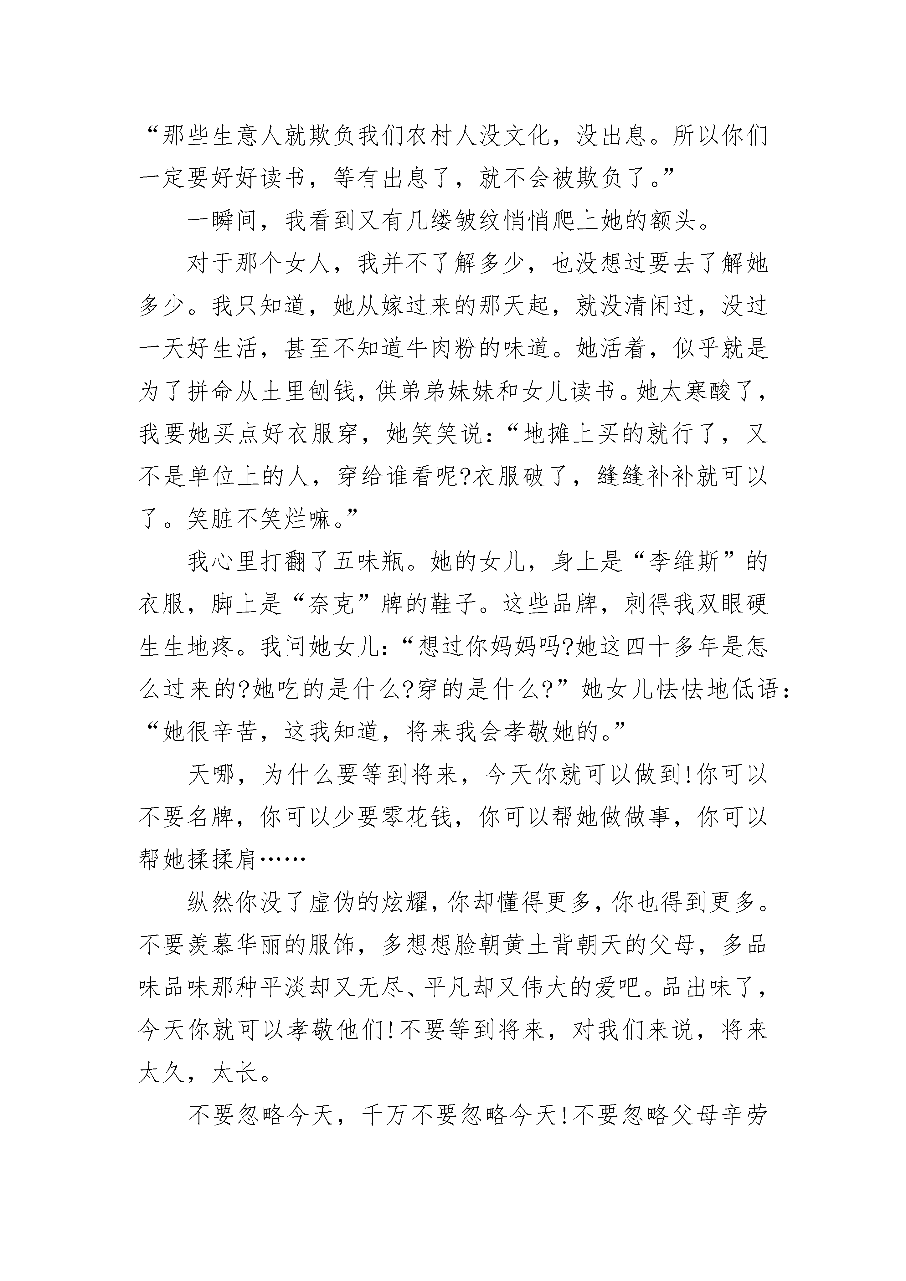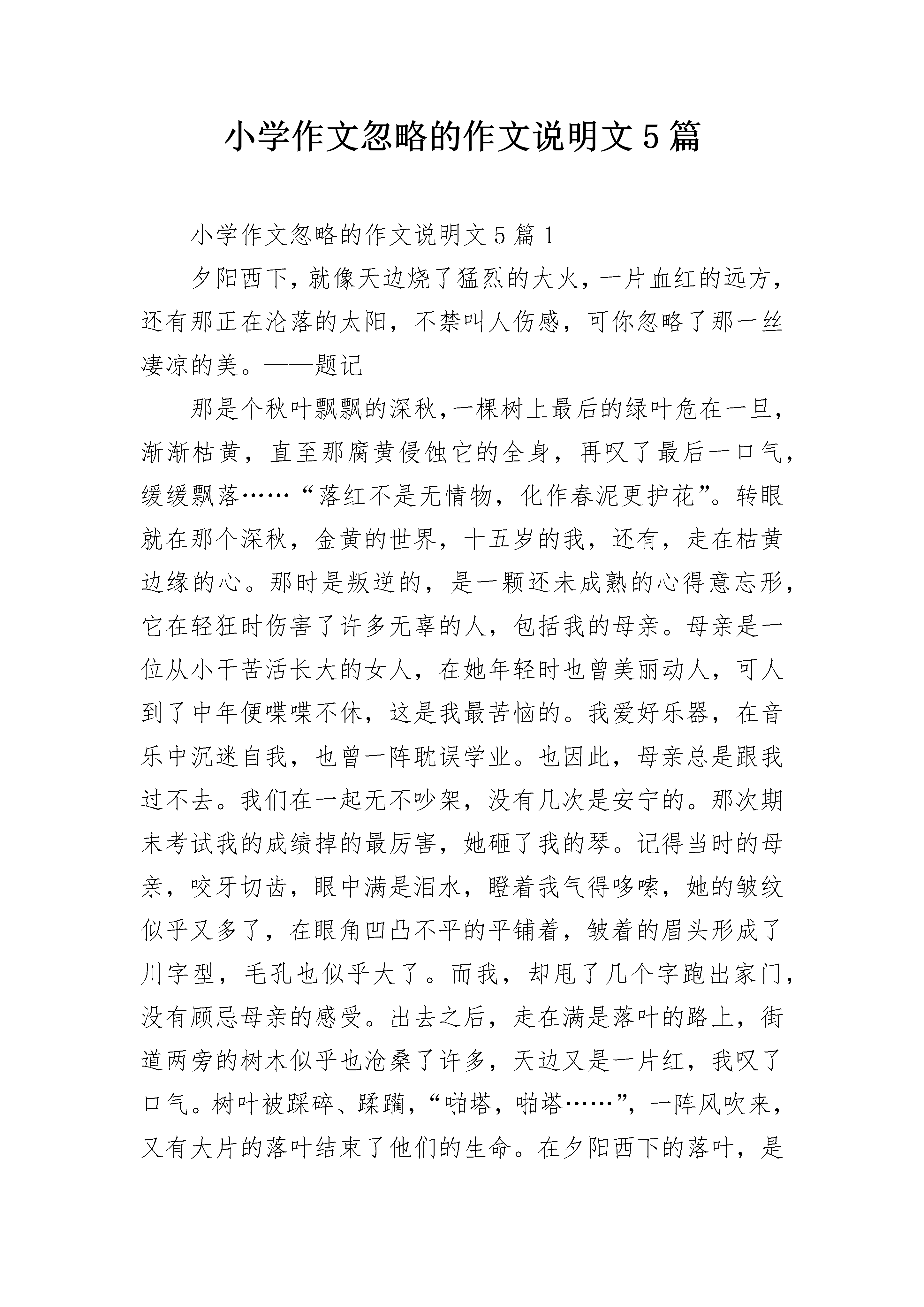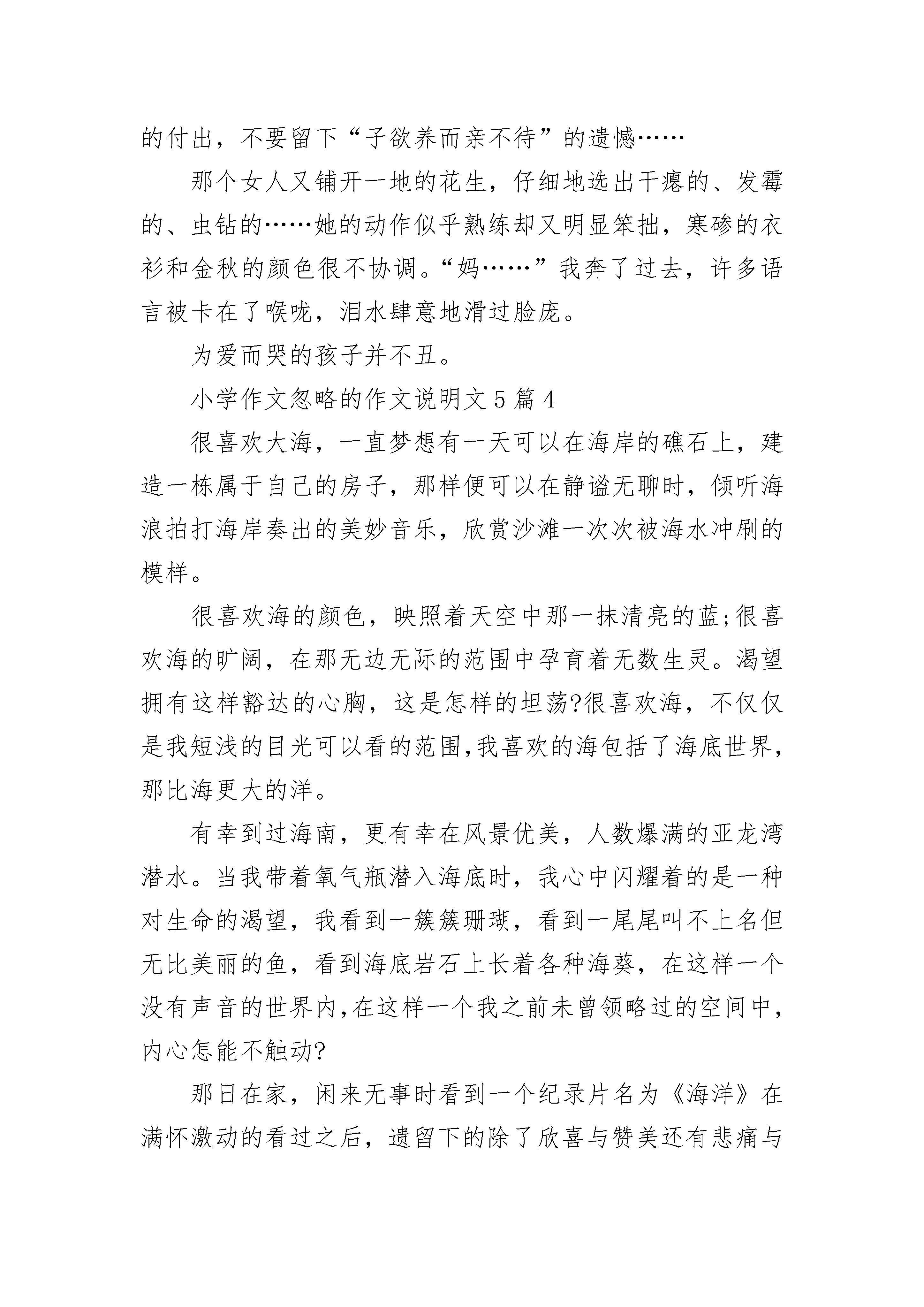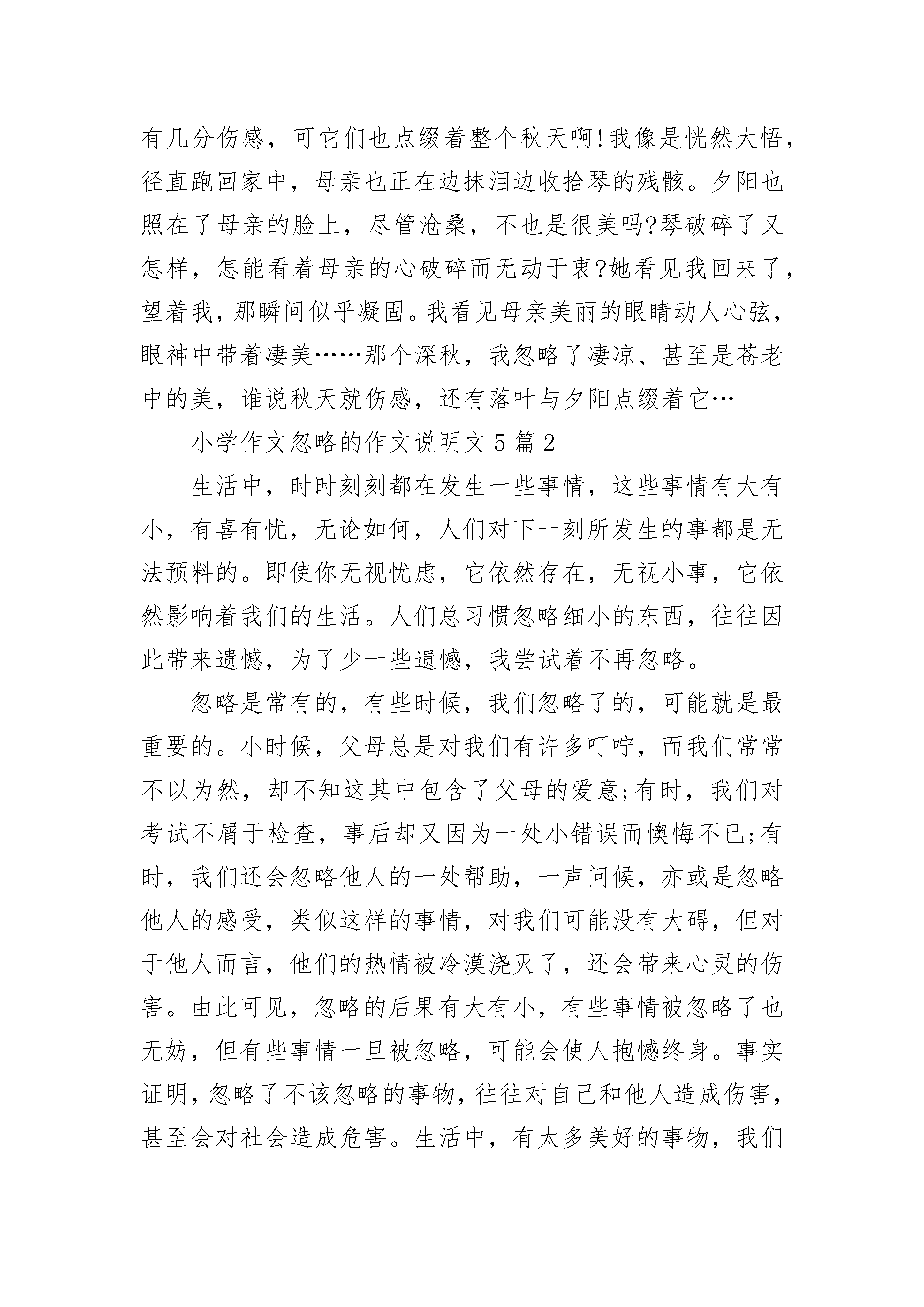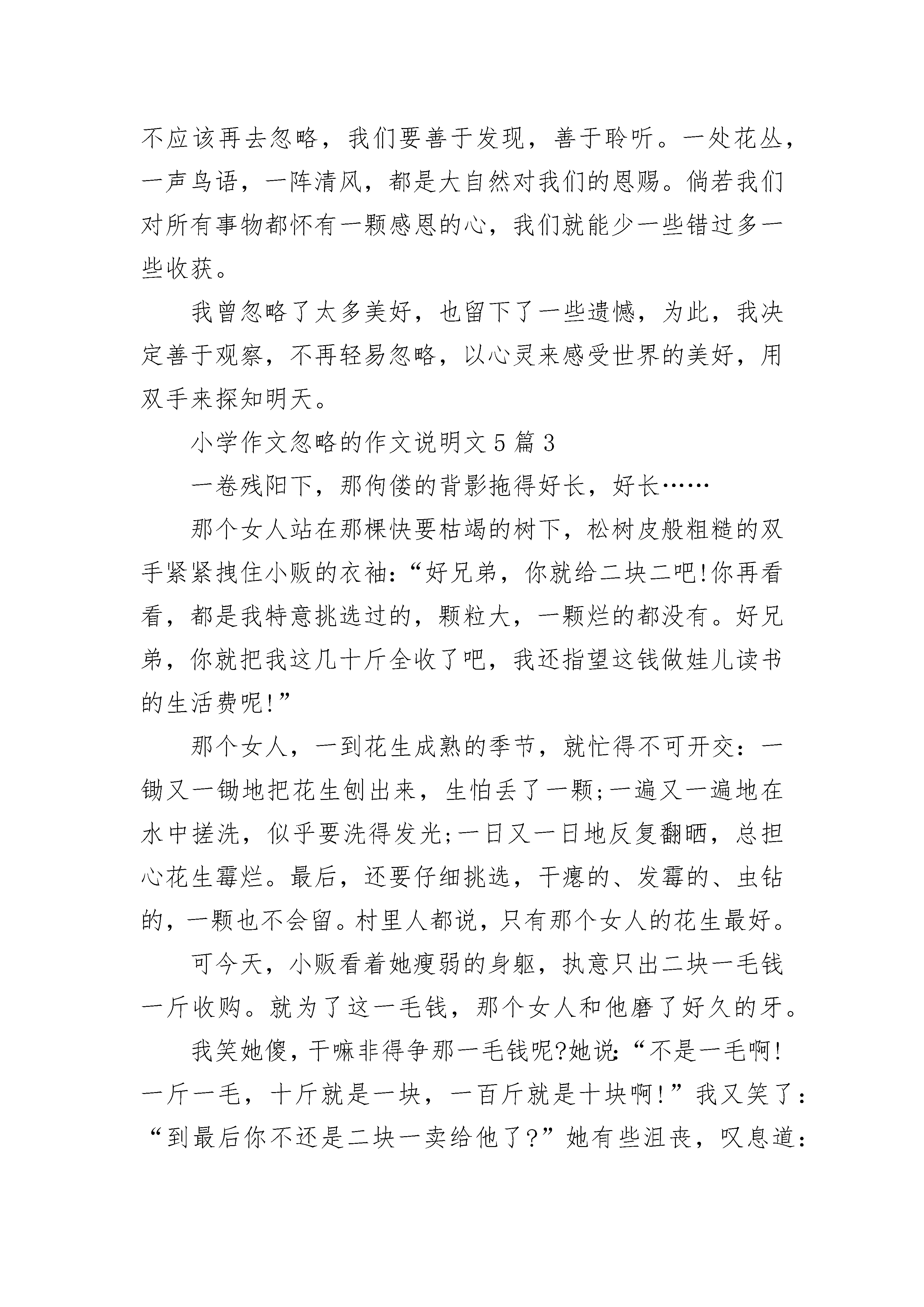 小学作文忽略的作文说明文5篇小学作文忽略的作文说明文5篇1夕阳西下,就像天边烧了猛烈的大火,一片血红的远方,还有那正在沦落的太阳,不禁叫人伤感,可你忽略了那一丝凄凉的美。——题记那是个秋叶飘飘的深秋,一棵树上最后的绿叶危在一旦,渐渐枯黄,直至那腐黄侵蚀它的全身,再叹了最后一口气,缓缓飘落……“落红不是无情物,化作春泥更护花”。转眼就在那个深秋,金黄的世界,十五岁的我,还有,走在枯黄边缘的心。那时是叛逆的,是一颗还未成熟的心得意忘形,它在轻狂时伤害了许多无辜的人,包括我的母亲。母亲是一位从小干苦活长大的女人,在她年轻时也曾美丽动人,可人到了中年便喋喋不休,这是我最苦恼的。我爱好乐器,在音乐中沉迷自我,也曾一阵耽误学业。也因此,母亲总是跟我过不去。我们在一起无不吵架,没有几次是安宁的。那次期末考试我的成绩掉的最厉害,她砸了我的琴。记得当时的母亲,咬牙切齿,眼中满是泪水,瞪着我气得哆嗦,她的皱纹似乎又多了,在眼角凹凸不平的平铺着,皱着的眉头形成了川字型,毛孔也似乎大了。而我,却甩了几个字跑出家门,没有顾忌母亲的感受。出去之后,走在满是落叶的路上,街道两旁的树木似乎也沧桑了许多,天边又是一片红,我叹了口气。树叶被踩碎、蹂躏,“啪塔,啪塔……”,一阵风吹来,又有大片的落叶结束了他们的生命。在夕阳西下的落叶,是有几分伤感,可它们也点缀着整个秋天啊!我像是恍然大悟,径直跑回家中,母亲也正在边抹泪边收拾琴的残骸。夕阳也照在了母亲的脸上,尽管沧桑,不也是很美吗?琴破碎了又怎样,怎能看着母亲的心破碎而无动于衷?她看见我回来了,望着我,那瞬间似乎凝固。我看见母亲美丽的眼睛动人心弦,眼神中带着凄美……那个深秋,我忽略了凄凉、甚至是苍老中的美,谁说秋天就伤感,还有落叶与夕阳点缀着它…小学作文忽略的作文说明文5篇2生活中,时时刻刻都在发生一些事情,这些事情有大有小,有喜有忧,无论如何,人们对下一刻所发生的事都是无法预料的。即使你无视忧虑,它依然存在,无视小事,它依然影响着我们的生活。人们总习惯忽略细小的东西,往往因此带来遗憾,为了少一些遗憾,我尝试着不再忽略。忽略是常有的,有些时候,我们忽略了的,可能就是最重要的。小时候,父母总是对我们有许多叮咛,而我们常常不以为然,却不知这其中包含了父母的爱意;有时,我们对考试不屑于检查,事后却又因为一处小错误而懊悔不已;有时,我们还会忽略他人的一处帮助,一声问候,亦或是忽略他人的感受,类似这样的事情,对我们可能没有大碍,但对于他人而言,他们的热情被冷漠浇灭了,还会带来心灵的伤害。由此可见,忽略的后果有大有小,有些事情被忽略了也无妨,但有些事情一旦被忽略,可能会使人抱憾终身。事实证明,忽略了不该忽略的事物,往往对自己和他人造成伤害,甚至会对社会造成危害。生活中,有太多美好的事物,我们不应该再去忽略,我们要善于发现,善于聆听。一处花丛,一声鸟语,一阵清风,都是大自然对我们的恩赐。倘若我们对所有事物都怀有一颗感恩的心,我们就能少一些错过多一些收获。我曾忽略了太多美好,也留下了一些遗憾,为此,我决定善于观察,不再轻易忽略,以心灵来感受世界的美好,用双手来探知明天。小学作文忽略的作文说明文5篇3一卷残阳下,那佝偻的背影拖得好长,好长……那个女人站在那棵快要枯竭的树下,松树皮般粗糙的双手紧紧拽住小贩的衣袖:“好兄弟,你就给二块二吧!你再看看,都是我特意挑选过的,颗粒大,一颗烂的都没有。好兄弟,你就把我这几十斤全收了吧,我还指望这钱做娃儿读书的生活费呢!”那个女人,一到花生成熟的季节,就忙得不可开交:一锄又一锄地把花生刨出来,生怕丢了一颗;一遍又一遍地在水中搓洗,似乎要洗得发光;一日又一日地反复翻晒,总担心花生霉烂。最后,还要仔细挑选,干瘪的、发霉的、虫钻的,一颗也不会留。村里人都说,只有那个女人的花生最好。可今天,小贩看着她瘦弱的身躯,执意只出二块一毛钱一斤收购。就为了这一毛钱,那个女人和他磨了好久的牙。我笑她傻,干嘛非得争那一毛钱呢?她说:“不是一毛啊!一斤一毛,十斤就是一块,一百斤就是十块啊!”我又笑了:“到最后你不还是二块一卖给他了?”她有些沮丧,叹息道:“那些生意人就欺负我们农村人没文化,没出息。所以你们一定要好好读书,等有出息了,就不会被欺负了。”一瞬间,我看到又有几缕皱纹悄悄爬上她的额头。对于那个女人,我并不了解多少,也没想过要去了解她多少。我只知道,她从嫁过来的那天起,就没清闲过,没过一天好生活,甚至不知道牛肉粉的味道。她活着,似乎就是为了拼命从土里刨钱,供弟弟妹妹和女儿读书。她太寒酸了,我要她买点好衣服穿,她笑笑说:“地摊上买的就行了,又不是单位上的人,穿给谁看呢?衣服破了,缝缝补补就可以了。笑脏不笑烂嘛。”我心里打翻了五味瓶。她的女儿,身上是“李维斯”的衣服,脚上是“奈克”牌的鞋子。这些品牌,刺得我双眼硬生