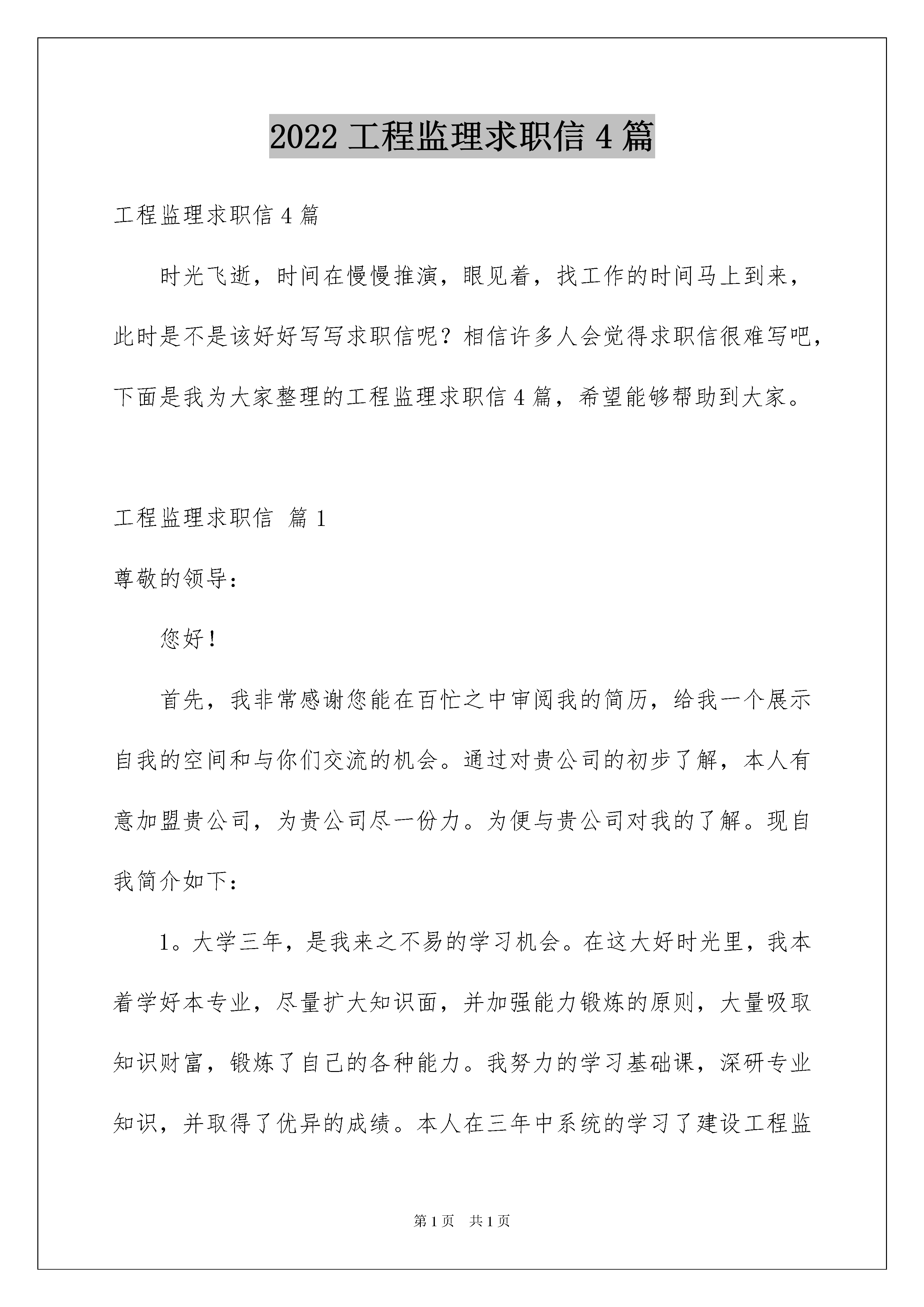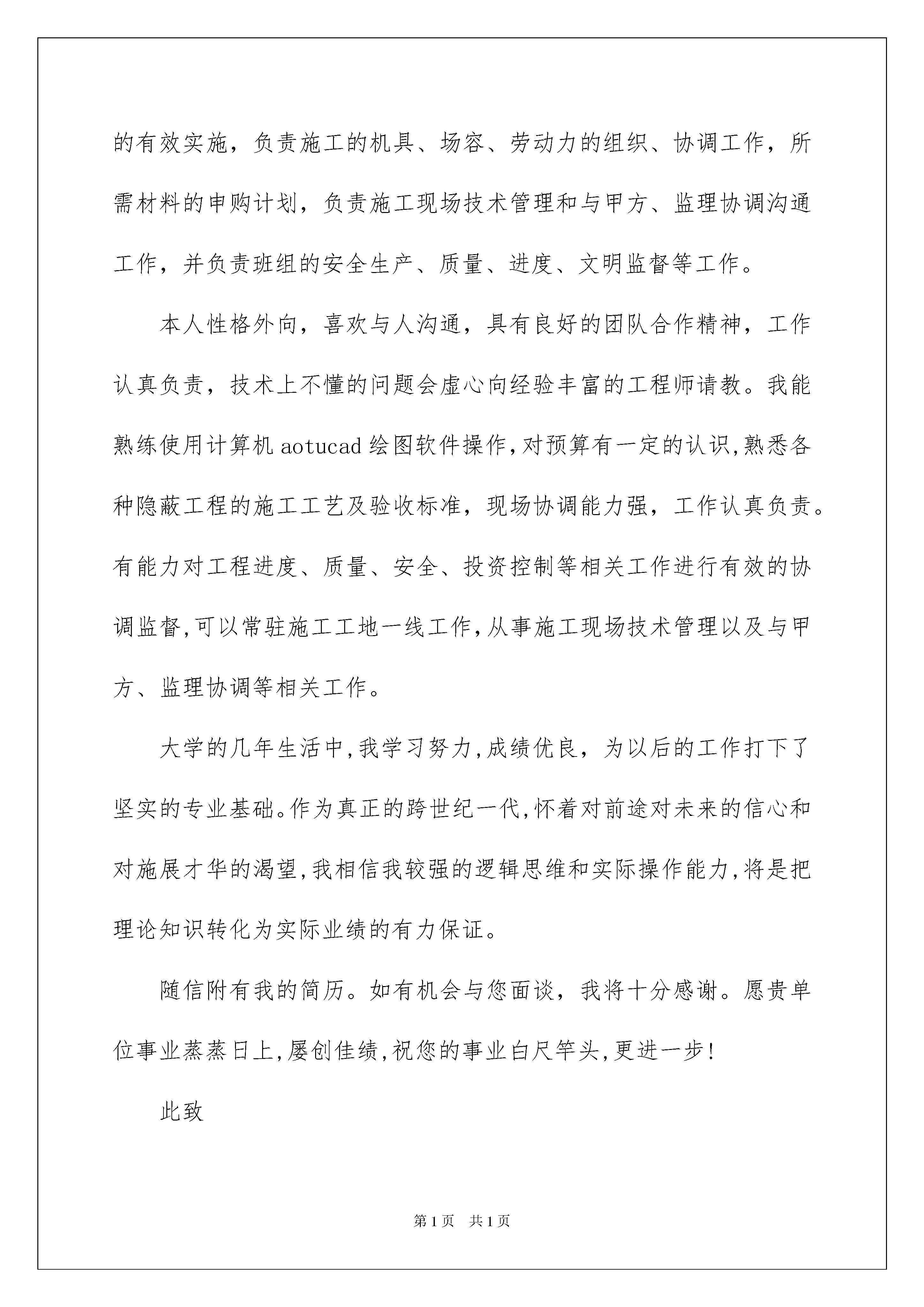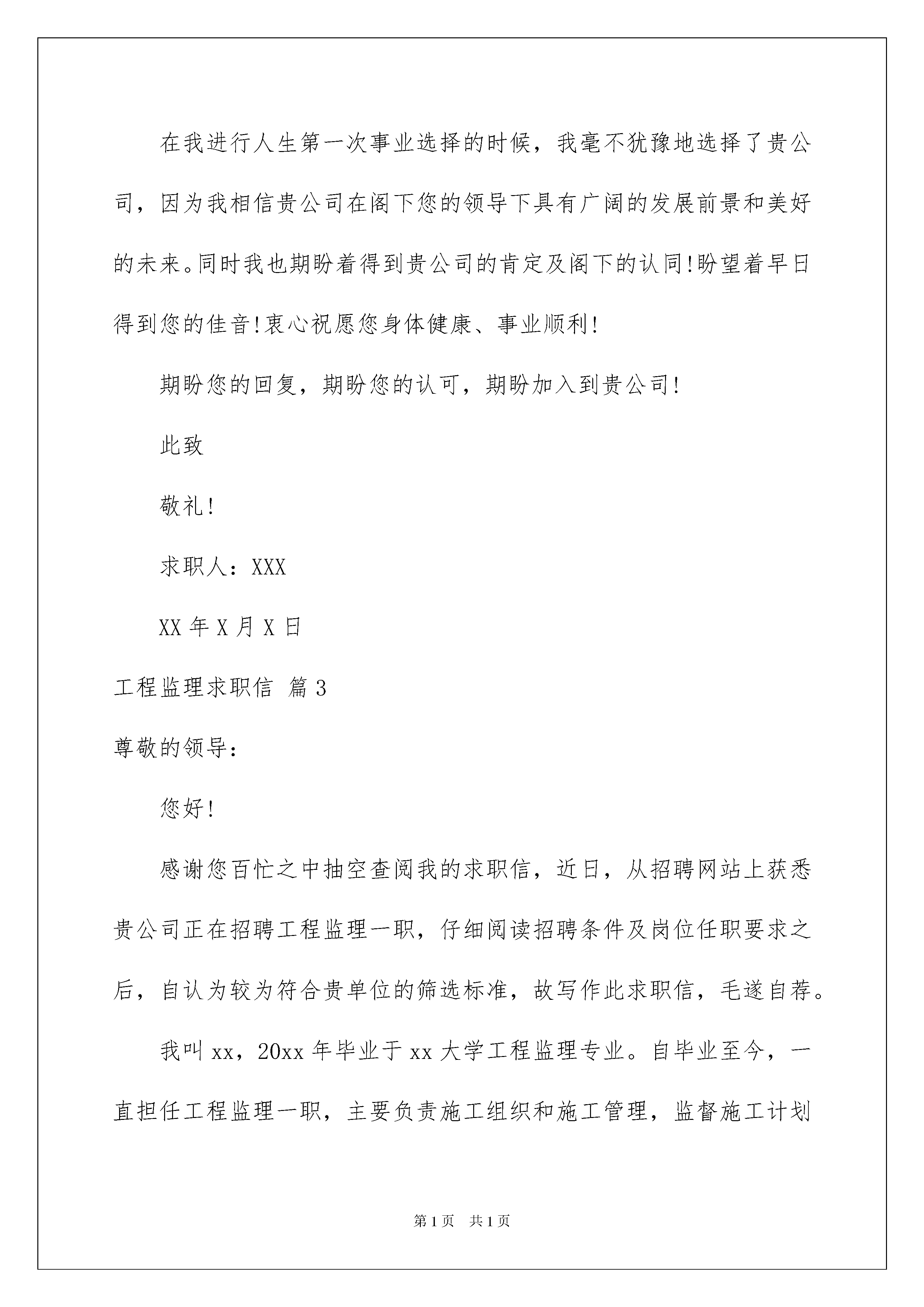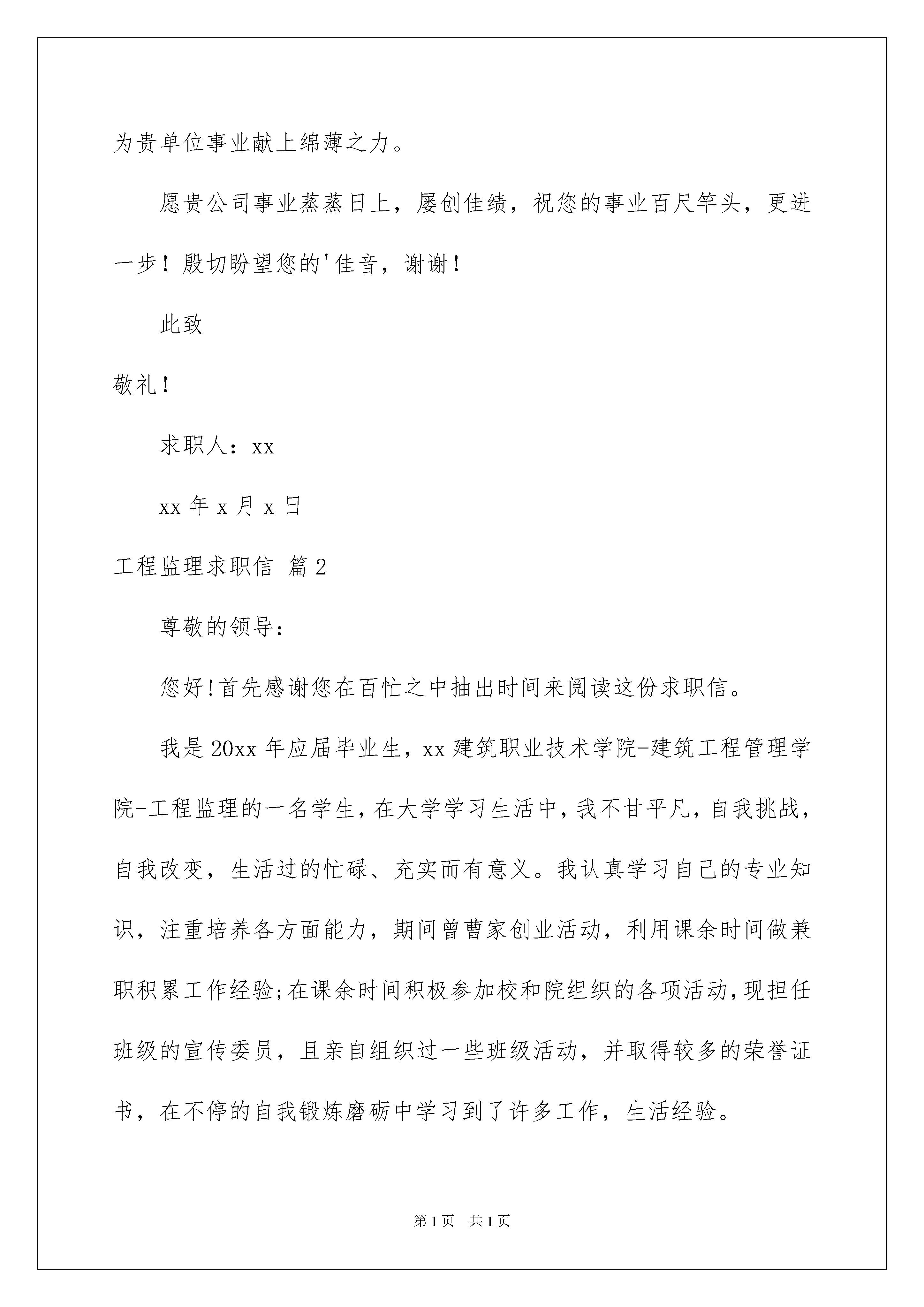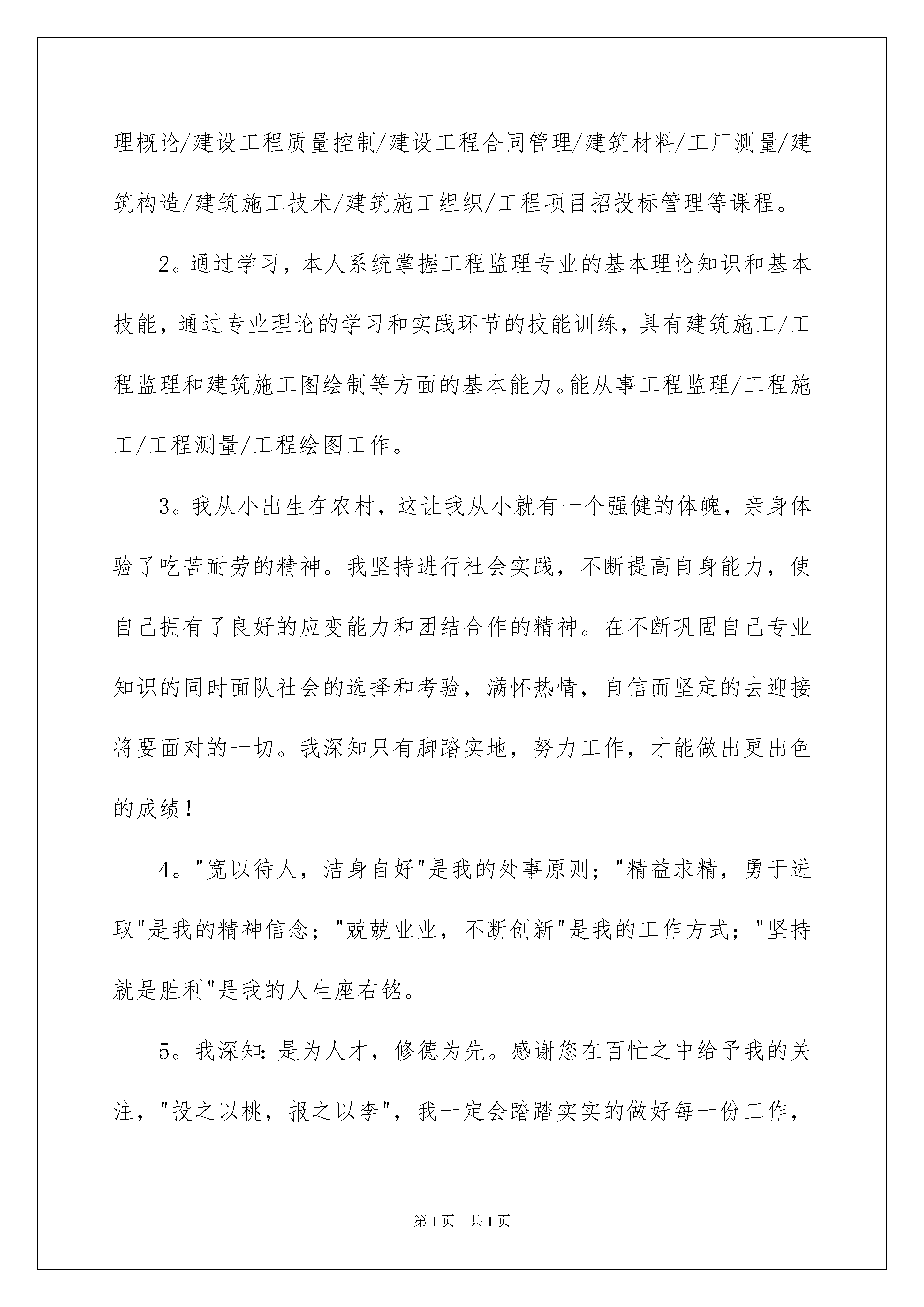 2022工程监理求职信4篇工程监理求职信4篇时光飞逝,时间在慢慢推演,眼见着,找工作的时间马上到来,此时是不是该好好写写求职信呢?相信许多人会觉得求职信很难写吧,下面是我为大家整理的工程监理求职信4篇,希望能够帮助到大家。工程监理求职信篇1尊敬的领导:您好!首先,我非常感谢您能在百忙之中审阅我的简历,给我一个展示自我的空间和与你们交流的机会。通过对贵公司的初步了解,本人有意加盟贵公司,为贵公司尽一份力。为便与贵公司对我的了解。现自我简介如下:1。大学三年,是我来之不易的学习机会。在这大好时光里,我本着学好本专业,尽量扩大知识面,并加强能力锻炼的原则,大量吸取知识财富,锻炼了自己的各种能力。我努力的学习基础课,深研专业知识,并取得了优异的成绩。本人在三年中系统的学习了建设工程监理概论/建设工程质量控制/建设工程合同管理/建筑材料/工厂测量/建筑构造/建筑施工技术/建筑施工组织/工程项目招投标管理等课程。2。通过学习,本人系统掌握工程监理专业的基本理论知识和基本技能,通过专业理论的学习和实践环节的技能训练,具有建筑施工/工程监理和建筑施工图绘制等方面的基本能力。能从事工程监理/工程施工/工程测量/工程绘图工作。3。我从小出生在农村,这让我从小就有一个强健的体魄,亲身体验了吃苦耐劳的精神。我坚持进行社会实践,不断提高自身能力,使自己拥有了良好的应变能力和团结合作的精神。在不断巩固自己专业知识的同时面队社会的选择和考验,满怀热情,自信而坚定的去迎接将要面对的一切。我深知只有脚踏实地,努力工作,才能做出更出色的成绩!4。"宽以待人,洁身自好"是我的处事原则;"精益求精,勇于进取"是我的精神信念;"兢兢业业,不断创新"是我的工作方式;"坚持就是胜利"是我的人生座右铭。5。我深知:是为人才,修德为先。感谢您在百忙之中给予我的关注,"投之以桃,报之以李",我一定会踏踏实实的做好每一份工作,为贵单位事业献上绵薄之力。愿贵公司事业蒸蒸日上,屡创佳绩,祝您的事业百尺竿头,更进一步!殷切盼望您的'佳音,谢谢!此致敬礼!求职人:xxxx年x月x日工程监理求职信篇2尊敬的领导:您好!首先感谢您在百忙之中抽出时间来阅读这份求职信。我是20xx年应届毕业生,xx建筑职业技术学院-建筑工程管理学院-工程监理的一名学生,在大学学习生活中,我不甘平凡,自我挑战,自我改变,生活过的忙碌、充实而有意义。我认真学习自己的专业知识,注重培养各方面能力,期间曾曹家创业活动,利用课余时间做兼职积累工作经验;在课余时间积极参加校和院组织的各项活动,现担任班级的宣传委员,且亲自组织过一些班级活动,并取得较多的荣誉证书,在不停的自我锻炼磨砺中学习到了许多工作,生活经验。在我进行人生第一次事业选择的时候,我毫不犹豫地选择了贵公司,因为我相信贵公司在阁下您的领导下具有广阔的发展前景和美好的未来。同时我也期盼着得到贵公司的肯定及阁下的认同!盼望着早日得到您的佳音!衷心祝愿您身体健康、事业顺利!期盼您的回复,期盼您的认可,期盼加入到贵公司!此致敬礼!求职人:XXXXX年X月X日工程监理求职信篇3尊敬的领导:您好!感谢您百忙之中抽空查阅我的求职信,近日,从招聘网站上获悉贵公司正在招聘工程监理一职,仔细阅读招聘条件及岗位任职要求之后,自认为较为符合贵单位的筛选标准,故写作此求职信,毛遂自荐。我叫xx,20xx年毕业于xx大学工程监理专业。自毕业至今,一直担任工程监理一职,主要负责施工组织和施工管理,监督施工计划的有效实施,负责施工的机具、场容、劳动力的组织、协调工作,所需材料的申购计划,负责施工现场技术管理和与甲方、监理协调沟通工作,并负责班组的安全生产、质量、进度、文明监督等工作。本人性格外向,喜欢与人沟通,具有良好的团队合作精神,工作认真负责,技术上不懂的问题会虚心向经验丰富的工程师请教。我能熟练使用计算机aotucad绘图软件操作,对预算有一定的认识,熟悉各种隐蔽工程的施工工艺及验收标准,现场协调能力强,工作认真负责。有能力对工程进度、质量、安全、投资控制等相关工作进行有效的协调监督,可以常驻施工工地一线工作,从事施工现场技术管理以及与甲方、监理协调等相关工作。大学的几年生活中,我学习努力,成绩优良,为以后的工作打下了坚实的专业基础。作为真正的跨世纪一代,怀着对前途对未来的信心和对施展才华的渴望,我相信我较强的逻辑思维和实际操作能力,将是把理论知识转化为实际业绩的有力保证。随信附有我的简历。如有机会与您面谈,我将十分感谢。愿贵单位事业蒸蒸日上,屡创佳绩,祝您的事业白尺竿头,更进一步!此致敬礼!求职人:xxx20xx年xx月xx日工程