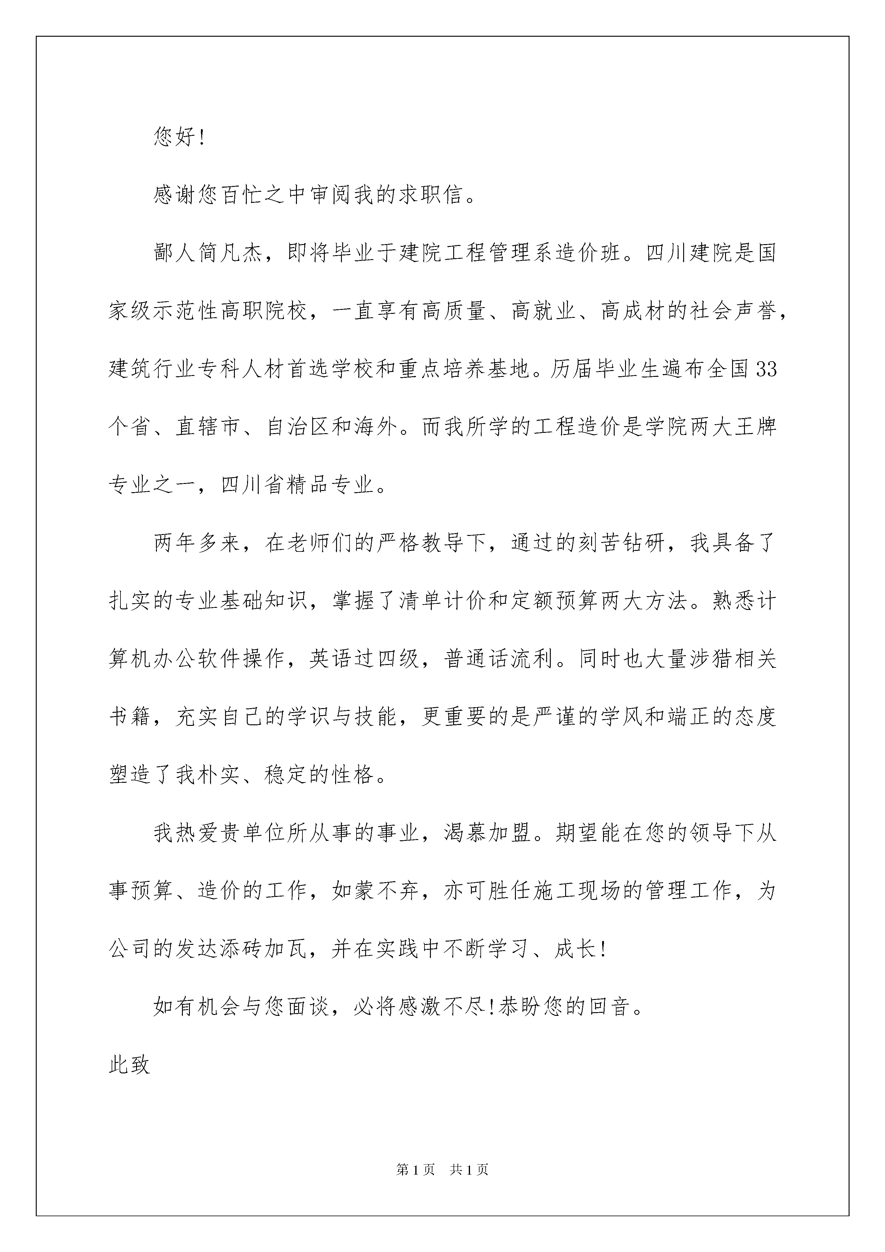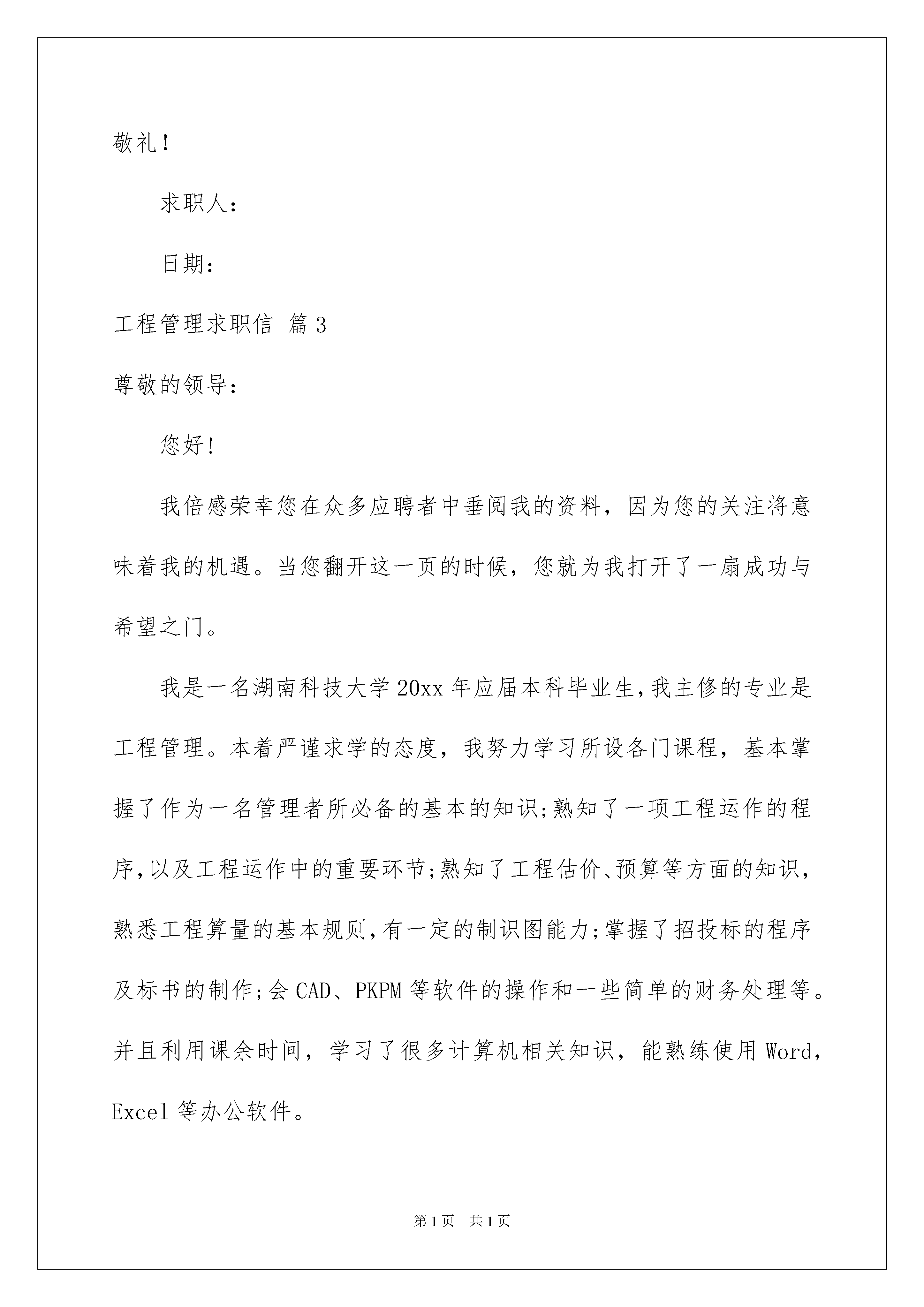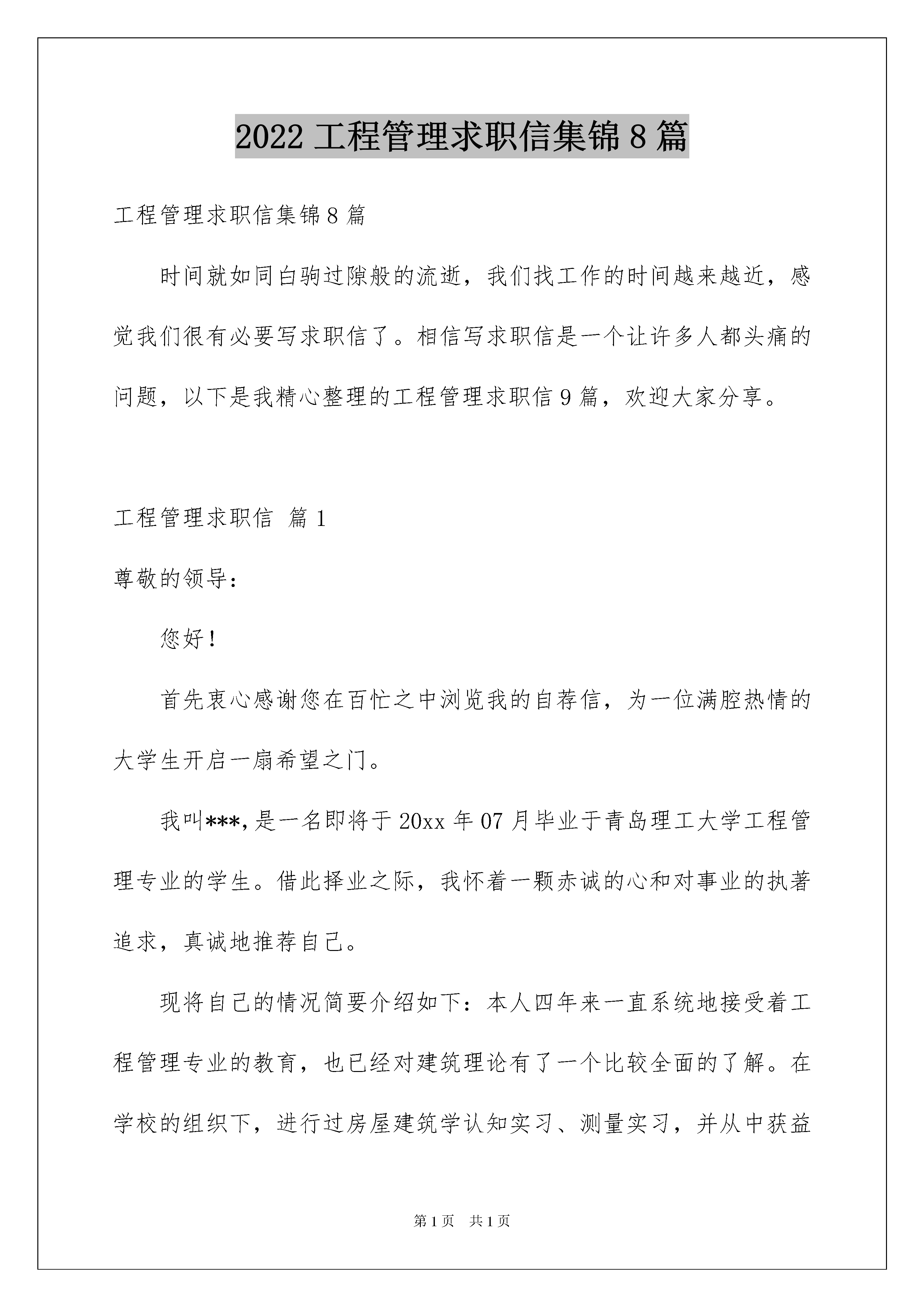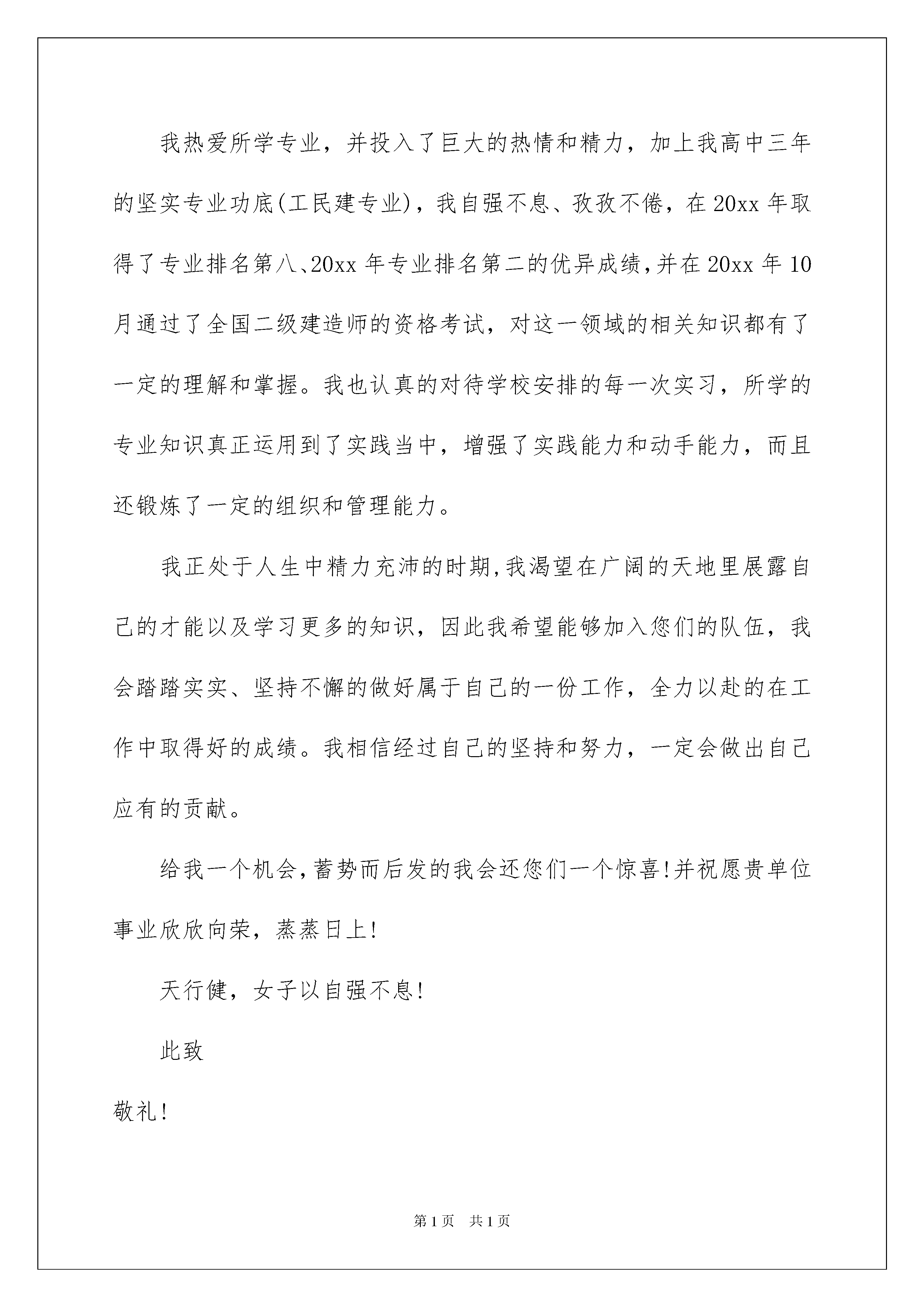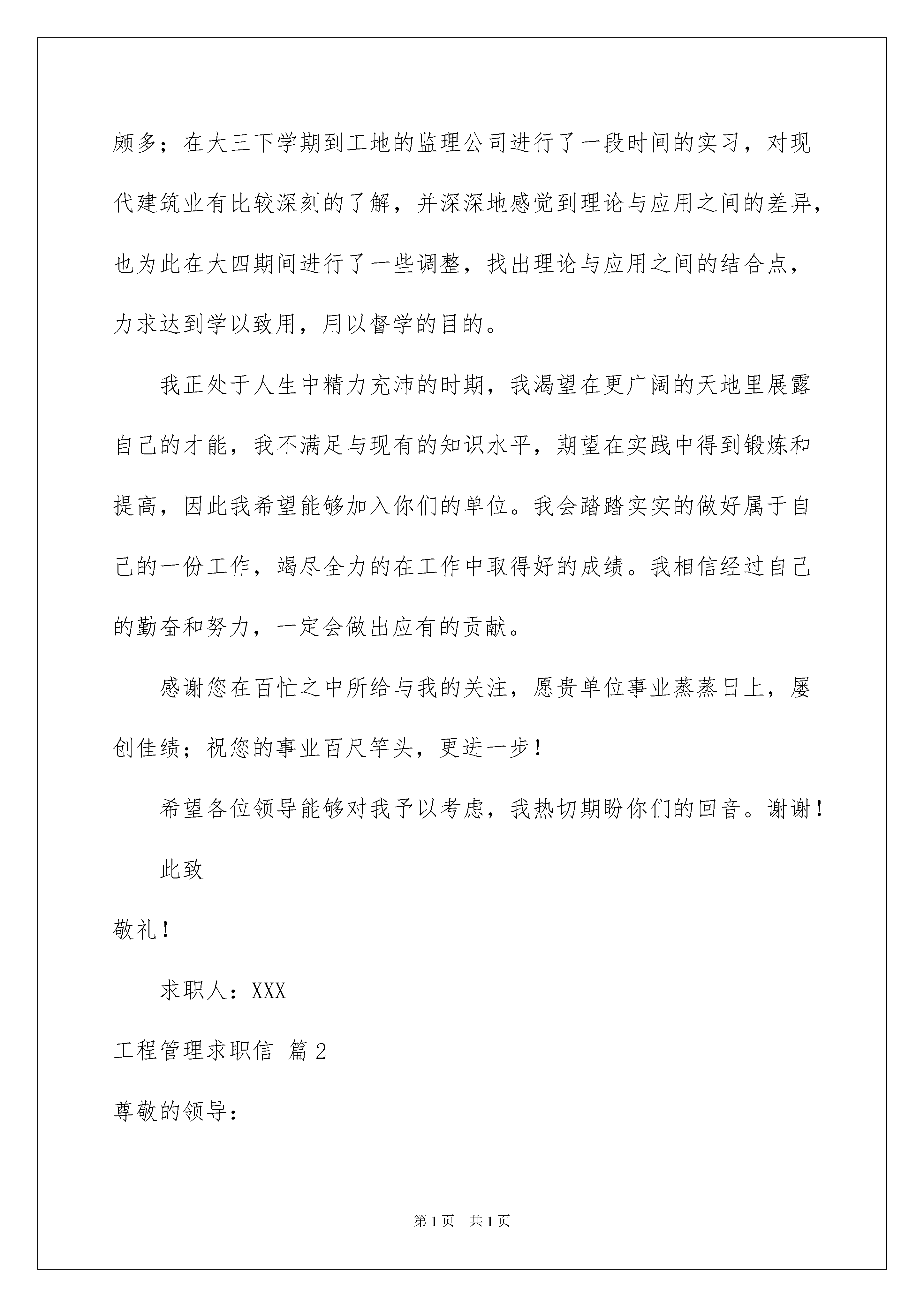 2022工程管理求职信集锦8篇工程管理求职信集锦8篇时间就如同白驹过隙般的流逝,我们找工作的时间越来越近,感觉我们很有必要写求职信了。相信写求职信是一个让许多人都头痛的问题,以下是我精心整理的工程管理求职信9篇,欢迎大家分享。工程管理求职信篇1尊敬的领导:您好!首先衷心感谢您在百忙之中浏览我的自荐信,为一位满腔热情的大学生开启一扇希望之门。我叫***,是一名即将于20xx年07月毕业于青岛理工大学工程管理专业的学生。借此择业之际,我怀着一颗赤诚的心和对事业的执著追求,真诚地推荐自己。现将自己的情况简要介绍如下:本人四年来一直系统地接受着工程管理专业的教育,也已经对建筑理论有了一个比较全面的了解。在学校的组织下,进行过房屋建筑学认知实习、测量实习,并从中获益颇多;在大三下学期到工地的监理公司进行了一段时间的实习,对现代建筑业有比较深刻的了解,并深深地感觉到理论与应用之间的差异,也为此在大四期间进行了一些调整,找出理论与应用之间的结合点,力求达到学以致用,用以督学的目的。我正处于人生中精力充沛的时期,我渴望在更广阔的天地里展露自己的才能,我不满足与现有的知识水平,期望在实践中得到锻炼和提高,因此我希望能够加入你们的单位。我会踏踏实实的做好属于自己的一份工作,竭尽全力的在工作中取得好的成绩。我相信经过自己的勤奋和努力,一定会做出应有的贡献。感谢您在百忙之中所给与我的关注,愿贵单位事业蒸蒸日上,屡创佳绩;祝您的事业百尺竿头,更进一步!希望各位领导能够对我予以考虑,我热切期盼你们的回音。谢谢!此致敬礼!求职人:XXX工程管理求职信篇2尊敬的领导:您好!感谢您百忙之中审阅我的求职信。鄙人简凡杰,即将毕业于建院工程管理系造价班。四川建院是国家级示范性高职院校,一直享有高质量、高就业、高成材的社会声誉,建筑行业专科人材首选学校和重点培养基地。历届毕业生遍布全国33个省、直辖市、自治区和海外。而我所学的工程造价是学院两大王牌专业之一,四川省精品专业。两年多来,在老师们的严格教导下,通过的刻苦钻研,我具备了扎实的专业基础知识,掌握了清单计价和定额预算两大方法。熟悉计算机办公软件操作,英语过四级,普通话流利。同时也大量涉猎相关书籍,充实自己的学识与技能,更重要的是严谨的学风和端正的态度塑造了我朴实、稳定的性格。我热爱贵单位所从事的事业,渴慕加盟。期望能在您的领导下从事预算、造价的工作,如蒙不弃,亦可胜任施工现场的管理工作,为公司的发达添砖加瓦,并在实践中不断学习、成长!如有机会与您面谈,必将感激不尽!恭盼您的回音。此致敬礼!求职人:日期:工程管理求职信篇3尊敬的领导:您好!我倍感荣幸您在众多应聘者中垂阅我的资料,因为您的关注将意味着我的机遇。当您翻开这一页的时候,您就为我打开了一扇成功与希望之门。我是一名湖南科技大学20xx年应届本科毕业生,我主修的专业是工程管理。本着严谨求学的态度,我努力学习所设各门课程,基本掌握了作为一名管理者所必备的基本的知识;熟知了一项工程运作的程序,以及工程运作中的重要环节;熟知了工程估价、预算等方面的知识,熟悉工程算量的基本规则,有一定的制识图能力;掌握了招投标的程序及标书的制作;会CAD、PKPM等软件的操作和一些简单的财务处理等。并且利用课余时间,学习了很多计算机相关知识,能熟练使用Word,Excel等办公软件。我热爱所学专业,并投入了巨大的热情和精力,加上我高中三年的坚实专业功底(工民建专业),我自强不息、孜孜不倦,在20xx年取得了专业排名第八、20xx年专业排名第二的优异成绩,并在20xx年10月通过了全国二级建造师的资格考试,对这一领域的相关知识都有了一定的理解和掌握。我也认真的对待学校安排的每一次实习,所学的专业知识真正运用到了实践当中,增强了实践能力和动手能力,而且还锻炼了一定的组织和管理能力。我正处于人生中精力充沛的时期,我渴望在广阔的天地里展露自己的才能以及学习更多的知识,因此我希望能够加入您们的队伍,我会踏踏实实、坚持不懈的做好属于自己的一份工作,全力以赴的在工作中取得好的成绩。我相信经过自己的坚持和努力,一定会做出自己应有的贡献。给我一个机会,蓄势而后发的我会还您们一个惊喜!并祝愿贵单位事业欣欣向荣,蒸蒸日上!天行健,女子以自强不息!此致敬礼!工程管理求职信篇4尊敬的领导:您好!感谢您在百忙之中现出宝贵的时间垂阅我的自荐书,为一位满腔热情的大学生开启一扇希望之门。借此择业之际,我怀着一颗赤诚的心和对事业的执著追求,真诚的推荐自己。古有毛遂自荐,今有伯乐点将。愿借您伯乐慧眼,开始我千里之行。“疾风知劲草,路遥知马力”。简单几页纸只是我的“包