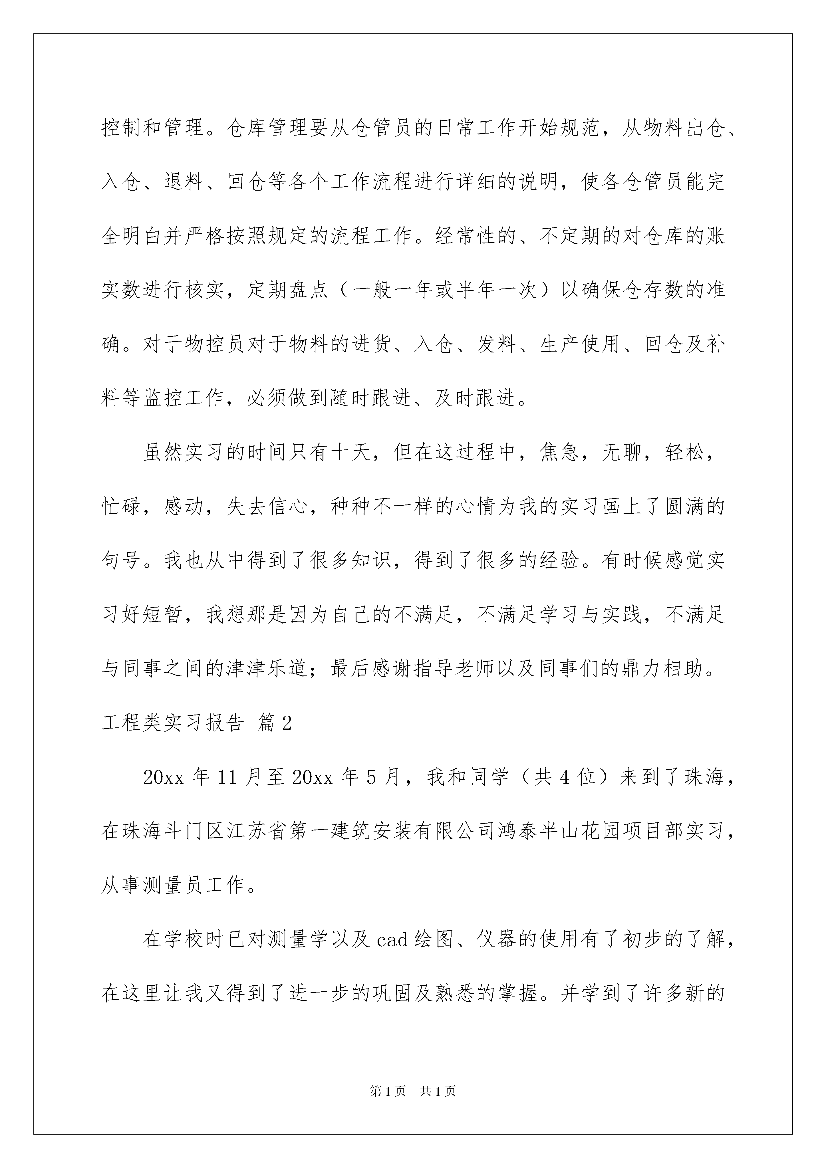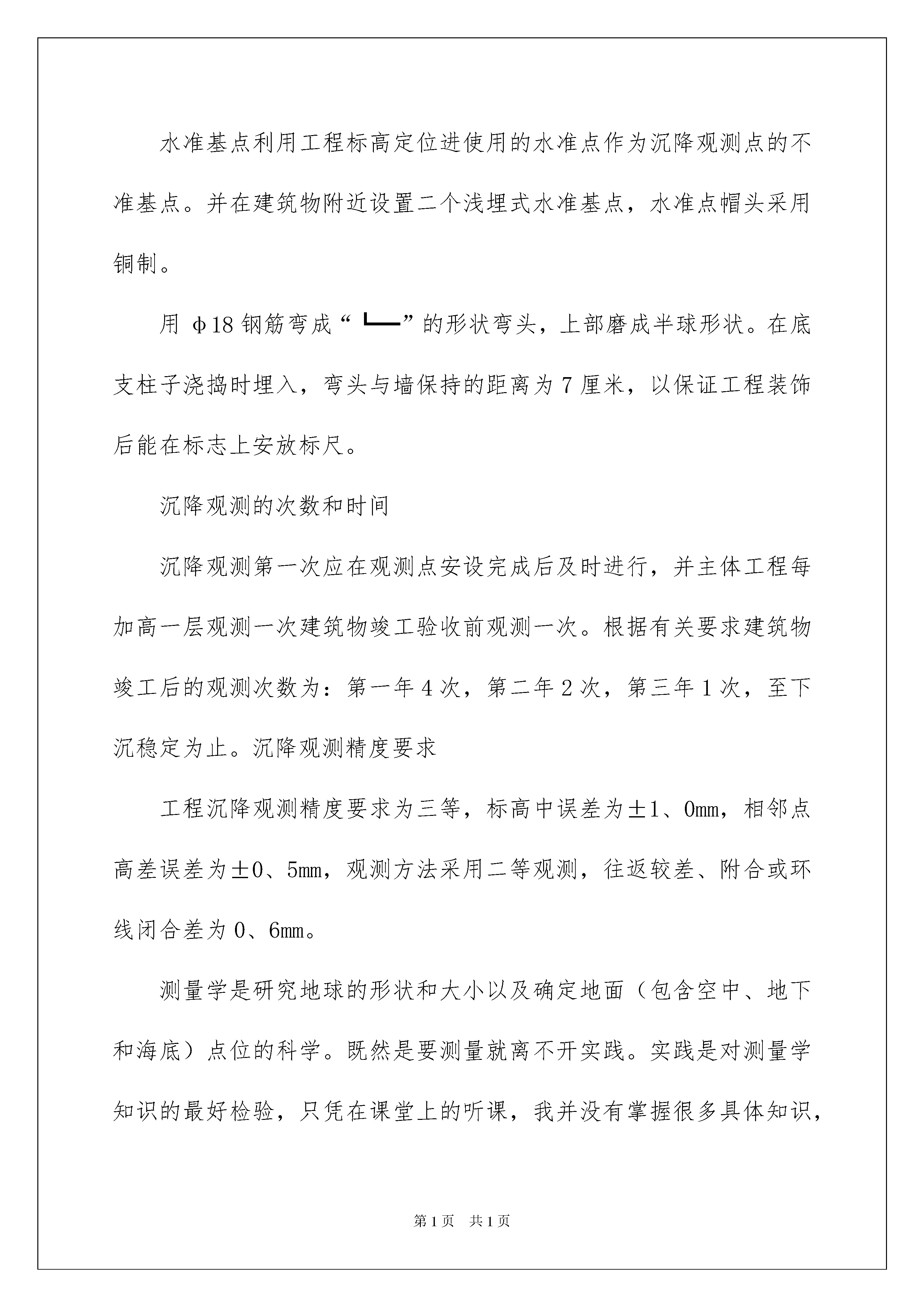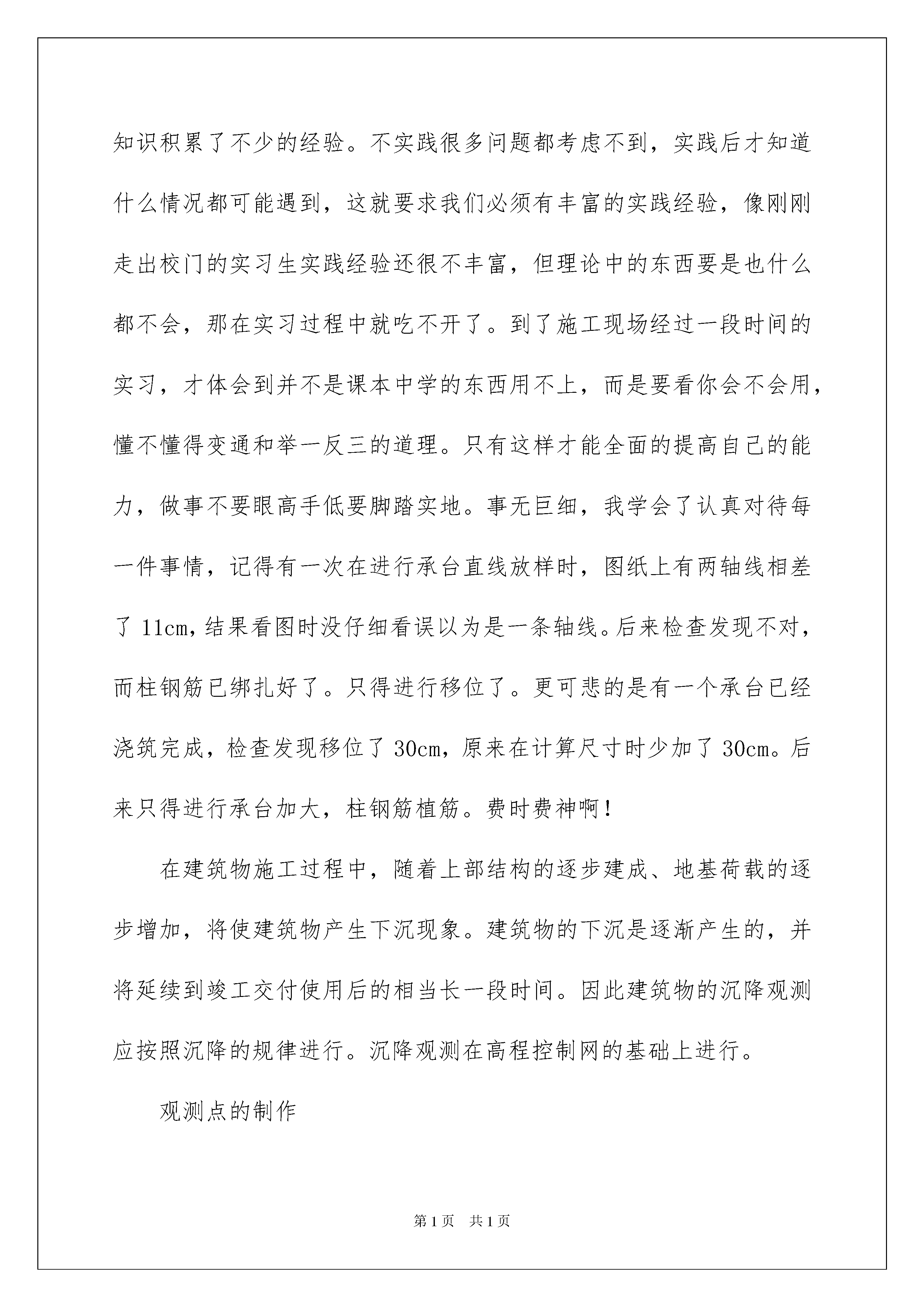 2022工程类实习报告模板6篇工程类实习报告模板6篇在人们越来越注重自身素养的今天,报告的使用频率呈上升趋势,我们在写报告的时候要避免篇幅过长。我敢肯定,大部分人都对写报告很是头疼的,以下是我为大家收集的工程类实习报告6篇,仅供参考,欢迎大家阅读。工程类实习报告篇1为了了解物流管理在现代市场经济中的功能的地位,了解现代物流在工商企业中的基本运做规律,我对专业的感性认识,提高了理性知识,为后阶段深入学习物流管理专业所设置的各门专业课程打下良好的基础。为了更好的适应以后的学习和工作,在本学期末,由学校统一组织到xx省xx物流配送中心实习,实习时间共计十天。在这十天时间里我主要感观物流业的宏观和微观发展以及主要的物流流程。为以后的学习和工作打下坚实的基础,让我对中国物流业的发展状况有一个比较全新的认识。经过亲身实践才知道,物流配送中心是一个中等规模的物流配送基地,是综合性的物流配送中心。兼有转运和集散功能,也可以扩展至配送和流通加工的功能,因此在规划与设计方面可操作性更高。物流配送中心主要分为:收货、分货、验货、退货四大部门,各个部门之间相互协调和相互配合,密不可分!物流配送中心,对于物流的概念,我仅仅是停留在浅显的书本知识。对于物流的本身感到很神秘,不敢想象现实中的物流业和心目中的物流业有那些不同之处。对于物流,我只是知道它是集:运输、储存、搬运、包装、流通加工、配送、信息处理等基本功能实施的有机结合。但没有想到它的实际操作却没有这么的简单。通过十天的简单了解,使我对于物流配送有了更加深刻的认识。中国的物流业虽然没有国外发达,但这并代表中国物流业的落后,一些原则性严重的制约了中国物流业信息技术化的发展速度。这一点作为国人的物流人士有着切肤的体会。货物运转速度慢,货差货损率高难以避免,高层货架利用率严重低下。从实习中知道了仓库的管理也很重要。只有仓库的物料管理好了,才能进一步在将车间的在生产物料、周转材料、废品等其它物料进行控制和管理。仓库管理要从仓管员的日常工作开始规范,从物料出仓、入仓、退料、回仓等各个工作流程进行详细的说明,使各仓管员能完全明白并严格按照规定的流程工作。经常性的、不定期的对仓库的账实数进行核实,定期盘点(一般一年或半年一次)以确保仓存数的准确。对于物控员对于物料的进货、入仓、发料、生产使用、回仓及补料等监控工作,必须做到随时跟进、及时跟进。虽然实习的时间只有十天,但在这过程中,焦急,无聊,轻松,忙碌,感动,失去信心,种种不一样的心情为我的实习画上了圆满的句号。我也从中得到了很多知识,得到了很多的经验。有时候感觉实习好短暂,我想那是因为自己的不满足,不满足学习与实践,不满足与同事之间的津津乐道;最后感谢指导老师以及同事们的鼎力相助。工程类实习报告篇220xx年11月至20xx年5月,我和同学(共4位)来到了珠海,在珠海斗门区江苏省第一建筑安装有限公司鸿泰半山花园项目部实习,从事测量员工作。在学校时已对测量学以及cad绘图、仪器的使用有了初步的了解,在这里让我又得到了进一步的巩固及熟悉的掌握。并学到了许多新的知识积累了不少的经验。不实践很多问题都考虑不到,实践后才知道什么情况都可能遇到,这就要求我们必须有丰富的实践经验,像刚刚走出校门的实习生实践经验还很不丰富,但理论中的东西要是也什么都不会,那在实习过程中就吃不开了。到了施工现场经过一段时间的实习,才体会到并不是课本中学的东西用不上,而是要看你会不会用,懂不懂得变通和举一反三的道理。只有这样才能全面的提高自己的能力,做事不要眼高手低要脚踏实地。事无巨细,我学会了认真对待每一件事情,记得有一次在进行承台直线放样时,图纸上有两轴线相差了11cm,结果看图时没仔细看误以为是一条轴线。后来检查发现不对,而柱钢筋已绑扎好了。只得进行移位了。更可悲的是有一个承台已经浇筑完成,检查发现移位了30cm,原来在计算尺寸时少加了30cm。后来只得进行承台加大,柱钢筋植筋。费时费神啊!在建筑物施工过程中,随着上部结构的逐步建成、地基荷载的逐步增加,将使建筑物产生下沉现象。建筑物的下沉是逐渐产生的,并将延续到竣工交付使用后的相当长一段时间。因此建筑物的沉降观测应按照沉降的规律进行。沉降观测在高程控制网的基础上进行。观测点的制作水准基点利用工程标高定位进使用的水准点作为沉降观测点的不准基点。并在建筑物附近设置二个浅埋式水准基点,水准点帽头采用铜制。用φ18钢筋弯成“┗━”的形状弯头,上部磨成半球形状。在底支柱子浇捣时埋入,弯头与墙保持的距离为7厘米,以保证工程装饰后能在标志上安放标尺。沉降观测的次数和时间沉降观测第一次应在观测点安设完