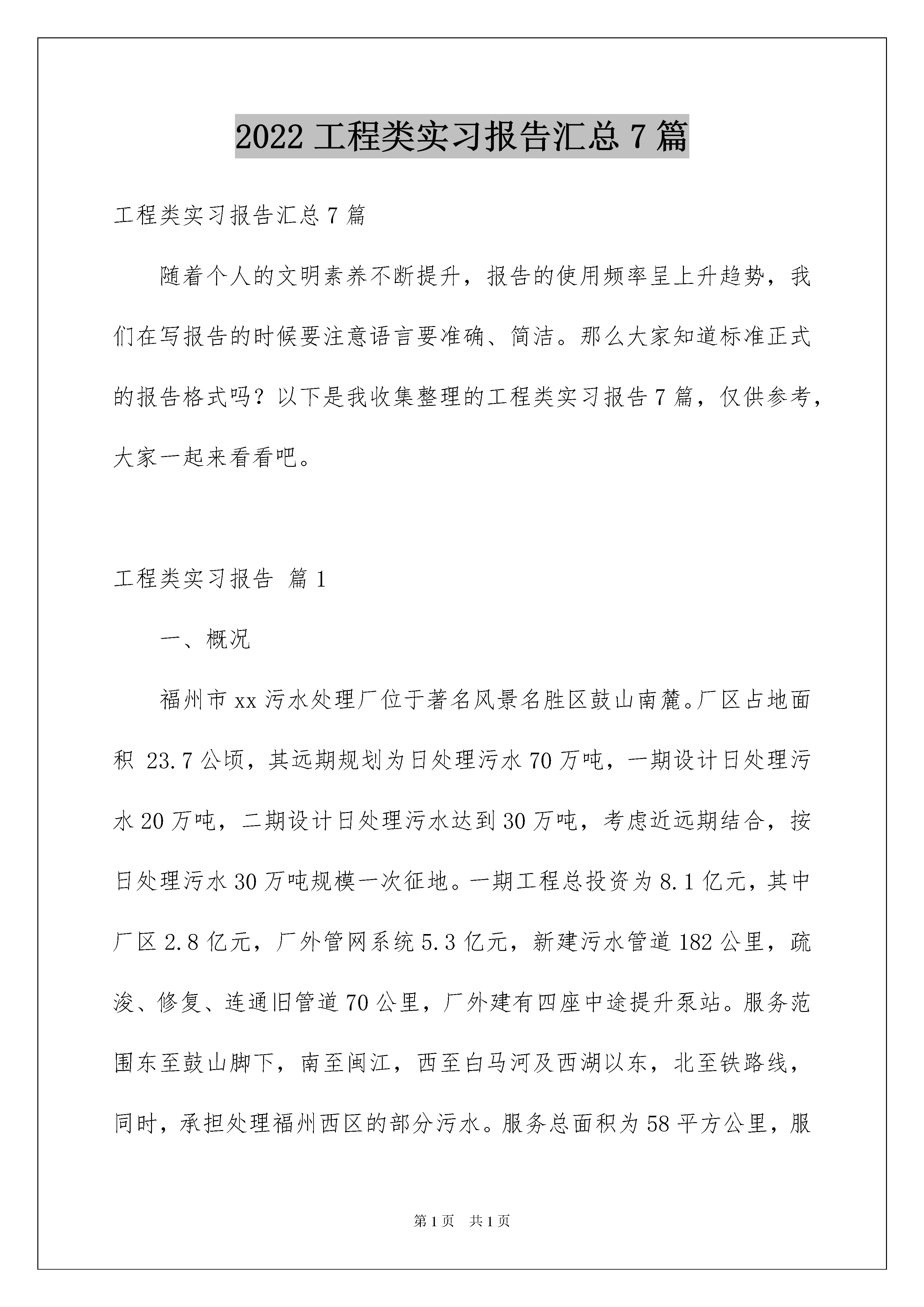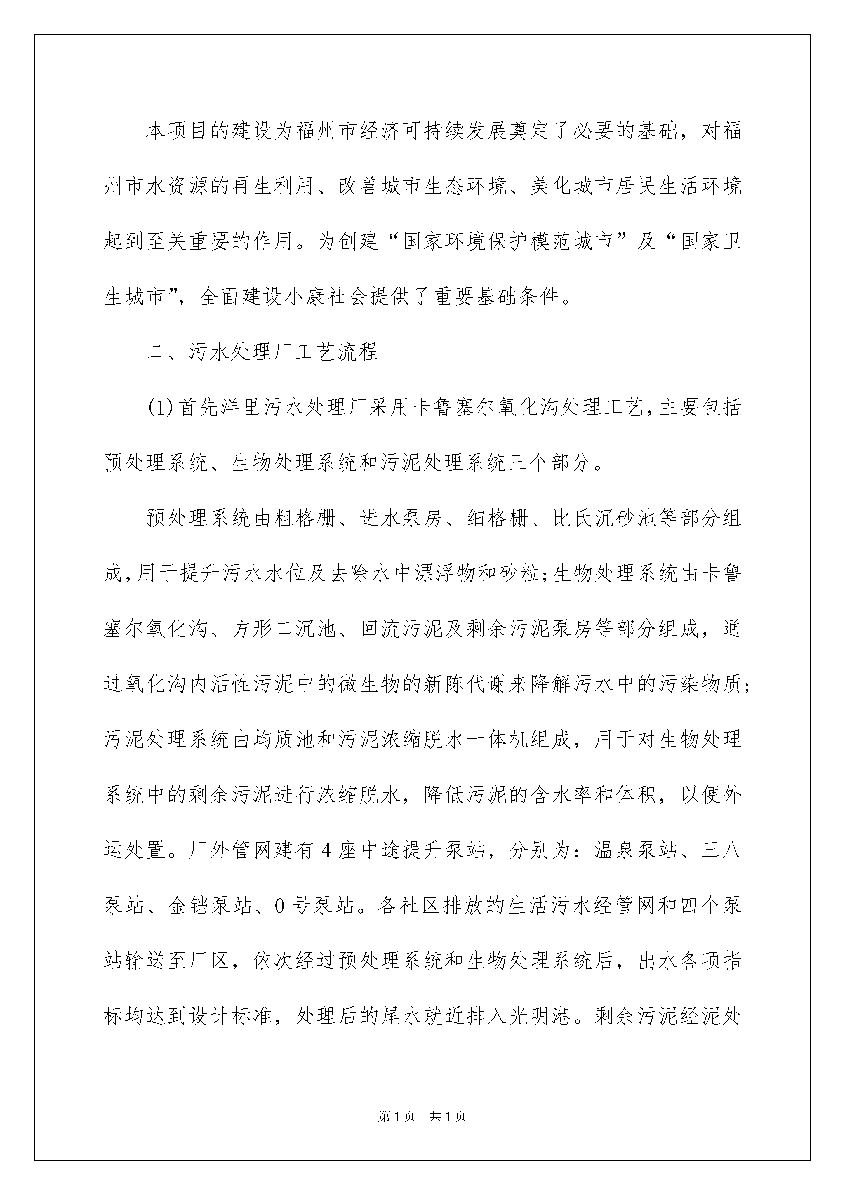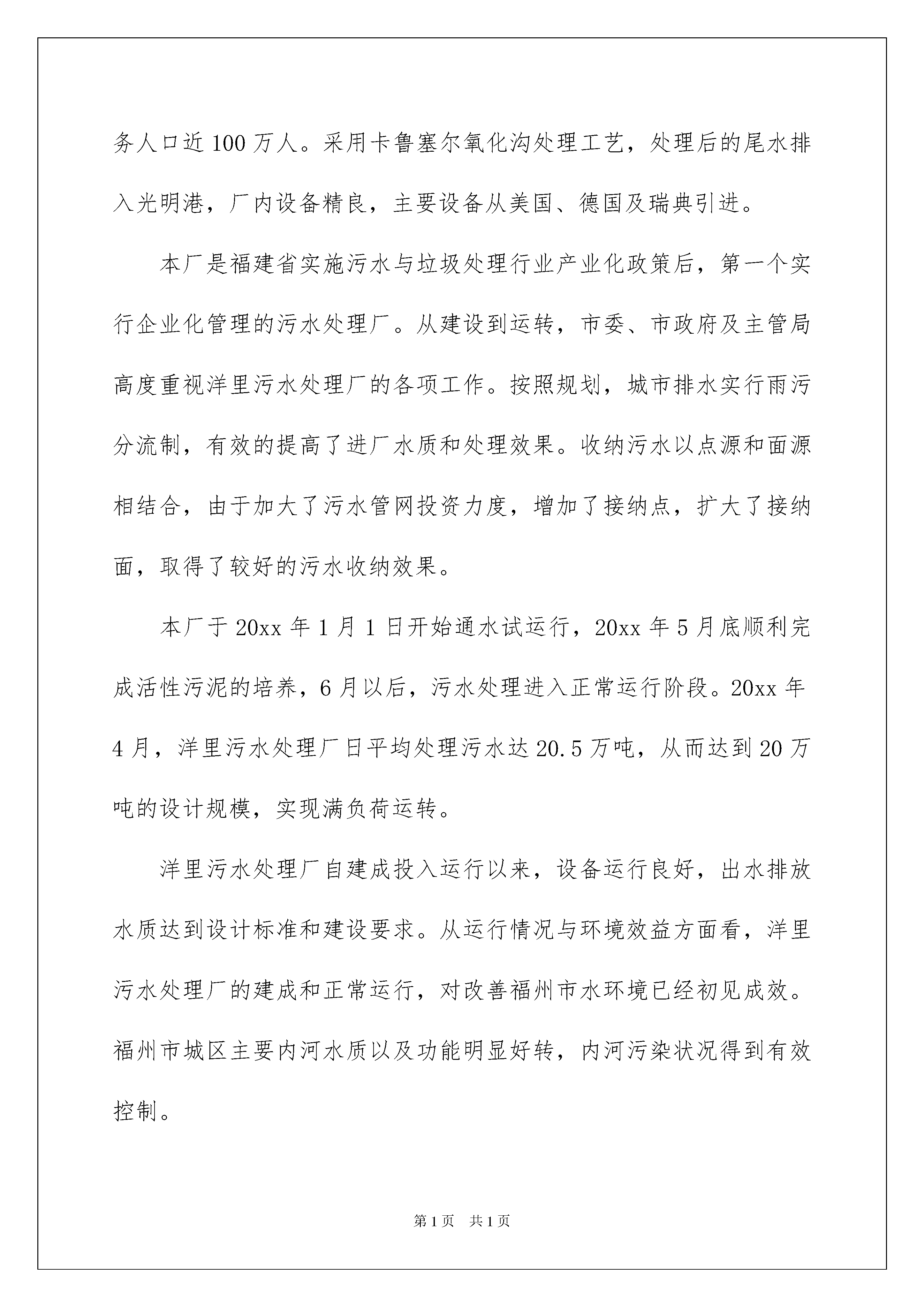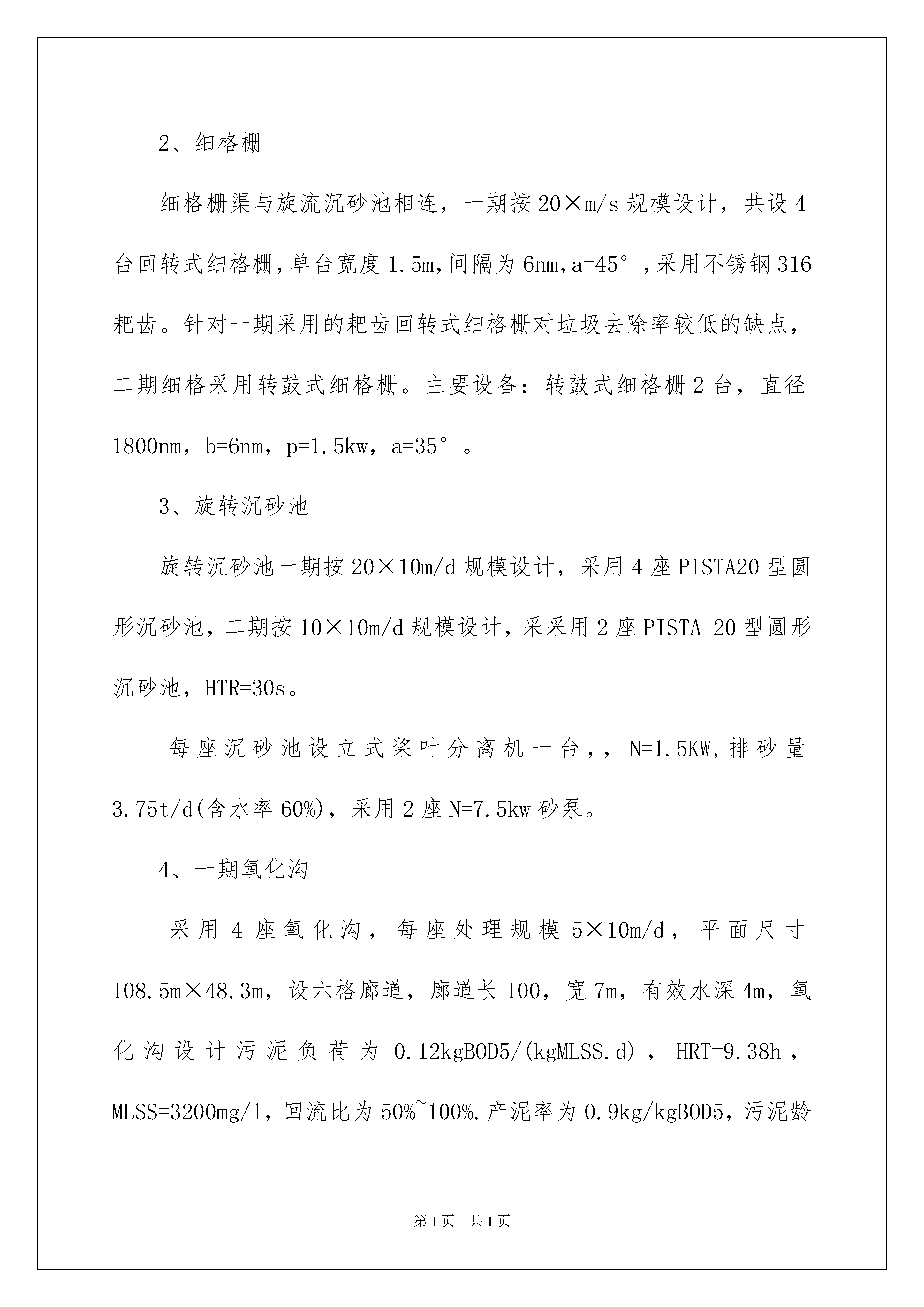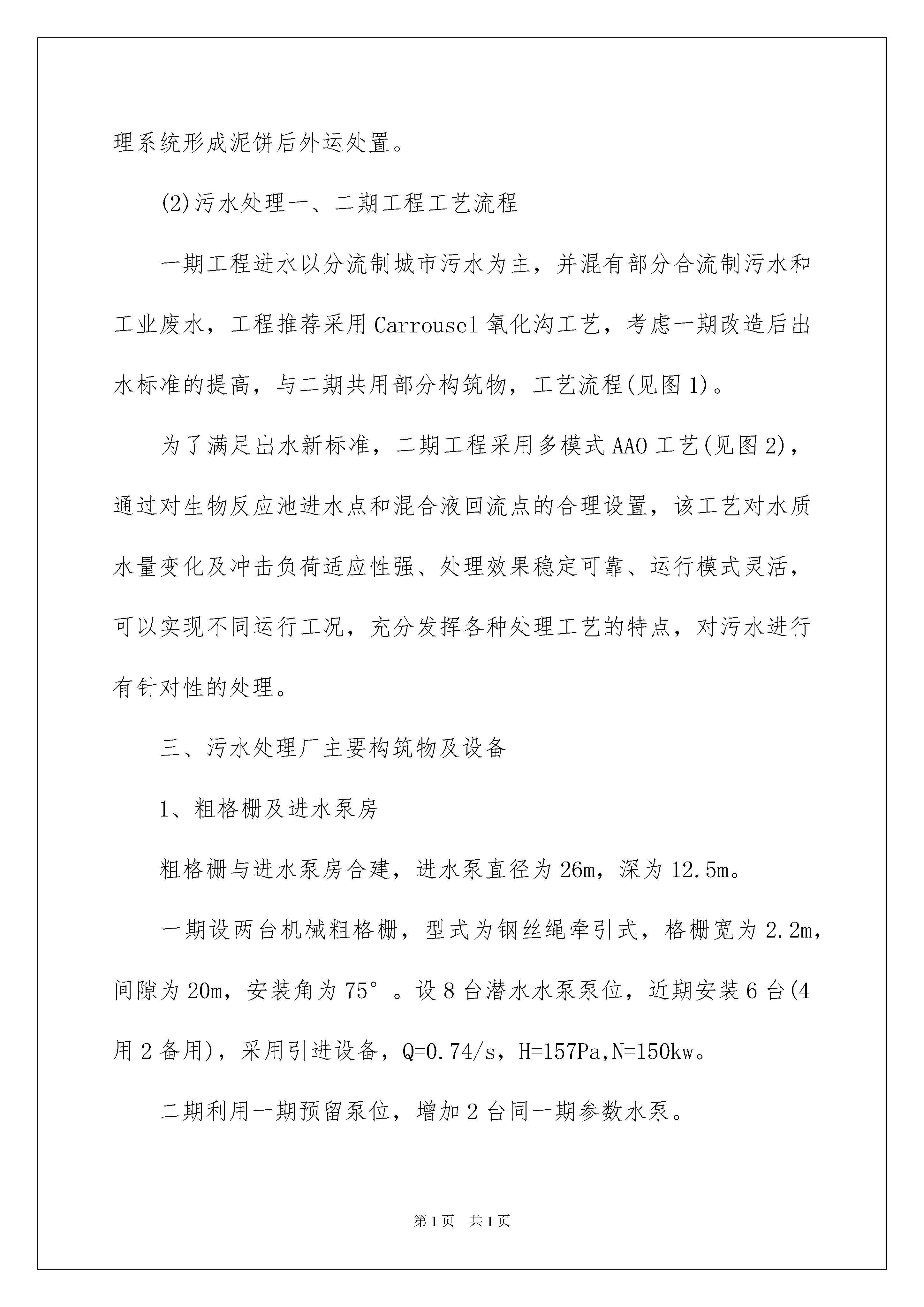 2022工程类实习报告汇总7篇工程类实习报告汇总7篇随着个人的文明素养不断提升,报告的使用频率呈上升趋势,我们在写报告的时候要注意语言要准确、简洁。那么大家知道标准正式的报告格式吗?以下是我收集整理的工程类实习报告7篇,仅供参考,大家一起来看看吧。工程类实习报告篇1一、概况福州市xx污水处理厂位于著名风景名胜区鼓山南麓。厂区占地面积23.7公顷,其远期规划为日处理污水70万吨,一期设计日处理污水20万吨,二期设计日处理污水达到30万吨,考虑近远期结合,按日处理污水30万吨规模一次征地。一期工程总投资为8.1亿元,其中厂区2.8亿元,厂外管网系统5.3亿元,新建污水管道182公里,疏浚、修复、连通旧管道70公里,厂外建有四座中途提升泵站。服务范围东至鼓山脚下,南至闽江,西至白马河及西湖以东,北至铁路线,同时,承担处理福州西区的部分污水。服务总面积为58平方公里,服务人口近100万人。采用卡鲁塞尔氧化沟处理工艺,处理后的尾水排入光明港,厂内设备精良,主要设备从美国、德国及瑞典引进。本厂是福建省实施污水与垃圾处理行业产业化政策后,第一个实行企业化管理的污水处理厂。从建设到运转,市委、市政府及主管局高度重视洋里污水处理厂的各项工作。按照规划,城市排水实行雨污分流制,有效的提高了进厂水质和处理效果。收纳污水以点源和面源相结合,由于加大了污水管网投资力度,增加了接纳点,扩大了接纳面,取得了较好的污水收纳效果。本厂于20xx年1月1日开始通水试运行,20xx年5月底顺利完成活性污泥的培养,6月以后,污水处理进入正常运行阶段。20xx年4月,洋里污水处理厂日平均处理污水达20.5万吨,从而达到20万吨的设计规模,实现满负荷运转。洋里污水处理厂自建成投入运行以来,设备运行良好,出水排放水质达到设计标准和建设要求。从运行情况与环境效益方面看,洋里污水处理厂的建成和正常运行,对改善福州市水环境已经初见成效。福州市城区主要内河水质以及功能明显好转,内河污染状况得到有效控制。本项目的建设为福州市经济可持续发展奠定了必要的基础,对福州市水资源的再生利用、改善城市生态环境、美化城市居民生活环境起到至关重要的作用。为创建“国家环境保护模范城市”及“国家卫生城市”,全面建设小康社会提供了重要基础条件。二、污水处理厂工艺流程(1)首先洋里污水处理厂采用卡鲁塞尔氧化沟处理工艺,主要包括预处理系统、生物处理系统和污泥处理系统三个部分。预处理系统由粗格栅、进水泵房、细格栅、比氏沉砂池等部分组成,用于提升污水水位及去除水中漂浮物和砂粒;生物处理系统由卡鲁塞尔氧化沟、方形二沉池、回流污泥及剩余污泥泵房等部分组成,通过氧化沟内活性污泥中的微生物的新陈代谢来降解污水中的污染物质;污泥处理系统由均质池和污泥浓缩脱水一体机组成,用于对生物处理系统中的剩余污泥进行浓缩脱水,降低污泥的含水率和体积,以便外运处置。厂外管网建有4座中途提升泵站,分别为:温泉泵站、三八泵站、金铛泵站、0号泵站。各社区排放的生活污水经管网和四个泵站输送至厂区,依次经过预处理系统和生物处理系统后,出水各项指标均达到设计标准,处理后的尾水就近排入光明港。剩余污泥经泥处理系统形成泥饼后外运处置。(2)污水处理一、二期工程工艺流程一期工程进水以分流制城市污水为主,并混有部分合流制污水和工业废水,工程推荐采用Carrousel氧化沟工艺,考虑一期改造后出水标准的提高,与二期共用部分构筑物,工艺流程(见图1)。为了满足出水新标准,二期工程采用多模式AAO工艺(见图2),通过对生物反应池进水点和混合液回流点的合理设置,该工艺对水质水量变化及冲击负荷适应性强、处理效果稳定可靠、运行模式灵活,可以实现不同运行工况,充分发挥各种处理工艺的特点,对污水进行有针对性的处理。三、污水处理厂主要构筑物及设备1、粗格栅及进水泵房粗格栅与进水泵房合建,进水泵直径为26m,深为12.5m。一期设两台机械粗格栅,型式为钢丝绳牵引式,格栅宽为2.2m,间隙为20m,安装角为75°。设8台潜水水泵泵位,近期安装6台(4用2备用),采用引进设备,Q=0.74/s,H=157Pa,N=150kw。二期利用一期预留泵位,增加2台同一期参数水泵。2、细格栅细格栅渠与旋流沉砂池相连,一期按20×m/s规模设计,共设4台回转式细格栅,单台宽度1.5m,间隔为6nm,a=45°,采用不锈钢316耙齿。针对一期采用的耙齿回转式细格栅对垃圾去除率较低的缺点,二期细格采用转鼓式细格栅。主要设备:转鼓式细格栅2台,直径1800nm,b=6nm,p=1.5kw,a=35°。3、旋转沉砂池旋转沉砂池一期按20×10m