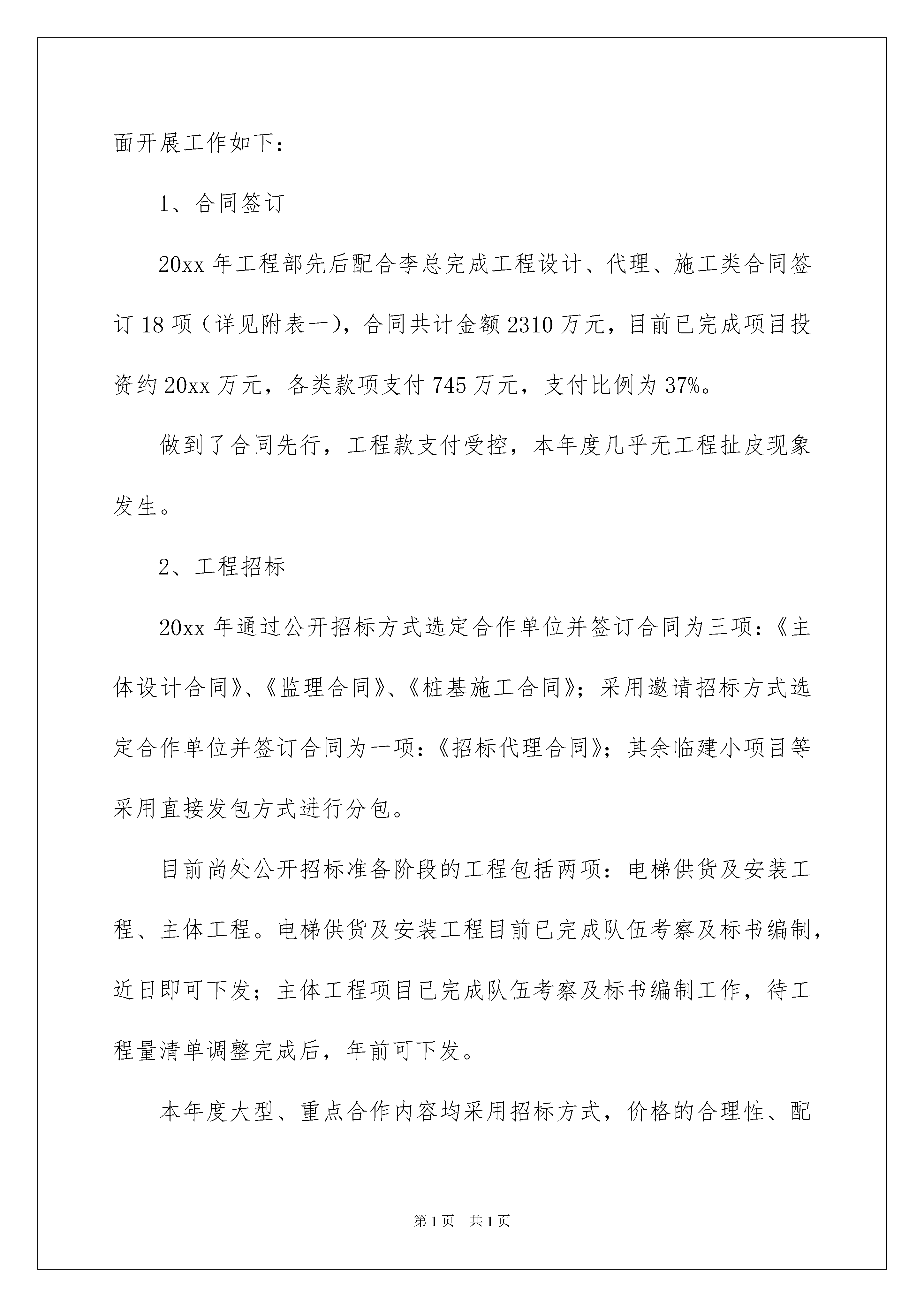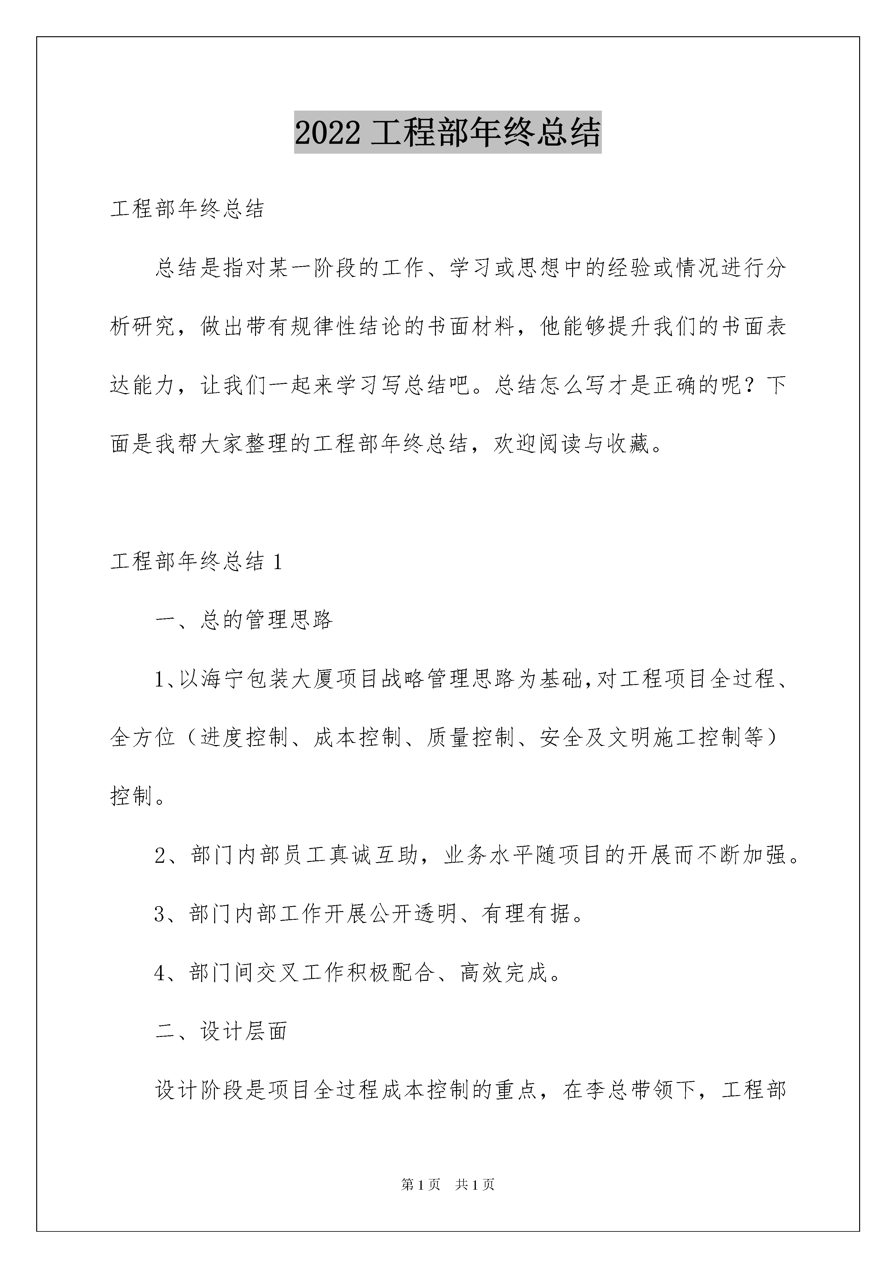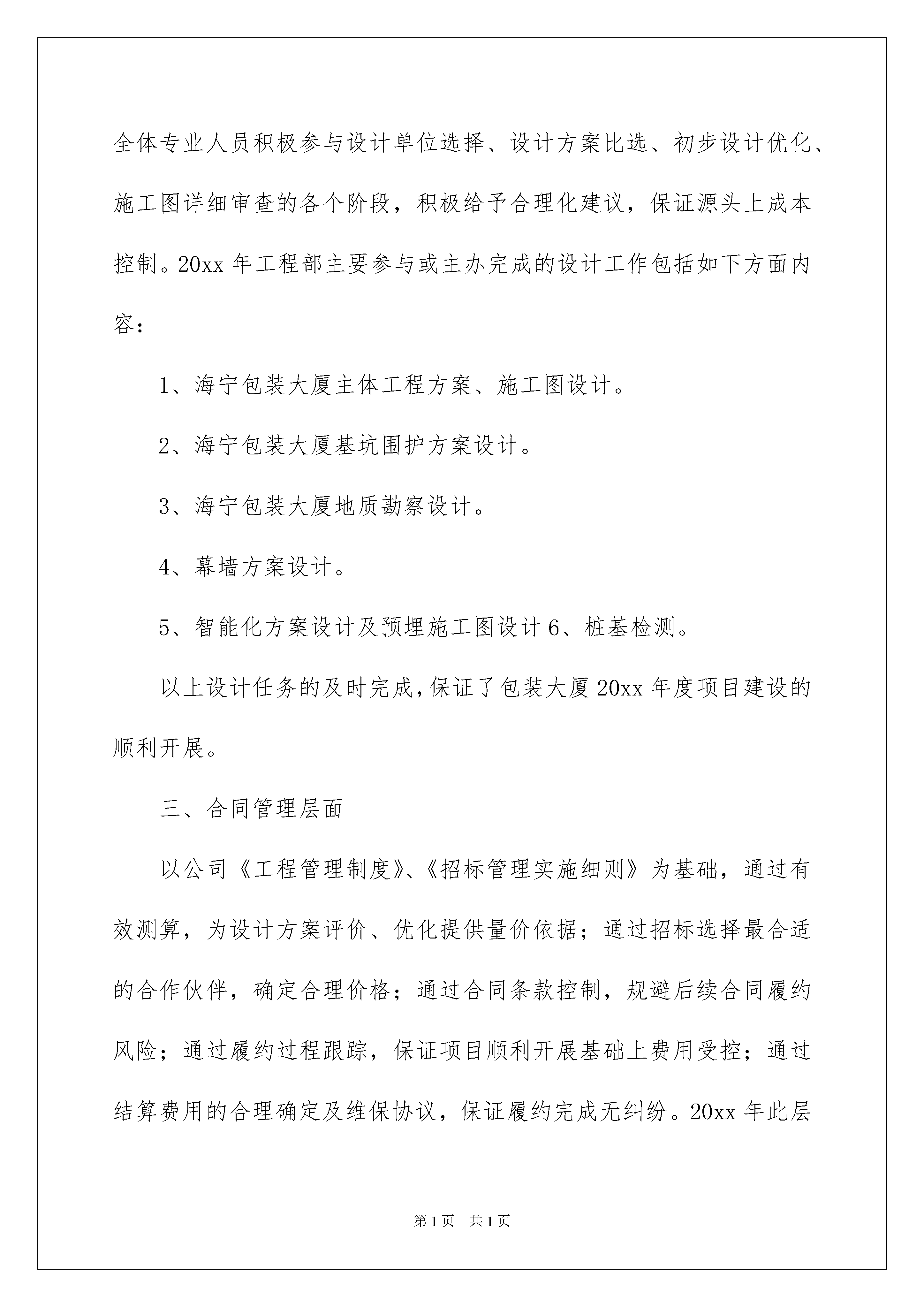 2022工程部年终总结工程部年终总结总结是指对某一阶段的工作、学习或思想中的经验或情况进行分析研究,做出带有规律性结论的书面材料,他能够提升我们的书面表达能力,让我们一起来学习写总结吧。总结怎么写才是正确的呢?下面是我帮大家整理的工程部年终总结,欢迎阅读与收藏。工程部年终总结1一、总的管理思路1、以海宁包装大厦项目战略管理思路为基础,对工程项目全过程、全方位(进度控制、成本控制、质量控制、安全及文明施工控制等)控制。2、部门内部员工真诚互助,业务水平随项目的开展而不断加强。3、部门内部工作开展公开透明、有理有据。4、部门间交叉工作积极配合、高效完成。二、设计层面设计阶段是项目全过程成本控制的重点,在李总带领下,工程部全体专业人员积极参与设计单位选择、设计方案比选、初步设计优化、施工图详细审查的各个阶段,积极给予合理化建议,保证源头上成本控制。20xx年工程部主要参与或主办完成的设计工作包括如下方面内容:1、海宁包装大厦主体工程方案、施工图设计。2、海宁包装大厦基坑围护方案设计。3、海宁包装大厦地质勘察设计。4、幕墙方案设计。5、智能化方案设计及预埋施工图设计6、桩基检测。以上设计任务的及时完成,保证了包装大厦20xx年度项目建设的顺利开展。三、合同管理层面以公司《工程管理制度》、《招标管理实施细则》为基础,通过有效测算,为设计方案评价、优化提供量价依据;通过招标选择最合适的合作伙伴,确定合理价格;通过合同条款控制,规避后续合同履约风险;通过履约过程跟踪,保证项目顺利开展基础上费用受控;通过结算费用的合理确定及维保协议,保证履约完成无纠纷。20xx年此层面开展工作如下:1、合同签订20xx年工程部先后配合李总完成工程设计、代理、施工类合同签订18项(详见附表一),合同共计金额2310万元,目前已完成项目投资约20xx万元,各类款项支付745万元,支付比例为37%。做到了合同先行,工程款支付受控,本年度几乎无工程扯皮现象发生。2、工程招标20xx年通过公开招标方式选定合作单位并签订合同为三项:《主体设计合同》、《监理合同》、《桩基施工合同》;采用邀请招标方式选定合作单位并签订合同为一项:《招标代理合同》;其余临建小项目等采用直接发包方式进行分包。目前尚处公开招标准备阶段的工程包括两项:电梯供货及安装工程、主体工程。电梯供货及安装工程目前已完成队伍考察及标书编制,近日即可下发;主体工程项目已完成队伍考察及标书编制工作,待工程量清单调整完成后,年前可下发。本年度大型、重点合作内容均采用招标方式,价格的合理性、配合单位的高素质、工程的顺利开展得到了有效保证。3、工程结算工程各类结算均以合同为依据,本年度已全面完成合同任务11项、目前已结算完成10项(桩基工程尚未开始结算),结算完成率91%。四、施工管理层面20xx年海宁包装大厦项目主要是开展项目前期准备及桩基施工(桩基先行)工作,故本年度主要是桩基施工的管理,具体情况如下:(一)进度管理层面:20xx年8月23日海宁包装大厦桩基工程正式开工,工程实际完工日期为12月14日,总工期为106天,合同计划工期为85天,对比合同工期,总工期拖后21天,未能如期完成的主要原因:1、海宁地方政府原因,导致淤泥无法外运,直接影响工期。2、施工过程中孤石、原住宅基础等地质条件对工期有一定影响。3、园区另外三家单位已经基本明确今年不打桩,这样园区四个项目总体进度上无论怎样我方项目均会提前,此外年前总包单位尚未选定,打桩后期我方在现场管理上更加强调工程质量,对桩基滞后有一定影响。总体上桩基工程进度是受控的。(二)质量管理层面质量控制尤其是对隐蔽工程的质量控制是工程管理的重点,工程部着重从以下几方面对项目进行质量管理:1、前期控制:开工前即会同设计单位、监理单位及施工方代表召开交底会,明确工程潜在质量控制难点、重点,深入探讨,就一些关键问题进行了详细交底,做到事前控制;2、工序控制:过程中监理单位及我方工程师对每根桩施工都会认真检查,严格工序控制,每道工序都要求监理工程师现场签字确认,方允许进行下道工序施工;3、技术跟进:施工工程中遇到的各种技术难题,保证第一时间与设计单位沟通(如有必要会请设计单位交底),待设计单位明确/确认相关改进方案后组织实施;4、原材料控制:对现场进场的每车砼、每批次钢筋均有详细记录,严格进场材料品牌、厂商控制,跟进试块、试件的检测结果,及时纠偏确保材料的合格使用;5、例会制度:采用定时例会与随机例会相结合的办法,定时例会为每周四,坚持例会是发现问题的例会也是解决问题的例会思路,有问题,有潜在风险,例会上能解决马上解决,无法当场