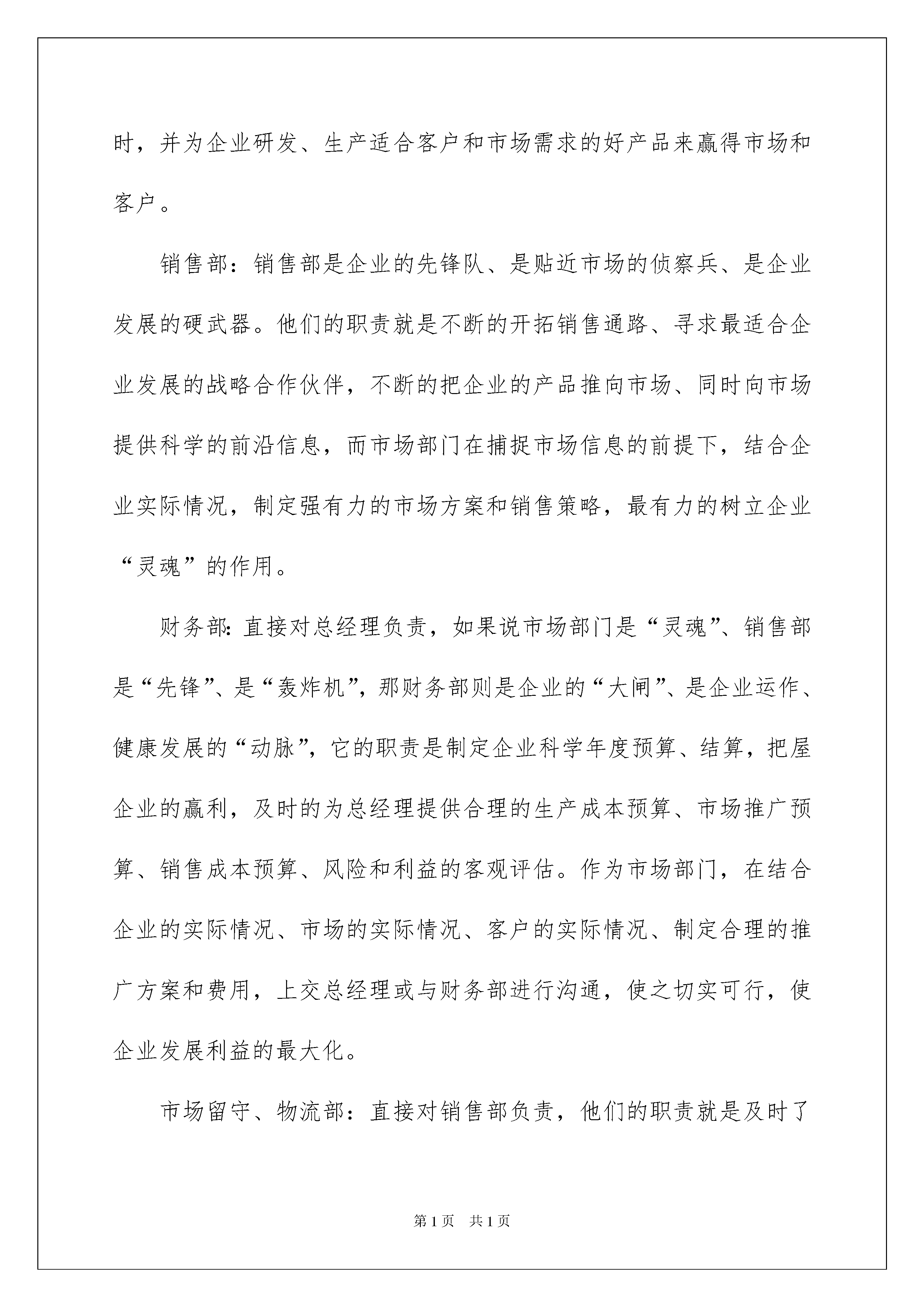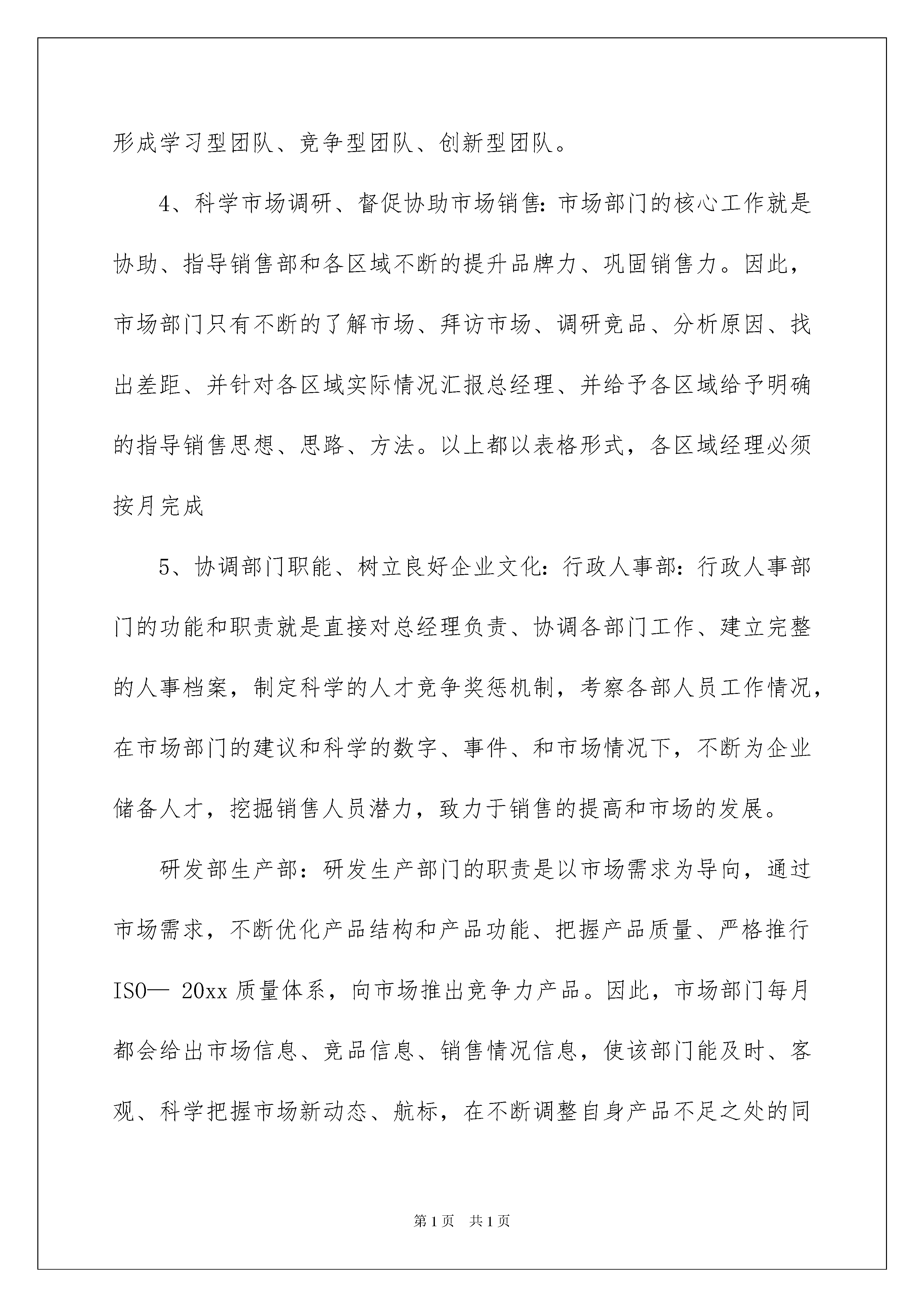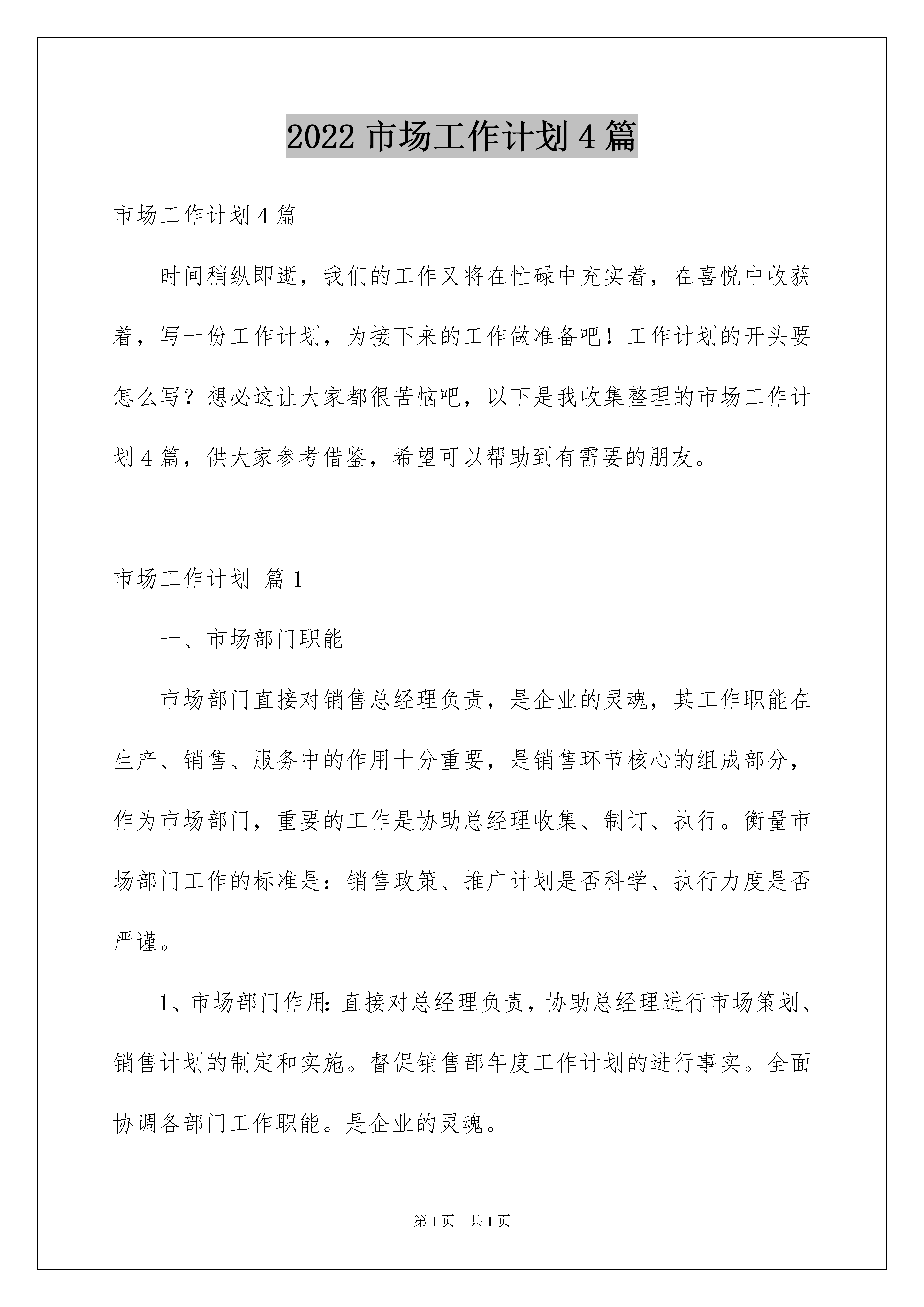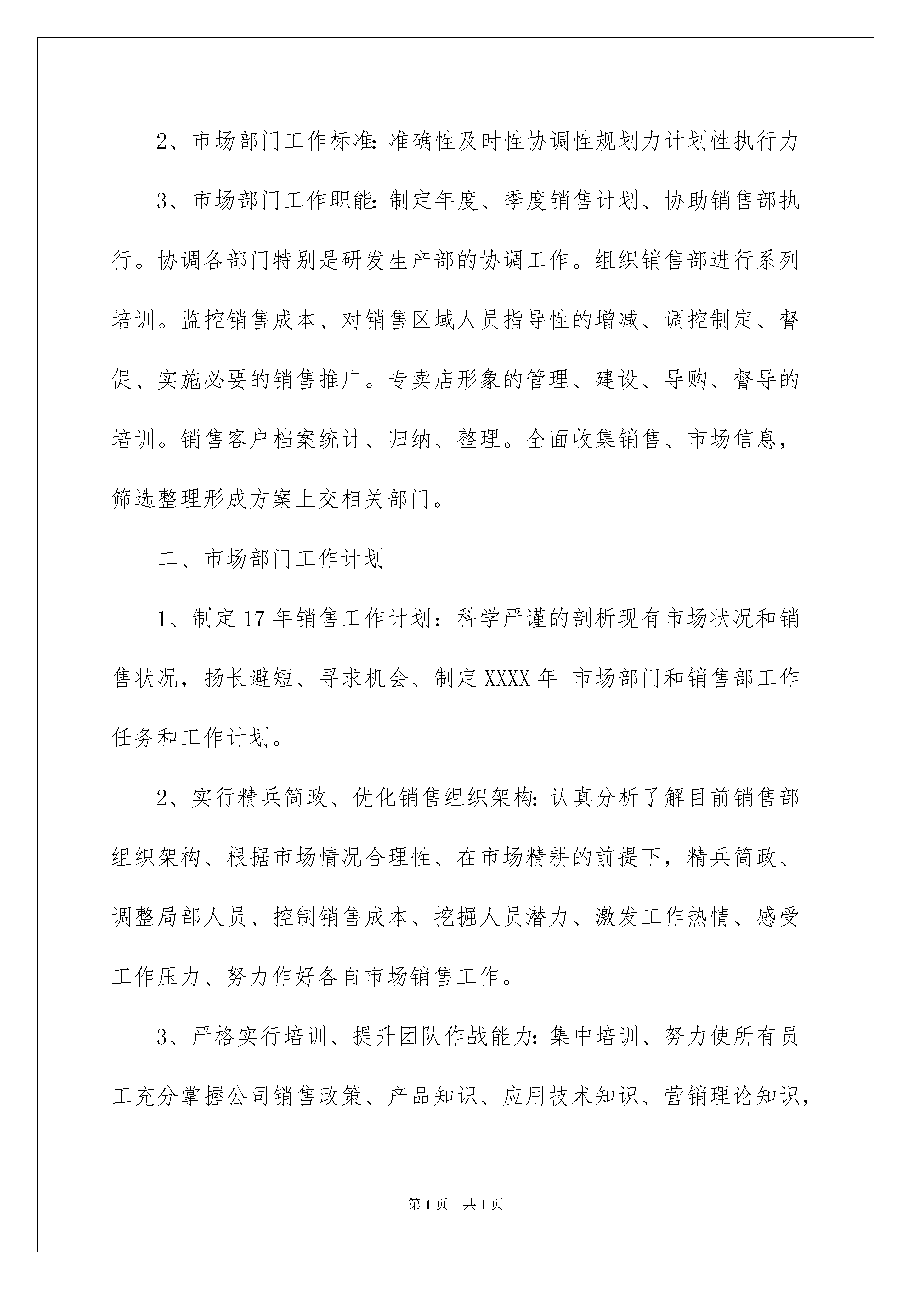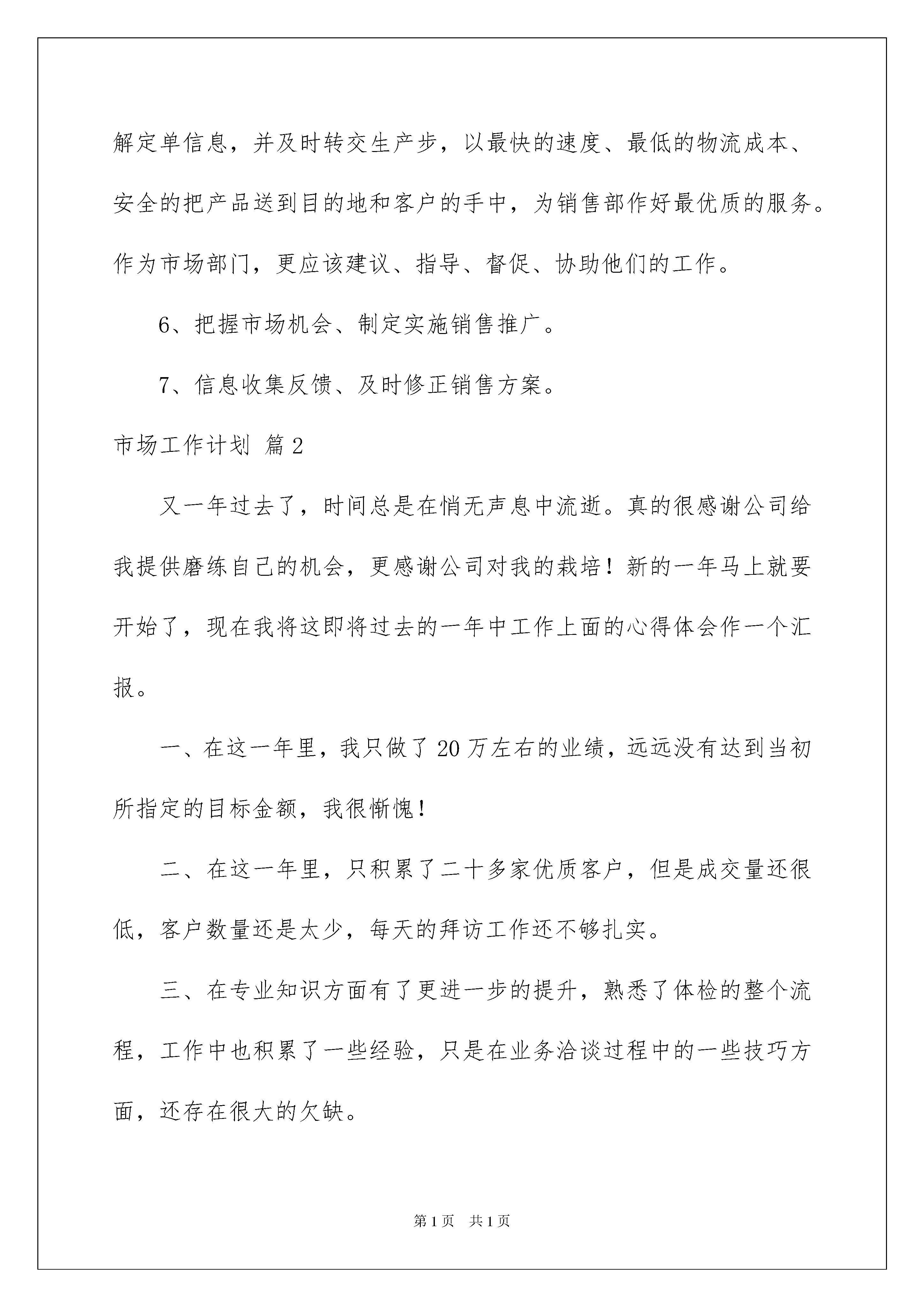 2022市场工作计划4篇市场工作计划4篇时间稍纵即逝,我们的工作又将在忙碌中充实着,在喜悦中收获着,写一份工作计划,为接下来的工作做准备吧!工作计划的开头要怎么写?想必这让大家都很苦恼吧,以下是我收集整理的市场工作计划4篇,供大家参考借鉴,希望可以帮助到有需要的朋友。市场工作计划篇1一、市场部门职能市场部门直接对销售总经理负责,是企业的灵魂,其工作职能在生产、销售、服务中的作用十分重要,是销售环节核心的组成部分,作为市场部门,重要的工作是协助总经理收集、制订、执行。衡量市场部门工作的标准是:销售政策、推广计划是否科学、执行力度是否严谨。1、市场部门作用:直接对总经理负责,协助总经理进行市场策划、销售计划的制定和实施。督促销售部年度工作计划的进行事实。全面协调各部门工作职能。是企业的灵魂。2、市场部门工作标准:准确性及时性协调性规划力计划性执行力3、市场部门工作职能:制定年度、季度销售计划、协助销售部执行。协调各部门特别是研发生产部的协调工作。组织销售部进行系列培训。监控销售成本、对销售区域人员指导性的增减、调控制定、督促、实施必要的销售推广。专卖店形象的管理、建设、导购、督导的培训。销售客户档案统计、归纳、整理。全面收集销售、市场信息,筛选整理形成方案上交相关部门。二、市场部门工作计划1、制定17年销售工作计划:科学严谨的剖析现有市场状况和销售状况,扬长避短、寻求机会、制定XXXX年市场部门和销售部工作任务和工作计划。2、实行精兵简政、优化销售组织架构:认真分析了解目前销售部组织架构、根据市场情况合理性、在市场精耕的前提下,精兵简政、调整局部人员、控制销售成本、挖掘人员潜力、激发工作热情、感受工作压力、努力作好各自市场销售工作。3、严格实行培训、提升团队作战能力:集中培训、努力使所有员工充分掌握公司销售政策、产品知识、应用技术知识、营销理论知识,形成学习型团队、竞争型团队、创新型团队。4、科学市场调研、督促协助市场销售:市场部门的核心工作就是协助、指导销售部和各区域不断的提升品牌力、巩固销售力。因此,市场部门只有不断的了解市场、拜访市场、调研竞品、分析原因、找出差距、并针对各区域实际情况汇报总经理、并给予各区域给予明确的指导销售思想、思路、方法。以上都以表格形式,各区域经理必须按月完成5、协调部门职能、树立良好企业文化:行政人事部:行政人事部门的功能和职责就是直接对总经理负责、协调各部门工作、建立完整的人事档案,制定科学的人才竞争奖惩机制,考察各部人员工作情况,在市场部门的建议和科学的数字、事件、和市场情况下,不断为企业储备人才,挖掘销售人员潜力,致力于销售的提高和市场的发展。研发部生产部:研发生产部门的职责是以市场需求为导向,通过市场需求,不断优化产品结构和产品功能、把握产品质量、严格推行ISO—20xx质量体系,向市场推出竞争力产品。因此,市场部门每月都会给出市场信息、竞品信息、销售情况信息,使该部门能及时、客观、科学把握市场新动态、航标,在不断调整自身产品不足之处的同时,并为企业研发、生产适合客户和市场需求的好产品来赢得市场和客户。销售部:销售部是企业的先锋队、是贴近市场的侦察兵、是企业发展的硬武器。他们的职责就是不断的开拓销售通路、寻求最适合企业发展的战略合作伙伴,不断的把企业的产品推向市场、同时向市场提供科学的前沿信息,而市场部门在捕捉市场信息的前提下,结合企业实际情况,制定强有力的市场方案和销售策略,最有力的树立企业“灵魂”的作用。财务部:直接对总经理负责,如果说市场部门是“灵魂”、销售部是“先锋”、是“轰炸机”,那财务部则是企业的“大闸”、是企业运作、健康发展的“动脉”,它的职责是制定企业科学年度预算、结算,把屋企业的赢利,及时的为总经理提供合理的生产成本预算、市场推广预算、销售成本预算、风险和利益的客观评估。作为市场部门,在结合企业的实际情况、市场的实际情况、客户的实际情况、制定合理的推广方案和费用,上交总经理或与财务部进行沟通,使之切实可行,使企业发展利益的最大化。市场留守、物流部:直接对销售部负责,他们的职责就是及时了解定单信息,并及时转交生产步,以最快的速度、最低的物流成本、安全的把产品送到目的地和客户的手中,为销售部作好最优质的服务。作为市场部门,更应该建议、指导、督促、协助他们的工作。6、把握市场机会、制定实施销售推广。7、信息收集反馈、及时修正销售方案。市场工作计划篇2又一年过去了,时间总是在悄无声息中流逝。真的很感谢公司给我提供磨练自己的机会,更感谢公司对我的栽培!新的一年马上就要开始了,现在我将这即将过去的一年中工作上面的心得体会作一个汇报