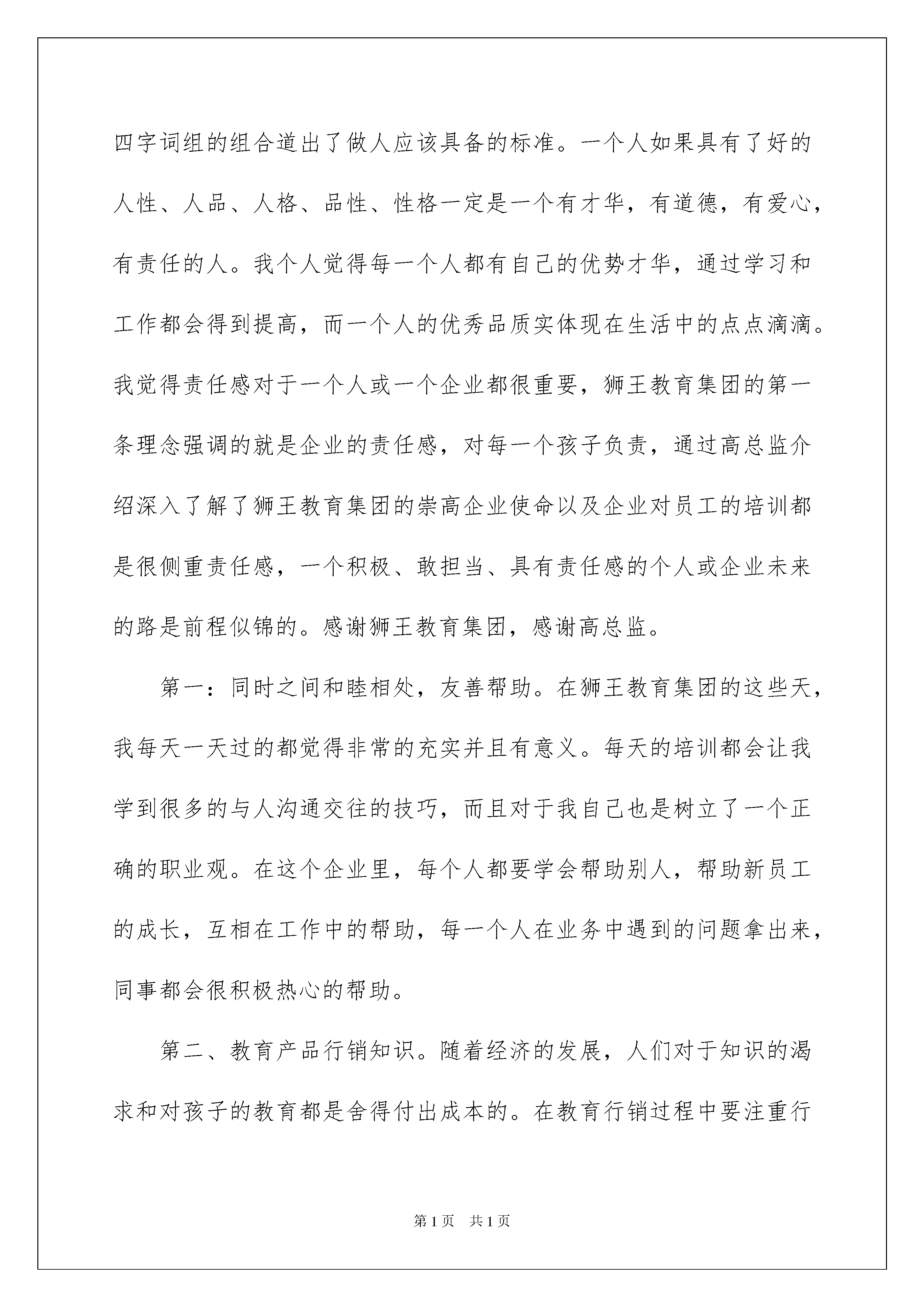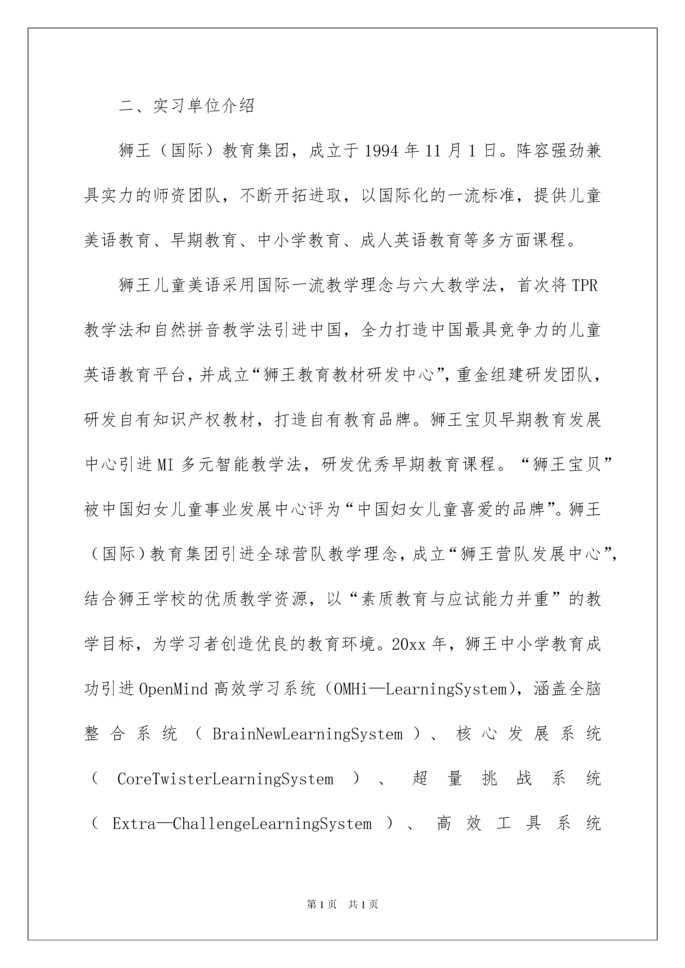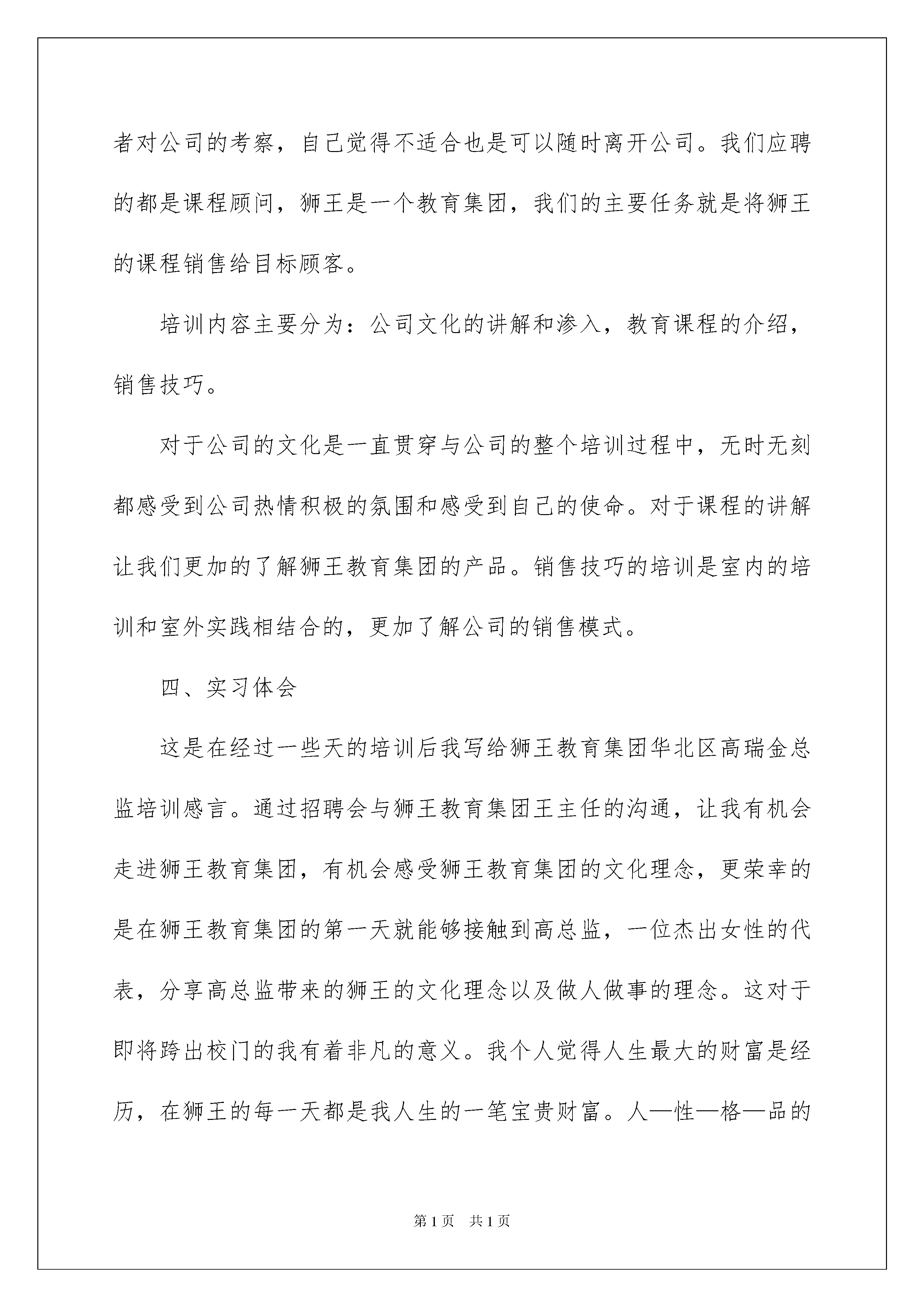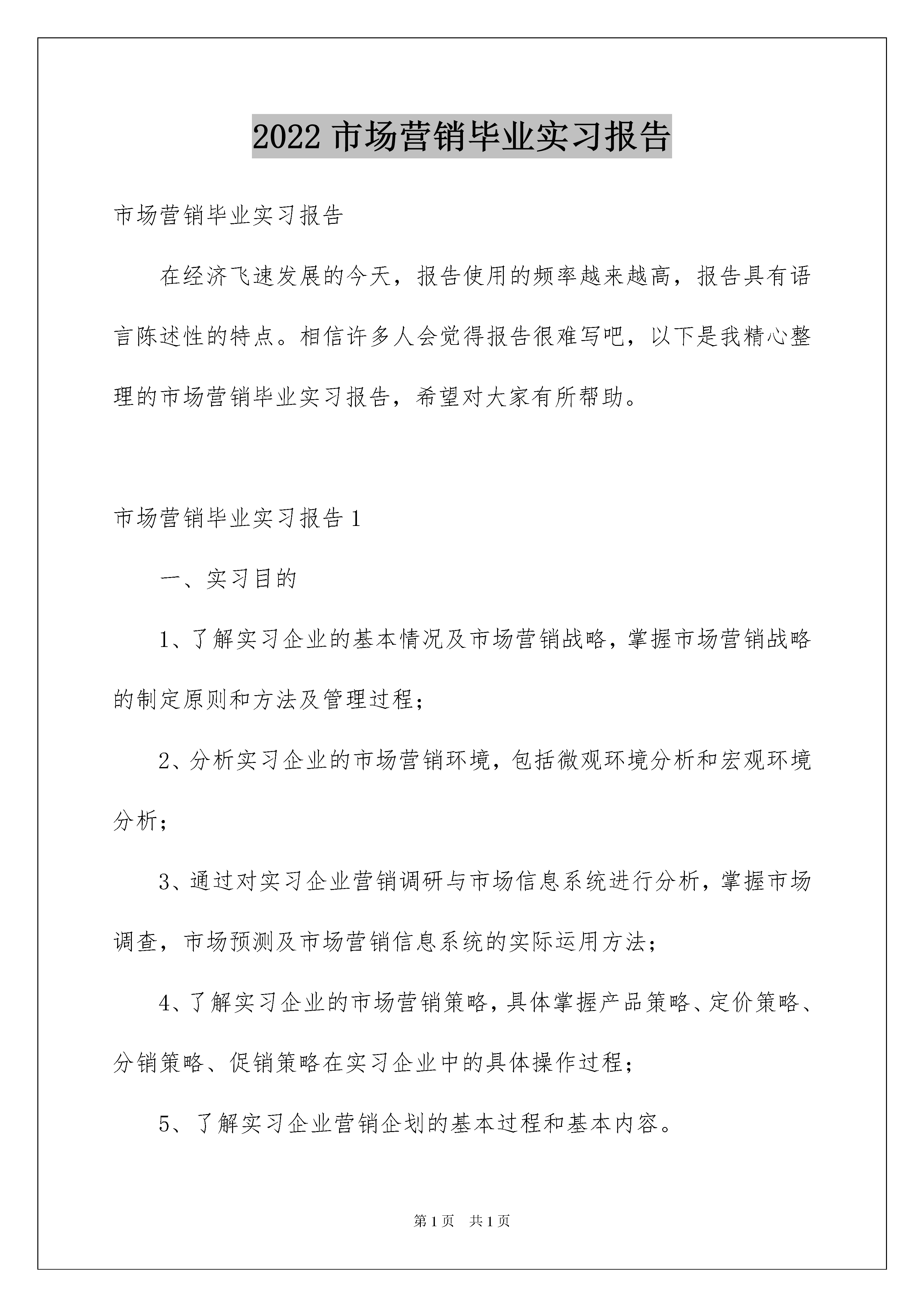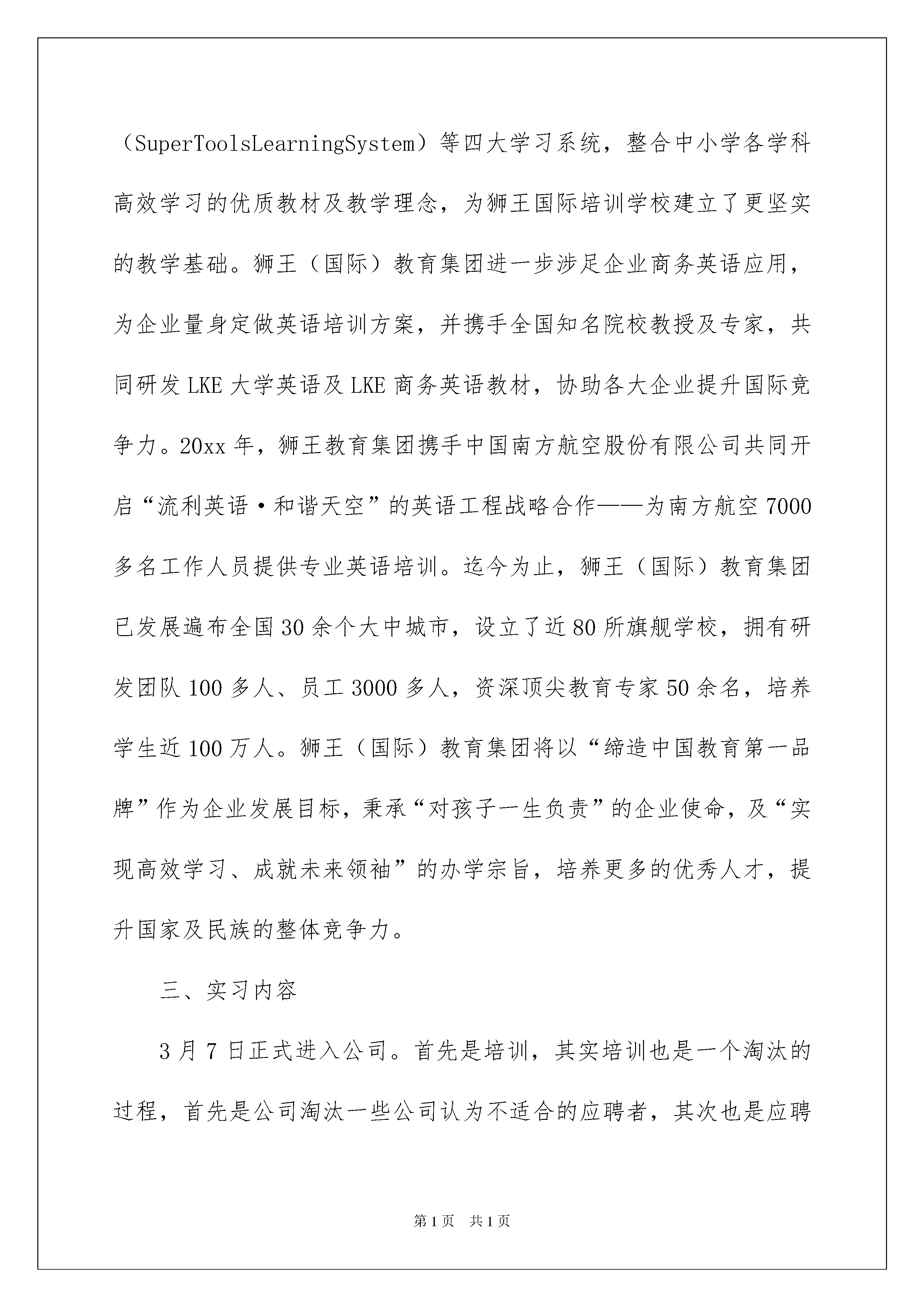2022市场营销毕业实习报告市场营销毕业实习报告在经济飞速发展的今天,报告使用的频率越来越高,报告具有语言陈述性的特点。相信许多人会觉得报告很难写吧,以下是我精心整理的市场营销毕业实习报告,希望对大家有所帮助。市场营销毕业实习报告1一、实习目的1、了解实习企业的基本情况及市场营销战略,掌握市场营销战略的制定原则和方法及管理过程;2、分析实习企业的市场营销环境,包括微观环境分析和宏观环境分析;3、通过对实习企业营销调研与市场信息系统进行分析,掌握市场调查,市场预测及市场营销信息系统的实际运用方法;4、了解实习企业的市场营销策略,具体掌握产品策略、定价策略、分销策略、促销策略在实习企业中的具体操作过程;5、了解实习企业营销企划的基本过程和基本内容。二、实习单位介绍狮王(国际)教育集团,成立于1994年11月1日。阵容强劲兼具实力的师资团队,不断开拓进取,以国际化的一流标准,提供儿童美语教育、早期教育、中小学教育、成人英语教育等多方面课程。狮王儿童美语采用国际一流教学理念与六大教学法,首次将TPR教学法和自然拼音教学法引进中国,全力打造中国最具竞争力的儿童英语教育平台,并成立“狮王教育教材研发中心”,重金组建研发团队,研发自有知识产权教材,打造自有教育品牌。狮王宝贝早期教育发展中心引进MI多元智能教学法,研发优秀早期教育课程。“狮王宝贝”被中国妇女儿童事业发展中心评为“中国妇女儿童喜爱的品牌”。狮王(国际)教育集团引进全球营队教学理念,成立“狮王营队发展中心”,结合狮王学校的优质教学资源,以“素质教育与应试能力并重”的教学目标,为学习者创造优良的教育环境。20xx年,狮王中小学教育成功引进OpenMind高效学习系统(OMHi—LearningSystem),涵盖全脑整合系统(BrainNewLearningSystem)、核心发展系统(CoreTwisterLearningSystem)、超量挑战系统(Extra—ChallengeLearningSystem)、高效工具系统(SuperToolsLearningSystem)等四大学习系统,整合中小学各学科高效学习的优质教材及教学理念,为狮王国际培训学校建立了更坚实的教学基础。狮王(国际)教育集团进一步涉足企业商务英语应用,为企业量身定做英语培训方案,并携手全国知名院校教授及专家,共同研发LKE大学英语及LKE商务英语教材,协助各大企业提升国际竞争力。20xx年,狮王教育集团携手中国南方航空股份有限公司共同开启“流利英语·和谐天空”的英语工程战略合作——为南方航空7000多名工作人员提供专业英语培训。迄今为止,狮王(国际)教育集团已发展遍布全国30余个大中城市,设立了近80所旗舰学校,拥有研发团队100多人、员工3000多人,资深顶尖教育专家50余名,培养学生近100万人。狮王(国际)教育集团将以“缔造中国教育第一品牌”作为企业发展目标,秉承“对孩子一生负责”的企业使命,及“实现高效学习、成就未来领袖”的办学宗旨,培养更多的优秀人才,提升国家及民族的整体竞争力。三、实习内容3月7日正式进入公司。首先是培训,其实培训也是一个淘汰的过程,首先是公司淘汰一些公司认为不适合的应聘者,其次也是应聘者对公司的考察,自己觉得不适合也是可以随时离开公司。我们应聘的都是课程顾问,狮王是一个教育集团,我们的主要任务就是将狮王的课程销售给目标顾客。培训内容主要分为:公司文化的讲解和渗入,教育课程的介绍,销售技巧。对于公司的文化是一直贯穿与公司的整个培训过程中,无时无刻都感受到公司热情积极的氛围和感受到自己的使命。对于课程的讲解让我们更加的了解狮王教育集团的产品。销售技巧的培训是室内的培训和室外实践相结合的,更加了解公司的销售模式。四、实习体会这是在经过一些天的培训后我写给狮王教育集团华北区高瑞金总监培训感言。通过招聘会与狮王教育集团王主任的沟通,让我有机会走进狮王教育集团,有机会感受狮王教育集团的文化理念,更荣幸的是在狮王教育集团的第一天就能够接触到高总监,一位杰出女性的代表,分享高总监带来的狮王的文化理念以及做人做事的理念。这对于即将跨出校门的我有着非凡的意义。我个人觉得人生最大的财富是经历,在狮王的每一天都是我人生的一笔宝贵财富。人—性—格—品的四字词组的组合道出了做人应该具备的标准。一个人如果具有了好的人性、人品、人格、品性、性格一定是一个有才华,有道德,有爱心,有责任的人。我个人觉得每一个人都有自己的优势才华,通过学习和工作都会得到提高,而一个人的优秀品质实体现在生活中的点点滴滴。我觉得责任感对于一个人或一个企业都很重要,狮王教育集团的第