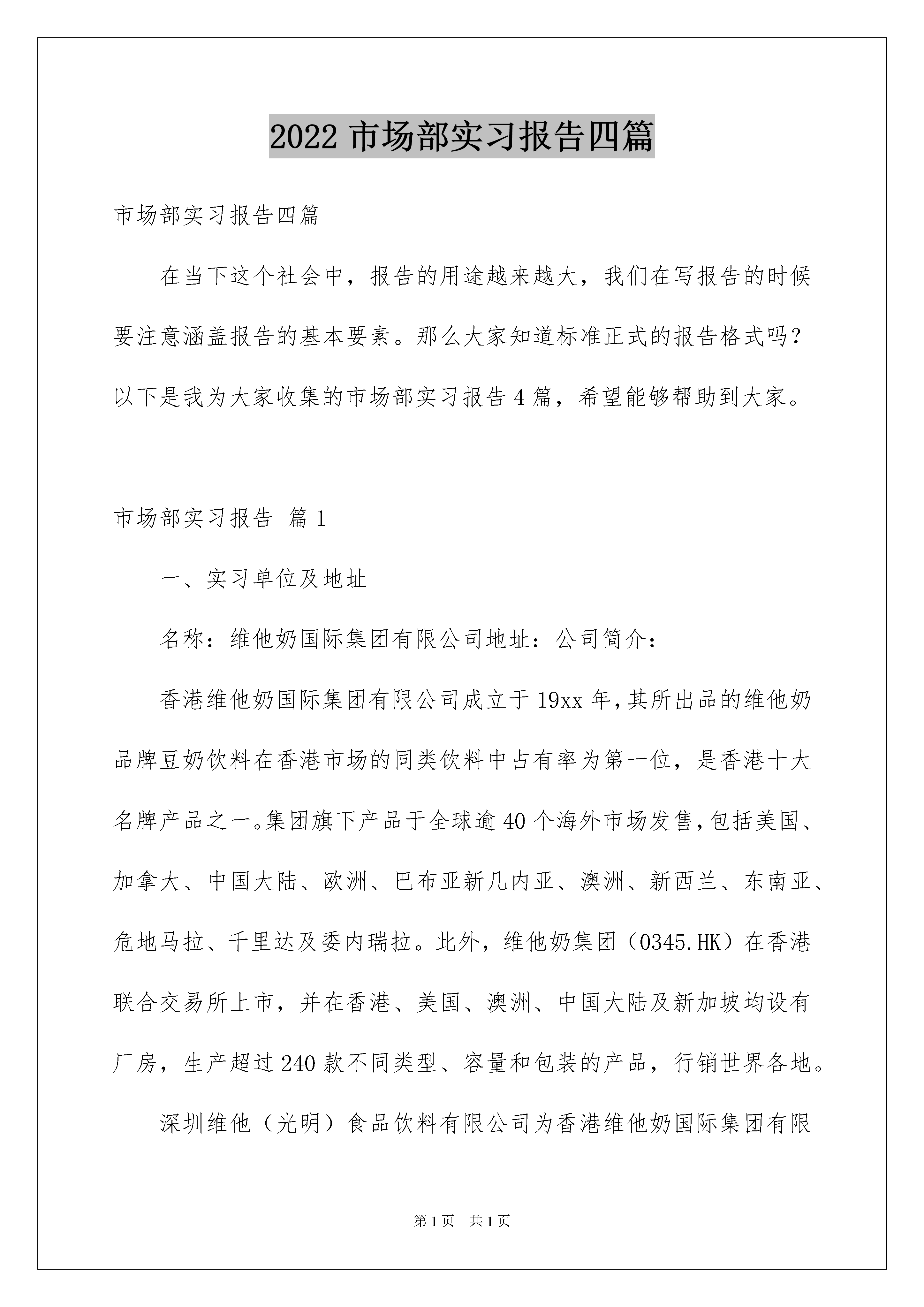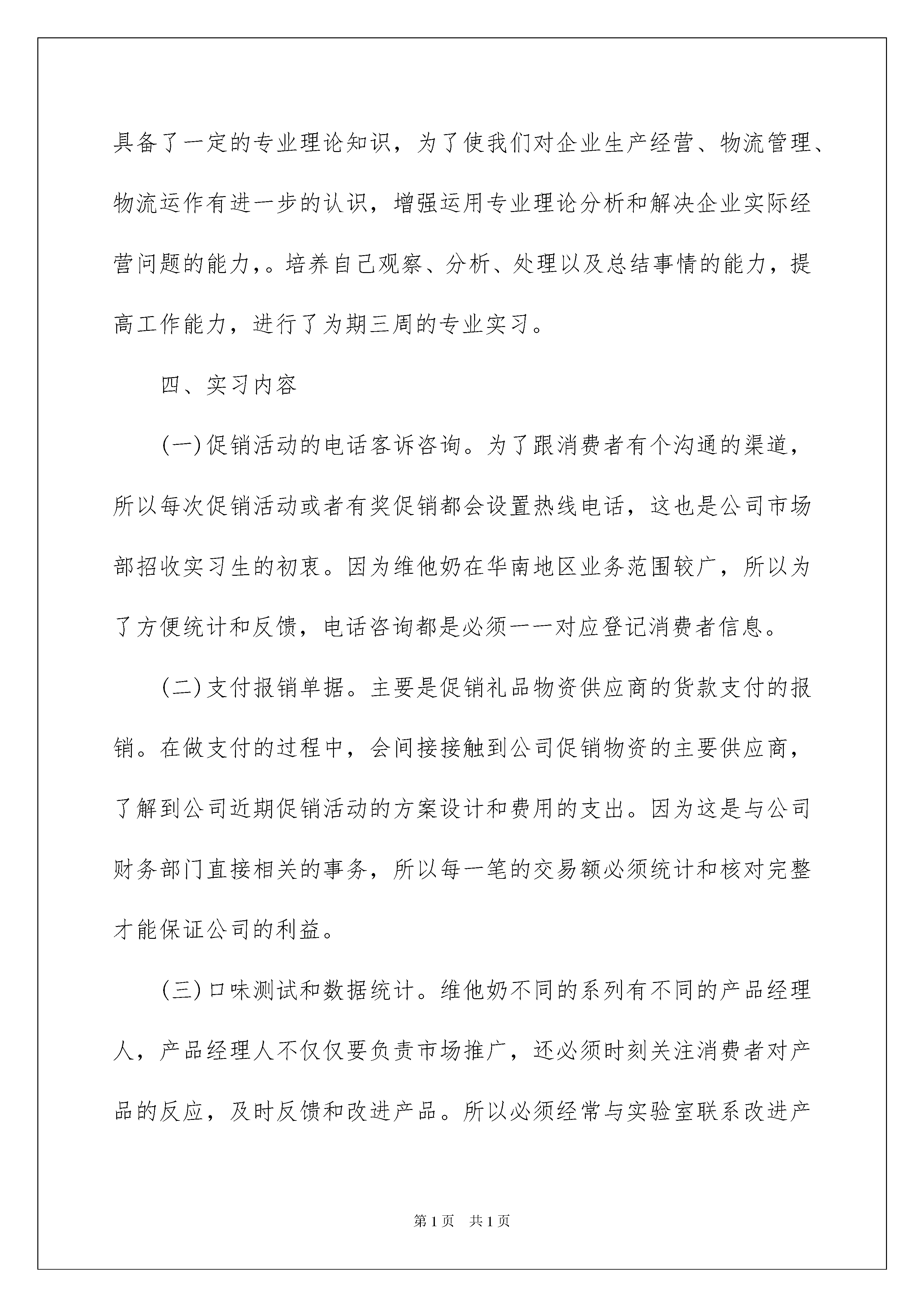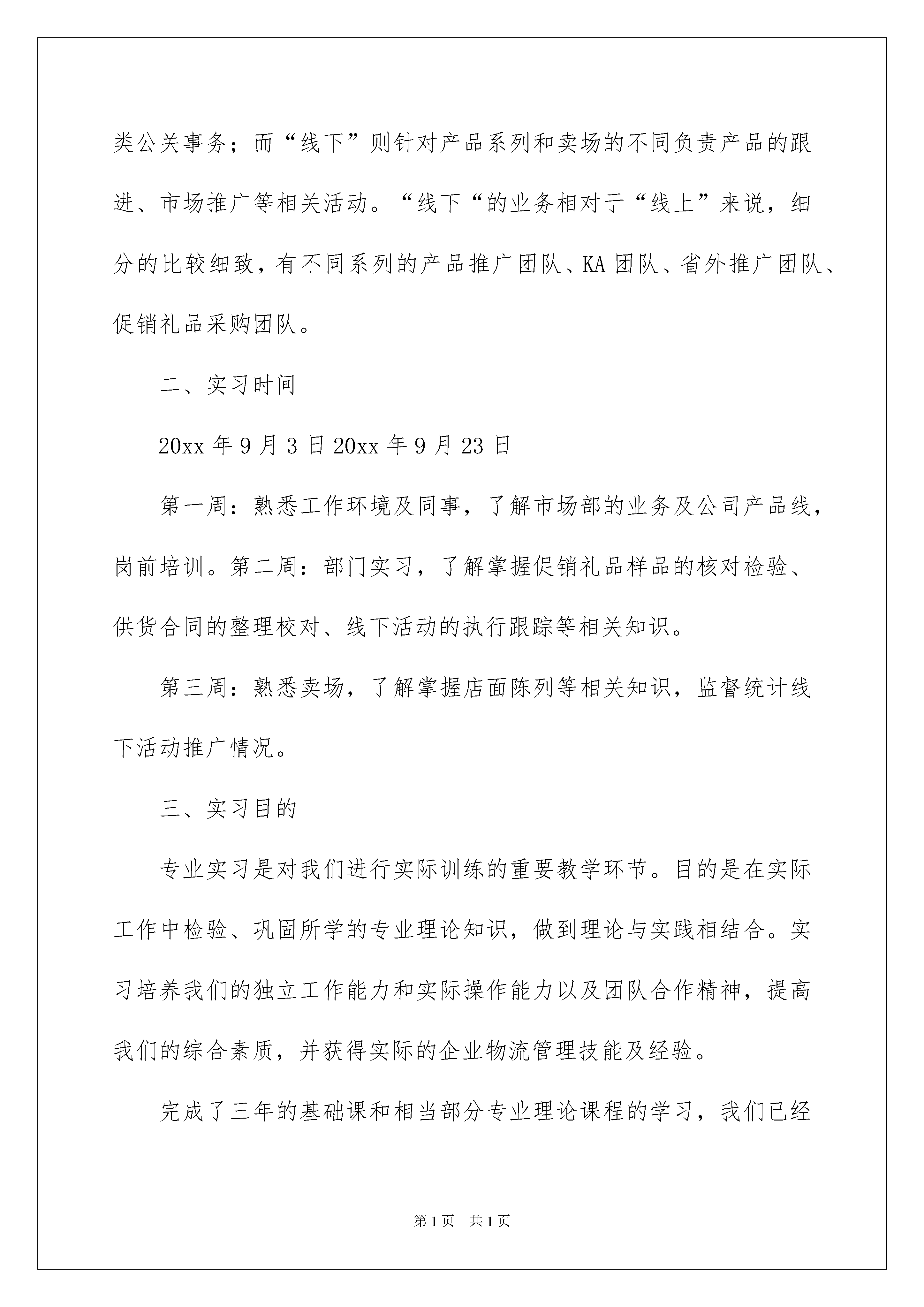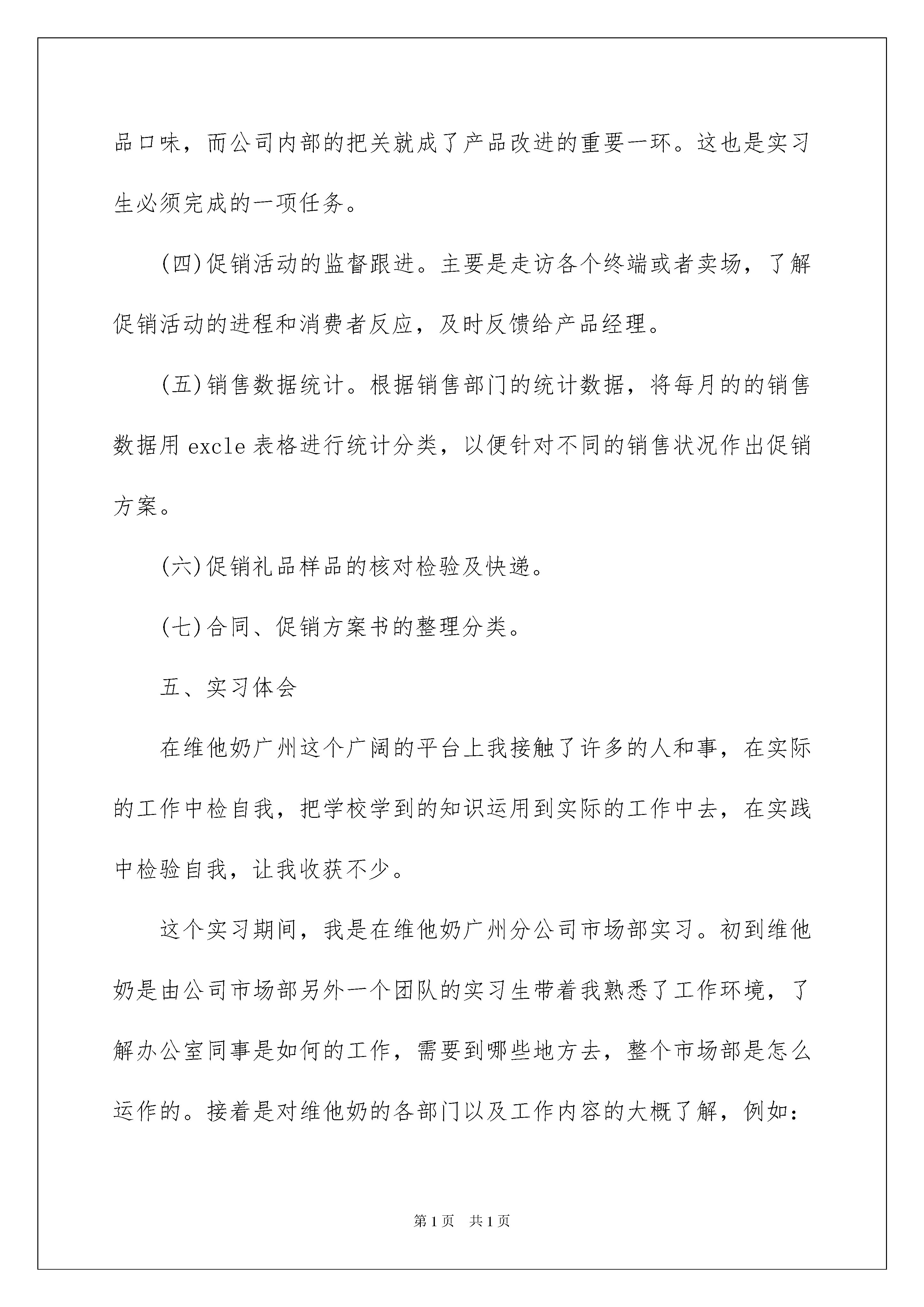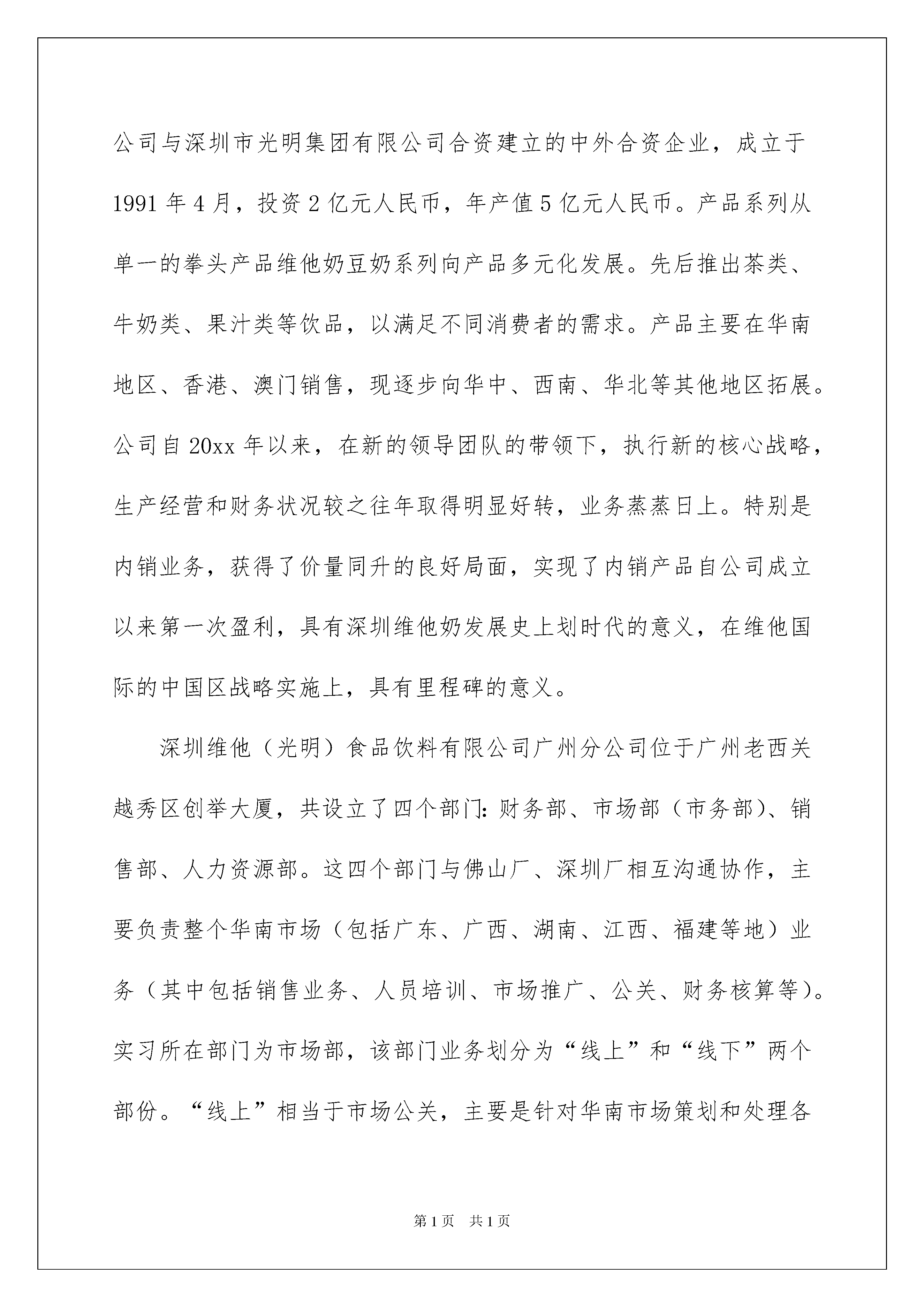 2022市场部实习报告四篇市场部实习报告四篇在当下这个社会中,报告的用途越来越大,我们在写报告的时候要注意涵盖报告的基本要素。那么大家知道标准正式的报告格式吗?以下是我为大家收集的市场部实习报告4篇,希望能够帮助到大家。市场部实习报告篇1一、实习单位及地址名称:维他奶国际集团有限公司地址:公司简介:香港维他奶国际集团有限公司成立于19xx年,其所出品的维他奶品牌豆奶饮料在香港市场的同类饮料中占有率为第一位,是香港十大名牌产品之一。集团旗下产品于全球逾40个海外市场发售,包括美国、加拿大、中国大陆、欧洲、巴布亚新几内亚、澳洲、新西兰、东南亚、危地马拉、千里达及委内瑞拉。此外,维他奶集团(0345.HK)在香港联合交易所上市,并在香港、美国、澳洲、中国大陆及新加坡均设有厂房,生产超过240款不同类型、容量和包装的产品,行销世界各地。深圳维他(光明)食品饮料有限公司为香港维他奶国际集团有限公司与深圳市光明集团有限公司合资建立的中外合资企业,成立于1991年4月,投资2亿元人民币,年产值5亿元人民币。产品系列从单一的拳头产品维他奶豆奶系列向产品多元化发展。先后推出茶类、牛奶类、果汁类等饮品,以满足不同消费者的需求。产品主要在华南地区、香港、澳门销售,现逐步向华中、西南、华北等其他地区拓展。公司自20xx年以来,在新的领导团队的带领下,执行新的核心战略,生产经营和财务状况较之往年取得明显好转,业务蒸蒸日上。特别是内销业务,获得了价量同升的良好局面,实现了内销产品自公司成立以来第一次盈利,具有深圳维他奶发展史上划时代的意义,在维他国际的中国区战略实施上,具有里程碑的意义。深圳维他(光明)食品饮料有限公司广州分公司位于广州老西关越秀区创举大厦,共设立了四个部门:财务部、市场部(市务部)、销售部、人力资源部。这四个部门与佛山厂、深圳厂相互沟通协作,主要负责整个华南市场(包括广东、广西、湖南、江西、福建等地)业务(其中包括销售业务、人员培训、市场推广、公关、财务核算等)。实习所在部门为市场部,该部门业务划分为“线上”和“线下”两个部份。“线上”相当于市场公关,主要是针对华南市场策划和处理各类公关事务;而“线下”则针对产品系列和卖场的不同负责产品的跟进、市场推广等相关活动。“线下“的业务相对于“线上”来说,细分的比较细致,有不同系列的产品推广团队、KA团队、省外推广团队、促销礼品采购团队。二、实习时间20xx年9月3日20xx年9月23日第一周:熟悉工作环境及同事,了解市场部的业务及公司产品线,岗前培训。第二周:部门实习,了解掌握促销礼品样品的核对检验、供货合同的整理校对、线下活动的执行跟踪等相关知识。第三周:熟悉卖场,了解掌握店面陈列等相关知识,监督统计线下活动推广情况。三、实习目的专业实习是对我们进行实际训练的重要教学环节。目的是在实际工作中检验、巩固所学的专业理论知识,做到理论与实践相结合。实习培养我们的独立工作能力和实际操作能力以及团队合作精神,提高我们的综合素质,并获得实际的企业物流管理技能及经验。完成了三年的基础课和相当部分专业理论课程的学习,我们已经具备了一定的专业理论知识,为了使我们对企业生产经营、物流管理、物流运作有进一步的认识,增强运用专业理论分析和解决企业实际经营问题的能力,。培养自己观察、分析、处理以及总结事情的能力,提高工作能力,进行了为期三周的专业实习。四、实习内容(一)促销活动的电话客诉咨询。为了跟消费者有个沟通的渠道,所以每次促销活动或者有奖促销都会设置热线电话,这也是公司市场部招收实习生的初衷。因为维他奶在华南地区业务范围较广,所以为了方便统计和反馈,电话咨询都是必须一一对应登记消费者信息。(二)支付报销单据。主要是促销礼品物资供应商的货款支付的报销。在做支付的过程中,会间接接触到公司促销物资的主要供应商,了解到公司近期促销活动的方案设计和费用的支出。因为这是与公司财务部门直接相关的事务,所以每一笔的交易额必须统计和核对完整才能保证公司的利益。(三)口味测试和数据统计。维他奶不同的系列有不同的产品经理人,产品经理人不仅仅要负责市场推广,还必须时刻关注消费者对产品的反应,及时反馈和改进产品。所以必须经常与实验室联系改进产品口味,而公司内部的把关就成了产品改进的重要一环。这也是实习生必须完成的一项任务。(四)促销活动的监督跟进。主要是走访各个终端或者卖场,了解促销活动的进程和消费者反应,及时反馈给产品经理。(五)销售数据统计。根据销售部门的统计数据,将每月的的销售数据用excle表格进行统计分类,以便针对不同的销售状况作出促销方案。(六)促销礼品样品的核对检验及