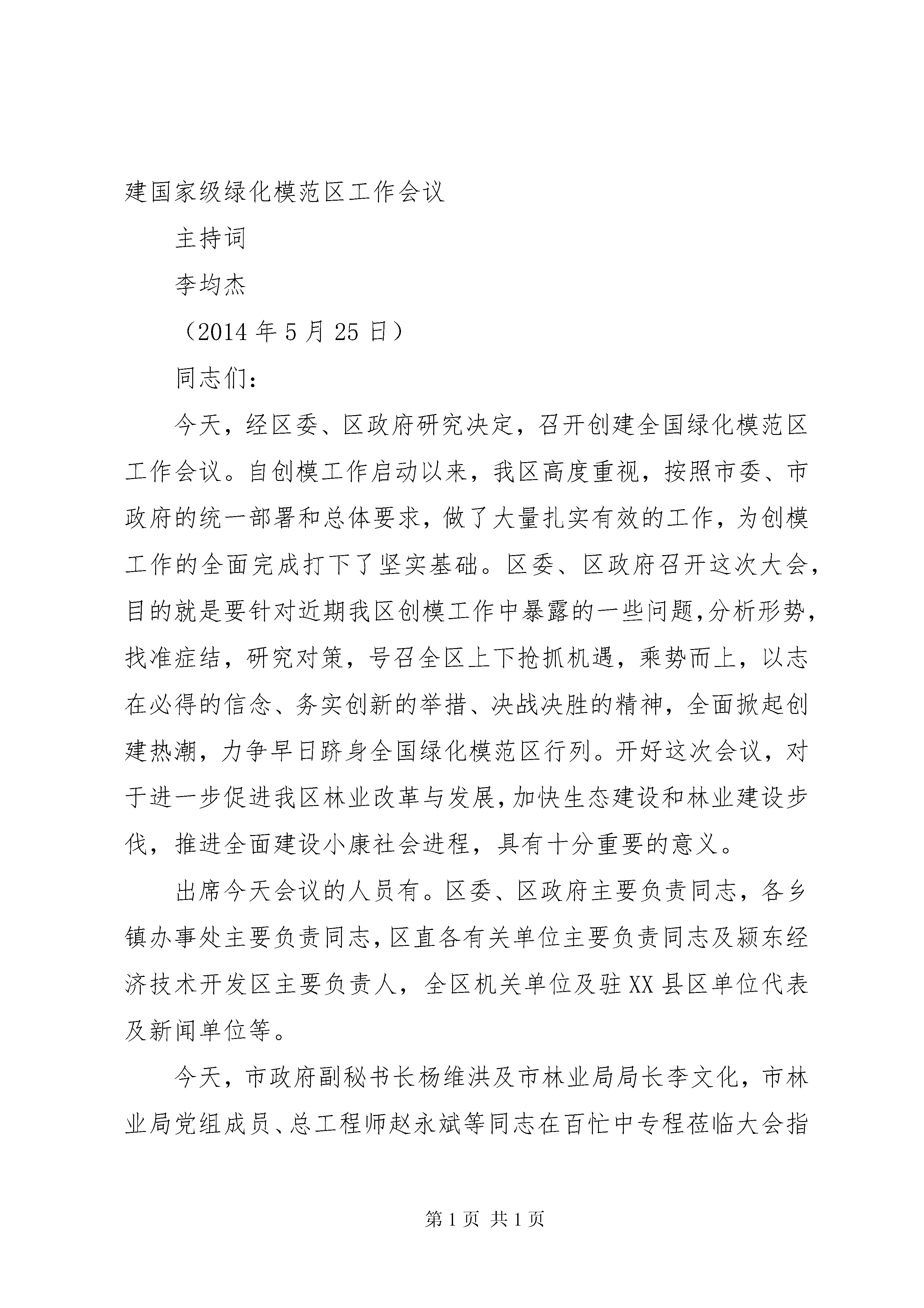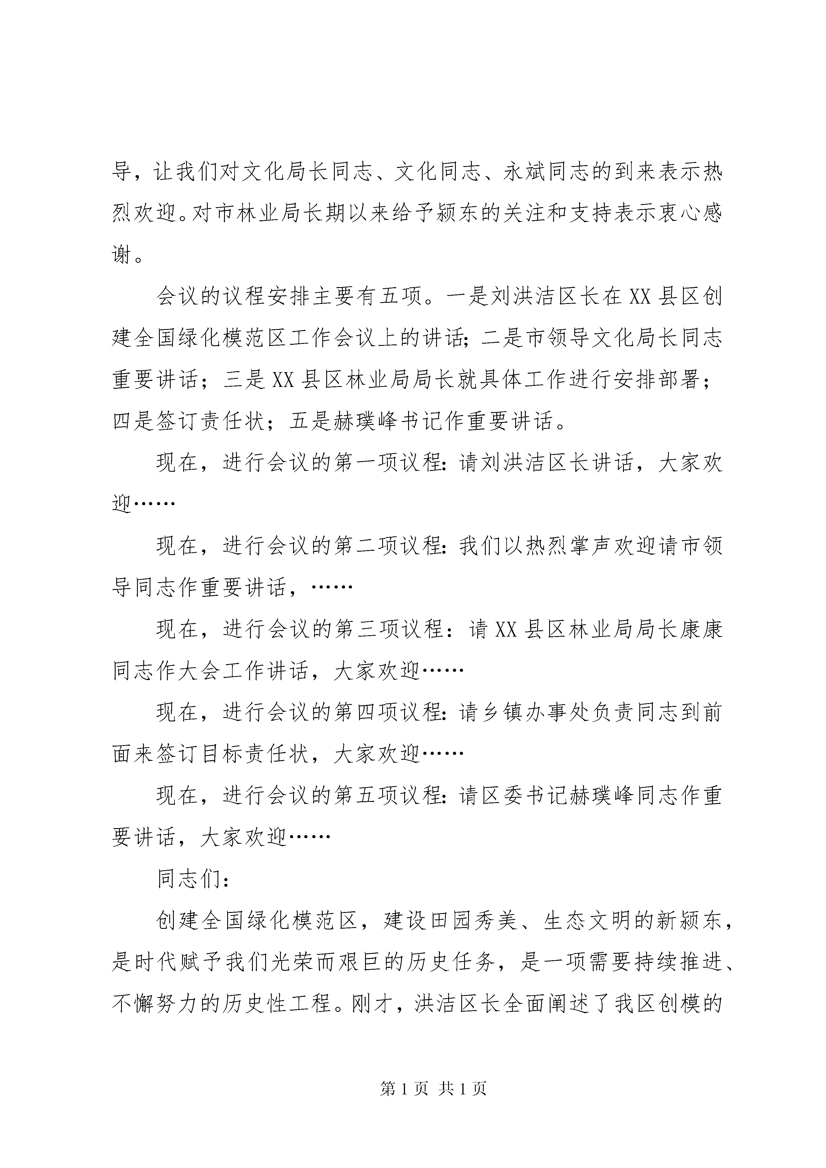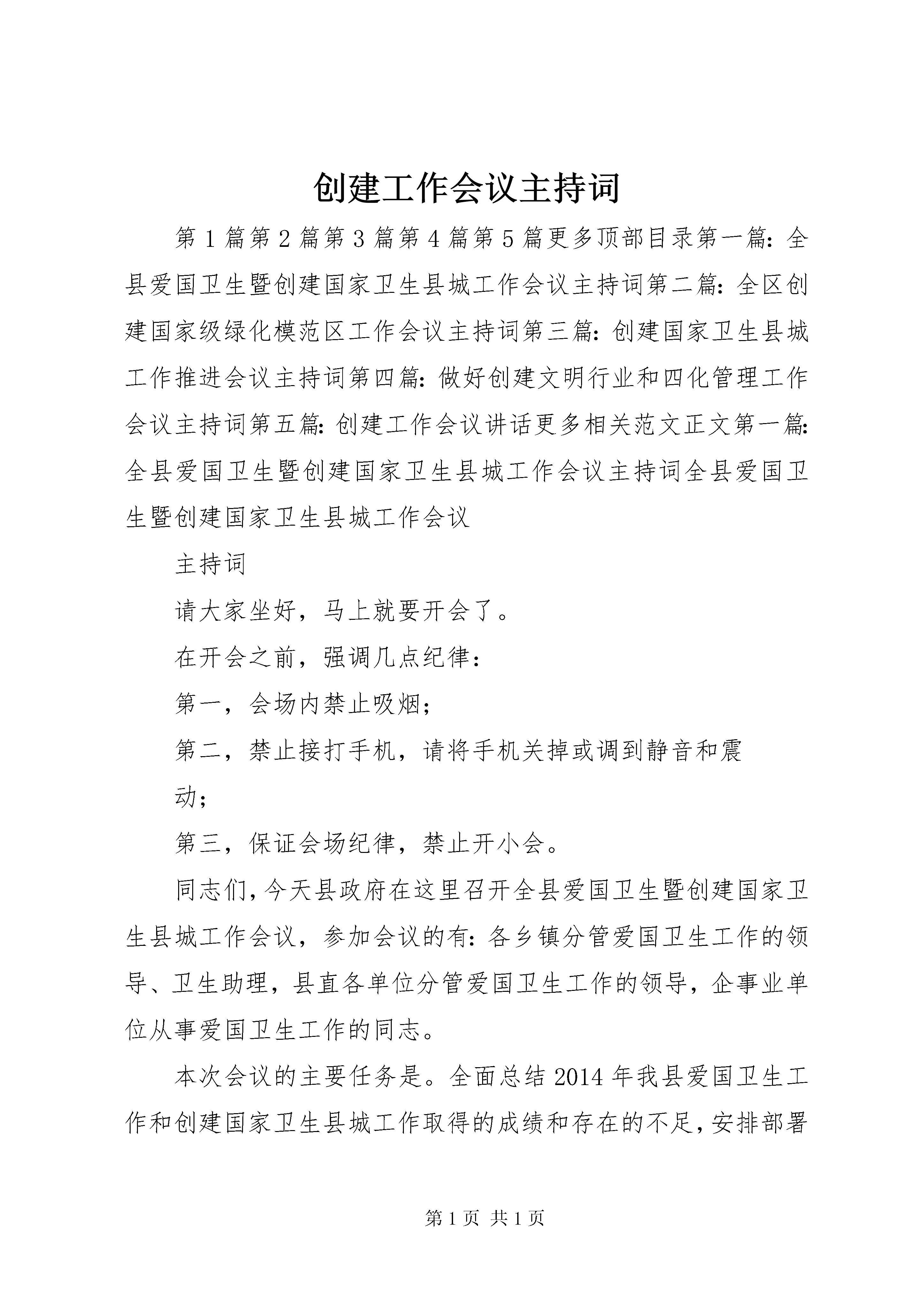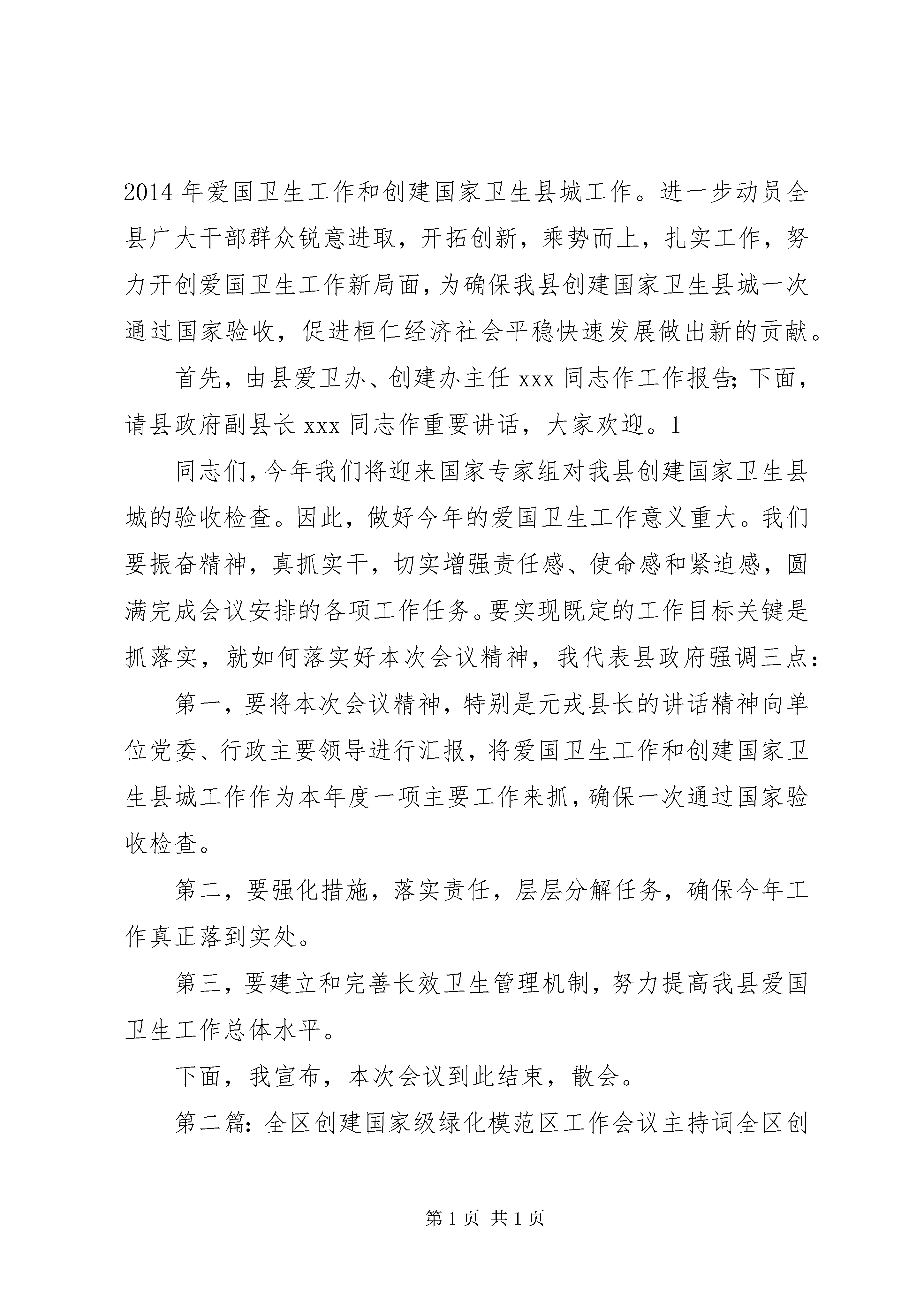 创建工作会议主持词第1篇第2篇第3篇第4篇第5篇更多顶部目录第一篇:全县爱国卫生暨创建国家卫生县城工作会议主持词第二篇:全区创建国家级绿化模范区工作会议主持词第三篇:创建国家卫生县城工作推进会议主持词第四篇:做好创建文明行业和四化管理工作会议主持词第五篇:创建工作会议讲话更多相关范文正文第一篇:全县爱国卫生暨创建国家卫生县城工作会议主持词全县爱国卫生暨创建国家卫生县城工作会议主持词请大家坐好,马上就要开会了。在开会之前,强调几点纪律:第一,会场内禁止吸烟;第二,禁止接打手机,请将手机关掉或调到静音和震动;第三,保证会场纪律,禁止开小会。同志们,今天县政府在这里召开全县爱国卫生暨创建国家卫生县城工作会议,参加会议的有:各乡镇分管爱国卫生工作的领导、卫生助理,县直各单位分管爱国卫生工作的领导,企事业单位从事爱国卫生工作的同志。本次会议的主要任务是。全面总结2014年我县爱国卫生工作和创建国家卫生县城工作取得的成绩和存在的不足,安排部署2014年爱国卫生工作和创建国家卫生县城工作。进一步动员全县广大干部群众锐意进取,开拓创新,乘势而上,扎实工作,努力开创爱国卫生工作新局面,为确保我县创建国家卫生县城一次通过国家验收,促进桓仁经济社会平稳快速发展做出新的贡献。首先,由县爱卫办、创建办主任xxx同志作工作报告;下面,请县政府副县长xxx同志作重要讲话,大家欢迎。1同志们,今年我们将迎来国家专家组对我县创建国家卫生县城的验收检查。因此,做好今年的爱国卫生工作意义重大。我们要振奋精神,真抓实干,切实增强责任感、使命感和紧迫感,圆满完成会议安排的各项工作任务。要实现既定的工作目标关键是抓落实,就如何落实好本次会议精神,我代表县政府强调三点:第一,要将本次会议精神,特别是元戎县长的讲话精神向单位党委、行政主要领导进行汇报,将爱国卫生工作和创建国家卫生县城工作作为本年度一项主要工作来抓,确保一次通过国家验收检查。第二,要强化措施,落实责任,层层分解任务,确保今年工作真正落到实处。第三,要建立和完善长效卫生管理机制,努力提高我县爱国卫生工作总体水平。下面,我宣布,本次会议到此结束,散会。第二篇:全区创建国家级绿化模范区工作会议主持词全区创建国家级绿化模范区工作会议主持词李均杰(2014年5月25日)同志们:今天,经区委、区政府研究决定,召开创建全国绿化模范区工作会议。自创模工作启动以来,我区高度重视,按照市委、市政府的统一部署和总体要求,做了大量扎实有效的工作,为创模工作的全面完成打下了坚实基础。区委、区政府召开这次大会,目的就是要针对近期我区创模工作中暴露的一些问题,分析形势,找准症结,研究对策,号召全区上下抢抓机遇,乘势而上,以志在必得的信念、务实创新的举措、决战决胜的精神,全面掀起创建热潮,力争早日跻身全国绿化模范区行列。开好这次会议,对于进一步促进我区林业改革与发展,加快生态建设和林业建设步伐,推进全面建设小康社会进程,具有十分重要的意义。出席今天会议的人员有。区委、区政府主要负责同志,各乡镇办事处主要负责同志,区直各有关单位主要负责同志及颍东经济技术开发区主要负责人,全区机关单位及驻XX县区单位代表及新闻单位等。今天,市政府副秘书长杨维洪及市林业局局长李文化,市林业局党组成员、总工程师赵永斌等同志在百忙中专程莅临大会指导,让我们对文化局长同志、文化同志、永斌同志的到来表示热烈欢迎。对市林业局长期以来给予颍东的关注和支持表示衷心感谢。会议的议程安排主要有五项。一是刘洪洁区长在XX县区创建全国绿化模范区工作会议上的讲话;二是市领导文化局长同志重要讲话;三是XX县区林业局局长就具体工作进行安排部署;四是签订责任状;五是赫璞峰书记作重要讲话。现在,进行会议的第一项议程:请刘洪洁区长讲话,大家欢迎……现在,进行会议的第二项议程:我们以热烈掌声欢迎请市领导同志作重要讲话,……现在,进行会议的第三项议程:请XX县区林业局局长康康同志作大会工作讲话,大家欢迎……现在,进行会议的第四项议程:请乡镇办事处负责同志到前面来签订目标责任状,大家欢迎……现在,进行会议的第五项议程:请区委书记赫璞峰同志作重要讲话,大家欢迎……同志们:创建全国绿化模范区,建设田园秀美、生态文明的新颍东,是时代赋予我们光荣而艰巨的历史任务,是一项需要持续推进、不懈努力的历史性工程。刚才,洪洁区长全面阐述了我区创模的良好基础和优势,文化局长。发表了热情洋溢的讲话,康康局长代表区委区政府对全区创模工作存在问题指出了下步努力方向,璞峰书记就统一思想、凝聚共识,用心用力抓落实,强化措施、齐抓共管抓创模进行强调。文化局长的讲话(站推荐:),充分肯定了我区林业改革发展取得的成绩,深刻分析了当前林业发展面临的大好形势,对我区创模工作提出了很好的指导性意见,体现了市对颍东创模