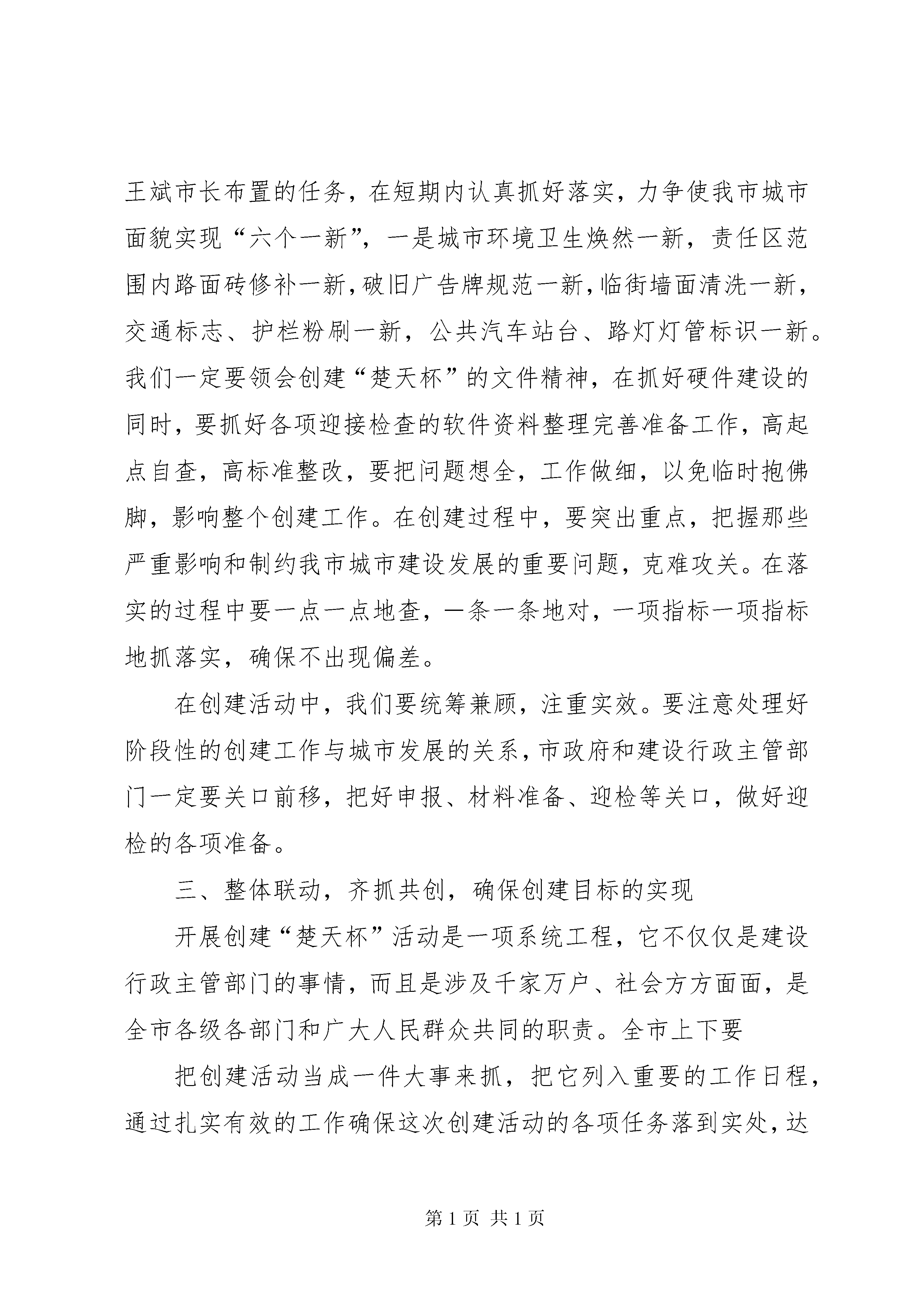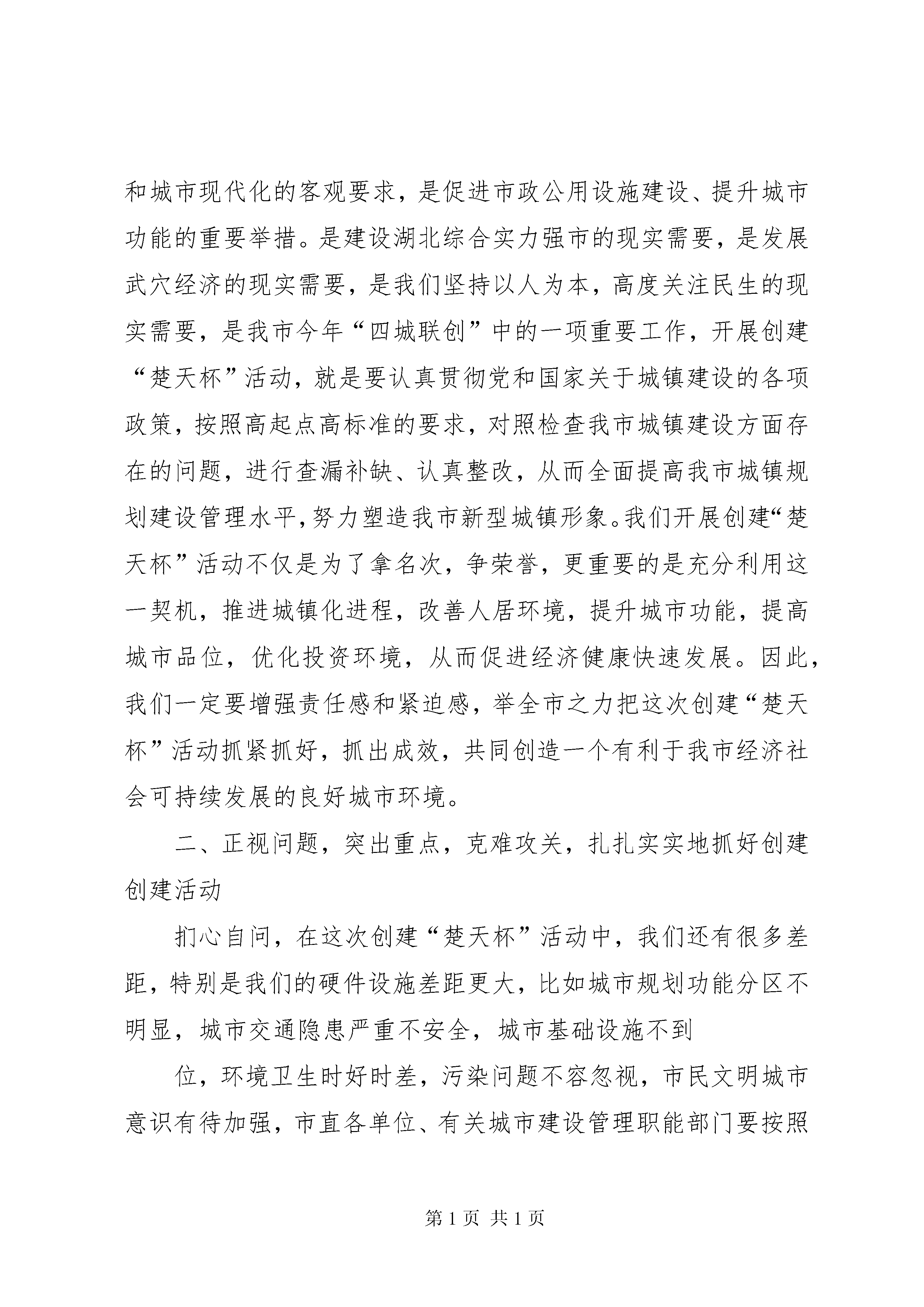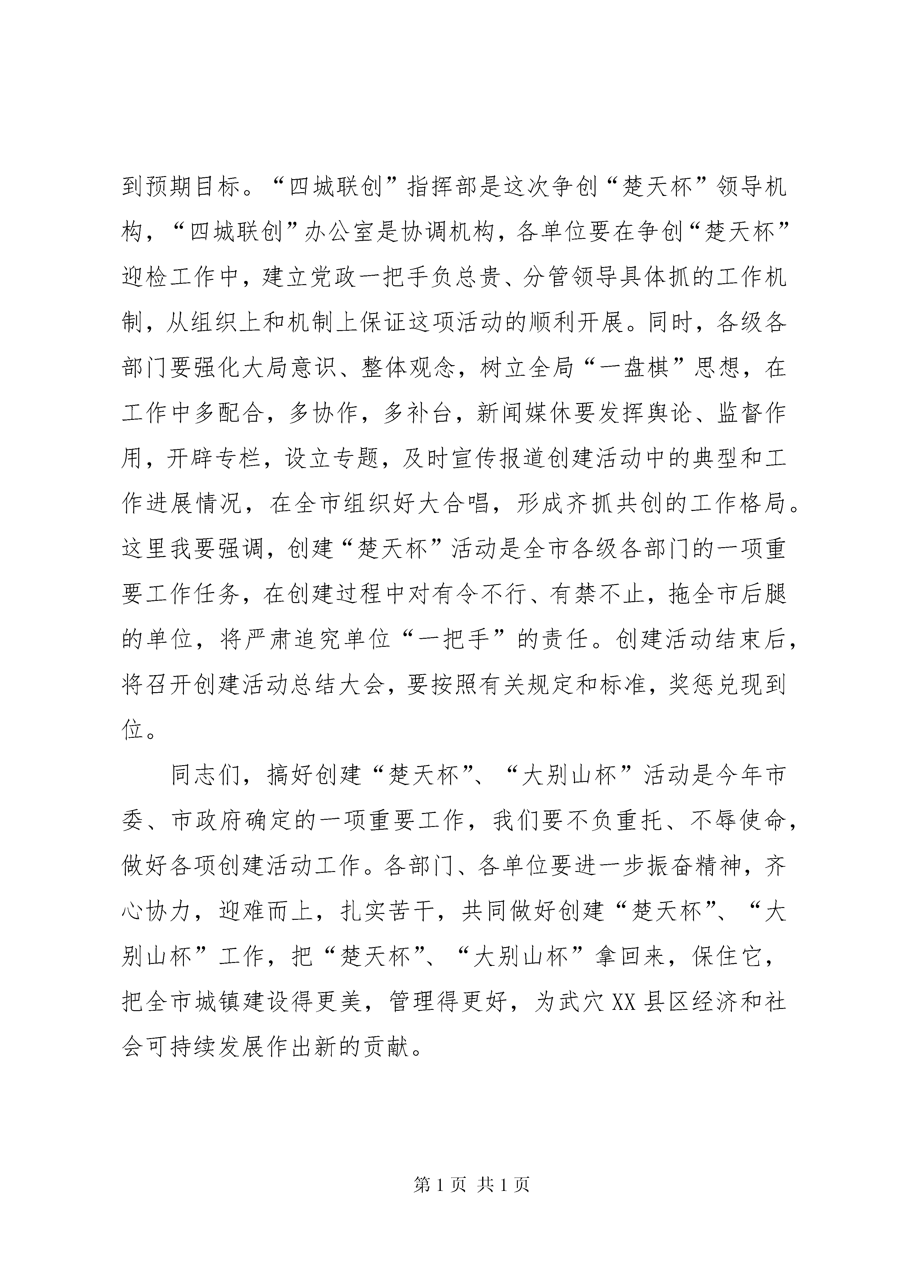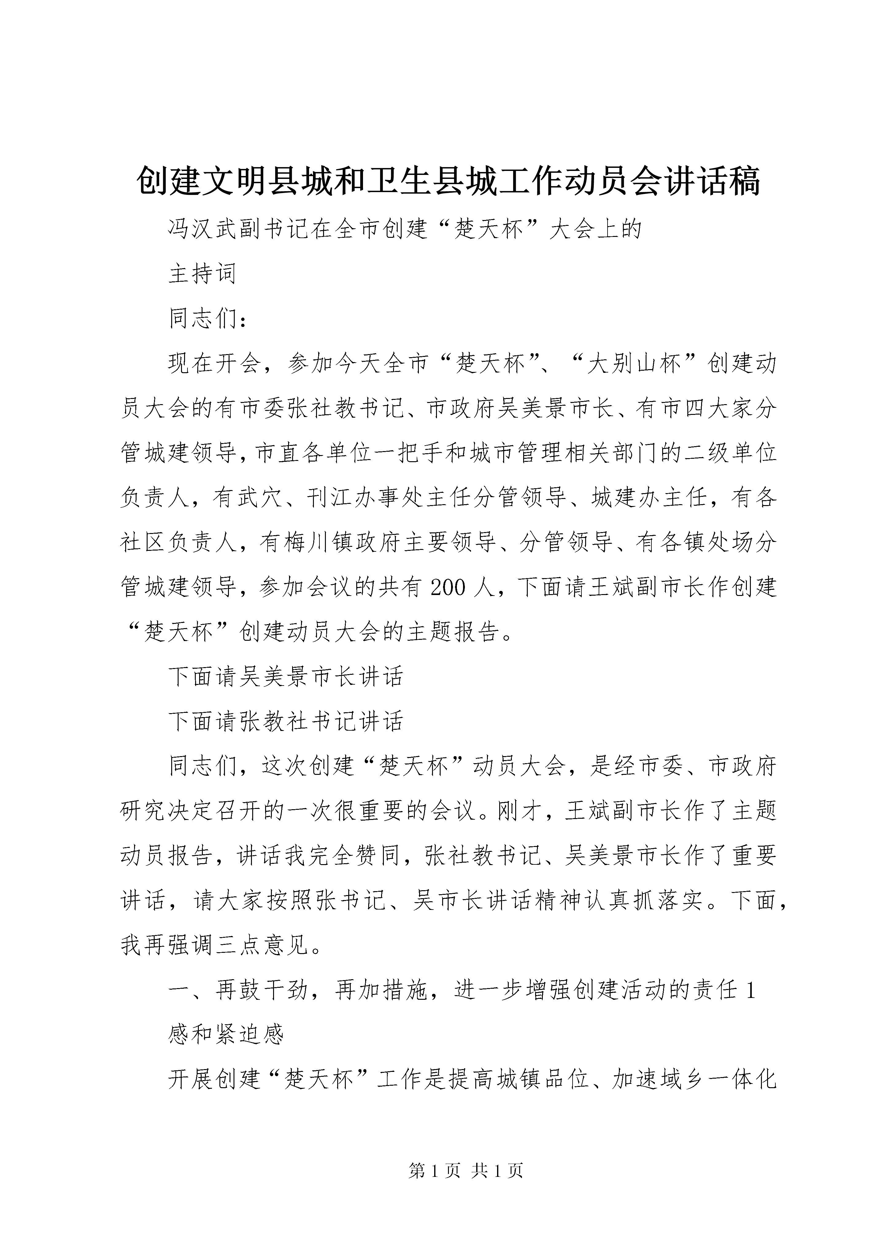 创建文明县城和卫生县城工作动员会讲话稿冯汉武副书记在全市创建“楚天杯”大会上的主持词同志们:现在开会,参加今天全市“楚天杯”、“大别山杯”创建动员大会的有市委张社教书记、市政府吴美景市长、有市四大家分管城建领导,市直各单位一把手和城市管理相关部门的二级单位负责人,有武穴、刊江办事处主任分管领导、城建办主任,有各社区负责人,有梅川镇政府主要领导、分管领导、有各镇处场分管城建领导,参加会议的共有200人,下面请王斌副市长作创建“楚天杯”创建动员大会的主题报告。下面请吴美景市长讲话下面请张教社书记讲话同志们,这次创建“楚天杯”动员大会,是经市委、市政府研究决定召开的一次很重要的会议。刚才,王斌副市长作了主题动员报告,讲话我完全赞同,张社教书记、吴美景市长作了重要讲话,请大家按照张书记、吴市长讲话精神认真抓落实。下面,我再强调三点意见。一、再鼓干劲,再加措施,进一步增强创建活动的责任1感和紧迫感开展创建“楚天杯”工作是提高城镇品位、加速域乡一体化和城市现代化的客观要求,是促进市政公用设施建设、提升城市功能的重要举措。是建设湖北综合实力强市的现实需要,是发展武穴经济的现实需要,是我们坚持以人为本,高度关注民生的现实需要,是我市今年“四城联创”中的一项重要工作,开展创建“楚天杯”活动,就是要认真贯彻党和国家关于城镇建设的各项政策,按照高起点高标准的要求,对照检查我市城镇建设方面存在的问题,进行查漏补缺、认真整改,从而全面提高我市城镇规划建设管理水平,努力塑造我市新型城镇形象。我们开展创建“楚天杯”活动不仅是为了拿名次,争荣誉,更重要的是充分利用这一契机,推进城镇化进程,改善人居环境,提升城市功能,提高城市品位,优化投资环境,从而促进经济健康快速发展。因此,我们一定要增强责任感和紧迫感,举全市之力把这次创建“楚天杯”活动抓紧抓好,抓出成效,共同创造一个有利于我市经济社会可持续发展的良好城市环境。二、正视问题,突出重点,克难攻关,扎扎实实地抓好创建创建活动扪心自问,在这次创建“楚天杯”活动中,我们还有很多差距,特别是我们的硬件设施差距更大,比如城市规划功能分区不明显,城市交通隐患严重不安全,城市基础设施不到位,环境卫生时好时差,污染问题不容忽视,市民文明城市意识有待加强,市直各单位、有关城市建设管理职能部门要按照王斌市长布置的任务,在短期内认真抓好落实,力争使我市城市面貌实现“六个一新”,一是城市环境卫生焕然一新,责任区范围内路面砖修补一新,破旧广告牌规范一新,临街墙面清洗一新,交通标志、护栏粉刷一新,公共汽车站台、路灯灯管标识一新。我们一定要领会创建“楚天杯”的文件精神,在抓好硬件建设的同时,要抓好各项迎接检查的软件资料整理完善准备工作,高起点自查,高标准整改,要把问题想全,工作做细,以免临时抱佛脚,影响整个创建工作。在创建过程中,要突出重点,把握那些严重影响和制约我市城市建设发展的重要问题,克难攻关。在落实的过程中要一点一点地查,-条一条地对,一项指标一项指标地抓落实,确保不出现偏差。在创建活动中,我们要统筹兼顾,注重实效。要注意处理好阶段性的创建工作与城市发展的关系,市政府和建设行政主管部门一定要关口前移,把好申报、材料准备、迎检等关口,做好迎检的各项准备。三、整体联动,齐抓共创,确保创建目标的实现开展创建“楚天杯”活动是一项系统工程,它不仅仅是建设行政主管部门的事情,而且是涉及千家万户、社会方方面面,是全市各级各部门和广大人民群众共同的职责。全市上下要把创建活动当成一件大事来抓,把它列入重要的工作日程,通过扎实有效的工作确保这次创建活动的各项任务落到实处,达到预期目标。“四城联创”指挥部是这次争创“楚天杯”领导机构,“四城联创”办公室是协调机构,各单位要在争创“楚天杯”迎检工作中,建立党政一把手负总贵、分管领导具体抓的工作机制,从组织上和机制上保证这项活动的顺利开展。同时,各级各部门要强化大局意识、整体观念,树立全局“一盘棋”思想,在工作中多配合,多协作,多补台,新闻媒休要发挥舆论、监督作用,开辟专栏,设立专题,及时宣传报道创建活动中的典型和工作进展情况,在全市组织好大合唱,形成齐抓共创的工作格局。这里我要强调,创建“楚天杯”活动是全市各级各部门的一项重要工作任务,在创建过程中对有令不行、有禁不止,拖全市后腿的单位,将严肃追究单位“一把手”的责任。创建活动结束后,将召开创建活动总结大会,要按照有关规定和标准,奖惩兑现到位。同志们,搞好创建“楚天杯”、“大别山杯”活动是今年市委、市政府确定的一项重要工作,我们要不负重托、不辱使命,做好各项创建活动工作。各部门、各单位要进一步振奋精神,齐心协力,迎难而上,扎实苦干,共同做好创建“楚天杯”、“大别山杯”工作,把“楚天杯”、“大别山杯”拿回来,保住它,把全市城镇建设得
